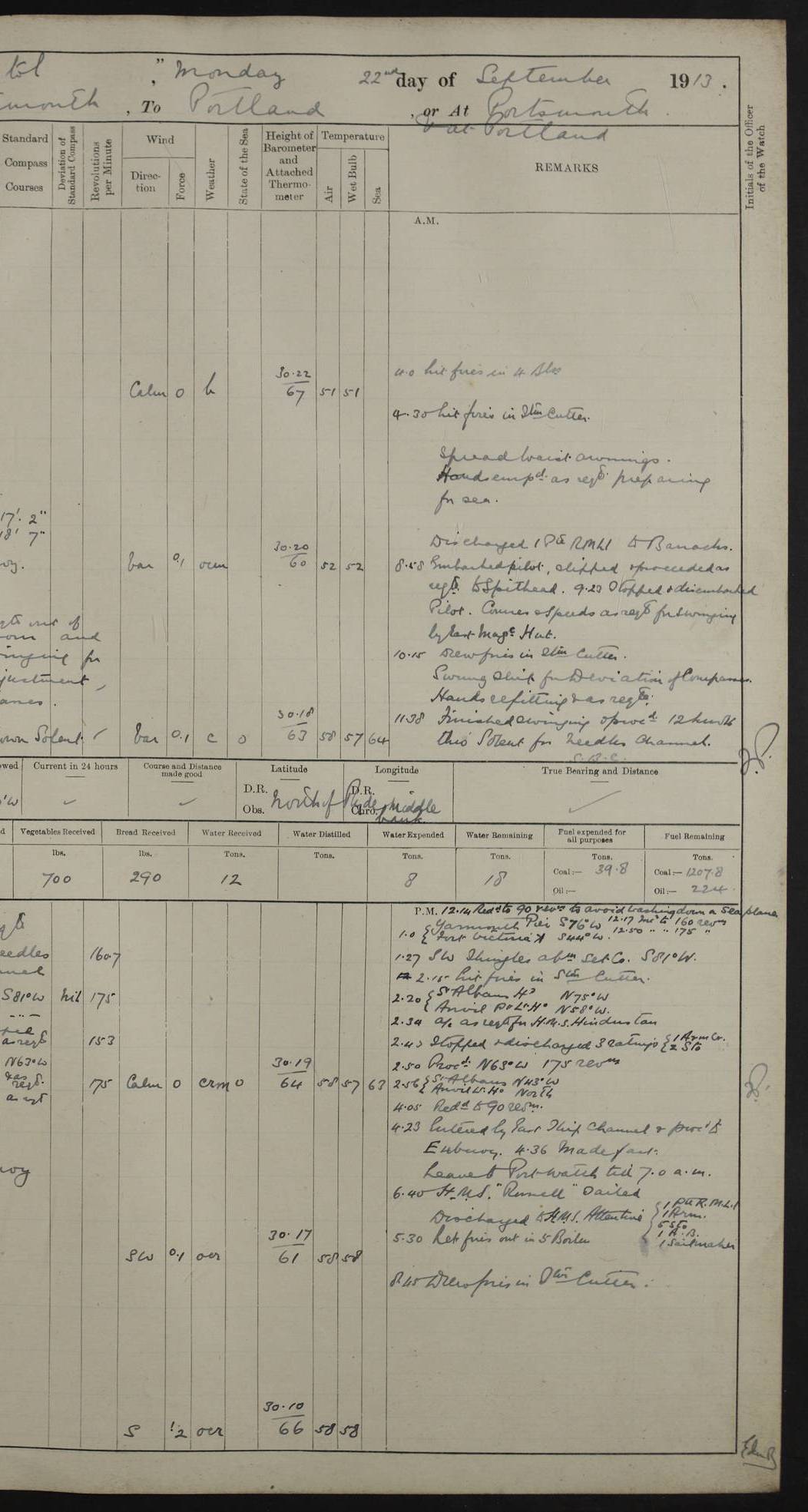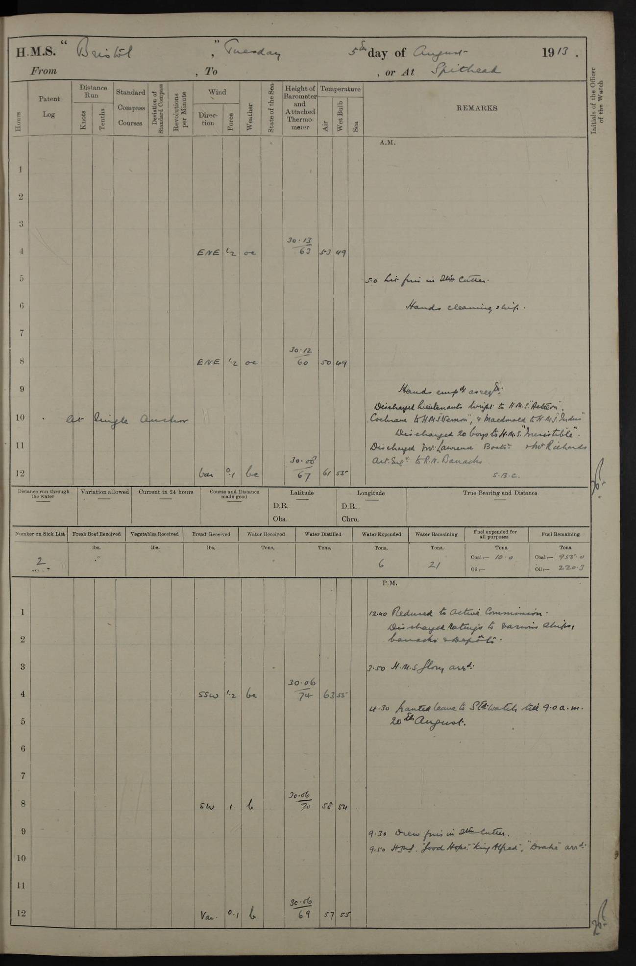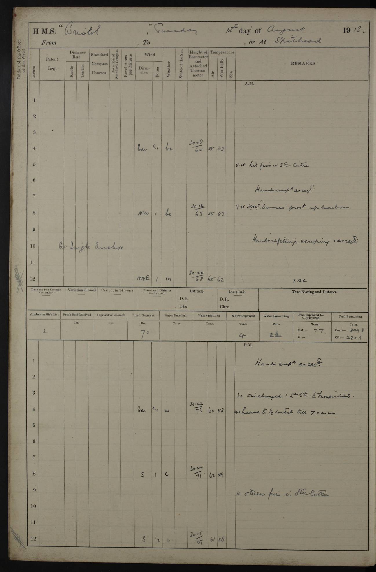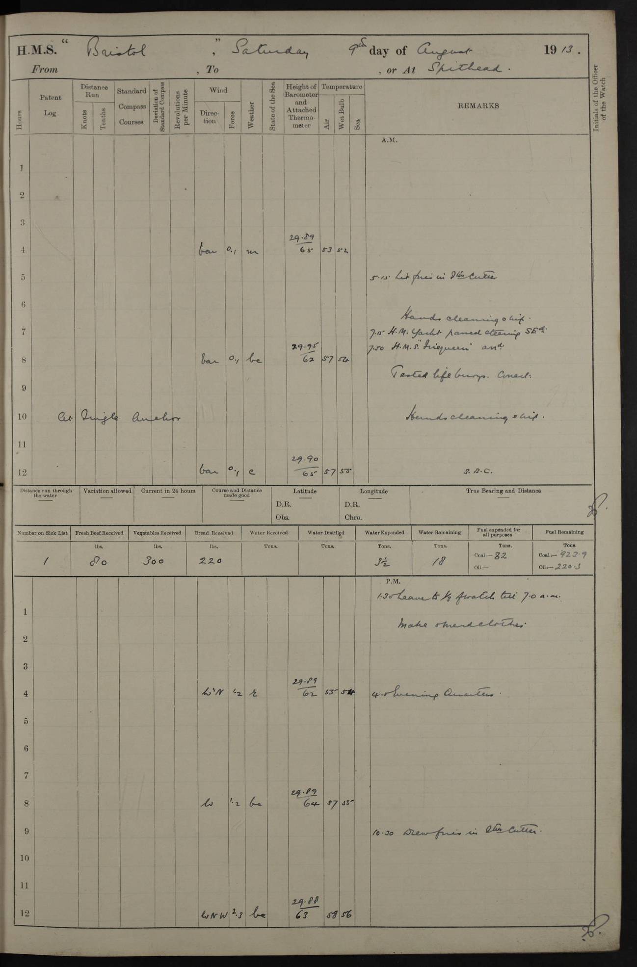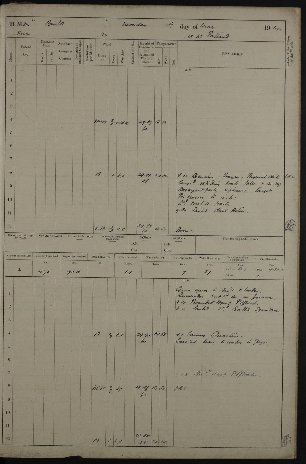 LOGS FOR JULY 1913 4ef4f40ee53e0a0c9100132d: (https://s3.amazonaws.com:443/oldweather/ADM53-36118/0006_0.jpg) 1 July 1913 Devonport Lat 50.38, Long -4.19 1 in sick list. 4.30am: Lit fires in Steam Cutter. Hands cleaning ship. 6.00am: Hands cleaning ship. 8.00am: Discharged ratings to ships in harbour. 9.00am: Recommissioned ship for service in 2nd Light Cruiser Squadron. 9.20am: Divisions. Hands cleaning ship. Dockyard parties drawing stores. 1.00pm: Hands drawing stores. Discharged 2 Privates RMLI to Barracks. 4.00pm: Leave to Watch till 7.00a.m. 9.00pm: 1 Sergeant RMLI joined ship. 10.15pm: Drew fires in Steam Cutter. 4ef4f40ee53e0a0c9100132e: (https://s3.amazonaws.com:443/oldweather/ADM53-36118/0006_1.jpg) 2 July 1913 Devonport Lat 50.38, Long -4.19 1 in sick list. 6.00am: Hands pumping water and as requisite. 9.00am: Dockyard parties drawing stores. Remainder of hands employed as requisite. 4ef4f40ee53e0a0c9100132f: (https://s3.amazonaws.com:443/oldweather/ADM53-36118/0007_0.jpg) 3 July 1913 Devonport Lat 50.38, Long -4.19 1 in sick list. 11.45am: Medical inspection of Ship's Company. 5.15pm: H.M.S. Defence arrived. 8.10pm: 1 Painter 2nd class joined ship. 4ef4f40ee53e0a0c91001330: (https://s3.amazonaws.com:443/oldweather/ADM53-36118/0007_1.jpg) 4 July 1913 Devonport Lat 50.38, Long -4.19 2 in sick list. 8.00am: Cleaned small arms. 12.45pm: Paid weekly money. 1.00pm: Lit fires in 1 Boiler. Hands securing boats for sea and as requisite. 4ef4f40ee53e0a0c91001331: (https://s3.amazonaws.com:443/oldweather/ADM53-36118/0008_0.jpg) 5 July 1913 Devonport to Plymouth Sound Lat 50.39, Long -4.14 2 on sick list. 6.45am: Landed escort. 8.30am: Escort and prisoner returned. 9.00am: Lit fires in 2 Boilers. Hands cleaning ship. Tested life buoys. Correct. 12.55pm: H.M. Tug Aetna towed stern to port. 1.00pm: Slipped and proceeded as requisite to Sound. 1.22pm: Stopped. 1.26pm: Came to with Starboard anchor, veered to 5 shackles in 6 fathoms. 2.15pm: Two ratings joined for passage to Portsmouth. 9.10pm: Sent boats to assist schooner aground on East end of Plymouth Breakwater (Owner W. Tugwell Esquire). Laid out small kedge and 4 1/2" grass. 4ef4f40ee53e0a0c91001332: (https://s3.amazonaws.com:443/oldweather/ADM53-36118/0008_1.jpg) 6 July 1913 Plymouth Lat 50.39, Long -4.14 2 on sick list. 5.45am: Schooner towed off by tug. 9.30am: Tug brought back kedge anchor. 10.00am: Divisions. Held Divine service onboard. 4ef4f40ee53e0a0c91001333: (https://s3.amazonaws.com:443/oldweather/ADM53-36118/0009_0.jpg) 7 July 1913 Plymouth to Spithead Lat 50.26, Long -3.26 1 on sick list. 8.50am: Weighed. 8.58am: Proceeded 170 revolutions. Course as requisite through West Entrance. 9.21am: Set Course SE. Mewstone: abeam. 9.30am: Mewstone: N10W. Revelstoke S87E. 10.21am: Altered course ESE. 10.57am: Altered course N87E. Prawle Point Bolt: N62 1/2W. Start Point: N10W. 3.50pm: Portland Bill: N65W. White Nose: N6W. 6.26pm: Needles Light House: abeam. Altered course as requisite up Needles Channel and to Spithead. 7.40pm: W. Ryde Middle: abeam to Starboard 4 cables. 8.07pm: Stopped. 8.10pm: Came to with Port anchor in 6 fathoms, veered to 5 shackles. Prepared for coaling. 4ef4f40ee53e0a0c91001334: (https://s3.amazonaws.com:443/oldweather/ADM53-36118/0009_1.jpg) 8 July 1913 Spithead to Portsmouth Harbour Lat 50.81, Long -1.11 1 on sick list. 7.39am: Embarked Pilot, weighed and proceeded as requisite 10 knots. 8.00am: Slow both. H.M. Tug "Malta" made fast alongside port side. 8.13am: Stopped. 8.20am: Made fast alongside "C1". 9.21am: Commenced coaling. 10.45am: Discharged 1 Able Seaman to H.M.A.S. "Sydney". 1.30pm: Discharged 1 Stoker to RN Barracks. 1 Leading Seaman and 1 Able Seaman joined from H.M.S. "Excellent". 2.45pm: 20 Ordinary Seamen joined from barracks. 4.20pm: 1 Ordinary Seaman joined from H.M.S. "Vernon". 6.30pm: Stopped coaling. 4ef4f40ee53e0a0c91001335: (https://s3.amazonaws.com:443/oldweather/ADM53-36118/0010_0.jpg) 9 July 1913 Portsmouth Lat 50.81, Long -1.11 Nil on sick list. 7,0am: Hands coaling ship. 2.30pm: Finished coaling. Received 527.0 tons. 3.30pm: 40 Stokers 2nd Class and 1 Ships Steward Assistant joined. 6.00pm: 7 Leading Stokers and 24 Stokers 1st class joined ship. 4ef4f40fe53e0a0c91001336: (https://s3.amazonaws.com:443/oldweather/ADM53-36118/0010_1.jpg) 10 July 1913 Portsmouth to Spithead Lat 50.75, Long -1.13 1 on sick list. 7.45am: H.M. Tugs "Enterprise" & "Malta" took ship in tow and transported her to mid stream. 8.08am: Proceeded 1/2 speed 130 revolutions out of harbour and as requisite to Spithead. 8.33am: Stopped. 8.35am: Came to with Port anchor in 6 fathoms, veered to 5 shackles. 4.00pm: Evening Quarters. Spread Quarter Deck awning. Leave to Watch till 7.00am. 1 Stoker Petty Officer and 1 Leading Stoker joined ship. 4ef4f40fe53e0a0c91001337: (https://s3.amazonaws.com:443/oldweather/ADM53-36118/0011_0.jpg) 11 July 1913 Spithead Lat 50.75, Long -1.13 1 on sick list. 12.45pm: Paid weekly money. 3.00pm: 4 Engine Room Artificers joined ship. 4.15pm: H.M.S. "Minerva " arrived. Leave to Watch till 7.00a.m. 1 Chief Stoker and 2 Leading Stokers joined. 4ef4f40fe53e0a0c91001338: (https://s3.amazonaws.com:443/oldweather/ADM53-36118/0011_1.jpg) 12 July 1913 Spithead Lat 50.75, Long -1.13 1 on sick list. 1.30pm: Leave to Watch till 7.00a.m. Monday. Youths till 10.00pm. and to boys till 6.45 pm. Make and mend clothes. 3.30pm: 10 Stoker Petty Officers joined ship. 6.00pm: Hands bathed. 4ef4f40fe53e0a0c91001339: (https://s3.amazonaws.com:443/oldweather/ADM53-36118/0012_0.jpg) 13 July 1913 Spithead Lat 50.75, Long -1.13 1 on sick list. 7.20am: H.M.S. "Blonde" arrived. 9.40am: Divisions. Held Divine Service. 1.00pm: H.M.S. "Enchantress" sailed. 7.35pm: H.M.S. "Liverpool" arrived. 4ef4f40fe53e0a0c9100133a: (https://s3.amazonaws.com:443/oldweather/ADM53-36118/0012_1.jpg) 4ef4f40fe53e0a0c9100133b: (https://s3.amazonaws.com:443/oldweather/ADM53-36118/0013_0.jpg) 4ef4f40fe53e0a0c9100133c: (https://s3.amazonaws.c