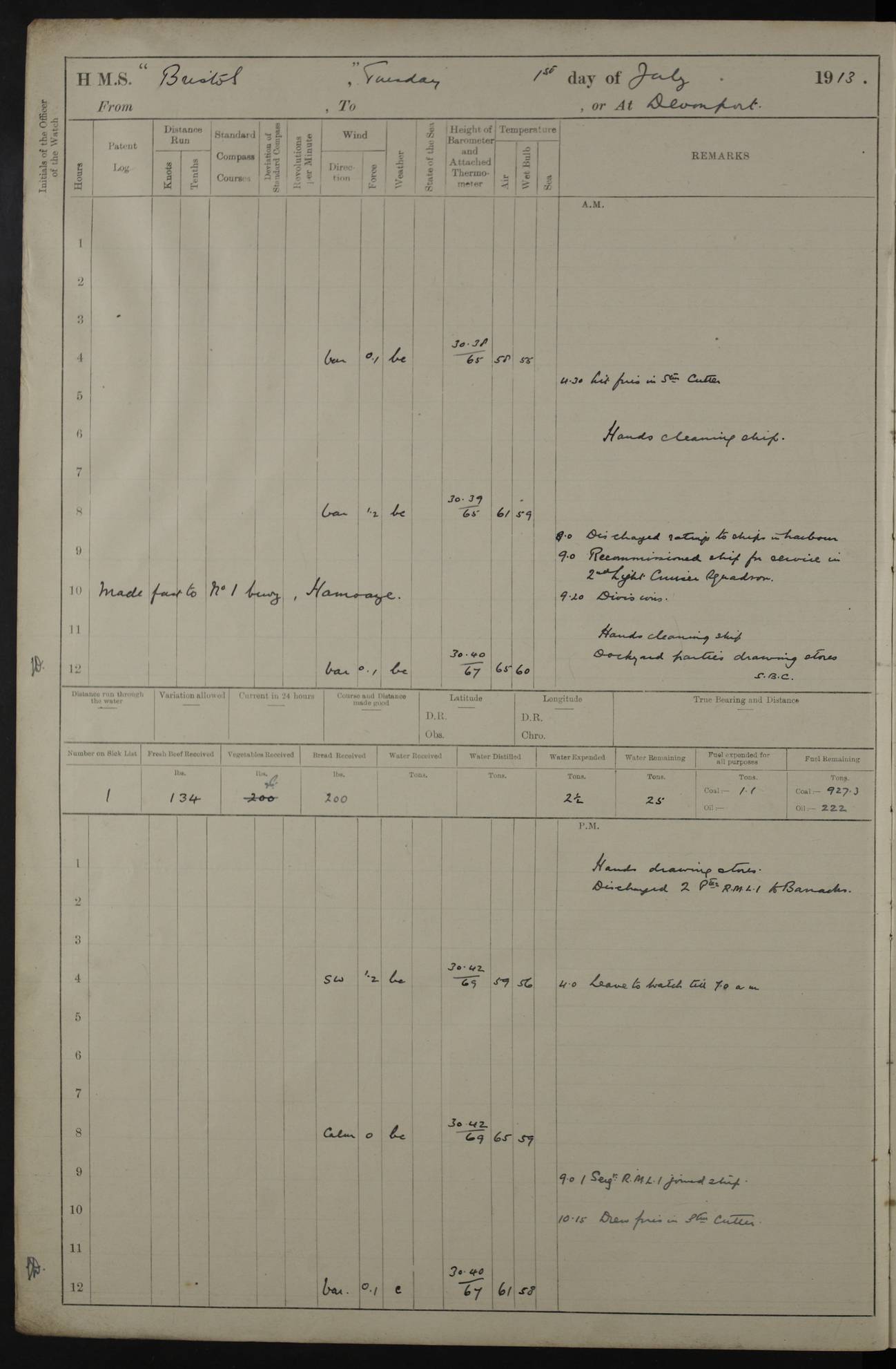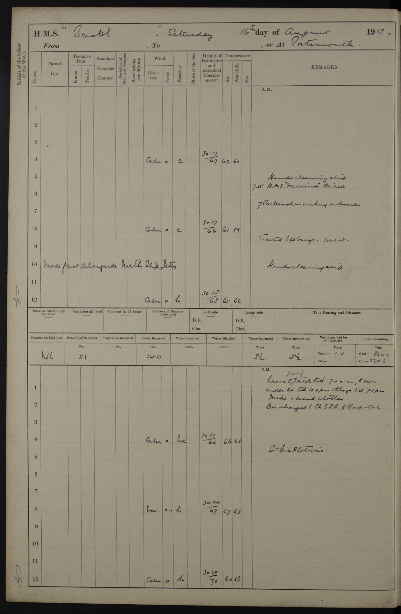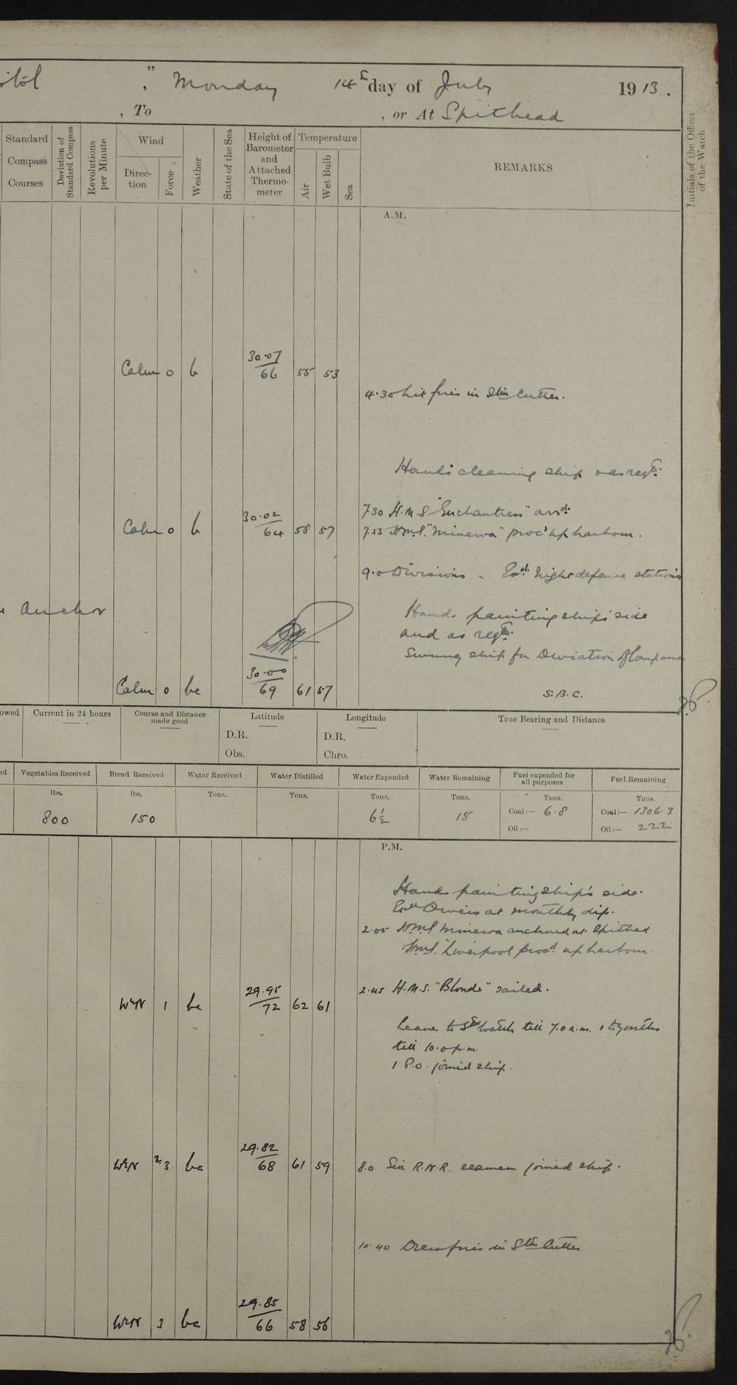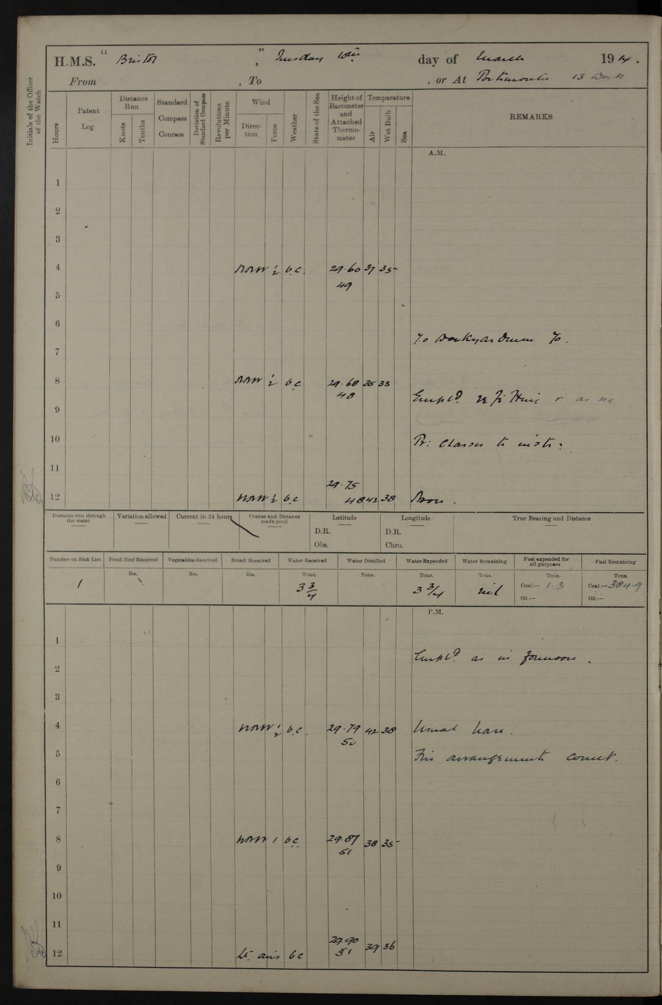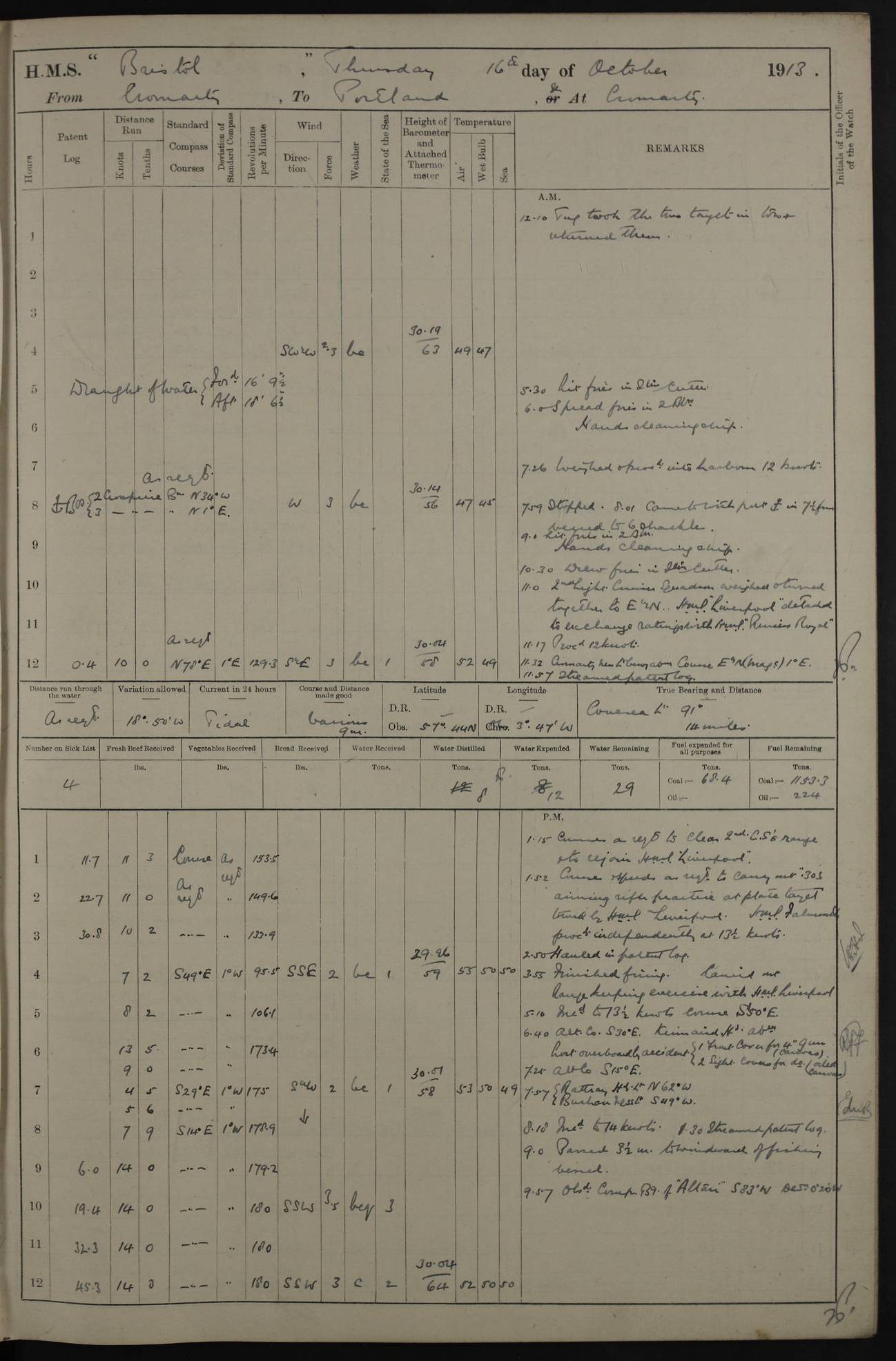 LOGS FOR JULY 1913 4ef4f40ee53e0a0c9100132d: (https://s3.amazonaws.com:443/oldweather/ADM53-36118/0006_0.jpg) 1 July 1913 Devonport Lat 50.38, Long -4.19 1 in sick list. 4.30am: Lit fires in Steam Cutter. Hands cleaning ship. 6.00am: Hands cleaning ship. 8.00am: Discharged ratings to ships in harbour. 9.00am: Recommissioned ship for service in 2nd Light Cruiser Squadron. 9.20am: Divisions. Hands cleaning ship. Dockyard parties drawing stores. 1.00pm: Hands drawing stores. Discharged 2 Privates RMLI to Barracks. 4.00pm: Leave to Watch till 7.00a.m. 9.00pm: 1 Sergeant RMLI joined ship. 10.15pm: Drew fires in Steam Cutter. 4ef4f40ee53e0a0c9100132e: (https://s3.amazonaws.com:443/oldweather/ADM53-36118/0006_1.jpg) 2 July 1913 Devonport Lat 50.38, Long -4.19 1 in sick list. 6.00am: Hands pumping water and as requisite. 9.00am: Dockyard parties drawing stores. Remainder of hands employed as requisite. 4ef4f40ee53e0a0c9100132f: (https://s3.amazonaws.com:443/oldweather/ADM53-36118/0007_0.jpg) 3 July 1913 Devonport Lat 50.38, Long -4.19 1 in sick list. 11.45am: Medical inspection of Ship's Company. 5.15pm: H.M.S. Defence arrived. 8.10pm: 1 Painter 2nd class joined ship. 4ef4f40ee53e0a0c91001330: (https://s3.amazonaws.com:443/oldweather/ADM53-36118/0007_1.jpg) 4 July 1913 Devonport Lat 50.38, Long -4.19 2 in sick list. 8.00am: Cleaned small arms. 12.45pm: Paid weekly money. 1.00pm: Lit fires in 1 Boiler. Hands securing boats for sea and as requisite. 4ef4f40ee53e0a0c91001331: (https://s3.amazonaws.com:443/oldweather/ADM53-36118/0008_0.jpg) 5 July 1913 Devonport to Plymouth Sound Lat 50.39, Long -4.14 2 on sick list. 6.45am: Landed escort. 8.30am: Escort and prisoner returned. 9.00am: Lit fires in 2 Boilers. Hands cleaning ship. Tested life buoys. Correct. 12.55pm: H.M. Tug Aetna towed stern to port. 1.00pm: Slipped and proceeded as requisite to Sound. 1.22pm: Stopped. 1.26pm: Came to with Starboard anchor, veered to 5 shackles in 6 fathoms. 2.15pm: Two ratings joined for passage to Portsmouth. 9.10pm: Sent boats to assist schooner aground on East end of Plymouth Breakwater (Owner W. Tugwell Esquire). Laid out small kedge and 4 1/2" grass. 4ef4f40ee53e0a0c91001332: (https://s3.amazonaws.com:443/oldweather/ADM53-36118/0008_1.jpg) 6 July 1913 Plymouth Lat 50.39, Long -4.14 2 on sick list. 5.45am: Schooner towed off by tug. 9.30am: Tug brought back kedge anchor. 10.00am: Divisions. Held Divine service onboard. 4ef4f40ee53e0a0c91001333: (https://s3.amazonaws.com:443/oldweather/ADM53-36118/0009_0.jpg) 7 July 1913 Plymouth to Spithead Lat 50.26, Long -3.26 1 on sick list. 8.50am: Weighed. 8.58am: Proceeded 170 revolutions. Course as requisite through West Entrance. 9.21am: Set Course SE. Mewstone: abeam. 9.30am: Mewstone: N10W. Revelstoke S87E. 10.21am: Altered course ESE. 10.57am: Altered course N87E. Prawle Point Bolt: N62 1/2W. Start Point: N10W. 3.50pm: Portland Bill: N65W. White Nose: N6W. 6.26pm: Needles Light House: abeam. Altered course as requisite up Needles Channel and to Spithead. 7.40pm: W. Ryde Middle: abeam to Starboard 4 cables. 8.07pm: Stopped. 8.10pm: Came to with Port anchor in 6 fathoms, veered to 5 shackles. Prepared for coaling. 4ef4f40ee53e0a0c91001334: (https://s3.amazonaws.com:443/oldweather/ADM53-36118/0009_1.jpg) 8 July 1913 Spithead to Portsmouth Harbour Lat 50.81, Long -1.11 1 on sick list. 7.39am: Embarked Pilot, weighed and proceeded as requisite 10 knots. 8.00am: Slow both. H.M. Tug "Malta" made fast alongside port side. 8.13am: Stopped. 8.20am: Made fast alongside "C1". 9.21am: Commenced coaling. 10.45am: Discharged 1 Able Seaman to H.M.A.S. "Sydney". 1.30pm: Discharged 1 Stoker to RN Barracks. 1 Leading Seaman and 1 Able Seaman joined from H.M.S. "Excellent". 2.45pm: 20 Ordinary Seamen joined from barracks. 4.20pm: 1 Ordinary Seaman joined from H.M.S. "Vernon". 6.30pm: Stopped coaling. 4ef4f40ee53e0a0c91001335: (https://s3.amazonaws.com:443/oldweather/ADM53-36118/0010_0.jpg) 9 July 1913 Portsmouth Lat 50.81, Long -1.11 Nil on sick list. 7,0am: Hands coaling ship. 2.30pm: Finished coaling. Received 527.0 tons. 3.30pm: 40 Stokers 2nd Class and 1 Ships Steward Assistant joined. 6.00pm: 7 Leading Stokers and 24 Stokers 1st class joined ship. 4ef4f40fe53e0a0c91001336: (https://s3.amazonaws.com:443/oldweather/ADM53-36118/0010_1.jpg) 10 July 1913 Portsmouth to Spithead Lat 50.75, Long -1.13 1 on sick list. 7.45am: H.M. Tugs "Enterprise" & "Malta" took ship in tow and transported her to mid stream. 8.08am: Proceeded 1/2 speed 130 revolutions out of harbour and as requisite to Spithead. 8.33am: Stopped. 8.35am: Came to with Port anchor in 6 fathoms, veered to 5 shackles. 4.00pm: Evening Quarters. Spread Quarter Deck awning. Leave to Watch till 7.00am. 1 Stoker Petty Officer and 1 Leading Stoker joined ship. 4ef4f40fe53e0a0c91001337: (https://s3.amazonaws.com:443/oldweather/ADM53-36118/0011_0.jpg) 11 July 1913 Spithead Lat 50.75, Long -1.13 1 on sick list. 12.45pm: Paid weekly money. 3.00pm: 4 Engine Room Artificers joined ship. 4.15pm: H.M.S. "Minerva " arrived. Leave to Watch till 7.00a.m. 1 Chief Stoker and 2 Leading Stokers joined. 4ef4f40fe53e0a0c91001338: (https://s3.amazonaws.com:443/oldweather/ADM53-36118/0011_1.jpg) 12 July 1913 Spithead Lat 50.75, Long -1.13 1 on sick list. 1.30pm: Leave to Watch till 7.00a.m. Monday. Youths till 10.00pm. and to boys till 6.45 pm. Make and mend clothes. 3.30pm: 10 Stoker Petty Officers joined ship. 6.00pm: Hands bathed. 4ef4f40fe53e0a0c91001339: (https://s3.amazonaws.com:443/oldweather/ADM53-36118/0012_0.jpg) 13 July 1913 Spithead Lat 50.75, Long -1.13 1 on sick list. 7.20am: H.M.S. "Blonde" arrived. 9.40am: Divisions. Held Divine Service. 1.00pm: H.M.S. "Enchantress" sailed. 7.35pm: H.M.S. "Liverpool" arrived. 4ef4f40fe53e0a0c9100133a: (https://s3.amazonaws.com:443/oldweather/ADM53-36118/0012_1.jpg) 4ef4f40fe53e0a0c9100133b: (https://s3.amazonaws.com:443/oldweather/ADM53-36118/0013_0.jpg) 4ef4f40fe53e0a0c9100133c: (https://s3.amazonaws.c