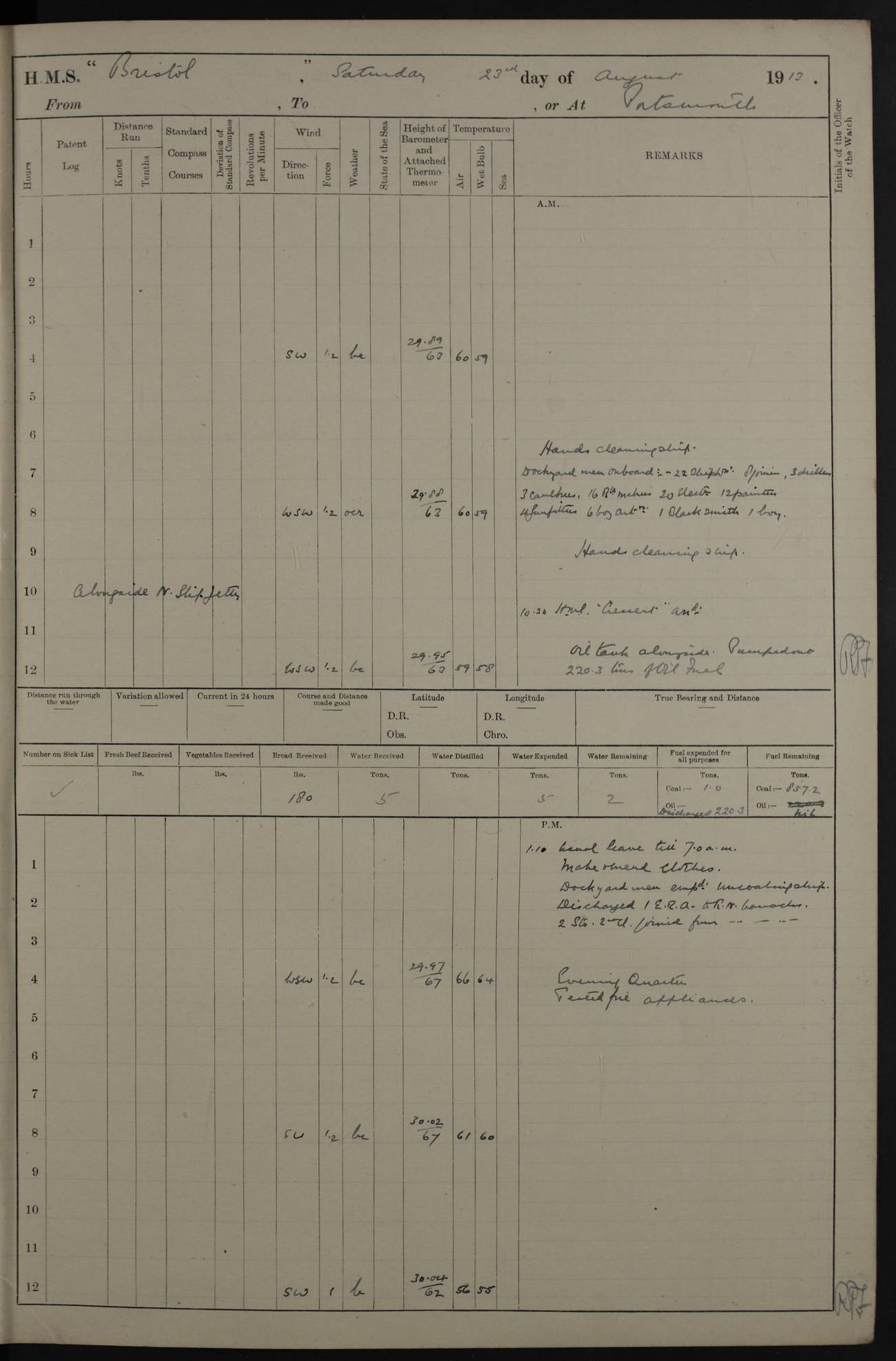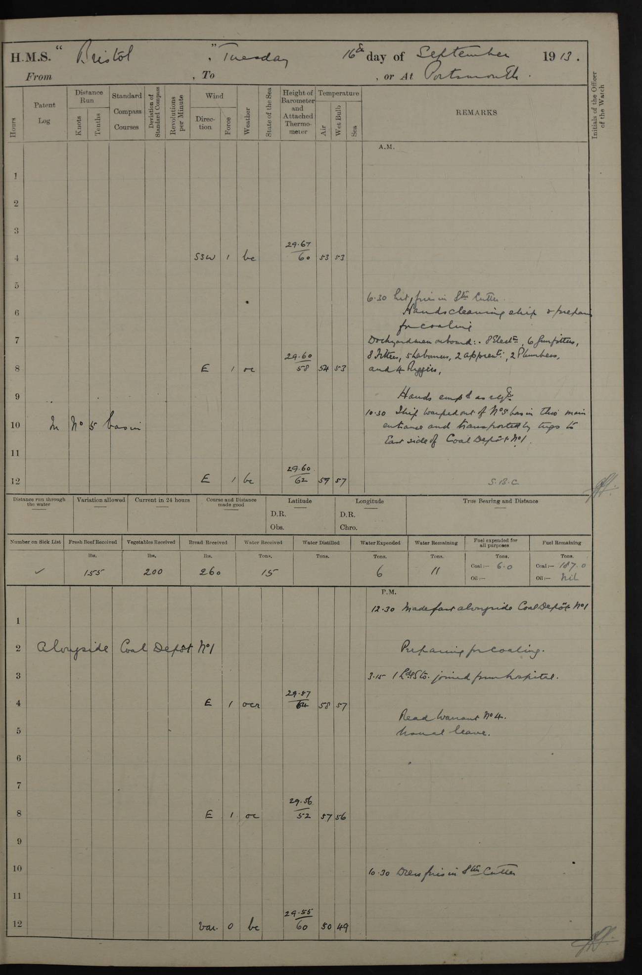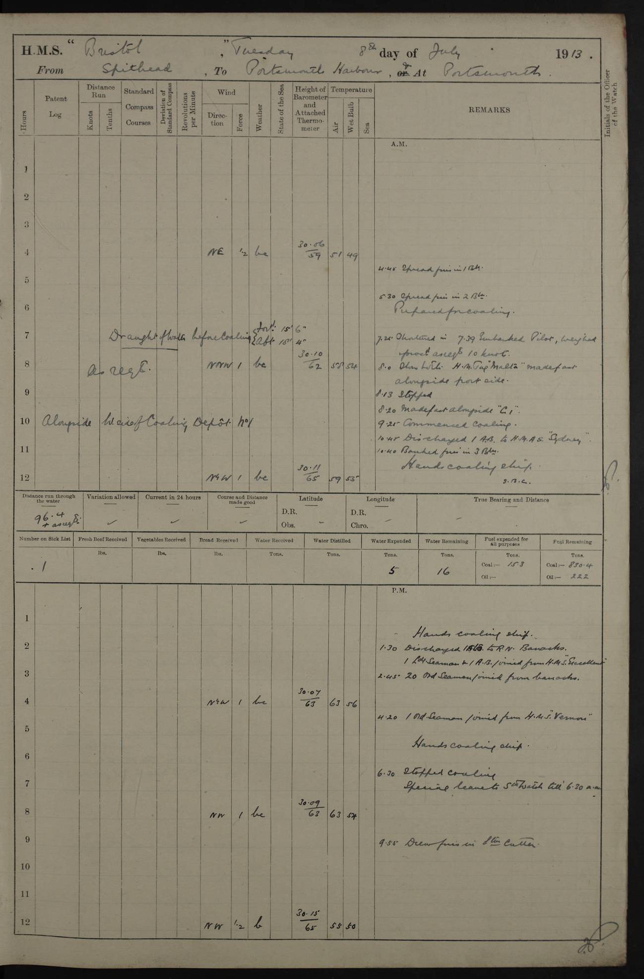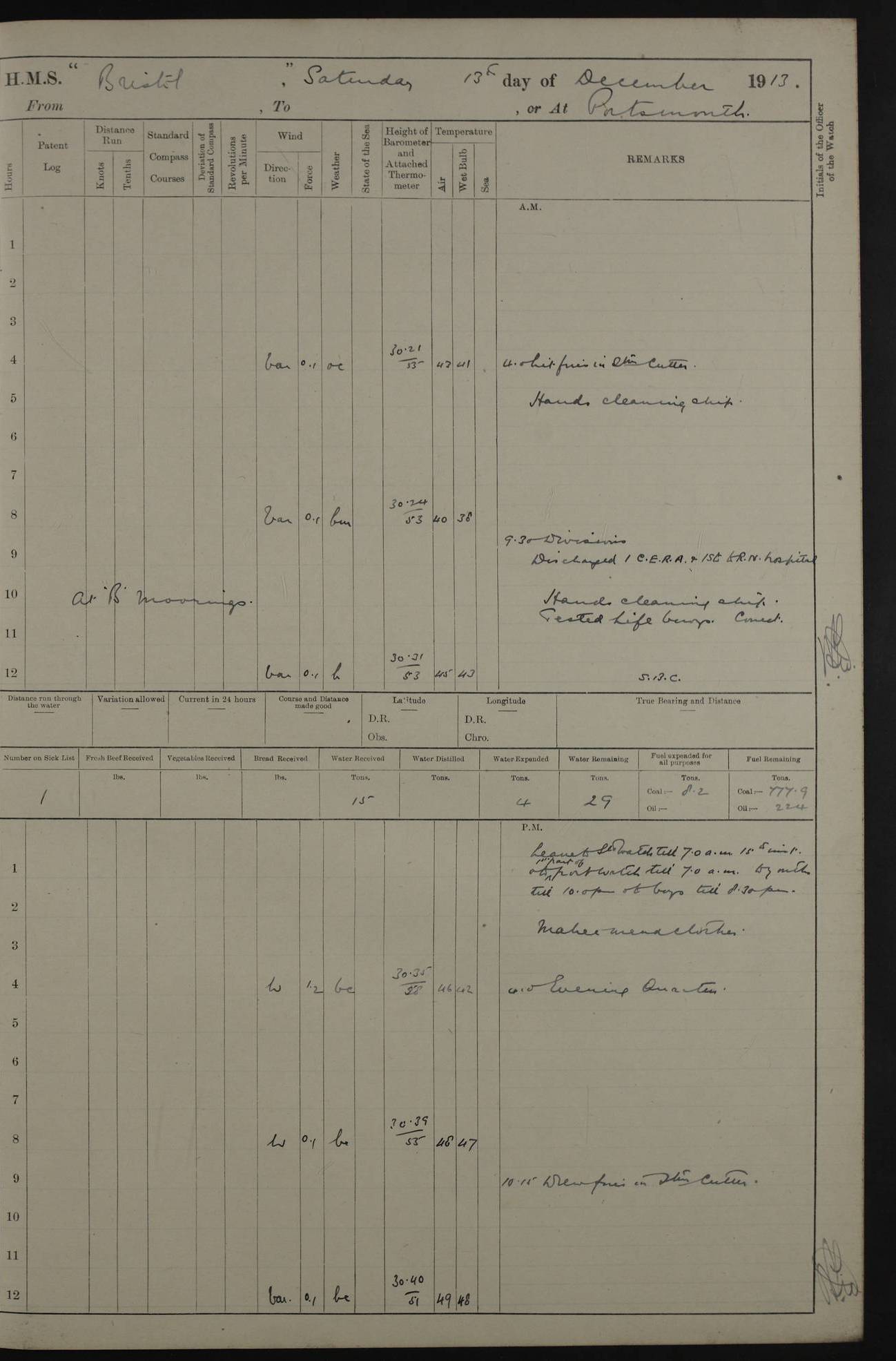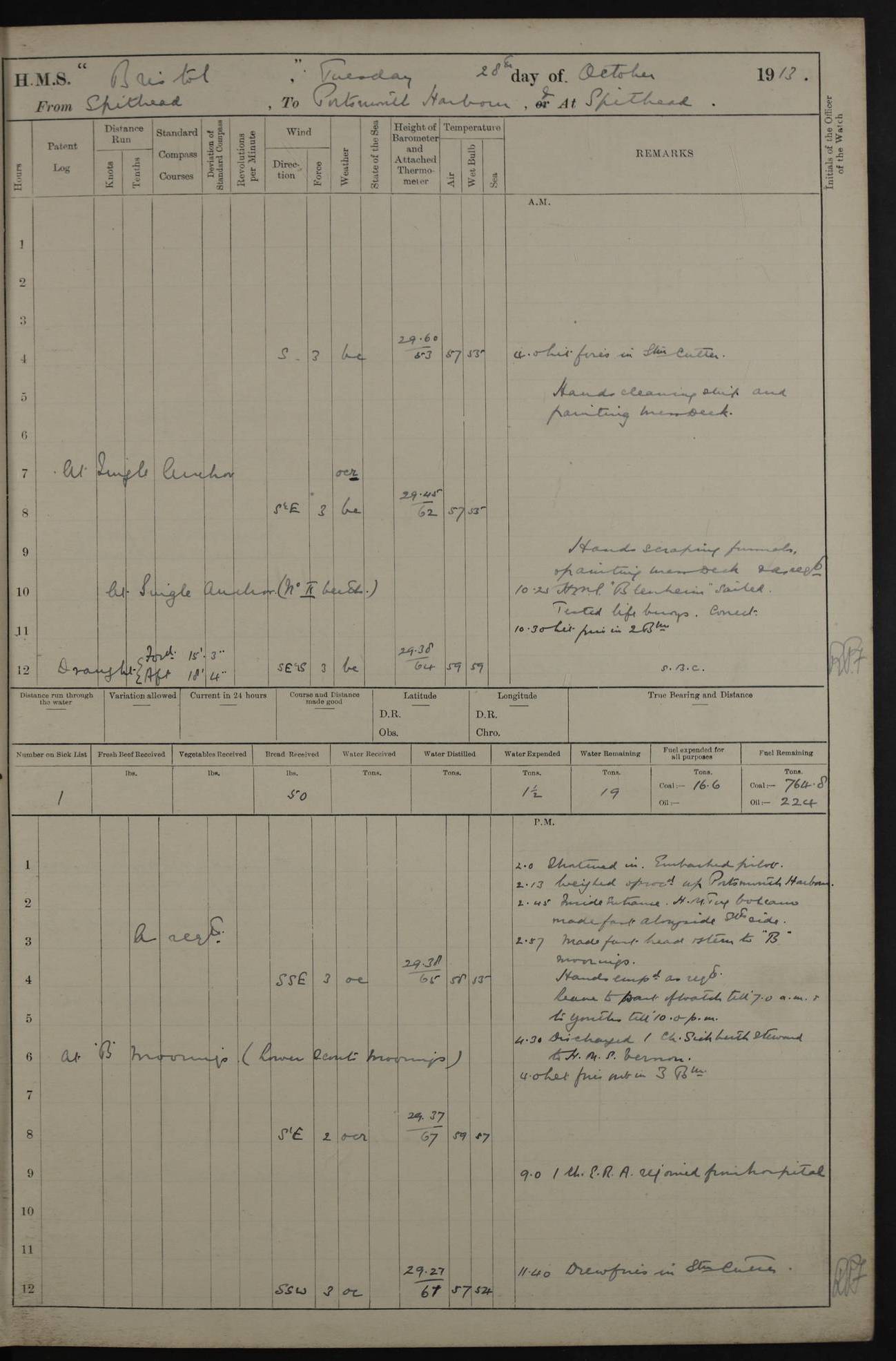 LOGS FOR JULY 1913 4ef4f40ee53e0a0c9100132d: (https://s3.amazonaws.com:443/oldweather/ADM53-36118/0006_0.jpg) 1 July 1913 Devonport Lat 50.38, Long -4.19 1 in sick list. 4.30am: Lit fires in Steam Cutter. Hands cleaning ship. 6.00am: Hands cleaning ship. 8.00am: Discharged ratings to ships in harbour. 9.00am: Recommissioned ship for service in 2nd Light Cruiser Squadron. 9.20am: Divisions. Hands cleaning ship. Dockyard parties drawing stores. 1.00pm: Hands drawing stores. Discharged 2 Privates RMLI to Barracks. 4.00pm: Leave to Watch till 7.00a.m. 9.00pm: 1 Sergeant RMLI joined ship. 10.15pm: Drew fires in Steam Cutter. 4ef4f40ee53e0a0c9100132e: (https://s3.amazonaws.com:443/oldweather/ADM53-36118/0006_1.jpg) 2 July 1913 Devonport Lat 50.38, Long -4.19 1 in sick list. 6.00am: Hands pumping water and as requisite. 9.00am: Dockyard parties drawing stores. Remainder of hands employed as requisite. 4ef4f40ee53e0a0c9100132f: (https://s3.amazonaws.com:443/oldweather/ADM53-36118/0007_0.jpg) 3 July 1913 Devonport Lat 50.38, Long -4.19 1 in sick list. 11.45am: Medical inspection of Ship's Company. 5.15pm: H.M.S. Defence arrived. 8.10pm: 1 Painter 2nd class joined ship. 4ef4f40ee53e0a0c91001330: (https://s3.amazonaws.com:443/oldweather/ADM53-36118/0007_1.jpg) 4 July 1913 Devonport Lat 50.38, Long -4.19 2 in sick list. 8.00am: Cleaned small arms. 12.45pm: Paid weekly money. 1.00pm: Lit fires in 1 Boiler. Hands securing boats for sea and as requisite. 4ef4f40ee53e0a0c91001331: (https://s3.amazonaws.com:443/oldweather/ADM53-36118/0008_0.jpg) 5 July 1913 Devonport to Plymouth Sound Lat 50.39, Long -4.14 2 on sick list. 6.45am: Landed escort. 8.30am: Escort and prisoner returned. 9.00am: Lit fires in 2 Boilers. Hands cleaning ship. Tested life buoys. Correct. 12.55pm: H.M. Tug Aetna towed stern to port. 1.00pm: Slipped and proceeded as requisite to Sound. 1.22pm: Stopped. 1.26pm: Came to with Starboard anchor, veered to 5 shackles in 6 fathoms. 2.15pm: Two ratings joined for passage to Portsmouth. 9.10pm: Sent boats to assist schooner aground on East end of Plymouth Breakwater (Owner W. Tugwell Esquire). Laid out small kedge and 4 1/2" grass. 4ef4f40ee53e0a0c91001332: (https://s3.amazonaws.com:443/oldweather/ADM53-36118/0008_1.jpg) 6 July 1913 Plymouth Lat 50.39, Long -4.14 2 on sick list. 5.45am: Schooner towed off by tug. 9.30am: Tug brought back kedge anchor. 10.00am: Divisions. Held Divine service onboard. 4ef4f40ee53e0a0c91001333: (https://s3.amazonaws.com:443/oldweather/ADM53-36118/0009_0.jpg) 7 July 1913 Plymouth to Spithead Lat 50.26, Long -3.26 1 on sick list. 8.50am: Weighed. 8.58am: Proceeded 170 revolutions. Course as requisite through West Entrance. 9.21am: Set Course SE. Mewstone: abeam. 9.30am: Mewstone: N10W. Revelstoke S87E. 10.21am: Altered course ESE. 10.57am: Altered course N87E. Prawle Point Bolt: N62 1/2W. Start Point: N10W. 3.50pm: Portland Bill: N65W. White Nose: N6W. 6.26pm: Needles Light House: abeam. Altered course as requisite up Needles Channel and to Spithead. 7.40pm: W. Ryde Middle: abeam to Starboard 4 cables. 8.07pm: Stopped. 8.10pm: Came to with Port anchor in 6 fathoms, veered to 5 shackles. Prepared for coaling. 4ef4f40ee53e0a0c91001334: (https://s3.amazonaws.com:443/oldweather/ADM53-36118/0009_1.jpg) 8 July 1913 Spithead to Portsmouth Harbour Lat 50.81, Long -1.11 1 on sick list. 7.39am: Embarked Pilot, weighed and proceeded as requisite 10 knots. 8.00am: Slow both. H.M. Tug "Malta" made fast alongside port side. 8.13am: Stopped. 8.20am: Made fast alongside "C1". 9.21am: Commenced coaling. 10.45am: Discharged 1 Able Seaman to H.M.A.S. "Sydney". 1.30pm: Discharged 1 Stoker to RN Barracks. 1 Leading Seaman and 1 Able Seaman joined from H.M.S. "Excellent". 2.45pm: 20 Ordinary Seamen joined from barracks. 4.20pm: 1 Ordinary Seaman joined from H.M.S. "Vernon". 6.30pm: Stopped coaling. 4ef4f40ee53e0a0c91001335: (https://s3.amazonaws.com:443/oldweather/ADM53-36118/0010_0.jpg) 9 July 1913 Portsmouth Lat 50.81, Long -1.11 Nil on sick list. 7,0am: Hands coaling ship. 2.30pm: Finished coaling. Received 527.0 tons. 3.30pm: 40 Stokers 2nd Class and 1 Ships Steward Assistant joined. 6.00pm: 7 Leading Stokers and 24 Stokers 1st class joined ship. 4ef4f40fe53e0a0c91001336: (https://s3.amazonaws.com:443/oldweather/ADM53-36118/0010_1.jpg) 10 July 1913 Portsmouth to Spithead Lat 50.75, Long -1.13 1 on sick list. 7.45am: H.M. Tugs "Enterprise" & "Malta" took ship in tow and transported her to mid stream. 8.08am: Proceeded 1/2 speed 130 revolutions out of harbour and as requisite to Spithead. 8.33am: Stopped. 8.35am: Came to with Port anchor in 6 fathoms, veered to 5 shackles. 4.00pm: Evening Quarters. Spread Quarter Deck awning. Leave to Watch till 7.00am. 1 Stoker Petty Officer and 1 Leading Stoker joined ship. 4ef4f40fe53e0a0c91001337: (https://s3.amazonaws.com:443/oldweather/ADM53-36118/0011_0.jpg) 11 July 1913 Spithead Lat 50.75, Long -1.13 1 on sick list. 12.45pm: Paid weekly money. 3.00pm: 4 Engine Room Artificers joined ship. 4.15pm: H.M.S. "Minerva " arrived. Leave to Watch till 7.00a.m. 1 Chief Stoker and 2 Leading Stokers joined. 4ef4f40fe53e0a0c91001338: (https://s3.amazonaws.com:443/oldweather/ADM53-36118/0011_1.jpg) 12 July 1913 Spithead Lat 50.75, Long -1.13 1 on sick list. 1.30pm: Leave to Watch till 7.00a.m. Monday. Youths till 10.00pm. and to boys till 6.45 pm. Make and mend clothes. 3.30pm: 10 Stoker Petty Officers joined ship. 6.00pm: Hands bathed. 4ef4f40fe53e0a0c91001339: (https://s3.amazonaws.com:443/oldweather/ADM53-36118/0012_0.jpg) 13 July 1913 Spithead Lat 50.75, Long -1.13 1 on sick list. 7.20am: H.M.S. "Blonde" arrived. 9.40am: Divisions. Held Divine Service. 1.00pm: H.M.S. "Enchantress" sailed. 7.35pm: H.M.S. "Liverpool" arrived. 4ef4f40fe53e0a0c9100133a: (https://s3.amazonaws.com:443/oldweather/ADM53-36118/0012_1.jpg) 4ef4f40fe53e0a0c9100133b: (https://s3.amazonaws.com:443/oldweather/ADM53-36118/0013_0.jpg) 4ef4f40fe53e0a0c9100133c: (https://s3.amazonaws.c