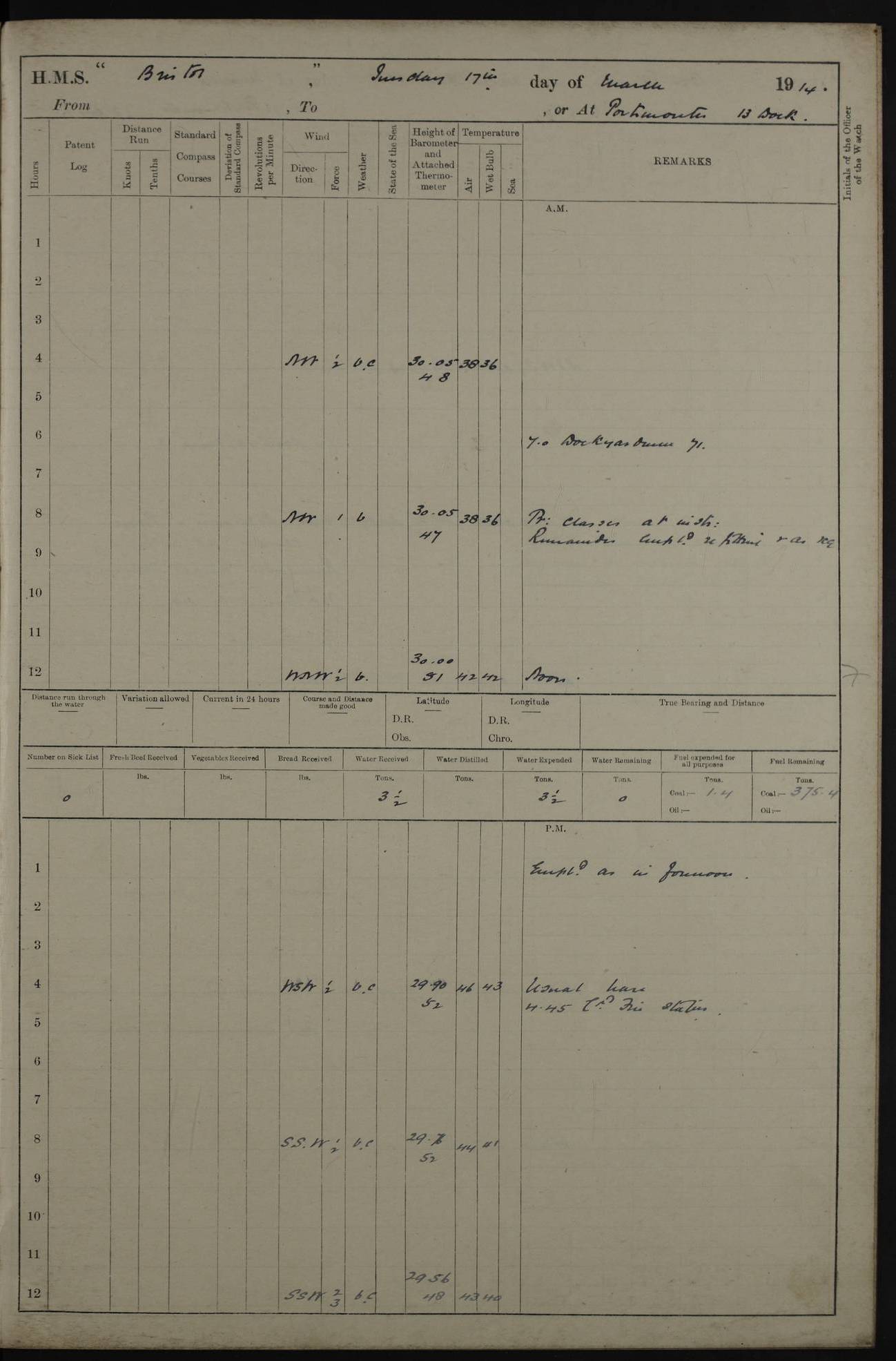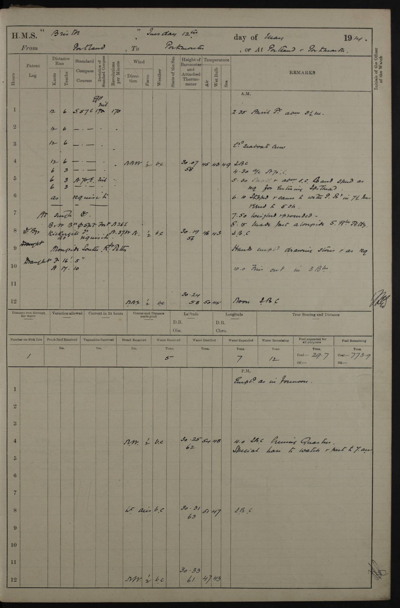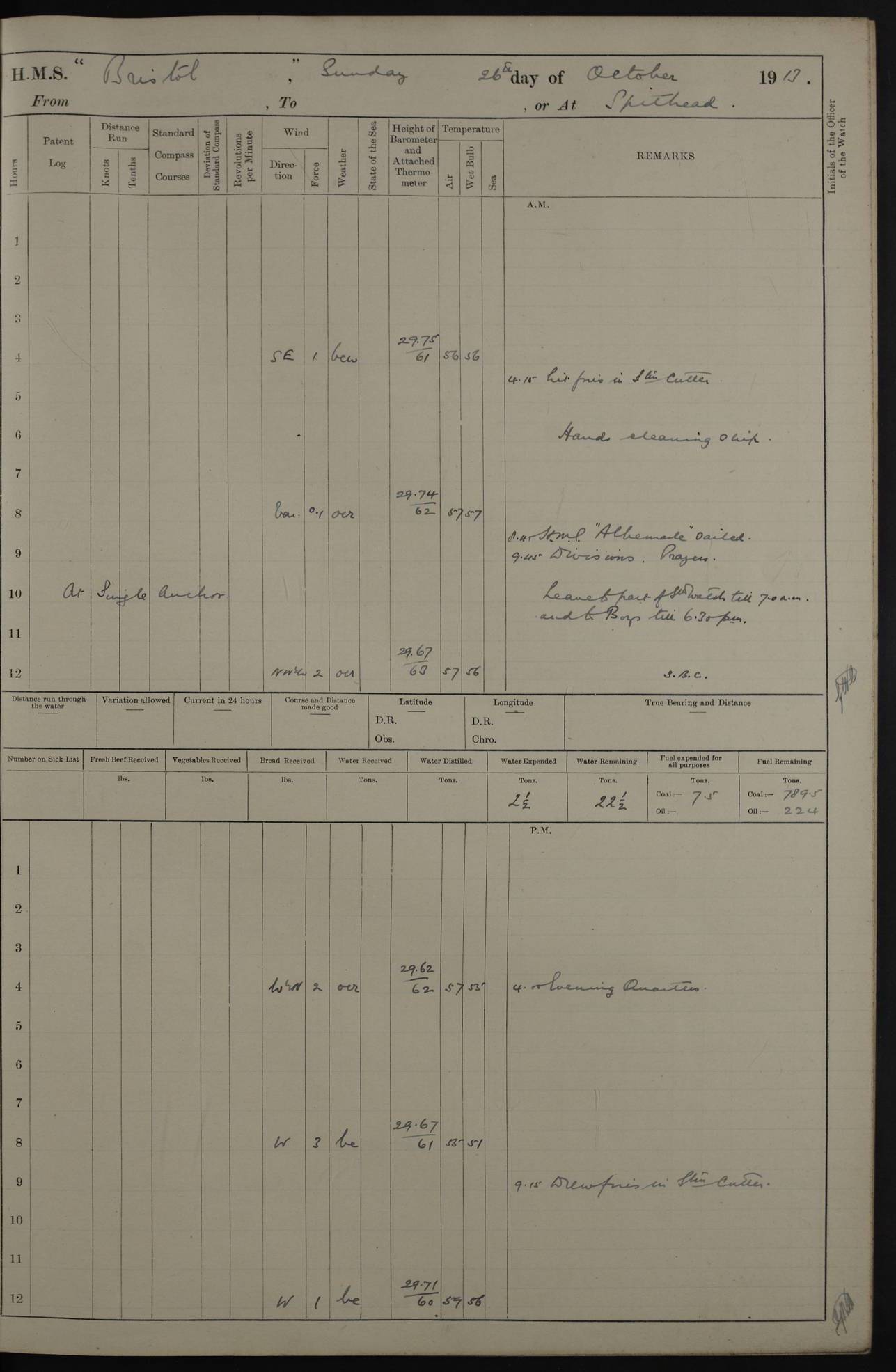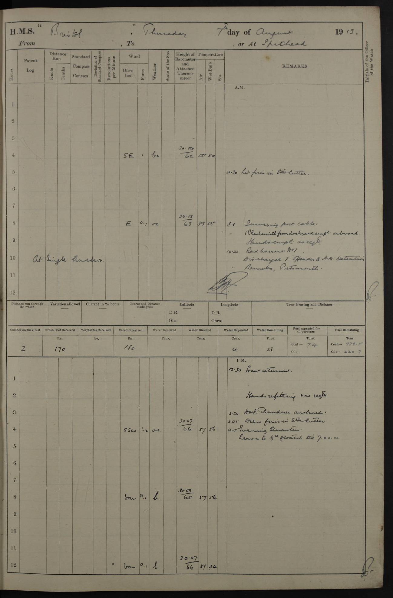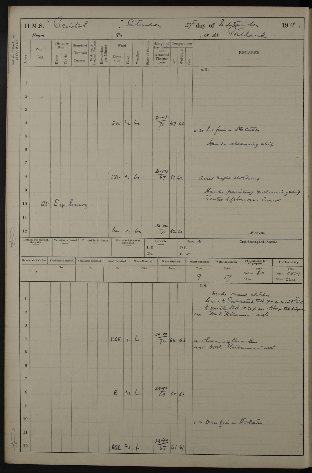 LOGS FOR JULY 1913 4ef4f40ee53e0a0c9100132d: (https://s3.amazonaws.com:443/oldweather/ADM53-36118/0006_0.jpg) 1 July 1913 Devonport Lat 50.38, Long -4.19 1 in sick list. 4.30am: Lit fires in Steam Cutter. Hands cleaning ship. 6.00am: Hands cleaning ship. 8.00am: Discharged ratings to ships in harbour. 9.00am: Recommissioned ship for service in 2nd Light Cruiser Squadron. 9.20am: Divisions. Hands cleaning ship. Dockyard parties drawing stores. 1.00pm: Hands drawing stores. Discharged 2 Privates RMLI to Barracks. 4.00pm: Leave to Watch till 7.00a.m. 9.00pm: 1 Sergeant RMLI joined ship. 10.15pm: Drew fires in Steam Cutter. 4ef4f40ee53e0a0c9100132e: (https://s3.amazonaws.com:443/oldweather/ADM53-36118/0006_1.jpg) 2 July 1913 Devonport Lat 50.38, Long -4.19 1 in sick list. 6.00am: Hands pumping water and as requisite. 9.00am: Dockyard parties drawing stores. Remainder of hands employed as requisite. 4ef4f40ee53e0a0c9100132f: (https://s3.amazonaws.com:443/oldweather/ADM53-36118/0007_0.jpg) 3 July 1913 Devonport Lat 50.38, Long -4.19 1 in sick list. 11.45am: Medical inspection of Ship's Company. 5.15pm: H.M.S. Defence arrived. 8.10pm: 1 Painter 2nd class joined ship. 4ef4f40ee53e0a0c91001330: (https://s3.amazonaws.com:443/oldweather/ADM53-36118/0007_1.jpg) 4 July 1913 Devonport Lat 50.38, Long -4.19 2 in sick list. 8.00am: Cleaned small arms. 12.45pm: Paid weekly money. 1.00pm: Lit fires in 1 Boiler. Hands securing boats for sea and as requisite. 4ef4f40ee53e0a0c91001331: (https://s3.amazonaws.com:443/oldweather/ADM53-36118/0008_0.jpg) 5 July 1913 Devonport to Plymouth Sound Lat 50.39, Long -4.14 2 on sick list. 6.45am: Landed escort. 8.30am: Escort and prisoner returned. 9.00am: Lit fires in 2 Boilers. Hands cleaning ship. Tested life buoys. Correct. 12.55pm: H.M. Tug Aetna towed stern to port. 1.00pm: Slipped and proceeded as requisite to Sound. 1.22pm: Stopped. 1.26pm: Came to with Starboard anchor, veered to 5 shackles in 6 fathoms. 2.15pm: Two ratings joined for passage to Portsmouth. 9.10pm: Sent boats to assist schooner aground on East end of Plymouth Breakwater (Owner W. Tugwell Esquire). Laid out small kedge and 4 1/2" grass. 4ef4f40ee53e0a0c91001332: (https://s3.amazonaws.com:443/oldweather/ADM53-36118/0008_1.jpg) 6 July 1913 Plymouth Lat 50.39, Long -4.14 2 on sick list. 5.45am: Schooner towed off by tug. 9.30am: Tug brought back kedge anchor. 10.00am: Divisions. Held Divine service onboard. 4ef4f40ee53e0a0c91001333: (https://s3.amazonaws.com:443/oldweather/ADM53-36118/0009_0.jpg) 7 July 1913 Plymouth to Spithead Lat 50.26, Long -3.26 1 on sick list. 8.50am: Weighed. 8.58am: Proceeded 170 revolutions. Course as requisite through West Entrance. 9.21am: Set Course SE. Mewstone: abeam. 9.30am: Mewstone: N10W. Revelstoke S87E. 10.21am: Altered course ESE. 10.57am: Altered course N87E. Prawle Point Bolt: N62 1/2W. Start Point: N10W. 3.50pm: Portland Bill: N65W. White Nose: N6W. 6.26pm: Needles Light House: abeam. Altered course as requisite up Needles Channel and to Spithead. 7.40pm: W. Ryde Middle: abeam to Starboard 4 cables. 8.07pm: Stopped. 8.10pm: Came to with Port anchor in 6 fathoms, veered to 5 shackles. Prepared for coaling. 4ef4f40ee53e0a0c91001334: (https://s3.amazonaws.com:443/oldweather/ADM53-36118/0009_1.jpg) 8 July 1913 Spithead to Portsmouth Harbour Lat 50.81, Long -1.11 1 on sick list. 7.39am: Embarked Pilot, weighed and proceeded as requisite 10 knots. 8.00am: Slow both. H.M. Tug "Malta" made fast alongside port side. 8.13am: Stopped. 8.20am: Made fast alongside "C1". 9.21am: Commenced coaling. 10.45am: Discharged 1 Able Seaman to H.M.A.S. "Sydney". 1.30pm: Discharged 1 Stoker to RN Barracks. 1 Leading Seaman and 1 Able Seaman joined from H.M.S. "Excellent". 2.45pm: 20 Ordinary Seamen joined from barracks. 4.20pm: 1 Ordinary Seaman joined from H.M.S. "Vernon". 6.30pm: Stopped coaling. 4ef4f40ee53e0a0c91001335: (https://s3.amazonaws.com:443/oldweather/ADM53-36118/0010_0.jpg) 9 July 1913 Portsmouth Lat 50.81, Long -1.11 Nil on sick list. 7,0am: Hands coaling ship. 2.30pm: Finished coaling. Received 527.0 tons. 3.30pm: 40 Stokers 2nd Class and 1 Ships Steward Assistant joined. 6.00pm: 7 Leading Stokers and 24 Stokers 1st class joined ship. 4ef4f40fe53e0a0c91001336: (https://s3.amazonaws.com:443/oldweather/ADM53-36118/0010_1.jpg) 10 July 1913 Portsmouth to Spithead Lat 50.75, Long -1.13 1 on sick list. 7.45am: H.M. Tugs "Enterprise" & "Malta" took ship in tow and transported her to mid stream. 8.08am: Proceeded 1/2 speed 130 revolutions out of harbour and as requisite to Spithead. 8.33am: Stopped. 8.35am: Came to with Port anchor in 6 fathoms, veered to 5 shackles. 4.00pm: Evening Quarters. Spread Quarter Deck awning. Leave to Watch till 7.00am. 1 Stoker Petty Officer and 1 Leading Stoker joined ship. 4ef4f40fe53e0a0c91001337: (https://s3.amazonaws.com:443/oldweather/ADM53-36118/0011_0.jpg) 11 July 1913 Spithead Lat 50.75, Long -1.13 1 on sick list. 12.45pm: Paid weekly money. 3.00pm: 4 Engine Room Artificers joined ship. 4.15pm: H.M.S. "Minerva " arrived. Leave to Watch till 7.00a.m. 1 Chief Stoker and 2 Leading Stokers joined. 4ef4f40fe53e0a0c91001338: (https://s3.amazonaws.com:443/oldweather/ADM53-36118/0011_1.jpg) 12 July 1913 Spithead Lat 50.75, Long -1.13 1 on sick list. 1.30pm: Leave to Watch till 7.00a.m. Monday. Youths till 10.00pm. and to boys till 6.45 pm. Make and mend clothes. 3.30pm: 10 Stoker Petty Officers joined ship. 6.00pm: Hands bathed. 4ef4f40fe53e0a0c91001339: (https://s3.amazonaws.com:443/oldweather/ADM53-36118/0012_0.jpg) 13 July 1913 Spithead Lat 50.75, Long -1.13 1 on sick list. 7.20am: H.M.S. "Blonde" arrived. 9.40am: Divisions. Held Divine Service. 1.00pm: H.M.S. "Enchantress" sailed. 7.35pm: H.M.S. "Liverpool" arrived. 4ef4f40fe53e0a0c9100133a: (https://s3.amazonaws.com:443/oldweather/ADM53-36118/0012_1.jpg) 4ef4f40fe53e0a0c9100133b: (https://s3.amazonaws.com:443/oldweather/ADM53-36118/0013_0.jpg) 4ef4f40fe53e0a0c9100133c: (https://s3.amazonaws.c
