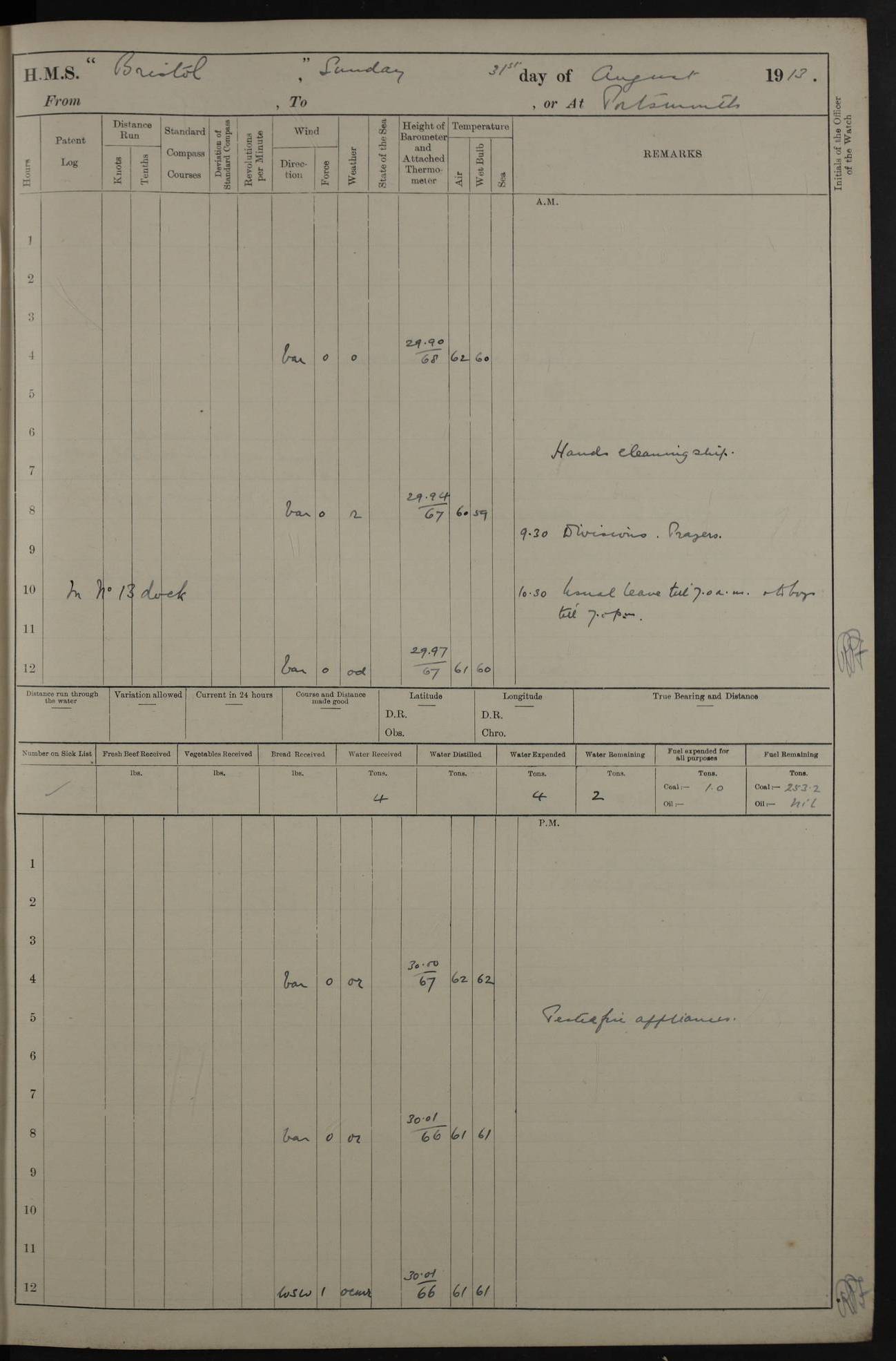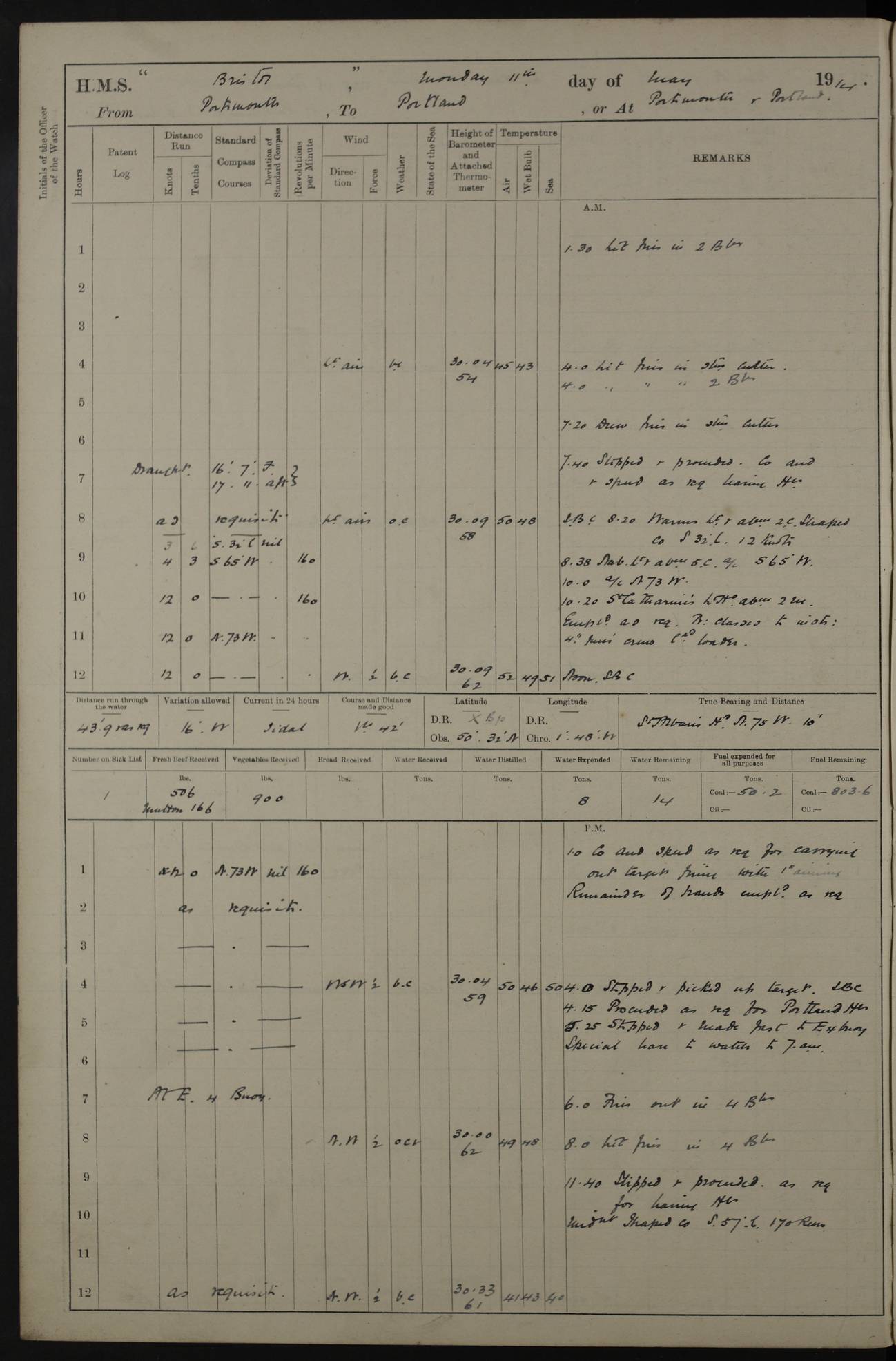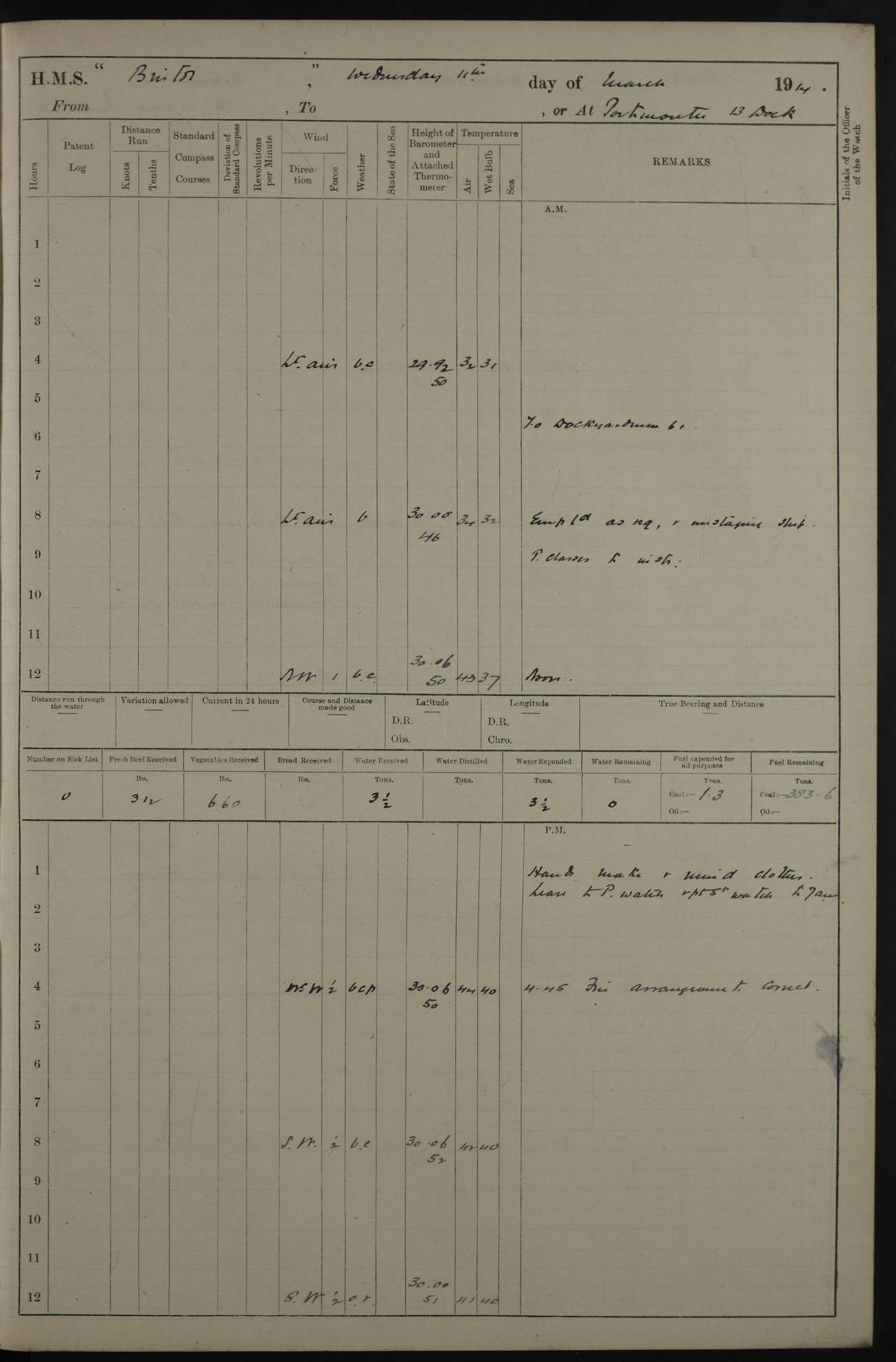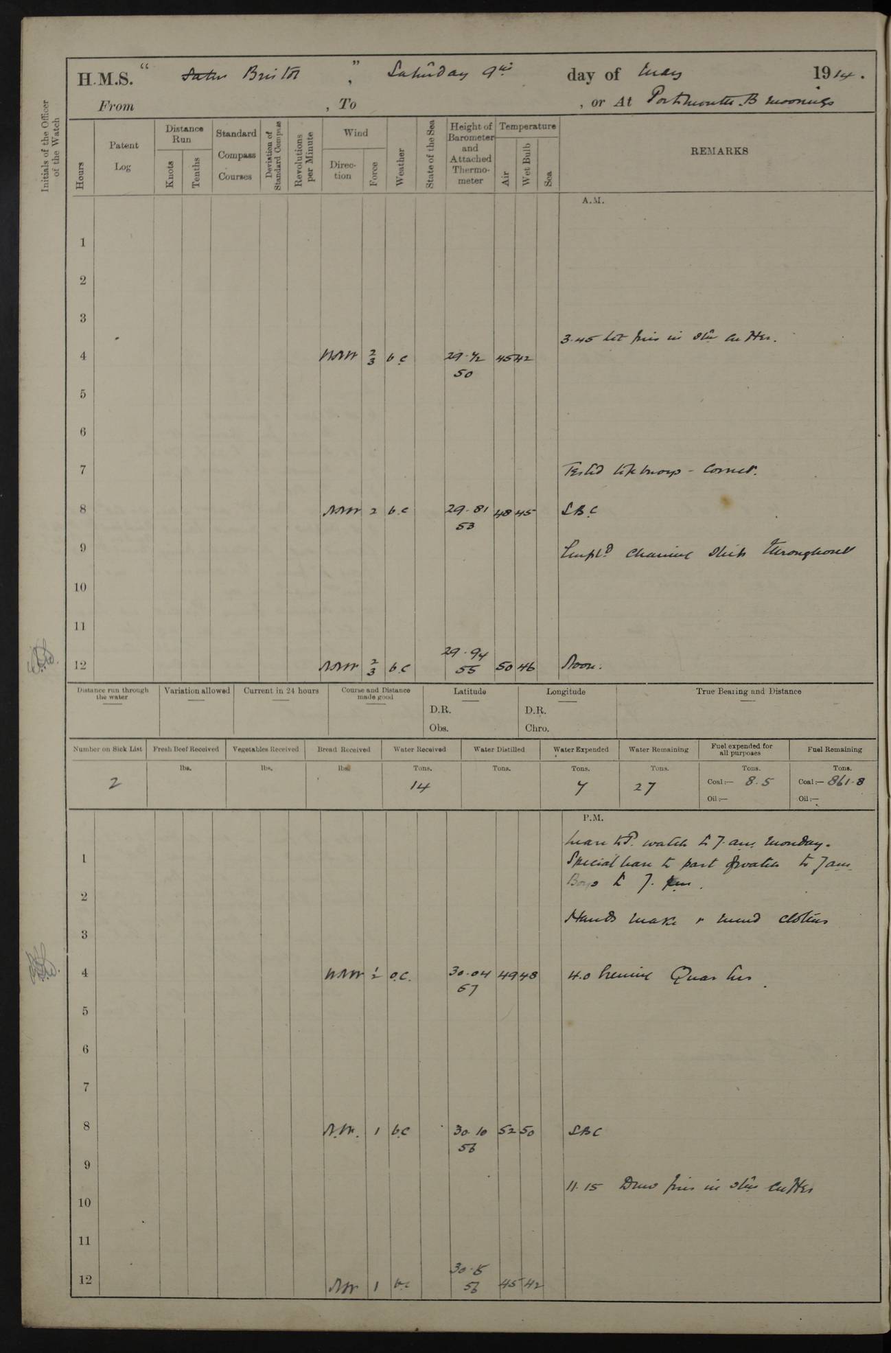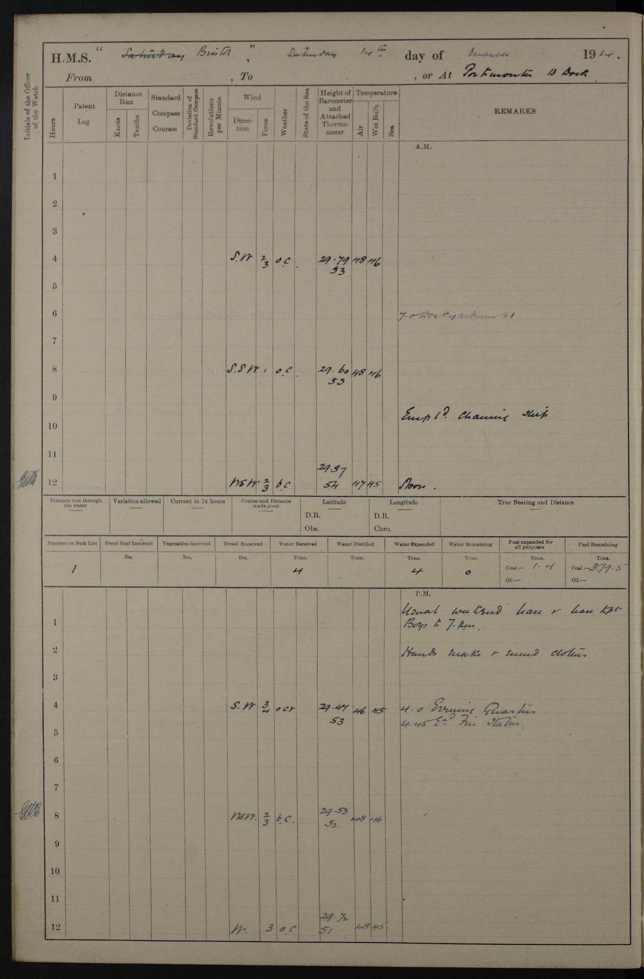 LOGS FOR JULY 1913 4ef4f40ee53e0a0c9100132d: (https://s3.amazonaws.com:443/oldweather/ADM53-36118/0006_0.jpg) 1 July 1913 Devonport Lat 50.38, Long -4.19 1 in sick list. 4.30am: Lit fires in Steam Cutter. Hands cleaning ship. 6.00am: Hands cleaning ship. 8.00am: Discharged ratings to ships in harbour. 9.00am: Recommissioned ship for service in 2nd Light Cruiser Squadron. 9.20am: Divisions. Hands cleaning ship. Dockyard parties drawing stores. 1.00pm: Hands drawing stores. Discharged 2 Privates RMLI to Barracks. 4.00pm: Leave to Watch till 7.00a.m. 9.00pm: 1 Sergeant RMLI joined ship. 10.15pm: Drew fires in Steam Cutter. 4ef4f40ee53e0a0c9100132e: (https://s3.amazonaws.com:443/oldweather/ADM53-36118/0006_1.jpg) 2 July 1913 Devonport Lat 50.38, Long -4.19 1 in sick list. 6.00am: Hands pumping water and as requisite. 9.00am: Dockyard parties drawing stores. Remainder of hands employed as requisite. 4ef4f40ee53e0a0c9100132f: (https://s3.amazonaws.com:443/oldweather/ADM53-36118/0007_0.jpg) 3 July 1913 Devonport Lat 50.38, Long -4.19 1 in sick list. 11.45am: Medical inspection of Ship's Company. 5.15pm: H.M.S. Defence arrived. 8.10pm: 1 Painter 2nd class joined ship. 4ef4f40ee53e0a0c91001330: (https://s3.amazonaws.com:443/oldweather/ADM53-36118/0007_1.jpg) 4 July 1913 Devonport Lat 50.38, Long -4.19 2 in sick list. 8.00am: Cleaned small arms. 12.45pm: Paid weekly money. 1.00pm: Lit fires in 1 Boiler. Hands securing boats for sea and as requisite. 4ef4f40ee53e0a0c91001331: (https://s3.amazonaws.com:443/oldweather/ADM53-36118/0008_0.jpg) 5 July 1913 Devonport to Plymouth Sound Lat 50.39, Long -4.14 2 on sick list. 6.45am: Landed escort. 8.30am: Escort and prisoner returned. 9.00am: Lit fires in 2 Boilers. Hands cleaning ship. Tested life buoys. Correct. 12.55pm: H.M. Tug Aetna towed stern to port. 1.00pm: Slipped and proceeded as requisite to Sound. 1.22pm: Stopped. 1.26pm: Came to with Starboard anchor, veered to 5 shackles in 6 fathoms. 2.15pm: Two ratings joined for passage to Portsmouth. 9.10pm: Sent boats to assist schooner aground on East end of Plymouth Breakwater (Owner W. Tugwell Esquire). Laid out small kedge and 4 1/2" grass. 4ef4f40ee53e0a0c91001332: (https://s3.amazonaws.com:443/oldweather/ADM53-36118/0008_1.jpg) 6 July 1913 Plymouth Lat 50.39, Long -4.14 2 on sick list. 5.45am: Schooner towed off by tug. 9.30am: Tug brought back kedge anchor. 10.00am: Divisions. Held Divine service onboard. 4ef4f40ee53e0a0c91001333: (https://s3.amazonaws.com:443/oldweather/ADM53-36118/0009_0.jpg) 7 July 1913 Plymouth to Spithead Lat 50.26, Long -3.26 1 on sick list. 8.50am: Weighed. 8.58am: Proceeded 170 revolutions. Course as requisite through West Entrance. 9.21am: Set Course SE. Mewstone: abeam. 9.30am: Mewstone: N10W. Revelstoke S87E. 10.21am: Altered course ESE. 10.57am: Altered course N87E. Prawle Point Bolt: N62 1/2W. Start Point: N10W. 3.50pm: Portland Bill: N65W. White Nose: N6W. 6.26pm: Needles Light House: abeam. Altered course as requisite up Needles Channel and to Spithead. 7.40pm: W. Ryde Middle: abeam to Starboard 4 cables. 8.07pm: Stopped. 8.10pm: Came to with Port anchor in 6 fathoms, veered to 5 shackles. Prepared for coaling. 4ef4f40ee53e0a0c91001334: (https://s3.amazonaws.com:443/oldweather/ADM53-36118/0009_1.jpg) 8 July 1913 Spithead to Portsmouth Harbour Lat 50.81, Long -1.11 1 on sick list. 7.39am: Embarked Pilot, weighed and proceeded as requisite 10 knots. 8.00am: Slow both. H.M. Tug "Malta" made fast alongside port side. 8.13am: Stopped. 8.20am: Made fast alongside "C1". 9.21am: Commenced coaling. 10.45am: Discharged 1 Able Seaman to H.M.A.S. "Sydney". 1.30pm: Discharged 1 Stoker to RN Barracks. 1 Leading Seaman and 1 Able Seaman joined from H.M.S. "Excellent". 2.45pm: 20 Ordinary Seamen joined from barracks. 4.20pm: 1 Ordinary Seaman joined from H.M.S. "Vernon". 6.30pm: Stopped coaling. 4ef4f40ee53e0a0c91001335: (https://s3.amazonaws.com:443/oldweather/ADM53-36118/0010_0.jpg) 9 July 1913 Portsmouth Lat 50.81, Long -1.11 Nil on sick list. 7,0am: Hands coaling ship. 2.30pm: Finished coaling. Received 527.0 tons. 3.30pm: 40 Stokers 2nd Class and 1 Ships Steward Assistant joined. 6.00pm: 7 Leading Stokers and 24 Stokers 1st class joined ship. 4ef4f40fe53e0a0c91001336: (https://s3.amazonaws.com:443/oldweather/ADM53-36118/0010_1.jpg) 10 July 1913 Portsmouth to Spithead Lat 50.75, Long -1.13 1 on sick list. 7.45am: H.M. Tugs "Enterprise" & "Malta" took ship in tow and transported her to mid stream. 8.08am: Proceeded 1/2 speed 130 revolutions out of harbour and as requisite to Spithead. 8.33am: Stopped. 8.35am: Came to with Port anchor in 6 fathoms, veered to 5 shackles. 4.00pm: Evening Quarters. Spread Quarter Deck awning. Leave to Watch till 7.00am. 1 Stoker Petty Officer and 1 Leading Stoker joined ship. 4ef4f40fe53e0a0c91001337: (https://s3.amazonaws.com:443/oldweather/ADM53-36118/0011_0.jpg) 11 July 1913 Spithead Lat 50.75, Long -1.13 1 on sick list. 12.45pm: Paid weekly money. 3.00pm: 4 Engine Room Artificers joined ship. 4.15pm: H.M.S. "Minerva " arrived. Leave to Watch till 7.00a.m. 1 Chief Stoker and 2 Leading Stokers joined. 4ef4f40fe53e0a0c91001338: (https://s3.amazonaws.com:443/oldweather/ADM53-36118/0011_1.jpg) 12 July 1913 Spithead Lat 50.75, Long -1.13 1 on sick list. 1.30pm: Leave to Watch till 7.00a.m. Monday. Youths till 10.00pm. and to boys till 6.45 pm. Make and mend clothes. 3.30pm: 10 Stoker Petty Officers joined ship. 6.00pm: Hands bathed. 4ef4f40fe53e0a0c91001339: (https://s3.amazonaws.com:443/oldweather/ADM53-36118/0012_0.jpg) 13 July 1913 Spithead Lat 50.75, Long -1.13 1 on sick list. 7.20am: H.M.S. "Blonde" arrived. 9.40am: Divisions. Held Divine Service. 1.00pm: H.M.S. "Enchantress" sailed. 7.35pm: H.M.S. "Liverpool" arrived. 4ef4f40fe53e0a0c9100133a: (https://s3.amazonaws.com:443/oldweather/ADM53-36118/0012_1.jpg) 4ef4f40fe53e0a0c9100133b: (https://s3.amazonaws.com:443/oldweather/ADM53-36118/0013_0.jpg) 4ef4f40fe53e0a0c9100133c: (https://s3.amazonaws.c