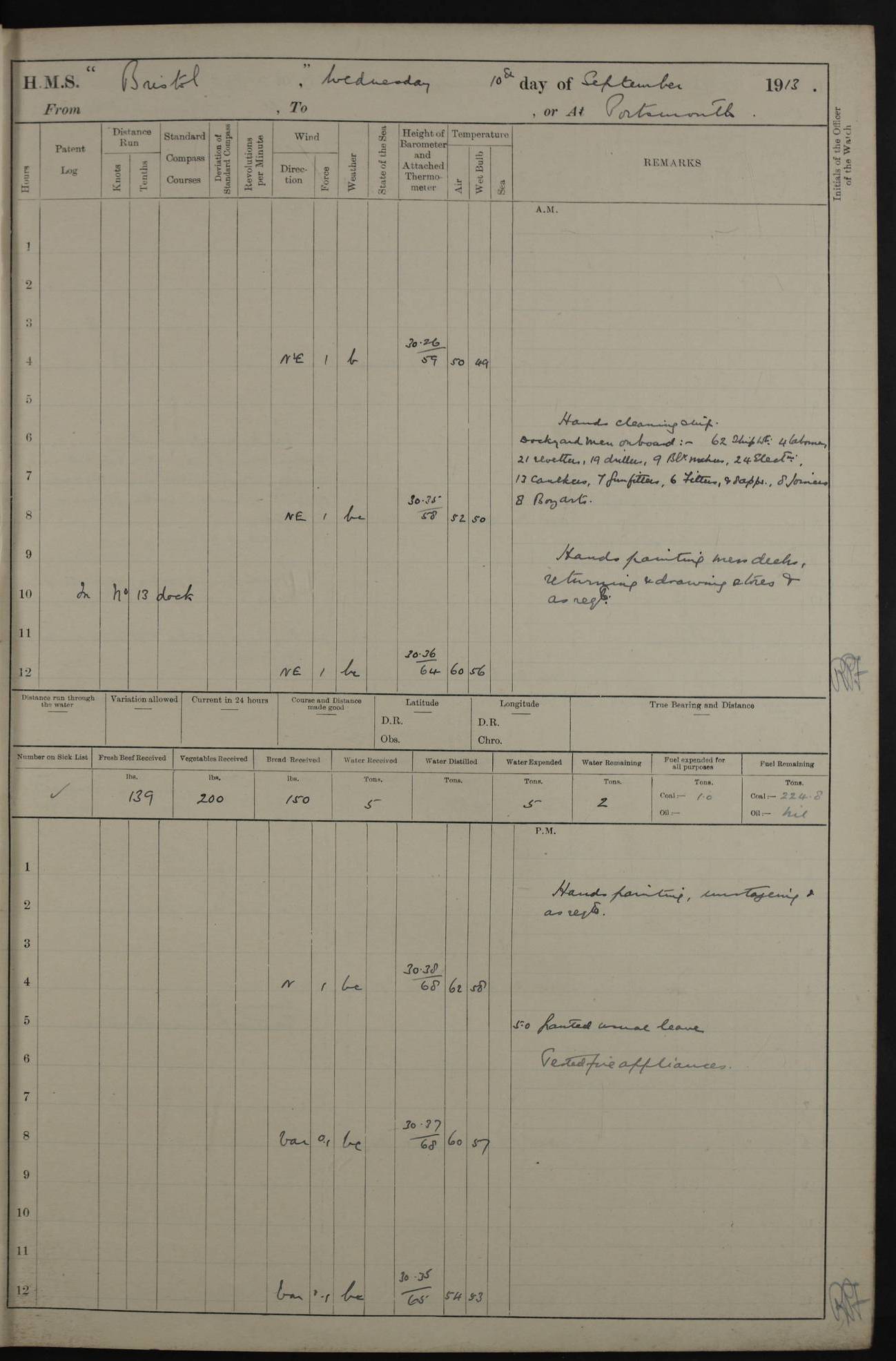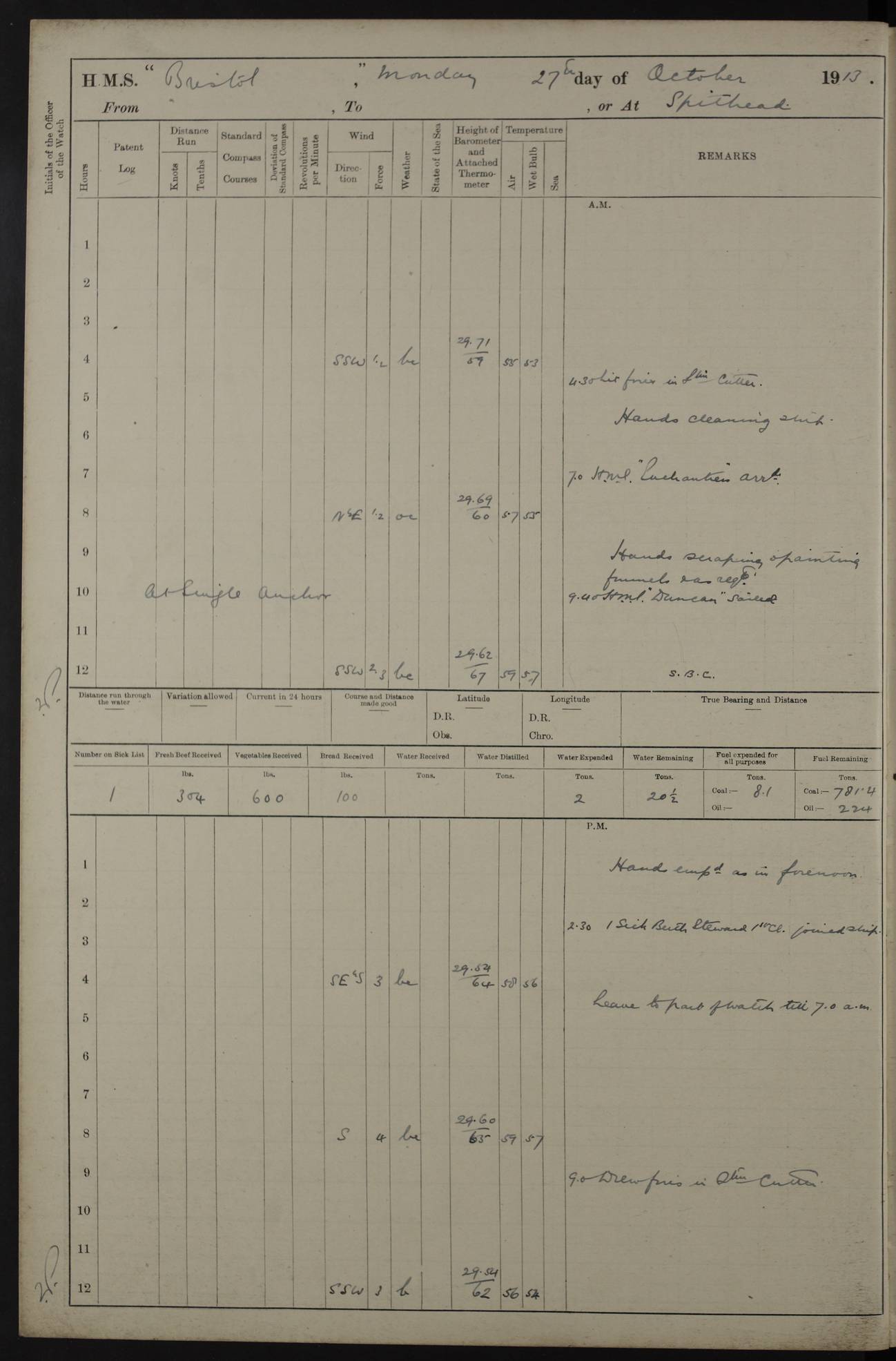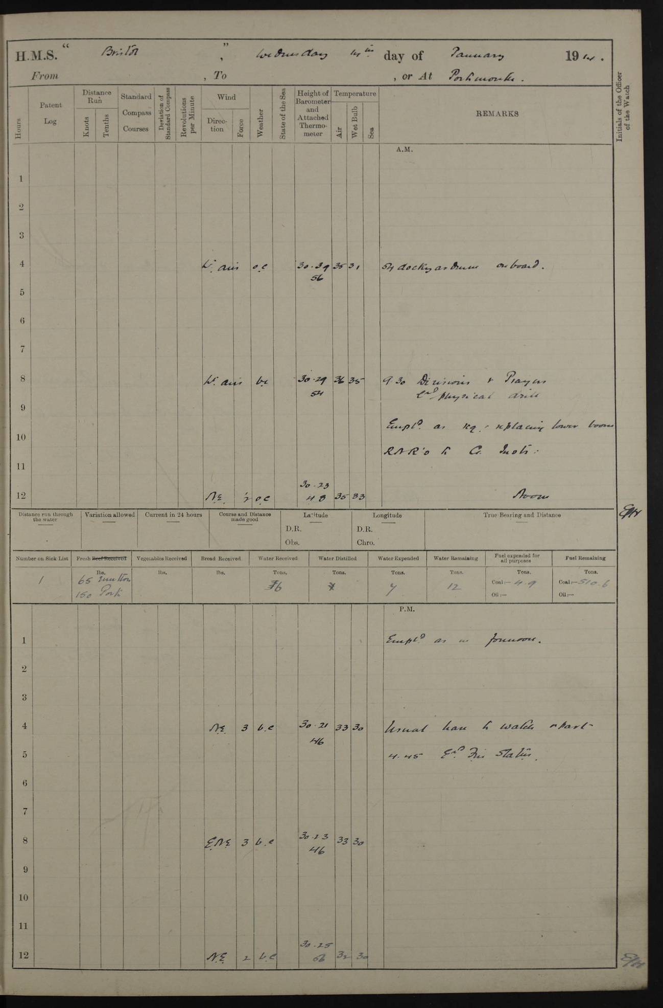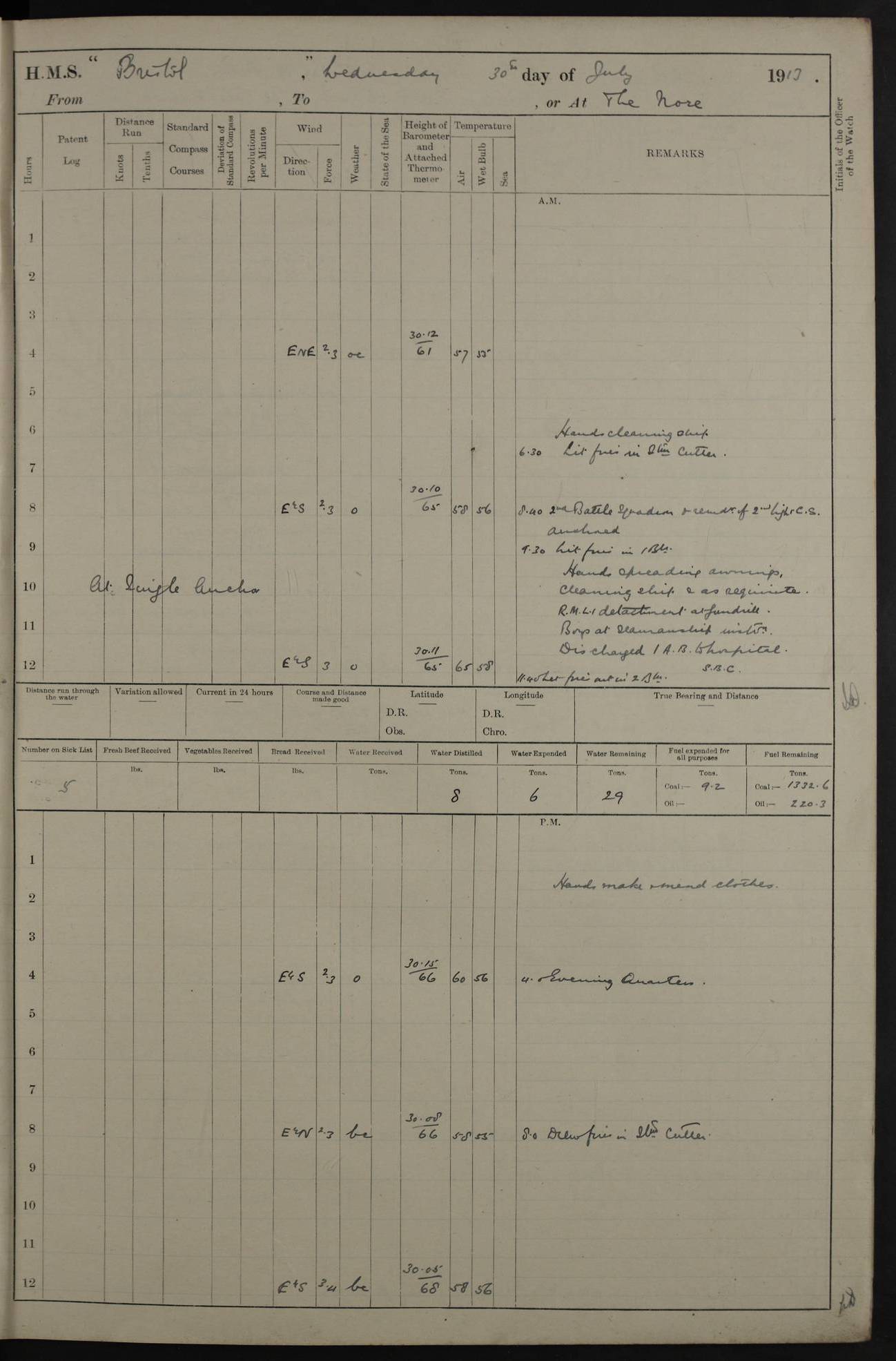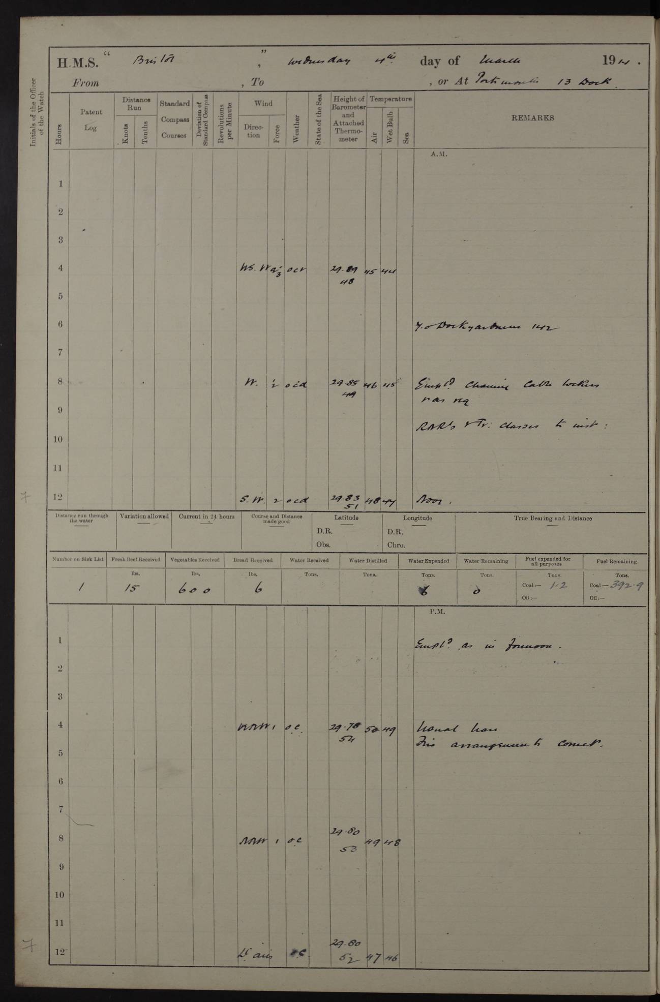 LOGS FOR JULY 1913 4ef4f40ee53e0a0c9100132d: (https://s3.amazonaws.com:443/oldweather/ADM53-36118/0006_0.jpg) 1 July 1913 Devonport Lat 50.38, Long -4.19 1 in sick list. 4.30am: Lit fires in Steam Cutter. Hands cleaning ship. 6.00am: Hands cleaning ship. 8.00am: Discharged ratings to ships in harbour. 9.00am: Recommissioned ship for service in 2nd Light Cruiser Squadron. 9.20am: Divisions. Hands cleaning ship. Dockyard parties drawing stores. 1.00pm: Hands drawing stores. Discharged 2 Privates RMLI to Barracks. 4.00pm: Leave to Watch till 7.00a.m. 9.00pm: 1 Sergeant RMLI joined ship. 10.15pm: Drew fires in Steam Cutter. 4ef4f40ee53e0a0c9100132e: (https://s3.amazonaws.com:443/oldweather/ADM53-36118/0006_1.jpg) 2 July 1913 Devonport Lat 50.38, Long -4.19 1 in sick list. 6.00am: Hands pumping water and as requisite. 9.00am: Dockyard parties drawing stores. Remainder of hands employed as requisite. 4ef4f40ee53e0a0c9100132f: (https://s3.amazonaws.com:443/oldweather/ADM53-36118/0007_0.jpg) 3 July 1913 Devonport Lat 50.38, Long -4.19 1 in sick list. 11.45am: Medical inspection of Ship's Company. 5.15pm: H.M.S. Defence arrived. 8.10pm: 1 Painter 2nd class joined ship. 4ef4f40ee53e0a0c91001330: (https://s3.amazonaws.com:443/oldweather/ADM53-36118/0007_1.jpg) 4 July 1913 Devonport Lat 50.38, Long -4.19 2 in sick list. 8.00am: Cleaned small arms. 12.45pm: Paid weekly money. 1.00pm: Lit fires in 1 Boiler. Hands securing boats for sea and as requisite. 4ef4f40ee53e0a0c91001331: (https://s3.amazonaws.com:443/oldweather/ADM53-36118/0008_0.jpg) 5 July 1913 Devonport to Plymouth Sound Lat 50.39, Long -4.14 2 on sick list. 6.45am: Landed escort. 8.30am: Escort and prisoner returned. 9.00am: Lit fires in 2 Boilers. Hands cleaning ship. Tested life buoys. Correct. 12.55pm: H.M. Tug Aetna towed stern to port. 1.00pm: Slipped and proceeded as requisite to Sound. 1.22pm: Stopped. 1.26pm: Came to with Starboard anchor, veered to 5 shackles in 6 fathoms. 2.15pm: Two ratings joined for passage to Portsmouth. 9.10pm: Sent boats to assist schooner aground on East end of Plymouth Breakwater (Owner W. Tugwell Esquire). Laid out small kedge and 4 1/2" grass. 4ef4f40ee53e0a0c91001332: (https://s3.amazonaws.com:443/oldweather/ADM53-36118/0008_1.jpg) 6 July 1913 Plymouth Lat 50.39, Long -4.14 2 on sick list. 5.45am: Schooner towed off by tug. 9.30am: Tug brought back kedge anchor. 10.00am: Divisions. Held Divine service onboard. 4ef4f40ee53e0a0c91001333: (https://s3.amazonaws.com:443/oldweather/ADM53-36118/0009_0.jpg) 7 July 1913 Plymouth to Spithead Lat 50.26, Long -3.26 1 on sick list. 8.50am: Weighed. 8.58am: Proceeded 170 revolutions. Course as requisite through West Entrance. 9.21am: Set Course SE. Mewstone: abeam. 9.30am: Mewstone: N10W. Revelstoke S87E. 10.21am: Altered course ESE. 10.57am: Altered course N87E. Prawle Point Bolt: N62 1/2W. Start Point: N10W. 3.50pm: Portland Bill: N65W. White Nose: N6W. 6.26pm: Needles Light House: abeam. Altered course as requisite up Needles Channel and to Spithead. 7.40pm: W. Ryde Middle: abeam to Starboard 4 cables. 8.07pm: Stopped. 8.10pm: Came to with Port anchor in 6 fathoms, veered to 5 shackles. Prepared for coaling. 4ef4f40ee53e0a0c91001334: (https://s3.amazonaws.com:443/oldweather/ADM53-36118/0009_1.jpg) 8 July 1913 Spithead to Portsmouth Harbour Lat 50.81, Long -1.11 1 on sick list. 7.39am: Embarked Pilot, weighed and proceeded as requisite 10 knots. 8.00am: Slow both. H.M. Tug "Malta" made fast alongside port side. 8.13am: Stopped. 8.20am: Made fast alongside "C1". 9.21am: Commenced coaling. 10.45am: Discharged 1 Able Seaman to H.M.A.S. "Sydney". 1.30pm: Discharged 1 Stoker to RN Barracks. 1 Leading Seaman and 1 Able Seaman joined from H.M.S. "Excellent". 2.45pm: 20 Ordinary Seamen joined from barracks. 4.20pm: 1 Ordinary Seaman joined from H.M.S. "Vernon". 6.30pm: Stopped coaling. 4ef4f40ee53e0a0c91001335: (https://s3.amazonaws.com:443/oldweather/ADM53-36118/0010_0.jpg) 9 July 1913 Portsmouth Lat 50.81, Long -1.11 Nil on sick list. 7,0am: Hands coaling ship. 2.30pm: Finished coaling. Received 527.0 tons. 3.30pm: 40 Stokers 2nd Class and 1 Ships Steward Assistant joined. 6.00pm: 7 Leading Stokers and 24 Stokers 1st class joined ship. 4ef4f40fe53e0a0c91001336: (https://s3.amazonaws.com:443/oldweather/ADM53-36118/0010_1.jpg) 10 July 1913 Portsmouth to Spithead Lat 50.75, Long -1.13 1 on sick list. 7.45am: H.M. Tugs "Enterprise" & "Malta" took ship in tow and transported her to mid stream. 8.08am: Proceeded 1/2 speed 130 revolutions out of harbour and as requisite to Spithead. 8.33am: Stopped. 8.35am: Came to with Port anchor in 6 fathoms, veered to 5 shackles. 4.00pm: Evening Quarters. Spread Quarter Deck awning. Leave to Watch till 7.00am. 1 Stoker Petty Officer and 1 Leading Stoker joined ship. 4ef4f40fe53e0a0c91001337: (https://s3.amazonaws.com:443/oldweather/ADM53-36118/0011_0.jpg) 11 July 1913 Spithead Lat 50.75, Long -1.13 1 on sick list. 12.45pm: Paid weekly money. 3.00pm: 4 Engine Room Artificers joined ship. 4.15pm: H.M.S. "Minerva " arrived. Leave to Watch till 7.00a.m. 1 Chief Stoker and 2 Leading Stokers joined. 4ef4f40fe53e0a0c91001338: (https://s3.amazonaws.com:443/oldweather/ADM53-36118/0011_1.jpg) 12 July 1913 Spithead Lat 50.75, Long -1.13 1 on sick list. 1.30pm: Leave to Watch till 7.00a.m. Monday. Youths till 10.00pm. and to boys till 6.45 pm. Make and mend clothes. 3.30pm: 10 Stoker Petty Officers joined ship. 6.00pm: Hands bathed. 4ef4f40fe53e0a0c91001339: (https://s3.amazonaws.com:443/oldweather/ADM53-36118/0012_0.jpg) 13 July 1913 Spithead Lat 50.75, Long -1.13 1 on sick list. 7.20am: H.M.S. "Blonde" arrived. 9.40am: Divisions. Held Divine Service. 1.00pm: H.M.S. "Enchantress" sailed. 7.35pm: H.M.S. "Liverpool" arrived. 4ef4f40fe53e0a0c9100133a: (https://s3.amazonaws.com:443/oldweather/ADM53-36118/0012_1.jpg) 4ef4f40fe53e0a0c9100133b: (https://s3.amazonaws.com:443/oldweather/ADM53-36118/0013_0.jpg) 4ef4f40fe53e0a0c9100133c: (https://s3.amazonaws.c