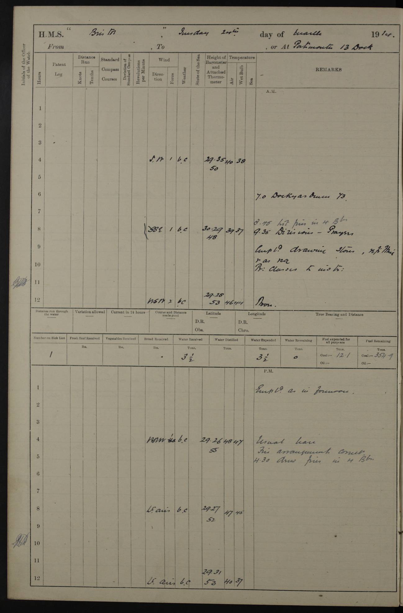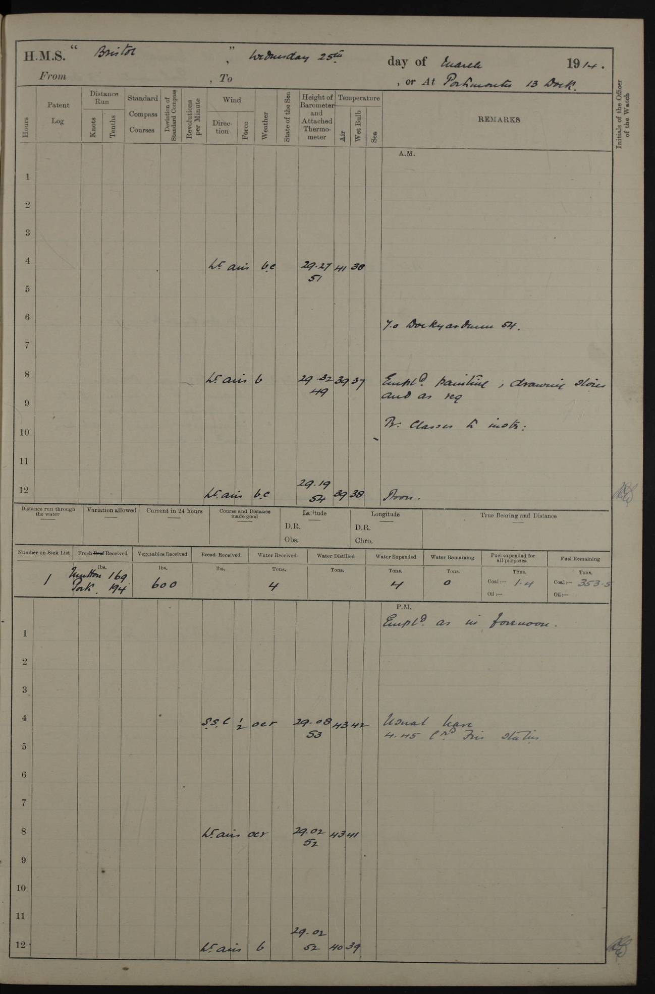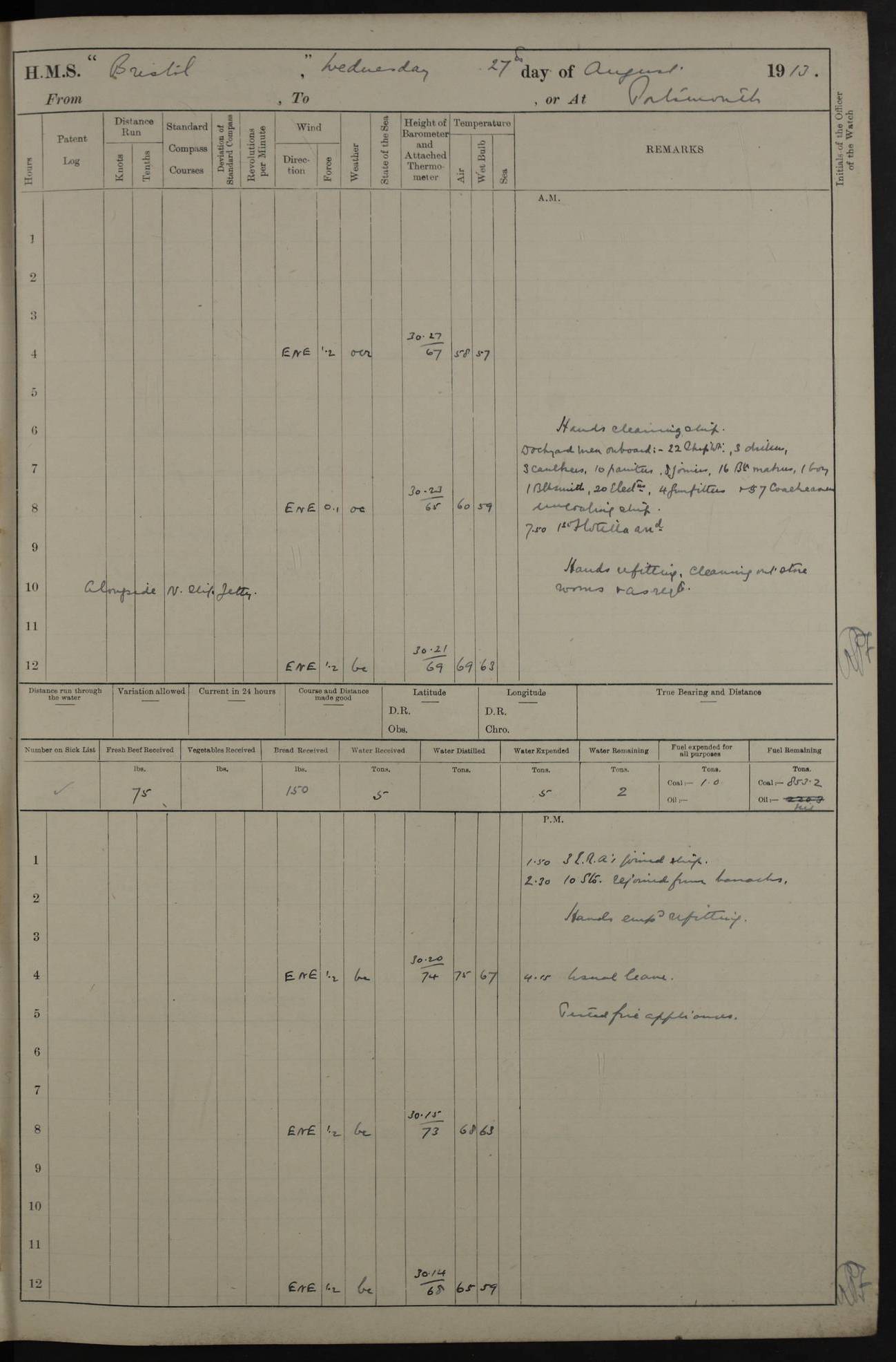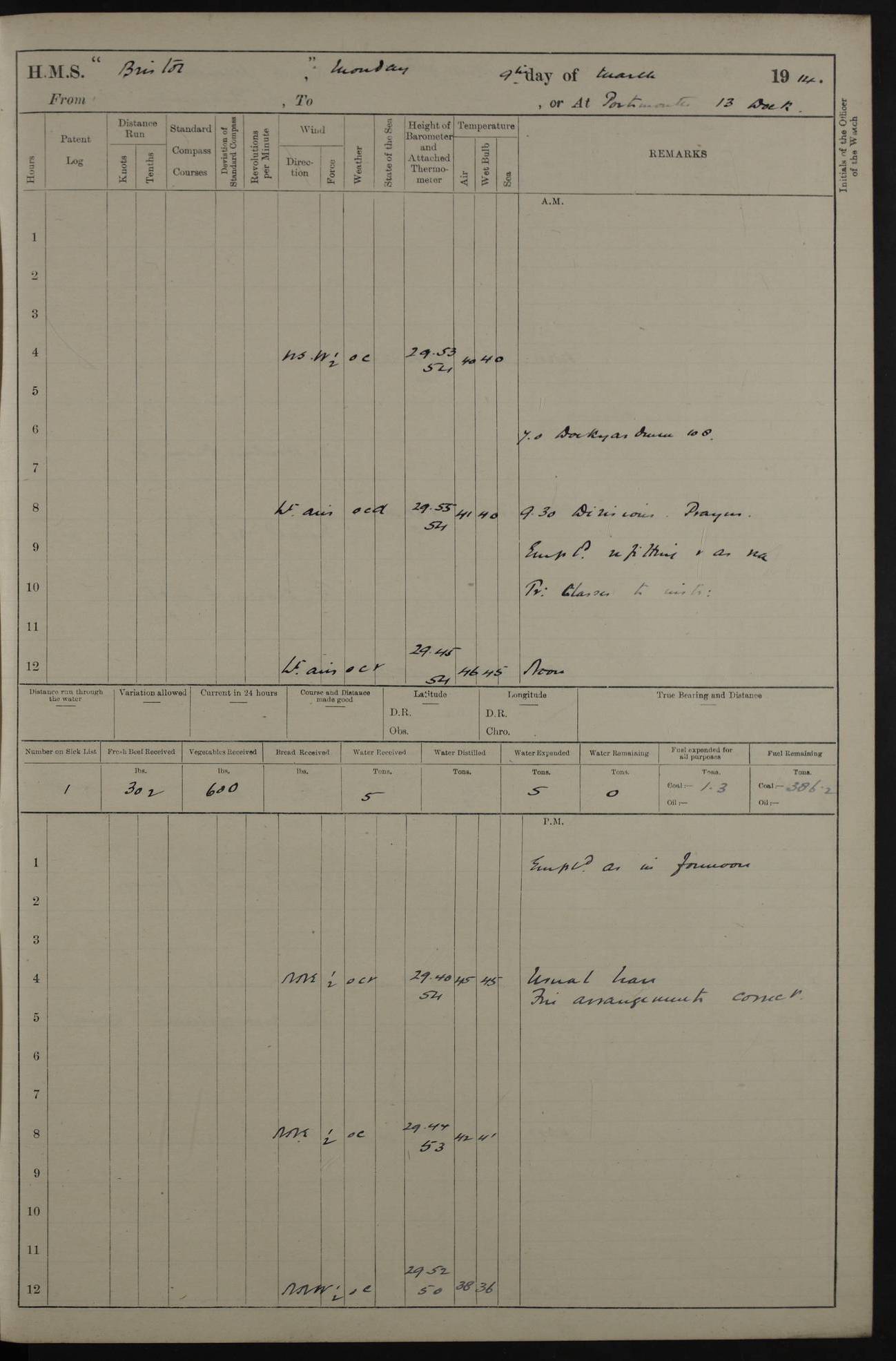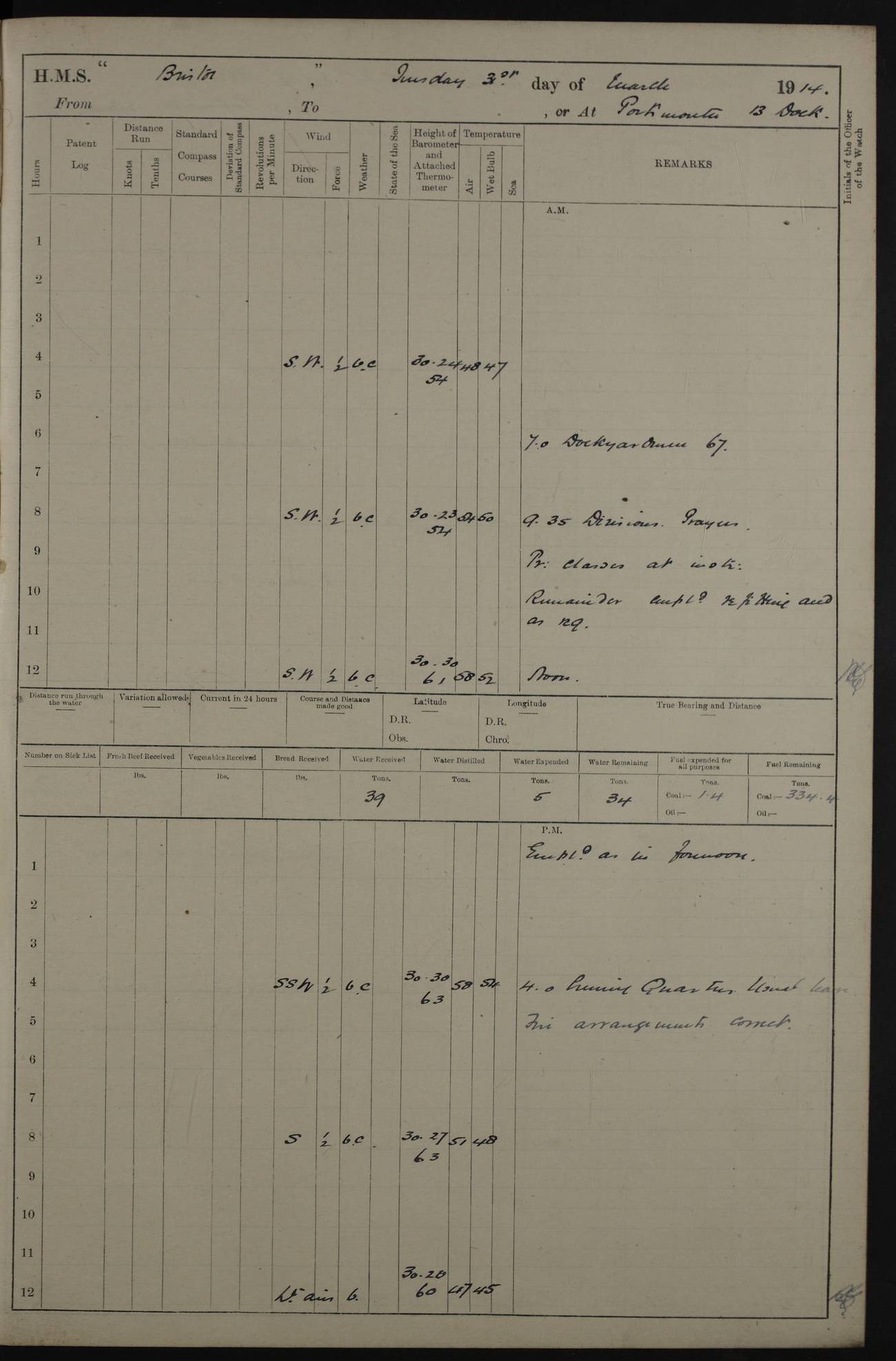 LOGS FOR JULY 1913 4ef4f40ee53e0a0c9100132d: (https://s3.amazonaws.com:443/oldweather/ADM53-36118/0006_0.jpg) 1 July 1913 Devonport Lat 50.38, Long -4.19 1 in sick list. 4.30am: Lit fires in Steam Cutter. Hands cleaning ship. 6.00am: Hands cleaning ship. 8.00am: Discharged ratings to ships in harbour. 9.00am: Recommissioned ship for service in 2nd Light Cruiser Squadron. 9.20am: Divisions. Hands cleaning ship. Dockyard parties drawing stores. 1.00pm: Hands drawing stores. Discharged 2 Privates RMLI to Barracks. 4.00pm: Leave to Watch till 7.00a.m. 9.00pm: 1 Sergeant RMLI joined ship. 10.15pm: Drew fires in Steam Cutter. 4ef4f40ee53e0a0c9100132e: (https://s3.amazonaws.com:443/oldweather/ADM53-36118/0006_1.jpg) 2 July 1913 Devonport Lat 50.38, Long -4.19 1 in sick list. 6.00am: Hands pumping water and as requisite. 9.00am: Dockyard parties drawing stores. Remainder of hands employed as requisite. 4ef4f40ee53e0a0c9100132f: (https://s3.amazonaws.com:443/oldweather/ADM53-36118/0007_0.jpg) 3 July 1913 Devonport Lat 50.38, Long -4.19 1 in sick list. 11.45am: Medical inspection of Ship's Company. 5.15pm: H.M.S. Defence arrived. 8.10pm: 1 Painter 2nd class joined ship. 4ef4f40ee53e0a0c91001330: (https://s3.amazonaws.com:443/oldweather/ADM53-36118/0007_1.jpg) 4 July 1913 Devonport Lat 50.38, Long -4.19 2 in sick list. 8.00am: Cleaned small arms. 12.45pm: Paid weekly money. 1.00pm: Lit fires in 1 Boiler. Hands securing boats for sea and as requisite. 4ef4f40ee53e0a0c91001331: (https://s3.amazonaws.com:443/oldweather/ADM53-36118/0008_0.jpg) 5 July 1913 Devonport to Plymouth Sound Lat 50.39, Long -4.14 2 on sick list. 6.45am: Landed escort. 8.30am: Escort and prisoner returned. 9.00am: Lit fires in 2 Boilers. Hands cleaning ship. Tested life buoys. Correct. 12.55pm: H.M. Tug Aetna towed stern to port. 1.00pm: Slipped and proceeded as requisite to Sound. 1.22pm: Stopped. 1.26pm: Came to with Starboard anchor, veered to 5 shackles in 6 fathoms. 2.15pm: Two ratings joined for passage to Portsmouth. 9.10pm: Sent boats to assist schooner aground on East end of Plymouth Breakwater (Owner W. Tugwell Esquire). Laid out small kedge and 4 1/2" grass. 4ef4f40ee53e0a0c91001332: (https://s3.amazonaws.com:443/oldweather/ADM53-36118/0008_1.jpg) 6 July 1913 Plymouth Lat 50.39, Long -4.14 2 on sick list. 5.45am: Schooner towed off by tug. 9.30am: Tug brought back kedge anchor. 10.00am: Divisions. Held Divine service onboard. 4ef4f40ee53e0a0c91001333: (https://s3.amazonaws.com:443/oldweather/ADM53-36118/0009_0.jpg) 7 July 1913 Plymouth to Spithead Lat 50.26, Long -3.26 1 on sick list. 8.50am: Weighed. 8.58am: Proceeded 170 revolutions. Course as requisite through West Entrance. 9.21am: Set Course SE. Mewstone: abeam. 9.30am: Mewstone: N10W. Revelstoke S87E. 10.21am: Altered course ESE. 10.57am: Altered course N87E. Prawle Point Bolt: N62 1/2W. Start Point: N10W. 3.50pm: Portland Bill: N65W. White Nose: N6W. 6.26pm: Needles Light House: abeam. Altered course as requisite up Needles Channel and to Spithead. 7.40pm: W. Ryde Middle: abeam to Starboard 4 cables. 8.07pm: Stopped. 8.10pm: Came to with Port anchor in 6 fathoms, veered to 5 shackles. Prepared for coaling. 4ef4f40ee53e0a0c91001334: (https://s3.amazonaws.com:443/oldweather/ADM53-36118/0009_1.jpg) 8 July 1913 Spithead to Portsmouth Harbour Lat 50.81, Long -1.11 1 on sick list. 7.39am: Embarked Pilot, weighed and proceeded as requisite 10 knots. 8.00am: Slow both. H.M. Tug "Malta" made fast alongside port side. 8.13am: Stopped. 8.20am: Made fast alongside "C1". 9.21am: Commenced coaling. 10.45am: Discharged 1 Able Seaman to H.M.A.S. "Sydney". 1.30pm: Discharged 1 Stoker to RN Barracks. 1 Leading Seaman and 1 Able Seaman joined from H.M.S. "Excellent". 2.45pm: 20 Ordinary Seamen joined from barracks. 4.20pm: 1 Ordinary Seaman joined from H.M.S. "Vernon". 6.30pm: Stopped coaling. 4ef4f40ee53e0a0c91001335: (https://s3.amazonaws.com:443/oldweather/ADM53-36118/0010_0.jpg) 9 July 1913 Portsmouth Lat 50.81, Long -1.11 Nil on sick list. 7,0am: Hands coaling ship. 2.30pm: Finished coaling. Received 527.0 tons. 3.30pm: 40 Stokers 2nd Class and 1 Ships Steward Assistant joined. 6.00pm: 7 Leading Stokers and 24 Stokers 1st class joined ship. 4ef4f40fe53e0a0c91001336: (https://s3.amazonaws.com:443/oldweather/ADM53-36118/0010_1.jpg) 10 July 1913 Portsmouth to Spithead Lat 50.75, Long -1.13 1 on sick list. 7.45am: H.M. Tugs "Enterprise" & "Malta" took ship in tow and transported her to mid stream. 8.08am: Proceeded 1/2 speed 130 revolutions out of harbour and as requisite to Spithead. 8.33am: Stopped. 8.35am: Came to with Port anchor in 6 fathoms, veered to 5 shackles. 4.00pm: Evening Quarters. Spread Quarter Deck awning. Leave to Watch till 7.00am. 1 Stoker Petty Officer and 1 Leading Stoker joined ship. 4ef4f40fe53e0a0c91001337: (https://s3.amazonaws.com:443/oldweather/ADM53-36118/0011_0.jpg) 11 July 1913 Spithead Lat 50.75, Long -1.13 1 on sick list. 12.45pm: Paid weekly money. 3.00pm: 4 Engine Room Artificers joined ship. 4.15pm: H.M.S. "Minerva " arrived. Leave to Watch till 7.00a.m. 1 Chief Stoker and 2 Leading Stokers joined. 4ef4f40fe53e0a0c91001338: (https://s3.amazonaws.com:443/oldweather/ADM53-36118/0011_1.jpg) 12 July 1913 Spithead Lat 50.75, Long -1.13 1 on sick list. 1.30pm: Leave to Watch till 7.00a.m. Monday. Youths till 10.00pm. and to boys till 6.45 pm. Make and mend clothes. 3.30pm: 10 Stoker Petty Officers joined ship. 6.00pm: Hands bathed. 4ef4f40fe53e0a0c91001339: (https://s3.amazonaws.com:443/oldweather/ADM53-36118/0012_0.jpg) 13 July 1913 Spithead Lat 50.75, Long -1.13 1 on sick list. 7.20am: H.M.S. "Blonde" arrived. 9.40am: Divisions. Held Divine Service. 1.00pm: H.M.S. "Enchantress" sailed. 7.35pm: H.M.S. "Liverpool" arrived. 4ef4f40fe53e0a0c9100133a: (https://s3.amazonaws.com:443/oldweather/ADM53-36118/0012_1.jpg) 4ef4f40fe53e0a0c9100133b: (https://s3.amazonaws.com:443/oldweather/ADM53-36118/0013_0.jpg) 4ef4f40fe53e0a0c9100133c: (https://s3.amazonaws.c