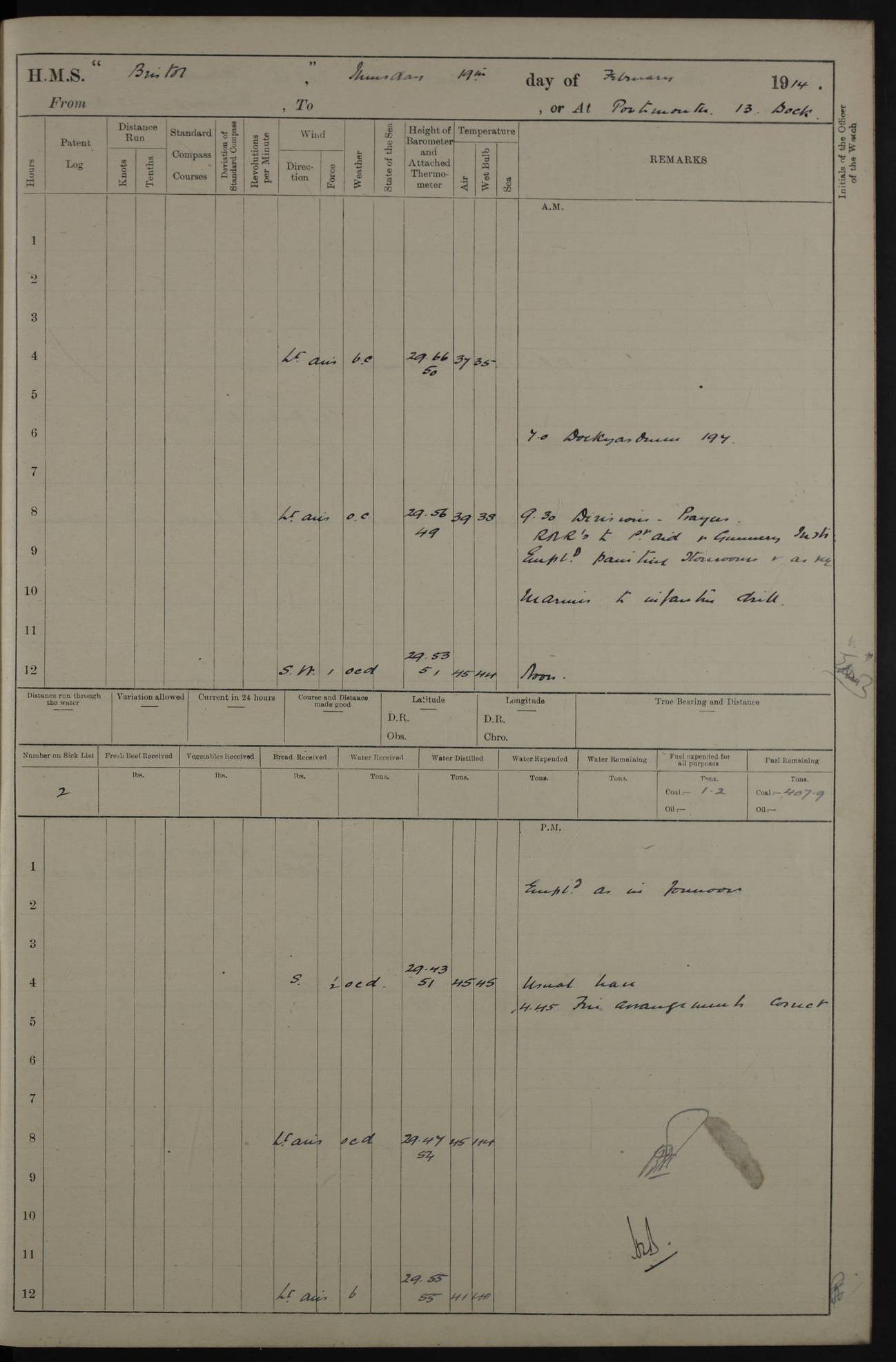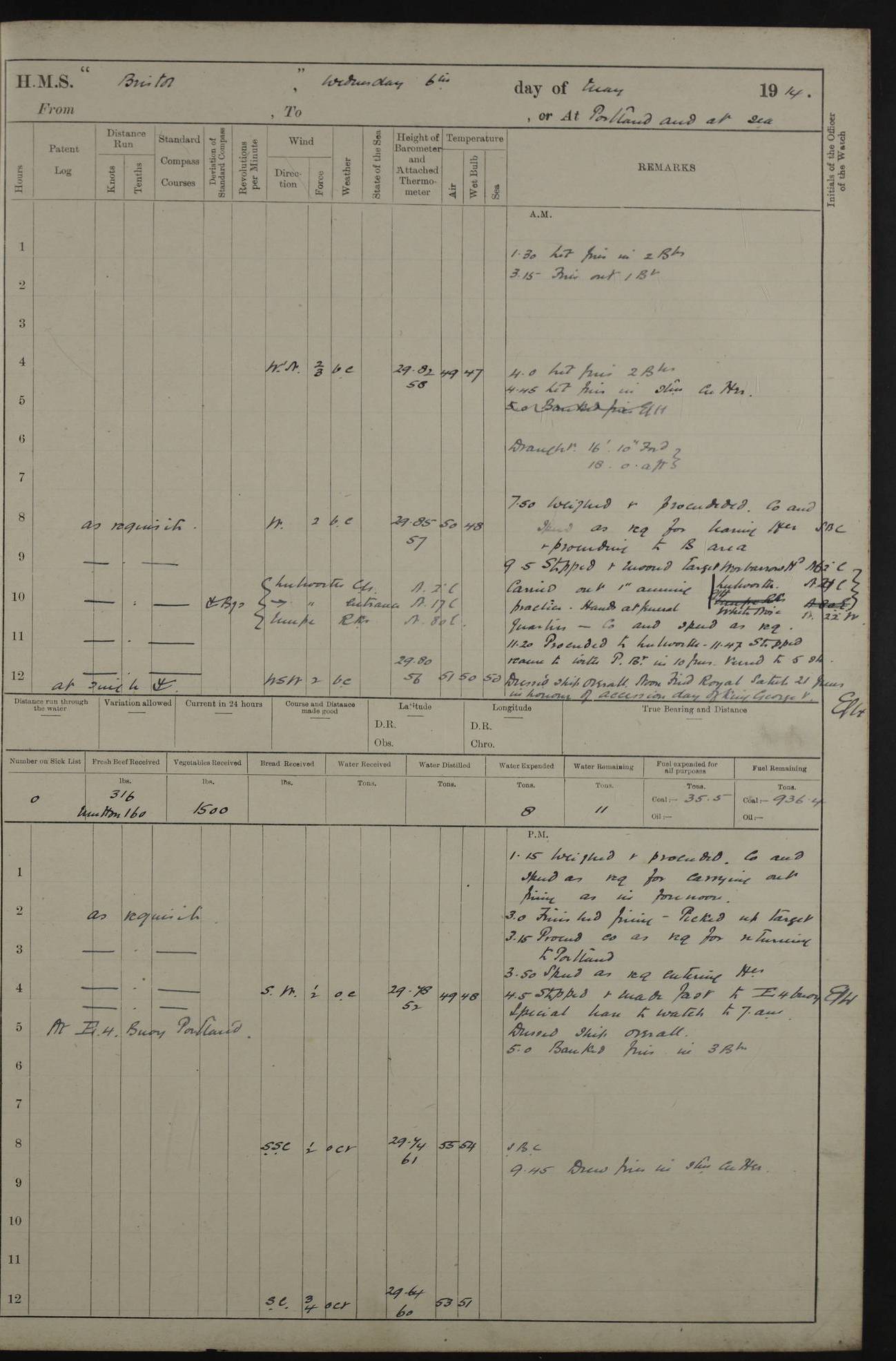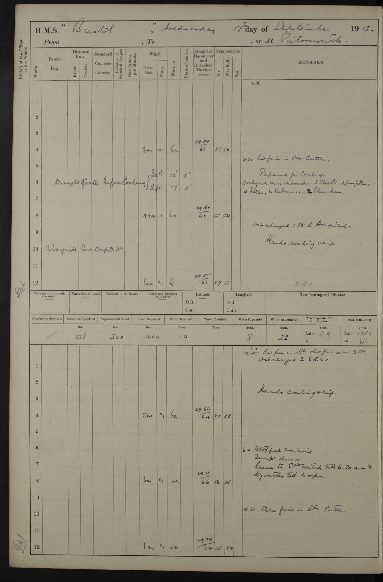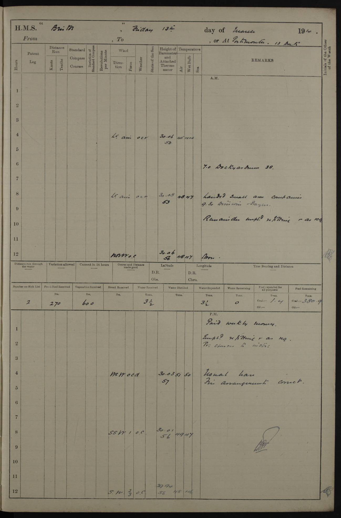 LOGS FOR JULY 1913 4ef4f40ee53e0a0c9100132d: (https://s3.amazonaws.com:443/oldweather/ADM53-36118/0006_0.jpg) 1 July 1913 Devonport Lat 50.38, Long -4.19 1 in sick list. 4.30am: Lit fires in Steam Cutter. Hands cleaning ship. 6.00am: Hands cleaning ship. 8.00am: Discharged ratings to ships in harbour. 9.00am: Recommissioned ship for service in 2nd Light Cruiser Squadron. 9.20am: Divisions. Hands cleaning ship. Dockyard parties drawing stores. 1.00pm: Hands drawing stores. Discharged 2 Privates RMLI to Barracks. 4.00pm: Leave to Watch till 7.00a.m. 9.00pm: 1 Sergeant RMLI joined ship. 10.15pm: Drew fires in Steam Cutter. 4ef4f40ee53e0a0c9100132e: (https://s3.amazonaws.com:443/oldweather/ADM53-36118/0006_1.jpg) 2 July 1913 Devonport Lat 50.38, Long -4.19 1 in sick list. 6.00am: Hands pumping water and as requisite. 9.00am: Dockyard parties drawing stores. Remainder of hands employed as requisite. 4ef4f40ee53e0a0c9100132f: (https://s3.amazonaws.com:443/oldweather/ADM53-36118/0007_0.jpg) 3 July 1913 Devonport Lat 50.38, Long -4.19 1 in sick list. 11.45am: Medical inspection of Ship's Company. 5.15pm: H.M.S. Defence arrived. 8.10pm: 1 Painter 2nd class joined ship. 4ef4f40ee53e0a0c91001330: (https://s3.amazonaws.com:443/oldweather/ADM53-36118/0007_1.jpg) 4 July 1913 Devonport Lat 50.38, Long -4.19 2 in sick list. 8.00am: Cleaned small arms. 12.45pm: Paid weekly money. 1.00pm: Lit fires in 1 Boiler. Hands securing boats for sea and as requisite. 4ef4f40ee53e0a0c91001331: (https://s3.amazonaws.com:443/oldweather/ADM53-36118/0008_0.jpg) 5 July 1913 Devonport to Plymouth Sound Lat 50.39, Long -4.14 2 on sick list. 6.45am: Landed escort. 8.30am: Escort and prisoner returned. 9.00am: Lit fires in 2 Boilers. Hands cleaning ship. Tested life buoys. Correct. 12.55pm: H.M. Tug Aetna towed stern to port. 1.00pm: Slipped and proceeded as requisite to Sound. 1.22pm: Stopped. 1.26pm: Came to with Starboard anchor, veered to 5 shackles in 6 fathoms. 2.15pm: Two ratings joined for passage to Portsmouth. 9.10pm: Sent boats to assist schooner aground on East end of Plymouth Breakwater (Owner W. Tugwell Esquire). Laid out small kedge and 4 1/2" grass. 4ef4f40ee53e0a0c91001332: (https://s3.amazonaws.com:443/oldweather/ADM53-36118/0008_1.jpg) 6 July 1913 Plymouth Lat 50.39, Long -4.14 2 on sick list. 5.45am: Schooner towed off by tug. 9.30am: Tug brought back kedge anchor. 10.00am: Divisions. Held Divine service onboard. 4ef4f40ee53e0a0c91001333: (https://s3.amazonaws.com:443/oldweather/ADM53-36118/0009_0.jpg) 7 July 1913 Plymouth to Spithead Lat 50.26, Long -3.26 1 on sick list. 8.50am: Weighed. 8.58am: Proceeded 170 revolutions. Course as requisite through West Entrance. 9.21am: Set Course SE. Mewstone: abeam. 9.30am: Mewstone: N10W. Revelstoke S87E. 10.21am: Altered course ESE. 10.57am: Altered course N87E. Prawle Point Bolt: N62 1/2W. Start Point: N10W. 3.50pm: Portland Bill: N65W. White Nose: N6W. 6.26pm: Needles Light House: abeam. Altered course as requisite up Needles Channel and to Spithead. 7.40pm: W. Ryde Middle: abeam to Starboard 4 cables. 8.07pm: Stopped. 8.10pm: Came to with Port anchor in 6 fathoms, veered to 5 shackles. Prepared for coaling. 4ef4f40ee53e0a0c91001334: (https://s3.amazonaws.com:443/oldweather/ADM53-36118/0009_1.jpg) 8 July 1913 Spithead to Portsmouth Harbour Lat 50.81, Long -1.11 1 on sick list. 7.39am: Embarked Pilot, weighed and proceeded as requisite 10 knots. 8.00am: Slow both. H.M. Tug "Malta" made fast alongside port side. 8.13am: Stopped. 8.20am: Made fast alongside "C1". 9.21am: Commenced coaling. 10.45am: Discharged 1 Able Seaman to H.M.A.S. "Sydney". 1.30pm: Discharged 1 Stoker to RN Barracks. 1 Leading Seaman and 1 Able Seaman joined from H.M.S. "Excellent". 2.45pm: 20 Ordinary Seamen joined from barracks. 4.20pm: 1 Ordinary Seaman joined from H.M.S. "Vernon". 6.30pm: Stopped coaling. 4ef4f40ee53e0a0c91001335: (https://s3.amazonaws.com:443/oldweather/ADM53-36118/0010_0.jpg) 9 July 1913 Portsmouth Lat 50.81, Long -1.11 Nil on sick list. 7,0am: Hands coaling ship. 2.30pm: Finished coaling. Received 527.0 tons. 3.30pm: 40 Stokers 2nd Class and 1 Ships Steward Assistant joined. 6.00pm: 7 Leading Stokers and 24 Stokers 1st class joined ship. 4ef4f40fe53e0a0c91001336: (https://s3.amazonaws.com:443/oldweather/ADM53-36118/0010_1.jpg) 10 July 1913 Portsmouth to Spithead Lat 50.75, Long -1.13 1 on sick list. 7.45am: H.M. Tugs "Enterprise" & "Malta" took ship in tow and transported her to mid stream. 8.08am: Proceeded 1/2 speed 130 revolutions out of harbour and as requisite to Spithead. 8.33am: Stopped. 8.35am: Came to with Port anchor in 6 fathoms, veered to 5 shackles. 4.00pm: Evening Quarters. Spread Quarter Deck awning. Leave to Watch till 7.00am. 1 Stoker Petty Officer and 1 Leading Stoker joined ship. 4ef4f40fe53e0a0c91001337: (https://s3.amazonaws.com:443/oldweather/ADM53-36118/0011_0.jpg) 11 July 1913 Spithead Lat 50.75, Long -1.13 1 on sick list. 12.45pm: Paid weekly money. 3.00pm: 4 Engine Room Artificers joined ship. 4.15pm: H.M.S. "Minerva " arrived. Leave to Watch till 7.00a.m. 1 Chief Stoker and 2 Leading Stokers joined. 4ef4f40fe53e0a0c91001338: (https://s3.amazonaws.com:443/oldweather/ADM53-36118/0011_1.jpg) 12 July 1913 Spithead Lat 50.75, Long -1.13 1 on sick list. 1.30pm: Leave to Watch till 7.00a.m. Monday. Youths till 10.00pm. and to boys till 6.45 pm. Make and mend clothes. 3.30pm: 10 Stoker Petty Officers joined ship. 6.00pm: Hands bathed. 4ef4f40fe53e0a0c91001339: (https://s3.amazonaws.com:443/oldweather/ADM53-36118/0012_0.jpg) 13 July 1913 Spithead Lat 50.75, Long -1.13 1 on sick list. 7.20am: H.M.S. "Blonde" arrived. 9.40am: Divisions. Held Divine Service. 1.00pm: H.M.S. "Enchantress" sailed. 7.35pm: H.M.S. "Liverpool" arrived. 4ef4f40fe53e0a0c9100133a: (https://s3.amazonaws.com:443/oldweather/ADM53-36118/0012_1.jpg) 4ef4f40fe53e0a0c9100133b: (https://s3.amazonaws.com:443/oldweather/ADM53-36118/0013_0.jpg) 4ef4f40fe53e0a0c9100133c: (https://s3.amazonaws.c