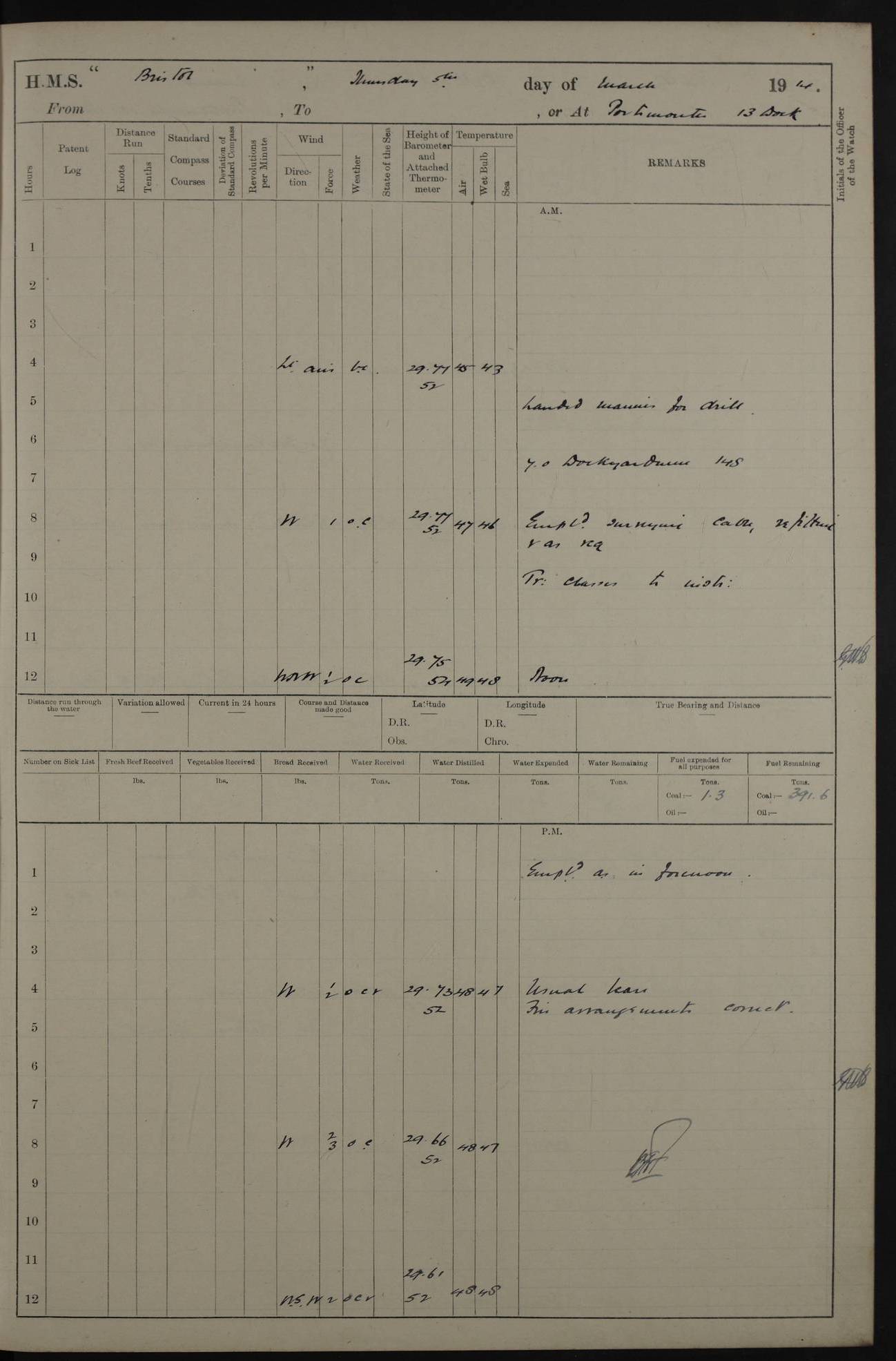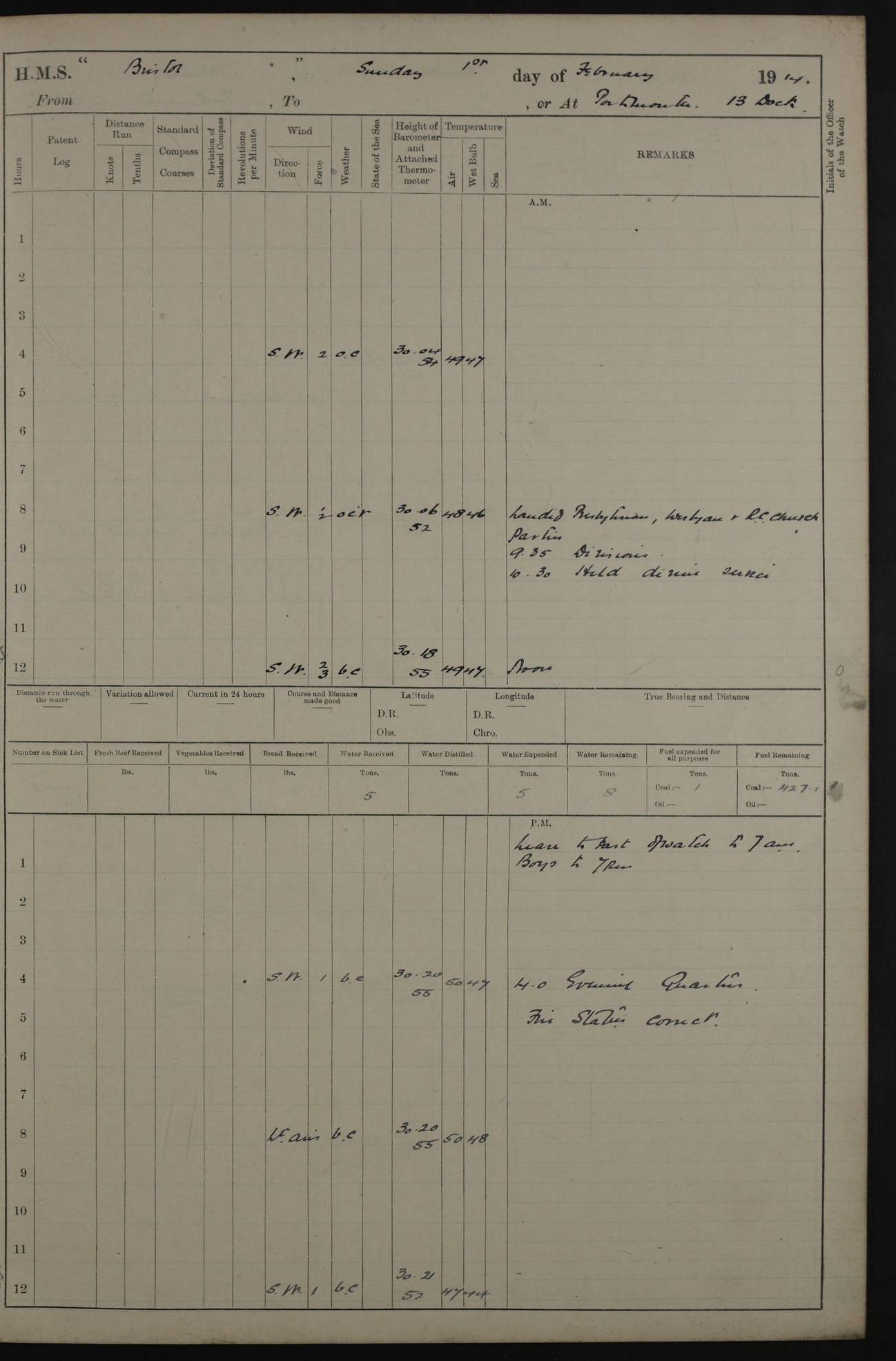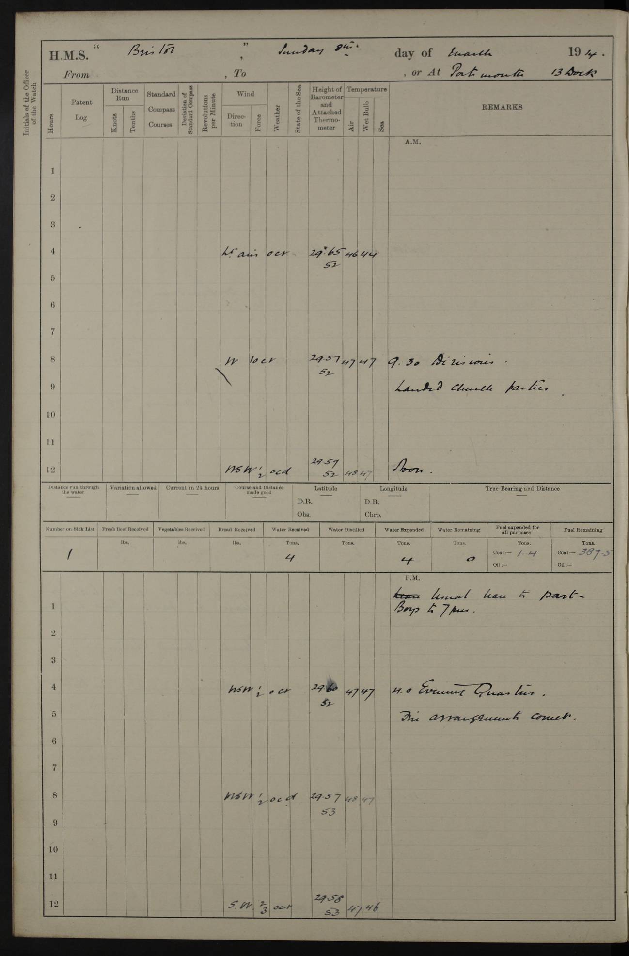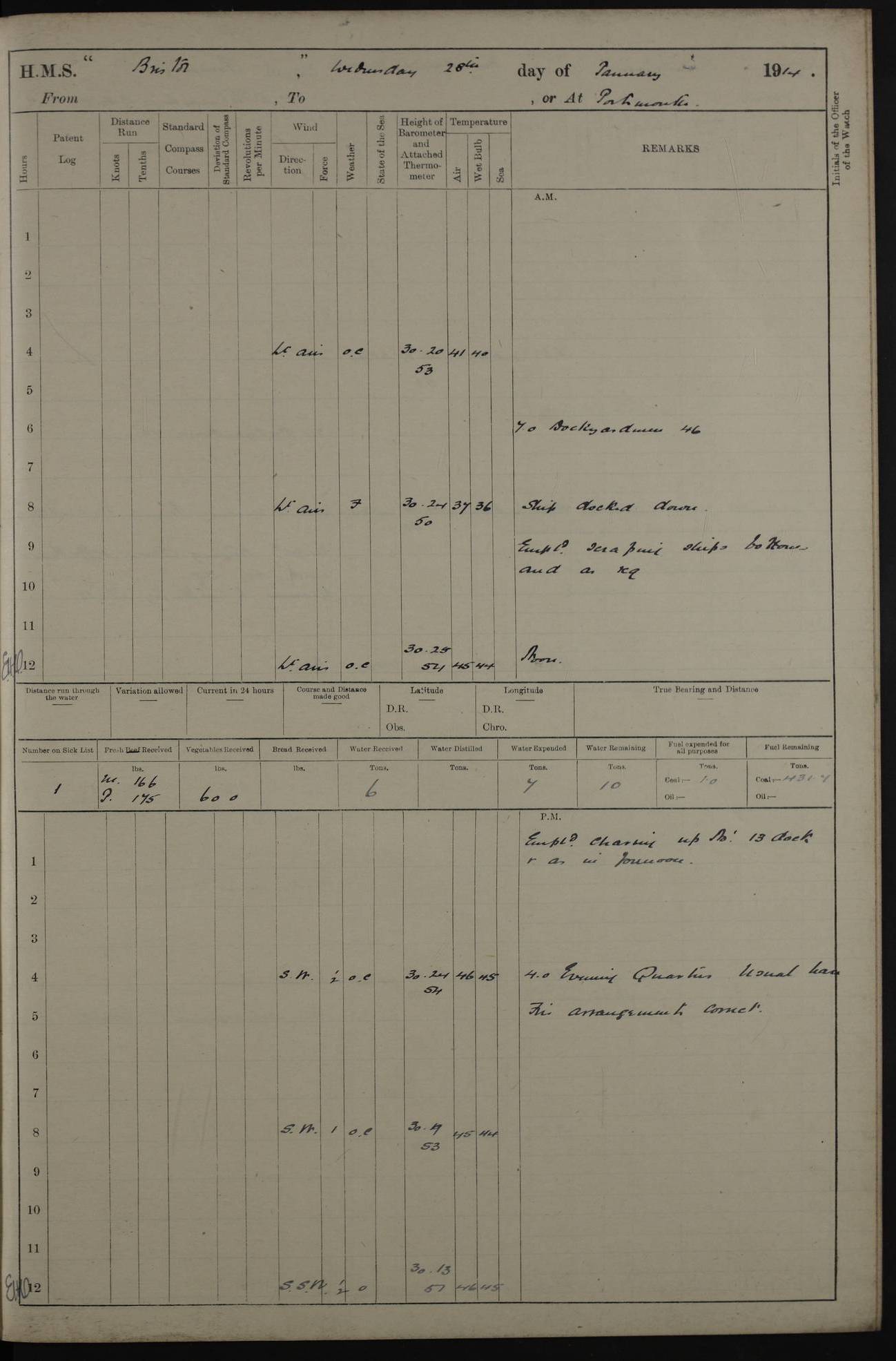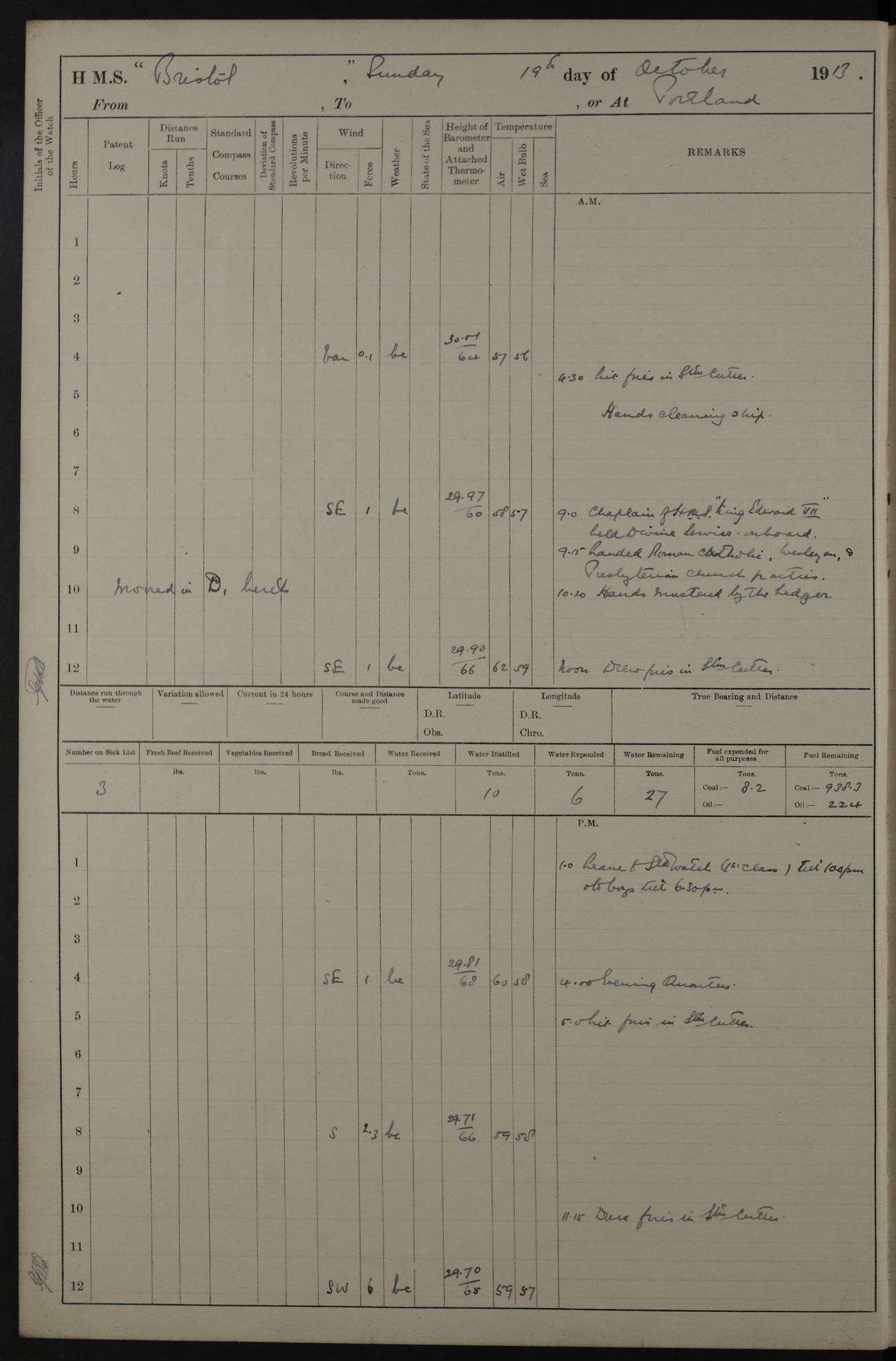 LOGS FOR JULY 1913 4ef4f40ee53e0a0c9100132d: (https://s3.amazonaws.com:443/oldweather/ADM53-36118/0006_0.jpg) 1 July 1913 Devonport Lat 50.38, Long -4.19 1 in sick list. 4.30am: Lit fires in Steam Cutter. Hands cleaning ship. 6.00am: Hands cleaning ship. 8.00am: Discharged ratings to ships in harbour. 9.00am: Recommissioned ship for service in 2nd Light Cruiser Squadron. 9.20am: Divisions. Hands cleaning ship. Dockyard parties drawing stores. 1.00pm: Hands drawing stores. Discharged 2 Privates RMLI to Barracks. 4.00pm: Leave to Watch till 7.00a.m. 9.00pm: 1 Sergeant RMLI joined ship. 10.15pm: Drew fires in Steam Cutter. 4ef4f40ee53e0a0c9100132e: (https://s3.amazonaws.com:443/oldweather/ADM53-36118/0006_1.jpg) 2 July 1913 Devonport Lat 50.38, Long -4.19 1 in sick list. 6.00am: Hands pumping water and as requisite. 9.00am: Dockyard parties drawing stores. Remainder of hands employed as requisite. 4ef4f40ee53e0a0c9100132f: (https://s3.amazonaws.com:443/oldweather/ADM53-36118/0007_0.jpg) 3 July 1913 Devonport Lat 50.38, Long -4.19 1 in sick list. 11.45am: Medical inspection of Ship's Company. 5.15pm: H.M.S. Defence arrived. 8.10pm: 1 Painter 2nd class joined ship. 4ef4f40ee53e0a0c91001330: (https://s3.amazonaws.com:443/oldweather/ADM53-36118/0007_1.jpg) 4 July 1913 Devonport Lat 50.38, Long -4.19 2 in sick list. 8.00am: Cleaned small arms. 12.45pm: Paid weekly money. 1.00pm: Lit fires in 1 Boiler. Hands securing boats for sea and as requisite. 4ef4f40ee53e0a0c91001331: (https://s3.amazonaws.com:443/oldweather/ADM53-36118/0008_0.jpg) 5 July 1913 Devonport to Plymouth Sound Lat 50.39, Long -4.14 2 on sick list. 6.45am: Landed escort. 8.30am: Escort and prisoner returned. 9.00am: Lit fires in 2 Boilers. Hands cleaning ship. Tested life buoys. Correct. 12.55pm: H.M. Tug Aetna towed stern to port. 1.00pm: Slipped and proceeded as requisite to Sound. 1.22pm: Stopped. 1.26pm: Came to with Starboard anchor, veered to 5 shackles in 6 fathoms. 2.15pm: Two ratings joined for passage to Portsmouth. 9.10pm: Sent boats to assist schooner aground on East end of Plymouth Breakwater (Owner W. Tugwell Esquire). Laid out small kedge and 4 1/2" grass. 4ef4f40ee53e0a0c91001332: (https://s3.amazonaws.com:443/oldweather/ADM53-36118/0008_1.jpg) 6 July 1913 Plymouth Lat 50.39, Long -4.14 2 on sick list. 5.45am: Schooner towed off by tug. 9.30am: Tug brought back kedge anchor. 10.00am: Divisions. Held Divine service onboard. 4ef4f40ee53e0a0c91001333: (https://s3.amazonaws.com:443/oldweather/ADM53-36118/0009_0.jpg) 7 July 1913 Plymouth to Spithead Lat 50.26, Long -3.26 1 on sick list. 8.50am: Weighed. 8.58am: Proceeded 170 revolutions. Course as requisite through West Entrance. 9.21am: Set Course SE. Mewstone: abeam. 9.30am: Mewstone: N10W. Revelstoke S87E. 10.21am: Altered course ESE. 10.57am: Altered course N87E. Prawle Point Bolt: N62 1/2W. Start Point: N10W. 3.50pm: Portland Bill: N65W. White Nose: N6W. 6.26pm: Needles Light House: abeam. Altered course as requisite up Needles Channel and to Spithead. 7.40pm: W. Ryde Middle: abeam to Starboard 4 cables. 8.07pm: Stopped. 8.10pm: Came to with Port anchor in 6 fathoms, veered to 5 shackles. Prepared for coaling. 4ef4f40ee53e0a0c91001334: (https://s3.amazonaws.com:443/oldweather/ADM53-36118/0009_1.jpg) 8 July 1913 Spithead to Portsmouth Harbour Lat 50.81, Long -1.11 1 on sick list. 7.39am: Embarked Pilot, weighed and proceeded as requisite 10 knots. 8.00am: Slow both. H.M. Tug "Malta" made fast alongside port side. 8.13am: Stopped. 8.20am: Made fast alongside "C1". 9.21am: Commenced coaling. 10.45am: Discharged 1 Able Seaman to H.M.A.S. "Sydney". 1.30pm: Discharged 1 Stoker to RN Barracks. 1 Leading Seaman and 1 Able Seaman joined from H.M.S. "Excellent". 2.45pm: 20 Ordinary Seamen joined from barracks. 4.20pm: 1 Ordinary Seaman joined from H.M.S. "Vernon". 6.30pm: Stopped coaling. 4ef4f40ee53e0a0c91001335: (https://s3.amazonaws.com:443/oldweather/ADM53-36118/0010_0.jpg) 9 July 1913 Portsmouth Lat 50.81, Long -1.11 Nil on sick list. 7,0am: Hands coaling ship. 2.30pm: Finished coaling. Received 527.0 tons. 3.30pm: 40 Stokers 2nd Class and 1 Ships Steward Assistant joined. 6.00pm: 7 Leading Stokers and 24 Stokers 1st class joined ship. 4ef4f40fe53e0a0c91001336: (https://s3.amazonaws.com:443/oldweather/ADM53-36118/0010_1.jpg) 10 July 1913 Portsmouth to Spithead Lat 50.75, Long -1.13 1 on sick list. 7.45am: H.M. Tugs "Enterprise" & "Malta" took ship in tow and transported her to mid stream. 8.08am: Proceeded 1/2 speed 130 revolutions out of harbour and as requisite to Spithead. 8.33am: Stopped. 8.35am: Came to with Port anchor in 6 fathoms, veered to 5 shackles. 4.00pm: Evening Quarters. Spread Quarter Deck awning. Leave to Watch till 7.00am. 1 Stoker Petty Officer and 1 Leading Stoker joined ship. 4ef4f40fe53e0a0c91001337: (https://s3.amazonaws.com:443/oldweather/ADM53-36118/0011_0.jpg) 11 July 1913 Spithead Lat 50.75, Long -1.13 1 on sick list. 12.45pm: Paid weekly money. 3.00pm: 4 Engine Room Artificers joined ship. 4.15pm: H.M.S. "Minerva " arrived. Leave to Watch till 7.00a.m. 1 Chief Stoker and 2 Leading Stokers joined. 4ef4f40fe53e0a0c91001338: (https://s3.amazonaws.com:443/oldweather/ADM53-36118/0011_1.jpg) 12 July 1913 Spithead Lat 50.75, Long -1.13 1 on sick list. 1.30pm: Leave to Watch till 7.00a.m. Monday. Youths till 10.00pm. and to boys till 6.45 pm. Make and mend clothes. 3.30pm: 10 Stoker Petty Officers joined ship. 6.00pm: Hands bathed. 4ef4f40fe53e0a0c91001339: (https://s3.amazonaws.com:443/oldweather/ADM53-36118/0012_0.jpg) 13 July 1913 Spithead Lat 50.75, Long -1.13 1 on sick list. 7.20am: H.M.S. "Blonde" arrived. 9.40am: Divisions. Held Divine Service. 1.00pm: H.M.S. "Enchantress" sailed. 7.35pm: H.M.S. "Liverpool" arrived. 4ef4f40fe53e0a0c9100133a: (https://s3.amazonaws.com:443/oldweather/ADM53-36118/0012_1.jpg) 4ef4f40fe53e0a0c9100133b: (https://s3.amazonaws.com:443/oldweather/ADM53-36118/0013_0.jpg) 4ef4f40fe53e0a0c9100133c: (https://s3.amazonaws.c