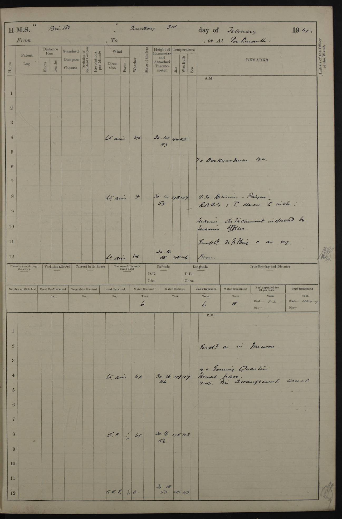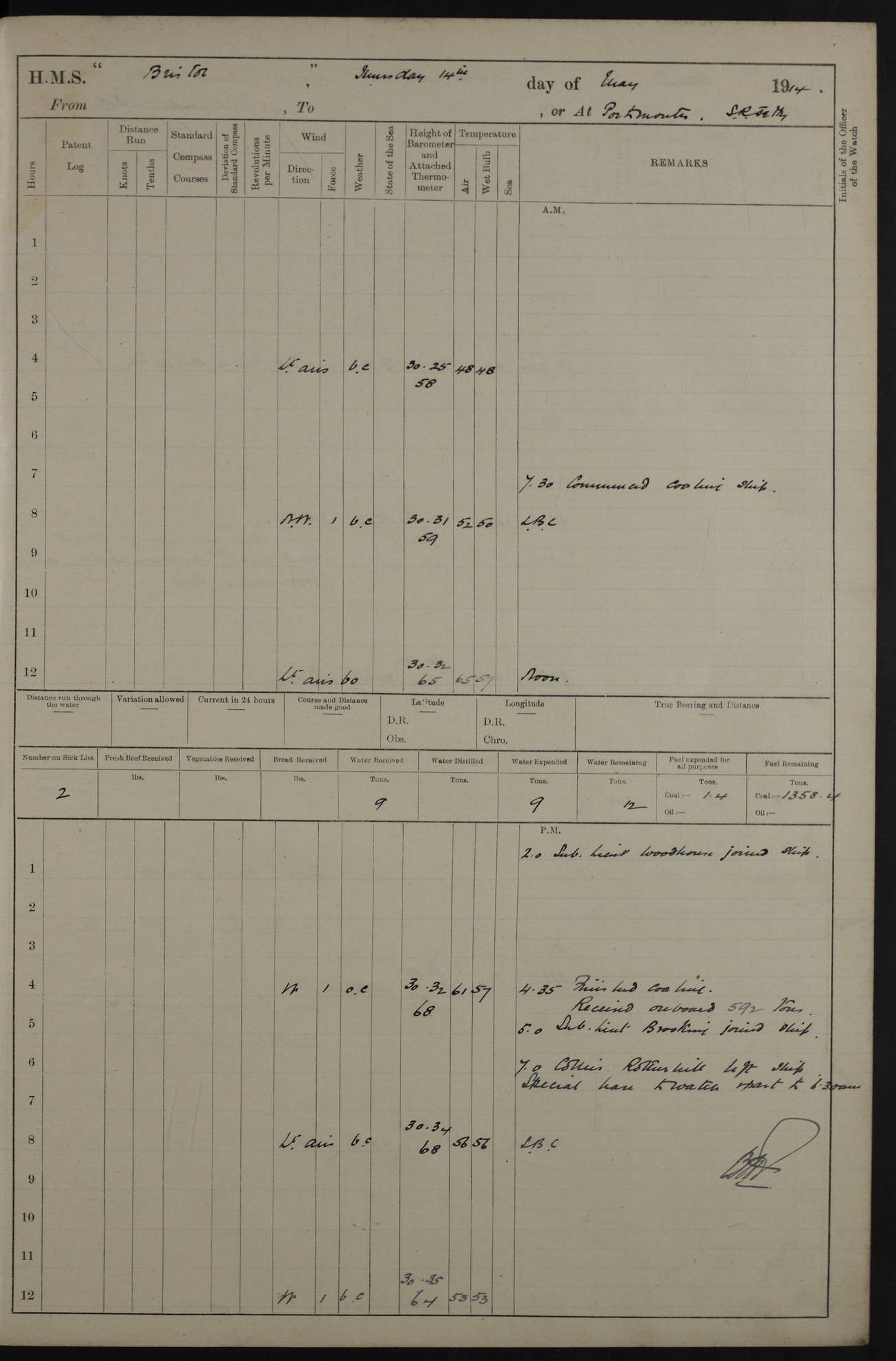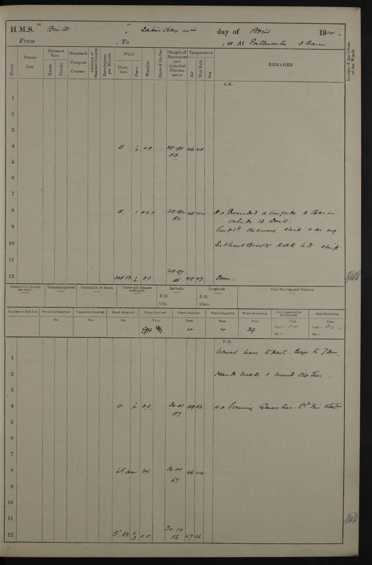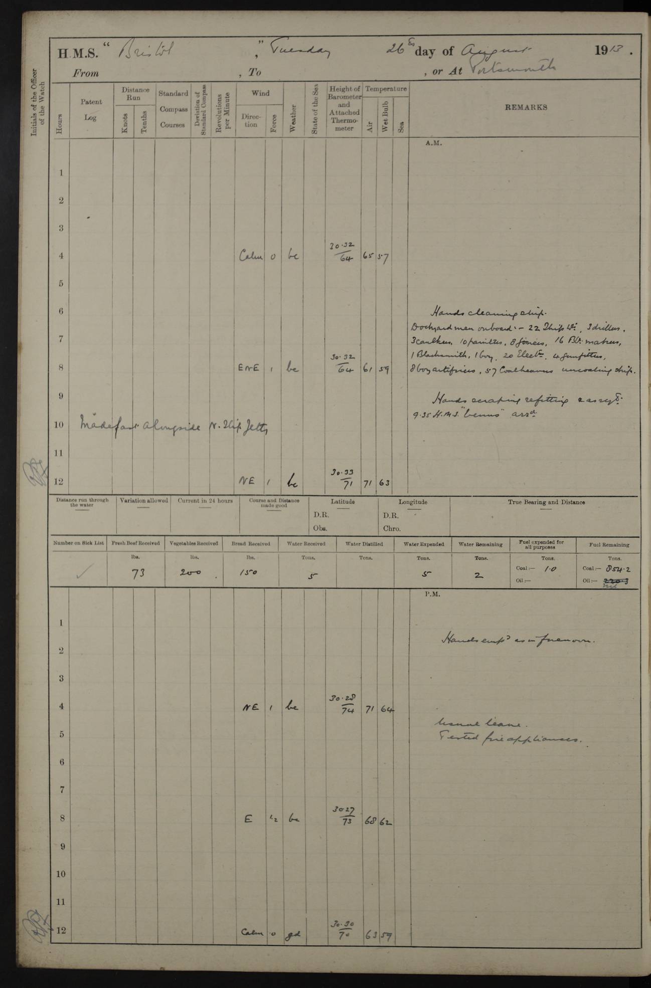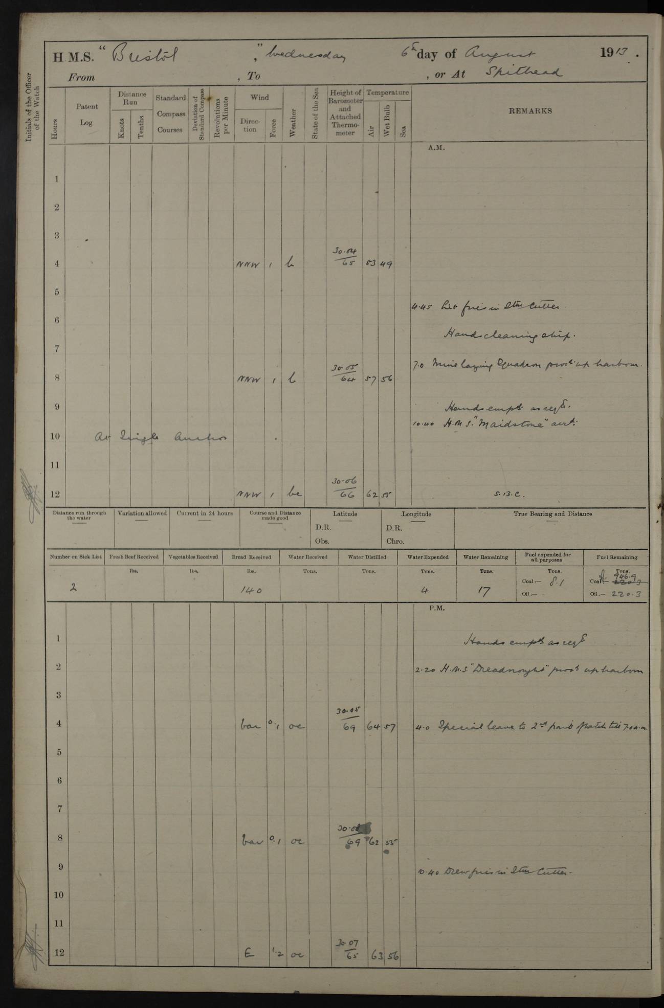 LOGS FOR JULY 1913 4ef4f40ee53e0a0c9100132d: (https://s3.amazonaws.com:443/oldweather/ADM53-36118/0006_0.jpg) 1 July 1913 Devonport Lat 50.38, Long -4.19 1 in sick list. 4.30am: Lit fires in Steam Cutter. Hands cleaning ship. 6.00am: Hands cleaning ship. 8.00am: Discharged ratings to ships in harbour. 9.00am: Recommissioned ship for service in 2nd Light Cruiser Squadron. 9.20am: Divisions. Hands cleaning ship. Dockyard parties drawing stores. 1.00pm: Hands drawing stores. Discharged 2 Privates RMLI to Barracks. 4.00pm: Leave to Watch till 7.00a.m. 9.00pm: 1 Sergeant RMLI joined ship. 10.15pm: Drew fires in Steam Cutter. 4ef4f40ee53e0a0c9100132e: (https://s3.amazonaws.com:443/oldweather/ADM53-36118/0006_1.jpg) 2 July 1913 Devonport Lat 50.38, Long -4.19 1 in sick list. 6.00am: Hands pumping water and as requisite. 9.00am: Dockyard parties drawing stores. Remainder of hands employed as requisite. 4ef4f40ee53e0a0c9100132f: (https://s3.amazonaws.com:443/oldweather/ADM53-36118/0007_0.jpg) 3 July 1913 Devonport Lat 50.38, Long -4.19 1 in sick list. 11.45am: Medical inspection of Ship's Company. 5.15pm: H.M.S. Defence arrived. 8.10pm: 1 Painter 2nd class joined ship. 4ef4f40ee53e0a0c91001330: (https://s3.amazonaws.com:443/oldweather/ADM53-36118/0007_1.jpg) 4 July 1913 Devonport Lat 50.38, Long -4.19 2 in sick list. 8.00am: Cleaned small arms. 12.45pm: Paid weekly money. 1.00pm: Lit fires in 1 Boiler. Hands securing boats for sea and as requisite. 4ef4f40ee53e0a0c91001331: (https://s3.amazonaws.com:443/oldweather/ADM53-36118/0008_0.jpg) 5 July 1913 Devonport to Plymouth Sound Lat 50.39, Long -4.14 2 on sick list. 6.45am: Landed escort. 8.30am: Escort and prisoner returned. 9.00am: Lit fires in 2 Boilers. Hands cleaning ship. Tested life buoys. Correct. 12.55pm: H.M. Tug Aetna towed stern to port. 1.00pm: Slipped and proceeded as requisite to Sound. 1.22pm: Stopped. 1.26pm: Came to with Starboard anchor, veered to 5 shackles in 6 fathoms. 2.15pm: Two ratings joined for passage to Portsmouth. 9.10pm: Sent boats to assist schooner aground on East end of Plymouth Breakwater (Owner W. Tugwell Esquire). Laid out small kedge and 4 1/2" grass. 4ef4f40ee53e0a0c91001332: (https://s3.amazonaws.com:443/oldweather/ADM53-36118/0008_1.jpg) 6 July 1913 Plymouth Lat 50.39, Long -4.14 2 on sick list. 5.45am: Schooner towed off by tug. 9.30am: Tug brought back kedge anchor. 10.00am: Divisions. Held Divine service onboard. 4ef4f40ee53e0a0c91001333: (https://s3.amazonaws.com:443/oldweather/ADM53-36118/0009_0.jpg) 7 July 1913 Plymouth to Spithead Lat 50.26, Long -3.26 1 on sick list. 8.50am: Weighed. 8.58am: Proceeded 170 revolutions. Course as requisite through West Entrance. 9.21am: Set Course SE. Mewstone: abeam. 9.30am: Mewstone: N10W. Revelstoke S87E. 10.21am: Altered course ESE. 10.57am: Altered course N87E. Prawle Point Bolt: N62 1/2W. Start Point: N10W. 3.50pm: Portland Bill: N65W. White Nose: N6W. 6.26pm: Needles Light House: abeam. Altered course as requisite up Needles Channel and to Spithead. 7.40pm: W. Ryde Middle: abeam to Starboard 4 cables. 8.07pm: Stopped. 8.10pm: Came to with Port anchor in 6 fathoms, veered to 5 shackles. Prepared for coaling. 4ef4f40ee53e0a0c91001334: (https://s3.amazonaws.com:443/oldweather/ADM53-36118/0009_1.jpg) 8 July 1913 Spithead to Portsmouth Harbour Lat 50.81, Long -1.11 1 on sick list. 7.39am: Embarked Pilot, weighed and proceeded as requisite 10 knots. 8.00am: Slow both. H.M. Tug "Malta" made fast alongside port side. 8.13am: Stopped. 8.20am: Made fast alongside "C1". 9.21am: Commenced coaling. 10.45am: Discharged 1 Able Seaman to H.M.A.S. "Sydney". 1.30pm: Discharged 1 Stoker to RN Barracks. 1 Leading Seaman and 1 Able Seaman joined from H.M.S. "Excellent". 2.45pm: 20 Ordinary Seamen joined from barracks. 4.20pm: 1 Ordinary Seaman joined from H.M.S. "Vernon". 6.30pm: Stopped coaling. 4ef4f40ee53e0a0c91001335: (https://s3.amazonaws.com:443/oldweather/ADM53-36118/0010_0.jpg) 9 July 1913 Portsmouth Lat 50.81, Long -1.11 Nil on sick list. 7,0am: Hands coaling ship. 2.30pm: Finished coaling. Received 527.0 tons. 3.30pm: 40 Stokers 2nd Class and 1 Ships Steward Assistant joined. 6.00pm: 7 Leading Stokers and 24 Stokers 1st class joined ship. 4ef4f40fe53e0a0c91001336: (https://s3.amazonaws.com:443/oldweather/ADM53-36118/0010_1.jpg) 10 July 1913 Portsmouth to Spithead Lat 50.75, Long -1.13 1 on sick list. 7.45am: H.M. Tugs "Enterprise" & "Malta" took ship in tow and transported her to mid stream. 8.08am: Proceeded 1/2 speed 130 revolutions out of harbour and as requisite to Spithead. 8.33am: Stopped. 8.35am: Came to with Port anchor in 6 fathoms, veered to 5 shackles. 4.00pm: Evening Quarters. Spread Quarter Deck awning. Leave to Watch till 7.00am. 1 Stoker Petty Officer and 1 Leading Stoker joined ship. 4ef4f40fe53e0a0c91001337: (https://s3.amazonaws.com:443/oldweather/ADM53-36118/0011_0.jpg) 11 July 1913 Spithead Lat 50.75, Long -1.13 1 on sick list. 12.45pm: Paid weekly money. 3.00pm: 4 Engine Room Artificers joined ship. 4.15pm: H.M.S. "Minerva " arrived. Leave to Watch till 7.00a.m. 1 Chief Stoker and 2 Leading Stokers joined. 4ef4f40fe53e0a0c91001338: (https://s3.amazonaws.com:443/oldweather/ADM53-36118/0011_1.jpg) 12 July 1913 Spithead Lat 50.75, Long -1.13 1 on sick list. 1.30pm: Leave to Watch till 7.00a.m. Monday. Youths till 10.00pm. and to boys till 6.45 pm. Make and mend clothes. 3.30pm: 10 Stoker Petty Officers joined ship. 6.00pm: Hands bathed. 4ef4f40fe53e0a0c91001339: (https://s3.amazonaws.com:443/oldweather/ADM53-36118/0012_0.jpg) 13 July 1913 Spithead Lat 50.75, Long -1.13 1 on sick list. 7.20am: H.M.S. "Blonde" arrived. 9.40am: Divisions. Held Divine Service. 1.00pm: H.M.S. "Enchantress" sailed. 7.35pm: H.M.S. "Liverpool" arrived. 4ef4f40fe53e0a0c9100133a: (https://s3.amazonaws.com:443/oldweather/ADM53-36118/0012_1.jpg) 4ef4f40fe53e0a0c9100133b: (https://s3.amazonaws.com:443/oldweather/ADM53-36118/0013_0.jpg) 4ef4f40fe53e0a0c9100133c: (https://s3.amazonaws.c