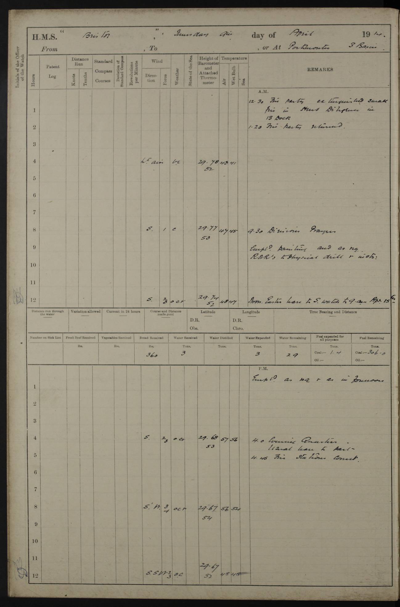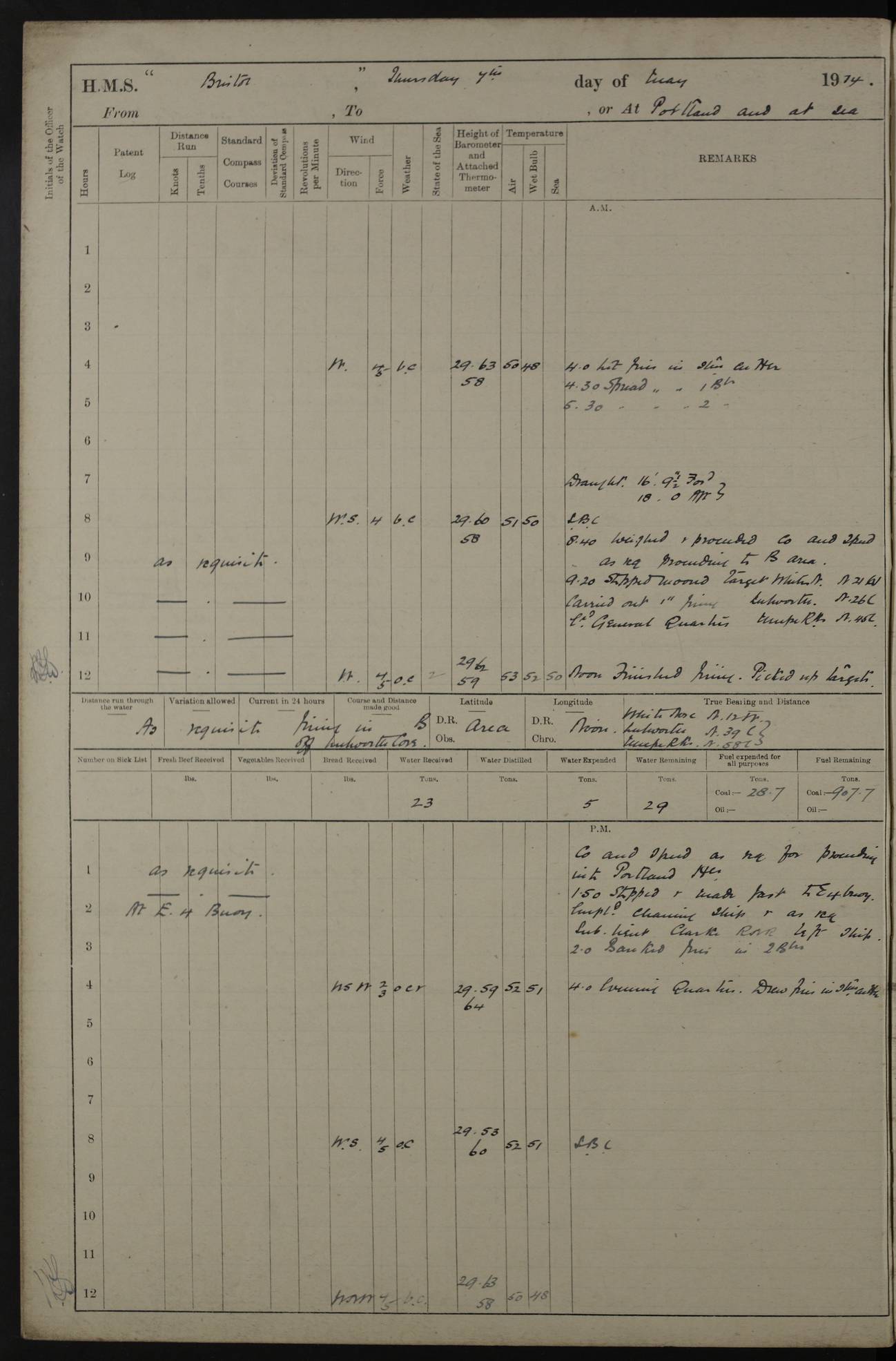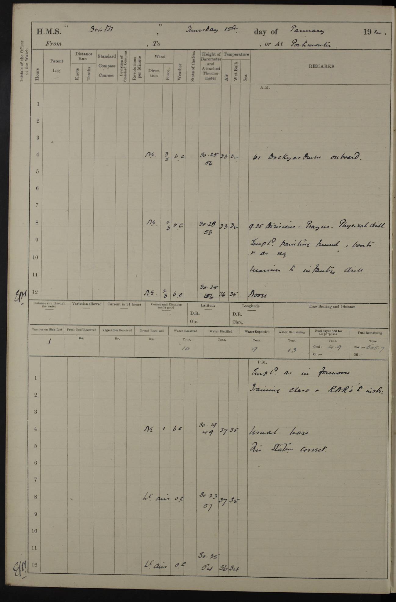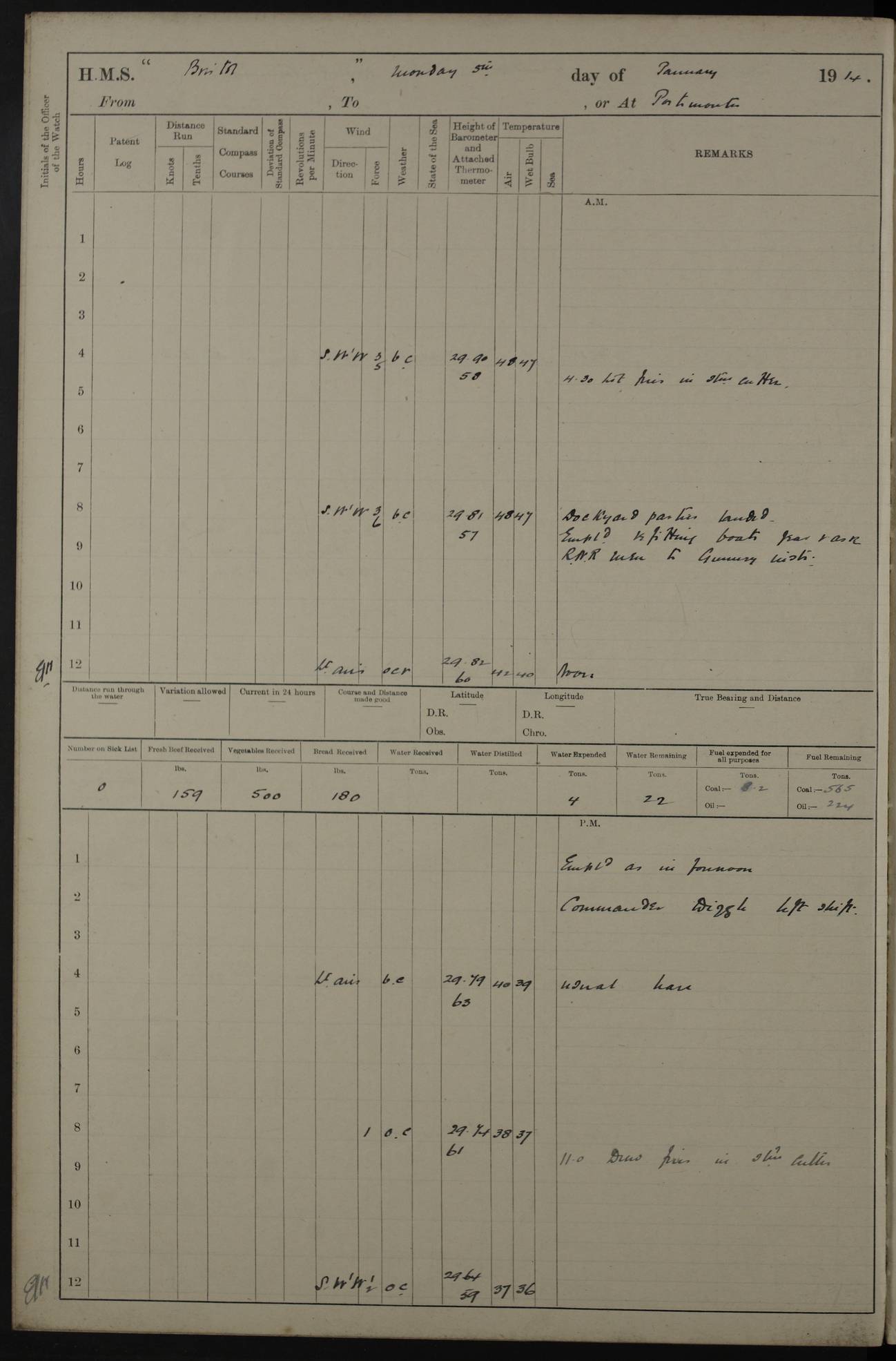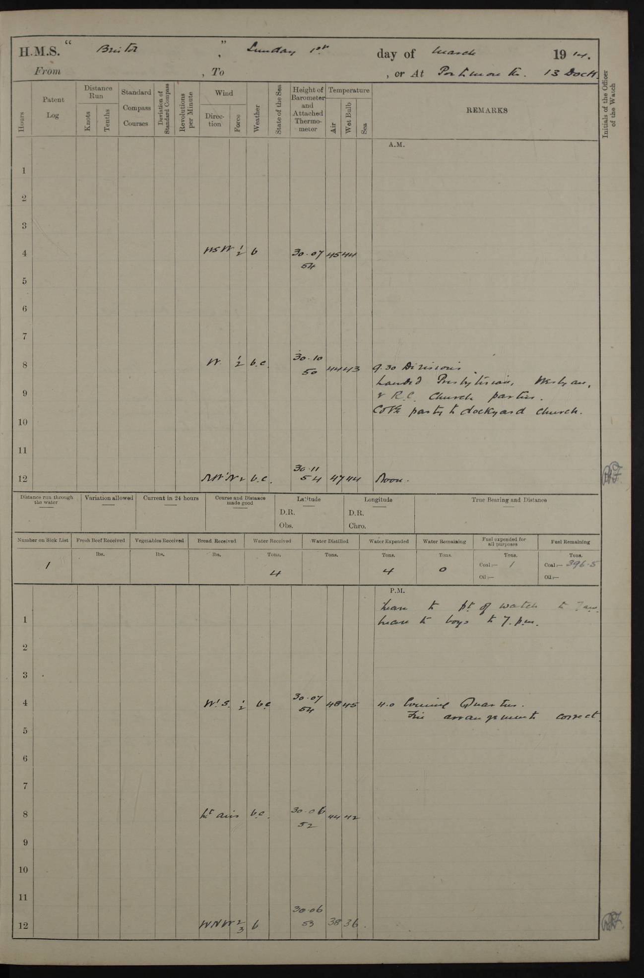 LOGS FOR JULY 1913 4ef4f40ee53e0a0c9100132d: (https://s3.amazonaws.com:443/oldweather/ADM53-36118/0006_0.jpg) 1 July 1913 Devonport Lat 50.38, Long -4.19 1 in sick list. 4.30am: Lit fires in Steam Cutter. Hands cleaning ship. 6.00am: Hands cleaning ship. 8.00am: Discharged ratings to ships in harbour. 9.00am: Recommissioned ship for service in 2nd Light Cruiser Squadron. 9.20am: Divisions. Hands cleaning ship. Dockyard parties drawing stores. 1.00pm: Hands drawing stores. Discharged 2 Privates RMLI to Barracks. 4.00pm: Leave to Watch till 7.00a.m. 9.00pm: 1 Sergeant RMLI joined ship. 10.15pm: Drew fires in Steam Cutter. 4ef4f40ee53e0a0c9100132e: (https://s3.amazonaws.com:443/oldweather/ADM53-36118/0006_1.jpg) 2 July 1913 Devonport Lat 50.38, Long -4.19 1 in sick list. 6.00am: Hands pumping water and as requisite. 9.00am: Dockyard parties drawing stores. Remainder of hands employed as requisite. 4ef4f40ee53e0a0c9100132f: (https://s3.amazonaws.com:443/oldweather/ADM53-36118/0007_0.jpg) 3 July 1913 Devonport Lat 50.38, Long -4.19 1 in sick list. 11.45am: Medical inspection of Ship's Company. 5.15pm: H.M.S. Defence arrived. 8.10pm: 1 Painter 2nd class joined ship. 4ef4f40ee53e0a0c91001330: (https://s3.amazonaws.com:443/oldweather/ADM53-36118/0007_1.jpg) 4 July 1913 Devonport Lat 50.38, Long -4.19 2 in sick list. 8.00am: Cleaned small arms. 12.45pm: Paid weekly money. 1.00pm: Lit fires in 1 Boiler. Hands securing boats for sea and as requisite. 4ef4f40ee53e0a0c91001331: (https://s3.amazonaws.com:443/oldweather/ADM53-36118/0008_0.jpg) 5 July 1913 Devonport to Plymouth Sound Lat 50.39, Long -4.14 2 on sick list. 6.45am: Landed escort. 8.30am: Escort and prisoner returned. 9.00am: Lit fires in 2 Boilers. Hands cleaning ship. Tested life buoys. Correct. 12.55pm: H.M. Tug Aetna towed stern to port. 1.00pm: Slipped and proceeded as requisite to Sound. 1.22pm: Stopped. 1.26pm: Came to with Starboard anchor, veered to 5 shackles in 6 fathoms. 2.15pm: Two ratings joined for passage to Portsmouth. 9.10pm: Sent boats to assist schooner aground on East end of Plymouth Breakwater (Owner W. Tugwell Esquire). Laid out small kedge and 4 1/2" grass. 4ef4f40ee53e0a0c91001332: (https://s3.amazonaws.com:443/oldweather/ADM53-36118/0008_1.jpg) 6 July 1913 Plymouth Lat 50.39, Long -4.14 2 on sick list. 5.45am: Schooner towed off by tug. 9.30am: Tug brought back kedge anchor. 10.00am: Divisions. Held Divine service onboard. 4ef4f40ee53e0a0c91001333: (https://s3.amazonaws.com:443/oldweather/ADM53-36118/0009_0.jpg) 7 July 1913 Plymouth to Spithead Lat 50.26, Long -3.26 1 on sick list. 8.50am: Weighed. 8.58am: Proceeded 170 revolutions. Course as requisite through West Entrance. 9.21am: Set Course SE. Mewstone: abeam. 9.30am: Mewstone: N10W. Revelstoke S87E. 10.21am: Altered course ESE. 10.57am: Altered course N87E. Prawle Point Bolt: N62 1/2W. Start Point: N10W. 3.50pm: Portland Bill: N65W. White Nose: N6W. 6.26pm: Needles Light House: abeam. Altered course as requisite up Needles Channel and to Spithead. 7.40pm: W. Ryde Middle: abeam to Starboard 4 cables. 8.07pm: Stopped. 8.10pm: Came to with Port anchor in 6 fathoms, veered to 5 shackles. Prepared for coaling. 4ef4f40ee53e0a0c91001334: (https://s3.amazonaws.com:443/oldweather/ADM53-36118/0009_1.jpg) 8 July 1913 Spithead to Portsmouth Harbour Lat 50.81, Long -1.11 1 on sick list. 7.39am: Embarked Pilot, weighed and proceeded as requisite 10 knots. 8.00am: Slow both. H.M. Tug "Malta" made fast alongside port side. 8.13am: Stopped. 8.20am: Made fast alongside "C1". 9.21am: Commenced coaling. 10.45am: Discharged 1 Able Seaman to H.M.A.S. "Sydney". 1.30pm: Discharged 1 Stoker to RN Barracks. 1 Leading Seaman and 1 Able Seaman joined from H.M.S. "Excellent". 2.45pm: 20 Ordinary Seamen joined from barracks. 4.20pm: 1 Ordinary Seaman joined from H.M.S. "Vernon". 6.30pm: Stopped coaling. 4ef4f40ee53e0a0c91001335: (https://s3.amazonaws.com:443/oldweather/ADM53-36118/0010_0.jpg) 9 July 1913 Portsmouth Lat 50.81, Long -1.11 Nil on sick list. 7,0am: Hands coaling ship. 2.30pm: Finished coaling. Received 527.0 tons. 3.30pm: 40 Stokers 2nd Class and 1 Ships Steward Assistant joined. 6.00pm: 7 Leading Stokers and 24 Stokers 1st class joined ship. 4ef4f40fe53e0a0c91001336: (https://s3.amazonaws.com:443/oldweather/ADM53-36118/0010_1.jpg) 10 July 1913 Portsmouth to Spithead Lat 50.75, Long -1.13 1 on sick list. 7.45am: H.M. Tugs "Enterprise" & "Malta" took ship in tow and transported her to mid stream. 8.08am: Proceeded 1/2 speed 130 revolutions out of harbour and as requisite to Spithead. 8.33am: Stopped. 8.35am: Came to with Port anchor in 6 fathoms, veered to 5 shackles. 4.00pm: Evening Quarters. Spread Quarter Deck awning. Leave to Watch till 7.00am. 1 Stoker Petty Officer and 1 Leading Stoker joined ship. 4ef4f40fe53e0a0c91001337: (https://s3.amazonaws.com:443/oldweather/ADM53-36118/0011_0.jpg) 11 July 1913 Spithead Lat 50.75, Long -1.13 1 on sick list. 12.45pm: Paid weekly money. 3.00pm: 4 Engine Room Artificers joined ship. 4.15pm: H.M.S. "Minerva " arrived. Leave to Watch till 7.00a.m. 1 Chief Stoker and 2 Leading Stokers joined. 4ef4f40fe53e0a0c91001338: (https://s3.amazonaws.com:443/oldweather/ADM53-36118/0011_1.jpg) 12 July 1913 Spithead Lat 50.75, Long -1.13 1 on sick list. 1.30pm: Leave to Watch till 7.00a.m. Monday. Youths till 10.00pm. and to boys till 6.45 pm. Make and mend clothes. 3.30pm: 10 Stoker Petty Officers joined ship. 6.00pm: Hands bathed. 4ef4f40fe53e0a0c91001339: (https://s3.amazonaws.com:443/oldweather/ADM53-36118/0012_0.jpg) 13 July 1913 Spithead Lat 50.75, Long -1.13 1 on sick list. 7.20am: H.M.S. "Blonde" arrived. 9.40am: Divisions. Held Divine Service. 1.00pm: H.M.S. "Enchantress" sailed. 7.35pm: H.M.S. "Liverpool" arrived. 4ef4f40fe53e0a0c9100133a: (https://s3.amazonaws.com:443/oldweather/ADM53-36118/0012_1.jpg) 4ef4f40fe53e0a0c9100133b: (https://s3.amazonaws.com:443/oldweather/ADM53-36118/0013_0.jpg) 4ef4f40fe53e0a0c9100133c: (https://s3.amazonaws.c