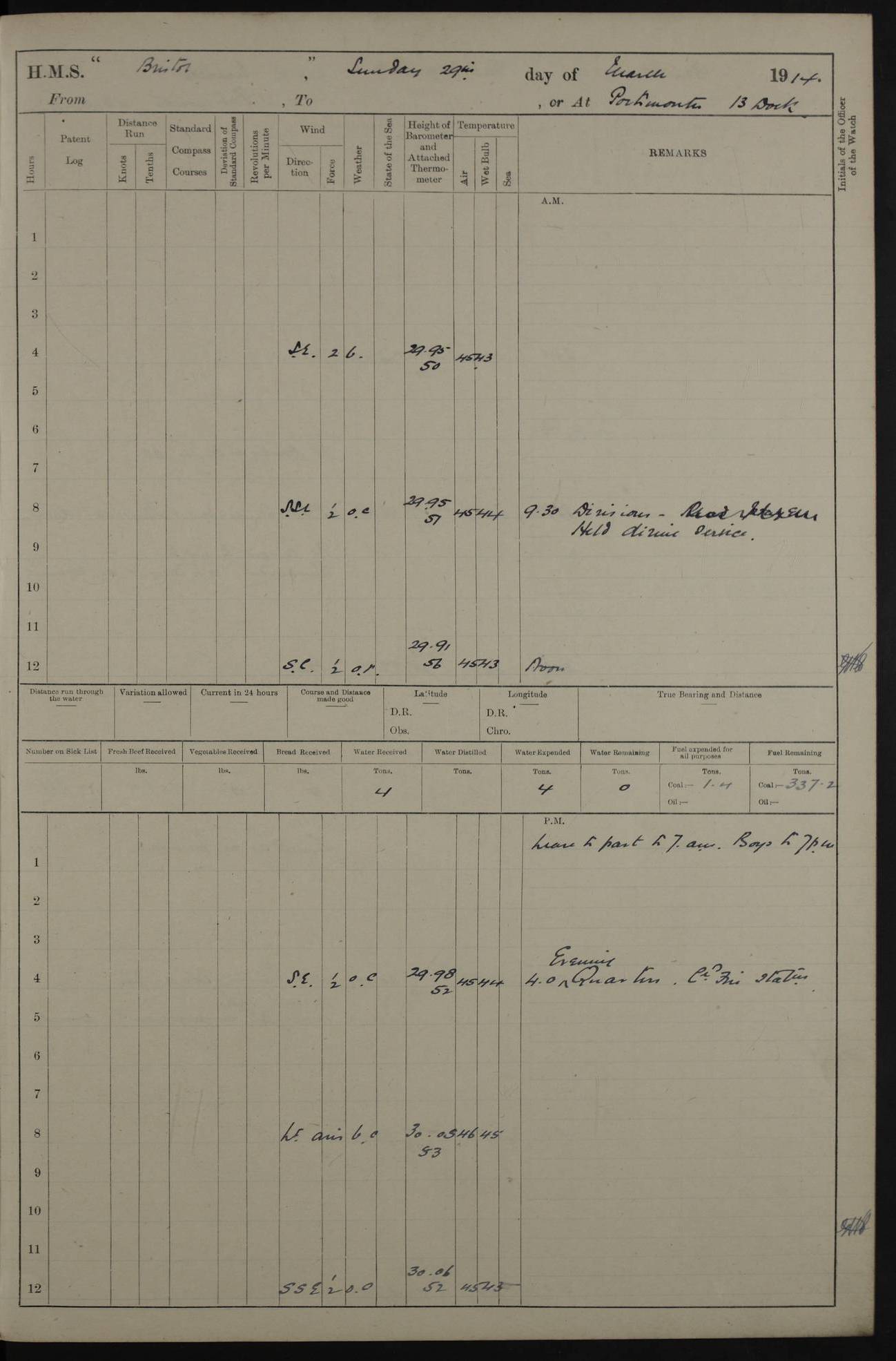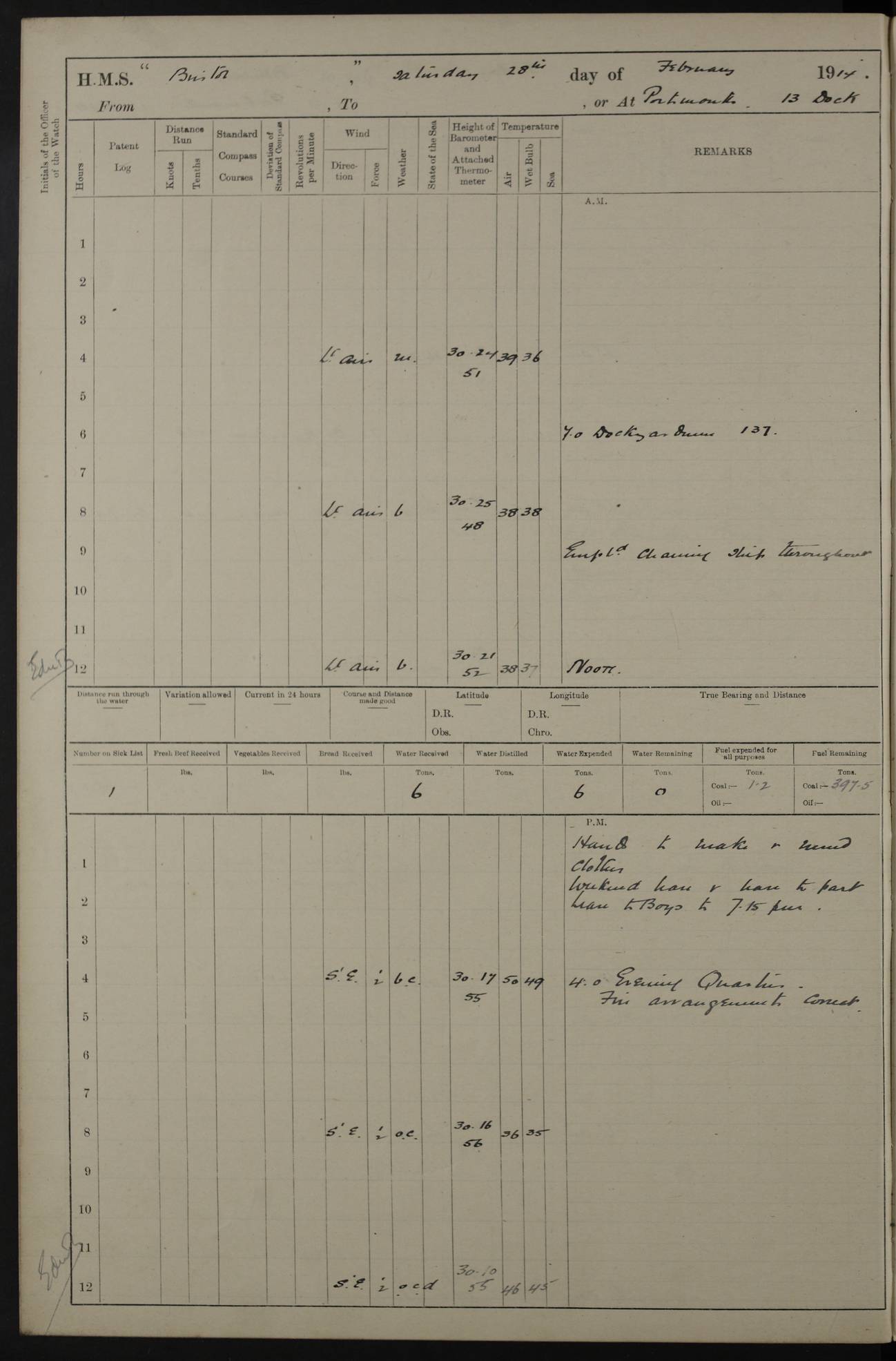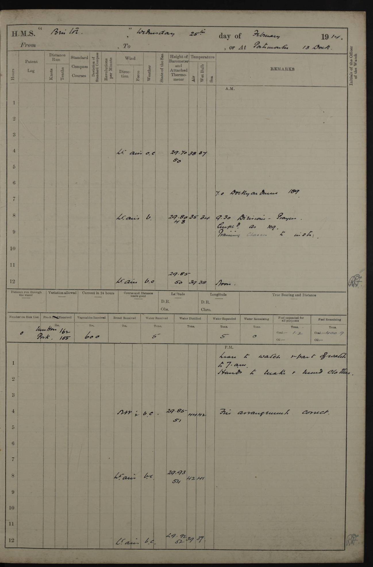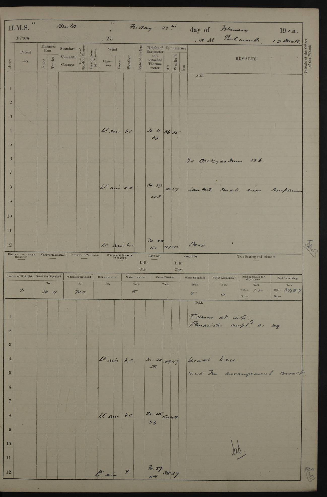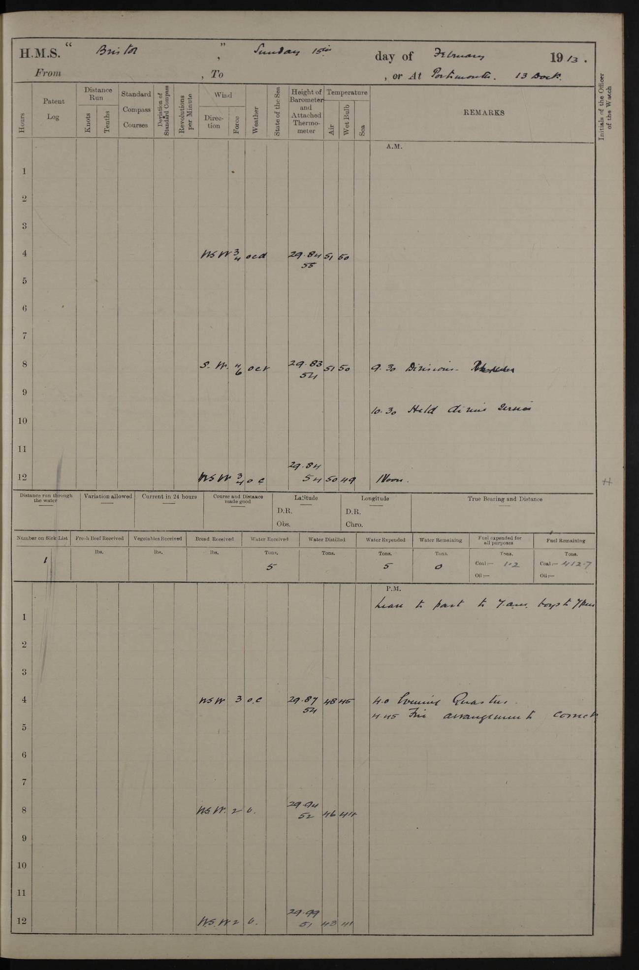 LOGS FOR JULY 1913 4ef4f40ee53e0a0c9100132d: (https://s3.amazonaws.com:443/oldweather/ADM53-36118/0006_0.jpg) 1 July 1913 Devonport Lat 50.38, Long -4.19 1 in sick list. 4.30am: Lit fires in Steam Cutter. Hands cleaning ship. 6.00am: Hands cleaning ship. 8.00am: Discharged ratings to ships in harbour. 9.00am: Recommissioned ship for service in 2nd Light Cruiser Squadron. 9.20am: Divisions. Hands cleaning ship. Dockyard parties drawing stores. 1.00pm: Hands drawing stores. Discharged 2 Privates RMLI to Barracks. 4.00pm: Leave to Watch till 7.00a.m. 9.00pm: 1 Sergeant RMLI joined ship. 10.15pm: Drew fires in Steam Cutter. 4ef4f40ee53e0a0c9100132e: (https://s3.amazonaws.com:443/oldweather/ADM53-36118/0006_1.jpg) 2 July 1913 Devonport Lat 50.38, Long -4.19 1 in sick list. 6.00am: Hands pumping water and as requisite. 9.00am: Dockyard parties drawing stores. Remainder of hands employed as requisite. 4ef4f40ee53e0a0c9100132f: (https://s3.amazonaws.com:443/oldweather/ADM53-36118/0007_0.jpg) 3 July 1913 Devonport Lat 50.38, Long -4.19 1 in sick list. 11.45am: Medical inspection of Ship's Company. 5.15pm: H.M.S. Defence arrived. 8.10pm: 1 Painter 2nd class joined ship. 4ef4f40ee53e0a0c91001330: (https://s3.amazonaws.com:443/oldweather/ADM53-36118/0007_1.jpg) 4 July 1913 Devonport Lat 50.38, Long -4.19 2 in sick list. 8.00am: Cleaned small arms. 12.45pm: Paid weekly money. 1.00pm: Lit fires in 1 Boiler. Hands securing boats for sea and as requisite. 4ef4f40ee53e0a0c91001331: (https://s3.amazonaws.com:443/oldweather/ADM53-36118/0008_0.jpg) 5 July 1913 Devonport to Plymouth Sound Lat 50.39, Long -4.14 2 on sick list. 6.45am: Landed escort. 8.30am: Escort and prisoner returned. 9.00am: Lit fires in 2 Boilers. Hands cleaning ship. Tested life buoys. Correct. 12.55pm: H.M. Tug Aetna towed stern to port. 1.00pm: Slipped and proceeded as requisite to Sound. 1.22pm: Stopped. 1.26pm: Came to with Starboard anchor, veered to 5 shackles in 6 fathoms. 2.15pm: Two ratings joined for passage to Portsmouth. 9.10pm: Sent boats to assist schooner aground on East end of Plymouth Breakwater (Owner W. Tugwell Esquire). Laid out small kedge and 4 1/2" grass. 4ef4f40ee53e0a0c91001332: (https://s3.amazonaws.com:443/oldweather/ADM53-36118/0008_1.jpg) 6 July 1913 Plymouth Lat 50.39, Long -4.14 2 on sick list. 5.45am: Schooner towed off by tug. 9.30am: Tug brought back kedge anchor. 10.00am: Divisions. Held Divine service onboard. 4ef4f40ee53e0a0c91001333: (https://s3.amazonaws.com:443/oldweather/ADM53-36118/0009_0.jpg) 7 July 1913 Plymouth to Spithead Lat 50.26, Long -3.26 1 on sick list. 8.50am: Weighed. 8.58am: Proceeded 170 revolutions. Course as requisite through West Entrance. 9.21am: Set Course SE. Mewstone: abeam. 9.30am: Mewstone: N10W. Revelstoke S87E. 10.21am: Altered course ESE. 10.57am: Altered course N87E. Prawle Point Bolt: N62 1/2W. Start Point: N10W. 3.50pm: Portland Bill: N65W. White Nose: N6W. 6.26pm: Needles Light House: abeam. Altered course as requisite up Needles Channel and to Spithead. 7.40pm: W. Ryde Middle: abeam to Starboard 4 cables. 8.07pm: Stopped. 8.10pm: Came to with Port anchor in 6 fathoms, veered to 5 shackles. Prepared for coaling. 4ef4f40ee53e0a0c91001334: (https://s3.amazonaws.com:443/oldweather/ADM53-36118/0009_1.jpg) 8 July 1913 Spithead to Portsmouth Harbour Lat 50.81, Long -1.11 1 on sick list. 7.39am: Embarked Pilot, weighed and proceeded as requisite 10 knots. 8.00am: Slow both. H.M. Tug "Malta" made fast alongside port side. 8.13am: Stopped. 8.20am: Made fast alongside "C1". 9.21am: Commenced coaling. 10.45am: Discharged 1 Able Seaman to H.M.A.S. "Sydney". 1.30pm: Discharged 1 Stoker to RN Barracks. 1 Leading Seaman and 1 Able Seaman joined from H.M.S. "Excellent". 2.45pm: 20 Ordinary Seamen joined from barracks. 4.20pm: 1 Ordinary Seaman joined from H.M.S. "Vernon". 6.30pm: Stopped coaling. 4ef4f40ee53e0a0c91001335: (https://s3.amazonaws.com:443/oldweather/ADM53-36118/0010_0.jpg) 9 July 1913 Portsmouth Lat 50.81, Long -1.11 Nil on sick list. 7,0am: Hands coaling ship. 2.30pm: Finished coaling. Received 527.0 tons. 3.30pm: 40 Stokers 2nd Class and 1 Ships Steward Assistant joined. 6.00pm: 7 Leading Stokers and 24 Stokers 1st class joined ship. 4ef4f40fe53e0a0c91001336: (https://s3.amazonaws.com:443/oldweather/ADM53-36118/0010_1.jpg) 10 July 1913 Portsmouth to Spithead Lat 50.75, Long -1.13 1 on sick list. 7.45am: H.M. Tugs "Enterprise" & "Malta" took ship in tow and transported her to mid stream. 8.08am: Proceeded 1/2 speed 130 revolutions out of harbour and as requisite to Spithead. 8.33am: Stopped. 8.35am: Came to with Port anchor in 6 fathoms, veered to 5 shackles. 4.00pm: Evening Quarters. Spread Quarter Deck awning. Leave to Watch till 7.00am. 1 Stoker Petty Officer and 1 Leading Stoker joined ship. 4ef4f40fe53e0a0c91001337: (https://s3.amazonaws.com:443/oldweather/ADM53-36118/0011_0.jpg) 11 July 1913 Spithead Lat 50.75, Long -1.13 1 on sick list. 12.45pm: Paid weekly money. 3.00pm: 4 Engine Room Artificers joined ship. 4.15pm: H.M.S. "Minerva " arrived. Leave to Watch till 7.00a.m. 1 Chief Stoker and 2 Leading Stokers joined. 4ef4f40fe53e0a0c91001338: (https://s3.amazonaws.com:443/oldweather/ADM53-36118/0011_1.jpg) 12 July 1913 Spithead Lat 50.75, Long -1.13 1 on sick list. 1.30pm: Leave to Watch till 7.00a.m. Monday. Youths till 10.00pm. and to boys till 6.45 pm. Make and mend clothes. 3.30pm: 10 Stoker Petty Officers joined ship. 6.00pm: Hands bathed. 4ef4f40fe53e0a0c91001339: (https://s3.amazonaws.com:443/oldweather/ADM53-36118/0012_0.jpg) 13 July 1913 Spithead Lat 50.75, Long -1.13 1 on sick list. 7.20am: H.M.S. "Blonde" arrived. 9.40am: Divisions. Held Divine Service. 1.00pm: H.M.S. "Enchantress" sailed. 7.35pm: H.M.S. "Liverpool" arrived. 4ef4f40fe53e0a0c9100133a: (https://s3.amazonaws.com:443/oldweather/ADM53-36118/0012_1.jpg) 4ef4f40fe53e0a0c9100133b: (https://s3.amazonaws.com:443/oldweather/ADM53-36118/0013_0.jpg) 4ef4f40fe53e0a0c9100133c: (https://s3.amazonaws.c