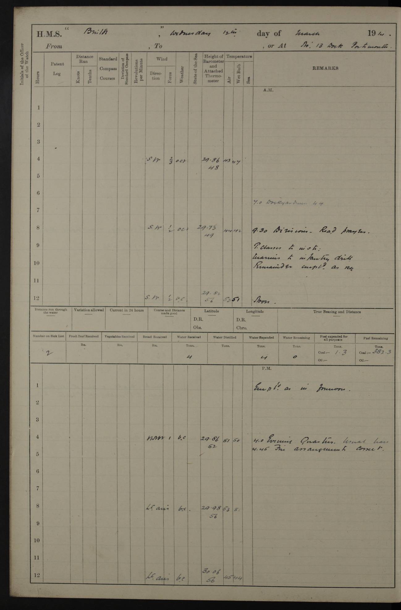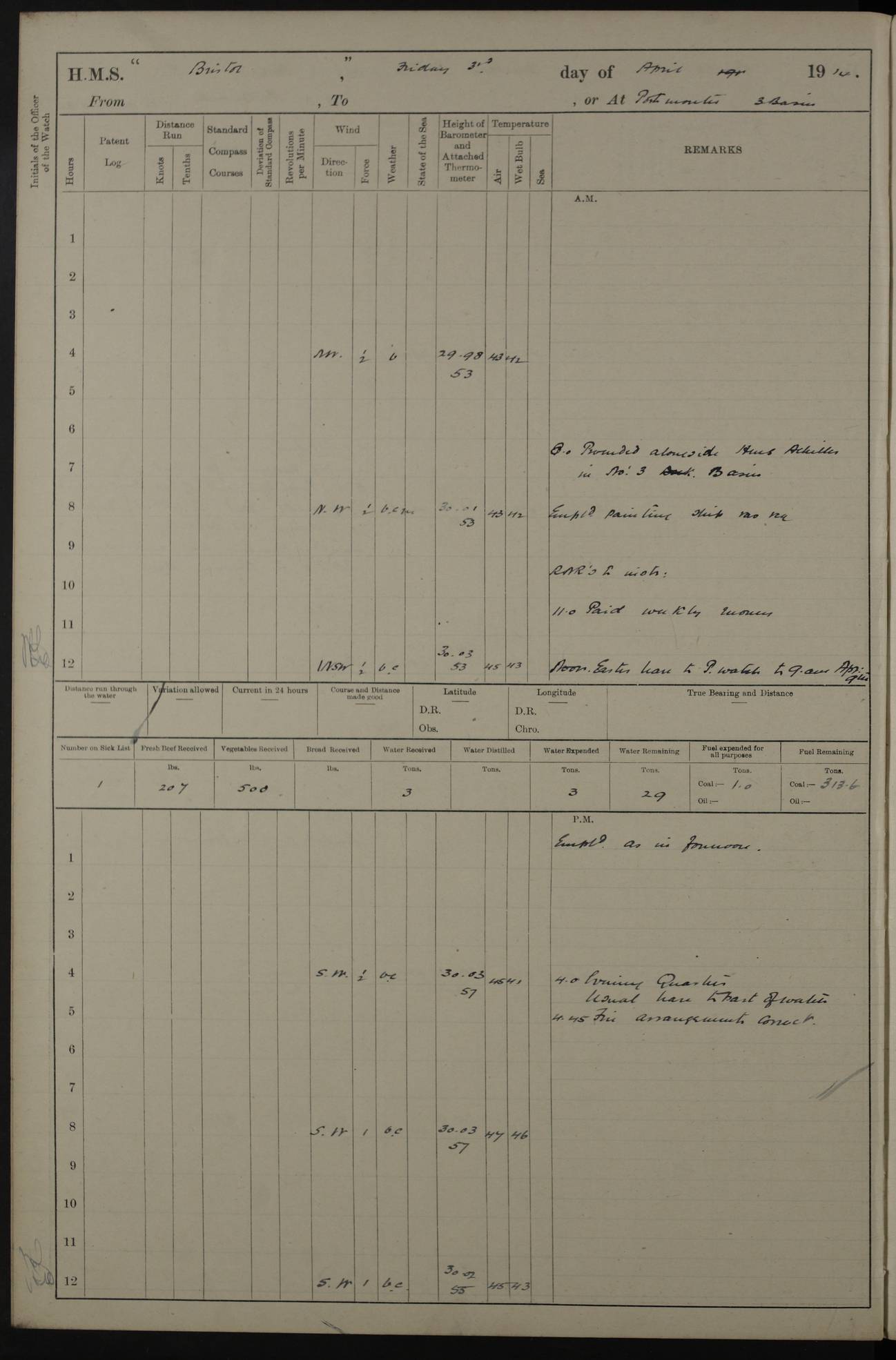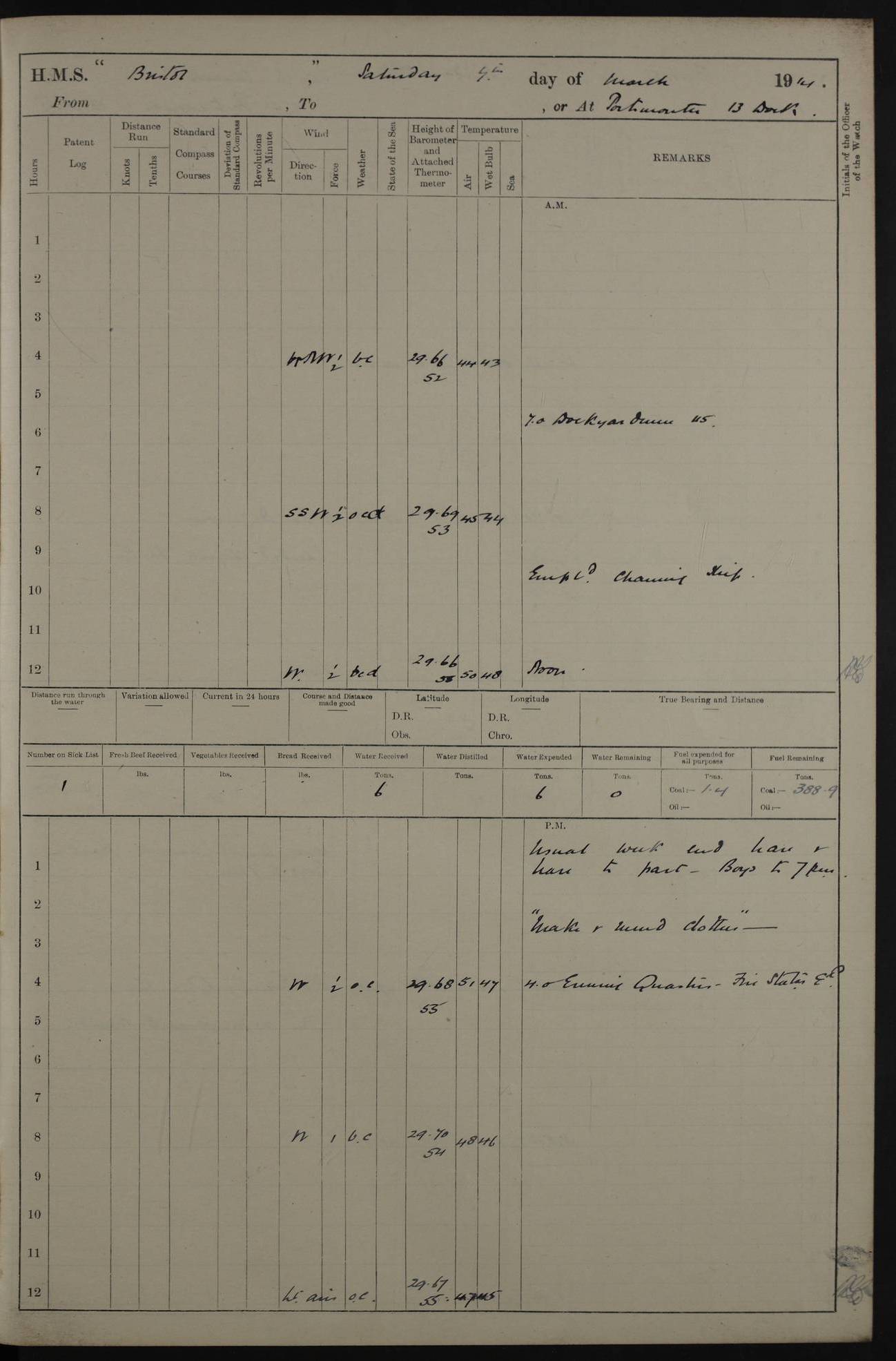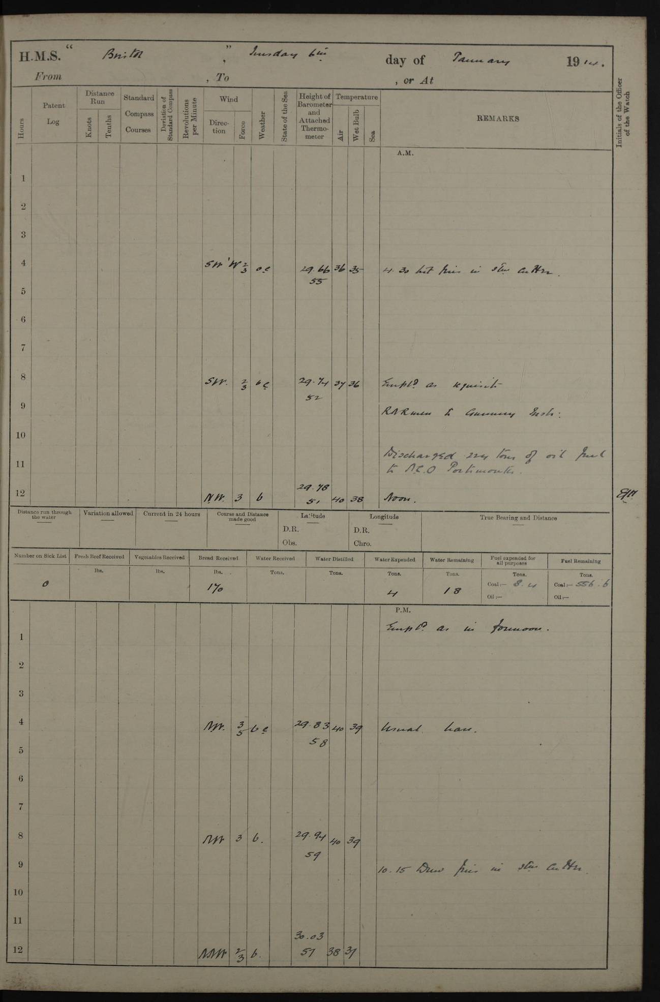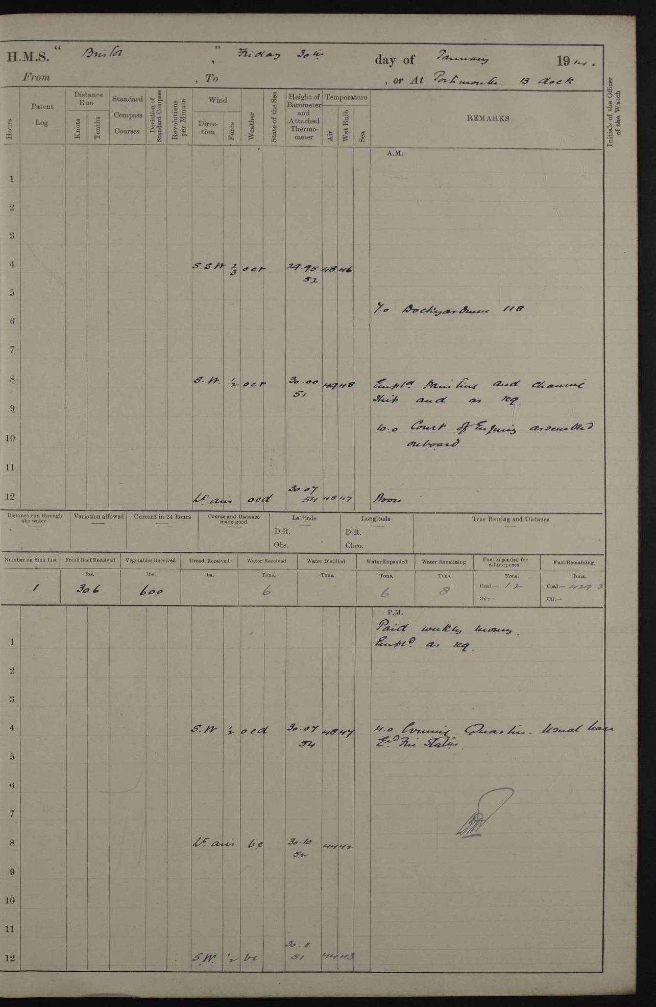 LOGS FOR JULY 1913 4ef4f40ee53e0a0c9100132d: (https://s3.amazonaws.com:443/oldweather/ADM53-36118/0006_0.jpg) 1 July 1913 Devonport Lat 50.38, Long -4.19 1 in sick list. 4.30am: Lit fires in Steam Cutter. Hands cleaning ship. 6.00am: Hands cleaning ship. 8.00am: Discharged ratings to ships in harbour. 9.00am: Recommissioned ship for service in 2nd Light Cruiser Squadron. 9.20am: Divisions. Hands cleaning ship. Dockyard parties drawing stores. 1.00pm: Hands drawing stores. Discharged 2 Privates RMLI to Barracks. 4.00pm: Leave to Watch till 7.00a.m. 9.00pm: 1 Sergeant RMLI joined ship. 10.15pm: Drew fires in Steam Cutter. 4ef4f40ee53e0a0c9100132e: (https://s3.amazonaws.com:443/oldweather/ADM53-36118/0006_1.jpg) 2 July 1913 Devonport Lat 50.38, Long -4.19 1 in sick list. 6.00am: Hands pumping water and as requisite. 9.00am: Dockyard parties drawing stores. Remainder of hands employed as requisite. 4ef4f40ee53e0a0c9100132f: (https://s3.amazonaws.com:443/oldweather/ADM53-36118/0007_0.jpg) 3 July 1913 Devonport Lat 50.38, Long -4.19 1 in sick list. 11.45am: Medical inspection of Ship's Company. 5.15pm: H.M.S. Defence arrived. 8.10pm: 1 Painter 2nd class joined ship. 4ef4f40ee53e0a0c91001330: (https://s3.amazonaws.com:443/oldweather/ADM53-36118/0007_1.jpg) 4 July 1913 Devonport Lat 50.38, Long -4.19 2 in sick list. 8.00am: Cleaned small arms. 12.45pm: Paid weekly money. 1.00pm: Lit fires in 1 Boiler. Hands securing boats for sea and as requisite. 4ef4f40ee53e0a0c91001331: (https://s3.amazonaws.com:443/oldweather/ADM53-36118/0008_0.jpg) 5 July 1913 Devonport to Plymouth Sound Lat 50.39, Long -4.14 2 on sick list. 6.45am: Landed escort. 8.30am: Escort and prisoner returned. 9.00am: Lit fires in 2 Boilers. Hands cleaning ship. Tested life buoys. Correct. 12.55pm: H.M. Tug Aetna towed stern to port. 1.00pm: Slipped and proceeded as requisite to Sound. 1.22pm: Stopped. 1.26pm: Came to with Starboard anchor, veered to 5 shackles in 6 fathoms. 2.15pm: Two ratings joined for passage to Portsmouth. 9.10pm: Sent boats to assist schooner aground on East end of Plymouth Breakwater (Owner W. Tugwell Esquire). Laid out small kedge and 4 1/2" grass. 4ef4f40ee53e0a0c91001332: (https://s3.amazonaws.com:443/oldweather/ADM53-36118/0008_1.jpg) 6 July 1913 Plymouth Lat 50.39, Long -4.14 2 on sick list. 5.45am: Schooner towed off by tug. 9.30am: Tug brought back kedge anchor. 10.00am: Divisions. Held Divine service onboard. 4ef4f40ee53e0a0c91001333: (https://s3.amazonaws.com:443/oldweather/ADM53-36118/0009_0.jpg) 7 July 1913 Plymouth to Spithead Lat 50.26, Long -3.26 1 on sick list. 8.50am: Weighed. 8.58am: Proceeded 170 revolutions. Course as requisite through West Entrance. 9.21am: Set Course SE. Mewstone: abeam. 9.30am: Mewstone: N10W. Revelstoke S87E. 10.21am: Altered course ESE. 10.57am: Altered course N87E. Prawle Point Bolt: N62 1/2W. Start Point: N10W. 3.50pm: Portland Bill: N65W. White Nose: N6W. 6.26pm: Needles Light House: abeam. Altered course as requisite up Needles Channel and to Spithead. 7.40pm: W. Ryde Middle: abeam to Starboard 4 cables. 8.07pm: Stopped. 8.10pm: Came to with Port anchor in 6 fathoms, veered to 5 shackles. Prepared for coaling. 4ef4f40ee53e0a0c91001334: (https://s3.amazonaws.com:443/oldweather/ADM53-36118/0009_1.jpg) 8 July 1913 Spithead to Portsmouth Harbour Lat 50.81, Long -1.11 1 on sick list. 7.39am: Embarked Pilot, weighed and proceeded as requisite 10 knots. 8.00am: Slow both. H.M. Tug "Malta" made fast alongside port side. 8.13am: Stopped. 8.20am: Made fast alongside "C1". 9.21am: Commenced coaling. 10.45am: Discharged 1 Able Seaman to H.M.A.S. "Sydney". 1.30pm: Discharged 1 Stoker to RN Barracks. 1 Leading Seaman and 1 Able Seaman joined from H.M.S. "Excellent". 2.45pm: 20 Ordinary Seamen joined from barracks. 4.20pm: 1 Ordinary Seaman joined from H.M.S. "Vernon". 6.30pm: Stopped coaling. 4ef4f40ee53e0a0c91001335: (https://s3.amazonaws.com:443/oldweather/ADM53-36118/0010_0.jpg) 9 July 1913 Portsmouth Lat 50.81, Long -1.11 Nil on sick list. 7,0am: Hands coaling ship. 2.30pm: Finished coaling. Received 527.0 tons. 3.30pm: 40 Stokers 2nd Class and 1 Ships Steward Assistant joined. 6.00pm: 7 Leading Stokers and 24 Stokers 1st class joined ship. 4ef4f40fe53e0a0c91001336: (https://s3.amazonaws.com:443/oldweather/ADM53-36118/0010_1.jpg) 10 July 1913 Portsmouth to Spithead Lat 50.75, Long -1.13 1 on sick list. 7.45am: H.M. Tugs "Enterprise" & "Malta" took ship in tow and transported her to mid stream. 8.08am: Proceeded 1/2 speed 130 revolutions out of harbour and as requisite to Spithead. 8.33am: Stopped. 8.35am: Came to with Port anchor in 6 fathoms, veered to 5 shackles. 4.00pm: Evening Quarters. Spread Quarter Deck awning. Leave to Watch till 7.00am. 1 Stoker Petty Officer and 1 Leading Stoker joined ship. 4ef4f40fe53e0a0c91001337: (https://s3.amazonaws.com:443/oldweather/ADM53-36118/0011_0.jpg) 11 July 1913 Spithead Lat 50.75, Long -1.13 1 on sick list. 12.45pm: Paid weekly money. 3.00pm: 4 Engine Room Artificers joined ship. 4.15pm: H.M.S. "Minerva " arrived. Leave to Watch till 7.00a.m. 1 Chief Stoker and 2 Leading Stokers joined. 4ef4f40fe53e0a0c91001338: (https://s3.amazonaws.com:443/oldweather/ADM53-36118/0011_1.jpg) 12 July 1913 Spithead Lat 50.75, Long -1.13 1 on sick list. 1.30pm: Leave to Watch till 7.00a.m. Monday. Youths till 10.00pm. and to boys till 6.45 pm. Make and mend clothes. 3.30pm: 10 Stoker Petty Officers joined ship. 6.00pm: Hands bathed. 4ef4f40fe53e0a0c91001339: (https://s3.amazonaws.com:443/oldweather/ADM53-36118/0012_0.jpg) 13 July 1913 Spithead Lat 50.75, Long -1.13 1 on sick list. 7.20am: H.M.S. "Blonde" arrived. 9.40am: Divisions. Held Divine Service. 1.00pm: H.M.S. "Enchantress" sailed. 7.35pm: H.M.S. "Liverpool" arrived. 4ef4f40fe53e0a0c9100133a: (https://s3.amazonaws.com:443/oldweather/ADM53-36118/0012_1.jpg) 4ef4f40fe53e0a0c9100133b: (https://s3.amazonaws.com:443/oldweather/ADM53-36118/0013_0.jpg) 4ef4f40fe53e0a0c9100133c: (https://s3.amazonaws.c