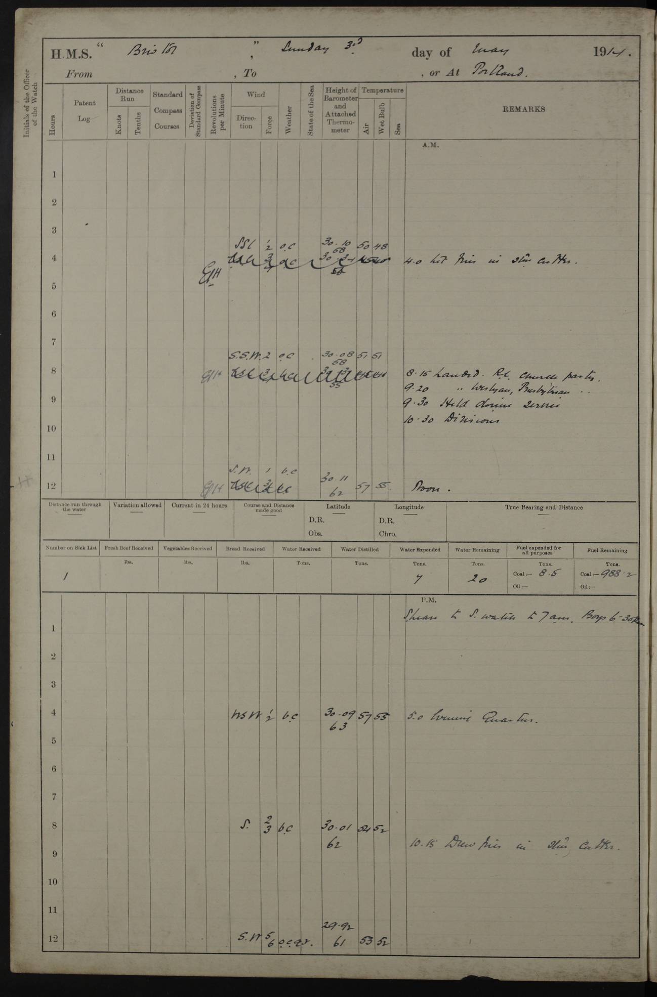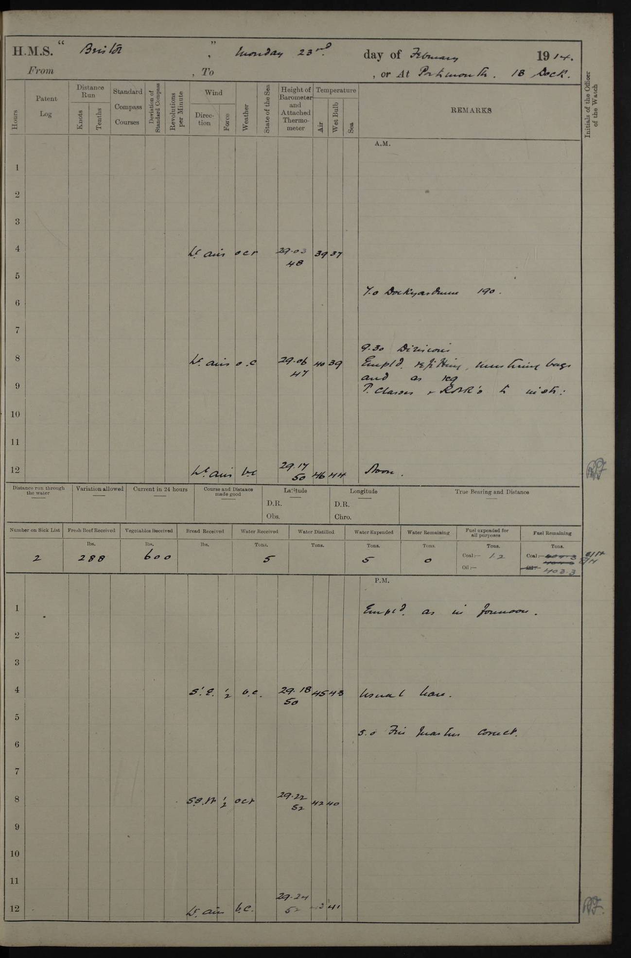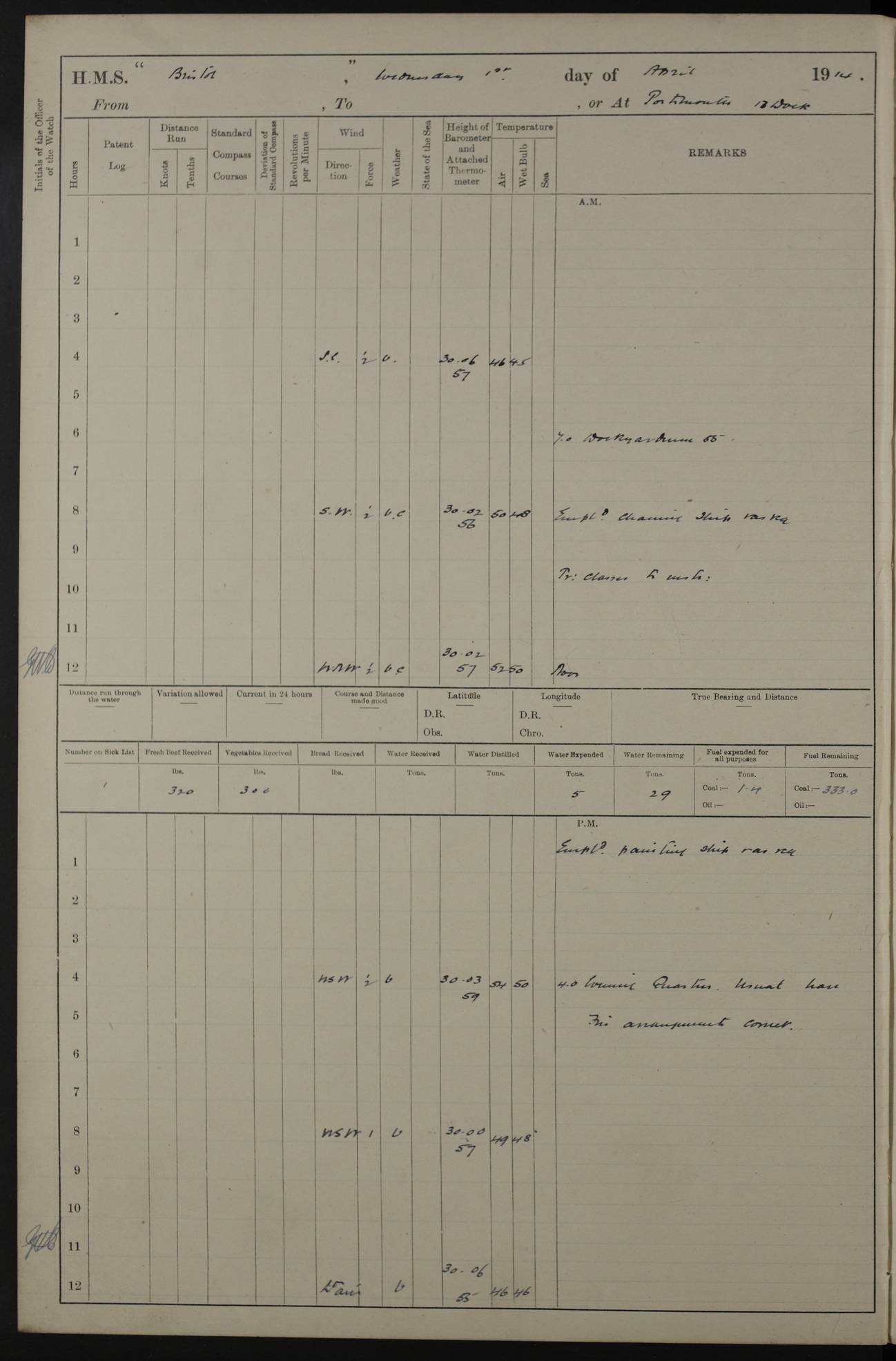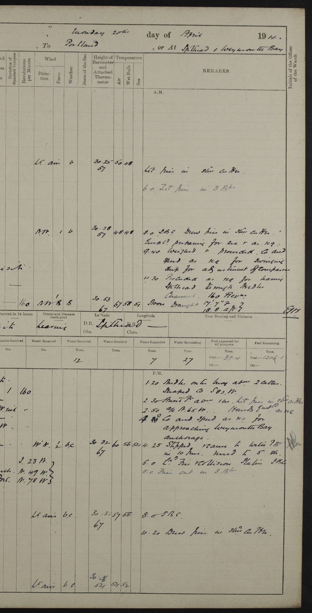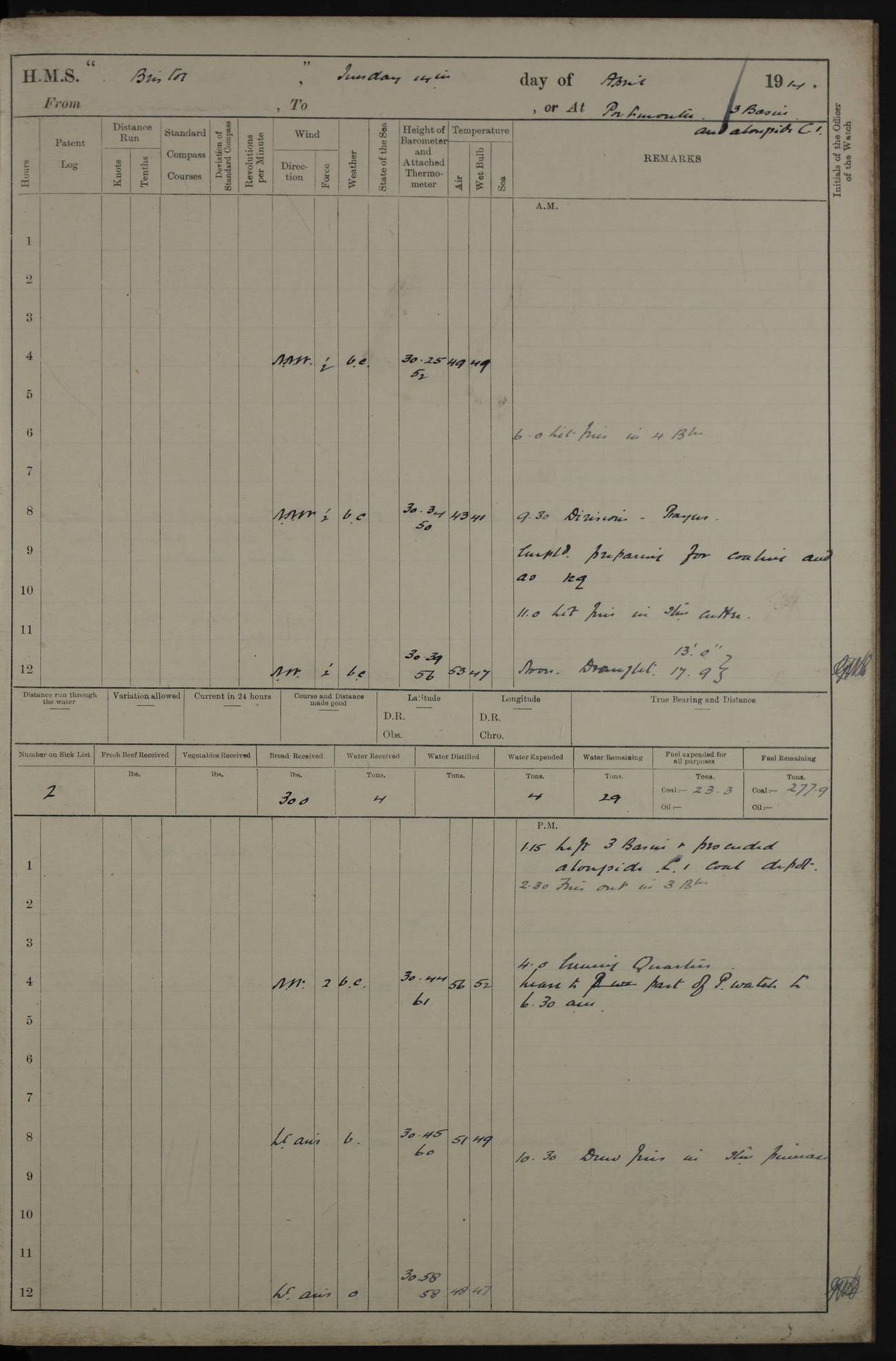 LOGS FOR JULY 1913 4ef4f40ee53e0a0c9100132d: (https://s3.amazonaws.com:443/oldweather/ADM53-36118/0006_0.jpg) 1 July 1913 Devonport Lat 50.38, Long -4.19 1 in sick list. 4.30am: Lit fires in Steam Cutter. Hands cleaning ship. 6.00am: Hands cleaning ship. 8.00am: Discharged ratings to ships in harbour. 9.00am: Recommissioned ship for service in 2nd Light Cruiser Squadron. 9.20am: Divisions. Hands cleaning ship. Dockyard parties drawing stores. 1.00pm: Hands drawing stores. Discharged 2 Privates RMLI to Barracks. 4.00pm: Leave to Watch till 7.00a.m. 9.00pm: 1 Sergeant RMLI joined ship. 10.15pm: Drew fires in Steam Cutter. 4ef4f40ee53e0a0c9100132e: (https://s3.amazonaws.com:443/oldweather/ADM53-36118/0006_1.jpg) 2 July 1913 Devonport Lat 50.38, Long -4.19 1 in sick list. 6.00am: Hands pumping water and as requisite. 9.00am: Dockyard parties drawing stores. Remainder of hands employed as requisite. 4ef4f40ee53e0a0c9100132f: (https://s3.amazonaws.com:443/oldweather/ADM53-36118/0007_0.jpg) 3 July 1913 Devonport Lat 50.38, Long -4.19 1 in sick list. 11.45am: Medical inspection of Ship's Company. 5.15pm: H.M.S. Defence arrived. 8.10pm: 1 Painter 2nd class joined ship. 4ef4f40ee53e0a0c91001330: (https://s3.amazonaws.com:443/oldweather/ADM53-36118/0007_1.jpg) 4 July 1913 Devonport Lat 50.38, Long -4.19 2 in sick list. 8.00am: Cleaned small arms. 12.45pm: Paid weekly money. 1.00pm: Lit fires in 1 Boiler. Hands securing boats for sea and as requisite. 4ef4f40ee53e0a0c91001331: (https://s3.amazonaws.com:443/oldweather/ADM53-36118/0008_0.jpg) 5 July 1913 Devonport to Plymouth Sound Lat 50.39, Long -4.14 2 on sick list. 6.45am: Landed escort. 8.30am: Escort and prisoner returned. 9.00am: Lit fires in 2 Boilers. Hands cleaning ship. Tested life buoys. Correct. 12.55pm: H.M. Tug Aetna towed stern to port. 1.00pm: Slipped and proceeded as requisite to Sound. 1.22pm: Stopped. 1.26pm: Came to with Starboard anchor, veered to 5 shackles in 6 fathoms. 2.15pm: Two ratings joined for passage to Portsmouth. 9.10pm: Sent boats to assist schooner aground on East end of Plymouth Breakwater (Owner W. Tugwell Esquire). Laid out small kedge and 4 1/2" grass. 4ef4f40ee53e0a0c91001332: (https://s3.amazonaws.com:443/oldweather/ADM53-36118/0008_1.jpg) 6 July 1913 Plymouth Lat 50.39, Long -4.14 2 on sick list. 5.45am: Schooner towed off by tug. 9.30am: Tug brought back kedge anchor. 10.00am: Divisions. Held Divine service onboard. 4ef4f40ee53e0a0c91001333: (https://s3.amazonaws.com:443/oldweather/ADM53-36118/0009_0.jpg) 7 July 1913 Plymouth to Spithead Lat 50.26, Long -3.26 1 on sick list. 8.50am: Weighed. 8.58am: Proceeded 170 revolutions. Course as requisite through West Entrance. 9.21am: Set Course SE. Mewstone: abeam. 9.30am: Mewstone: N10W. Revelstoke S87E. 10.21am: Altered course ESE. 10.57am: Altered course N87E. Prawle Point Bolt: N62 1/2W. Start Point: N10W. 3.50pm: Portland Bill: N65W. White Nose: N6W. 6.26pm: Needles Light House: abeam. Altered course as requisite up Needles Channel and to Spithead. 7.40pm: W. Ryde Middle: abeam to Starboard 4 cables. 8.07pm: Stopped. 8.10pm: Came to with Port anchor in 6 fathoms, veered to 5 shackles. Prepared for coaling. 4ef4f40ee53e0a0c91001334: (https://s3.amazonaws.com:443/oldweather/ADM53-36118/0009_1.jpg) 8 July 1913 Spithead to Portsmouth Harbour Lat 50.81, Long -1.11 1 on sick list. 7.39am: Embarked Pilot, weighed and proceeded as requisite 10 knots. 8.00am: Slow both. H.M. Tug "Malta" made fast alongside port side. 8.13am: Stopped. 8.20am: Made fast alongside "C1". 9.21am: Commenced coaling. 10.45am: Discharged 1 Able Seaman to H.M.A.S. "Sydney". 1.30pm: Discharged 1 Stoker to RN Barracks. 1 Leading Seaman and 1 Able Seaman joined from H.M.S. "Excellent". 2.45pm: 20 Ordinary Seamen joined from barracks. 4.20pm: 1 Ordinary Seaman joined from H.M.S. "Vernon". 6.30pm: Stopped coaling. 4ef4f40ee53e0a0c91001335: (https://s3.amazonaws.com:443/oldweather/ADM53-36118/0010_0.jpg) 9 July 1913 Portsmouth Lat 50.81, Long -1.11 Nil on sick list. 7,0am: Hands coaling ship. 2.30pm: Finished coaling. Received 527.0 tons. 3.30pm: 40 Stokers 2nd Class and 1 Ships Steward Assistant joined. 6.00pm: 7 Leading Stokers and 24 Stokers 1st class joined ship. 4ef4f40fe53e0a0c91001336: (https://s3.amazonaws.com:443/oldweather/ADM53-36118/0010_1.jpg) 10 July 1913 Portsmouth to Spithead Lat 50.75, Long -1.13 1 on sick list. 7.45am: H.M. Tugs "Enterprise" & "Malta" took ship in tow and transported her to mid stream. 8.08am: Proceeded 1/2 speed 130 revolutions out of harbour and as requisite to Spithead. 8.33am: Stopped. 8.35am: Came to with Port anchor in 6 fathoms, veered to 5 shackles. 4.00pm: Evening Quarters. Spread Quarter Deck awning. Leave to Watch till 7.00am. 1 Stoker Petty Officer and 1 Leading Stoker joined ship. 4ef4f40fe53e0a0c91001337: (https://s3.amazonaws.com:443/oldweather/ADM53-36118/0011_0.jpg) 11 July 1913 Spithead Lat 50.75, Long -1.13 1 on sick list. 12.45pm: Paid weekly money. 3.00pm: 4 Engine Room Artificers joined ship. 4.15pm: H.M.S. "Minerva " arrived. Leave to Watch till 7.00a.m. 1 Chief Stoker and 2 Leading Stokers joined. 4ef4f40fe53e0a0c91001338: (https://s3.amazonaws.com:443/oldweather/ADM53-36118/0011_1.jpg) 12 July 1913 Spithead Lat 50.75, Long -1.13 1 on sick list. 1.30pm: Leave to Watch till 7.00a.m. Monday. Youths till 10.00pm. and to boys till 6.45 pm. Make and mend clothes. 3.30pm: 10 Stoker Petty Officers joined ship. 6.00pm: Hands bathed. 4ef4f40fe53e0a0c91001339: (https://s3.amazonaws.com:443/oldweather/ADM53-36118/0012_0.jpg) 13 July 1913 Spithead Lat 50.75, Long -1.13 1 on sick list. 7.20am: H.M.S. "Blonde" arrived. 9.40am: Divisions. Held Divine Service. 1.00pm: H.M.S. "Enchantress" sailed. 7.35pm: H.M.S. "Liverpool" arrived. 4ef4f40fe53e0a0c9100133a: (https://s3.amazonaws.com:443/oldweather/ADM53-36118/0012_1.jpg) 4ef4f40fe53e0a0c9100133b: (https://s3.amazonaws.com:443/oldweather/ADM53-36118/0013_0.jpg) 4ef4f40fe53e0a0c9100133c: (https://s3.amazonaws.c