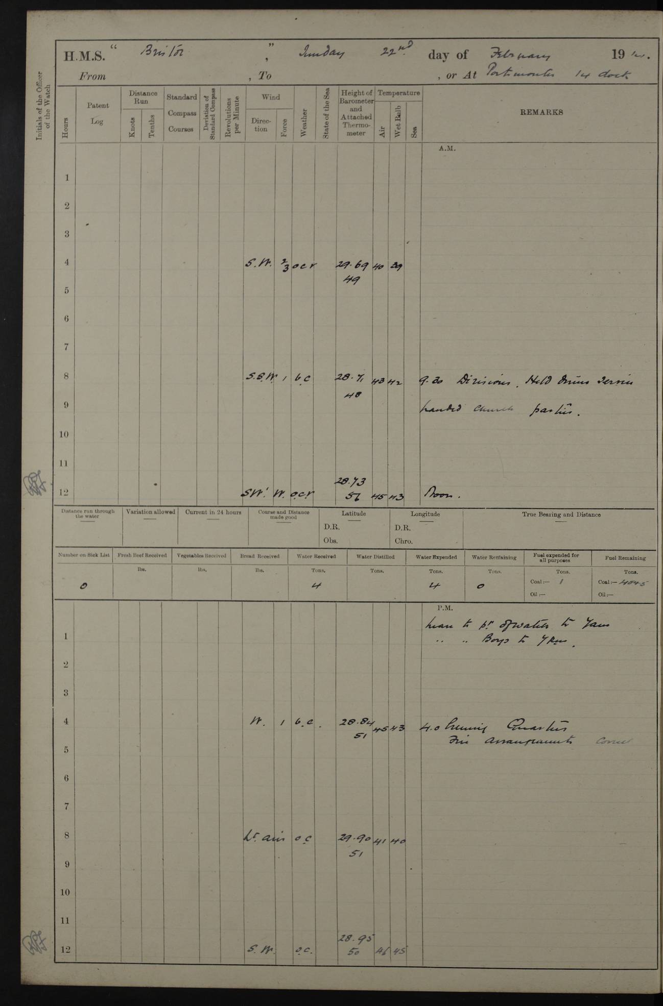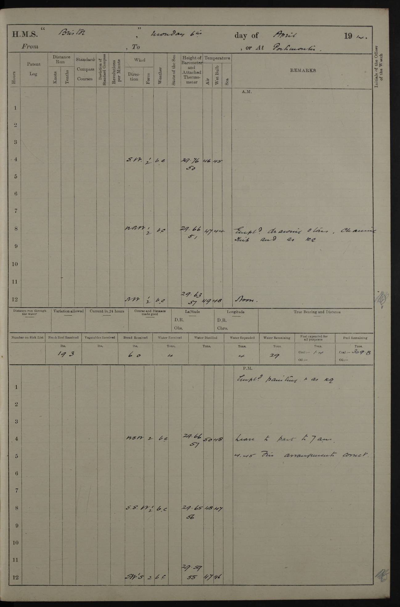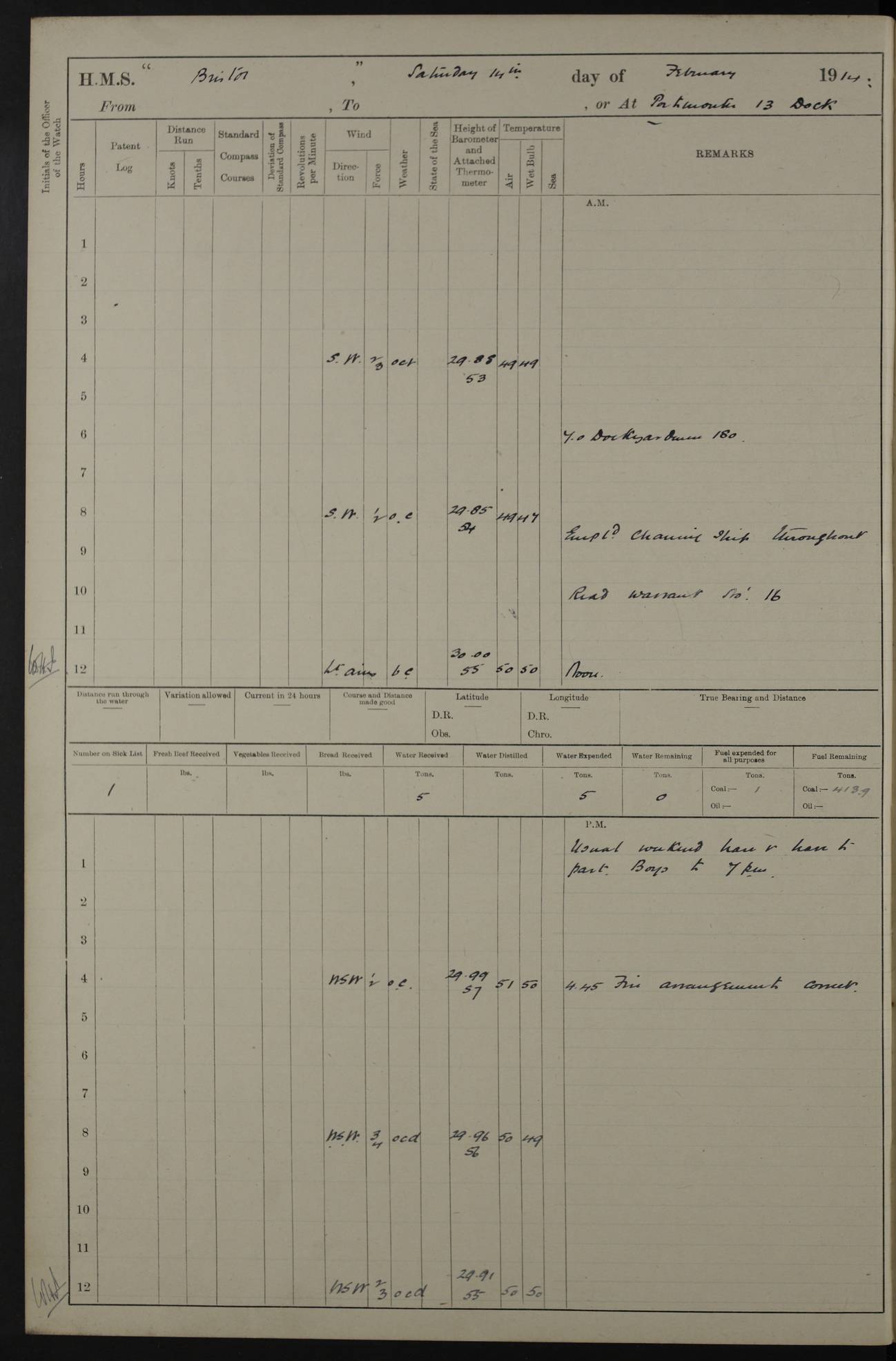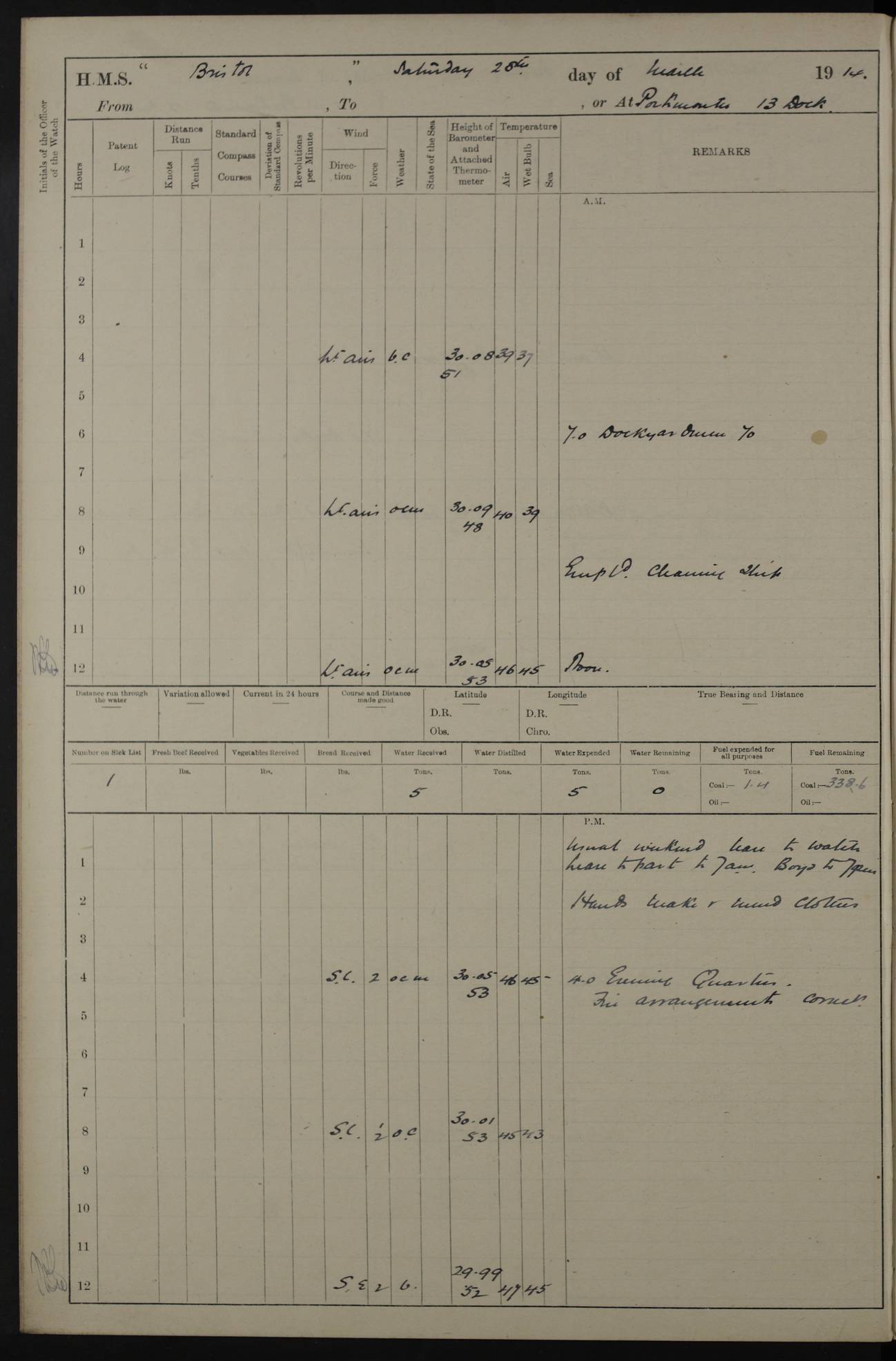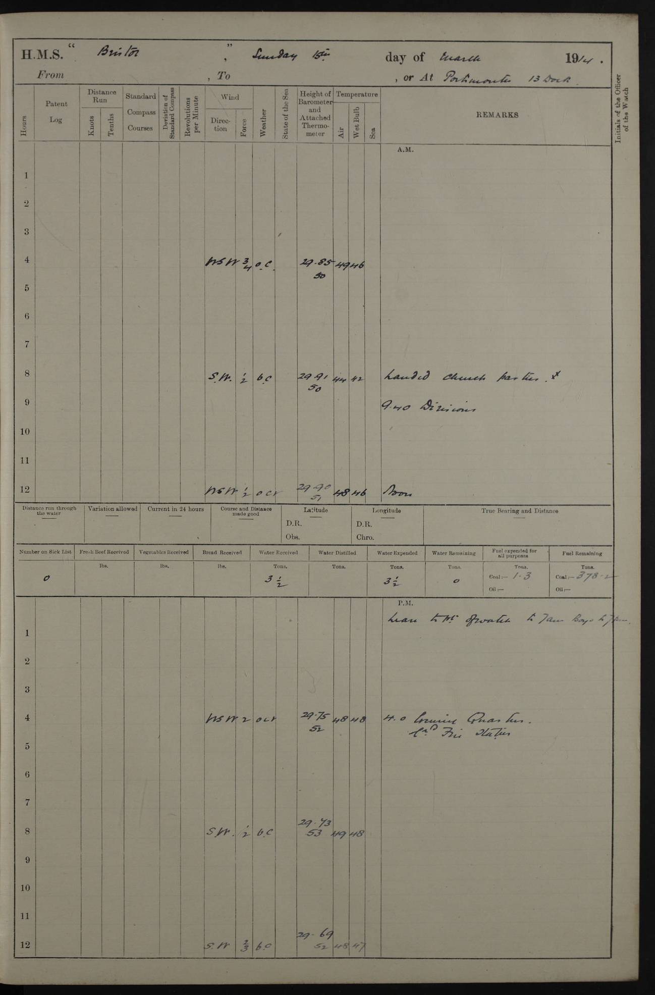 LOGS FOR JULY 1913 4ef4f40ee53e0a0c9100132d: (https://s3.amazonaws.com:443/oldweather/ADM53-36118/0006_0.jpg) 1 July 1913 Devonport Lat 50.38, Long -4.19 1 in sick list. 4.30am: Lit fires in Steam Cutter. Hands cleaning ship. 6.00am: Hands cleaning ship. 8.00am: Discharged ratings to ships in harbour. 9.00am: Recommissioned ship for service in 2nd Light Cruiser Squadron. 9.20am: Divisions. Hands cleaning ship. Dockyard parties drawing stores. 1.00pm: Hands drawing stores. Discharged 2 Privates RMLI to Barracks. 4.00pm: Leave to Watch till 7.00a.m. 9.00pm: 1 Sergeant RMLI joined ship. 10.15pm: Drew fires in Steam Cutter. 4ef4f40ee53e0a0c9100132e: (https://s3.amazonaws.com:443/oldweather/ADM53-36118/0006_1.jpg) 2 July 1913 Devonport Lat 50.38, Long -4.19 1 in sick list. 6.00am: Hands pumping water and as requisite. 9.00am: Dockyard parties drawing stores. Remainder of hands employed as requisite. 4ef4f40ee53e0a0c9100132f: (https://s3.amazonaws.com:443/oldweather/ADM53-36118/0007_0.jpg) 3 July 1913 Devonport Lat 50.38, Long -4.19 1 in sick list. 11.45am: Medical inspection of Ship's Company. 5.15pm: H.M.S. Defence arrived. 8.10pm: 1 Painter 2nd class joined ship. 4ef4f40ee53e0a0c91001330: (https://s3.amazonaws.com:443/oldweather/ADM53-36118/0007_1.jpg) 4 July 1913 Devonport Lat 50.38, Long -4.19 2 in sick list. 8.00am: Cleaned small arms. 12.45pm: Paid weekly money. 1.00pm: Lit fires in 1 Boiler. Hands securing boats for sea and as requisite. 4ef4f40ee53e0a0c91001331: (https://s3.amazonaws.com:443/oldweather/ADM53-36118/0008_0.jpg) 5 July 1913 Devonport to Plymouth Sound Lat 50.39, Long -4.14 2 on sick list. 6.45am: Landed escort. 8.30am: Escort and prisoner returned. 9.00am: Lit fires in 2 Boilers. Hands cleaning ship. Tested life buoys. Correct. 12.55pm: H.M. Tug Aetna towed stern to port. 1.00pm: Slipped and proceeded as requisite to Sound. 1.22pm: Stopped. 1.26pm: Came to with Starboard anchor, veered to 5 shackles in 6 fathoms. 2.15pm: Two ratings joined for passage to Portsmouth. 9.10pm: Sent boats to assist schooner aground on East end of Plymouth Breakwater (Owner W. Tugwell Esquire). Laid out small kedge and 4 1/2" grass. 4ef4f40ee53e0a0c91001332: (https://s3.amazonaws.com:443/oldweather/ADM53-36118/0008_1.jpg) 6 July 1913 Plymouth Lat 50.39, Long -4.14 2 on sick list. 5.45am: Schooner towed off by tug. 9.30am: Tug brought back kedge anchor. 10.00am: Divisions. Held Divine service onboard. 4ef4f40ee53e0a0c91001333: (https://s3.amazonaws.com:443/oldweather/ADM53-36118/0009_0.jpg) 7 July 1913 Plymouth to Spithead Lat 50.26, Long -3.26 1 on sick list. 8.50am: Weighed. 8.58am: Proceeded 170 revolutions. Course as requisite through West Entrance. 9.21am: Set Course SE. Mewstone: abeam. 9.30am: Mewstone: N10W. Revelstoke S87E. 10.21am: Altered course ESE. 10.57am: Altered course N87E. Prawle Point Bolt: N62 1/2W. Start Point: N10W. 3.50pm: Portland Bill: N65W. White Nose: N6W. 6.26pm: Needles Light House: abeam. Altered course as requisite up Needles Channel and to Spithead. 7.40pm: W. Ryde Middle: abeam to Starboard 4 cables. 8.07pm: Stopped. 8.10pm: Came to with Port anchor in 6 fathoms, veered to 5 shackles. Prepared for coaling. 4ef4f40ee53e0a0c91001334: (https://s3.amazonaws.com:443/oldweather/ADM53-36118/0009_1.jpg) 8 July 1913 Spithead to Portsmouth Harbour Lat 50.81, Long -1.11 1 on sick list. 7.39am: Embarked Pilot, weighed and proceeded as requisite 10 knots. 8.00am: Slow both. H.M. Tug "Malta" made fast alongside port side. 8.13am: Stopped. 8.20am: Made fast alongside "C1". 9.21am: Commenced coaling. 10.45am: Discharged 1 Able Seaman to H.M.A.S. "Sydney". 1.30pm: Discharged 1 Stoker to RN Barracks. 1 Leading Seaman and 1 Able Seaman joined from H.M.S. "Excellent". 2.45pm: 20 Ordinary Seamen joined from barracks. 4.20pm: 1 Ordinary Seaman joined from H.M.S. "Vernon". 6.30pm: Stopped coaling. 4ef4f40ee53e0a0c91001335: (https://s3.amazonaws.com:443/oldweather/ADM53-36118/0010_0.jpg) 9 July 1913 Portsmouth Lat 50.81, Long -1.11 Nil on sick list. 7,0am: Hands coaling ship. 2.30pm: Finished coaling. Received 527.0 tons. 3.30pm: 40 Stokers 2nd Class and 1 Ships Steward Assistant joined. 6.00pm: 7 Leading Stokers and 24 Stokers 1st class joined ship. 4ef4f40fe53e0a0c91001336: (https://s3.amazonaws.com:443/oldweather/ADM53-36118/0010_1.jpg) 10 July 1913 Portsmouth to Spithead Lat 50.75, Long -1.13 1 on sick list. 7.45am: H.M. Tugs "Enterprise" & "Malta" took ship in tow and transported her to mid stream. 8.08am: Proceeded 1/2 speed 130 revolutions out of harbour and as requisite to Spithead. 8.33am: Stopped. 8.35am: Came to with Port anchor in 6 fathoms, veered to 5 shackles. 4.00pm: Evening Quarters. Spread Quarter Deck awning. Leave to Watch till 7.00am. 1 Stoker Petty Officer and 1 Leading Stoker joined ship. 4ef4f40fe53e0a0c91001337: (https://s3.amazonaws.com:443/oldweather/ADM53-36118/0011_0.jpg) 11 July 1913 Spithead Lat 50.75, Long -1.13 1 on sick list. 12.45pm: Paid weekly money. 3.00pm: 4 Engine Room Artificers joined ship. 4.15pm: H.M.S. "Minerva " arrived. Leave to Watch till 7.00a.m. 1 Chief Stoker and 2 Leading Stokers joined. 4ef4f40fe53e0a0c91001338: (https://s3.amazonaws.com:443/oldweather/ADM53-36118/0011_1.jpg) 12 July 1913 Spithead Lat 50.75, Long -1.13 1 on sick list. 1.30pm: Leave to Watch till 7.00a.m. Monday. Youths till 10.00pm. and to boys till 6.45 pm. Make and mend clothes. 3.30pm: 10 Stoker Petty Officers joined ship. 6.00pm: Hands bathed. 4ef4f40fe53e0a0c91001339: (https://s3.amazonaws.com:443/oldweather/ADM53-36118/0012_0.jpg) 13 July 1913 Spithead Lat 50.75, Long -1.13 1 on sick list. 7.20am: H.M.S. "Blonde" arrived. 9.40am: Divisions. Held Divine Service. 1.00pm: H.M.S. "Enchantress" sailed. 7.35pm: H.M.S. "Liverpool" arrived. 4ef4f40fe53e0a0c9100133a: (https://s3.amazonaws.com:443/oldweather/ADM53-36118/0012_1.jpg) 4ef4f40fe53e0a0c9100133b: (https://s3.amazonaws.com:443/oldweather/ADM53-36118/0013_0.jpg) 4ef4f40fe53e0a0c9100133c: (https://s3.amazonaws.c