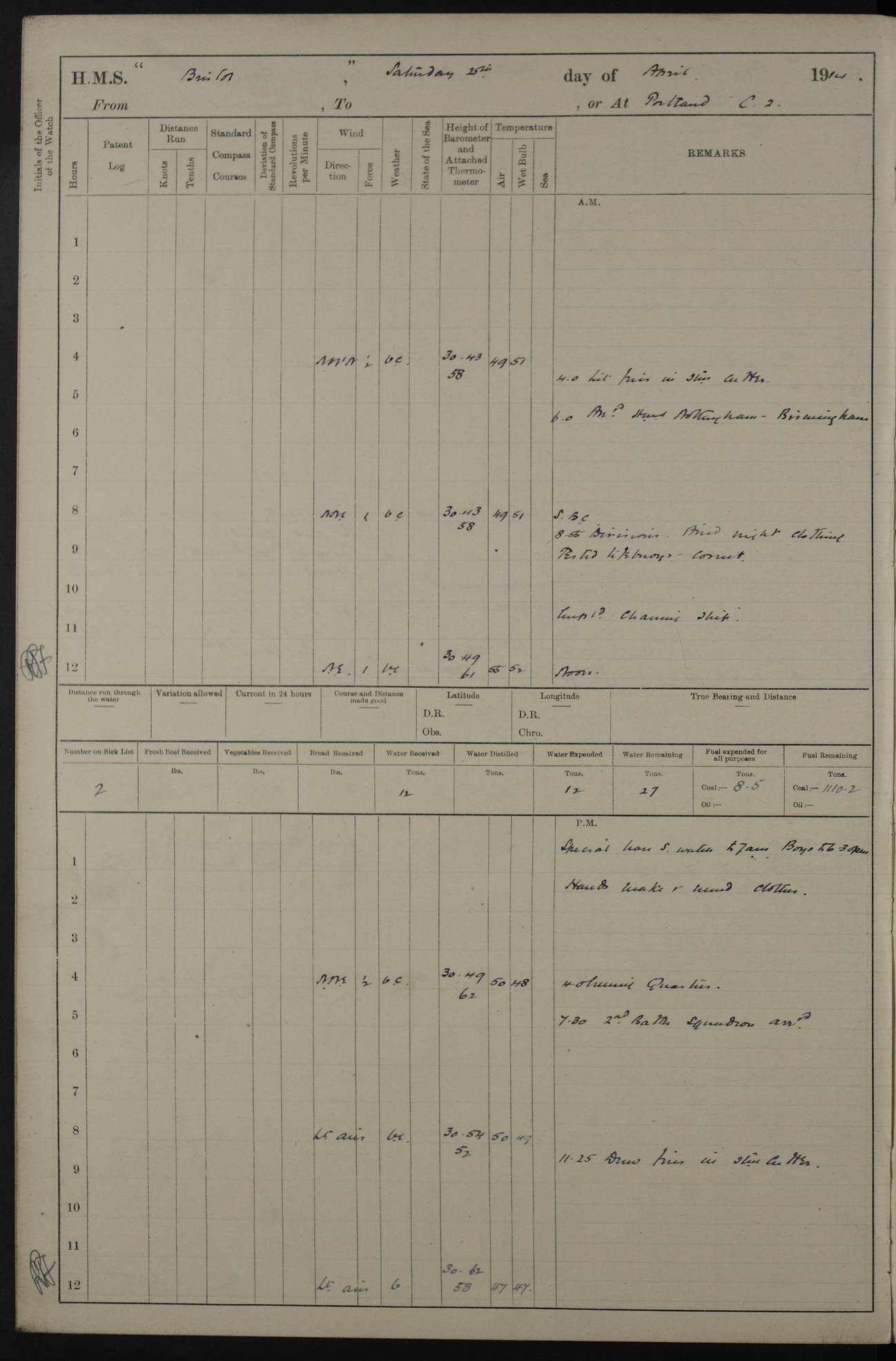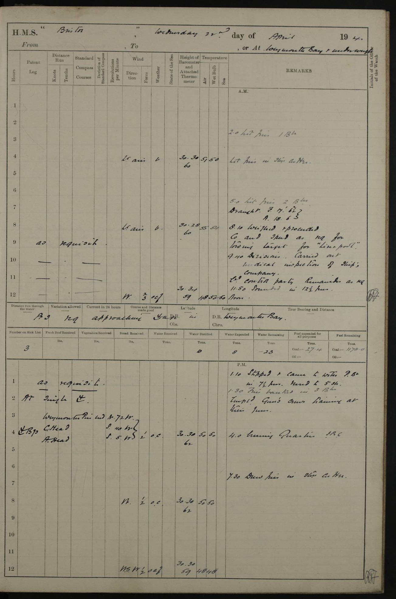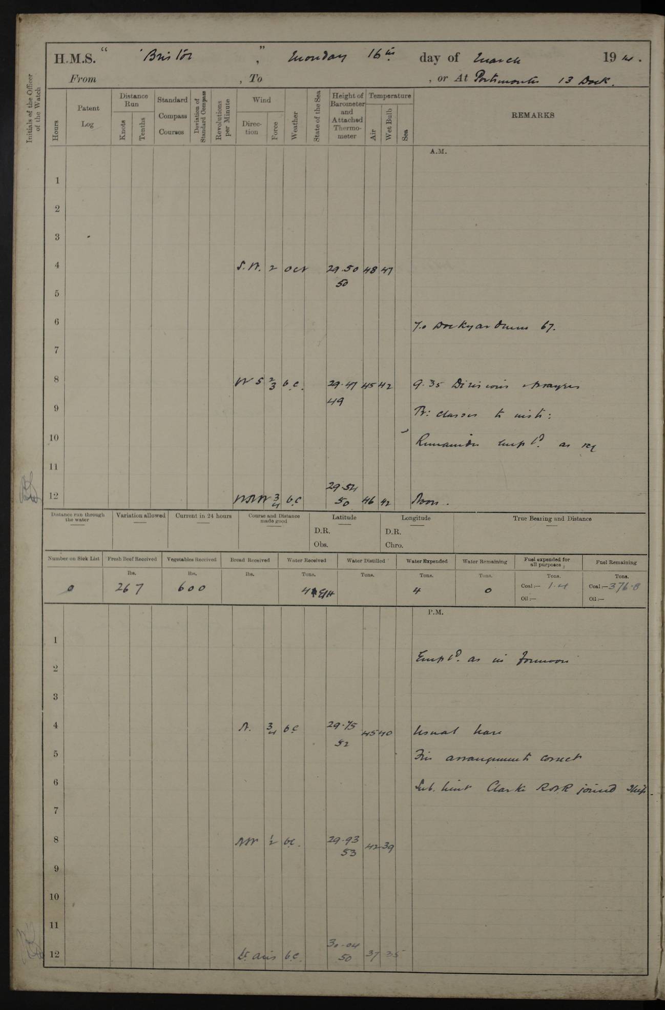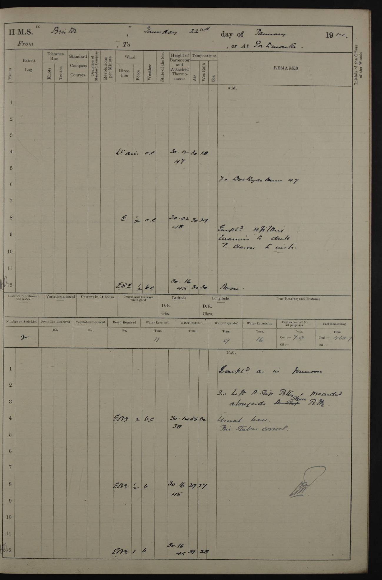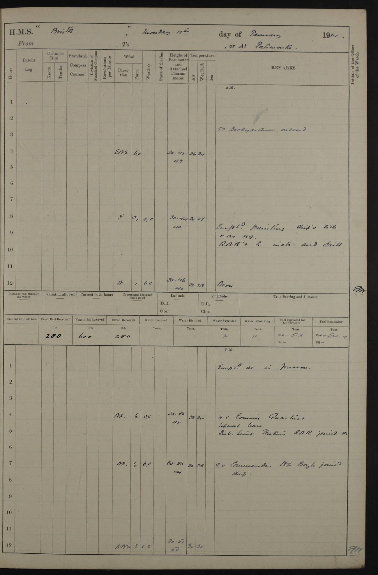 LOGS FOR JULY 1913 4ef4f40ee53e0a0c9100132d: (https://s3.amazonaws.com:443/oldweather/ADM53-36118/0006_0.jpg) 1 July 1913 Devonport Lat 50.38, Long -4.19 1 in sick list. 4.30am: Lit fires in Steam Cutter. Hands cleaning ship. 6.00am: Hands cleaning ship. 8.00am: Discharged ratings to ships in harbour. 9.00am: Recommissioned ship for service in 2nd Light Cruiser Squadron. 9.20am: Divisions. Hands cleaning ship. Dockyard parties drawing stores. 1.00pm: Hands drawing stores. Discharged 2 Privates RMLI to Barracks. 4.00pm: Leave to Watch till 7.00a.m. 9.00pm: 1 Sergeant RMLI joined ship. 10.15pm: Drew fires in Steam Cutter. 4ef4f40ee53e0a0c9100132e: (https://s3.amazonaws.com:443/oldweather/ADM53-36118/0006_1.jpg) 2 July 1913 Devonport Lat 50.38, Long -4.19 1 in sick list. 6.00am: Hands pumping water and as requisite. 9.00am: Dockyard parties drawing stores. Remainder of hands employed as requisite. 4ef4f40ee53e0a0c9100132f: (https://s3.amazonaws.com:443/oldweather/ADM53-36118/0007_0.jpg) 3 July 1913 Devonport Lat 50.38, Long -4.19 1 in sick list. 11.45am: Medical inspection of Ship's Company. 5.15pm: H.M.S. Defence arrived. 8.10pm: 1 Painter 2nd class joined ship. 4ef4f40ee53e0a0c91001330: (https://s3.amazonaws.com:443/oldweather/ADM53-36118/0007_1.jpg) 4 July 1913 Devonport Lat 50.38, Long -4.19 2 in sick list. 8.00am: Cleaned small arms. 12.45pm: Paid weekly money. 1.00pm: Lit fires in 1 Boiler. Hands securing boats for sea and as requisite. 4ef4f40ee53e0a0c91001331: (https://s3.amazonaws.com:443/oldweather/ADM53-36118/0008_0.jpg) 5 July 1913 Devonport to Plymouth Sound Lat 50.39, Long -4.14 2 on sick list. 6.45am: Landed escort. 8.30am: Escort and prisoner returned. 9.00am: Lit fires in 2 Boilers. Hands cleaning ship. Tested life buoys. Correct. 12.55pm: H.M. Tug Aetna towed stern to port. 1.00pm: Slipped and proceeded as requisite to Sound. 1.22pm: Stopped. 1.26pm: Came to with Starboard anchor, veered to 5 shackles in 6 fathoms. 2.15pm: Two ratings joined for passage to Portsmouth. 9.10pm: Sent boats to assist schooner aground on East end of Plymouth Breakwater (Owner W. Tugwell Esquire). Laid out small kedge and 4 1/2" grass. 4ef4f40ee53e0a0c91001332: (https://s3.amazonaws.com:443/oldweather/ADM53-36118/0008_1.jpg) 6 July 1913 Plymouth Lat 50.39, Long -4.14 2 on sick list. 5.45am: Schooner towed off by tug. 9.30am: Tug brought back kedge anchor. 10.00am: Divisions. Held Divine service onboard. 4ef4f40ee53e0a0c91001333: (https://s3.amazonaws.com:443/oldweather/ADM53-36118/0009_0.jpg) 7 July 1913 Plymouth to Spithead Lat 50.26, Long -3.26 1 on sick list. 8.50am: Weighed. 8.58am: Proceeded 170 revolutions. Course as requisite through West Entrance. 9.21am: Set Course SE. Mewstone: abeam. 9.30am: Mewstone: N10W. Revelstoke S87E. 10.21am: Altered course ESE. 10.57am: Altered course N87E. Prawle Point Bolt: N62 1/2W. Start Point: N10W. 3.50pm: Portland Bill: N65W. White Nose: N6W. 6.26pm: Needles Light House: abeam. Altered course as requisite up Needles Channel and to Spithead. 7.40pm: W. Ryde Middle: abeam to Starboard 4 cables. 8.07pm: Stopped. 8.10pm: Came to with Port anchor in 6 fathoms, veered to 5 shackles. Prepared for coaling. 4ef4f40ee53e0a0c91001334: (https://s3.amazonaws.com:443/oldweather/ADM53-36118/0009_1.jpg) 8 July 1913 Spithead to Portsmouth Harbour Lat 50.81, Long -1.11 1 on sick list. 7.39am: Embarked Pilot, weighed and proceeded as requisite 10 knots. 8.00am: Slow both. H.M. Tug "Malta" made fast alongside port side. 8.13am: Stopped. 8.20am: Made fast alongside "C1". 9.21am: Commenced coaling. 10.45am: Discharged 1 Able Seaman to H.M.A.S. "Sydney". 1.30pm: Discharged 1 Stoker to RN Barracks. 1 Leading Seaman and 1 Able Seaman joined from H.M.S. "Excellent". 2.45pm: 20 Ordinary Seamen joined from barracks. 4.20pm: 1 Ordinary Seaman joined from H.M.S. "Vernon". 6.30pm: Stopped coaling. 4ef4f40ee53e0a0c91001335: (https://s3.amazonaws.com:443/oldweather/ADM53-36118/0010_0.jpg) 9 July 1913 Portsmouth Lat 50.81, Long -1.11 Nil on sick list. 7,0am: Hands coaling ship. 2.30pm: Finished coaling. Received 527.0 tons. 3.30pm: 40 Stokers 2nd Class and 1 Ships Steward Assistant joined. 6.00pm: 7 Leading Stokers and 24 Stokers 1st class joined ship. 4ef4f40fe53e0a0c91001336: (https://s3.amazonaws.com:443/oldweather/ADM53-36118/0010_1.jpg) 10 July 1913 Portsmouth to Spithead Lat 50.75, Long -1.13 1 on sick list. 7.45am: H.M. Tugs "Enterprise" & "Malta" took ship in tow and transported her to mid stream. 8.08am: Proceeded 1/2 speed 130 revolutions out of harbour and as requisite to Spithead. 8.33am: Stopped. 8.35am: Came to with Port anchor in 6 fathoms, veered to 5 shackles. 4.00pm: Evening Quarters. Spread Quarter Deck awning. Leave to Watch till 7.00am. 1 Stoker Petty Officer and 1 Leading Stoker joined ship. 4ef4f40fe53e0a0c91001337: (https://s3.amazonaws.com:443/oldweather/ADM53-36118/0011_0.jpg) 11 July 1913 Spithead Lat 50.75, Long -1.13 1 on sick list. 12.45pm: Paid weekly money. 3.00pm: 4 Engine Room Artificers joined ship. 4.15pm: H.M.S. "Minerva " arrived. Leave to Watch till 7.00a.m. 1 Chief Stoker and 2 Leading Stokers joined. 4ef4f40fe53e0a0c91001338: (https://s3.amazonaws.com:443/oldweather/ADM53-36118/0011_1.jpg) 12 July 1913 Spithead Lat 50.75, Long -1.13 1 on sick list. 1.30pm: Leave to Watch till 7.00a.m. Monday. Youths till 10.00pm. and to boys till 6.45 pm. Make and mend clothes. 3.30pm: 10 Stoker Petty Officers joined ship. 6.00pm: Hands bathed. 4ef4f40fe53e0a0c91001339: (https://s3.amazonaws.com:443/oldweather/ADM53-36118/0012_0.jpg) 13 July 1913 Spithead Lat 50.75, Long -1.13 1 on sick list. 7.20am: H.M.S. "Blonde" arrived. 9.40am: Divisions. Held Divine Service. 1.00pm: H.M.S. "Enchantress" sailed. 7.35pm: H.M.S. "Liverpool" arrived. 4ef4f40fe53e0a0c9100133a: (https://s3.amazonaws.com:443/oldweather/ADM53-36118/0012_1.jpg) 4ef4f40fe53e0a0c9100133b: (https://s3.amazonaws.com:443/oldweather/ADM53-36118/0013_0.jpg) 4ef4f40fe53e0a0c9100133c: (https://s3.amazonaws.c