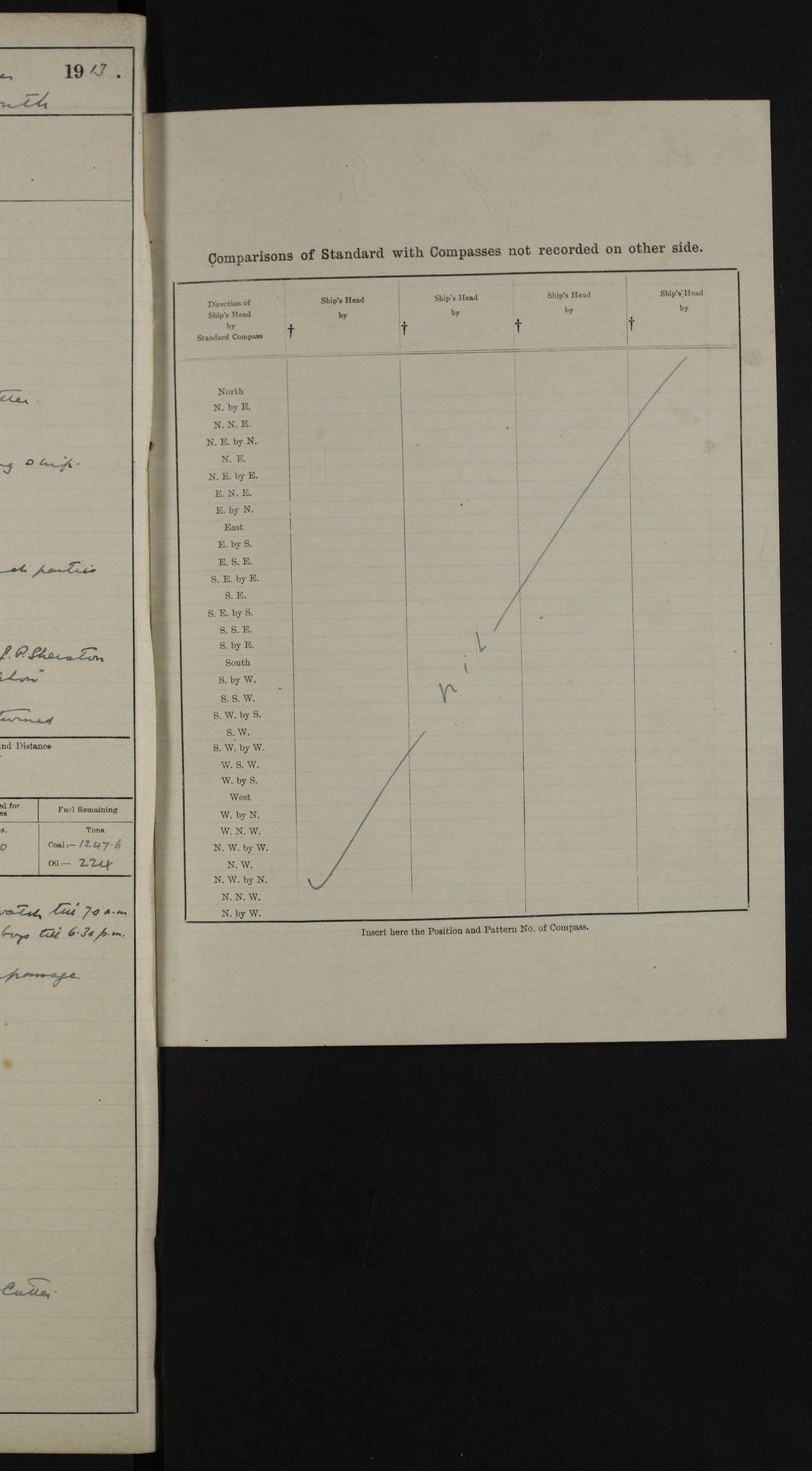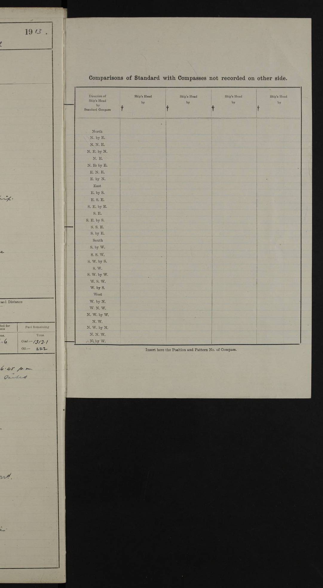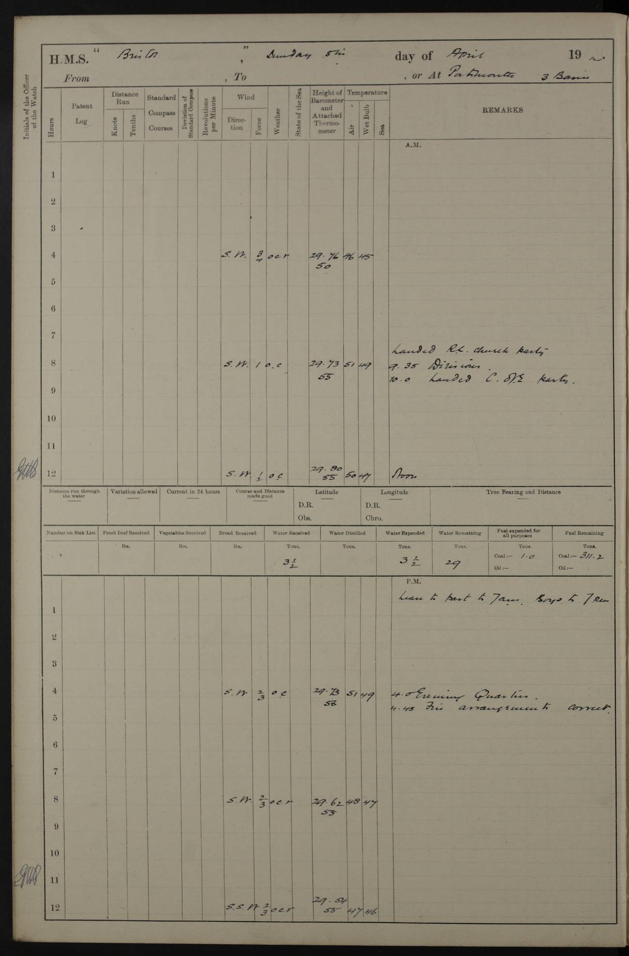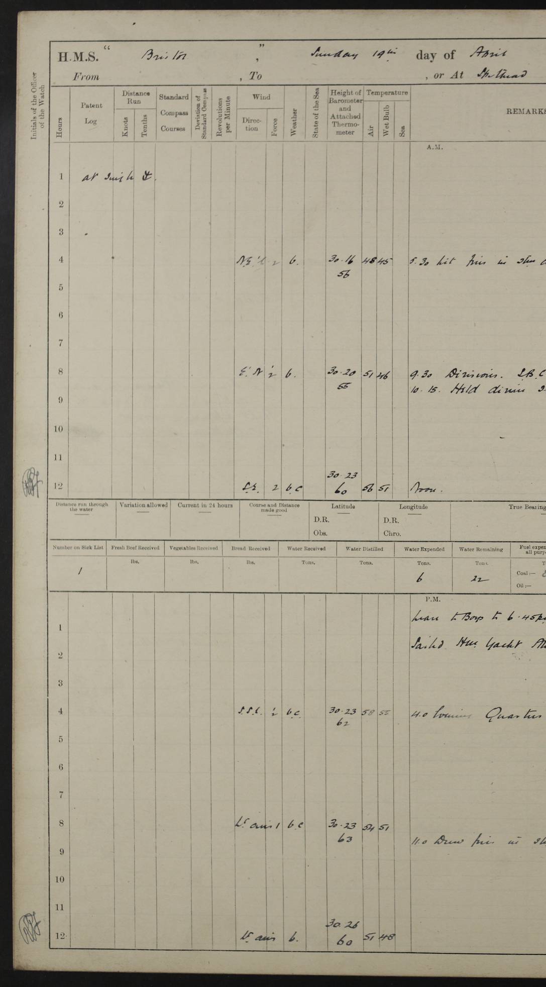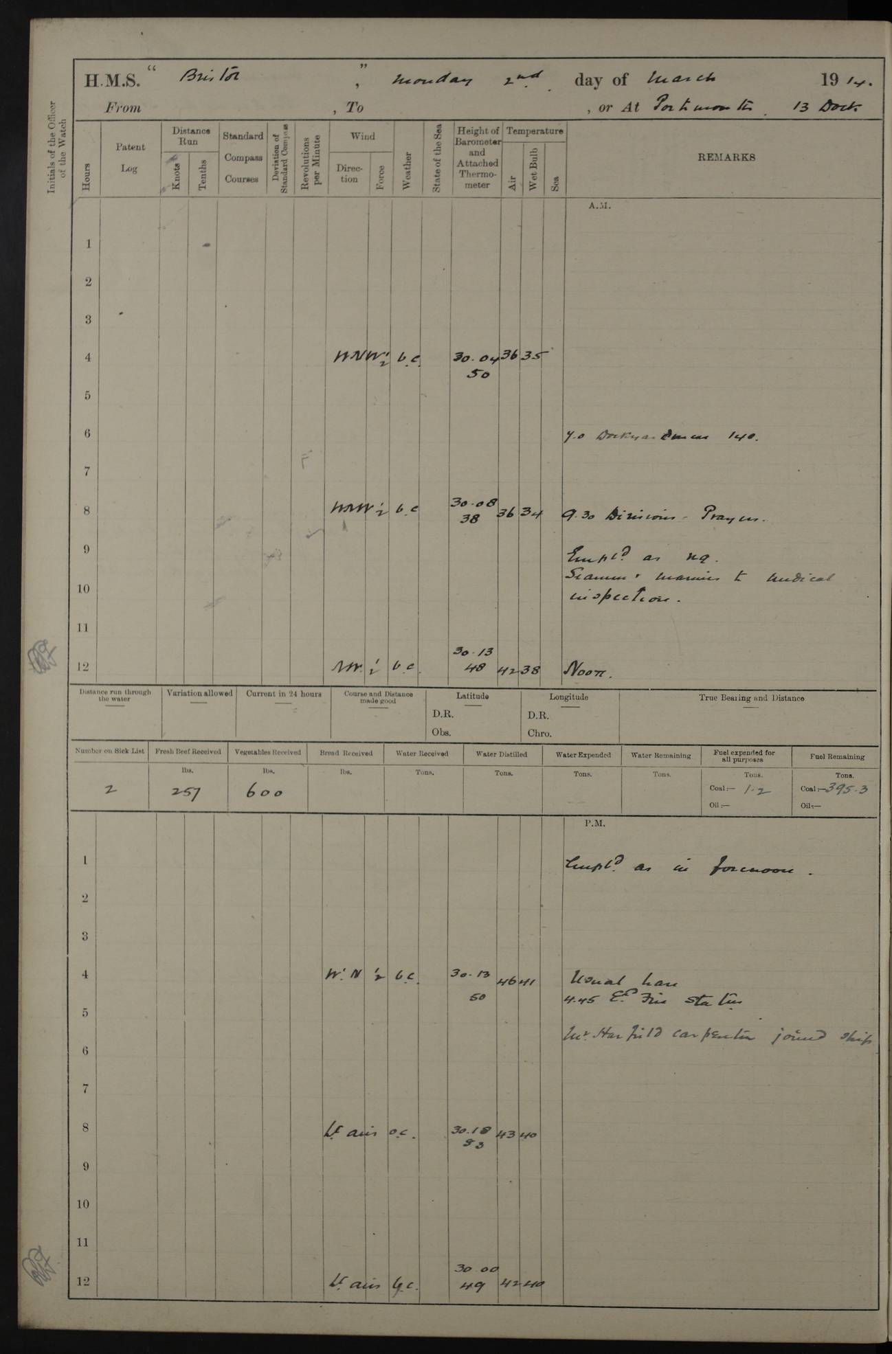 LOGS FOR JULY 1913 4ef4f40ee53e0a0c9100132d: (https://s3.amazonaws.com:443/oldweather/ADM53-36118/0006_0.jpg) 1 July 1913 Devonport Lat 50.38, Long -4.19 1 in sick list. 4.30am: Lit fires in Steam Cutter. Hands cleaning ship. 6.00am: Hands cleaning ship. 8.00am: Discharged ratings to ships in harbour. 9.00am: Recommissioned ship for service in 2nd Light Cruiser Squadron. 9.20am: Divisions. Hands cleaning ship. Dockyard parties drawing stores. 1.00pm: Hands drawing stores. Discharged 2 Privates RMLI to Barracks. 4.00pm: Leave to Watch till 7.00a.m. 9.00pm: 1 Sergeant RMLI joined ship. 10.15pm: Drew fires in Steam Cutter. 4ef4f40ee53e0a0c9100132e: (https://s3.amazonaws.com:443/oldweather/ADM53-36118/0006_1.jpg) 2 July 1913 Devonport Lat 50.38, Long -4.19 1 in sick list. 6.00am: Hands pumping water and as requisite. 9.00am: Dockyard parties drawing stores. Remainder of hands employed as requisite. 4ef4f40ee53e0a0c9100132f: (https://s3.amazonaws.com:443/oldweather/ADM53-36118/0007_0.jpg) 3 July 1913 Devonport Lat 50.38, Long -4.19 1 in sick list. 11.45am: Medical inspection of Ship's Company. 5.15pm: H.M.S. Defence arrived. 8.10pm: 1 Painter 2nd class joined ship. 4ef4f40ee53e0a0c91001330: (https://s3.amazonaws.com:443/oldweather/ADM53-36118/0007_1.jpg) 4 July 1913 Devonport Lat 50.38, Long -4.19 2 in sick list. 8.00am: Cleaned small arms. 12.45pm: Paid weekly money. 1.00pm: Lit fires in 1 Boiler. Hands securing boats for sea and as requisite. 4ef4f40ee53e0a0c91001331: (https://s3.amazonaws.com:443/oldweather/ADM53-36118/0008_0.jpg) 5 July 1913 Devonport to Plymouth Sound Lat 50.39, Long -4.14 2 on sick list. 6.45am: Landed escort. 8.30am: Escort and prisoner returned. 9.00am: Lit fires in 2 Boilers. Hands cleaning ship. Tested life buoys. Correct. 12.55pm: H.M. Tug Aetna towed stern to port. 1.00pm: Slipped and proceeded as requisite to Sound. 1.22pm: Stopped. 1.26pm: Came to with Starboard anchor, veered to 5 shackles in 6 fathoms. 2.15pm: Two ratings joined for passage to Portsmouth. 9.10pm: Sent boats to assist schooner aground on East end of Plymouth Breakwater (Owner W. Tugwell Esquire). Laid out small kedge and 4 1/2" grass. 4ef4f40ee53e0a0c91001332: (https://s3.amazonaws.com:443/oldweather/ADM53-36118/0008_1.jpg) 6 July 1913 Plymouth Lat 50.39, Long -4.14 2 on sick list. 5.45am: Schooner towed off by tug. 9.30am: Tug brought back kedge anchor. 10.00am: Divisions. Held Divine service onboard. 4ef4f40ee53e0a0c91001333: (https://s3.amazonaws.com:443/oldweather/ADM53-36118/0009_0.jpg) 7 July 1913 Plymouth to Spithead Lat 50.26, Long -3.26 1 on sick list. 8.50am: Weighed. 8.58am: Proceeded 170 revolutions. Course as requisite through West Entrance. 9.21am: Set Course SE. Mewstone: abeam. 9.30am: Mewstone: N10W. Revelstoke S87E. 10.21am: Altered course ESE. 10.57am: Altered course N87E. Prawle Point Bolt: N62 1/2W. Start Point: N10W. 3.50pm: Portland Bill: N65W. White Nose: N6W. 6.26pm: Needles Light House: abeam. Altered course as requisite up Needles Channel and to Spithead. 7.40pm: W. Ryde Middle: abeam to Starboard 4 cables. 8.07pm: Stopped. 8.10pm: Came to with Port anchor in 6 fathoms, veered to 5 shackles. Prepared for coaling. 4ef4f40ee53e0a0c91001334: (https://s3.amazonaws.com:443/oldweather/ADM53-36118/0009_1.jpg) 8 July 1913 Spithead to Portsmouth Harbour Lat 50.81, Long -1.11 1 on sick list. 7.39am: Embarked Pilot, weighed and proceeded as requisite 10 knots. 8.00am: Slow both. H.M. Tug "Malta" made fast alongside port side. 8.13am: Stopped. 8.20am: Made fast alongside "C1". 9.21am: Commenced coaling. 10.45am: Discharged 1 Able Seaman to H.M.A.S. "Sydney". 1.30pm: Discharged 1 Stoker to RN Barracks. 1 Leading Seaman and 1 Able Seaman joined from H.M.S. "Excellent". 2.45pm: 20 Ordinary Seamen joined from barracks. 4.20pm: 1 Ordinary Seaman joined from H.M.S. "Vernon". 6.30pm: Stopped coaling. 4ef4f40ee53e0a0c91001335: (https://s3.amazonaws.com:443/oldweather/ADM53-36118/0010_0.jpg) 9 July 1913 Portsmouth Lat 50.81, Long -1.11 Nil on sick list. 7,0am: Hands coaling ship. 2.30pm: Finished coaling. Received 527.0 tons. 3.30pm: 40 Stokers 2nd Class and 1 Ships Steward Assistant joined. 6.00pm: 7 Leading Stokers and 24 Stokers 1st class joined ship. 4ef4f40fe53e0a0c91001336: (https://s3.amazonaws.com:443/oldweather/ADM53-36118/0010_1.jpg) 10 July 1913 Portsmouth to Spithead Lat 50.75, Long -1.13 1 on sick list. 7.45am: H.M. Tugs "Enterprise" & "Malta" took ship in tow and transported her to mid stream. 8.08am: Proceeded 1/2 speed 130 revolutions out of harbour and as requisite to Spithead. 8.33am: Stopped. 8.35am: Came to with Port anchor in 6 fathoms, veered to 5 shackles. 4.00pm: Evening Quarters. Spread Quarter Deck awning. Leave to Watch till 7.00am. 1 Stoker Petty Officer and 1 Leading Stoker joined ship. 4ef4f40fe53e0a0c91001337: (https://s3.amazonaws.com:443/oldweather/ADM53-36118/0011_0.jpg) 11 July 1913 Spithead Lat 50.75, Long -1.13 1 on sick list. 12.45pm: Paid weekly money. 3.00pm: 4 Engine Room Artificers joined ship. 4.15pm: H.M.S. "Minerva " arrived. Leave to Watch till 7.00a.m. 1 Chief Stoker and 2 Leading Stokers joined. 4ef4f40fe53e0a0c91001338: (https://s3.amazonaws.com:443/oldweather/ADM53-36118/0011_1.jpg) 12 July 1913 Spithead Lat 50.75, Long -1.13 1 on sick list. 1.30pm: Leave to Watch till 7.00a.m. Monday. Youths till 10.00pm. and to boys till 6.45 pm. Make and mend clothes. 3.30pm: 10 Stoker Petty Officers joined ship. 6.00pm: Hands bathed. 4ef4f40fe53e0a0c91001339: (https://s3.amazonaws.com:443/oldweather/ADM53-36118/0012_0.jpg) 13 July 1913 Spithead Lat 50.75, Long -1.13 1 on sick list. 7.20am: H.M.S. "Blonde" arrived. 9.40am: Divisions. Held Divine Service. 1.00pm: H.M.S. "Enchantress" sailed. 7.35pm: H.M.S. "Liverpool" arrived. 4ef4f40fe53e0a0c9100133a: (https://s3.amazonaws.com:443/oldweather/ADM53-36118/0012_1.jpg) 4ef4f40fe53e0a0c9100133b: (https://s3.amazonaws.com:443/oldweather/ADM53-36118/0013_0.jpg) 4ef4f40fe53e0a0c9100133c: (https://s3.amazonaws.c