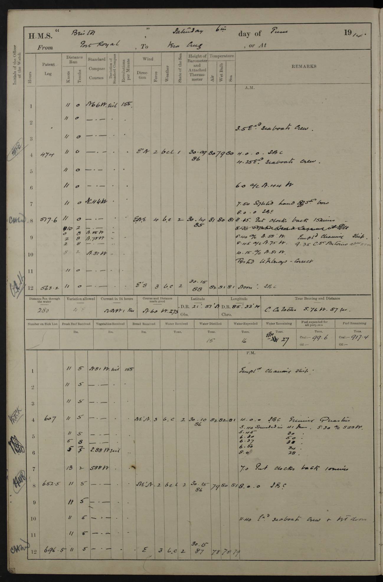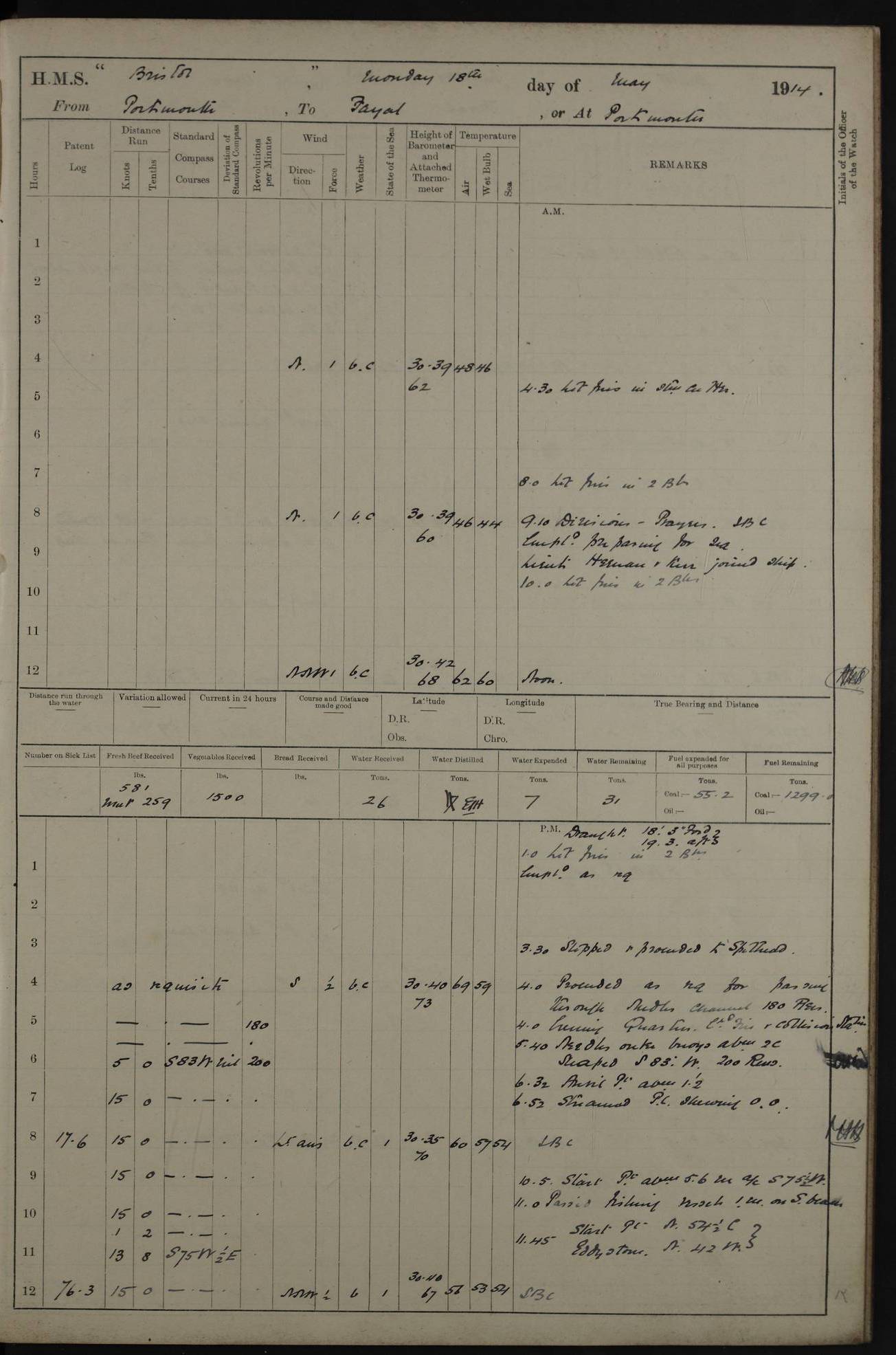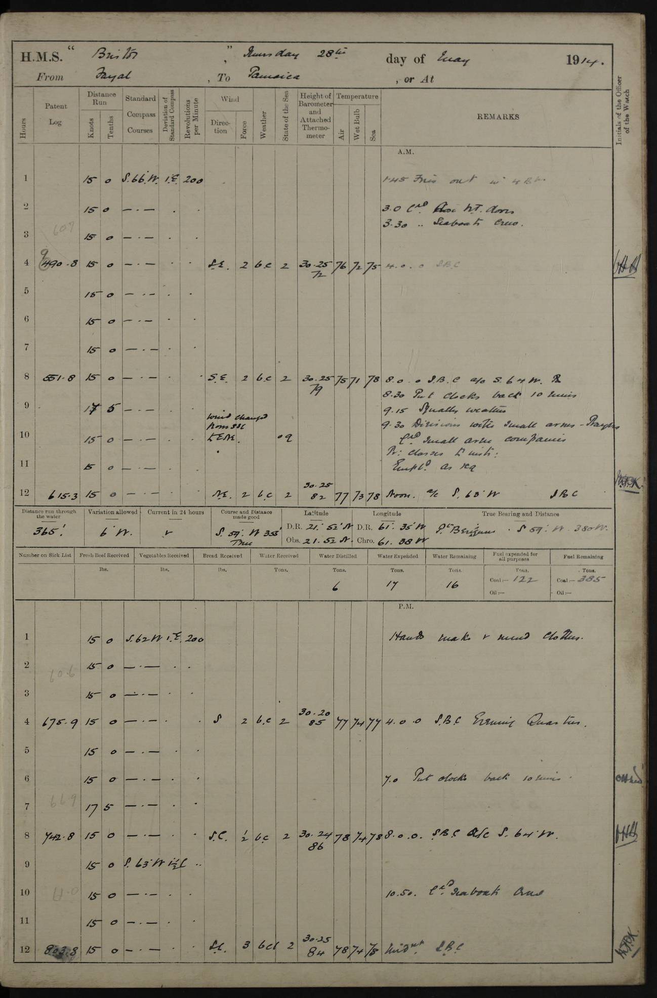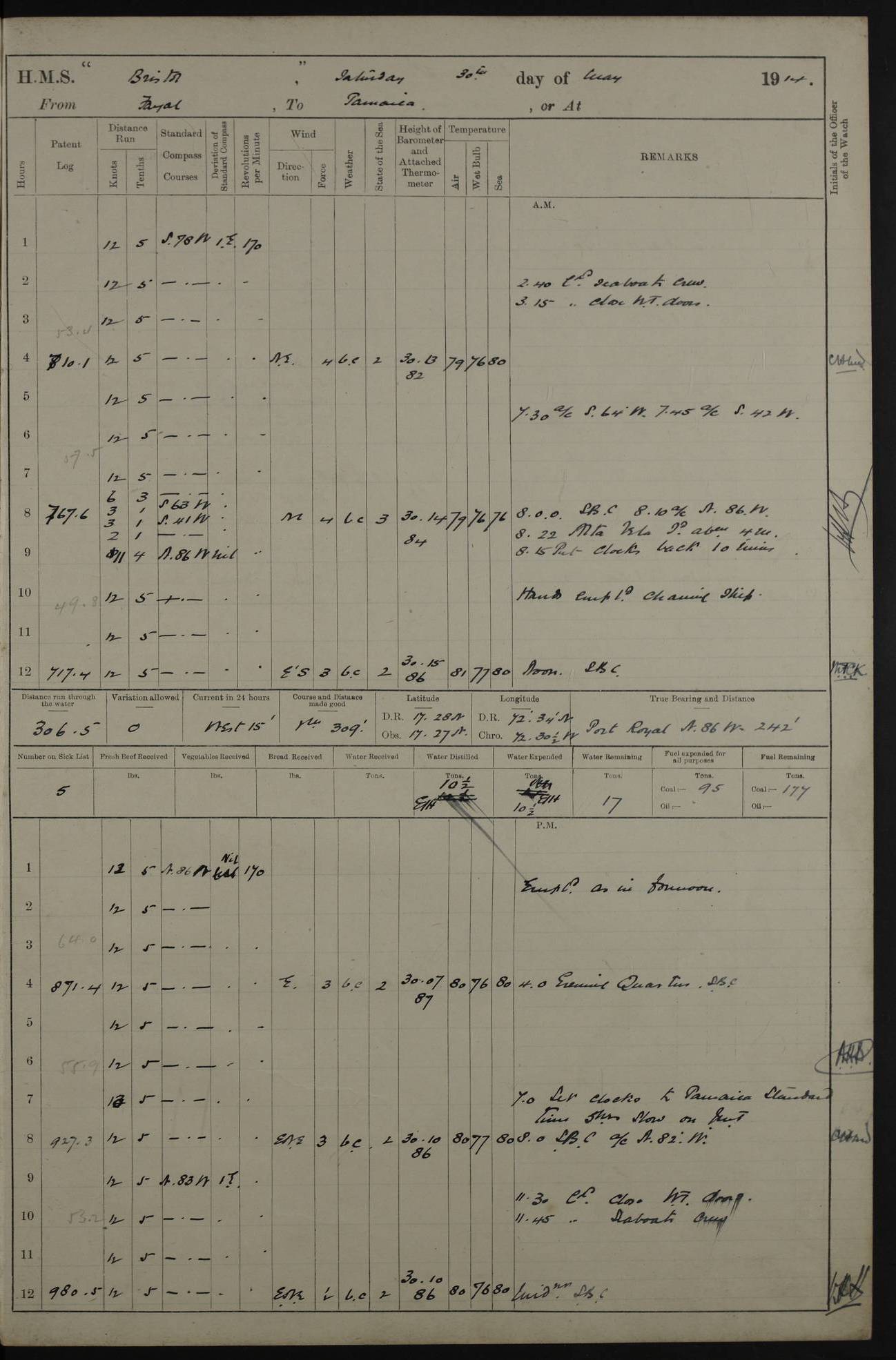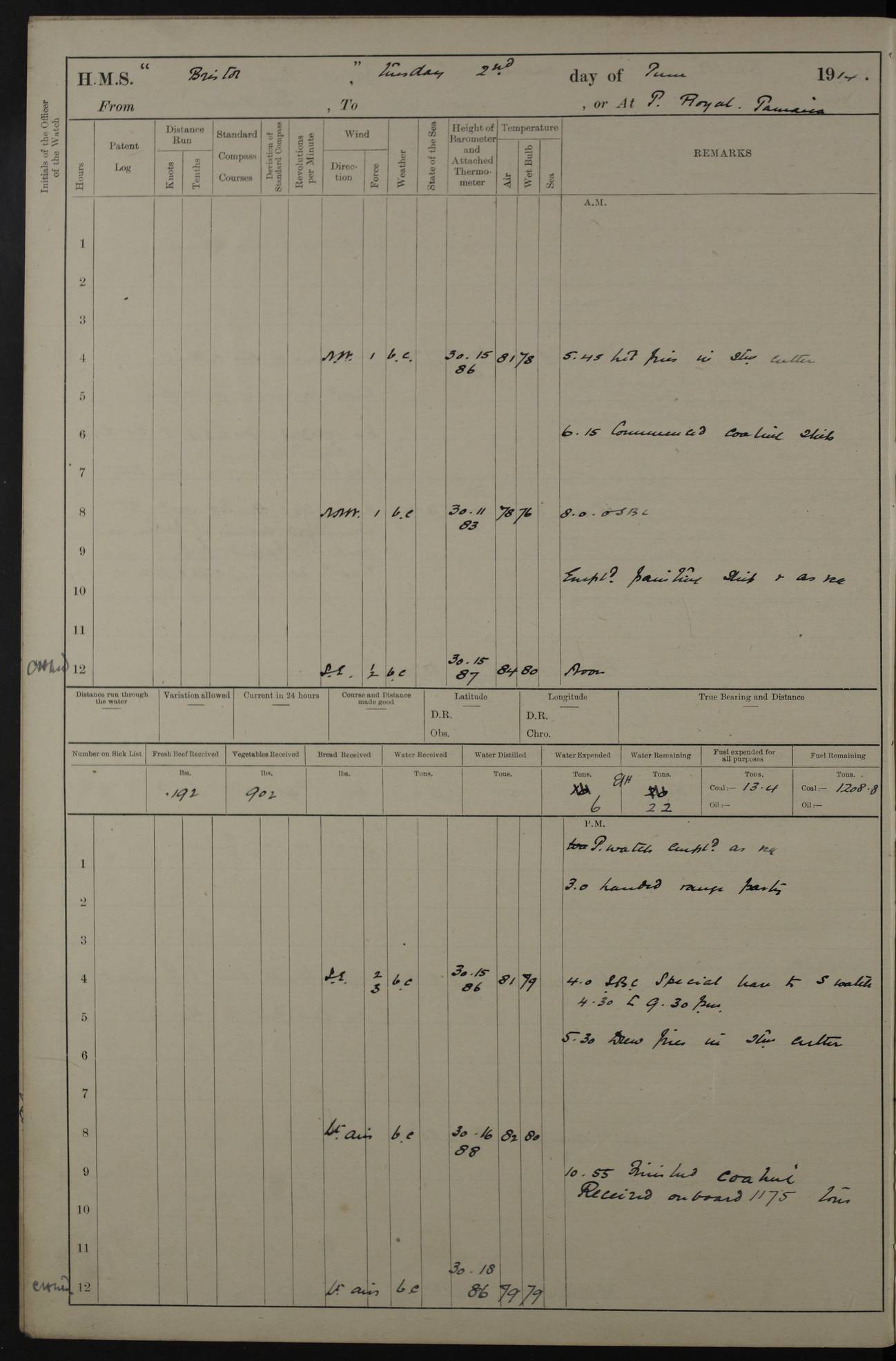 4ef4f435e53e0a0c9100147a: (https://s3.amazonaws.com:443/oldweather/ADM53-36118/0172_1.jpg) 18 May 1914 Portsmouth and at sea towards Fayal Lat 50.81, Long -1.11 Sick list not recorded.. 9.10am: Divisions. Payers. Hands employed preparing for sea. Lieutenants Hernan and Kerr joined ship. 3.30pm: Slipped and proceeded to Spithead. 4.00pm: Proceeded as requisite for passing through Needles Channel. 5.40pm: Needles outer buoys: abeam 2 cables. Shaped course S83W. 200 revolutions. 6.32pm: Anvil Point: abeam 1.2 mile. 10.05pm: Start Point: abeam 5.6 miles. Altered course S75 1/2W. 11.00pm: Passed fishing vessels 1 mile on Starboard beam. 11.45pm: Start Point: N54 1/2E. Eddystone: N42W. 4ef4f436e53e0a0c9100147b: (https://s3.amazonaws.com:443/oldweather/ADM53-36118/0173_0.jpg) 19 May 1914 At sea Lat 48.40, Long -7.91 Sick list not recorded. 1.30am: Passed several fishing vessels about 4 cables N and S of ship. 2.30am: Lizard Light: N30W. 3.32am: Lizard Light: N8E. Noon: Altered course S77W. 7.00pm: Put clocks back 30 minutes. 8.00pm: Altered course S78W. 4ef4f436e53e0a0c9100147c: (https://s3.amazonaws.com:443/oldweather/ADM53-36118/0173_1.jpg) 20 May 1914 At sea Lat 45.28, Long -15.61 1 on sick list. 8.30am: Put clocks back 15 minutes. 7.00pm: Put clocks back 15 minutes. 4ef4f436e53e0a0c9100147d: (https://s3.amazonaws.com:443/oldweather/ADM53-36118/0174_0.jpg) 21 May 1914 At sea Lat 41.81, Long -22.63 1 on sick list. 8.30am: Put clocks back 15 minutes. 7.00pm: Put clocks back 15 minutes. 8.00pm: Altered course S77W. 4ef4f436e53e0a0c9100147e: (https://s3.amazonaws.com:443/oldweather/ADM53-36118/0174_1.jpg) 22 May 1914 At sea to Fayal (Horta Bay) Lat 38.53, Long -28.61 2 on sick list. 7.00am: Sighted Graciosa Island ahead. 7.15am: Altered course N84W. 8.20am: Altered course S50W. 8.30am: Put clocks back 15 minutes. Employed preparing for coaling and as requisite. 8.45am: Passed Portuguese cruiser Adamastor. 9.40am: St Jorge Rock: abeam 4 miles. 10.30am: Course and speed as requisite for approaching and entering Horta Bay. 11.00am: Stopped and came to with Starboard Bower in 16 1/2 fathoms, veered to 6 shackles. Fired 21 guns salute. Portuguese Fort returned 21 guns. 2.00pm: Commenced coaling ship. 4ef4f436e53e0a0c9100147f: (https://s3.amazonaws.com:443/oldweather/ADM53-36118/0175_0.jpg) 23 May 1914 Fayal and at sea towards Jamaica Lat 37.20, Long -31.63 4 on sick list. 12.30am: Finished coaling. Received onboard 300 tons. 1.40am: Weighed and proceeded. 2.00am: Shaped course S82W. 200 revolutions. 8.30am: Put clocks back 15 minutes. 10.52pm: Stopped Starboard engine owing to accident to stoker. 11.40pm: Proceeded 200 revolutions. 4ef4f436e53e0a0c91001480: (https://s3.amazonaws.com:443/oldweather/ADM53-36118/0175_1.jpg) 24 May 1914 At sea Lat 34.08, Long -37.83 4 on sick list. 8.30am: Put clocks back 15 minutes. 10.00am: Held Divine Service. Noon: Altered course S81W. 7.00pm: Put clocks back 10 minutes. 4ef4f436e53e0a0c91001481: (https://s3.amazonaws.com:443/oldweather/ADM53-36118/0176_0.jpg) 25 May 1914 At sea Lat 31.1, Long -44.25 Sick list not recorded. 8.30am: Clocks back 10 minutes. 10.35am: Lost overboard by accident 1 Patent Log rotator and line complete. 7.00pm: Put clocks back 10 minutes. 4ef4f436e53e0a0c91001482: (https://s3.amazonaws.com:443/oldweather/ADM53-36118/0176_1.jpg) 26 May 1914 At sea Lat 28.0, Long -50.35 Sick list not recorded. 8.30am: Put clocks back 10 minutes. 7.00pm: Put clocks back 10 minutes. 8.00pm: Altered course S71W. 4ef4f436e53e0a0c91001483: (https://s3.amazonaws.com:443/oldweather/ADM53-36118/0177_0.jpg) 27 May 1914 At sea Lat 24.85, Long -56.15 Sick list not recorded. 8.00am: Altered course S69W. 8.30am: Put clocks back 10 minutes. 9.10am: Divisions. Prayers. Physical drill. Employed painting and as requisite. 12.30pm: Exercised Maxim Gun crews. Training Classes to instruction. Remainder employed as in forenoon. 7.00pm: Put clocks back 10 min 9.40pm: Heavy rain squall, frequent lightning. 4ef4f437e53e0a0c91001484: (https://s3.amazonaws.com:443/oldweather/ADM53-36118/0177_1.jpg) 28 May 1914 At sea Lat 21.86, Long -61.63 Sick list not recorded. 8.00am: Altered course S64W. 8.30am: Put clocks back 10 minutes. 9.15am: Squally weather. 9.30am: Divisions with small arms. Prayers. Exercised small arm companies. Training Classes to instructions. Employed as requisite. Noon: Altered course S63W. 7.00pm: Put clocks back 10 minutes. 8.00pm: Altered course S64W. 4ef4f437e53e0a0c91001485: (https://s3.amazonaws.com:443/oldweather/ADM53-36118/0178_0.jpg) 29 May 1914 At sea Lat 18.61, Long -67.25 4 on sick list. 8.00am: Altered course S62W. 8.30am: Put clocks back 10 minutes. 10.15am: Sighted land on Port bow. 10.00am: Cape Borinquen: S13W. Noon: Cape Borinquen: S12W 15 miles. Altered course S61W. 1.00pm: Reduced to 170 revolutions. 1.28pm: Mona Island: abeam 12 miles. 5.50pm: Altered course S47W. 6.30pm: Altered course S73W. Cuidado Island: N44W. Espada Point: N5E. 7.00pm: Put clocks back 10 minutes. 4ef4f437e53e0a0c91001486: (https://s3.amazonaws.com:443/oldweather/ADM53-36118/0178_1.jpg) 30 May 1914 At sea Lat 17.43, Long -72.50 5 on sick list. 7.30am: Altered course S64W. 7.45am: Altered course S42W. 8.10am: Altered course N86W. 8.22am: Alto Velo Island: abeam 4 miles. 8.15am: Put clocks back 10 minutes. 7.00pm: Set clocks to Jamaica Standard Time 5 hours slow on GMT. 8.00pm: Altered course N82W. 4ef4f437e53e0a0c91001487: (https://s3.amazonaws.com:443/oldweather/ADM53-36118/0179_0.jpg) 31 May 1914 At sea to Port Royal Lat 17.93, Long -76.85 5 on sick list. 3.30am: Sighted Morant Light: WNW. 5.03am: Morant Light: abeam 9 miles. 6.45am: Course and speed as requisite for approaching and entering Port Royal. 8.25am: Stopped and came to with Starboard Bower in 9 fathoms, veered to 6 shackles. 10.30am: Divisions. Held Divine Service. 1.25pm: Obtained Pratique. LOGS FOR JUNE 1914 4ef4f437e53e0a0c91001488: (https://s3.amazonaws.com:443/oldweather/ADM53-36118/0179_1.jpg) 1 June 1914 P