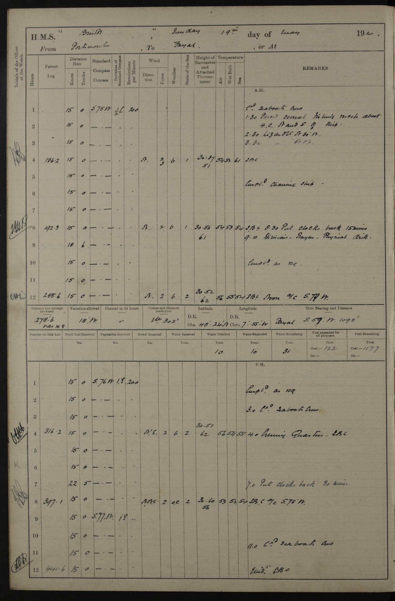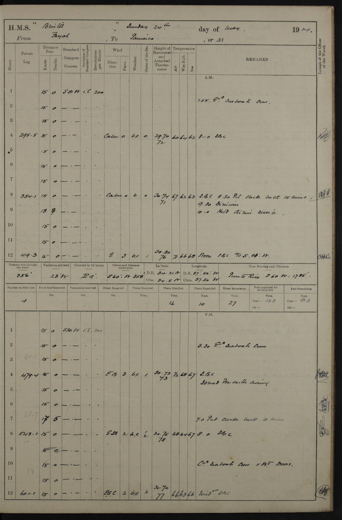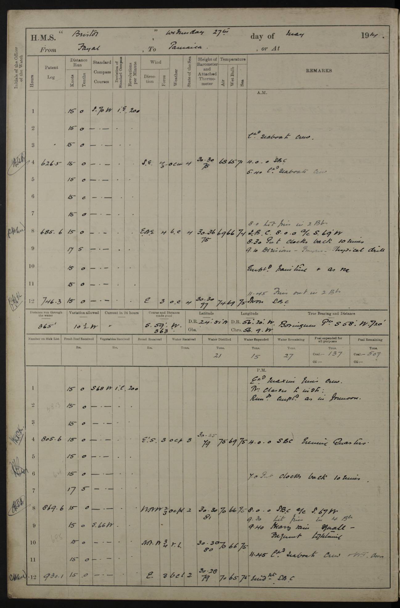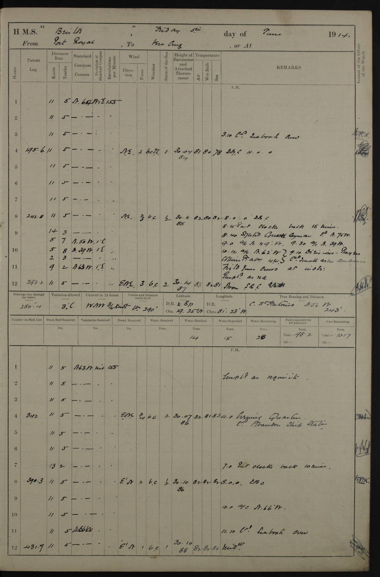 4ef4f435e53e0a0c9100147a: (https://s3.amazonaws.com:443/oldweather/ADM53-36118/0172_1.jpg) 18 May 1914 Portsmouth and at sea towards Fayal Lat 50.81, Long -1.11 Sick list not recorded.. 9.10am: Divisions. Payers. Hands employed preparing for sea. Lieutenants Hernan and Kerr joined ship. 3.30pm: Slipped and proceeded to Spithead. 4.00pm: Proceeded as requisite for passing through Needles Channel. 5.40pm: Needles outer buoys: abeam 2 cables. Shaped course S83W. 200 revolutions. 6.32pm: Anvil Point: abeam 1.2 mile. 10.05pm: Start Point: abeam 5.6 miles. Altered course S75 1/2W. 11.00pm: Passed fishing vessels 1 mile on Starboard beam. 11.45pm: Start Point: N54 1/2E. Eddystone: N42W. 4ef4f436e53e0a0c9100147b: (https://s3.amazonaws.com:443/oldweather/ADM53-36118/0173_0.jpg) 19 May 1914 At sea Lat 48.40, Long -7.91 Sick list not recorded. 1.30am: Passed several fishing vessels about 4 cables N and S of ship. 2.30am: Lizard Light: N30W. 3.32am: Lizard Light: N8E. Noon: Altered course S77W. 7.00pm: Put clocks back 30 minutes. 8.00pm: Altered course S78W. 4ef4f436e53e0a0c9100147c: (https://s3.amazonaws.com:443/oldweather/ADM53-36118/0173_1.jpg) 20 May 1914 At sea Lat 45.28, Long -15.61 1 on sick list. 8.30am: Put clocks back 15 minutes. 7.00pm: Put clocks back 15 minutes. 4ef4f436e53e0a0c9100147d: (https://s3.amazonaws.com:443/oldweather/ADM53-36118/0174_0.jpg) 21 May 1914 At sea Lat 41.81, Long -22.63 1 on sick list. 8.30am: Put clocks back 15 minutes. 7.00pm: Put clocks back 15 minutes. 8.00pm: Altered course S77W. 4ef4f436e53e0a0c9100147e: (https://s3.amazonaws.com:443/oldweather/ADM53-36118/0174_1.jpg) 22 May 1914 At sea to Fayal (Horta Bay) Lat 38.53, Long -28.61 2 on sick list. 7.00am: Sighted Graciosa Island ahead. 7.15am: Altered course N84W. 8.20am: Altered course S50W. 8.30am: Put clocks back 15 minutes. Employed preparing for coaling and as requisite. 8.45am: Passed Portuguese cruiser Adamastor. 9.40am: St Jorge Rock: abeam 4 miles. 10.30am: Course and speed as requisite for approaching and entering Horta Bay. 11.00am: Stopped and came to with Starboard Bower in 16 1/2 fathoms, veered to 6 shackles. Fired 21 guns salute. Portuguese Fort returned 21 guns. 2.00pm: Commenced coaling ship. 4ef4f436e53e0a0c9100147f: (https://s3.amazonaws.com:443/oldweather/ADM53-36118/0175_0.jpg) 23 May 1914 Fayal and at sea towards Jamaica Lat 37.20, Long -31.63 4 on sick list. 12.30am: Finished coaling. Received onboard 300 tons. 1.40am: Weighed and proceeded. 2.00am: Shaped course S82W. 200 revolutions. 8.30am: Put clocks back 15 minutes. 10.52pm: Stopped Starboard engine owing to accident to stoker. 11.40pm: Proceeded 200 revolutions. 4ef4f436e53e0a0c91001480: (https://s3.amazonaws.com:443/oldweather/ADM53-36118/0175_1.jpg) 24 May 1914 At sea Lat 34.08, Long -37.83 4 on sick list. 8.30am: Put clocks back 15 minutes. 10.00am: Held Divine Service. Noon: Altered course S81W. 7.00pm: Put clocks back 10 minutes. 4ef4f436e53e0a0c91001481: (https://s3.amazonaws.com:443/oldweather/ADM53-36118/0176_0.jpg) 25 May 1914 At sea Lat 31.1, Long -44.25 Sick list not recorded. 8.30am: Clocks back 10 minutes. 10.35am: Lost overboard by accident 1 Patent Log rotator and line complete. 7.00pm: Put clocks back 10 minutes. 4ef4f436e53e0a0c91001482: (https://s3.amazonaws.com:443/oldweather/ADM53-36118/0176_1.jpg) 26 May 1914 At sea Lat 28.0, Long -50.35 Sick list not recorded. 8.30am: Put clocks back 10 minutes. 7.00pm: Put clocks back 10 minutes. 8.00pm: Altered course S71W. 4ef4f436e53e0a0c91001483: (https://s3.amazonaws.com:443/oldweather/ADM53-36118/0177_0.jpg) 27 May 1914 At sea Lat 24.85, Long -56.15 Sick list not recorded. 8.00am: Altered course S69W. 8.30am: Put clocks back 10 minutes. 9.10am: Divisions. Prayers. Physical drill. Employed painting and as requisite. 12.30pm: Exercised Maxim Gun crews. Training Classes to instruction. Remainder employed as in forenoon. 7.00pm: Put clocks back 10 min 9.40pm: Heavy rain squall, frequent lightning. 4ef4f437e53e0a0c91001484: (https://s3.amazonaws.com:443/oldweather/ADM53-36118/0177_1.jpg) 28 May 1914 At sea Lat 21.86, Long -61.63 Sick list not recorded. 8.00am: Altered course S64W. 8.30am: Put clocks back 10 minutes. 9.15am: Squally weather. 9.30am: Divisions with small arms. Prayers. Exercised small arm companies. Training Classes to instructions. Employed as requisite. Noon: Altered course S63W. 7.00pm: Put clocks back 10 minutes. 8.00pm: Altered course S64W. 4ef4f437e53e0a0c91001485: (https://s3.amazonaws.com:443/oldweather/ADM53-36118/0178_0.jpg) 29 May 1914 At sea Lat 18.61, Long -67.25 4 on sick list. 8.00am: Altered course S62W. 8.30am: Put clocks back 10 minutes. 10.15am: Sighted land on Port bow. 10.00am: Cape Borinquen: S13W. Noon: Cape Borinquen: S12W 15 miles. Altered course S61W. 1.00pm: Reduced to 170 revolutions. 1.28pm: Mona Island: abeam 12 miles. 5.50pm: Altered course S47W. 6.30pm: Altered course S73W. Cuidado Island: N44W. Espada Point: N5E. 7.00pm: Put clocks back 10 minutes. 4ef4f437e53e0a0c91001486: (https://s3.amazonaws.com:443/oldweather/ADM53-36118/0178_1.jpg) 30 May 1914 At sea Lat 17.43, Long -72.50 5 on sick list. 7.30am: Altered course S64W. 7.45am: Altered course S42W. 8.10am: Altered course N86W. 8.22am: Alto Velo Island: abeam 4 miles. 8.15am: Put clocks back 10 minutes. 7.00pm: Set clocks to Jamaica Standard Time 5 hours slow on GMT. 8.00pm: Altered course N82W. 4ef4f437e53e0a0c91001487: (https://s3.amazonaws.com:443/oldweather/ADM53-36118/0179_0.jpg) 31 May 1914 At sea to Port Royal Lat 17.93, Long -76.85 5 on sick list. 3.30am: Sighted Morant Light: WNW. 5.03am: Morant Light: abeam 9 miles. 6.45am: Course and speed as requisite for approaching and entering Port Royal. 8.25am: Stopped and came to with Starboard Bower in 9 fathoms, veered to 6 shackles. 10.30am: Divisions. Held Divine Service. 1.25pm: Obtained Pratique. LOGS FOR JUNE 1914 4ef4f437e53e0a0c91001488: (https://s3.amazonaws.com:443/oldweather/ADM53-36118/0179_1.jpg) 1 June 1914 P