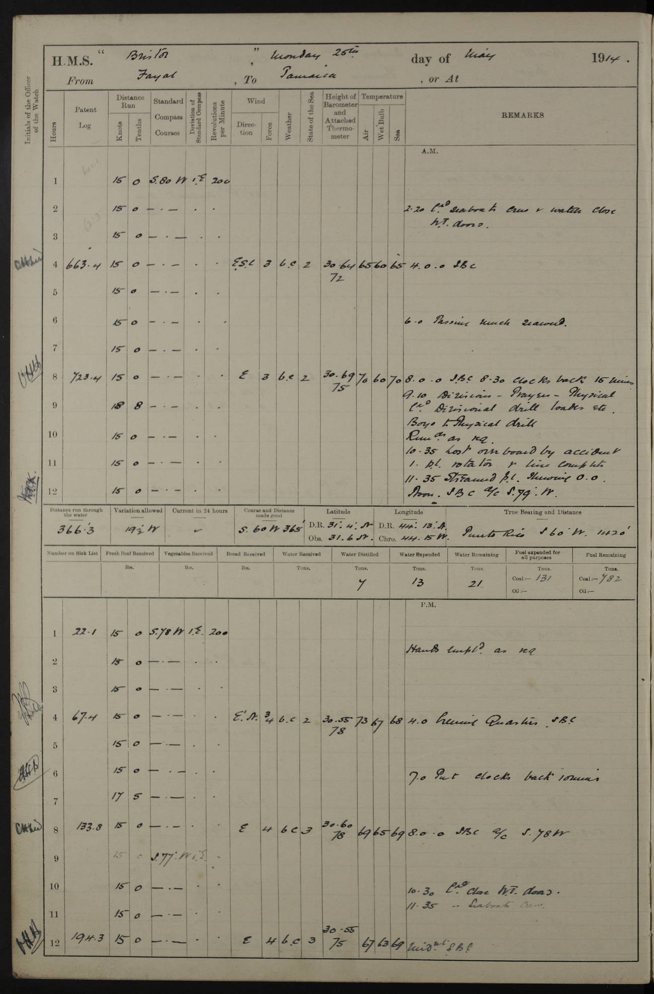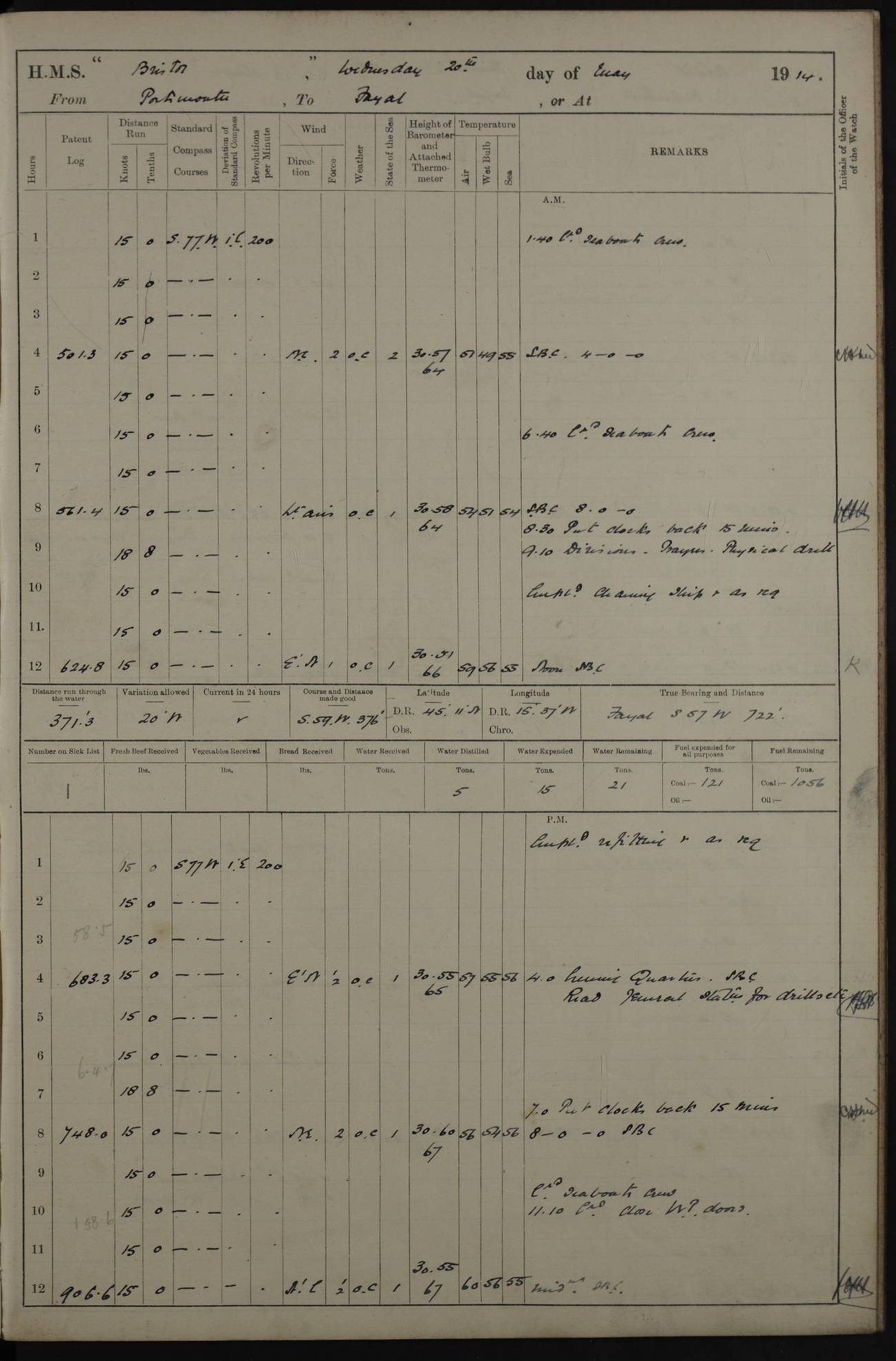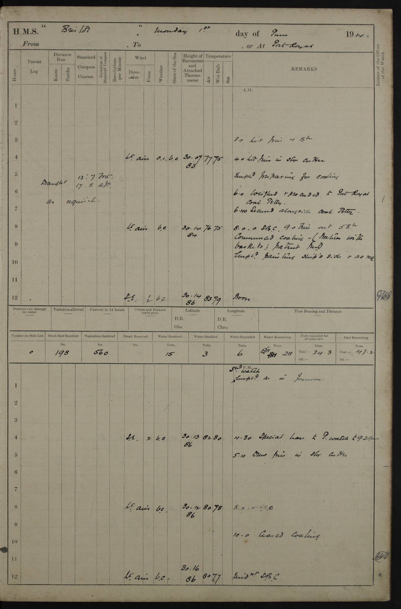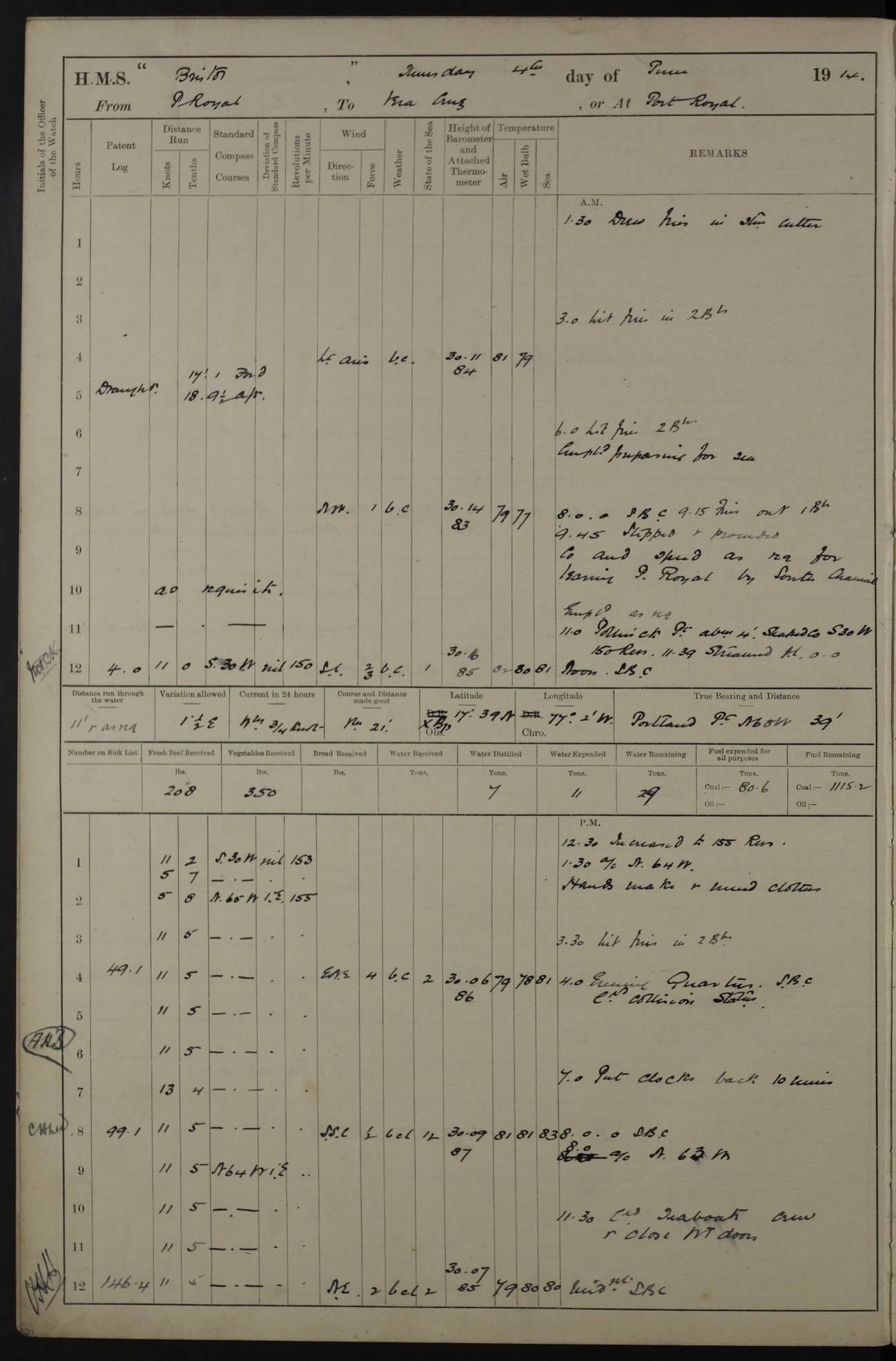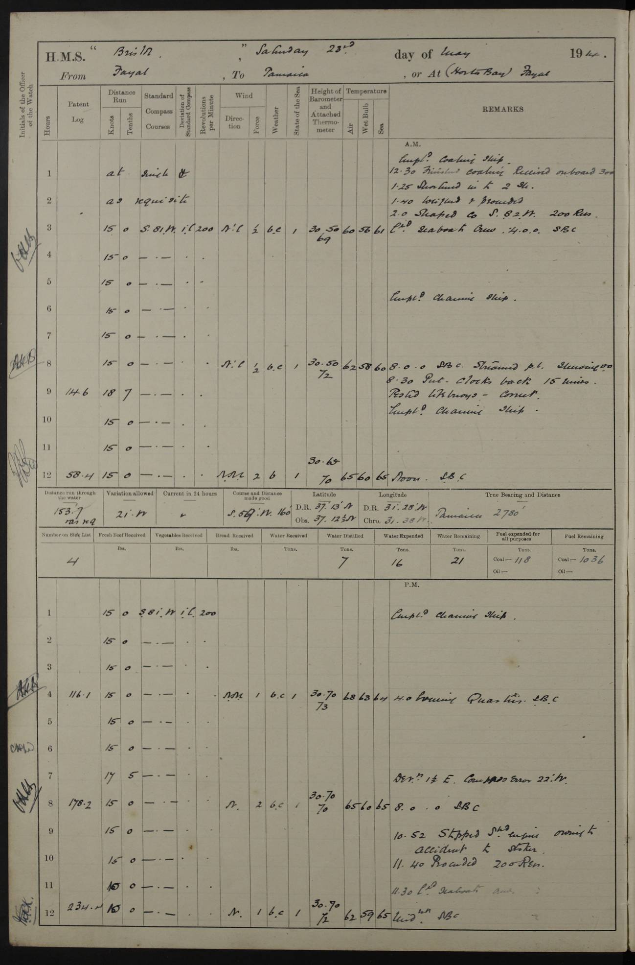 4ef4f435e53e0a0c9100147a: (https://s3.amazonaws.com:443/oldweather/ADM53-36118/0172_1.jpg) 18 May 1914 Portsmouth and at sea towards Fayal Lat 50.81, Long -1.11 Sick list not recorded.. 9.10am: Divisions. Payers. Hands employed preparing for sea. Lieutenants Hernan and Kerr joined ship. 3.30pm: Slipped and proceeded to Spithead. 4.00pm: Proceeded as requisite for passing through Needles Channel. 5.40pm: Needles outer buoys: abeam 2 cables. Shaped course S83W. 200 revolutions. 6.32pm: Anvil Point: abeam 1.2 mile. 10.05pm: Start Point: abeam 5.6 miles. Altered course S75 1/2W. 11.00pm: Passed fishing vessels 1 mile on Starboard beam. 11.45pm: Start Point: N54 1/2E. Eddystone: N42W. 4ef4f436e53e0a0c9100147b: (https://s3.amazonaws.com:443/oldweather/ADM53-36118/0173_0.jpg) 19 May 1914 At sea Lat 48.40, Long -7.91 Sick list not recorded. 1.30am: Passed several fishing vessels about 4 cables N and S of ship. 2.30am: Lizard Light: N30W. 3.32am: Lizard Light: N8E. Noon: Altered course S77W. 7.00pm: Put clocks back 30 minutes. 8.00pm: Altered course S78W. 4ef4f436e53e0a0c9100147c: (https://s3.amazonaws.com:443/oldweather/ADM53-36118/0173_1.jpg) 20 May 1914 At sea Lat 45.28, Long -15.61 1 on sick list. 8.30am: Put clocks back 15 minutes. 7.00pm: Put clocks back 15 minutes. 4ef4f436e53e0a0c9100147d: (https://s3.amazonaws.com:443/oldweather/ADM53-36118/0174_0.jpg) 21 May 1914 At sea Lat 41.81, Long -22.63 1 on sick list. 8.30am: Put clocks back 15 minutes. 7.00pm: Put clocks back 15 minutes. 8.00pm: Altered course S77W. 4ef4f436e53e0a0c9100147e: (https://s3.amazonaws.com:443/oldweather/ADM53-36118/0174_1.jpg) 22 May 1914 At sea to Fayal (Horta Bay) Lat 38.53, Long -28.61 2 on sick list. 7.00am: Sighted Graciosa Island ahead. 7.15am: Altered course N84W. 8.20am: Altered course S50W. 8.30am: Put clocks back 15 minutes. Employed preparing for coaling and as requisite. 8.45am: Passed Portuguese cruiser Adamastor. 9.40am: St Jorge Rock: abeam 4 miles. 10.30am: Course and speed as requisite for approaching and entering Horta Bay. 11.00am: Stopped and came to with Starboard Bower in 16 1/2 fathoms, veered to 6 shackles. Fired 21 guns salute. Portuguese Fort returned 21 guns. 2.00pm: Commenced coaling ship. 4ef4f436e53e0a0c9100147f: (https://s3.amazonaws.com:443/oldweather/ADM53-36118/0175_0.jpg) 23 May 1914 Fayal and at sea towards Jamaica Lat 37.20, Long -31.63 4 on sick list. 12.30am: Finished coaling. Received onboard 300 tons. 1.40am: Weighed and proceeded. 2.00am: Shaped course S82W. 200 revolutions. 8.30am: Put clocks back 15 minutes. 10.52pm: Stopped Starboard engine owing to accident to stoker. 11.40pm: Proceeded 200 revolutions. 4ef4f436e53e0a0c91001480: (https://s3.amazonaws.com:443/oldweather/ADM53-36118/0175_1.jpg) 24 May 1914 At sea Lat 34.08, Long -37.83 4 on sick list. 8.30am: Put clocks back 15 minutes. 10.00am: Held Divine Service. Noon: Altered course S81W. 7.00pm: Put clocks back 10 minutes. 4ef4f436e53e0a0c91001481: (https://s3.amazonaws.com:443/oldweather/ADM53-36118/0176_0.jpg) 25 May 1914 At sea Lat 31.1, Long -44.25 Sick list not recorded. 8.30am: Clocks back 10 minutes. 10.35am: Lost overboard by accident 1 Patent Log rotator and line complete. 7.00pm: Put clocks back 10 minutes. 4ef4f436e53e0a0c91001482: (https://s3.amazonaws.com:443/oldweather/ADM53-36118/0176_1.jpg) 26 May 1914 At sea Lat 28.0, Long -50.35 Sick list not recorded. 8.30am: Put clocks back 10 minutes. 7.00pm: Put clocks back 10 minutes. 8.00pm: Altered course S71W. 4ef4f436e53e0a0c91001483: (https://s3.amazonaws.com:443/oldweather/ADM53-36118/0177_0.jpg) 27 May 1914 At sea Lat 24.85, Long -56.15 Sick list not recorded. 8.00am: Altered course S69W. 8.30am: Put clocks back 10 minutes. 9.10am: Divisions. Prayers. Physical drill. Employed painting and as requisite. 12.30pm: Exercised Maxim Gun crews. Training Classes to instruction. Remainder employed as in forenoon. 7.00pm: Put clocks back 10 min 9.40pm: Heavy rain squall, frequent lightning. 4ef4f437e53e0a0c91001484: (https://s3.amazonaws.com:443/oldweather/ADM53-36118/0177_1.jpg) 28 May 1914 At sea Lat 21.86, Long -61.63 Sick list not recorded. 8.00am: Altered course S64W. 8.30am: Put clocks back 10 minutes. 9.15am: Squally weather. 9.30am: Divisions with small arms. Prayers. Exercised small arm companies. Training Classes to instructions. Employed as requisite. Noon: Altered course S63W. 7.00pm: Put clocks back 10 minutes. 8.00pm: Altered course S64W. 4ef4f437e53e0a0c91001485: (https://s3.amazonaws.com:443/oldweather/ADM53-36118/0178_0.jpg) 29 May 1914 At sea Lat 18.61, Long -67.25 4 on sick list. 8.00am: Altered course S62W. 8.30am: Put clocks back 10 minutes. 10.15am: Sighted land on Port bow. 10.00am: Cape Borinquen: S13W. Noon: Cape Borinquen: S12W 15 miles. Altered course S61W. 1.00pm: Reduced to 170 revolutions. 1.28pm: Mona Island: abeam 12 miles. 5.50pm: Altered course S47W. 6.30pm: Altered course S73W. Cuidado Island: N44W. Espada Point: N5E. 7.00pm: Put clocks back 10 minutes. 4ef4f437e53e0a0c91001486: (https://s3.amazonaws.com:443/oldweather/ADM53-36118/0178_1.jpg) 30 May 1914 At sea Lat 17.43, Long -72.50 5 on sick list. 7.30am: Altered course S64W. 7.45am: Altered course S42W. 8.10am: Altered course N86W. 8.22am: Alto Velo Island: abeam 4 miles. 8.15am: Put clocks back 10 minutes. 7.00pm: Set clocks to Jamaica Standard Time 5 hours slow on GMT. 8.00pm: Altered course N82W. 4ef4f437e53e0a0c91001487: (https://s3.amazonaws.com:443/oldweather/ADM53-36118/0179_0.jpg) 31 May 1914 At sea to Port Royal Lat 17.93, Long -76.85 5 on sick list. 3.30am: Sighted Morant Light: WNW. 5.03am: Morant Light: abeam 9 miles. 6.45am: Course and speed as requisite for approaching and entering Port Royal. 8.25am: Stopped and came to with Starboard Bower in 9 fathoms, veered to 6 shackles. 10.30am: Divisions. Held Divine Service. 1.25pm: Obtained Pratique. LOGS FOR JUNE 1914 4ef4f437e53e0a0c91001488: (https://s3.amazonaws.com:443/oldweather/ADM53-36118/0179_1.jpg) 1 June 1914 P