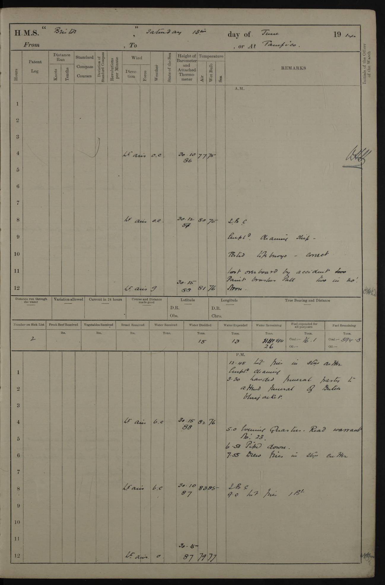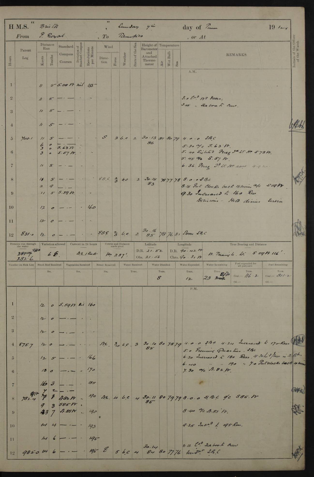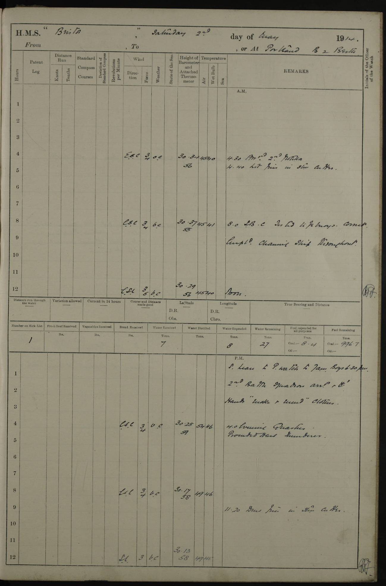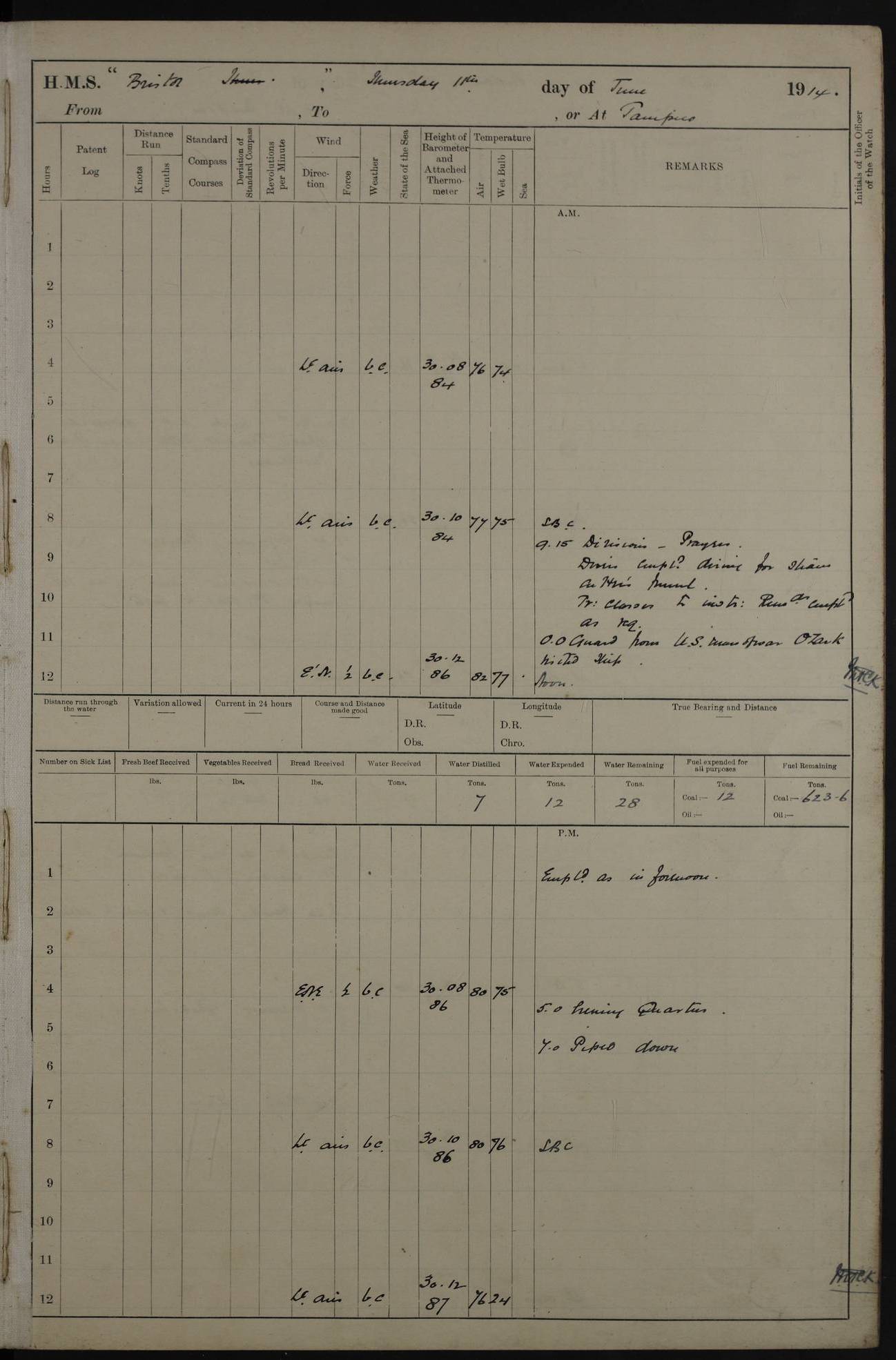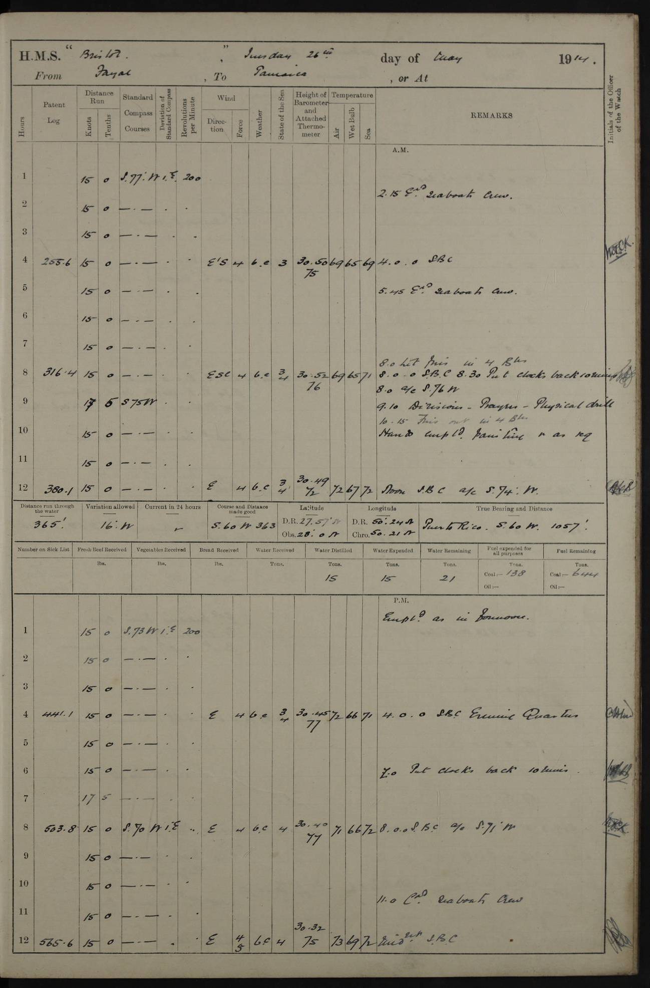 4ef4f435e53e0a0c9100147a: (https://s3.amazonaws.com:443/oldweather/ADM53-36118/0172_1.jpg) 18 May 1914 Portsmouth and at sea towards Fayal Lat 50.81, Long -1.11 Sick list not recorded.. 9.10am: Divisions. Payers. Hands employed preparing for sea. Lieutenants Hernan and Kerr joined ship. 3.30pm: Slipped and proceeded to Spithead. 4.00pm: Proceeded as requisite for passing through Needles Channel. 5.40pm: Needles outer buoys: abeam 2 cables. Shaped course S83W. 200 revolutions. 6.32pm: Anvil Point: abeam 1.2 mile. 10.05pm: Start Point: abeam 5.6 miles. Altered course S75 1/2W. 11.00pm: Passed fishing vessels 1 mile on Starboard beam. 11.45pm: Start Point: N54 1/2E. Eddystone: N42W. 4ef4f436e53e0a0c9100147b: (https://s3.amazonaws.com:443/oldweather/ADM53-36118/0173_0.jpg) 19 May 1914 At sea Lat 48.40, Long -7.91 Sick list not recorded. 1.30am: Passed several fishing vessels about 4 cables N and S of ship. 2.30am: Lizard Light: N30W. 3.32am: Lizard Light: N8E. Noon: Altered course S77W. 7.00pm: Put clocks back 30 minutes. 8.00pm: Altered course S78W. 4ef4f436e53e0a0c9100147c: (https://s3.amazonaws.com:443/oldweather/ADM53-36118/0173_1.jpg) 20 May 1914 At sea Lat 45.28, Long -15.61 1 on sick list. 8.30am: Put clocks back 15 minutes. 7.00pm: Put clocks back 15 minutes. 4ef4f436e53e0a0c9100147d: (https://s3.amazonaws.com:443/oldweather/ADM53-36118/0174_0.jpg) 21 May 1914 At sea Lat 41.81, Long -22.63 1 on sick list. 8.30am: Put clocks back 15 minutes. 7.00pm: Put clocks back 15 minutes. 8.00pm: Altered course S77W. 4ef4f436e53e0a0c9100147e: (https://s3.amazonaws.com:443/oldweather/ADM53-36118/0174_1.jpg) 22 May 1914 At sea to Fayal (Horta Bay) Lat 38.53, Long -28.61 2 on sick list. 7.00am: Sighted Graciosa Island ahead. 7.15am: Altered course N84W. 8.20am: Altered course S50W. 8.30am: Put clocks back 15 minutes. Employed preparing for coaling and as requisite. 8.45am: Passed Portuguese cruiser Adamastor. 9.40am: St Jorge Rock: abeam 4 miles. 10.30am: Course and speed as requisite for approaching and entering Horta Bay. 11.00am: Stopped and came to with Starboard Bower in 16 1/2 fathoms, veered to 6 shackles. Fired 21 guns salute. Portuguese Fort returned 21 guns. 2.00pm: Commenced coaling ship. 4ef4f436e53e0a0c9100147f: (https://s3.amazonaws.com:443/oldweather/ADM53-36118/0175_0.jpg) 23 May 1914 Fayal and at sea towards Jamaica Lat 37.20, Long -31.63 4 on sick list. 12.30am: Finished coaling. Received onboard 300 tons. 1.40am: Weighed and proceeded. 2.00am: Shaped course S82W. 200 revolutions. 8.30am: Put clocks back 15 minutes. 10.52pm: Stopped Starboard engine owing to accident to stoker. 11.40pm: Proceeded 200 revolutions. 4ef4f436e53e0a0c91001480: (https://s3.amazonaws.com:443/oldweather/ADM53-36118/0175_1.jpg) 24 May 1914 At sea Lat 34.08, Long -37.83 4 on sick list. 8.30am: Put clocks back 15 minutes. 10.00am: Held Divine Service. Noon: Altered course S81W. 7.00pm: Put clocks back 10 minutes. 4ef4f436e53e0a0c91001481: (https://s3.amazonaws.com:443/oldweather/ADM53-36118/0176_0.jpg) 25 May 1914 At sea Lat 31.1, Long -44.25 Sick list not recorded. 8.30am: Clocks back 10 minutes. 10.35am: Lost overboard by accident 1 Patent Log rotator and line complete. 7.00pm: Put clocks back 10 minutes. 4ef4f436e53e0a0c91001482: (https://s3.amazonaws.com:443/oldweather/ADM53-36118/0176_1.jpg) 26 May 1914 At sea Lat 28.0, Long -50.35 Sick list not recorded. 8.30am: Put clocks back 10 minutes. 7.00pm: Put clocks back 10 minutes. 8.00pm: Altered course S71W. 4ef4f436e53e0a0c91001483: (https://s3.amazonaws.com:443/oldweather/ADM53-36118/0177_0.jpg) 27 May 1914 At sea Lat 24.85, Long -56.15 Sick list not recorded. 8.00am: Altered course S69W. 8.30am: Put clocks back 10 minutes. 9.10am: Divisions. Prayers. Physical drill. Employed painting and as requisite. 12.30pm: Exercised Maxim Gun crews. Training Classes to instruction. Remainder employed as in forenoon. 7.00pm: Put clocks back 10 min 9.40pm: Heavy rain squall, frequent lightning. 4ef4f437e53e0a0c91001484: (https://s3.amazonaws.com:443/oldweather/ADM53-36118/0177_1.jpg) 28 May 1914 At sea Lat 21.86, Long -61.63 Sick list not recorded. 8.00am: Altered course S64W. 8.30am: Put clocks back 10 minutes. 9.15am: Squally weather. 9.30am: Divisions with small arms. Prayers. Exercised small arm companies. Training Classes to instructions. Employed as requisite. Noon: Altered course S63W. 7.00pm: Put clocks back 10 minutes. 8.00pm: Altered course S64W. 4ef4f437e53e0a0c91001485: (https://s3.amazonaws.com:443/oldweather/ADM53-36118/0178_0.jpg) 29 May 1914 At sea Lat 18.61, Long -67.25 4 on sick list. 8.00am: Altered course S62W. 8.30am: Put clocks back 10 minutes. 10.15am: Sighted land on Port bow. 10.00am: Cape Borinquen: S13W. Noon: Cape Borinquen: S12W 15 miles. Altered course S61W. 1.00pm: Reduced to 170 revolutions. 1.28pm: Mona Island: abeam 12 miles. 5.50pm: Altered course S47W. 6.30pm: Altered course S73W. Cuidado Island: N44W. Espada Point: N5E. 7.00pm: Put clocks back 10 minutes. 4ef4f437e53e0a0c91001486: (https://s3.amazonaws.com:443/oldweather/ADM53-36118/0178_1.jpg) 30 May 1914 At sea Lat 17.43, Long -72.50 5 on sick list. 7.30am: Altered course S64W. 7.45am: Altered course S42W. 8.10am: Altered course N86W. 8.22am: Alto Velo Island: abeam 4 miles. 8.15am: Put clocks back 10 minutes. 7.00pm: Set clocks to Jamaica Standard Time 5 hours slow on GMT. 8.00pm: Altered course N82W. 4ef4f437e53e0a0c91001487: (https://s3.amazonaws.com:443/oldweather/ADM53-36118/0179_0.jpg) 31 May 1914 At sea to Port Royal Lat 17.93, Long -76.85 5 on sick list. 3.30am: Sighted Morant Light: WNW. 5.03am: Morant Light: abeam 9 miles. 6.45am: Course and speed as requisite for approaching and entering Port Royal. 8.25am: Stopped and came to with Starboard Bower in 9 fathoms, veered to 6 shackles. 10.30am: Divisions. Held Divine Service. 1.25pm: Obtained Pratique. LOGS FOR JUNE 1914 4ef4f437e53e0a0c91001488: (https://s3.amazonaws.com:443/oldweather/ADM53-36118/0179_1.jpg) 1 June 1914 P