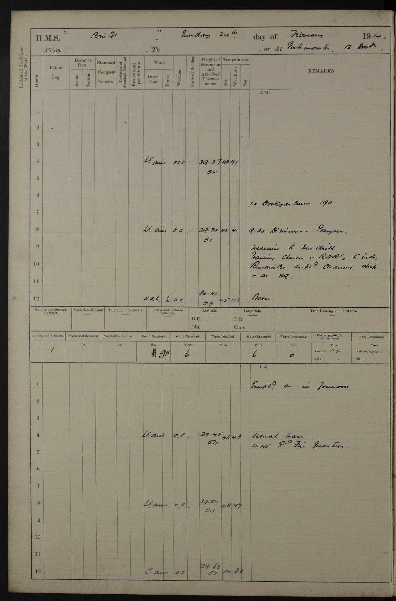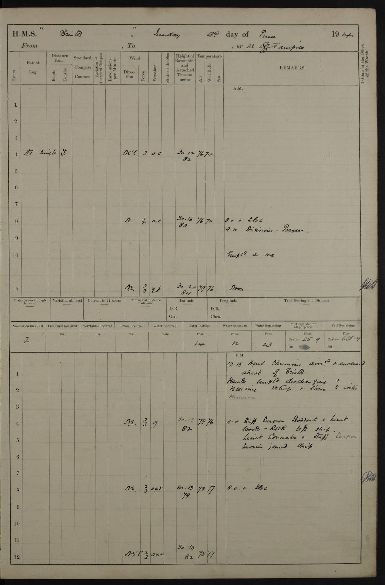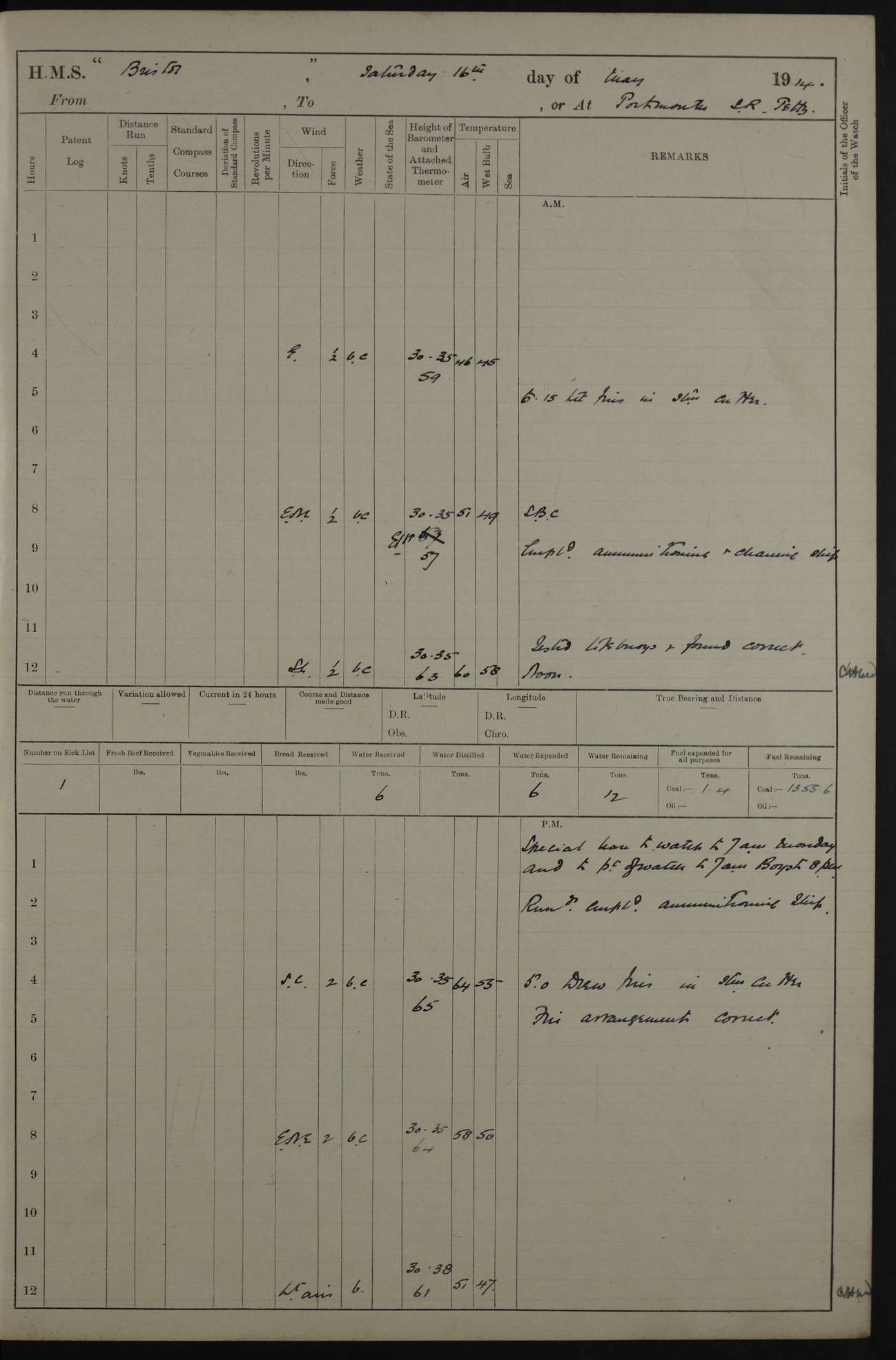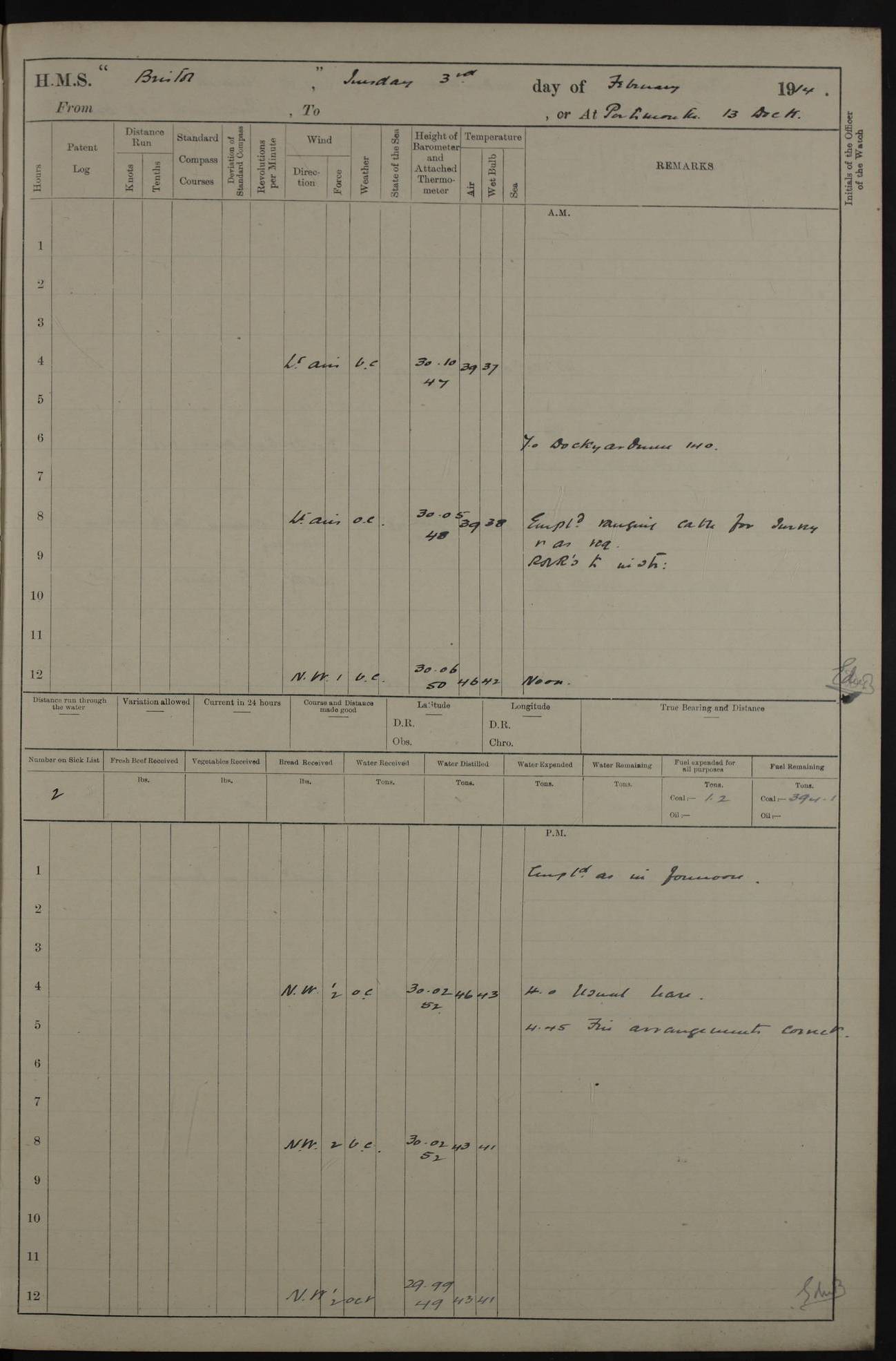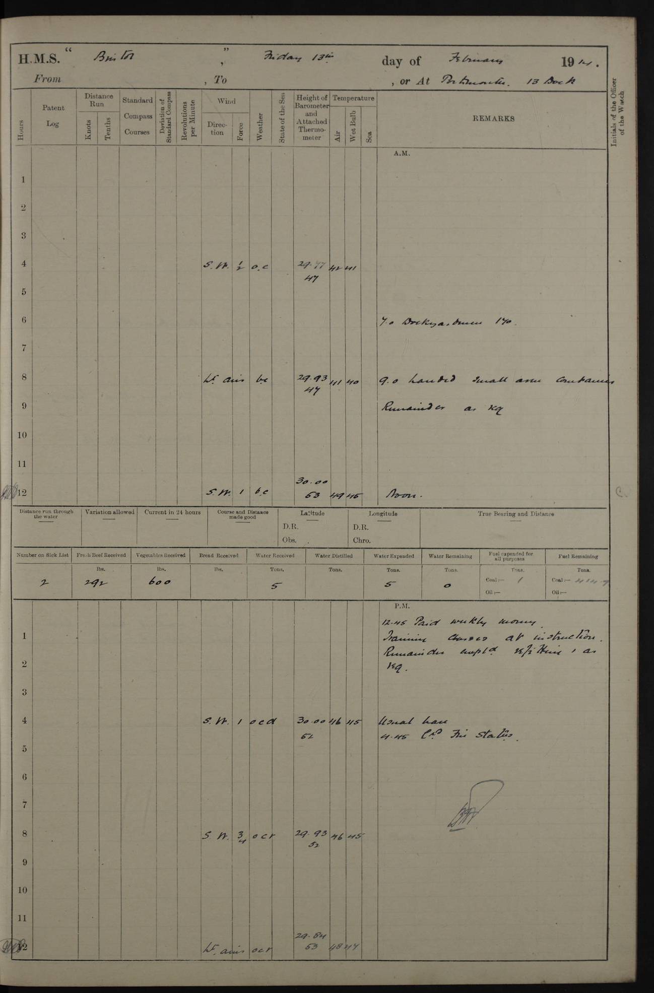 4ef4f435e53e0a0c9100147a: (https://s3.amazonaws.com:443/oldweather/ADM53-36118/0172_1.jpg) 18 May 1914 Portsmouth and at sea towards Fayal Lat 50.81, Long -1.11 Sick list not recorded.. 9.10am: Divisions. Payers. Hands employed preparing for sea. Lieutenants Hernan and Kerr joined ship. 3.30pm: Slipped and proceeded to Spithead. 4.00pm: Proceeded as requisite for passing through Needles Channel. 5.40pm: Needles outer buoys: abeam 2 cables. Shaped course S83W. 200 revolutions. 6.32pm: Anvil Point: abeam 1.2 mile. 10.05pm: Start Point: abeam 5.6 miles. Altered course S75 1/2W. 11.00pm: Passed fishing vessels 1 mile on Starboard beam. 11.45pm: Start Point: N54 1/2E. Eddystone: N42W. 4ef4f436e53e0a0c9100147b: (https://s3.amazonaws.com:443/oldweather/ADM53-36118/0173_0.jpg) 19 May 1914 At sea Lat 48.40, Long -7.91 Sick list not recorded. 1.30am: Passed several fishing vessels about 4 cables N and S of ship. 2.30am: Lizard Light: N30W. 3.32am: Lizard Light: N8E. Noon: Altered course S77W. 7.00pm: Put clocks back 30 minutes. 8.00pm: Altered course S78W. 4ef4f436e53e0a0c9100147c: (https://s3.amazonaws.com:443/oldweather/ADM53-36118/0173_1.jpg) 20 May 1914 At sea Lat 45.28, Long -15.61 1 on sick list. 8.30am: Put clocks back 15 minutes. 7.00pm: Put clocks back 15 minutes. 4ef4f436e53e0a0c9100147d: (https://s3.amazonaws.com:443/oldweather/ADM53-36118/0174_0.jpg) 21 May 1914 At sea Lat 41.81, Long -22.63 1 on sick list. 8.30am: Put clocks back 15 minutes. 7.00pm: Put clocks back 15 minutes. 8.00pm: Altered course S77W. 4ef4f436e53e0a0c9100147e: (https://s3.amazonaws.com:443/oldweather/ADM53-36118/0174_1.jpg) 22 May 1914 At sea to Fayal (Horta Bay) Lat 38.53, Long -28.61 2 on sick list. 7.00am: Sighted Graciosa Island ahead. 7.15am: Altered course N84W. 8.20am: Altered course S50W. 8.30am: Put clocks back 15 minutes. Employed preparing for coaling and as requisite. 8.45am: Passed Portuguese cruiser Adamastor. 9.40am: St Jorge Rock: abeam 4 miles. 10.30am: Course and speed as requisite for approaching and entering Horta Bay. 11.00am: Stopped and came to with Starboard Bower in 16 1/2 fathoms, veered to 6 shackles. Fired 21 guns salute. Portuguese Fort returned 21 guns. 2.00pm: Commenced coaling ship. 4ef4f436e53e0a0c9100147f: (https://s3.amazonaws.com:443/oldweather/ADM53-36118/0175_0.jpg) 23 May 1914 Fayal and at sea towards Jamaica Lat 37.20, Long -31.63 4 on sick list. 12.30am: Finished coaling. Received onboard 300 tons. 1.40am: Weighed and proceeded. 2.00am: Shaped course S82W. 200 revolutions. 8.30am: Put clocks back 15 minutes. 10.52pm: Stopped Starboard engine owing to accident to stoker. 11.40pm: Proceeded 200 revolutions. 4ef4f436e53e0a0c91001480: (https://s3.amazonaws.com:443/oldweather/ADM53-36118/0175_1.jpg) 24 May 1914 At sea Lat 34.08, Long -37.83 4 on sick list. 8.30am: Put clocks back 15 minutes. 10.00am: Held Divine Service. Noon: Altered course S81W. 7.00pm: Put clocks back 10 minutes. 4ef4f436e53e0a0c91001481: (https://s3.amazonaws.com:443/oldweather/ADM53-36118/0176_0.jpg) 25 May 1914 At sea Lat 31.1, Long -44.25 Sick list not recorded. 8.30am: Clocks back 10 minutes. 10.35am: Lost overboard by accident 1 Patent Log rotator and line complete. 7.00pm: Put clocks back 10 minutes. 4ef4f436e53e0a0c91001482: (https://s3.amazonaws.com:443/oldweather/ADM53-36118/0176_1.jpg) 26 May 1914 At sea Lat 28.0, Long -50.35 Sick list not recorded. 8.30am: Put clocks back 10 minutes. 7.00pm: Put clocks back 10 minutes. 8.00pm: Altered course S71W. 4ef4f436e53e0a0c91001483: (https://s3.amazonaws.com:443/oldweather/ADM53-36118/0177_0.jpg) 27 May 1914 At sea Lat 24.85, Long -56.15 Sick list not recorded. 8.00am: Altered course S69W. 8.30am: Put clocks back 10 minutes. 9.10am: Divisions. Prayers. Physical drill. Employed painting and as requisite. 12.30pm: Exercised Maxim Gun crews. Training Classes to instruction. Remainder employed as in forenoon. 7.00pm: Put clocks back 10 min 9.40pm: Heavy rain squall, frequent lightning. 4ef4f437e53e0a0c91001484: (https://s3.amazonaws.com:443/oldweather/ADM53-36118/0177_1.jpg) 28 May 1914 At sea Lat 21.86, Long -61.63 Sick list not recorded. 8.00am: Altered course S64W. 8.30am: Put clocks back 10 minutes. 9.15am: Squally weather. 9.30am: Divisions with small arms. Prayers. Exercised small arm companies. Training Classes to instructions. Employed as requisite. Noon: Altered course S63W. 7.00pm: Put clocks back 10 minutes. 8.00pm: Altered course S64W. 4ef4f437e53e0a0c91001485: (https://s3.amazonaws.com:443/oldweather/ADM53-36118/0178_0.jpg) 29 May 1914 At sea Lat 18.61, Long -67.25 4 on sick list. 8.00am: Altered course S62W. 8.30am: Put clocks back 10 minutes. 10.15am: Sighted land on Port bow. 10.00am: Cape Borinquen: S13W. Noon: Cape Borinquen: S12W 15 miles. Altered course S61W. 1.00pm: Reduced to 170 revolutions. 1.28pm: Mona Island: abeam 12 miles. 5.50pm: Altered course S47W. 6.30pm: Altered course S73W. Cuidado Island: N44W. Espada Point: N5E. 7.00pm: Put clocks back 10 minutes. 4ef4f437e53e0a0c91001486: (https://s3.amazonaws.com:443/oldweather/ADM53-36118/0178_1.jpg) 30 May 1914 At sea Lat 17.43, Long -72.50 5 on sick list. 7.30am: Altered course S64W. 7.45am: Altered course S42W. 8.10am: Altered course N86W. 8.22am: Alto Velo Island: abeam 4 miles. 8.15am: Put clocks back 10 minutes. 7.00pm: Set clocks to Jamaica Standard Time 5 hours slow on GMT. 8.00pm: Altered course N82W. 4ef4f437e53e0a0c91001487: (https://s3.amazonaws.com:443/oldweather/ADM53-36118/0179_0.jpg) 31 May 1914 At sea to Port Royal Lat 17.93, Long -76.85 5 on sick list. 3.30am: Sighted Morant Light: WNW. 5.03am: Morant Light: abeam 9 miles. 6.45am: Course and speed as requisite for approaching and entering Port Royal. 8.25am: Stopped and came to with Starboard Bower in 9 fathoms, veered to 6 shackles. 10.30am: Divisions. Held Divine Service. 1.25pm: Obtained Pratique. LOGS FOR JUNE 1914 4ef4f437e53e0a0c91001488: (https://s3.amazonaws.com:443/oldweather/ADM53-36118/0179_1.jpg) 1 June 1914 P