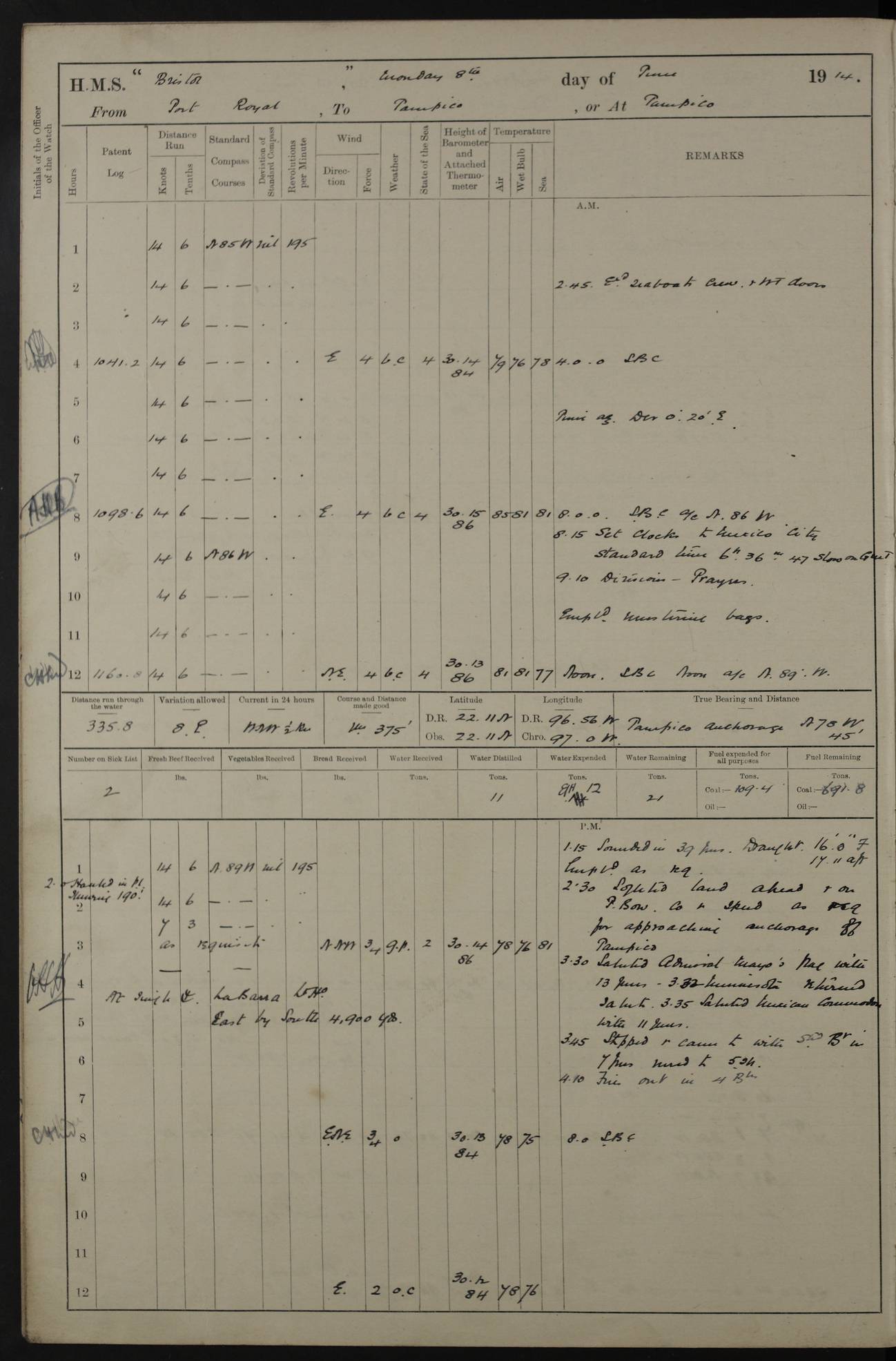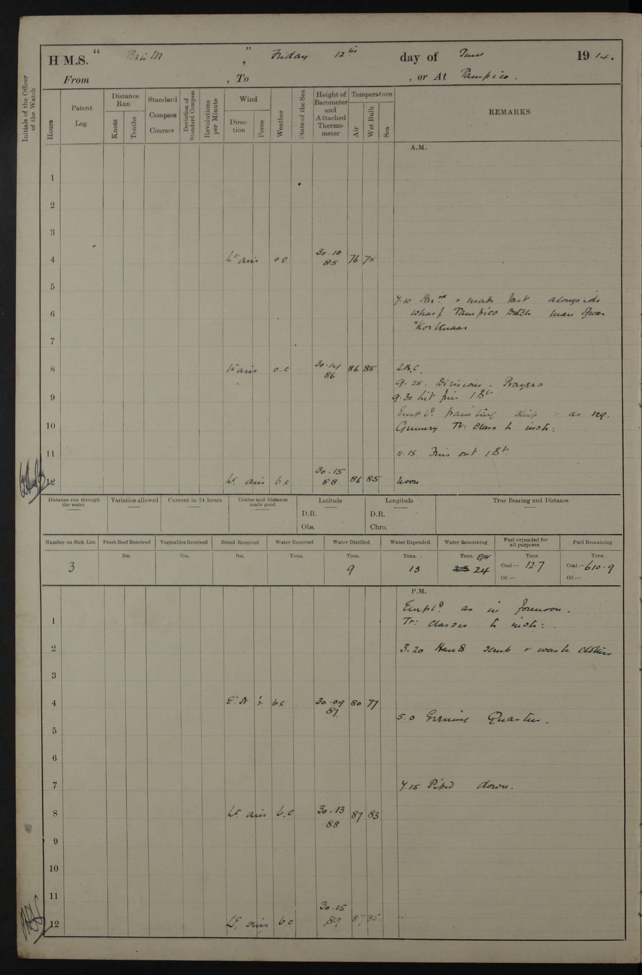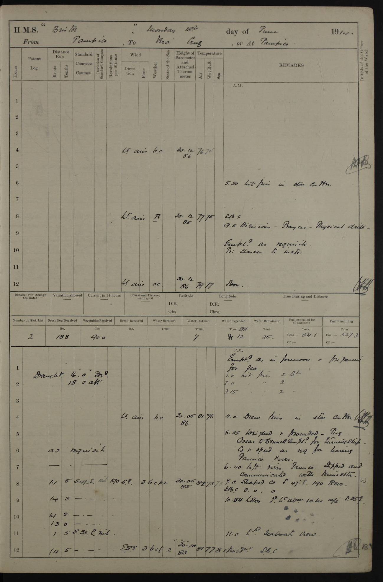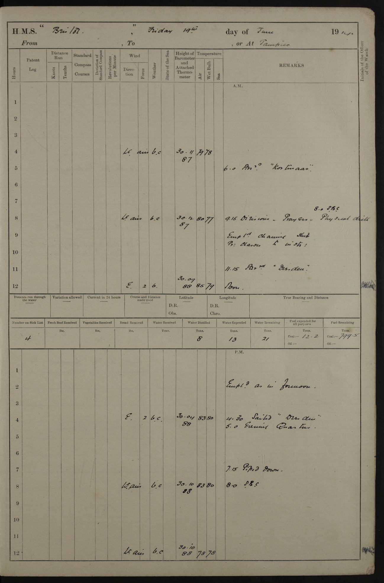 4ef4f435e53e0a0c9100147a: (https://s3.amazonaws.com:443/oldweather/ADM53-36118/0172_1.jpg) 18 May 1914 Portsmouth and at sea towards Fayal Lat 50.81, Long -1.11 Sick list not recorded.. 9.10am: Divisions. Payers. Hands employed preparing for sea. Lieutenants Hernan and Kerr joined ship. 3.30pm: Slipped and proceeded to Spithead. 4.00pm: Proceeded as requisite for passing through Needles Channel. 5.40pm: Needles outer buoys: abeam 2 cables. Shaped course S83W. 200 revolutions. 6.32pm: Anvil Point: abeam 1.2 mile. 10.05pm: Start Point: abeam 5.6 miles. Altered course S75 1/2W. 11.00pm: Passed fishing vessels 1 mile on Starboard beam. 11.45pm: Start Point: N54 1/2E. Eddystone: N42W. 4ef4f436e53e0a0c9100147b: (https://s3.amazonaws.com:443/oldweather/ADM53-36118/0173_0.jpg) 19 May 1914 At sea Lat 48.40, Long -7.91 Sick list not recorded. 1.30am: Passed several fishing vessels about 4 cables N and S of ship. 2.30am: Lizard Light: N30W. 3.32am: Lizard Light: N8E. Noon: Altered course S77W. 7.00pm: Put clocks back 30 minutes. 8.00pm: Altered course S78W. 4ef4f436e53e0a0c9100147c: (https://s3.amazonaws.com:443/oldweather/ADM53-36118/0173_1.jpg) 20 May 1914 At sea Lat 45.28, Long -15.61 1 on sick list. 8.30am: Put clocks back 15 minutes. 7.00pm: Put clocks back 15 minutes. 4ef4f436e53e0a0c9100147d: (https://s3.amazonaws.com:443/oldweather/ADM53-36118/0174_0.jpg) 21 May 1914 At sea Lat 41.81, Long -22.63 1 on sick list. 8.30am: Put clocks back 15 minutes. 7.00pm: Put clocks back 15 minutes. 8.00pm: Altered course S77W. 4ef4f436e53e0a0c9100147e: (https://s3.amazonaws.com:443/oldweather/ADM53-36118/0174_1.jpg) 22 May 1914 At sea to Fayal (Horta Bay) Lat 38.53, Long -28.61 2 on sick list. 7.00am: Sighted Graciosa Island ahead. 7.15am: Altered course N84W. 8.20am: Altered course S50W. 8.30am: Put clocks back 15 minutes. Employed preparing for coaling and as requisite. 8.45am: Passed Portuguese cruiser Adamastor. 9.40am: St Jorge Rock: abeam 4 miles. 10.30am: Course and speed as requisite for approaching and entering Horta Bay. 11.00am: Stopped and came to with Starboard Bower in 16 1/2 fathoms, veered to 6 shackles. Fired 21 guns salute. Portuguese Fort returned 21 guns. 2.00pm: Commenced coaling ship. 4ef4f436e53e0a0c9100147f: (https://s3.amazonaws.com:443/oldweather/ADM53-36118/0175_0.jpg) 23 May 1914 Fayal and at sea towards Jamaica Lat 37.20, Long -31.63 4 on sick list. 12.30am: Finished coaling. Received onboard 300 tons. 1.40am: Weighed and proceeded. 2.00am: Shaped course S82W. 200 revolutions. 8.30am: Put clocks back 15 minutes. 10.52pm: Stopped Starboard engine owing to accident to stoker. 11.40pm: Proceeded 200 revolutions. 4ef4f436e53e0a0c91001480: (https://s3.amazonaws.com:443/oldweather/ADM53-36118/0175_1.jpg) 24 May 1914 At sea Lat 34.08, Long -37.83 4 on sick list. 8.30am: Put clocks back 15 minutes. 10.00am: Held Divine Service. Noon: Altered course S81W. 7.00pm: Put clocks back 10 minutes. 4ef4f436e53e0a0c91001481: (https://s3.amazonaws.com:443/oldweather/ADM53-36118/0176_0.jpg) 25 May 1914 At sea Lat 31.1, Long -44.25 Sick list not recorded. 8.30am: Clocks back 10 minutes. 10.35am: Lost overboard by accident 1 Patent Log rotator and line complete. 7.00pm: Put clocks back 10 minutes. 4ef4f436e53e0a0c91001482: (https://s3.amazonaws.com:443/oldweather/ADM53-36118/0176_1.jpg) 26 May 1914 At sea Lat 28.0, Long -50.35 Sick list not recorded. 8.30am: Put clocks back 10 minutes. 7.00pm: Put clocks back 10 minutes. 8.00pm: Altered course S71W. 4ef4f436e53e0a0c91001483: (https://s3.amazonaws.com:443/oldweather/ADM53-36118/0177_0.jpg) 27 May 1914 At sea Lat 24.85, Long -56.15 Sick list not recorded. 8.00am: Altered course S69W. 8.30am: Put clocks back 10 minutes. 9.10am: Divisions. Prayers. Physical drill. Employed painting and as requisite. 12.30pm: Exercised Maxim Gun crews. Training Classes to instruction. Remainder employed as in forenoon. 7.00pm: Put clocks back 10 min 9.40pm: Heavy rain squall, frequent lightning. 4ef4f437e53e0a0c91001484: (https://s3.amazonaws.com:443/oldweather/ADM53-36118/0177_1.jpg) 28 May 1914 At sea Lat 21.86, Long -61.63 Sick list not recorded. 8.00am: Altered course S64W. 8.30am: Put clocks back 10 minutes. 9.15am: Squally weather. 9.30am: Divisions with small arms. Prayers. Exercised small arm companies. Training Classes to instructions. Employed as requisite. Noon: Altered course S63W. 7.00pm: Put clocks back 10 minutes. 8.00pm: Altered course S64W. 4ef4f437e53e0a0c91001485: (https://s3.amazonaws.com:443/oldweather/ADM53-36118/0178_0.jpg) 29 May 1914 At sea Lat 18.61, Long -67.25 4 on sick list. 8.00am: Altered course S62W. 8.30am: Put clocks back 10 minutes. 10.15am: Sighted land on Port bow. 10.00am: Cape Borinquen: S13W. Noon: Cape Borinquen: S12W 15 miles. Altered course S61W. 1.00pm: Reduced to 170 revolutions. 1.28pm: Mona Island: abeam 12 miles. 5.50pm: Altered course S47W. 6.30pm: Altered course S73W. Cuidado Island: N44W. Espada Point: N5E. 7.00pm: Put clocks back 10 minutes. 4ef4f437e53e0a0c91001486: (https://s3.amazonaws.com:443/oldweather/ADM53-36118/0178_1.jpg) 30 May 1914 At sea Lat 17.43, Long -72.50 5 on sick list. 7.30am: Altered course S64W. 7.45am: Altered course S42W. 8.10am: Altered course N86W. 8.22am: Alto Velo Island: abeam 4 miles. 8.15am: Put clocks back 10 minutes. 7.00pm: Set clocks to Jamaica Standard Time 5 hours slow on GMT. 8.00pm: Altered course N82W. 4ef4f437e53e0a0c91001487: (https://s3.amazonaws.com:443/oldweather/ADM53-36118/0179_0.jpg) 31 May 1914 At sea to Port Royal Lat 17.93, Long -76.85 5 on sick list. 3.30am: Sighted Morant Light: WNW. 5.03am: Morant Light: abeam 9 miles. 6.45am: Course and speed as requisite for approaching and entering Port Royal. 8.25am: Stopped and came to with Starboard Bower in 9 fathoms, veered to 6 shackles. 10.30am: Divisions. Held Divine Service. 1.25pm: Obtained Pratique. LOGS FOR JUNE 1914 4ef4f437e53e0a0c91001488: (https://s3.amazonaws.com:443/oldweather/ADM53-36118/0179_1.jpg) 1 June 1914 P