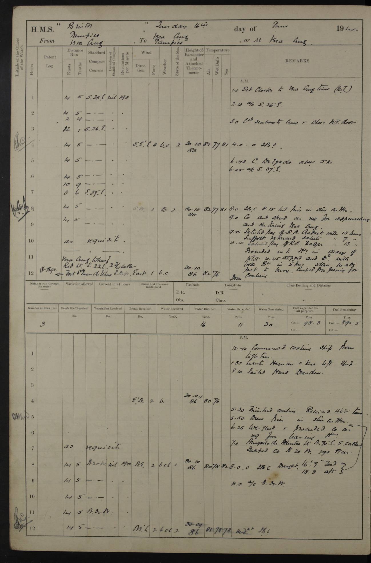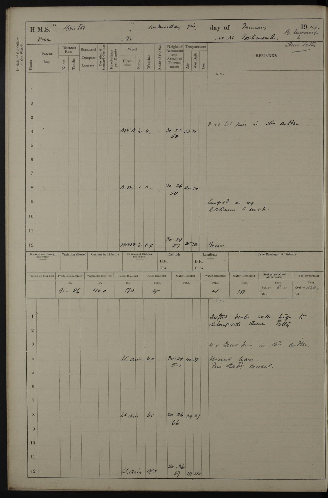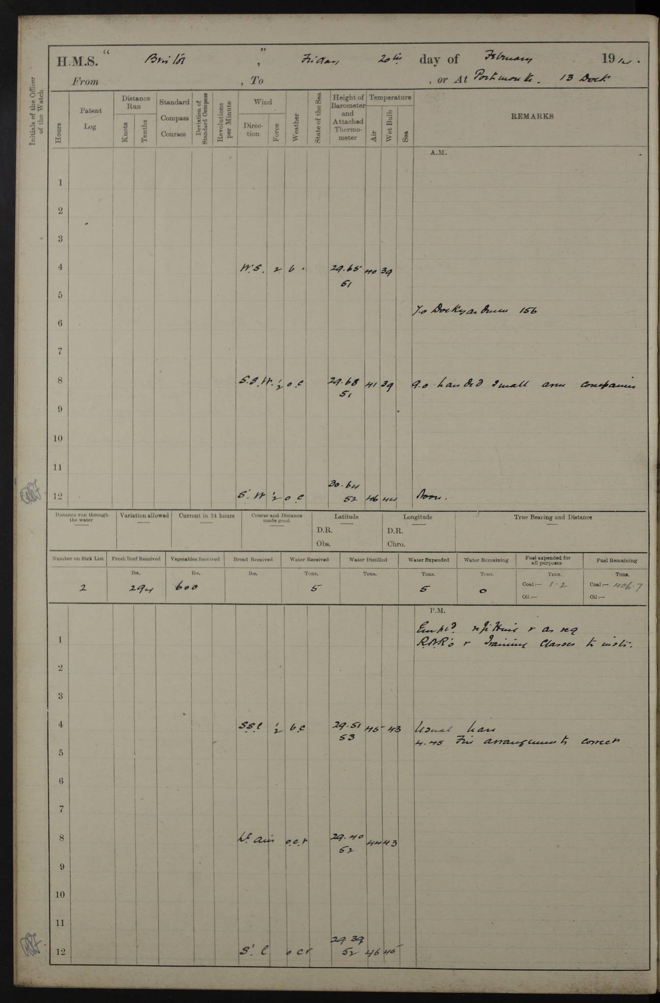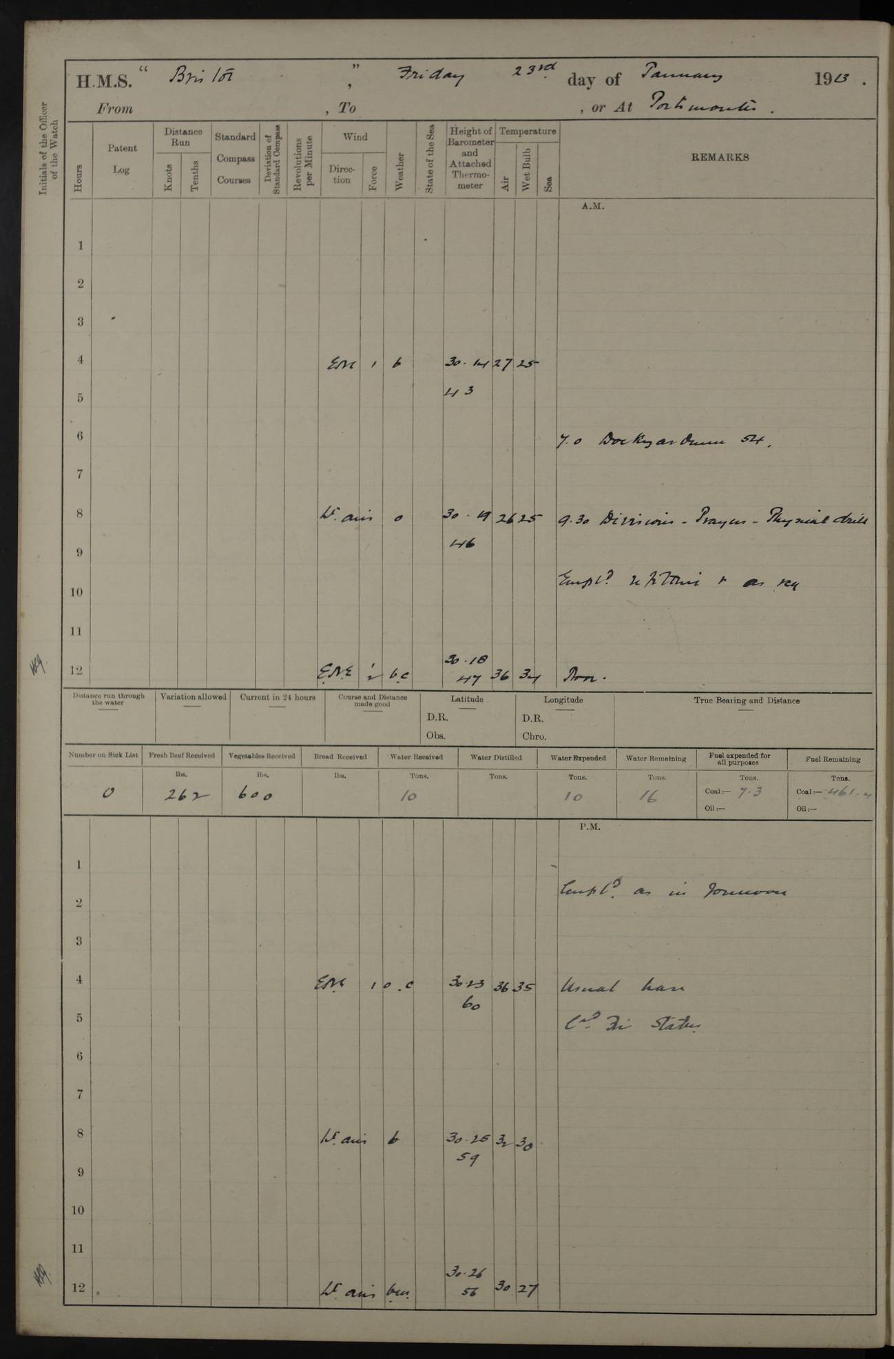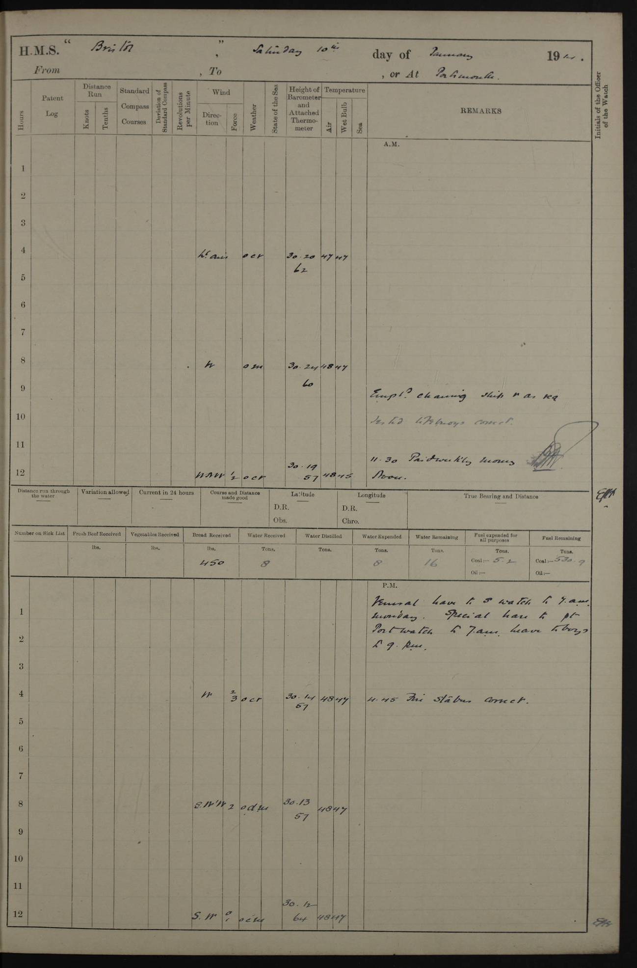 4ef4f435e53e0a0c9100147a: (https://s3.amazonaws.com:443/oldweather/ADM53-36118/0172_1.jpg) 18 May 1914 Portsmouth and at sea towards Fayal Lat 50.81, Long -1.11 Sick list not recorded.. 9.10am: Divisions. Payers. Hands employed preparing for sea. Lieutenants Hernan and Kerr joined ship. 3.30pm: Slipped and proceeded to Spithead. 4.00pm: Proceeded as requisite for passing through Needles Channel. 5.40pm: Needles outer buoys: abeam 2 cables. Shaped course S83W. 200 revolutions. 6.32pm: Anvil Point: abeam 1.2 mile. 10.05pm: Start Point: abeam 5.6 miles. Altered course S75 1/2W. 11.00pm: Passed fishing vessels 1 mile on Starboard beam. 11.45pm: Start Point: N54 1/2E. Eddystone: N42W. 4ef4f436e53e0a0c9100147b: (https://s3.amazonaws.com:443/oldweather/ADM53-36118/0173_0.jpg) 19 May 1914 At sea Lat 48.40, Long -7.91 Sick list not recorded. 1.30am: Passed several fishing vessels about 4 cables N and S of ship. 2.30am: Lizard Light: N30W. 3.32am: Lizard Light: N8E. Noon: Altered course S77W. 7.00pm: Put clocks back 30 minutes. 8.00pm: Altered course S78W. 4ef4f436e53e0a0c9100147c: (https://s3.amazonaws.com:443/oldweather/ADM53-36118/0173_1.jpg) 20 May 1914 At sea Lat 45.28, Long -15.61 1 on sick list. 8.30am: Put clocks back 15 minutes. 7.00pm: Put clocks back 15 minutes. 4ef4f436e53e0a0c9100147d: (https://s3.amazonaws.com:443/oldweather/ADM53-36118/0174_0.jpg) 21 May 1914 At sea Lat 41.81, Long -22.63 1 on sick list. 8.30am: Put clocks back 15 minutes. 7.00pm: Put clocks back 15 minutes. 8.00pm: Altered course S77W. 4ef4f436e53e0a0c9100147e: (https://s3.amazonaws.com:443/oldweather/ADM53-36118/0174_1.jpg) 22 May 1914 At sea to Fayal (Horta Bay) Lat 38.53, Long -28.61 2 on sick list. 7.00am: Sighted Graciosa Island ahead. 7.15am: Altered course N84W. 8.20am: Altered course S50W. 8.30am: Put clocks back 15 minutes. Employed preparing for coaling and as requisite. 8.45am: Passed Portuguese cruiser Adamastor. 9.40am: St Jorge Rock: abeam 4 miles. 10.30am: Course and speed as requisite for approaching and entering Horta Bay. 11.00am: Stopped and came to with Starboard Bower in 16 1/2 fathoms, veered to 6 shackles. Fired 21 guns salute. Portuguese Fort returned 21 guns. 2.00pm: Commenced coaling ship. 4ef4f436e53e0a0c9100147f: (https://s3.amazonaws.com:443/oldweather/ADM53-36118/0175_0.jpg) 23 May 1914 Fayal and at sea towards Jamaica Lat 37.20, Long -31.63 4 on sick list. 12.30am: Finished coaling. Received onboard 300 tons. 1.40am: Weighed and proceeded. 2.00am: Shaped course S82W. 200 revolutions. 8.30am: Put clocks back 15 minutes. 10.52pm: Stopped Starboard engine owing to accident to stoker. 11.40pm: Proceeded 200 revolutions. 4ef4f436e53e0a0c91001480: (https://s3.amazonaws.com:443/oldweather/ADM53-36118/0175_1.jpg) 24 May 1914 At sea Lat 34.08, Long -37.83 4 on sick list. 8.30am: Put clocks back 15 minutes. 10.00am: Held Divine Service. Noon: Altered course S81W. 7.00pm: Put clocks back 10 minutes. 4ef4f436e53e0a0c91001481: (https://s3.amazonaws.com:443/oldweather/ADM53-36118/0176_0.jpg) 25 May 1914 At sea Lat 31.1, Long -44.25 Sick list not recorded. 8.30am: Clocks back 10 minutes. 10.35am: Lost overboard by accident 1 Patent Log rotator and line complete. 7.00pm: Put clocks back 10 minutes. 4ef4f436e53e0a0c91001482: (https://s3.amazonaws.com:443/oldweather/ADM53-36118/0176_1.jpg) 26 May 1914 At sea Lat 28.0, Long -50.35 Sick list not recorded. 8.30am: Put clocks back 10 minutes. 7.00pm: Put clocks back 10 minutes. 8.00pm: Altered course S71W. 4ef4f436e53e0a0c91001483: (https://s3.amazonaws.com:443/oldweather/ADM53-36118/0177_0.jpg) 27 May 1914 At sea Lat 24.85, Long -56.15 Sick list not recorded. 8.00am: Altered course S69W. 8.30am: Put clocks back 10 minutes. 9.10am: Divisions. Prayers. Physical drill. Employed painting and as requisite. 12.30pm: Exercised Maxim Gun crews. Training Classes to instruction. Remainder employed as in forenoon. 7.00pm: Put clocks back 10 min 9.40pm: Heavy rain squall, frequent lightning. 4ef4f437e53e0a0c91001484: (https://s3.amazonaws.com:443/oldweather/ADM53-36118/0177_1.jpg) 28 May 1914 At sea Lat 21.86, Long -61.63 Sick list not recorded. 8.00am: Altered course S64W. 8.30am: Put clocks back 10 minutes. 9.15am: Squally weather. 9.30am: Divisions with small arms. Prayers. Exercised small arm companies. Training Classes to instructions. Employed as requisite. Noon: Altered course S63W. 7.00pm: Put clocks back 10 minutes. 8.00pm: Altered course S64W. 4ef4f437e53e0a0c91001485: (https://s3.amazonaws.com:443/oldweather/ADM53-36118/0178_0.jpg) 29 May 1914 At sea Lat 18.61, Long -67.25 4 on sick list. 8.00am: Altered course S62W. 8.30am: Put clocks back 10 minutes. 10.15am: Sighted land on Port bow. 10.00am: Cape Borinquen: S13W. Noon: Cape Borinquen: S12W 15 miles. Altered course S61W. 1.00pm: Reduced to 170 revolutions. 1.28pm: Mona Island: abeam 12 miles. 5.50pm: Altered course S47W. 6.30pm: Altered course S73W. Cuidado Island: N44W. Espada Point: N5E. 7.00pm: Put clocks back 10 minutes. 4ef4f437e53e0a0c91001486: (https://s3.amazonaws.com:443/oldweather/ADM53-36118/0178_1.jpg) 30 May 1914 At sea Lat 17.43, Long -72.50 5 on sick list. 7.30am: Altered course S64W. 7.45am: Altered course S42W. 8.10am: Altered course N86W. 8.22am: Alto Velo Island: abeam 4 miles. 8.15am: Put clocks back 10 minutes. 7.00pm: Set clocks to Jamaica Standard Time 5 hours slow on GMT. 8.00pm: Altered course N82W. 4ef4f437e53e0a0c91001487: (https://s3.amazonaws.com:443/oldweather/ADM53-36118/0179_0.jpg) 31 May 1914 At sea to Port Royal Lat 17.93, Long -76.85 5 on sick list. 3.30am: Sighted Morant Light: WNW. 5.03am: Morant Light: abeam 9 miles. 6.45am: Course and speed as requisite for approaching and entering Port Royal. 8.25am: Stopped and came to with Starboard Bower in 9 fathoms, veered to 6 shackles. 10.30am: Divisions. Held Divine Service. 1.25pm: Obtained Pratique. LOGS FOR JUNE 1914 4ef4f437e53e0a0c91001488: (https://s3.amazonaws.com:443/oldweather/ADM53-36118/0179_1.jpg) 1 June 1914 P
