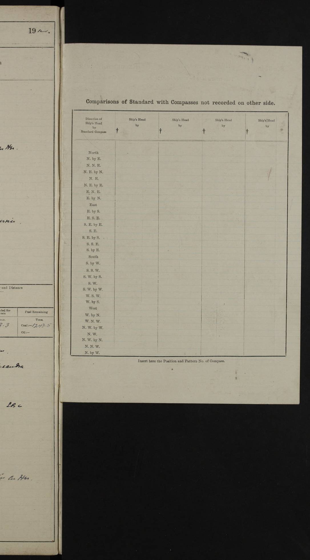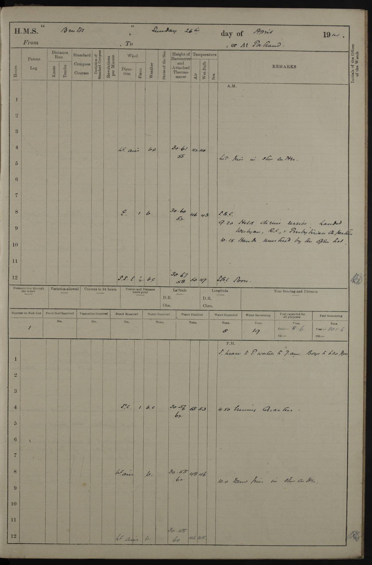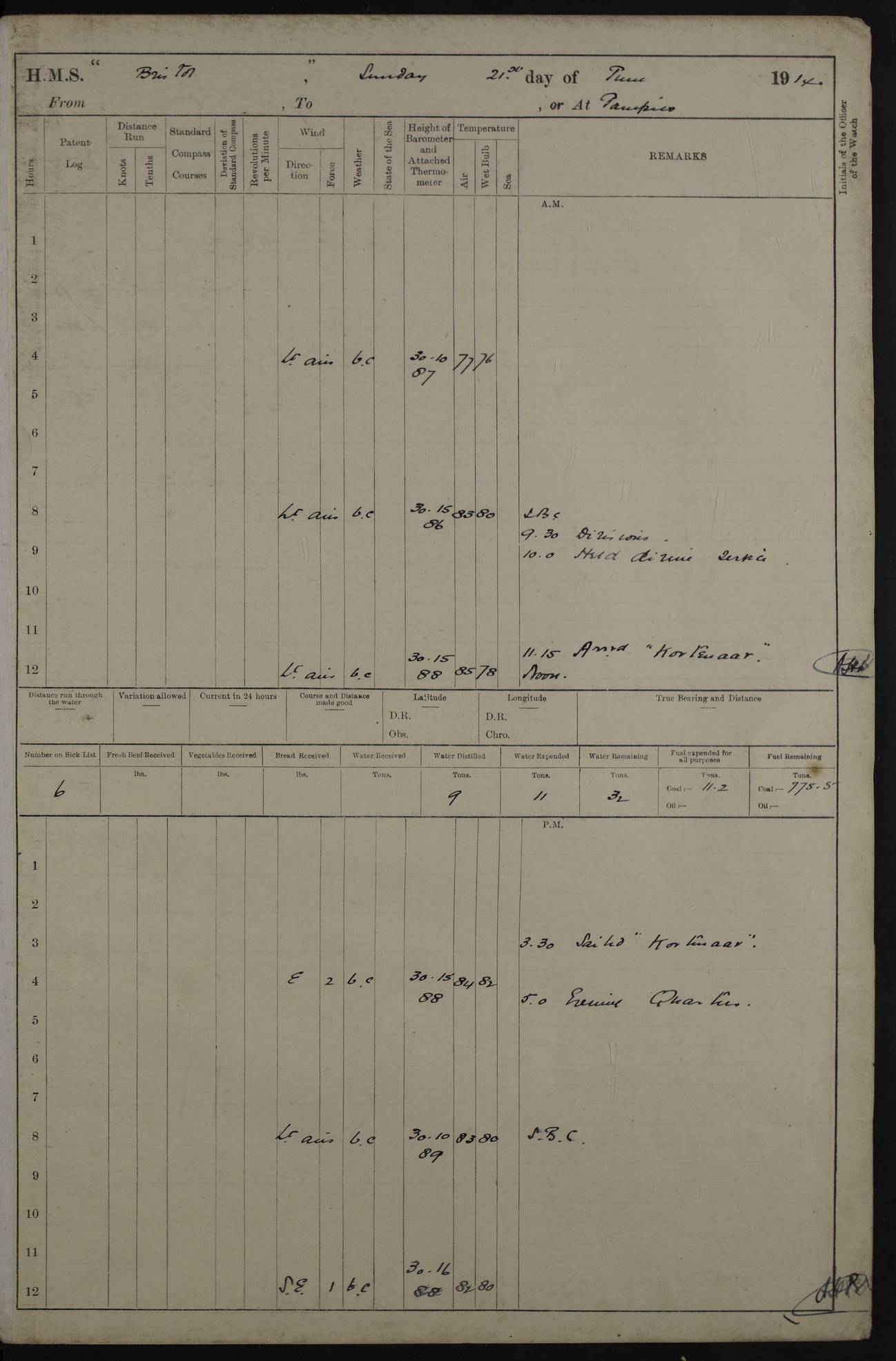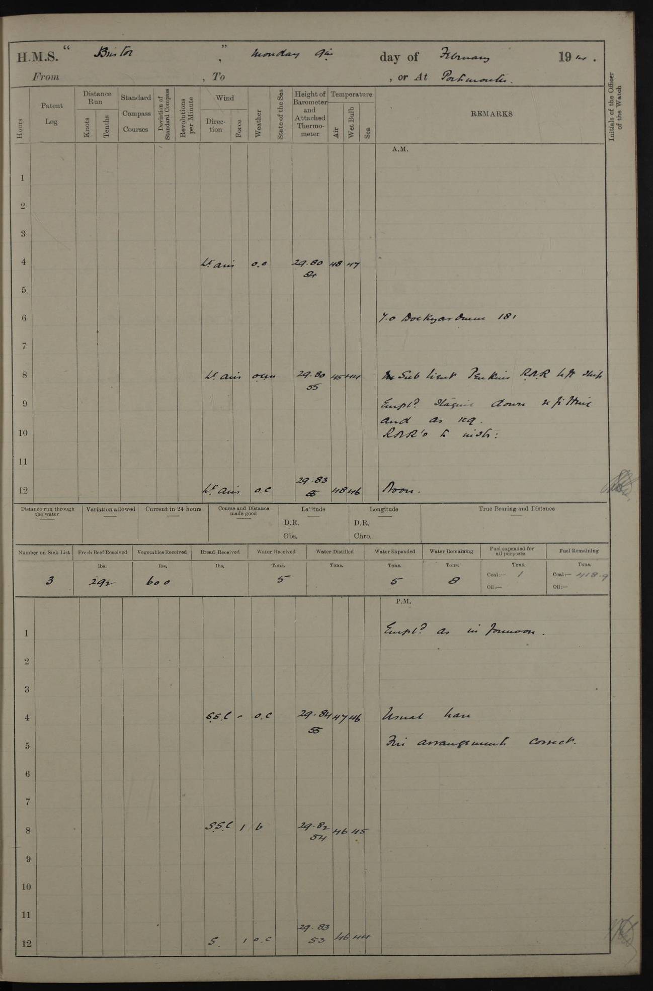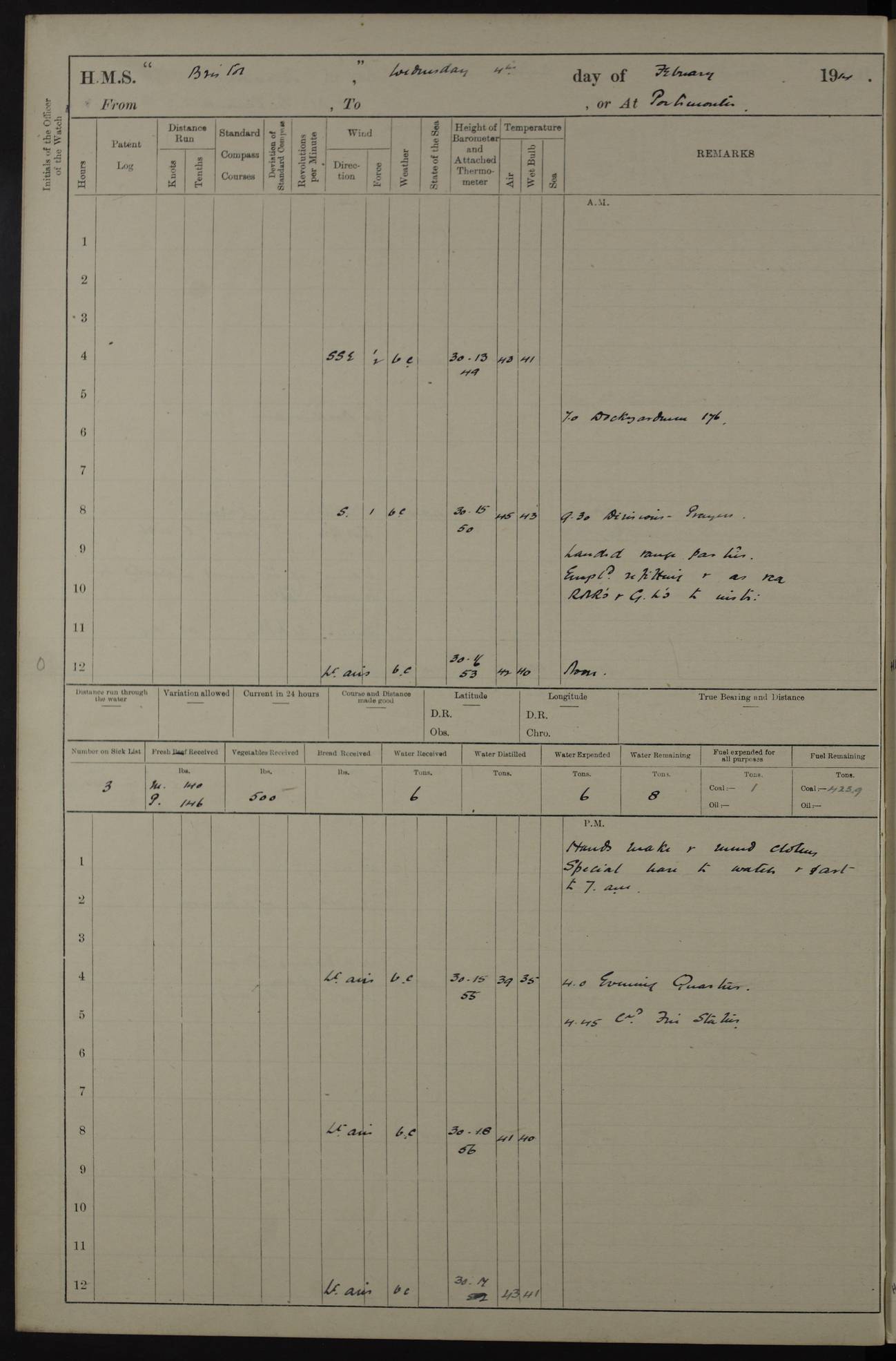4ef4f435e53e0a0c9100147a: (https://s3.amazonaws.com:443/oldweather/ADM53-36118/0172_1.jpg) 18 May 1914 Portsmouth and at sea towards Fayal Lat 50.81, Long -1.11 Sick list not recorded.. 9.10am: Divisions. Payers. Hands employed preparing for sea. Lieutenants Hernan and Kerr joined ship. 3.30pm: Slipped and proceeded to Spithead. 4.00pm: Proceeded as requisite for passing through Needles Channel. 5.40pm: Needles outer buoys: abeam 2 cables. Shaped course S83W. 200 revolutions. 6.32pm: Anvil Point: abeam 1.2 mile. 10.05pm: Start Point: abeam 5.6 miles. Altered course S75 1/2W. 11.00pm: Passed fishing vessels 1 mile on Starboard beam. 11.45pm: Start Point: N54 1/2E. Eddystone: N42W. 4ef4f436e53e0a0c9100147b: (https://s3.amazonaws.com:443/oldweather/ADM53-36118/0173_0.jpg) 19 May 1914 At sea Lat 48.40, Long -7.91 Sick list not recorded. 1.30am: Passed several fishing vessels about 4 cables N and S of ship. 2.30am: Lizard Light: N30W. 3.32am: Lizard Light: N8E. Noon: Altered course S77W. 7.00pm: Put clocks back 30 minutes. 8.00pm: Altered course S78W. 4ef4f436e53e0a0c9100147c: (https://s3.amazonaws.com:443/oldweather/ADM53-36118/0173_1.jpg) 20 May 1914 At sea Lat 45.28, Long -15.61 1 on sick list. 8.30am: Put clocks back 15 minutes. 7.00pm: Put clocks back 15 minutes. 4ef4f436e53e0a0c9100147d: (https://s3.amazonaws.com:443/oldweather/ADM53-36118/0174_0.jpg) 21 May 1914 At sea Lat 41.81, Long -22.63 1 on sick list. 8.30am: Put clocks back 15 minutes. 7.00pm: Put clocks back 15 minutes. 8.00pm: Altered course S77W. 4ef4f436e53e0a0c9100147e: (https://s3.amazonaws.com:443/oldweather/ADM53-36118/0174_1.jpg) 22 May 1914 At sea to Fayal (Horta Bay) Lat 38.53, Long -28.61 2 on sick list. 7.00am: Sighted Graciosa Island ahead. 7.15am: Altered course N84W. 8.20am: Altered course S50W. 8.30am: Put clocks back 15 minutes. Employed preparing for coaling and as requisite. 8.45am: Passed Portuguese cruiser Adamastor. 9.40am: St Jorge Rock: abeam 4 miles. 10.30am: Course and speed as requisite for approaching and entering Horta Bay. 11.00am: Stopped and came to with Starboard Bower in 16 1/2 fathoms, veered to 6 shackles. Fired 21 guns salute. Portuguese Fort returned 21 guns. 2.00pm: Commenced coaling ship. 4ef4f436e53e0a0c9100147f: (https://s3.amazonaws.com:443/oldweather/ADM53-36118/0175_0.jpg) 23 May 1914 Fayal and at sea towards Jamaica Lat 37.20, Long -31.63 4 on sick list. 12.30am: Finished coaling. Received onboard 300 tons. 1.40am: Weighed and proceeded. 2.00am: Shaped course S82W. 200 revolutions. 8.30am: Put clocks back 15 minutes. 10.52pm: Stopped Starboard engine owing to accident to stoker. 11.40pm: Proceeded 200 revolutions. 4ef4f436e53e0a0c91001480: (https://s3.amazonaws.com:443/oldweather/ADM53-36118/0175_1.jpg) 24 May 1914 At sea Lat 34.08, Long -37.83 4 on sick list. 8.30am: Put clocks back 15 minutes. 10.00am: Held Divine Service. Noon: Altered course S81W. 7.00pm: Put clocks back 10 minutes. 4ef4f436e53e0a0c91001481: (https://s3.amazonaws.com:443/oldweather/ADM53-36118/0176_0.jpg) 25 May 1914 At sea Lat 31.1, Long -44.25 Sick list not recorded. 8.30am: Clocks back 10 minutes. 10.35am: Lost overboard by accident 1 Patent Log rotator and line complete. 7.00pm: Put clocks back 10 minutes. 4ef4f436e53e0a0c91001482: (https://s3.amazonaws.com:443/oldweather/ADM53-36118/0176_1.jpg) 26 May 1914 At sea Lat 28.0, Long -50.35 Sick list not recorded. 8.30am: Put clocks back 10 minutes. 7.00pm: Put clocks back 10 minutes. 8.00pm: Altered course S71W. 4ef4f436e53e0a0c91001483: (https://s3.amazonaws.com:443/oldweather/ADM53-36118/0177_0.jpg) 27 May 1914 At sea Lat 24.85, Long -56.15 Sick list not recorded. 8.00am: Altered course S69W. 8.30am: Put clocks back 10 minutes. 9.10am: Divisions. Prayers. Physical drill. Employed painting and as requisite. 12.30pm: Exercised Maxim Gun crews. Training Classes to instruction. Remainder employed as in forenoon. 7.00pm: Put clocks back 10 min 9.40pm: Heavy rain squall, frequent lightning. 4ef4f437e53e0a0c91001484: (https://s3.amazonaws.com:443/oldweather/ADM53-36118/0177_1.jpg) 28 May 1914 At sea Lat 21.86, Long -61.63 Sick list not recorded. 8.00am: Altered course S64W. 8.30am: Put clocks back 10 minutes. 9.15am: Squally weather. 9.30am: Divisions with small arms. Prayers. Exercised small arm companies. Training Classes to instructions. Employed as requisite. Noon: Altered course S63W. 7.00pm: Put clocks back 10 minutes. 8.00pm: Altered course S64W. 4ef4f437e53e0a0c91001485: (https://s3.amazonaws.com:443/oldweather/ADM53-36118/0178_0.jpg) 29 May 1914 At sea Lat 18.61, Long -67.25 4 on sick list. 8.00am: Altered course S62W. 8.30am: Put clocks back 10 minutes. 10.15am: Sighted land on Port bow. 10.00am: Cape Borinquen: S13W. Noon: Cape Borinquen: S12W 15 miles. Altered course S61W. 1.00pm: Reduced to 170 revolutions. 1.28pm: Mona Island: abeam 12 miles. 5.50pm: Altered course S47W. 6.30pm: Altered course S73W. Cuidado Island: N44W. Espada Point: N5E. 7.00pm: Put clocks back 10 minutes. 4ef4f437e53e0a0c91001486: (https://s3.amazonaws.com:443/oldweather/ADM53-36118/0178_1.jpg) 30 May 1914 At sea Lat 17.43, Long -72.50 5 on sick list. 7.30am: Altered course S64W. 7.45am: Altered course S42W. 8.10am: Altered course N86W. 8.22am: Alto Velo Island: abeam 4 miles. 8.15am: Put clocks back 10 minutes. 7.00pm: Set clocks to Jamaica Standard Time 5 hours slow on GMT. 8.00pm: Altered course N82W. 4ef4f437e53e0a0c91001487: (https://s3.amazonaws.com:443/oldweather/ADM53-36118/0179_0.jpg) 31 May 1914 At sea to Port Royal Lat 17.93, Long -76.85 5 on sick list. 3.30am: Sighted Morant Light: WNW. 5.03am: Morant Light: abeam 9 miles. 6.45am: Course and speed as requisite for approaching and entering Port Royal. 8.25am: Stopped and came to with Starboard Bower in 9 fathoms, veered to 6 shackles. 10.30am: Divisions. Held Divine Service. 1.25pm: Obtained Pratique. LOGS FOR JUNE 1914 4ef4f437e53e0a0c91001488: (https://s3.amazonaws.com:443/oldweather/ADM53-36118/0179_1.jpg) 1 June 1914 P