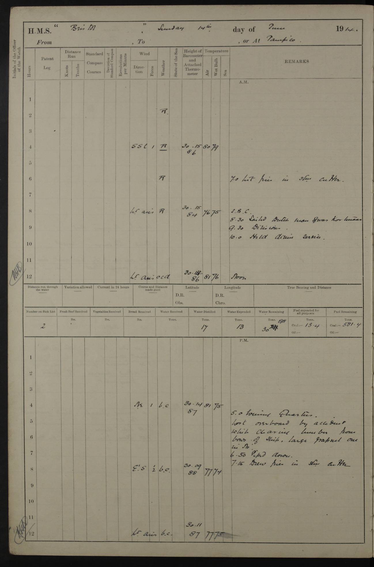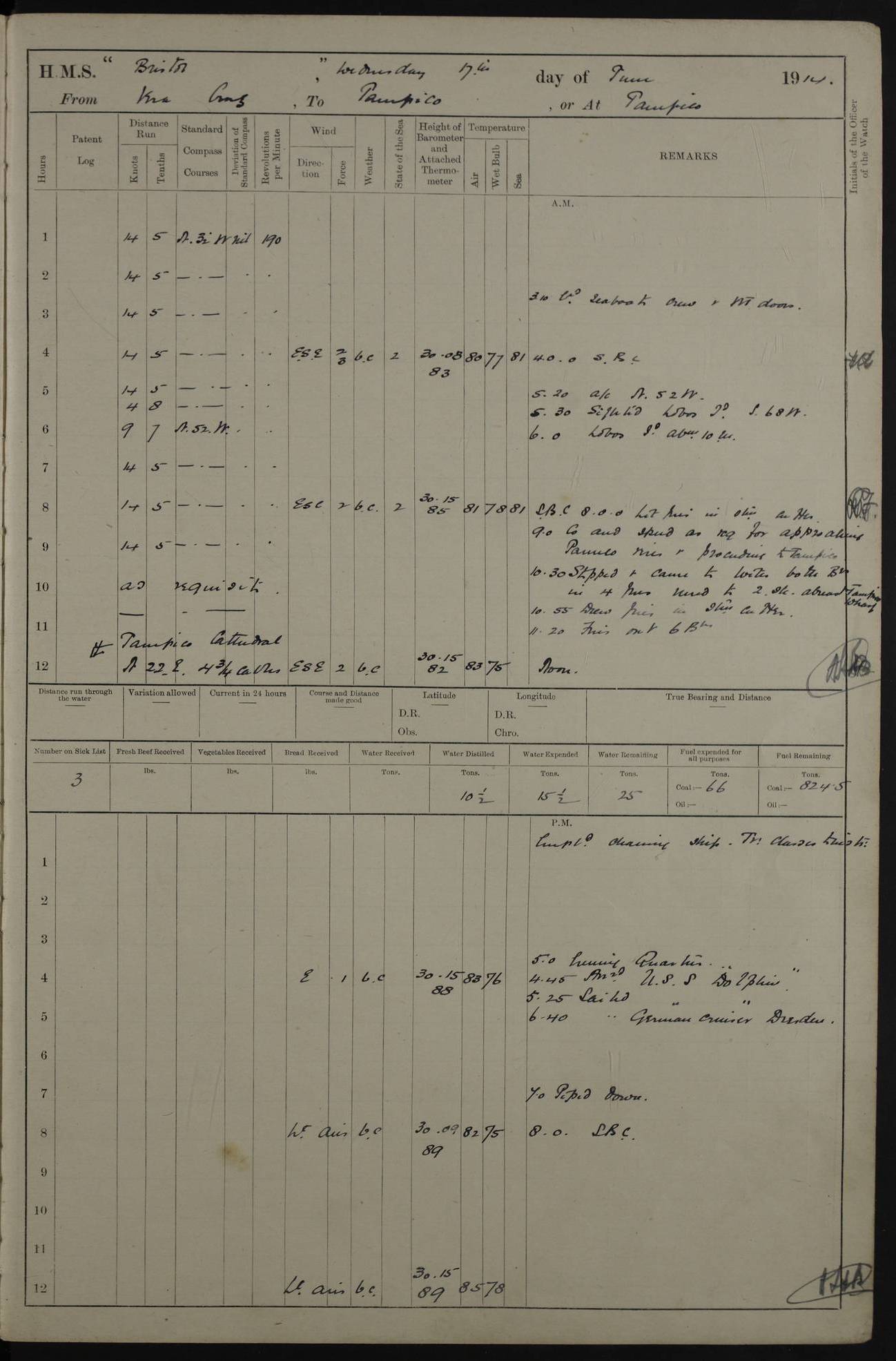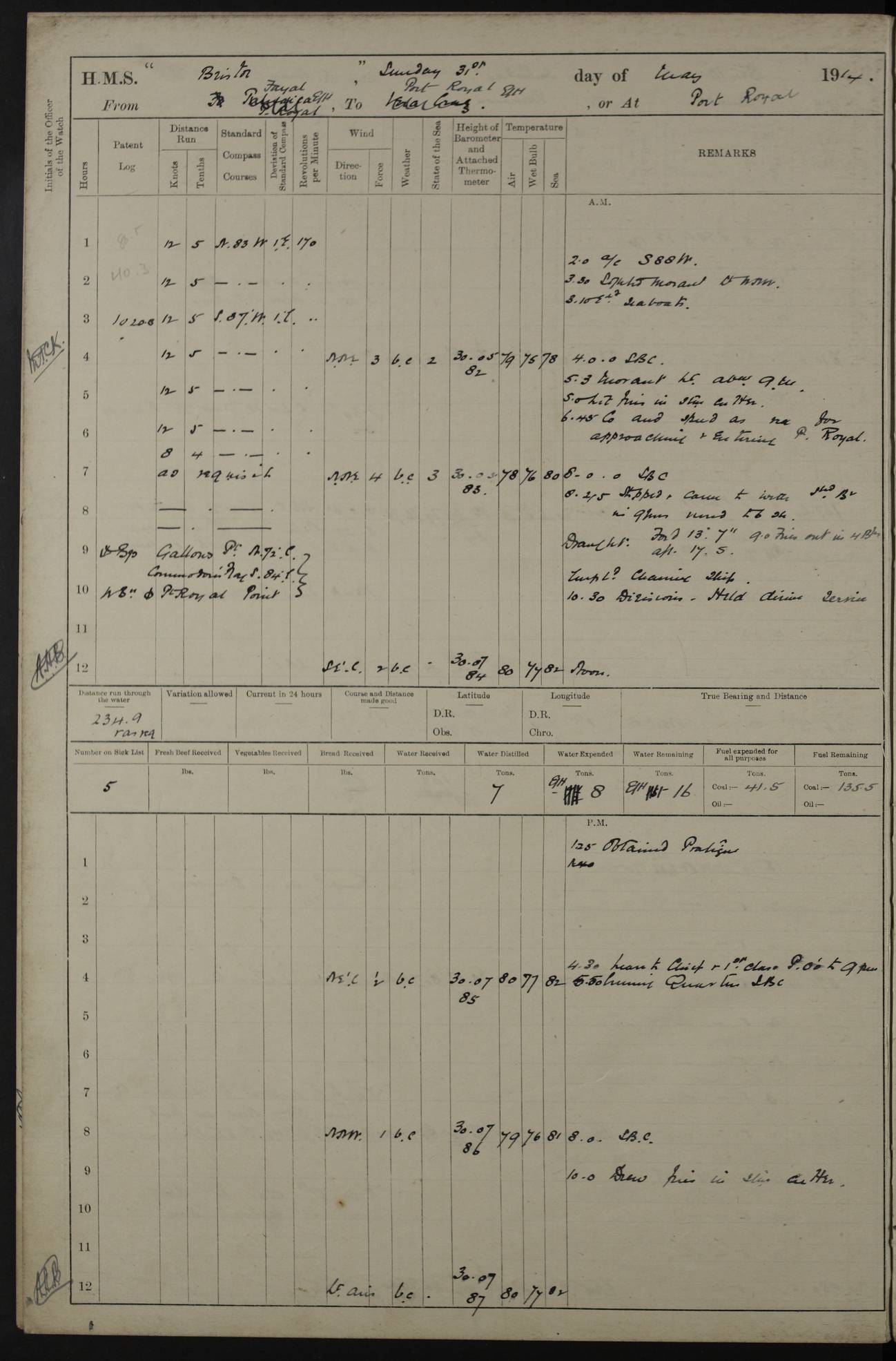 LOGS FOR AUGUST 1914 4caf8494cadfd34197008827: (http://oldweather.s3.amazonaws.com/ADM53-69477/ADM53-69477-028_1.jpg) 1 August 1914 At sea Lat 22.31, Long -87.03 2.00am: Put clocks on 15 minutes. 2.15am: Sighted Perez Island Light: N15E. 5.00am: Put clocks on 15 min (clocks set 5 hours W of GMT). Position at 8.00am: Lat 22.26, Long -89.30. 1.40pm: Sounded in 30 fathoms. 1.49pm: Sounded in 44 fathoms. Paid monthly money. Position at 8.00pm: Lat 21.03, Long -84.63. 10.00pm: Put clocks on 15 minutes. 11.00pm: Lost overboard by accident one log line and rotator. 16 on sick list. 4caf8494cadfd34197008828: (http://oldweather.s3.amazonaws.com/ADM53-69477/ADM53-69477-029_0.jpg) 2 August 1914 From Vera Cruz to Jamaica Lat 19.08, Long -79.91 2.00am: Put clocks on 15 minutes. 5.00am: Put clocks on 15 minutes. 5.30am: Returned cordite. Position at 8.00am: Lat 19.71, Long -81.03. 5.03pm: S. Negril Point: N38E. 10.40pm: Plum Point Light: N25E. Course and speed as requisite for entrence Port Royal Harbour and proceeding alongside coaling wharf. 18 on sick list. 4caf8494cadfd34197008829: (http://oldweather.s3.amazonaws.com/ADM53-69477/ADM53-69477-029_1.jpg) 3 August 1914 Port Royal and at sea Lat 17.95, Long -76.86 12.45am: Secured alonside coaling wharf. 1.30am: Commenced coaling. am: Hands employed landing all spare gear to Port Royal store, and preparing ship for war. 12.15pm: Finished coaling. Received onboard 580 tons. 5.00pm: Lost overboard by accident Pistol key's cartridges boxes one in No. 6.10pm: Slipped and proceeded as requisite for leaving Port-Royal by North Channel. 8.20pm: Plum Point Light: N53W 1 1/2 mile. 9.10pm: Cape Morant Light: N52E. 10.38pm: Cape Morant: abeam 5'. 20 on sick list. 4caf8494cadfd3419700882a: (http://oldweather.s3.amazonaws.com/ADM53-69477/ADM53-69477-030_0.jpg) 4 August 1914 At sea Lat 19.51, Long -74.0 5.15am: Put clocks on 15 minutes. Position at 8.00am: Lat 18.91, Long -74.60. 1.25pm: Altered course N86E to examine Mole of St Nicholas Harbour Haiti. Position at 8.00pm: Lat 27.13, Long -72.41. 17 on sick list. 4caf8494cadfd3419700882b: (http://oldweather.s3.amazonaws.com/ADM53-69477/ADM53-69477-030_1.jpg) 5 August 1914 At sea Lat 25.05, Long -72.25 Position at 8.00am: Lat 23.95, Long -72.21. 4.35pm: Altered course to Eastward to close steamer. 4.47pm: Returned course N10W. 17 on sick list. 4caf8494cadfd3419700882c: (http://oldweather.s3.amazonaws.com/ADM53-69477/ADM53-69477-031_0.jpg) 6 August 1914 At sea Lat 31.50, Long -73.0 6.30am: Put clocks back 10 minutes. Position at 8.00am: Lat 30.55, Long -73.25. 11.00am: Course and speed as requisite for firing at target. 1.00pm: Altered course S3W. 2.20pm: Altered course S9W. Thrown overboard preparing for immediate action: Mats cocon fibre gymnasium Pattern 28 seven in No. Part Parallel bars detachable Pattern 66 Belts life cork tanned Pattern 301 three in No. Bench carpenter Pattern 1056 one in No. Tables mess two in No. Stools mess two in No. 5.20pm: Sighted steamer on Starboard bow and altered course towards her. 5.25pm: Resumed course. 8.10pm: Sighted Karlsruhe: 4 points on Port Bow Altered course to Eastward as requisite for chasing and engaging her. 9.10pm: Shaped course SE - Chasing Karlsruhe. 11.00pm: Lost sight of Karlsruhe. 16 on sick list. S.M.S. Karlsruhe was a German light cruiser. Her speed allowed her to escape and than to roam the Caribbean and off the Northern coasts of Brazil where she heavily disturbed British trade routes. On 4 November 1914 an internal explosion blew up her fore part. The aft part stayed afloat to allow the survivors to be picked up by colliers accompanying her. The Royal Navy did not know this until March 1915. 4caf8494cadfd3419700882d: (http://oldweather.s3.amazonaws.com/ADM53-69477/ADM53-69477-031_1.jpg) 7 August 1914 At sea Lat 26.26, Long -68.55 10.07am: Altered course to close steamer Miami. Result DR. N54E 4 miles. 10.23am: Resumed course. Position at 8.00pm: Lat 24.96, Long -67.18. Lost overboard by accident lifebuoy one in No. 11 on sick list. 4caf8494cadfd3419700882e: (http://oldweather.s3.amazonaws.com/ADM53-69477/ADM53-69477-032_0.jpg) 8 August 1914 At sea Lat 22.38, Long -65.53 5.20am: Put clocks on 15 minutes. Position at 8.00am: Lat 23.01, Long -65.01. 9.50am: Course and speed as requisite for firing Port battery. Position at 8.00pm: Lat 20.98, Long -64.71. 11.00pm: Put clocks on 5 minutes. 13 on sick list. 4caf8494cadfd3419700882f: (http://oldweather.s3.amazonaws.com/ADM53-69477/ADM53-69477-032_1.jpg) 9 August 1914 At sea Lat 18.08, Long -63.40 2.00am: Put clocks on 10 minutes. 8.40am: Sighted Sombrero Light House: S65E. 9.40am: Sombrero Light House: abeam 11 miles. 1.50pm: Altered course as requisite to S.E to close S.S. Condor. 2.10pm: Stopped. 2.20pm: Proceeded S24 E. 170 Revs. Position at 8.00pm: Lat 16.66, Long -62.55. 11.0pm: Put clocks on 5 minutes. 4caf8494cadfd34197008830: (http://oldweather.s3.amazonaws.com/ADM53-69477/ADM53-69477-033_0.jpg) 10 August 1914 At sea to St Lucia (Port Castries) and at sea Lat 14.0, Long -61.0 2.00am: Put clocks on 10 minutes. 7.15am: Sighted St Lucia: ahead. Position at 8.00am: Lat 14.55, Long -61.26. 8.50am: Diamond Rock: abeam 9 miles. 10.30am: Course and speed as requisite for connecting bridge steering gear and approaching and entering Port Castries Harbour. Navigational marks removed. 11.45am: Made fast alongside coal wharf Port Castries. 12.05pm: Commenced coaling (native labour). 10.30pm: Finished coaling. Received 1050 tons. 11.00pm: Slipped and proceeded out of harbour. 11.20pm: Course and speed as requisite for patrolling North coast of St. Lucia at 90 Revs. 16 on sick list. 4caf8494cadfd34197008831: (http://oldweather.s3.amazonaws.com/ADM53-69477/ADM53-69477-033_1.jpg) 11 August 1914 At sea off St Lucia Lat 14.0, Long -61.0 3.15am: Heavy rain squall. 5.30am: Tampion Rock Light: S60E 2.3 miles. 5.40am: Closed Port Castries entrance. 6.00am: Stopped and came to with Port Bower in 14 fathoms veered to 2 1/2 shackles. 6