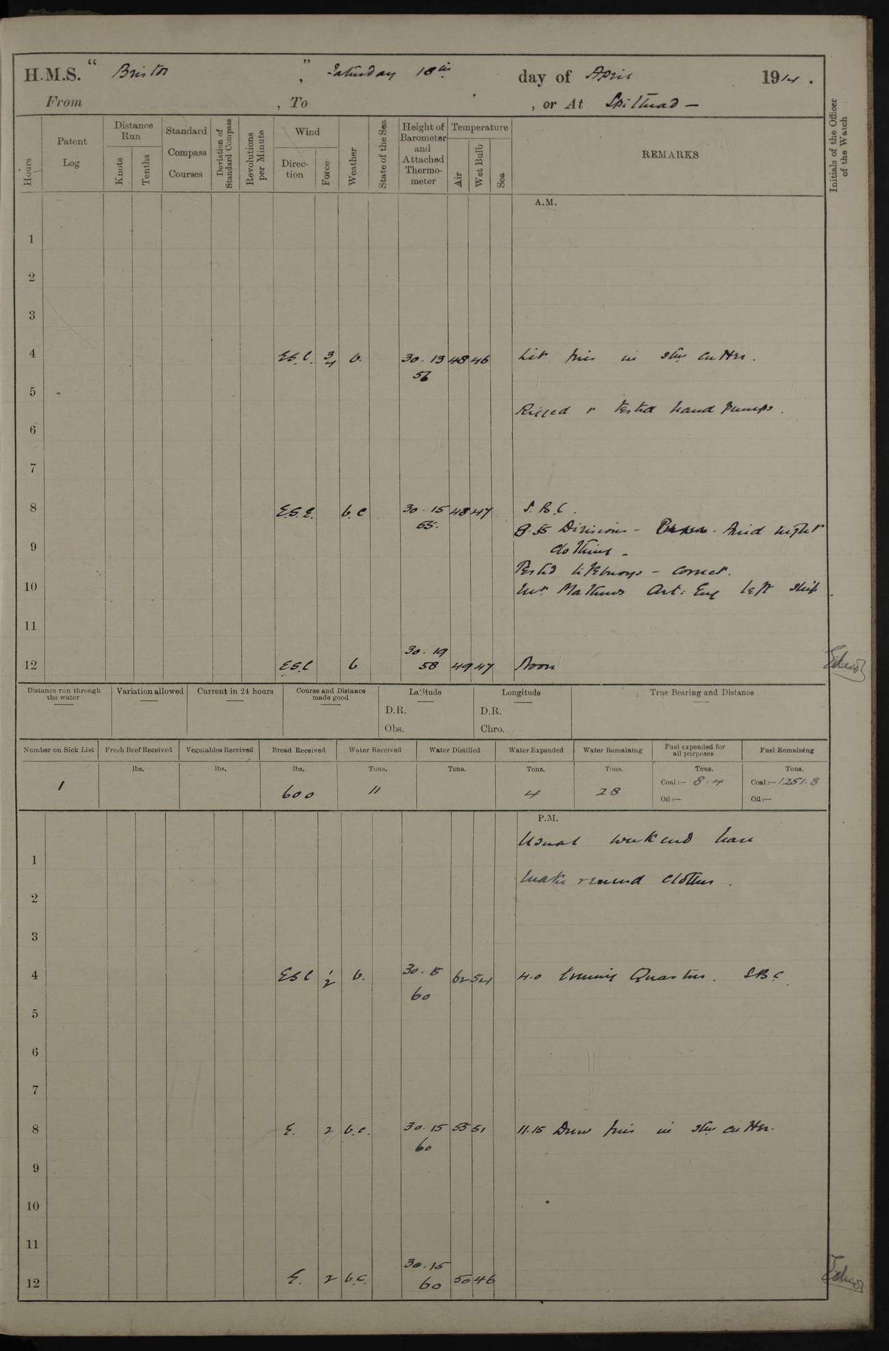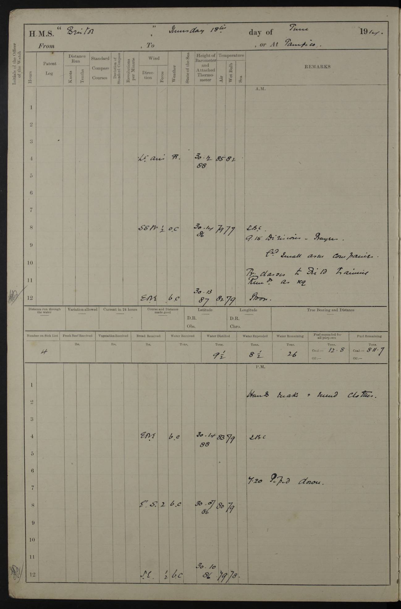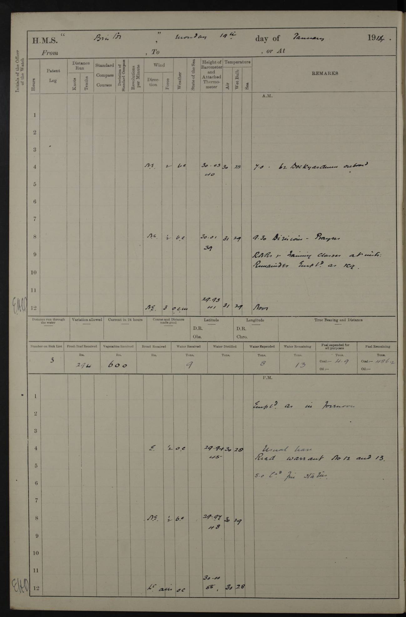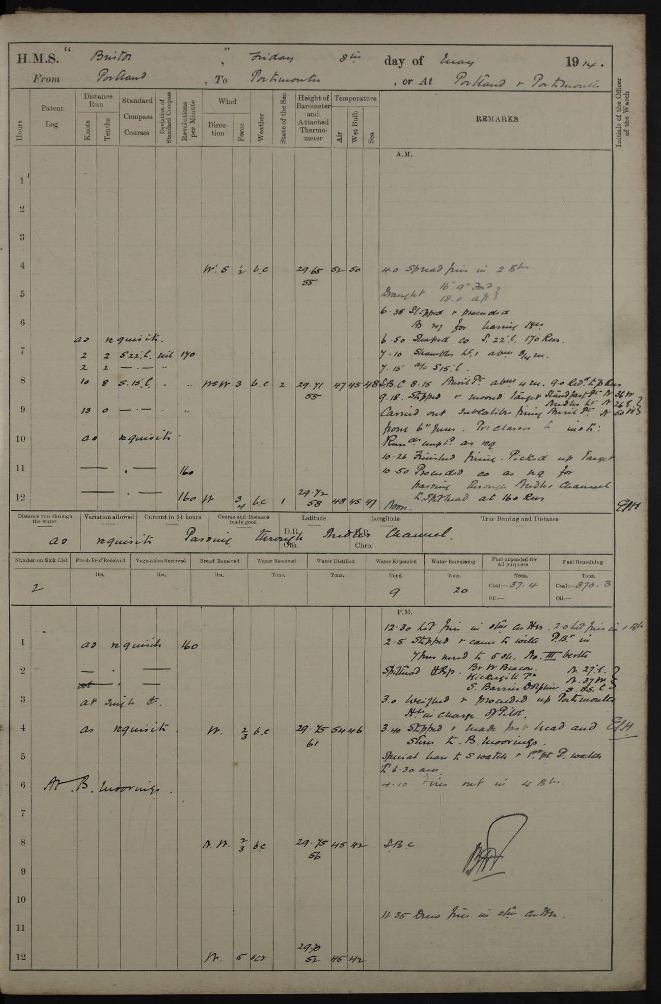 LOGS FOR AUGUST 1914 4caf8494cadfd34197008827: (http://oldweather.s3.amazonaws.com/ADM53-69477/ADM53-69477-028_1.jpg) 1 August 1914 At sea Lat 22.31, Long -87.03 2.00am: Put clocks on 15 minutes. 2.15am: Sighted Perez Island Light: N15E. 5.00am: Put clocks on 15 min (clocks set 5 hours W of GMT). Position at 8.00am: Lat 22.26, Long -89.30. 1.40pm: Sounded in 30 fathoms. 1.49pm: Sounded in 44 fathoms. Paid monthly money. Position at 8.00pm: Lat 21.03, Long -84.63. 10.00pm: Put clocks on 15 minutes. 11.00pm: Lost overboard by accident one log line and rotator. 16 on sick list. 4caf8494cadfd34197008828: (http://oldweather.s3.amazonaws.com/ADM53-69477/ADM53-69477-029_0.jpg) 2 August 1914 From Vera Cruz to Jamaica Lat 19.08, Long -79.91 2.00am: Put clocks on 15 minutes. 5.00am: Put clocks on 15 minutes. 5.30am: Returned cordite. Position at 8.00am: Lat 19.71, Long -81.03. 5.03pm: S. Negril Point: N38E. 10.40pm: Plum Point Light: N25E. Course and speed as requisite for entrence Port Royal Harbour and proceeding alongside coaling wharf. 18 on sick list. 4caf8494cadfd34197008829: (http://oldweather.s3.amazonaws.com/ADM53-69477/ADM53-69477-029_1.jpg) 3 August 1914 Port Royal and at sea Lat 17.95, Long -76.86 12.45am: Secured alonside coaling wharf. 1.30am: Commenced coaling. am: Hands employed landing all spare gear to Port Royal store, and preparing ship for war. 12.15pm: Finished coaling. Received onboard 580 tons. 5.00pm: Lost overboard by accident Pistol key's cartridges boxes one in No. 6.10pm: Slipped and proceeded as requisite for leaving Port-Royal by North Channel. 8.20pm: Plum Point Light: N53W 1 1/2 mile. 9.10pm: Cape Morant Light: N52E. 10.38pm: Cape Morant: abeam 5'. 20 on sick list. 4caf8494cadfd3419700882a: (http://oldweather.s3.amazonaws.com/ADM53-69477/ADM53-69477-030_0.jpg) 4 August 1914 At sea Lat 19.51, Long -74.0 5.15am: Put clocks on 15 minutes. Position at 8.00am: Lat 18.91, Long -74.60. 1.25pm: Altered course N86E to examine Mole of St Nicholas Harbour Haiti. Position at 8.00pm: Lat 27.13, Long -72.41. 17 on sick list. 4caf8494cadfd3419700882b: (http://oldweather.s3.amazonaws.com/ADM53-69477/ADM53-69477-030_1.jpg) 5 August 1914 At sea Lat 25.05, Long -72.25 Position at 8.00am: Lat 23.95, Long -72.21. 4.35pm: Altered course to Eastward to close steamer. 4.47pm: Returned course N10W. 17 on sick list. 4caf8494cadfd3419700882c: (http://oldweather.s3.amazonaws.com/ADM53-69477/ADM53-69477-031_0.jpg) 6 August 1914 At sea Lat 31.50, Long -73.0 6.30am: Put clocks back 10 minutes. Position at 8.00am: Lat 30.55, Long -73.25. 11.00am: Course and speed as requisite for firing at target. 1.00pm: Altered course S3W. 2.20pm: Altered course S9W. Thrown overboard preparing for immediate action: Mats cocon fibre gymnasium Pattern 28 seven in No. Part Parallel bars detachable Pattern 66 Belts life cork tanned Pattern 301 three in No. Bench carpenter Pattern 1056 one in No. Tables mess two in No. Stools mess two in No. 5.20pm: Sighted steamer on Starboard bow and altered course towards her. 5.25pm: Resumed course. 8.10pm: Sighted Karlsruhe: 4 points on Port Bow Altered course to Eastward as requisite for chasing and engaging her. 9.10pm: Shaped course SE - Chasing Karlsruhe. 11.00pm: Lost sight of Karlsruhe. 16 on sick list. S.M.S. Karlsruhe was a German light cruiser. Her speed allowed her to escape and than to roam the Caribbean and off the Northern coasts of Brazil where she heavily disturbed British trade routes. On 4 November 1914 an internal explosion blew up her fore part. The aft part stayed afloat to allow the survivors to be picked up by colliers accompanying her. The Royal Navy did not know this until March 1915. 4caf8494cadfd3419700882d: (http://oldweather.s3.amazonaws.com/ADM53-69477/ADM53-69477-031_1.jpg) 7 August 1914 At sea Lat 26.26, Long -68.55 10.07am: Altered course to close steamer Miami. Result DR. N54E 4 miles. 10.23am: Resumed course. Position at 8.00pm: Lat 24.96, Long -67.18. Lost overboard by accident lifebuoy one in No. 11 on sick list. 4caf8494cadfd3419700882e: (http://oldweather.s3.amazonaws.com/ADM53-69477/ADM53-69477-032_0.jpg) 8 August 1914 At sea Lat 22.38, Long -65.53 5.20am: Put clocks on 15 minutes. Position at 8.00am: Lat 23.01, Long -65.01. 9.50am: Course and speed as requisite for firing Port battery. Position at 8.00pm: Lat 20.98, Long -64.71. 11.00pm: Put clocks on 5 minutes. 13 on sick list. 4caf8494cadfd3419700882f: (http://oldweather.s3.amazonaws.com/ADM53-69477/ADM53-69477-032_1.jpg) 9 August 1914 At sea Lat 18.08, Long -63.40 2.00am: Put clocks on 10 minutes. 8.40am: Sighted Sombrero Light House: S65E. 9.40am: Sombrero Light House: abeam 11 miles. 1.50pm: Altered course as requisite to S.E to close S.S. Condor. 2.10pm: Stopped. 2.20pm: Proceeded S24 E. 170 Revs. Position at 8.00pm: Lat 16.66, Long -62.55. 11.0pm: Put clocks on 5 minutes. 4caf8494cadfd34197008830: (http://oldweather.s3.amazonaws.com/ADM53-69477/ADM53-69477-033_0.jpg) 10 August 1914 At sea to St Lucia (Port Castries) and at sea Lat 14.0, Long -61.0 2.00am: Put clocks on 10 minutes. 7.15am: Sighted St Lucia: ahead. Position at 8.00am: Lat 14.55, Long -61.26. 8.50am: Diamond Rock: abeam 9 miles. 10.30am: Course and speed as requisite for connecting bridge steering gear and approaching and entering Port Castries Harbour. Navigational marks removed. 11.45am: Made fast alongside coal wharf Port Castries. 12.05pm: Commenced coaling (native labour). 10.30pm: Finished coaling. Received 1050 tons. 11.00pm: Slipped and proceeded out of harbour. 11.20pm: Course and speed as requisite for patrolling North coast of St. Lucia at 90 Revs. 16 on sick list. 4caf8494cadfd34197008831: (http://oldweather.s3.amazonaws.com/ADM53-69477/ADM53-69477-033_1.jpg) 11 August 1914 At sea off St Lucia Lat 14.0, Long -61.0 3.15am: Heavy rain squall. 5.30am: Tampion Rock Light: S60E 2.3 miles. 5.40am: Closed Port Castries entrance. 6.00am: Stopped and came to with Port Bower in 14 fathoms veered to 2 1/2 shackles. 6