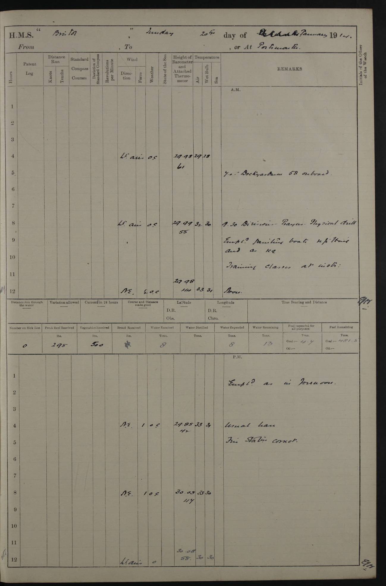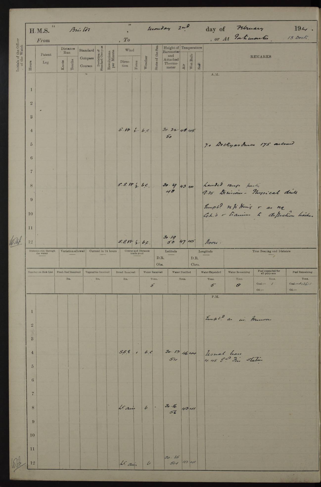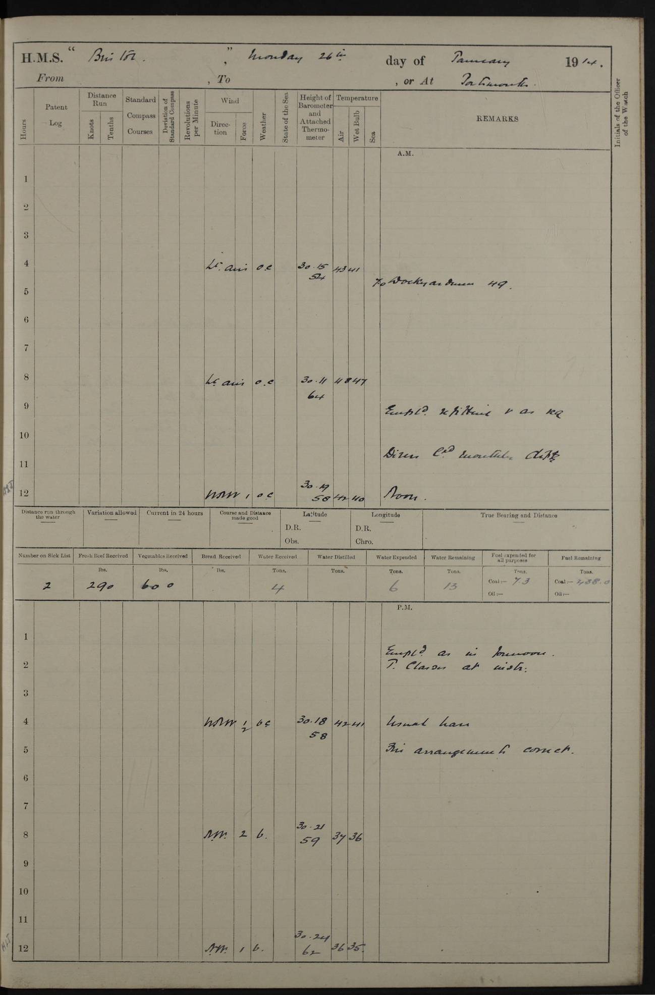 LOGS FOR JANUARY 1918 4caf848fcadfd3419700858e: (http://oldweather.s3.amazonaws.com/ADM53-36152/ADM 53-36152-001_0.jpg) 4caf848fcadfd3419700858f: (http://oldweather.s3.amazonaws.com/ADM53-36152/ADM 53-36152-001_1.jpg) 4caf848fcadfd34197008590: (http://oldweather.s3.amazonaws.com/ADM53-36152/ADM 53-36152-002_0.jpg) 4caf848fcadfd34197008591: (http://oldweather.s3.amazonaws.com/ADM53-36152/ADM 53-36152-002_1.jpg) 4caf848fcadfd34197008592: (http://oldweather.s3.amazonaws.com/ADM53-36152/ADM 53-36152-003_0.jpg) 4caf848fcadfd34197008593: (http://oldweather.s3.amazonaws.com/ADM53-36152/ADM 53-36152-003_1.jpg) 1 January 1918 Kalloni, Lesbos Lat 39.25, Long 26.25 8.00am: Landed working parties. Remainder as requisite. 5.00pm: Working parties returned. 3 on sick list. 4caf848fcadfd34197008594: (http://oldweather.s3.amazonaws.com/ADM53-36152/ADM 53-36152-004_0.jpg) 2 January 1918 Kalloni Lat 39.25, Long 26.25 9.50am: One quarter of beef lost overboard. 3.15pm: Discharged 1 rating T.S. 3 on sick list. 4caf848fcadfd34197008595: (http://oldweather.s3.amazonaws.com/ADM53-36152/ADM 53-36152-004_1.jpg) 3 January 1918 Kalloni Lat 39.25, Long 26.25 8.00am: Landed telephone working party. Rigged diving boat. 10.00am: Divers searching for lost beef. 11.40am: 1 Prisoner from Sentinel joined for cell punishment. 3.00pm: Telephone working party returned. 6.30pm: Discharged 1 Able Seaman to PB01. 5 on sick list. 4caf848fcadfd34197008596: (http://oldweather.s3.amazonaws.com/ADM53-36152/ADM 53-36152-005_0.jpg) 4 January 1918 Kalloni Lat 39.25, Long 26.25 8.00am: Landed shore working parties, sent coaling party to collier. 6 ratings joined ship. 4.00pm: Working parties returned onboard. 6 on sick list. 4caf848fcadfd34197008597: (http://oldweather.s3.amazonaws.com/ADM53-36152/ADM 53-36152-005_1.jpg) 5 January 1918 Kalloni Lat 39.25, Long 26.25 2.30pm: Welland arrived. 6 on sick list. 4caf848fcadfd34197008598: (http://oldweather.s3.amazonaws.com/ADM53-36152/ADM 53-36152-006_0.jpg) 6 January 1918 Kalloni Lat 39.25, Long 26.25 8.40am: Oiler Kharki secured alongside. 9.30am: Held Court of Inquiry. 11.30am: Paid monthly money. 2.00pm: Landed football parties. 7 on sick list. 4caf848fcadfd34197008599: (http://oldweather.s3.amazonaws.com/ADM53-36152/ADM 53-36152-006_1.jpg) 7 January 1918 Kalloni Lat 39.25, Long 26.25 8.00am: Landed working parties. Coaling party to collier, sent divers to Cast Bay. Remainder as requisite. 10.30am: H.M.M 334 Abercrombie arrived. Noon: Coaling party returned. 5.00pm: Working parties returned. 7.00pm: 2 Ratings joined ship from T1043. 7 on sick list. 4caf848fcadfd3419700859a: (http://oldweather.s3.amazonaws.com/ADM53-36152/ADM 53-36152-007_0.jpg) 8 January 1918 Kalloni Lat 39.25, Long 26.25 8.00am: Landed working parties. 4 Ratings from Abercrombie joined ship. G21 arrived 11.30am: H.M.M 334 Abercrombie left. 3.00pm: Discharged 18 Ratings to Mudros. Working parties returned. Sent all small craft and boats to Cast Bay for shelter (Strong winds were coming up with force up to 8 Beaufort which lasted for 2 days) 5 on sick list. 4caf848fcadfd3419700859b: (http://oldweather.s3.amazonaws.com/ADM53-36152/ADM 53-36152-007_1.jpg) 9 January 1918 Kalloni Lat 39.25, Long 26.25 9 on sick list. 4caf848fcadfd3419700859c: (http://oldweather.s3.amazonaws.com/ADM53-36152/ADM 53-36152-008_0.jpg) 10 January 1918 Kalloni Lat 39.25, Long 26.25 2.30pm: All boats and small craft returned to anchorage. 4.00pm: Landed watch and torpedo party. 6.00pm: Watch returned on board. 4caf848fcadfd3419700859d: (http://oldweather.s3.amazonaws.com/ADM53-36152/ADM 53-36152-008_1.jpg) 11 January 1918 Kalloni Lat 39.25, Long 26.25 8.00am: Landed working parties. Remainder as requisite. 10.00am: Discharged 2 Ratings to Welland. 11.30am: Working parties returned onboard. 8 Ratings joined from Naval Camp. 1.00pm: Turning over duties of S.N.O fourth detached Squadron to Sentinel. 4.00pm: Discharged all supernumaries to Sentinel. 7 on sick list. 4caf848fcadfd3419700859e: (http://oldweather.s3.amazonaws.com/ADM53-36152/ADM 53-36152-009_0.jpg) 12 January 1918 Port Kalloni to Mudros Lat 39.25, Long 26.25 9.45am: Unmoored and prepared for sea. Weighed Port Bower. Tested Mess Deck rattlers. 11.05am: Weighed foul anchor. 11.12am: Cleared ditto and proceeded as required turning. 11.55am: As requisite passing Arogas narrows. 4.15pm: Came to S.W. 5 shackles on B3 9 fathoms 4.35pm: Discharged 8 ratings to Europa. 6.00pm: Collier Alexander secured alongside. 6.15pm: Kharki secured alongside. 7.30pm: Commenced coaling. 10.30pm: Finished coaling. Oiling ship. Midnight. Piped down, finished oiling 3 on sick list. 4caf848fcadfd3419700859f: (http://oldweather.s3.amazonaws.com/ADM53-36152/ADM 53-36152-009_1.jpg) 13 January 1918 Mudros and at sea towards Gibraltar Lat 39.89, Long 25.24 7.40am: Kharki cast off. 8.30am: Collier cast off. 9.30am: Hands cleaning ship and preparing for sea. Discharged 1 Rating to Europa ,1 joined. 12.16pm: Weighed and proceeded. 12.30pm: Altered course S26E. Passed Inner gate. 12.42pm: Kombi Light: abeam. 1.30pm: Commenced zig-zagging. 6.30pm: Stopped zig-zagging. 8.43pm: Altered course S10W passing through Doro Channel. 8.30pm: Altered course S28W passing through Fermia Channel. 3 on sick list. 4caf848fcadfd341970085a0: (http://oldweather.s3.amazonaws.com/ADM53-36152/ADM 53-36152-010_0.jpg) 14 January 1918 At sea Lat 36.41, Long 21.08 5.00am: Anti Kithera: N66E. 6.30am: Put clocks back 30 minutes. 6.15am: Commenced zig-zagging. 9.45am: Cape Matapan: N80E. 6.30pm: Stopped zig-zagging. 4 on sick list. 4caf848fcadfd341970085a1: (http://oldweather.s3.amazonaws.com/ADM53-36152/ADM 53-36152-010_1.jpg) 15 January 1918 At sea Lat 36.01, Long 13.69 6.20am: Put clocks back 30 min. 8.41am: Delemara Light: N18W. 8.50am: Altered course N70W. Passed 2 Convoys. 4.47pm: Pantellaria Island: N68W. 7.34pm: Cape Bon: N89W. 9.10pm: Cape Bon: S32W. 3 on sick list. 4caf848fcadfd341970085a2: (http://oldweather.s3.amazonaws.com/ADM53-36152/ADM 53-361