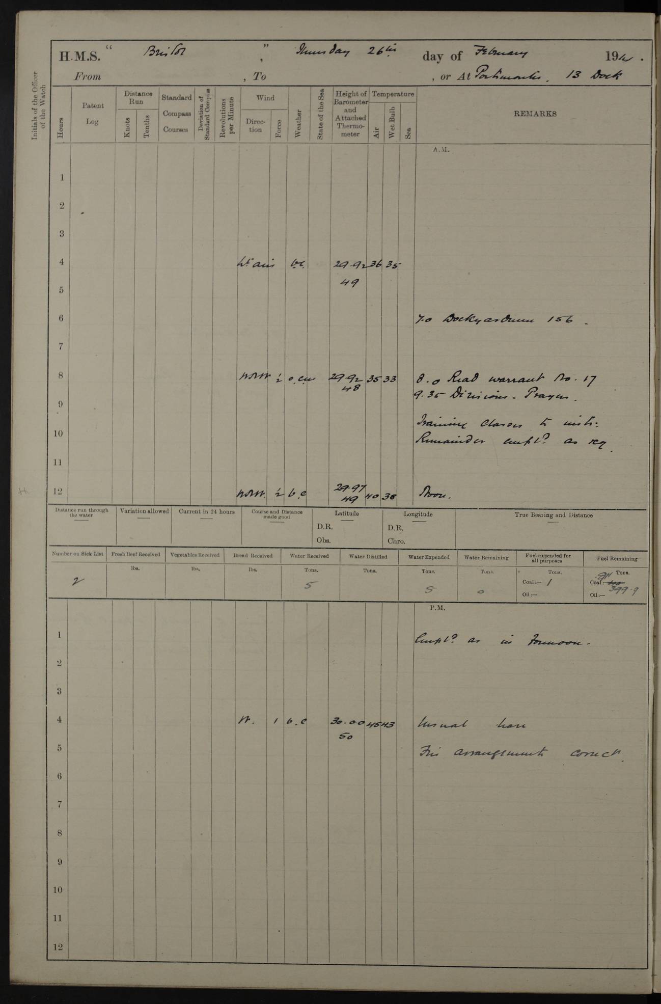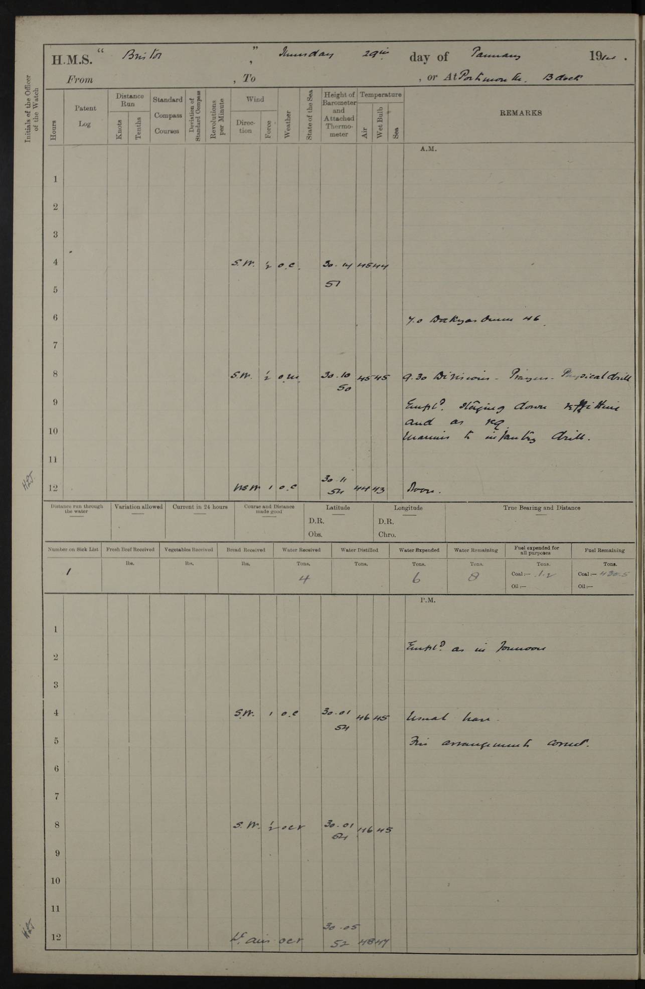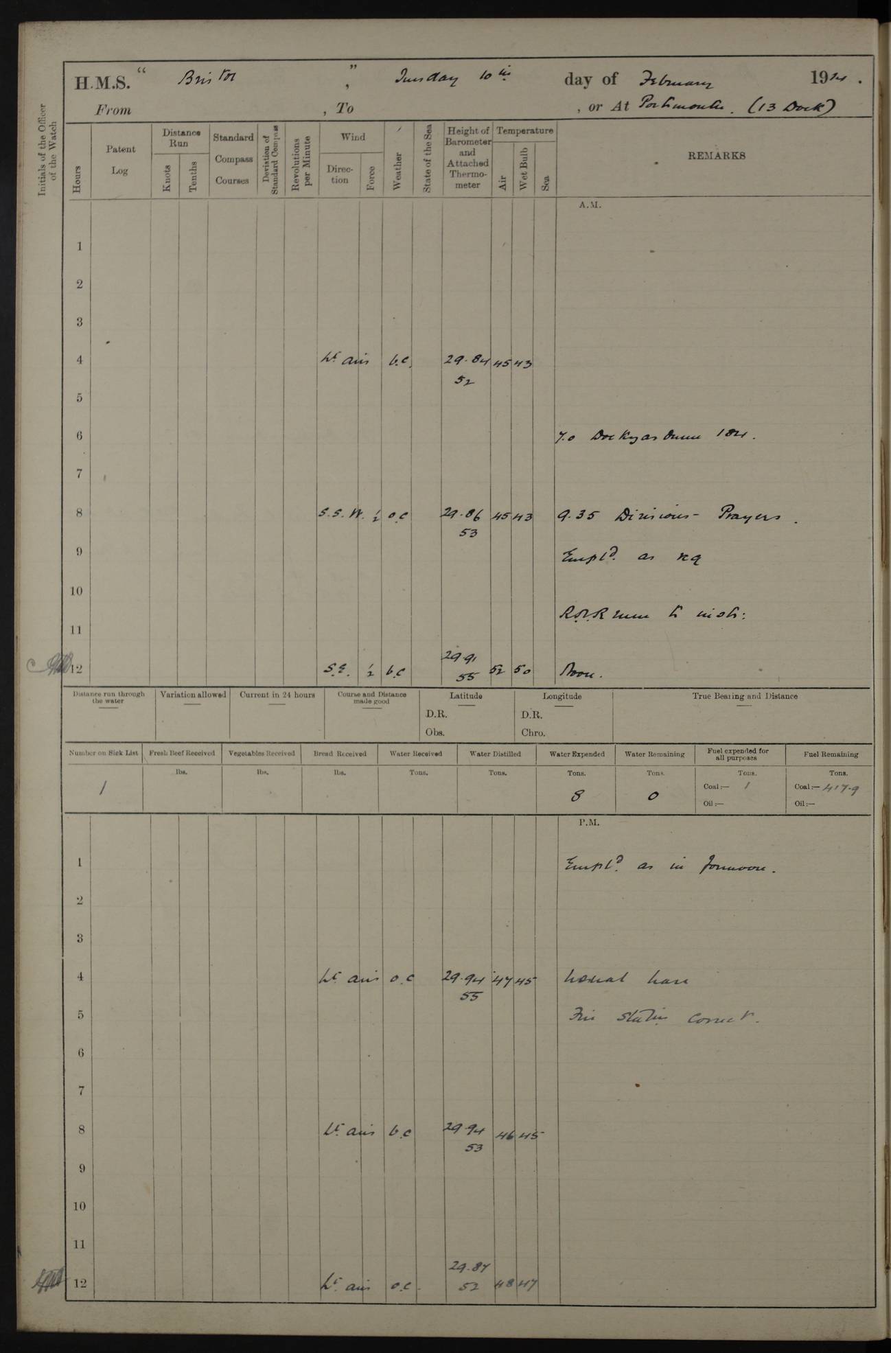 LOGS FOR JANUARY 1918 4caf848fcadfd3419700858e: (http://oldweather.s3.amazonaws.com/ADM53-36152/ADM 53-36152-001_0.jpg) 4caf848fcadfd3419700858f: (http://oldweather.s3.amazonaws.com/ADM53-36152/ADM 53-36152-001_1.jpg) 4caf848fcadfd34197008590: (http://oldweather.s3.amazonaws.com/ADM53-36152/ADM 53-36152-002_0.jpg) 4caf848fcadfd34197008591: (http://oldweather.s3.amazonaws.com/ADM53-36152/ADM 53-36152-002_1.jpg) 4caf848fcadfd34197008592: (http://oldweather.s3.amazonaws.com/ADM53-36152/ADM 53-36152-003_0.jpg) 4caf848fcadfd34197008593: (http://oldweather.s3.amazonaws.com/ADM53-36152/ADM 53-36152-003_1.jpg) 1 January 1918 Kalloni, Lesbos Lat 39.25, Long 26.25 8.00am: Landed working parties. Remainder as requisite. 5.00pm: Working parties returned. 3 on sick list. 4caf848fcadfd34197008594: (http://oldweather.s3.amazonaws.com/ADM53-36152/ADM 53-36152-004_0.jpg) 2 January 1918 Kalloni Lat 39.25, Long 26.25 9.50am: One quarter of beef lost overboard. 3.15pm: Discharged 1 rating T.S. 3 on sick list. 4caf848fcadfd34197008595: (http://oldweather.s3.amazonaws.com/ADM53-36152/ADM 53-36152-004_1.jpg) 3 January 1918 Kalloni Lat 39.25, Long 26.25 8.00am: Landed telephone working party. Rigged diving boat. 10.00am: Divers searching for lost beef. 11.40am: 1 Prisoner from Sentinel joined for cell punishment. 3.00pm: Telephone working party returned. 6.30pm: Discharged 1 Able Seaman to PB01. 5 on sick list. 4caf848fcadfd34197008596: (http://oldweather.s3.amazonaws.com/ADM53-36152/ADM 53-36152-005_0.jpg) 4 January 1918 Kalloni Lat 39.25, Long 26.25 8.00am: Landed shore working parties, sent coaling party to collier. 6 ratings joined ship. 4.00pm: Working parties returned onboard. 6 on sick list. 4caf848fcadfd34197008597: (http://oldweather.s3.amazonaws.com/ADM53-36152/ADM 53-36152-005_1.jpg) 5 January 1918 Kalloni Lat 39.25, Long 26.25 2.30pm: Welland arrived. 6 on sick list. 4caf848fcadfd34197008598: (http://oldweather.s3.amazonaws.com/ADM53-36152/ADM 53-36152-006_0.jpg) 6 January 1918 Kalloni Lat 39.25, Long 26.25 8.40am: Oiler Kharki secured alongside. 9.30am: Held Court of Inquiry. 11.30am: Paid monthly money. 2.00pm: Landed football parties. 7 on sick list. 4caf848fcadfd34197008599: (http://oldweather.s3.amazonaws.com/ADM53-36152/ADM 53-36152-006_1.jpg) 7 January 1918 Kalloni Lat 39.25, Long 26.25 8.00am: Landed working parties. Coaling party to collier, sent divers to Cast Bay. Remainder as requisite. 10.30am: H.M.M 334 Abercrombie arrived. Noon: Coaling party returned. 5.00pm: Working parties returned. 7.00pm: 2 Ratings joined ship from T1043. 7 on sick list. 4caf848fcadfd3419700859a: (http://oldweather.s3.amazonaws.com/ADM53-36152/ADM 53-36152-007_0.jpg) 8 January 1918 Kalloni Lat 39.25, Long 26.25 8.00am: Landed working parties. 4 Ratings from Abercrombie joined ship. G21 arrived 11.30am: H.M.M 334 Abercrombie left. 3.00pm: Discharged 18 Ratings to Mudros. Working parties returned. Sent all small craft and boats to Cast Bay for shelter (Strong winds were coming up with force up to 8 Beaufort which lasted for 2 days) 5 on sick list. 4caf848fcadfd3419700859b: (http://oldweather.s3.amazonaws.com/ADM53-36152/ADM 53-36152-007_1.jpg) 9 January 1918 Kalloni Lat 39.25, Long 26.25 9 on sick list. 4caf848fcadfd3419700859c: (http://oldweather.s3.amazonaws.com/ADM53-36152/ADM 53-36152-008_0.jpg) 10 January 1918 Kalloni Lat 39.25, Long 26.25 2.30pm: All boats and small craft returned to anchorage. 4.00pm: Landed watch and torpedo party. 6.00pm: Watch returned on board. 4caf848fcadfd3419700859d: (http://oldweather.s3.amazonaws.com/ADM53-36152/ADM 53-36152-008_1.jpg) 11 January 1918 Kalloni Lat 39.25, Long 26.25 8.00am: Landed working parties. Remainder as requisite. 10.00am: Discharged 2 Ratings to Welland. 11.30am: Working parties returned onboard. 8 Ratings joined from Naval Camp. 1.00pm: Turning over duties of S.N.O fourth detached Squadron to Sentinel. 4.00pm: Discharged all supernumaries to Sentinel. 7 on sick list. 4caf848fcadfd3419700859e: (http://oldweather.s3.amazonaws.com/ADM53-36152/ADM 53-36152-009_0.jpg) 12 January 1918 Port Kalloni to Mudros Lat 39.25, Long 26.25 9.45am: Unmoored and prepared for sea. Weighed Port Bower. Tested Mess Deck rattlers. 11.05am: Weighed foul anchor. 11.12am: Cleared ditto and proceeded as required turning. 11.55am: As requisite passing Arogas narrows. 4.15pm: Came to S.W. 5 shackles on B3 9 fathoms 4.35pm: Discharged 8 ratings to Europa. 6.00pm: Collier Alexander secured alongside. 6.15pm: Kharki secured alongside. 7.30pm: Commenced coaling. 10.30pm: Finished coaling. Oiling ship. Midnight. Piped down, finished oiling 3 on sick list. 4caf848fcadfd3419700859f: (http://oldweather.s3.amazonaws.com/ADM53-36152/ADM 53-36152-009_1.jpg) 13 January 1918 Mudros and at sea towards Gibraltar Lat 39.89, Long 25.24 7.40am: Kharki cast off. 8.30am: Collier cast off. 9.30am: Hands cleaning ship and preparing for sea. Discharged 1 Rating to Europa ,1 joined. 12.16pm: Weighed and proceeded. 12.30pm: Altered course S26E. Passed Inner gate. 12.42pm: Kombi Light: abeam. 1.30pm: Commenced zig-zagging. 6.30pm: Stopped zig-zagging. 8.43pm: Altered course S10W passing through Doro Channel. 8.30pm: Altered course S28W passing through Fermia Channel. 3 on sick list. 4caf848fcadfd341970085a0: (http://oldweather.s3.amazonaws.com/ADM53-36152/ADM 53-36152-010_0.jpg) 14 January 1918 At sea Lat 36.41, Long 21.08 5.00am: Anti Kithera: N66E. 6.30am: Put clocks back 30 minutes. 6.15am: Commenced zig-zagging. 9.45am: Cape Matapan: N80E. 6.30pm: Stopped zig-zagging. 4 on sick list. 4caf848fcadfd341970085a1: (http://oldweather.s3.amazonaws.com/ADM53-36152/ADM 53-36152-010_1.jpg) 15 January 1918 At sea Lat 36.01, Long 13.69 6.20am: Put clocks back 30 min. 8.41am: Delemara Light: N18W. 8.50am: Altered course N70W. Passed 2 Convoys. 4.47pm: Pantellaria Island: N68W. 7.34pm: Cape Bon: N89W. 9.10pm: Cape Bon: S32W. 3 on sick list. 4caf848fcadfd341970085a2: (http://oldweather.s3.amazonaws.com/ADM53-36152/ADM 53-361