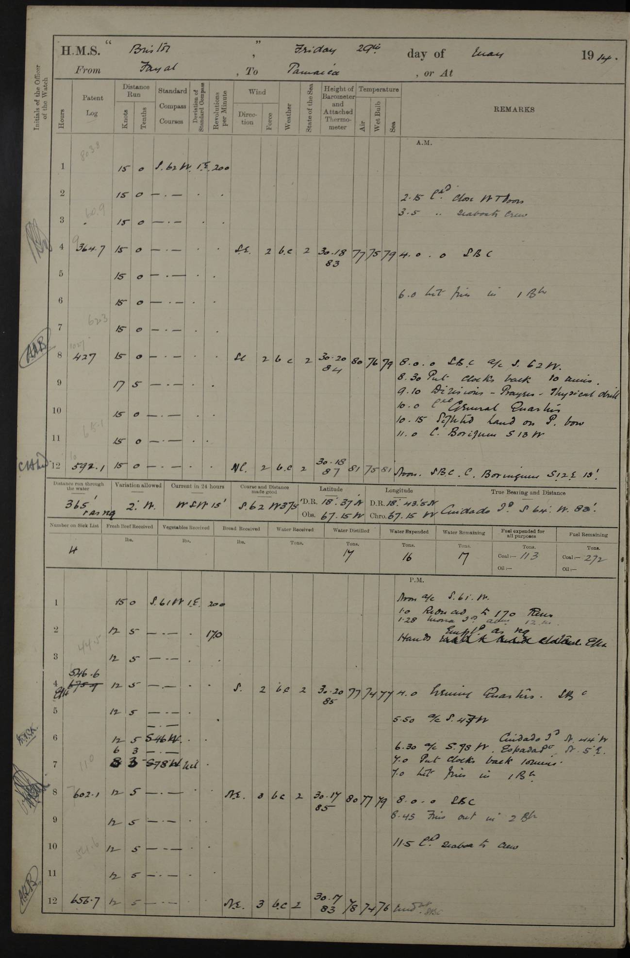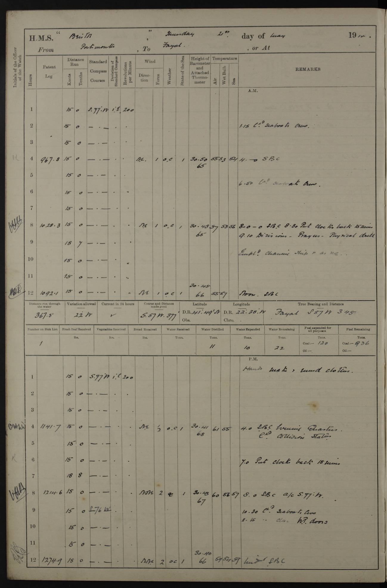 LOGS FOR MAY 1915 4caf848ccadfd34197008468: (http://oldweather.s3.amazonaws.com/ADM53-36124/ADM 53-36124-001_0.jpg) 4caf848ccadfd34197008469: (http://oldweather.s3.amazonaws.com/ADM53-36124/ADM 53-36124-001_1.jpg) 4caf848ccadfd3419700846a: (http://oldweather.s3.amazonaws.com/ADM53-36124/ADM 53-36124-002_0.jpg) 4caf848ccadfd3419700846b: (http://oldweather.s3.amazonaws.com/ADM53-36124/ADM 53-36124-002_1.jpg) 4caf848ccadfd3419700846c: (http://oldweather.s3.amazonaws.com/ADM53-36124/ADM 53-36124-003_0.jpg) 4caf848ccadfd3419700846d: (http://oldweather.s3.amazonaws.com/ADM53-36124/ADM 53-36124-003_1.jpg) 1 May 1915 Rio de Janeiro (Dry Dock) Lat -22.9, Long -43.2 6.00am: Hands to bathe. am and pm: Hands employed scraping ship's bottom. 3 on sick list. 4caf848dcadfd3419700846e: (http://oldweather.s3.amazonaws.com/ADM53-36124/ADM 53-36124-004_0.jpg) 2 May 1915 Rio de Janeiro Lat -22.9, Long -43.2 10.00am: Held divine service. 12.45pm: Paid monthly money. 1.30 to 6.00pm: Landed watch recreation party. 3 on sick list 4caf848dcadfd3419700846f: (http://oldweather.s3.amazonaws.com/ADM53-36124/ADM 53-36124-004_1.jpg) 3 May 1915 Rio de Janeiro Lat -22.9, Long -43.2 1.30 to 5.30pm: Landed watch recreation party. 4 on sick list. 4caf848dcadfd34197008470: (http://oldweather.s3.amazonaws.com/ADM53-36124/ADM 53-36124-005_0.jpg) 4 May 1915 Rio de Janeiro and at sea towards Abrolhos Rocks Lat -22.9, Long -43.2 6.00am: Lit fires in steam cutter. Commenced to flood dock. Pilot came on board. 7.30am: Proceeded out of dock. 8.20am: Secured to dock mooring buoy. Hands employed cleaning ship. 10.50am: Proceeded in charge of pilot. 11.30am: Stopped abreast Rat Island (Custom House). Pilot left ship. 11.40am: Proceeded, course as requisite for leaving harbour. 2.50pm: Sighted Cape Frio: S88E. 5.30pm: Cape Frio: N11E 3 miles. Position at 8.00pm: Lat -22.83, Long -41.53. 4 on sick list. 4caf848dcadfd34197008471: (http://oldweather.s3.amazonaws.com/ADM53-36124/ADM 53-36124-005_1.jpg) 5 May 1915 From Rio de Janeiro to Abrolhos Rocks Lat -20.79, Long -39.93 2.00am: Put clock on 15 minutes (2 hours 45 minutes slow on GMT). 6.00am: Observed High Land: N24N. Position at 8.00am: Lat -21.29, Long -40.15. 9.55am: Spoke S.S. Ortega. Turned 32 points to port. 10.05am: Resumed course N35E. 7.30pm: Burnt searchlights. Position at 8.00pm: Lat -19.63, Long -39.45. 3 on sick list. 4caf848dcadfd34197008472: (http://oldweather.s3.amazonaws.com/ADM53-36124/ADM 53-36124-006_0.jpg) 6 May 1915 At sea to Abrolhos Rocks and at sea Lat -17.95, Long -38.67 2.00am: Put clocks on 10 minutes (Set clocks 2 hours 35 minutes slow on GMT). 4.50am: Sighted Abrolhos Lighthouse: N40E. 5.00am: Altered course N40E. 6.00am: Course and and speed as requisite for approaching and anchoring in Abrolhos anchorages. Ships present, H.M.S. Vindictive, Edinburgh Castle, Celtic and Impoco and 2 colliers. 6.35am: Stopped and came to in 17 fathoms with Port Bower veered to 4 1/2 shackles. Anchorage bearings: Abrolhos Lighthouse N55E 5 miles. 1.40pm: Weighed and proceeded, course and speed as requisite for leaving anchorage by northern Abrolhos Channel. 3.30pm: Shaped course N42E 155 Revs Position at 8.00pm: Lat -17.03, Long -38.53 4caf848dcadfd34197008473: (http://oldweather.s3.amazonaws.com/ADM53-36124/ADM 53-36124-006_1.jpg) 7 May 1915 At sea Lat -14.46, Long -37.23 2.00am: Put clocks on 5 minutes (set clocks 2 hours 30 minutes slow on G.M.T.). Position at 8.00am: Lat -15.08, Long -37.46. 10.0am: Carried out .303 firing with port guns. Position at 8.00pm: Lat -13.05, Long -36.70. 4caf848dcadfd34197008474: (http://oldweather.s3.amazonaws.com/ADM53-36124/ADM 53-36124-007_0.jpg) 8 May 1915 At sea Lat -10.54, Long -35.50 Position at 8.00am: Lat -11.20, Long -35.75. Position at 8.00pm: Lat -6.58, Long -34.03. 8.55pm: Altered course to close steamer on Port bow, increased to 170 revolutions. 9.40pm: Abandoned chase. Course N56E 4 on sick list. 4caf848dcadfd34197008475: (http://oldweather.s3.amazonaws.com/ADM53-36124/ADM 53-36124-007_1.jpg) 9 May 1915 At sea to Pernambuco and at sea Lat -8.05, Long -34.86 1.10am: Sighted Agostinho Light: N3W. 2.00am: Put clocks on 5 minutes. 3.10am: Agostinho light: abeam 14 miles. 4.30am: Sighted Recife Light: N35W. 6.00am: Course and speed as requisite approaching Pernambuco outer anchorage. 6.34am: Stopped and came to with Port Bower in 7 fathoms, veered to 4 shackles. 9.50am: Held divine service. 11.45am: Weighed and proceeded as requisite for leaving Road. Position at 8.00pm: Lat -6.58, Long -34.03 4 on sick list. 4caf848dcadfd34197008476: (http://oldweather.s3.amazonaws.com/ADM53-36124/ADM 53-36124-008_0.jpg) 10 May 1915 At sea Lat -3.90, Long -32.61 2.00am: Put clocks on 5 minutes. 7.30am: Spoke S.S. Maritinus(?) and S.S. (?). Lat -4.58, Long -33.0. Position at 8.00am: Lat -4.25, Long -32.83. 9.15am: Sighted Point of Fernando Noronha: N53E. Position at 8.00pm: Lat -2.40, Long -32.13. 4 on sick list. 4caf848dcadfd34197008477: (http://oldweather.s3.amazonaws.com/ADM53-36124/ADM 53-36124-008_1.jpg) 11 May 1915 At sea Lat 0.40, Long -30.86 Position at 8.00pm: Lat 1.95, Long -30.38. 2.00am: Put clocks on 10 minutes. Position at 8.00am: Lat -0.25, Long -31.25. 3.05pm: Spoke S.S. Chacau (Spanish), altered course 1 point to starbord for 8 minutes. 4caf848dcadfd34197008478: (http://oldweather.s3.amazonaws.com/ADM53-36124/ADM 53-36124-009_0.jpg) 12 May 1915 At sea Lat 5.09, Long -29.23 2.0am: Put clocks on 5 minutes (2 hours slow on G.M.T.). Position at 8.00am: Lat 4.31, Long -29.50. Position at 8.00pm: Lat 6.66, Long -28.66. 4caf848dcadfd34197008479: (http://oldweather.s3.amazonaws.com/ADM53-36124/ADM 53-36124-009_1.jpg) 13 May 1915 At sea Lat 9.71, Long -27.60 2.0am: Put clocks on 15 minutes. Position at 8.00am: Lat 8.93, Long -27.80. Position at 8.00pm: Lat 11.36, Long -27.36. 4 on sick list. 4caf848dcadfd3419700847a: (http://oldweather.s3.amazonaws.com/ADM53-36124/ADM 53-36124-010_0.jpg) 14 May 1915 At sea Lat 14.37, Long -26.28 2.00am: Put
