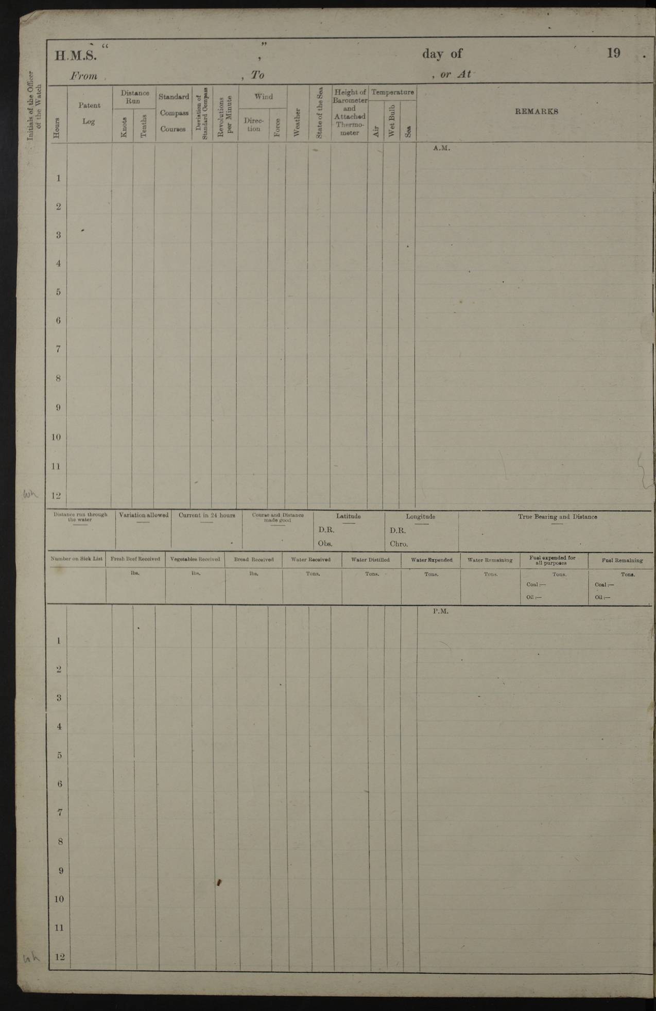 Notes: 1. Latitude/longitude, including for days in port, show representative decimal positions for each day, as calculated by the Old Weather project's analysis program. As such, they differ by varying amounts from the positions recorded, usually at noon, in the log pages. In addition, some latitudes/longitudes have been amended in edited logs for errors in the logs, for errors in identifying locations by the analysis program, or simply for greater accuracy. In all cases, refer to the log-page scans for the positions as originally recorded. Not all log pages contain this information and the ships' positions have therefore often been estimated. 2. Full account of any day is available by clicking on the link above that day. Groups of links refer to log book covers and introductory information; some may be blank. Editor’s note: The second line of each day’s entry is the position at noon in decimal format. It is either the position recorded in the log, or the known co-ordinates of a port or place. Occasionally it is marked “(approx)” and on these days the position has been estimated by the editing team from sightings or extrapolated from previous positions and courses. |