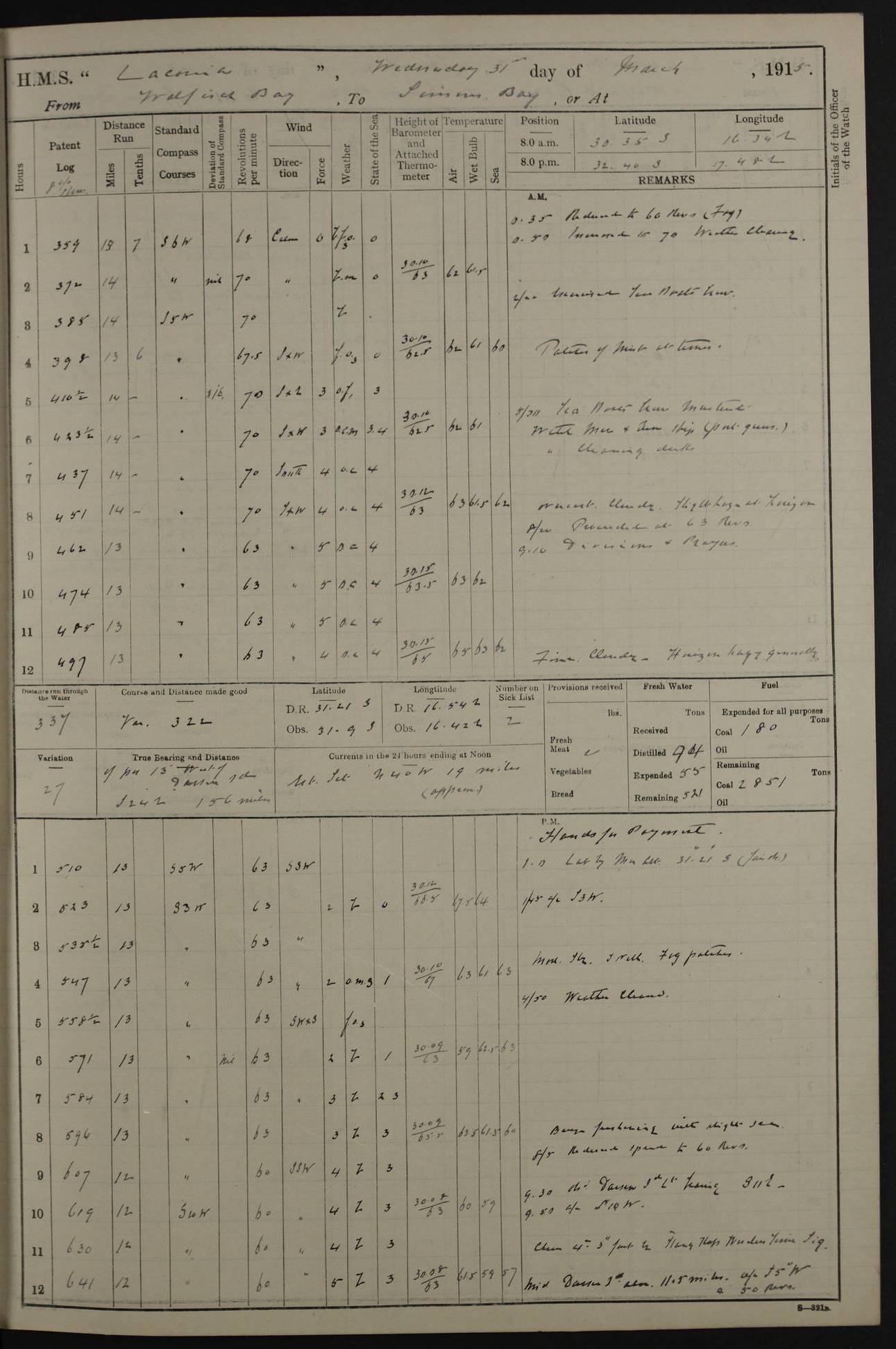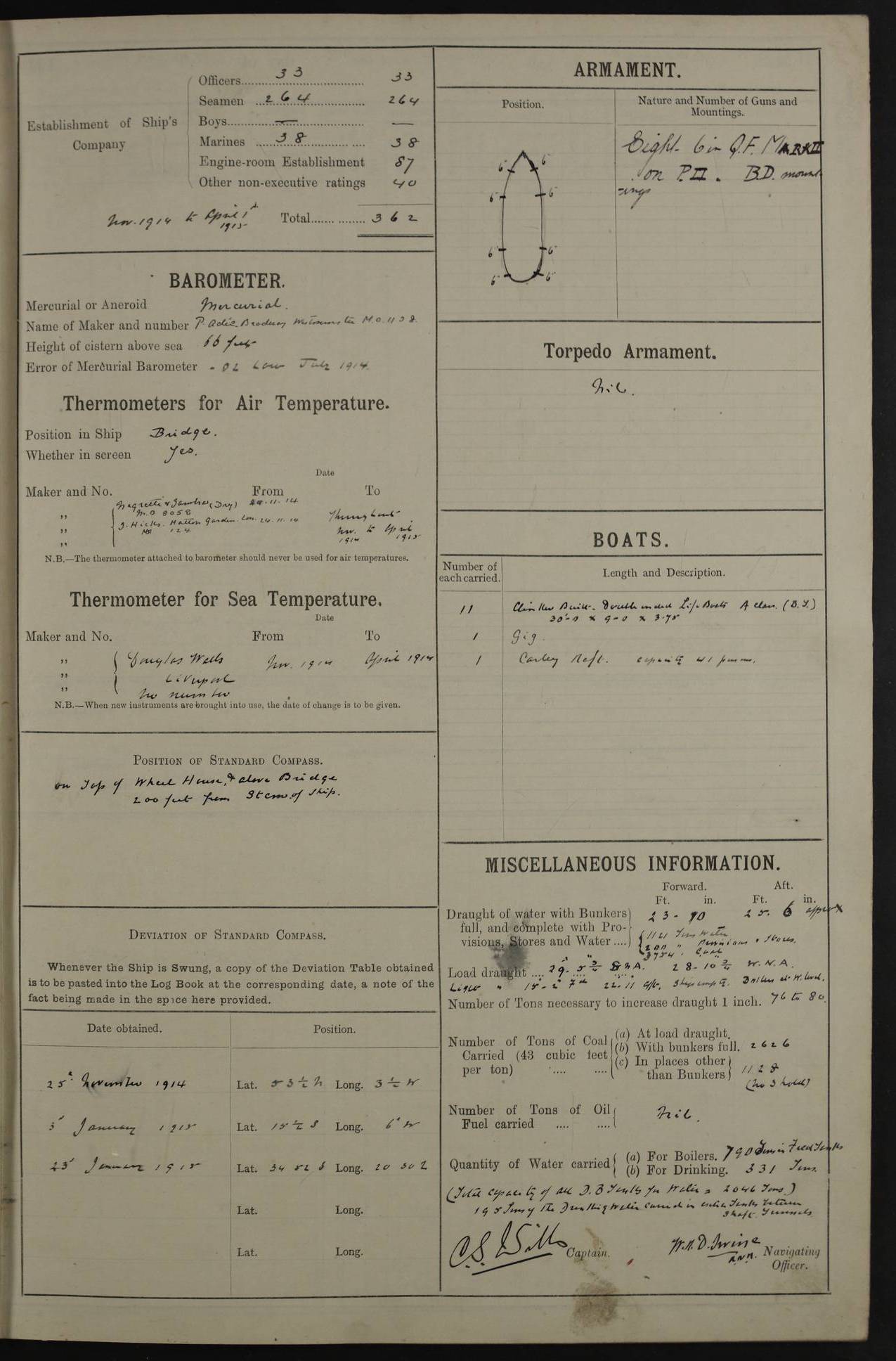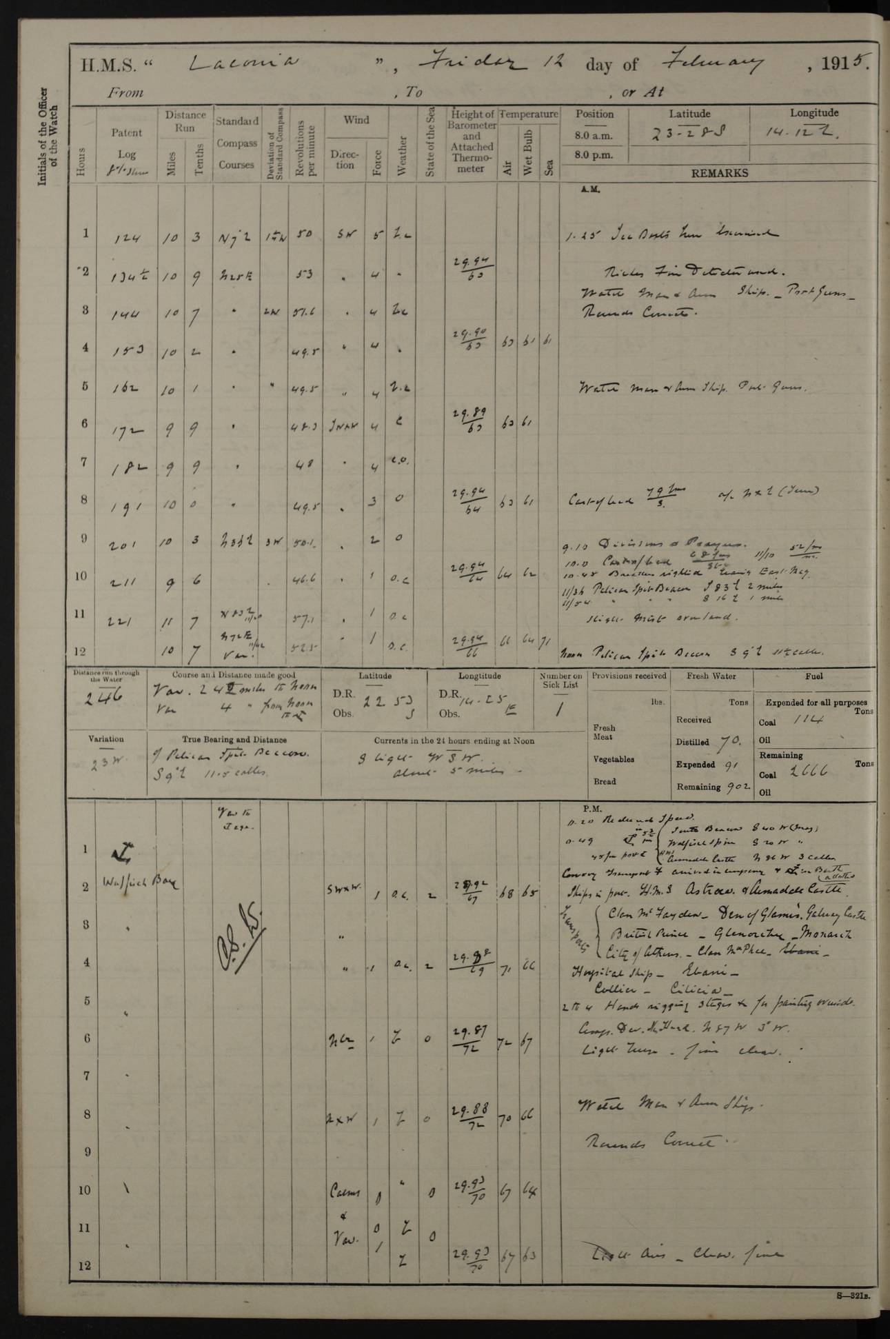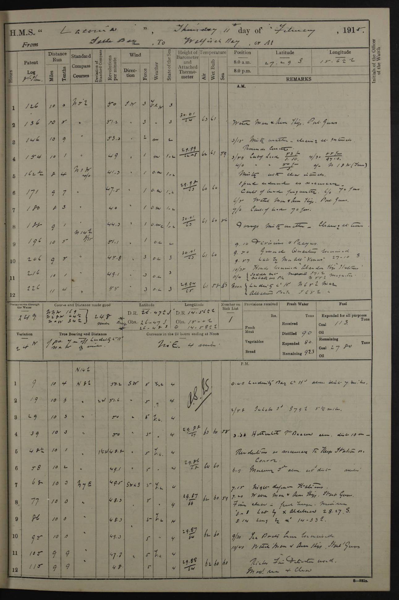 (Maps prepared using Journey Plotter, developed by Maikel. The Plots can only be approximate. They are made by joining-up positions on successive days, and sometimes positions are not given. There will therefore be occasions when the ship appears to have travelled overland) LOG BOOK – NOVEMBER 24th 1914 TO March 31st 1915 4ef4f6dae53e0a0c910022ef: (https://s3.amazonaws.com:443/oldweather/ADM53-45875/0001_0.jpg) 4ef4f6dae53e0a0c910022f0: (https://s3.amazonaws.com:443/oldweather/ADM53-45875/0001_1.jpg) Front cover, Adm. 53/45875, 24th November 1914 to 1st April 1915. 4ef4f6dae53e0a0c910022f1: (https://s3.amazonaws.com:443/oldweather/ADM53-45875/0002_0.jpg) 4ef4f6dae53e0a0c910022f2: (https://s3.amazonaws.com:443/oldweather/ADM53-45875/0002_1.jpg) 4ef4f6dbe53e0a0c910022f3: (https://s3.amazonaws.com:443/oldweather/ADM53-45875/0003_0.jpg) The above three pages are blank. 4ef4f6dbe53e0a0c910022f4: (https://s3.amazonaws.com:443/oldweather/ADM53-45875/0003_1.jpg) HMS LACONIA Tonnage. 27,946 tons. Length. 625 feet overall. Breadth. 71.35 feet. Engines. Wallsend Slipway and Engineering Co. Ltd. 14,500 IHP. Twin quadruple surface condensing, installed 1912. Boilers. Same manufacturer, cylindrical multi-tubular steel, installed 1912. Propellers. Manganese Bronze Co., London. twin, 19’ 9” dia. Condition very good. Signed, CS Wills. 4ef4f6dce53e0a0c910022f5: (https://s3.amazonaws.com:443/oldweather/ADM53-45875/0004_0.jpg) Printed page of directions for logkeepers. 4ef4f6dce53e0a0c910022f6: (https://s3.amazonaws.com:443/oldweather/ADM53-45875/0004_1.jpg) Information page Armament [diagram shown], eight 6" QF Mark II on P. II BD mountings. Complement. Officers 33, seamen 264, marines 38, engine room establishment 87, other non-exec ratings 40, total 462 [362 in log]. Mercurial barometer. P Adie No 1138. 16’ asl. Dry thermometer Negretti and Zambra No 8058. Wet thermometer J Hicks MS124. Sea thermometer Douglas Wells, no number. Boats. 11 clinker built double-ended 30’ lifeboats. 1 gig. 1 Carley raft, capacity 41 persons. Miscellaneous. Draught with full load. For’d 23’ 10”. Aft 25’ 6”. Bunkers. 2,626 tons coal, with a further 1,128 tons in No 3 hold. Tanks. 790 tons of boiler water, 331 tons drinking, with additional capacity in double bottom tanks. Page signed by the Captain and by Cdr WRD Irvine RNR, Navigating Officer. [Cdr Irvine was the Captain of Laconia before and after her conversion from a liner to an Armed Merchant Cruiser. There is a short biography at the conclusion of this edit].