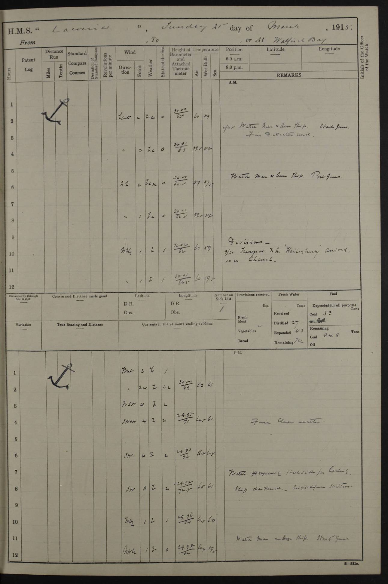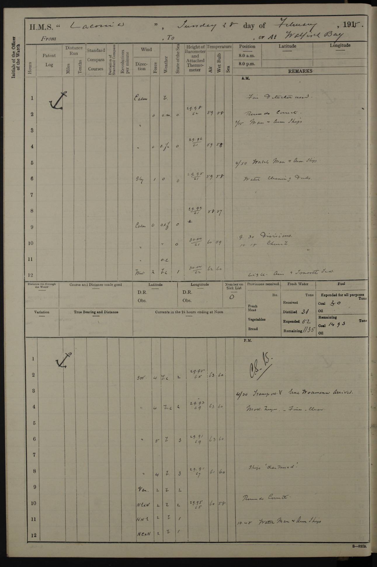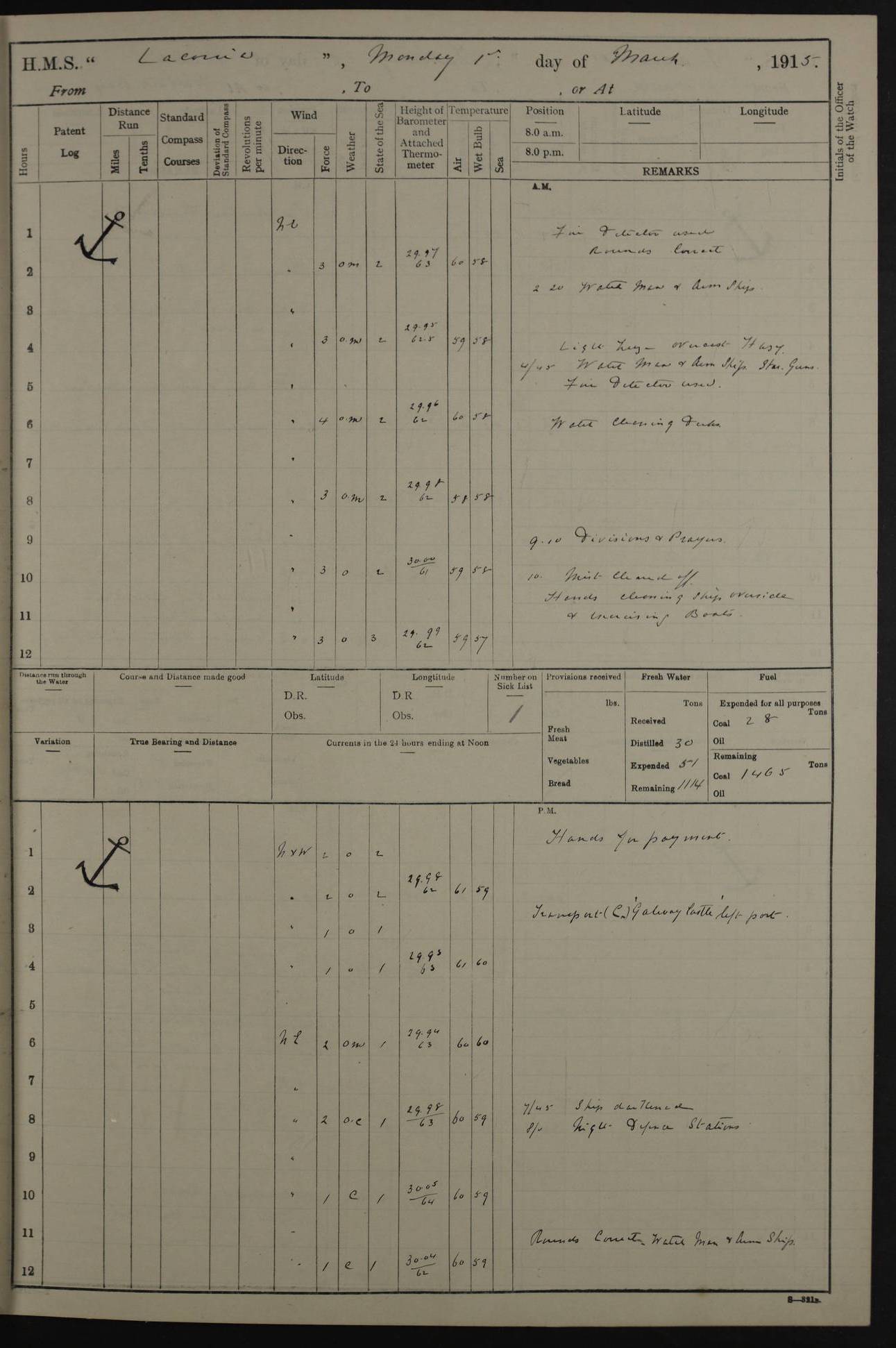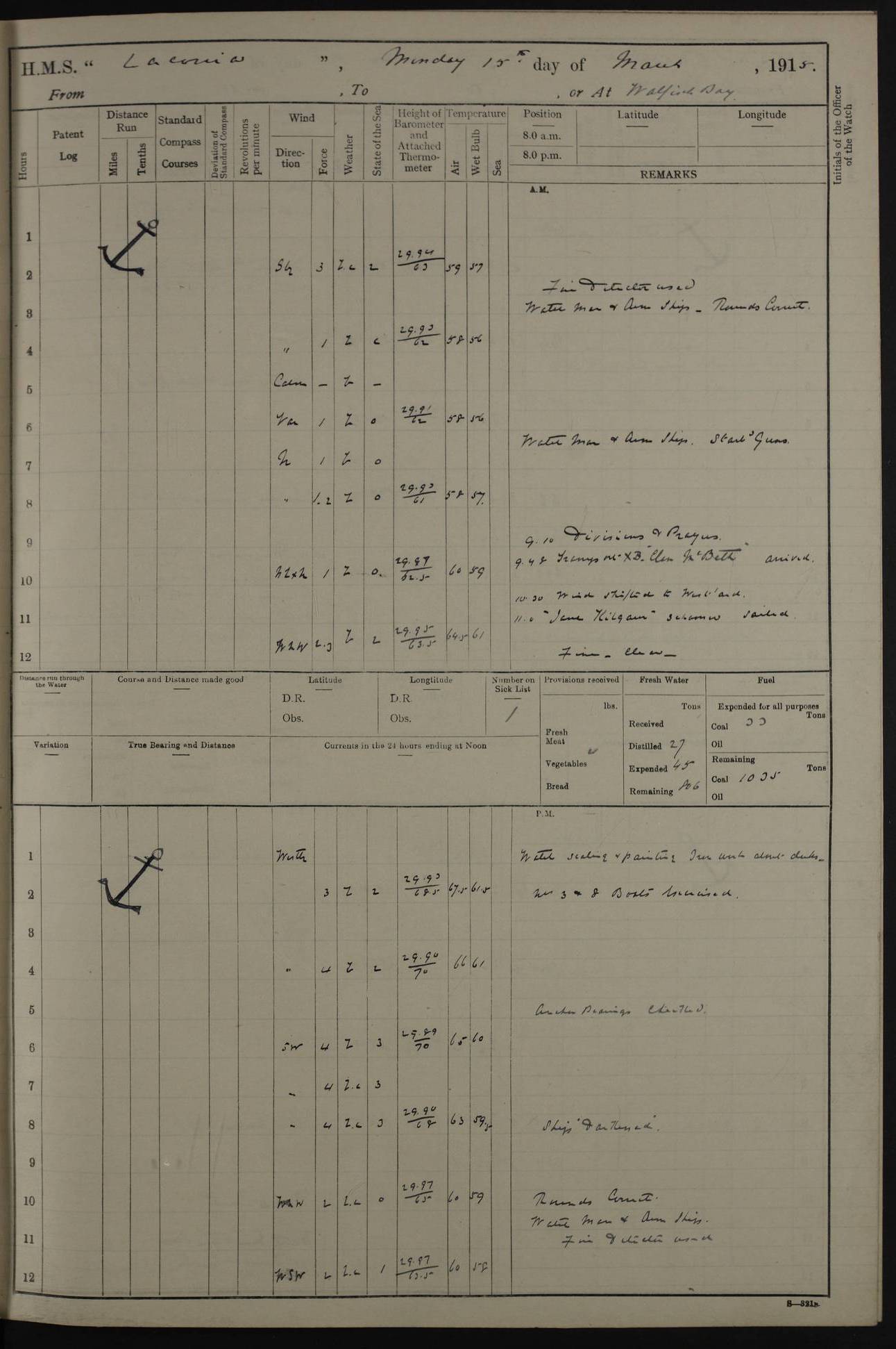 (Maps prepared using Journey Plotter, developed by Maikel. The Plots can only be approximate. They are made by joining-up positions on successive days, and sometimes positions are not given. There will therefore be occasions when the ship appears to have travelled overland) LOG BOOK – NOVEMBER 24th 1914 TO March 31st 1915 4ef4f6dae53e0a0c910022ef: (https://s3.amazonaws.com:443/oldweather/ADM53-45875/0001_0.jpg) 4ef4f6dae53e0a0c910022f0: (https://s3.amazonaws.com:443/oldweather/ADM53-45875/0001_1.jpg) Front cover, Adm. 53/45875, 24th November 1914 to 1st April 1915. 4ef4f6dae53e0a0c910022f1: (https://s3.amazonaws.com:443/oldweather/ADM53-45875/0002_0.jpg) 4ef4f6dae53e0a0c910022f2: (https://s3.amazonaws.com:443/oldweather/ADM53-45875/0002_1.jpg) 4ef4f6dbe53e0a0c910022f3: (https://s3.amazonaws.com:443/oldweather/ADM53-45875/0003_0.jpg) The above three pages are blank. 4ef4f6dbe53e0a0c910022f4: (https://s3.amazonaws.com:443/oldweather/ADM53-45875/0003_1.jpg) HMS LACONIA Tonnage. 27,946 tons. Length. 625 feet overall. Breadth. 71.35 feet. Engines. Wallsend Slipway and Engineering Co. Ltd. 14,500 IHP. Twin quadruple surface condensing, installed 1912. Boilers. Same manufacturer, cylindrical multi-tubular steel, installed 1912. Propellers. Manganese Bronze Co., London. twin, 19’ 9” dia. Condition very good. Signed, CS Wills. 4ef4f6dce53e0a0c910022f5: (https://s3.amazonaws.com:443/oldweather/ADM53-45875/0004_0.jpg) Printed page of directions for logkeepers. 4ef4f6dce53e0a0c910022f6: (https://s3.amazonaws.com:443/oldweather/ADM53-45875/0004_1.jpg) Information page Armament [diagram shown], eight 6" QF Mark II on P. II BD mountings. Complement. Officers 33, seamen 264, marines 38, engine room establishment 87, other non-exec ratings 40, total 462 [362 in log]. Mercurial barometer. P Adie No 1138. 16’ asl. Dry thermometer Negretti and Zambra No 8058. Wet thermometer J Hicks MS124. Sea thermometer Douglas Wells, no number. Boats. 11 clinker built double-ended 30’ lifeboats. 1 gig. 1 Carley raft, capacity 41 persons. Miscellaneous. Draught with full load. For’d 23’ 10”. Aft 25’ 6”. Bunkers. 2,626 tons coal, with a further 1,128 tons in No 3 hold. Tanks. 790 tons of boiler water, 331 tons drinking, with additional capacity in double bottom tanks. Page signed by the Captain and by Cdr WRD Irvine RNR, Navigating Officer. [Cdr Irvine was the Captain of Laconia before and after her conversion from a liner to an Armed Merchant Cruiser. There is a short biography at the conclusion of this edit].
