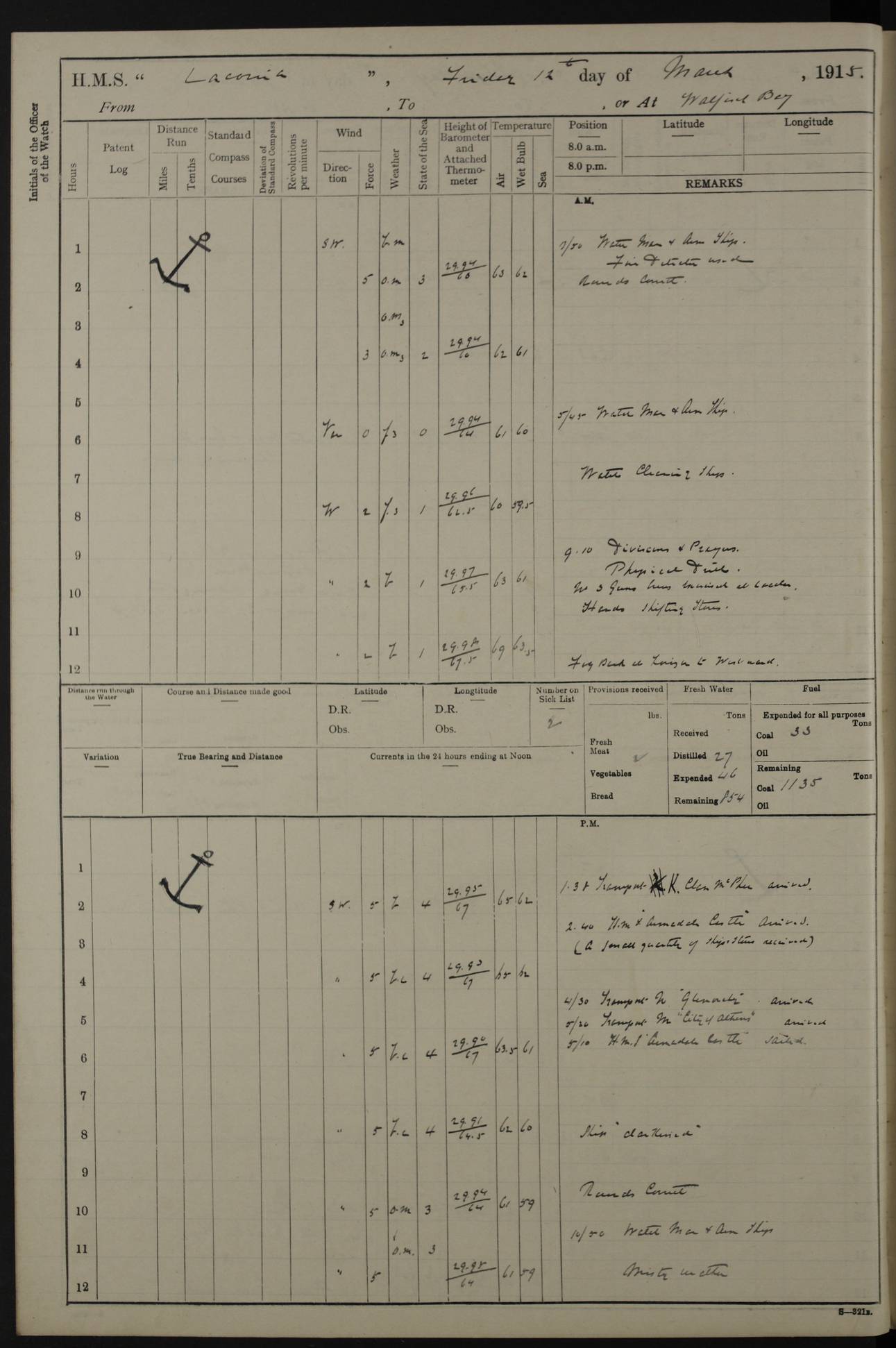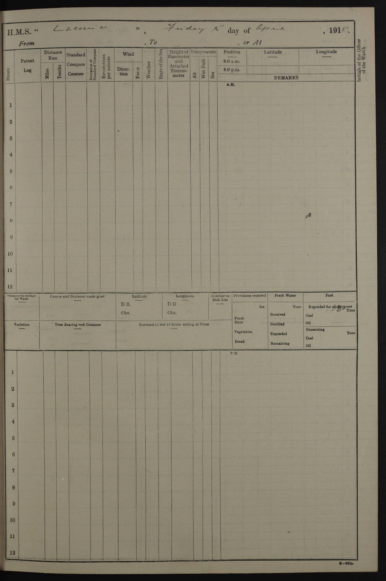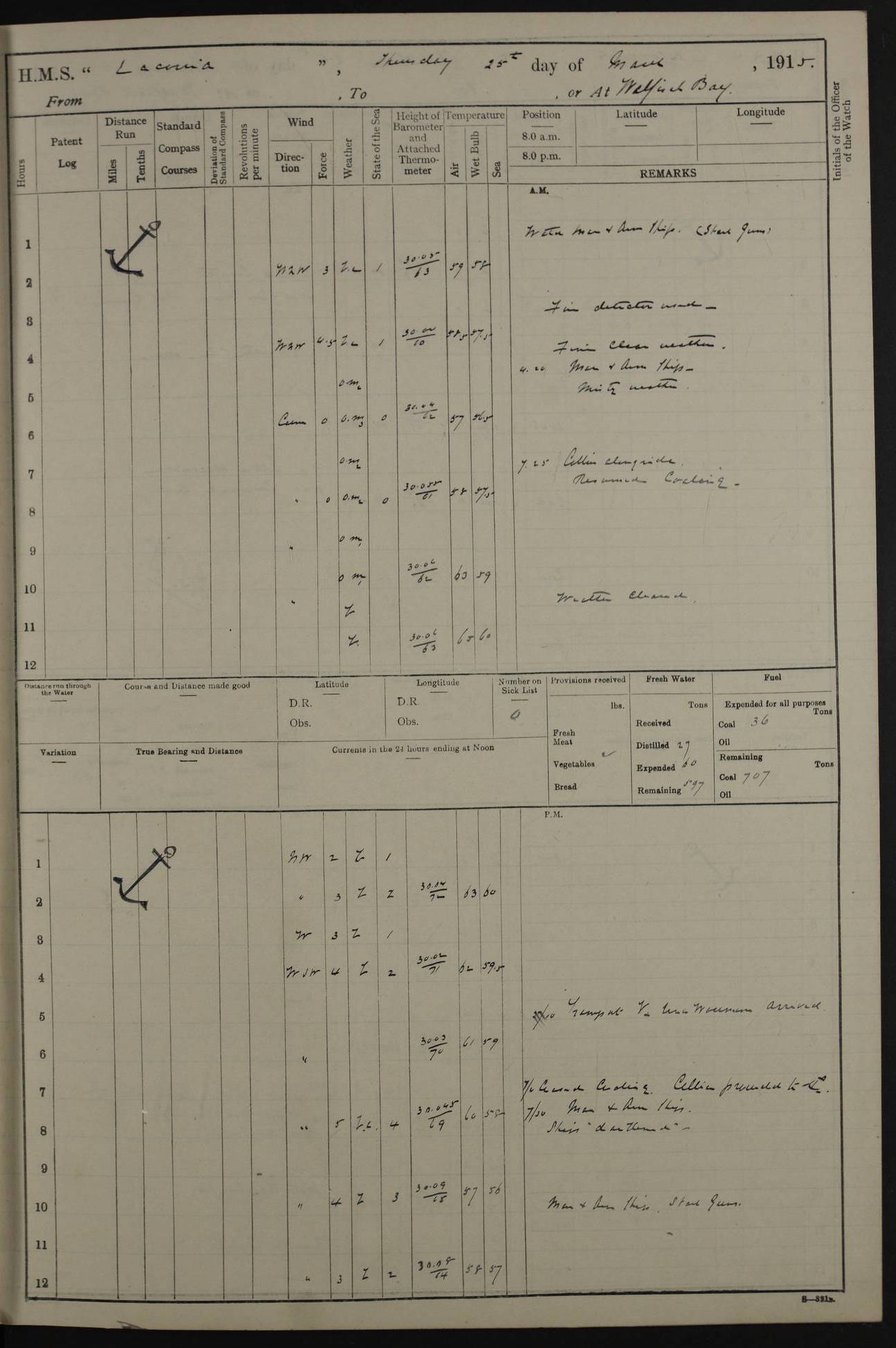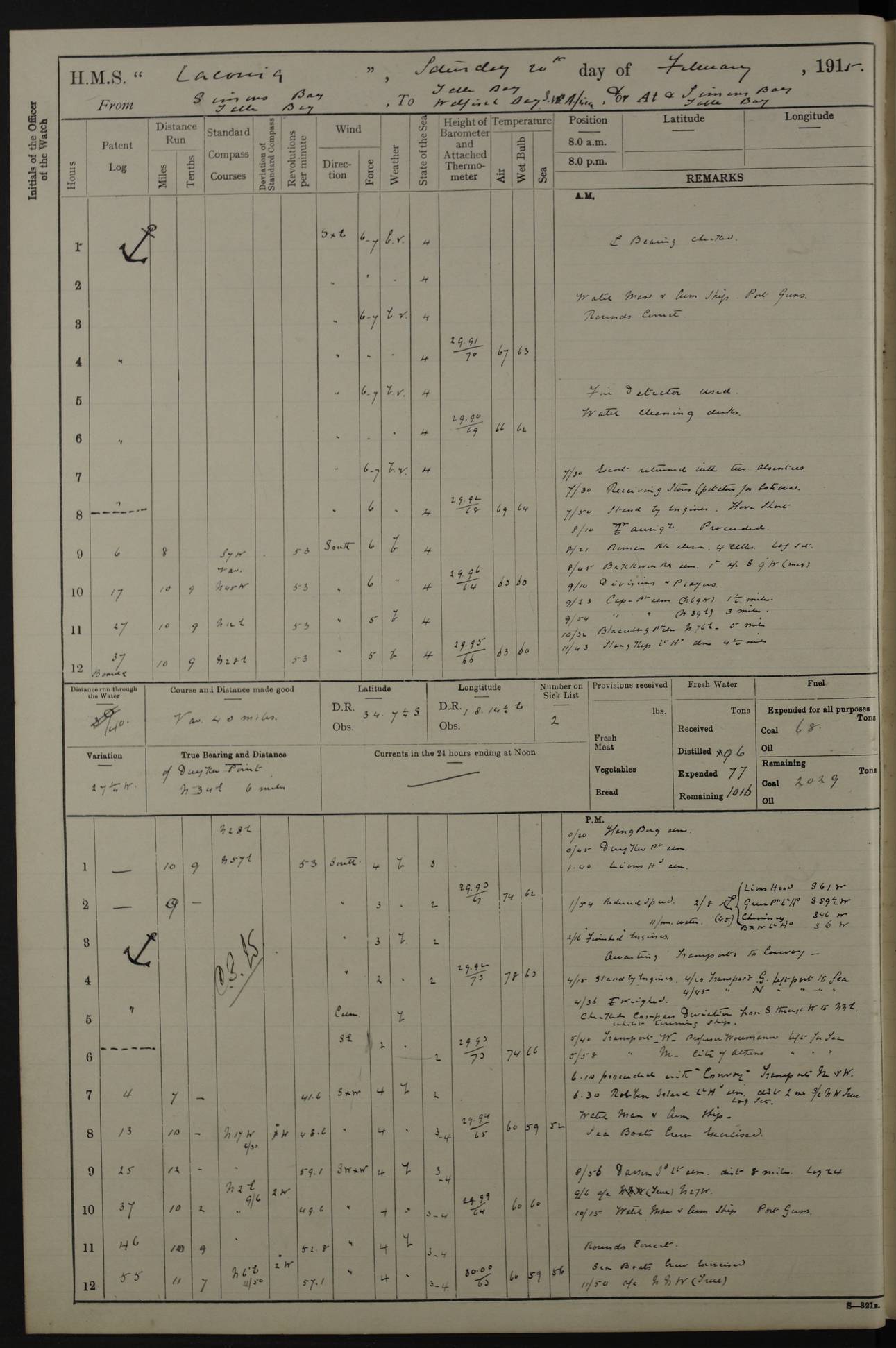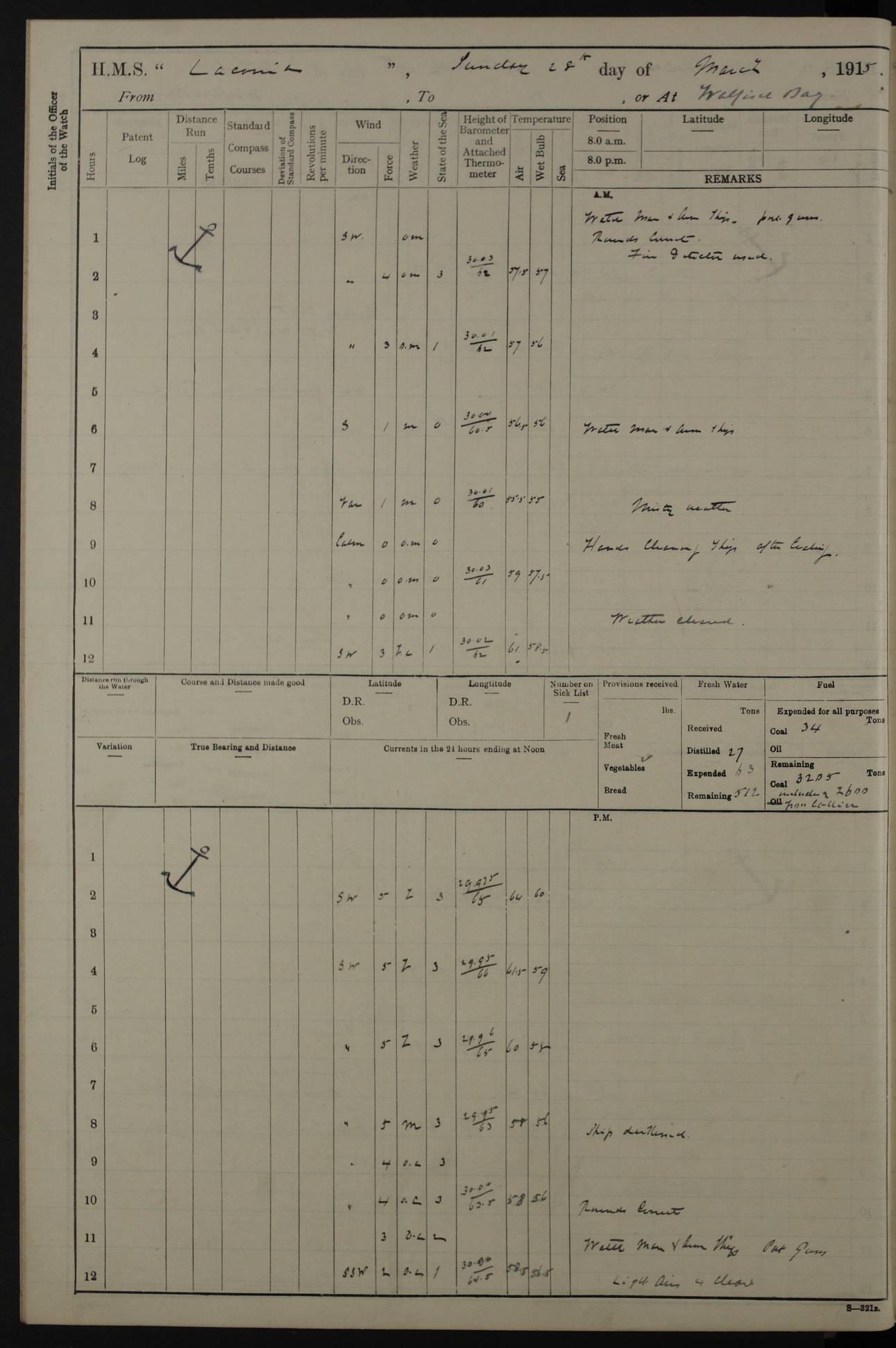 (Maps prepared using Journey Plotter, developed by Maikel. The Plots can only be approximate. They are made by joining-up positions on successive days, and sometimes positions are not given. There will therefore be occasions when the ship appears to have travelled overland) LOG BOOK – NOVEMBER 24th 1914 TO March 31st 1915 4ef4f6dae53e0a0c910022ef: (https://s3.amazonaws.com:443/oldweather/ADM53-45875/0001_0.jpg) 4ef4f6dae53e0a0c910022f0: (https://s3.amazonaws.com:443/oldweather/ADM53-45875/0001_1.jpg) Front cover, Adm. 53/45875, 24th November 1914 to 1st April 1915. 4ef4f6dae53e0a0c910022f1: (https://s3.amazonaws.com:443/oldweather/ADM53-45875/0002_0.jpg) 4ef4f6dae53e0a0c910022f2: (https://s3.amazonaws.com:443/oldweather/ADM53-45875/0002_1.jpg) 4ef4f6dbe53e0a0c910022f3: (https://s3.amazonaws.com:443/oldweather/ADM53-45875/0003_0.jpg) The above three pages are blank. 4ef4f6dbe53e0a0c910022f4: (https://s3.amazonaws.com:443/oldweather/ADM53-45875/0003_1.jpg) HMS LACONIA Tonnage. 27,946 tons. Length. 625 feet overall. Breadth. 71.35 feet. Engines. Wallsend Slipway and Engineering Co. Ltd. 14,500 IHP. Twin quadruple surface condensing, installed 1912. Boilers. Same manufacturer, cylindrical multi-tubular steel, installed 1912. Propellers. Manganese Bronze Co., London. twin, 19’ 9” dia. Condition very good. Signed, CS Wills. 4ef4f6dce53e0a0c910022f5: (https://s3.amazonaws.com:443/oldweather/ADM53-45875/0004_0.jpg) Printed page of directions for logkeepers. 4ef4f6dce53e0a0c910022f6: (https://s3.amazonaws.com:443/oldweather/ADM53-45875/0004_1.jpg) Information page Armament [diagram shown], eight 6" QF Mark II on P. II BD mountings. Complement. Officers 33, seamen 264, marines 38, engine room establishment 87, other non-exec ratings 40, total 462 [362 in log]. Mercurial barometer. P Adie No 1138. 16’ asl. Dry thermometer Negretti and Zambra No 8058. Wet thermometer J Hicks MS124. Sea thermometer Douglas Wells, no number. Boats. 11 clinker built double-ended 30’ lifeboats. 1 gig. 1 Carley raft, capacity 41 persons. Miscellaneous. Draught with full load. For’d 23’ 10”. Aft 25’ 6”. Bunkers. 2,626 tons coal, with a further 1,128 tons in No 3 hold. Tanks. 790 tons of boiler water, 331 tons drinking, with additional capacity in double bottom tanks. Page signed by the Captain and by Cdr WRD Irvine RNR, Navigating Officer. [Cdr Irvine was the Captain of Laconia before and after her conversion from a liner to an Armed Merchant Cruiser. There is a short biography at the conclusion of this edit].