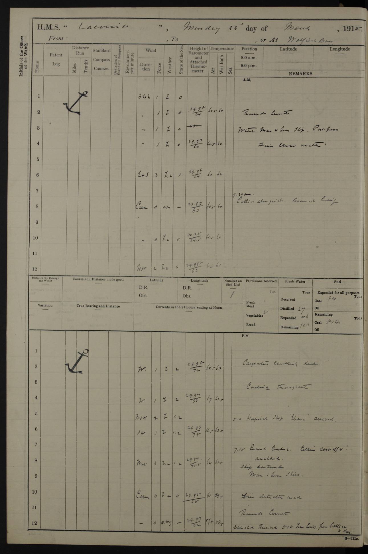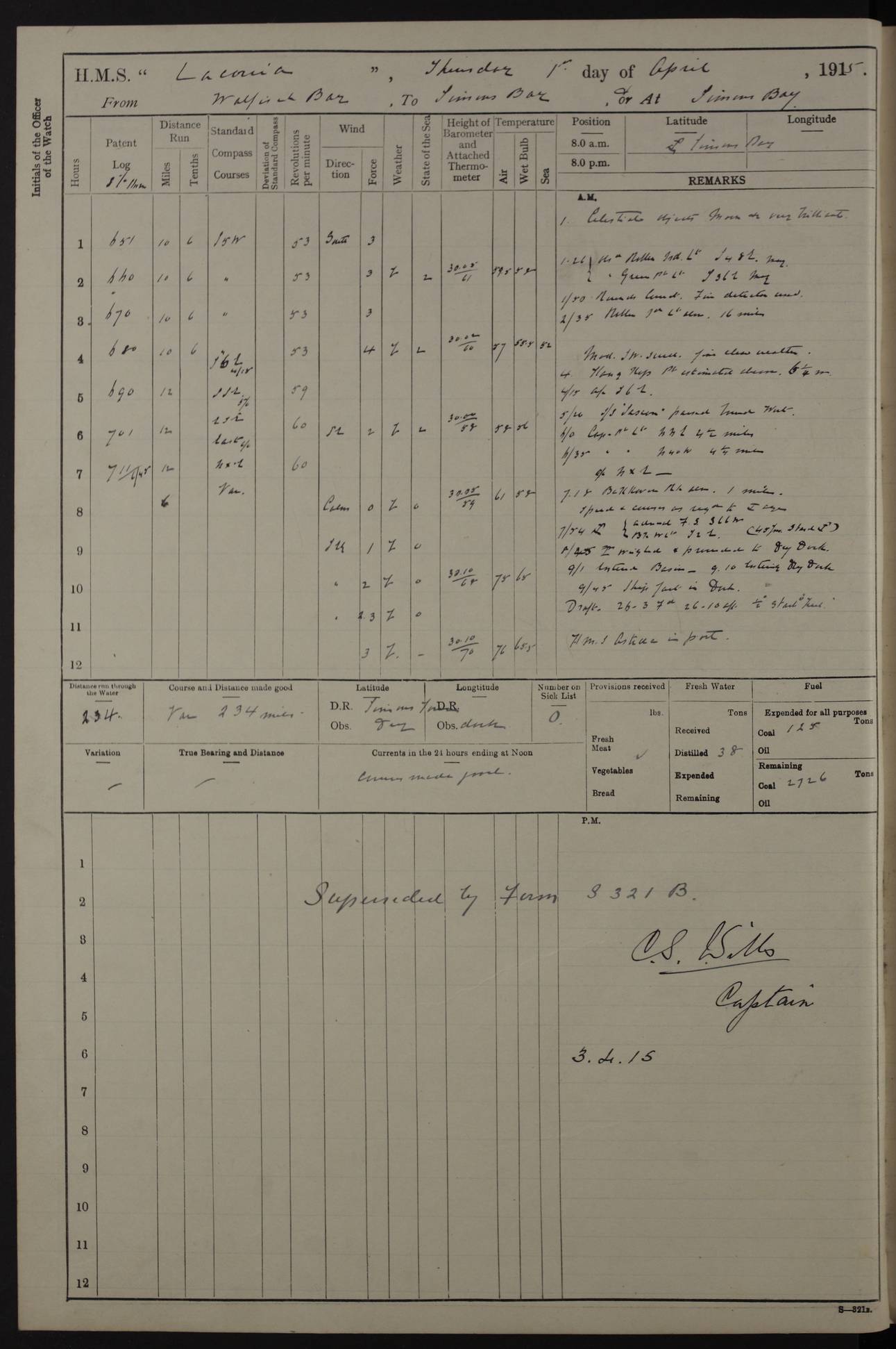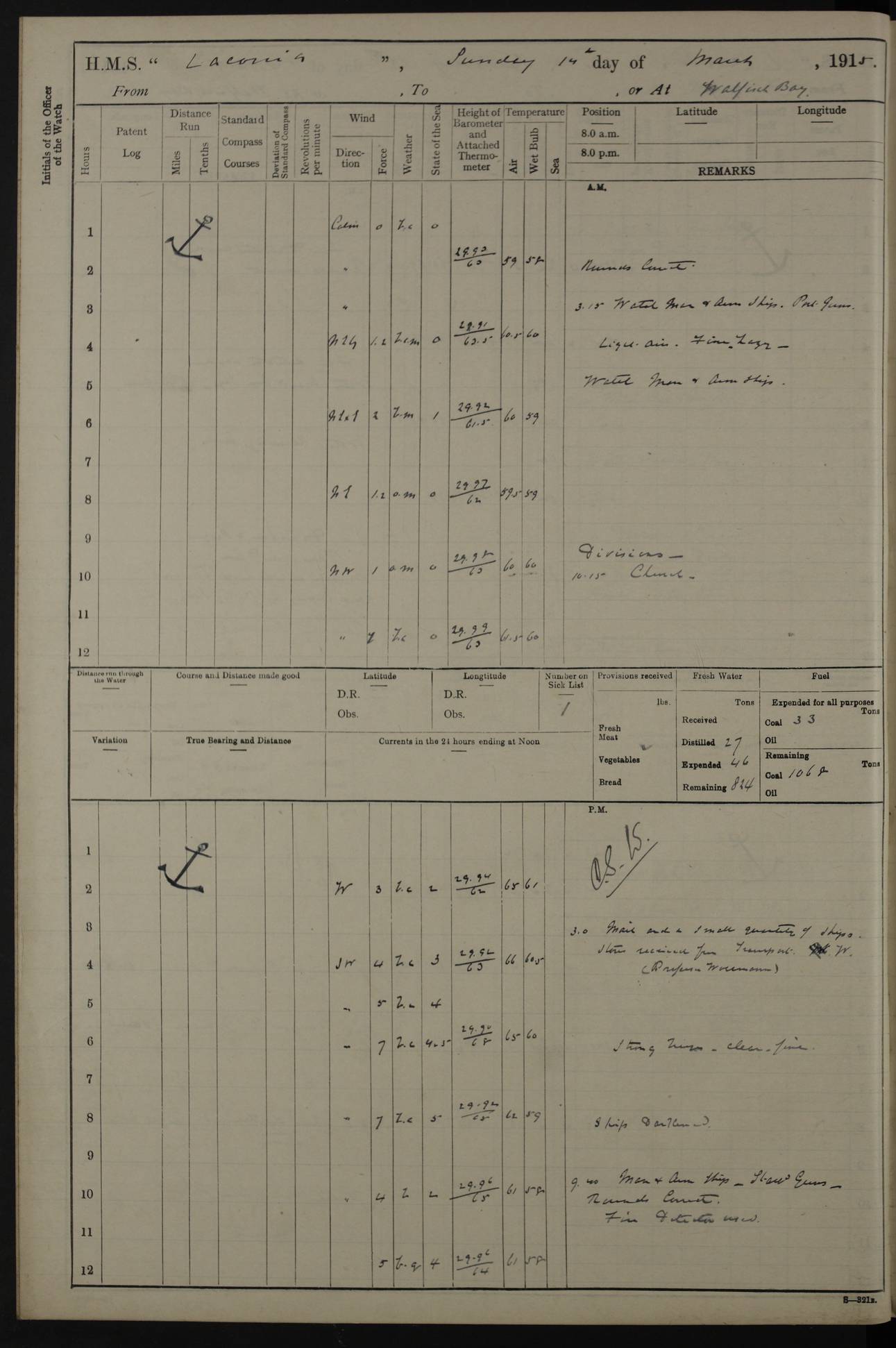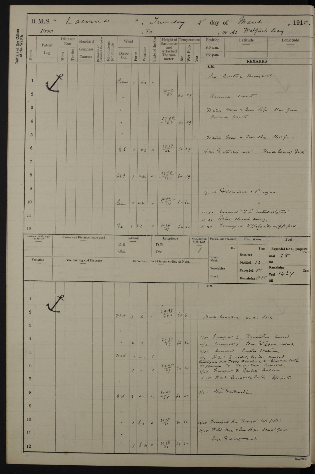 (Maps prepared using Journey Plotter, developed by Maikel. The Plots can only be approximate. They are made by joining-up positions on successive days, and sometimes positions are not given. There will therefore be occasions when the ship appears to have travelled overland) LOG BOOK – NOVEMBER 24th 1914 TO March 31st 1915 4ef4f6dae53e0a0c910022ef: (https://s3.amazonaws.com:443/oldweather/ADM53-45875/0001_0.jpg) 4ef4f6dae53e0a0c910022f0: (https://s3.amazonaws.com:443/oldweather/ADM53-45875/0001_1.jpg) Front cover, Adm. 53/45875, 24th November 1914 to 1st April 1915. 4ef4f6dae53e0a0c910022f1: (https://s3.amazonaws.com:443/oldweather/ADM53-45875/0002_0.jpg) 4ef4f6dae53e0a0c910022f2: (https://s3.amazonaws.com:443/oldweather/ADM53-45875/0002_1.jpg) 4ef4f6dbe53e0a0c910022f3: (https://s3.amazonaws.com:443/oldweather/ADM53-45875/0003_0.jpg) The above three pages are blank. 4ef4f6dbe53e0a0c910022f4: (https://s3.amazonaws.com:443/oldweather/ADM53-45875/0003_1.jpg) HMS LACONIA Tonnage. 27,946 tons. Length. 625 feet overall. Breadth. 71.35 feet. Engines. Wallsend Slipway and Engineering Co. Ltd. 14,500 IHP. Twin quadruple surface condensing, installed 1912. Boilers. Same manufacturer, cylindrical multi-tubular steel, installed 1912. Propellers. Manganese Bronze Co., London. twin, 19’ 9” dia. Condition very good. Signed, CS Wills. 4ef4f6dce53e0a0c910022f5: (https://s3.amazonaws.com:443/oldweather/ADM53-45875/0004_0.jpg) Printed page of directions for logkeepers. 4ef4f6dce53e0a0c910022f6: (https://s3.amazonaws.com:443/oldweather/ADM53-45875/0004_1.jpg) Information page Armament [diagram shown], eight 6" QF Mark II on P. II BD mountings. Complement. Officers 33, seamen 264, marines 38, engine room establishment 87, other non-exec ratings 40, total 462 [362 in log]. Mercurial barometer. P Adie No 1138. 16’ asl. Dry thermometer Negretti and Zambra No 8058. Wet thermometer J Hicks MS124. Sea thermometer Douglas Wells, no number. Boats. 11 clinker built double-ended 30’ lifeboats. 1 gig. 1 Carley raft, capacity 41 persons. Miscellaneous. Draught with full load. For’d 23’ 10”. Aft 25’ 6”. Bunkers. 2,626 tons coal, with a further 1,128 tons in No 3 hold. Tanks. 790 tons of boiler water, 331 tons drinking, with additional capacity in double bottom tanks. Page signed by the Captain and by Cdr WRD Irvine RNR, Navigating Officer. [Cdr Irvine was the Captain of Laconia before and after her conversion from a liner to an Armed Merchant Cruiser. There is a short biography at the conclusion of this edit].