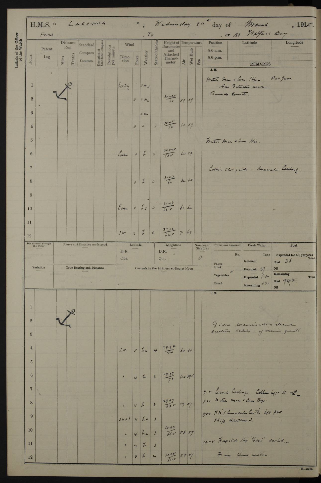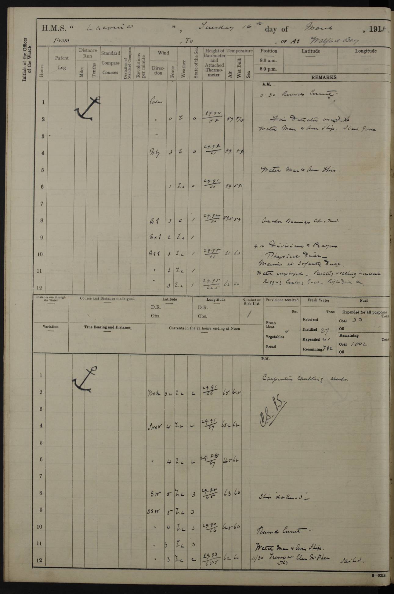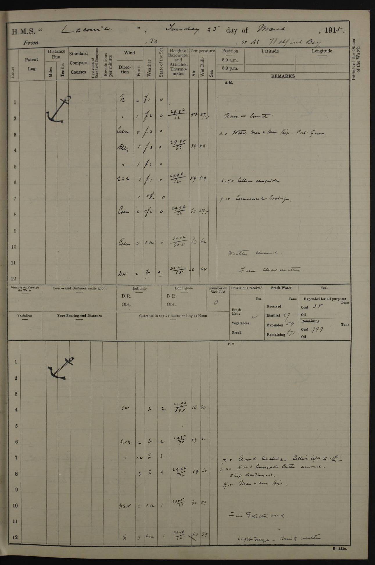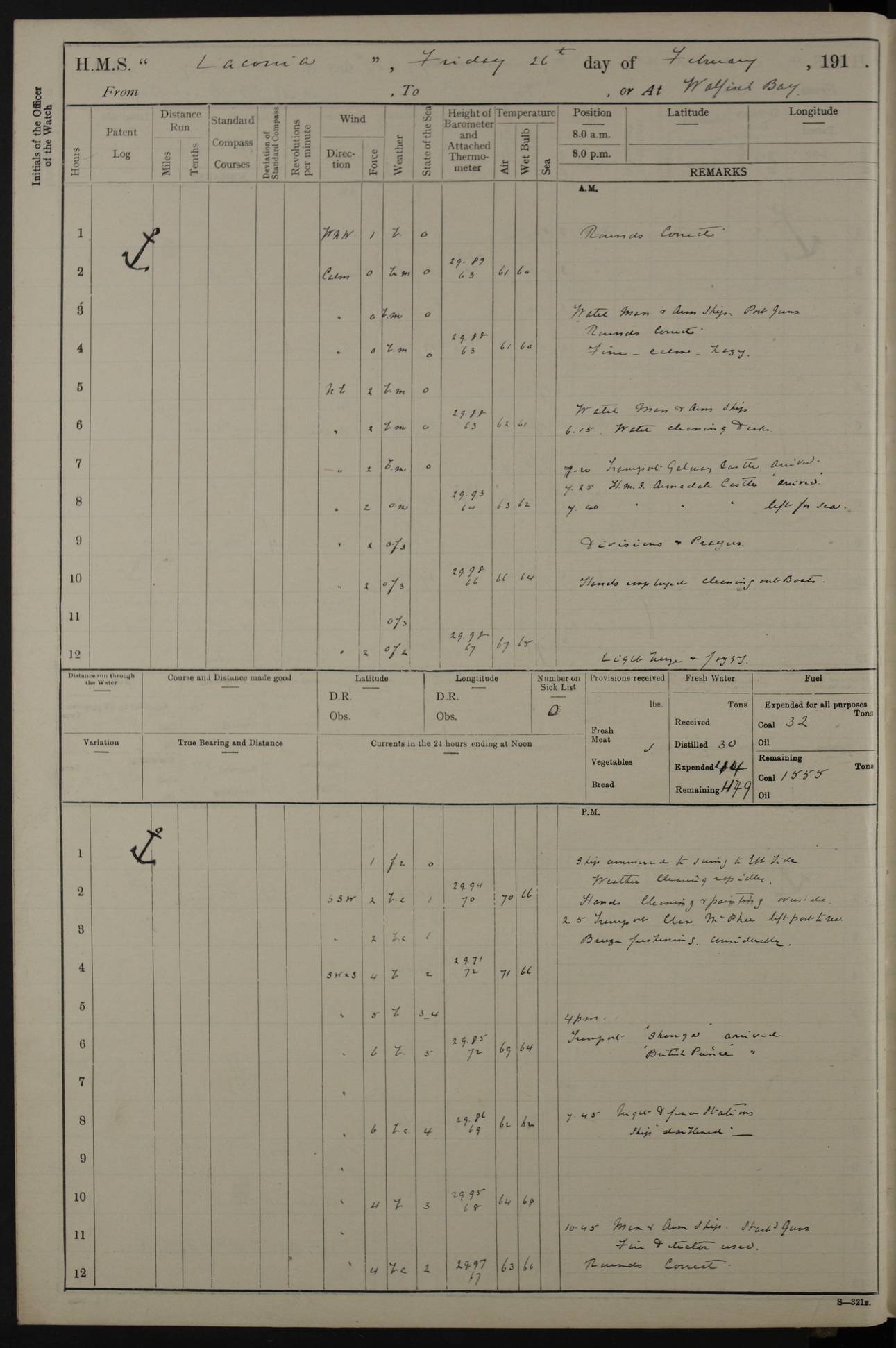 (Maps prepared using Journey Plotter, developed by Maikel. The Plots can only be approximate. They are made by joining-up positions on successive days, and sometimes positions are not given. There will therefore be occasions when the ship appears to have travelled overland) LOG BOOK – NOVEMBER 24th 1914 TO March 31st 1915 4ef4f6dae53e0a0c910022ef: (https://s3.amazonaws.com:443/oldweather/ADM53-45875/0001_0.jpg) 4ef4f6dae53e0a0c910022f0: (https://s3.amazonaws.com:443/oldweather/ADM53-45875/0001_1.jpg) Front cover, Adm. 53/45875, 24th November 1914 to 1st April 1915. 4ef4f6dae53e0a0c910022f1: (https://s3.amazonaws.com:443/oldweather/ADM53-45875/0002_0.jpg) 4ef4f6dae53e0a0c910022f2: (https://s3.amazonaws.com:443/oldweather/ADM53-45875/0002_1.jpg) 4ef4f6dbe53e0a0c910022f3: (https://s3.amazonaws.com:443/oldweather/ADM53-45875/0003_0.jpg) The above three pages are blank. 4ef4f6dbe53e0a0c910022f4: (https://s3.amazonaws.com:443/oldweather/ADM53-45875/0003_1.jpg) HMS LACONIA Tonnage. 27,946 tons. Length. 625 feet overall. Breadth. 71.35 feet. Engines. Wallsend Slipway and Engineering Co. Ltd. 14,500 IHP. Twin quadruple surface condensing, installed 1912. Boilers. Same manufacturer, cylindrical multi-tubular steel, installed 1912. Propellers. Manganese Bronze Co., London. twin, 19’ 9” dia. Condition very good. Signed, CS Wills. 4ef4f6dce53e0a0c910022f5: (https://s3.amazonaws.com:443/oldweather/ADM53-45875/0004_0.jpg) Printed page of directions for logkeepers. 4ef4f6dce53e0a0c910022f6: (https://s3.amazonaws.com:443/oldweather/ADM53-45875/0004_1.jpg) Information page Armament [diagram shown], eight 6" QF Mark II on P. II BD mountings. Complement. Officers 33, seamen 264, marines 38, engine room establishment 87, other non-exec ratings 40, total 462 [362 in log]. Mercurial barometer. P Adie No 1138. 16’ asl. Dry thermometer Negretti and Zambra No 8058. Wet thermometer J Hicks MS124. Sea thermometer Douglas Wells, no number. Boats. 11 clinker built double-ended 30’ lifeboats. 1 gig. 1 Carley raft, capacity 41 persons. Miscellaneous. Draught with full load. For’d 23’ 10”. Aft 25’ 6”. Bunkers. 2,626 tons coal, with a further 1,128 tons in No 3 hold. Tanks. 790 tons of boiler water, 331 tons drinking, with additional capacity in double bottom tanks. Page signed by the Captain and by Cdr WRD Irvine RNR, Navigating Officer. [Cdr Irvine was the Captain of Laconia before and after her conversion from a liner to an Armed Merchant Cruiser. There is a short biography at the conclusion of this edit].