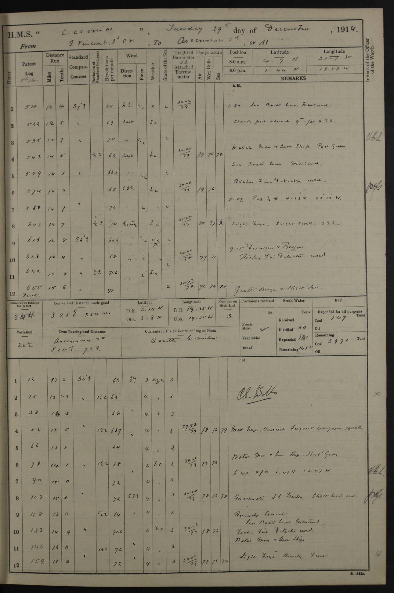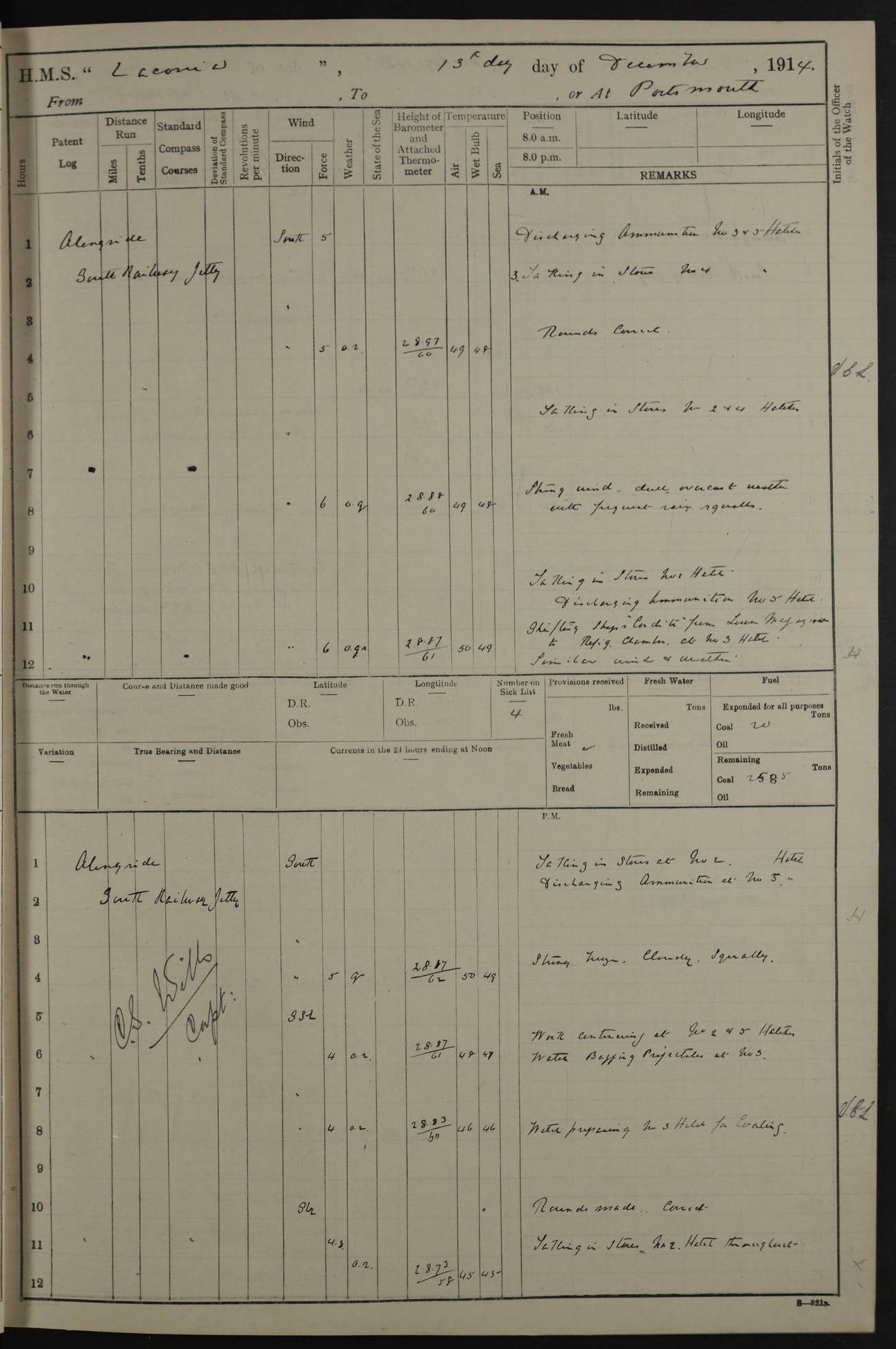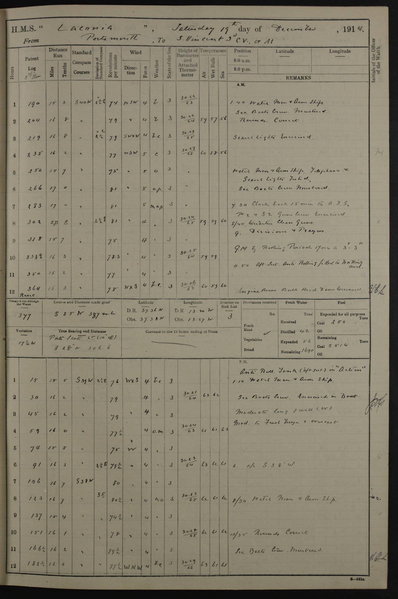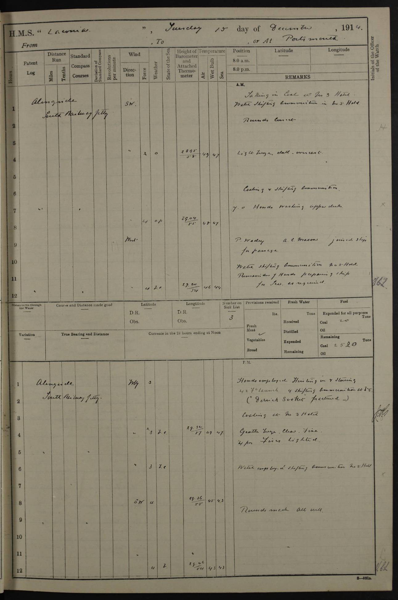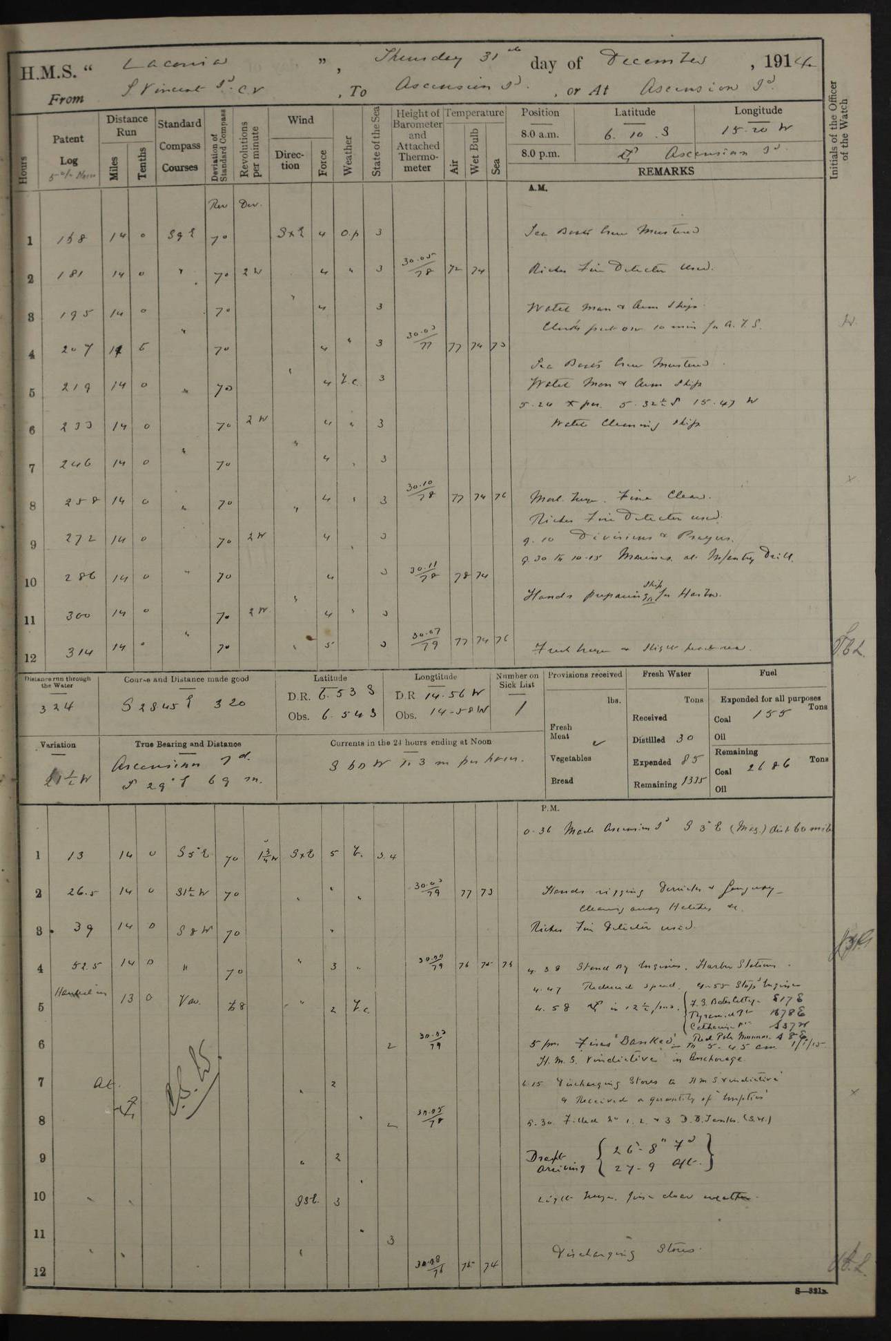 LOGS FOR NOVEMBER 1914 [Liverpool and Portsmouth] 4ef4f6dce53e0a0c910022f7: (https://s3.amazonaws.com:443/oldweather/ADM53-45875/0005_0.jpg) 24 November 1914 Liverpool Lat 53.43, Long -3.0 9.00am: Broke pendant, ship commissioned by Captain CS Wills as armed merchant cruiser with crew from Chatham depôt. 10.30am: Crew employed hoisting in and stowing stores, ammunition, projectiles etc. 1.30pm: Fires lit and engine room telegraph tested. Steering gear examined. 4ef4f6dce53e0a0c910022f8: (https://s3.amazonaws.com:443/oldweather/ADM53-45875/0005_1.jpg) 25 November 1914 Liverpool Lat 53.43, Long -3.0 8.00am: Hands taking in stores. 11.45am: Singled up moorings. 12.50pm: Left berth in Huskisson Dock assisted by three tugs. 1.35pm: Made fast in Sandon Basin. 4ef4f6dde53e0a0c910022f9: (https://s3.amazonaws.com:443/oldweather/ADM53-45875/0006_0.jpg) 26 November 1914 Liverpool and at sea towards Portsmouth Lat 53.55, Long -3.37 8.00am: Tested gun mountings. Compass adjusted by Lt Furse, compass adjuster. Draught on leaving 24’ 42” for’d, 26’ 10” aft. Coal 3,205 tons. Noon: Proceeded on passage. 2.49pm: Dropped pilot to pilot boat off Point Lynas. Proceeded full speed. 3.32pm: Middle Mouse I. abeam, 1.25 miles. Weather: West wind f 6 with squally showers. 4ef4f6dde53e0a0c910022fa: (https://s3.amazonaws.com:443/oldweather/ADM53-45875/0006_1.jpg) 27 November 1914 At sea Lat 49.95, Long -4.85 12.50am: Smalls Lt abeam 3 miles, a/c S24W. 8.00am: Pos. 50º 20’N, 5º 25’W. 9.10am: Longships Lt abeam 3 miles, a/c S60E. 11.10am: Lizard Lt abeam 4 miles, a/c S38E. Noon: Courses & DMG, various 294.5 miles, coasting. 1.10pm: Eddystone Lt bg N49E(t). 2.08pm: Same abeam 7 miles. 2.35pm: Start Pt Lt bg N64E(t) 3.54pm: Same abeam, 5 miles. 6.12pm: Portland Bill Lt bg Lt N53E(m) 7.17pm: Same abeam, 11 miles. 8.00pm: Pos 50º 22’N, 2º 08’W. 10.05pm: Needles Lt bg N80E 11.00pm: St Catherine’s Pt Lt abeam 3.5 miles. 4ef4f6dde53e0a0c910022fb: (https://s3.amazonaws.com:443/oldweather/ADM53-45875/0007_0.jpg) 28 November 1914 At sea to Portsmouth Lat 50.81, Long -1.11 12.46am: Passed Warrior LV and anchored. 7.10am: Weighed, pilot boarded. 7.46am: Anchored, awaiting permission to enter harbour. 8.30am: Weighed and proceeded. 9.15am: Secured alongside South Railway jetty. Drew fires in five boilers, banked fires in remainder. Noon: Courses & DMG, various 164.5 miles to anchorage. 4ef4f6dde53e0a0c910022fc: (https://s3.amazonaws.com:443/oldweather/ADM53-45875/0007_1.jpg) 29 November 1914 Portsmouth Lat 50.81, Long -1.11 9.05am: Commenced loading ammunition. 4ef4f6dee53e0a0c910022fd: (https://s3.amazonaws.com:443/oldweather/ADM53-45875/0008_0.jpg) 30 November 1914 Portsmouth Lat 50.81, Long -1.11 3.25am: Ceased work at No 3 hold, barge unloaded. 9.15am: Commenced loading victualling stores. 10.30am: Resumed loading ammunition. Work continuing throughout the night. LOGS FOR DECEMBER 1914 [Portsmouth, St Vincent and Ascension I.] 4ef4f6dee53e0a0c910022fe: (https://s3.amazonaws.com:443/oldweather/ADM53-45875/0008_1.jpg) 1 December 1914 Portsmouth Lat 50.81, Long -1.11 Receiving ammunition and victualling stores throughout the day and night. Sick list: 5. Weather: Strong winds, W or SW, f 7 at times in the am, f 4 in the pm, with some rain showers, 50º to 55º F. 4ef4f6dfe53e0a0c910022ff: (https://s3.amazonaws.com:443/oldweather/ADM53-45875/0009_0.jpg) 2 December 1914 Portsmouth Lat 50.81, Long -1.11 Hoisting in and stowing naval stores throughout the 24 hours. 4ef4f6dfe53e0a0c91002300: (https://s3.amazonaws.com:443/oldweather/ADM53-45875/0009_1.jpg) 3 December 1914 Portsmouth Lat 50.81, Long -1.11 Continuing to load stores throughout the 24 hours, with breaks for strong weather, SW winds up to f 7 with showers. 4ef4f6e0e53e0a0c91002303: (https://s3.amazonaws.com:443/oldweather/ADM53-45875/0011_0.jpg) 4 December 1914 Portsmouth Lat 50.81, Long -1.11 Taking in stores. 1.40pm: Ceased work at aft hatches owing to bad weather [force 8, squalls and rain]. 11.30pm: Escort with prisoner arrived on board. 4ef4f6e0e53e0a0c91002304: (https://s3.amazonaws.com:443/oldweather/ADM53-45875/0011_1.jpg) 5 December 1914 Portsmouth Lat 50.81, Long -1.11 Taking in stores and ammunition. 4ef4f6e0e53e0a0c91002305: (https://s3.amazonaws.com:443/oldweather/ADM53-45875/0012_0.jpg) 6 December 1914 Portsmouth Lat 50.81, Long -1.11 7.05am: AB Jones brought on board by escort. Taking in stores. 9.30pm: Ceased work for heavy rain. 4ef4f6e0e53e0a0c91002306: (https://s3.amazonaws.com:443/oldweather/ADM53-45875/0012_1.jpg) 7 December 1914 Portsmouth Lat 50.81, Long -1.11 Taking in stores in between rain showers. 9.00am: Exercised S2 and P2 guns. Hands overhauling boats etc. 4ef4f6e1e53e0a0c91002307: (https://s3.amazonaws.com:443/oldweather/ADM53-45875/0013_0.jpg) 8 December 1914 Portsmouth Lat 50.81, Long -1.11 Taking in stores. 9.00am: Gun crews at gun drill and loader exercises. 4ef4f6e1e53e0a0c91002308: (https://s3.amazonaws.com:443/oldweather/ADM53-45875/0013_1.jpg) 9 December 1914 Portsmouth. Lat 50.81, Long -1.11 Taking in stores. 2.00pm: Discharged Lt/Cdr Masson [?] to HMS Pembroke. Lt/Cdr Bowles joined ship. 7.45pm: One Marine from Chatham HQ joined the ship. 10.30pm: Stopped receiving stores and covered hatches owing to heavy rain. 4ef4f6e1e53e0a0c91002309: (https://s3.amazonaws.com:443/oldweather/ADM53-45875/0014_0.jpg) 10 December 1914 Portsmouth Lat 50.81, Long -1.11 Taking in stores. 5.30pm: Guard with prisoner returned from Barracks. 4ef4f6e1e53e0a0c9100230a: (https://s3.amazonaws.com:443/oldweather/ADM53-45875/0014_1.jpg) 11 December 1914 Portsmouth Lat 50.81, Long -1.11 In am: Taking in stores. 2.00pm: Stopped all work at hatches. Heavy continuous rain. 5.00pm: One ERA and three stokers joined ship. 7.00pm: Resumed work. 4ef4f6e2e53e0a0c9100230b: (https://s3.amazonaws.com:443/oldweather/ADM53-45875/0015_0.jpg) 12 December 1914 Portsmouth Lat 50.81, Long -1.11 Taking in stores. Discharging cordite and projectiles. 4ef4f6e2