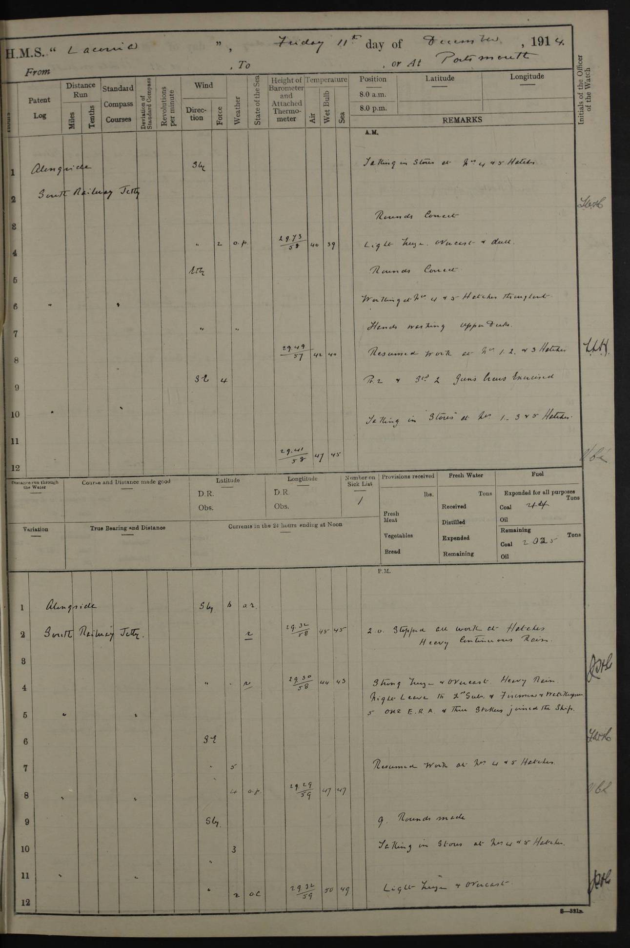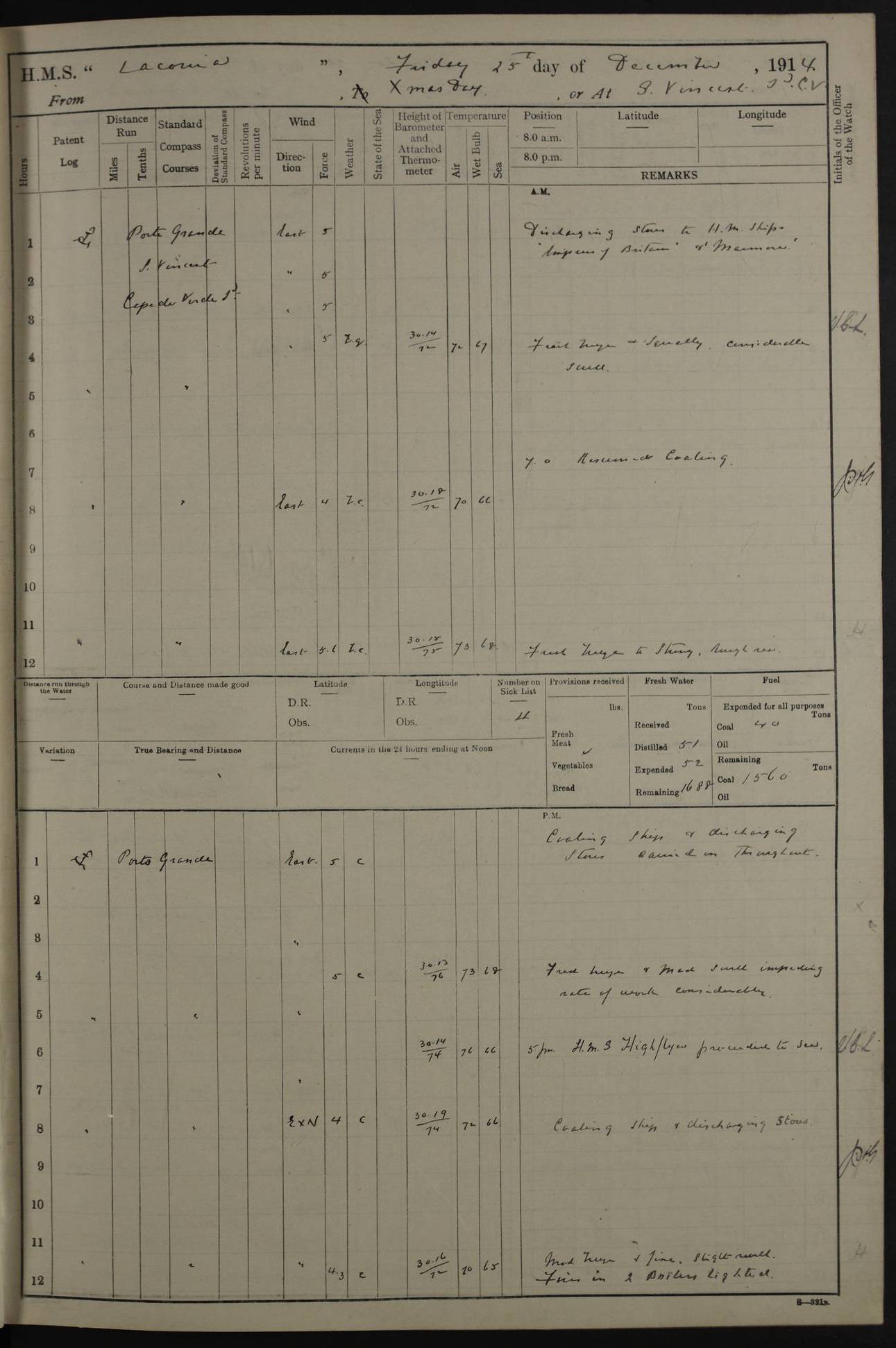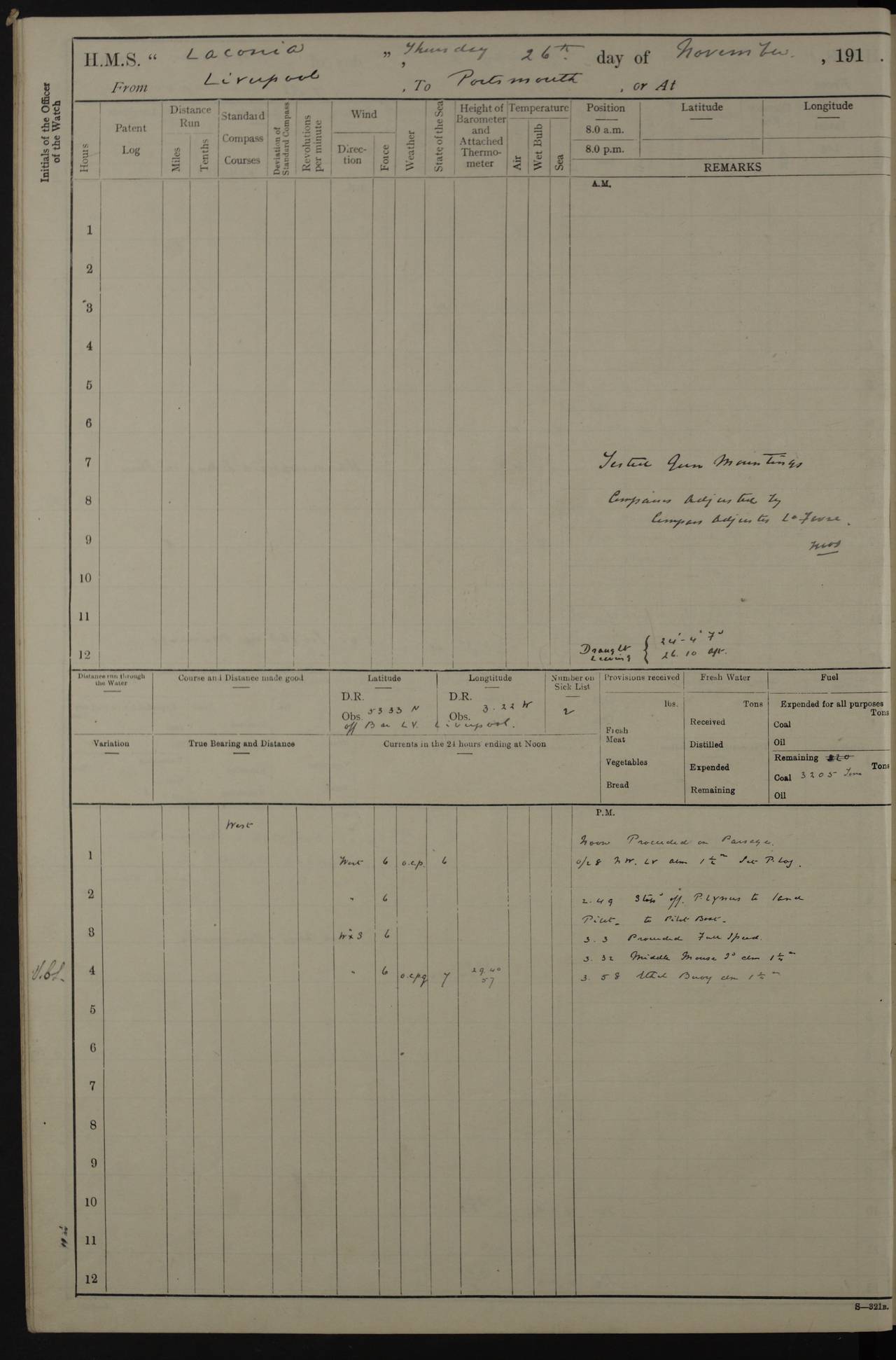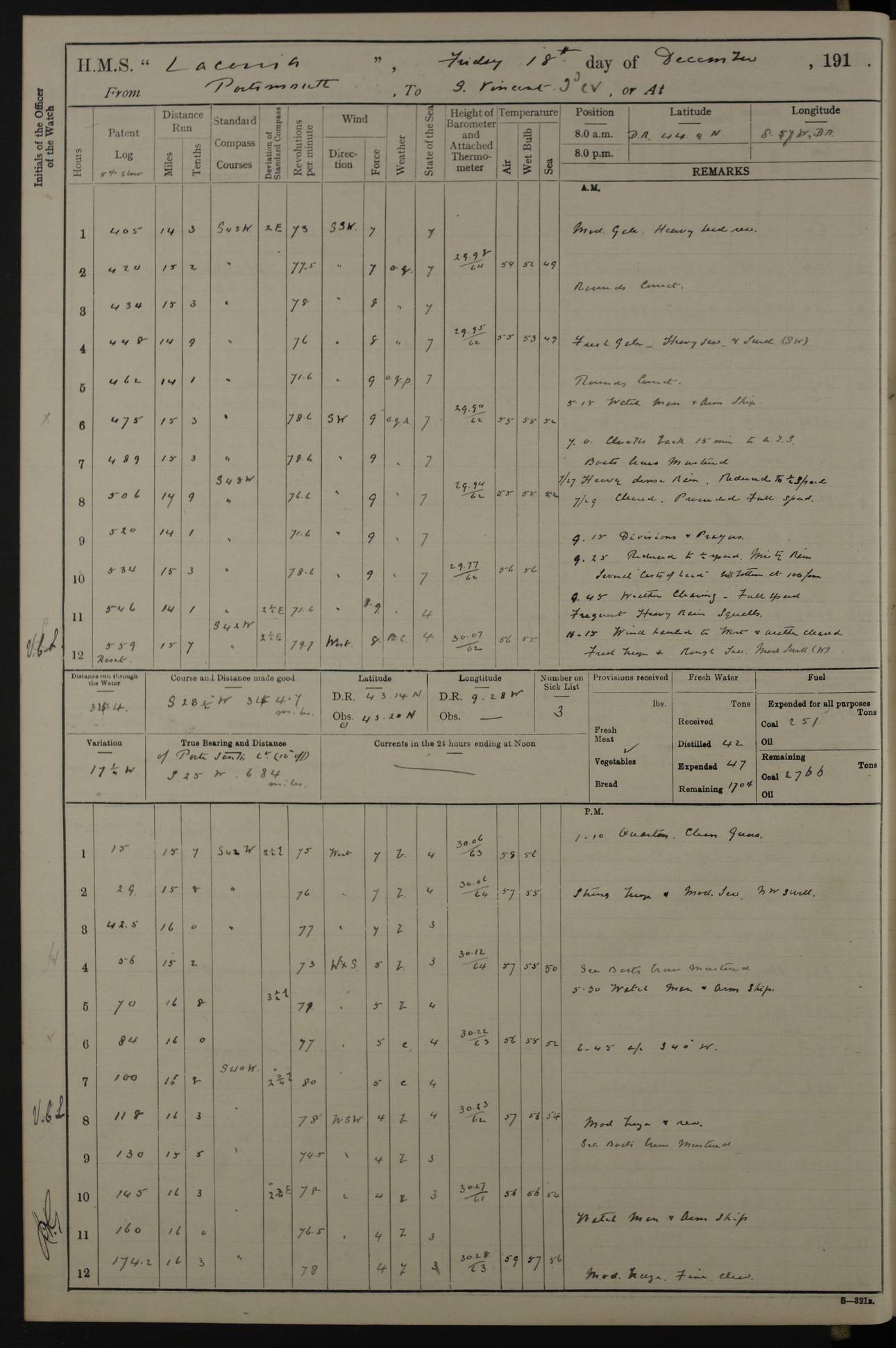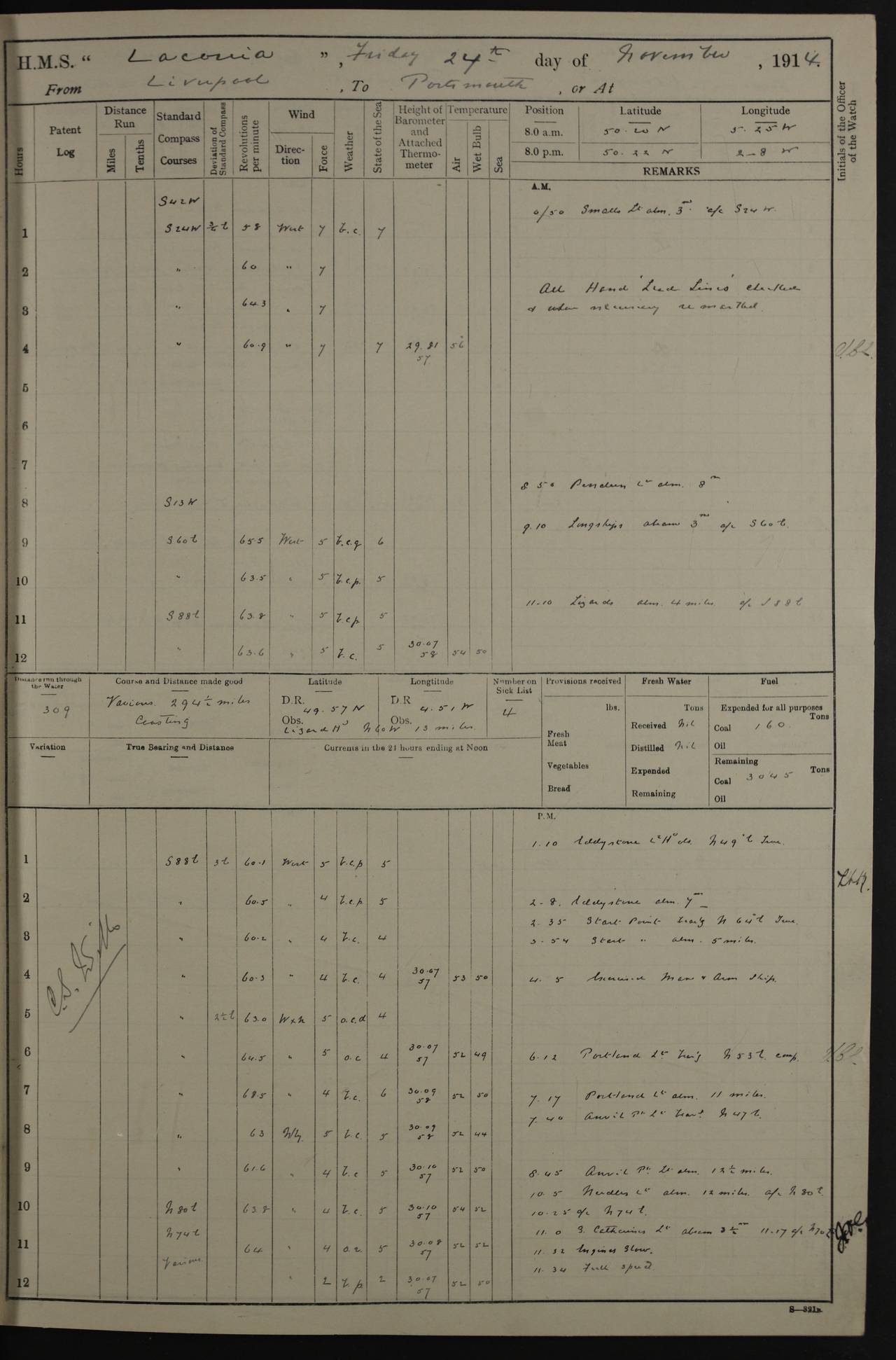 LOGS FOR NOVEMBER 1914 [Liverpool and Portsmouth] 4ef4f6dce53e0a0c910022f7: (https://s3.amazonaws.com:443/oldweather/ADM53-45875/0005_0.jpg) 24 November 1914 Liverpool Lat 53.43, Long -3.0 9.00am: Broke pendant, ship commissioned by Captain CS Wills as armed merchant cruiser with crew from Chatham depôt. 10.30am: Crew employed hoisting in and stowing stores, ammunition, projectiles etc. 1.30pm: Fires lit and engine room telegraph tested. Steering gear examined. 4ef4f6dce53e0a0c910022f8: (https://s3.amazonaws.com:443/oldweather/ADM53-45875/0005_1.jpg) 25 November 1914 Liverpool Lat 53.43, Long -3.0 8.00am: Hands taking in stores. 11.45am: Singled up moorings. 12.50pm: Left berth in Huskisson Dock assisted by three tugs. 1.35pm: Made fast in Sandon Basin. 4ef4f6dde53e0a0c910022f9: (https://s3.amazonaws.com:443/oldweather/ADM53-45875/0006_0.jpg) 26 November 1914 Liverpool and at sea towards Portsmouth Lat 53.55, Long -3.37 8.00am: Tested gun mountings. Compass adjusted by Lt Furse, compass adjuster. Draught on leaving 24’ 42” for’d, 26’ 10” aft. Coal 3,205 tons. Noon: Proceeded on passage. 2.49pm: Dropped pilot to pilot boat off Point Lynas. Proceeded full speed. 3.32pm: Middle Mouse I. abeam, 1.25 miles. Weather: West wind f 6 with squally showers. 4ef4f6dde53e0a0c910022fa: (https://s3.amazonaws.com:443/oldweather/ADM53-45875/0006_1.jpg) 27 November 1914 At sea Lat 49.95, Long -4.85 12.50am: Smalls Lt abeam 3 miles, a/c S24W. 8.00am: Pos. 50º 20’N, 5º 25’W. 9.10am: Longships Lt abeam 3 miles, a/c S60E. 11.10am: Lizard Lt abeam 4 miles, a/c S38E. Noon: Courses & DMG, various 294.5 miles, coasting. 1.10pm: Eddystone Lt bg N49E(t). 2.08pm: Same abeam 7 miles. 2.35pm: Start Pt Lt bg N64E(t) 3.54pm: Same abeam, 5 miles. 6.12pm: Portland Bill Lt bg Lt N53E(m) 7.17pm: Same abeam, 11 miles. 8.00pm: Pos 50º 22’N, 2º 08’W. 10.05pm: Needles Lt bg N80E 11.00pm: St Catherine’s Pt Lt abeam 3.5 miles. 4ef4f6dde53e0a0c910022fb: (https://s3.amazonaws.com:443/oldweather/ADM53-45875/0007_0.jpg) 28 November 1914 At sea to Portsmouth Lat 50.81, Long -1.11 12.46am: Passed Warrior LV and anchored. 7.10am: Weighed, pilot boarded. 7.46am: Anchored, awaiting permission to enter harbour. 8.30am: Weighed and proceeded. 9.15am: Secured alongside South Railway jetty. Drew fires in five boilers, banked fires in remainder. Noon: Courses & DMG, various 164.5 miles to anchorage. 4ef4f6dde53e0a0c910022fc: (https://s3.amazonaws.com:443/oldweather/ADM53-45875/0007_1.jpg) 29 November 1914 Portsmouth Lat 50.81, Long -1.11 9.05am: Commenced loading ammunition. 4ef4f6dee53e0a0c910022fd: (https://s3.amazonaws.com:443/oldweather/ADM53-45875/0008_0.jpg) 30 November 1914 Portsmouth Lat 50.81, Long -1.11 3.25am: Ceased work at No 3 hold, barge unloaded. 9.15am: Commenced loading victualling stores. 10.30am: Resumed loading ammunition. Work continuing throughout the night. LOGS FOR DECEMBER 1914 [Portsmouth, St Vincent and Ascension I.] 4ef4f6dee53e0a0c910022fe: (https://s3.amazonaws.com:443/oldweather/ADM53-45875/0008_1.jpg) 1 December 1914 Portsmouth Lat 50.81, Long -1.11 Receiving ammunition and victualling stores throughout the day and night. Sick list: 5. Weather: Strong winds, W or SW, f 7 at times in the am, f 4 in the pm, with some rain showers, 50º to 55º F. 4ef4f6dfe53e0a0c910022ff: (https://s3.amazonaws.com:443/oldweather/ADM53-45875/0009_0.jpg) 2 December 1914 Portsmouth Lat 50.81, Long -1.11 Hoisting in and stowing naval stores throughout the 24 hours. 4ef4f6dfe53e0a0c91002300: (https://s3.amazonaws.com:443/oldweather/ADM53-45875/0009_1.jpg) 3 December 1914 Portsmouth Lat 50.81, Long -1.11 Continuing to load stores throughout the 24 hours, with breaks for strong weather, SW winds up to f 7 with showers. 4ef4f6e0e53e0a0c91002303: (https://s3.amazonaws.com:443/oldweather/ADM53-45875/0011_0.jpg) 4 December 1914 Portsmouth Lat 50.81, Long -1.11 Taking in stores. 1.40pm: Ceased work at aft hatches owing to bad weather [force 8, squalls and rain]. 11.30pm: Escort with prisoner arrived on board. 4ef4f6e0e53e0a0c91002304: (https://s3.amazonaws.com:443/oldweather/ADM53-45875/0011_1.jpg) 5 December 1914 Portsmouth Lat 50.81, Long -1.11 Taking in stores and ammunition. 4ef4f6e0e53e0a0c91002305: (https://s3.amazonaws.com:443/oldweather/ADM53-45875/0012_0.jpg) 6 December 1914 Portsmouth Lat 50.81, Long -1.11 7.05am: AB Jones brought on board by escort. Taking in stores. 9.30pm: Ceased work for heavy rain. 4ef4f6e0e53e0a0c91002306: (https://s3.amazonaws.com:443/oldweather/ADM53-45875/0012_1.jpg) 7 December 1914 Portsmouth Lat 50.81, Long -1.11 Taking in stores in between rain showers. 9.00am: Exercised S2 and P2 guns. Hands overhauling boats etc. 4ef4f6e1e53e0a0c91002307: (https://s3.amazonaws.com:443/oldweather/ADM53-45875/0013_0.jpg) 8 December 1914 Portsmouth Lat 50.81, Long -1.11 Taking in stores. 9.00am: Gun crews at gun drill and loader exercises. 4ef4f6e1e53e0a0c91002308: (https://s3.amazonaws.com:443/oldweather/ADM53-45875/0013_1.jpg) 9 December 1914 Portsmouth. Lat 50.81, Long -1.11 Taking in stores. 2.00pm: Discharged Lt/Cdr Masson [?] to HMS Pembroke. Lt/Cdr Bowles joined ship. 7.45pm: One Marine from Chatham HQ joined the ship. 10.30pm: Stopped receiving stores and covered hatches owing to heavy rain. 4ef4f6e1e53e0a0c91002309: (https://s3.amazonaws.com:443/oldweather/ADM53-45875/0014_0.jpg) 10 December 1914 Portsmouth Lat 50.81, Long -1.11 Taking in stores. 5.30pm: Guard with prisoner returned from Barracks. 4ef4f6e1e53e0a0c9100230a: (https://s3.amazonaws.com:443/oldweather/ADM53-45875/0014_1.jpg) 11 December 1914 Portsmouth Lat 50.81, Long -1.11 In am: Taking in stores. 2.00pm: Stopped all work at hatches. Heavy continuous rain. 5.00pm: One ERA and three stokers joined ship. 7.00pm: Resumed work. 4ef4f6e2e53e0a0c9100230b: (https://s3.amazonaws.com:443/oldweather/ADM53-45875/0015_0.jpg) 12 December 1914 Portsmouth Lat 50.81, Long -1.11 Taking in stores. Discharging cordite and projectiles. 4ef4f6e2