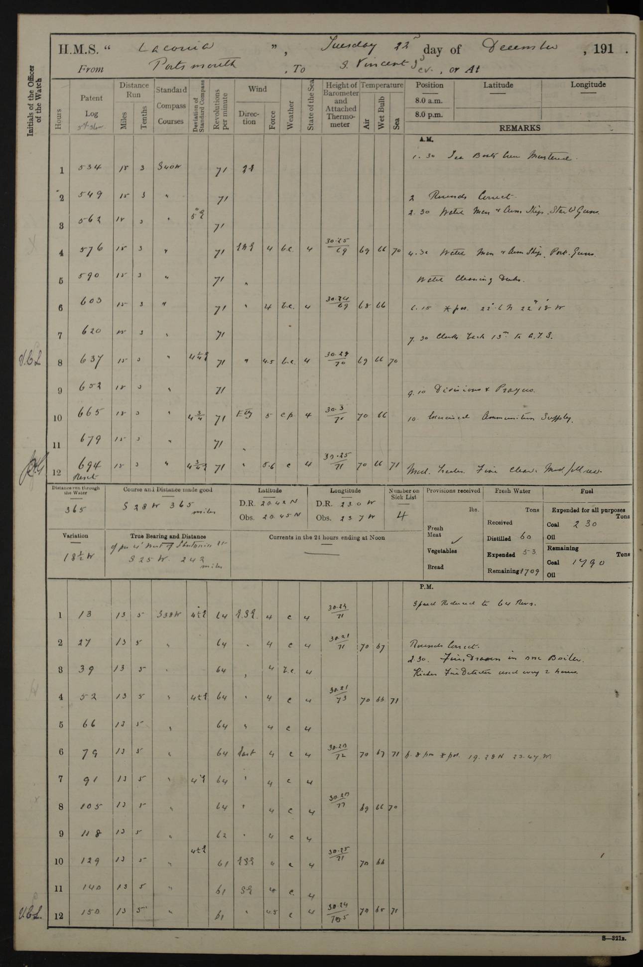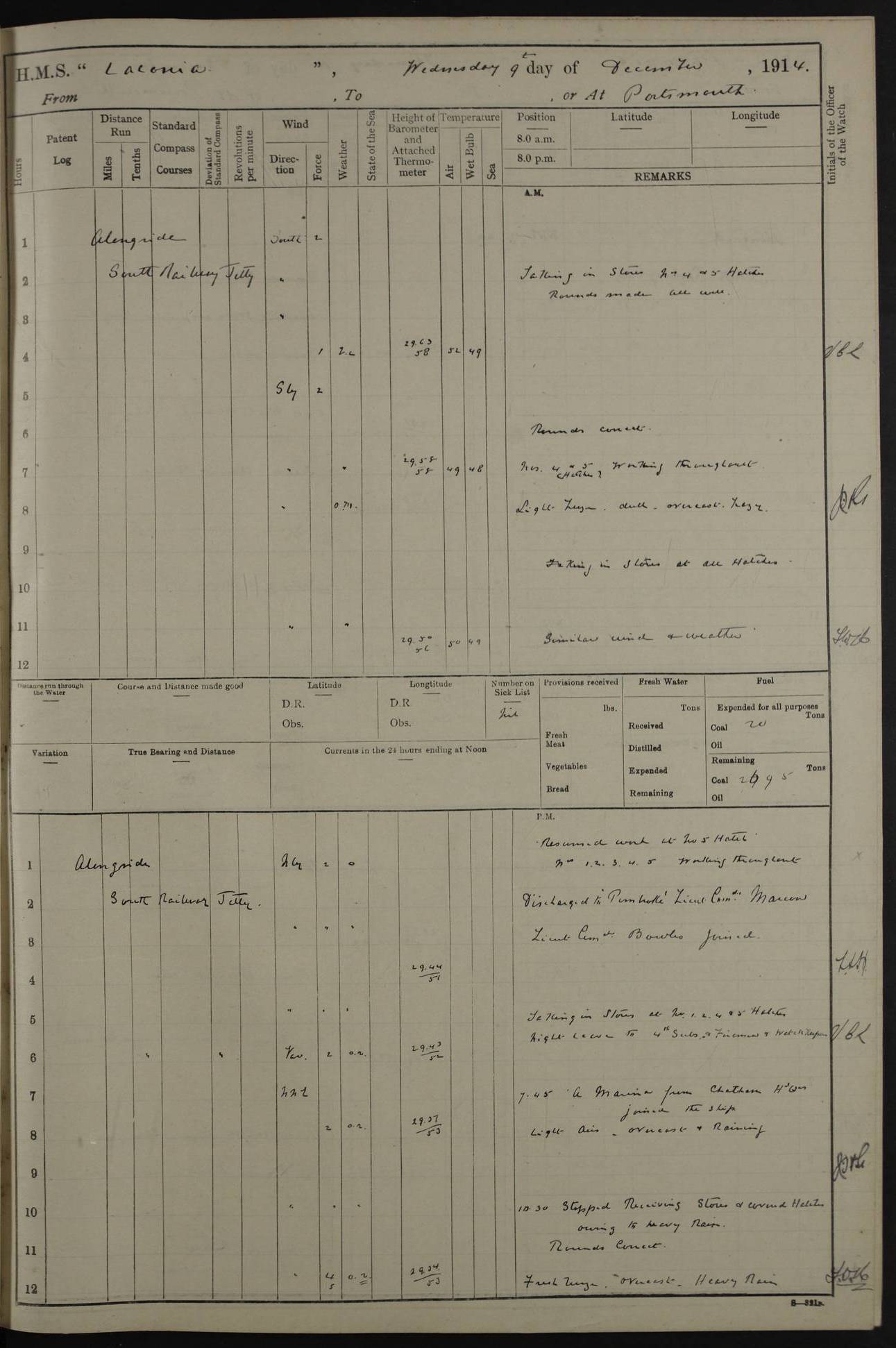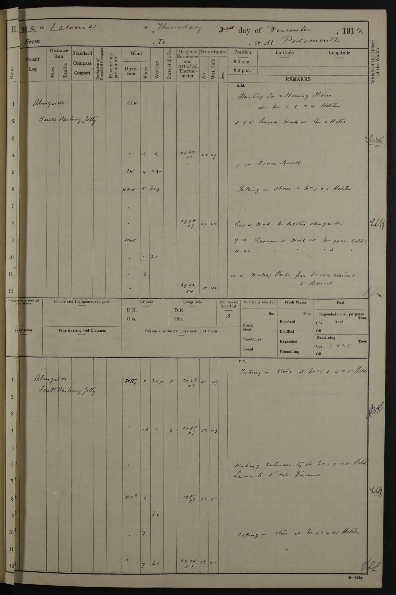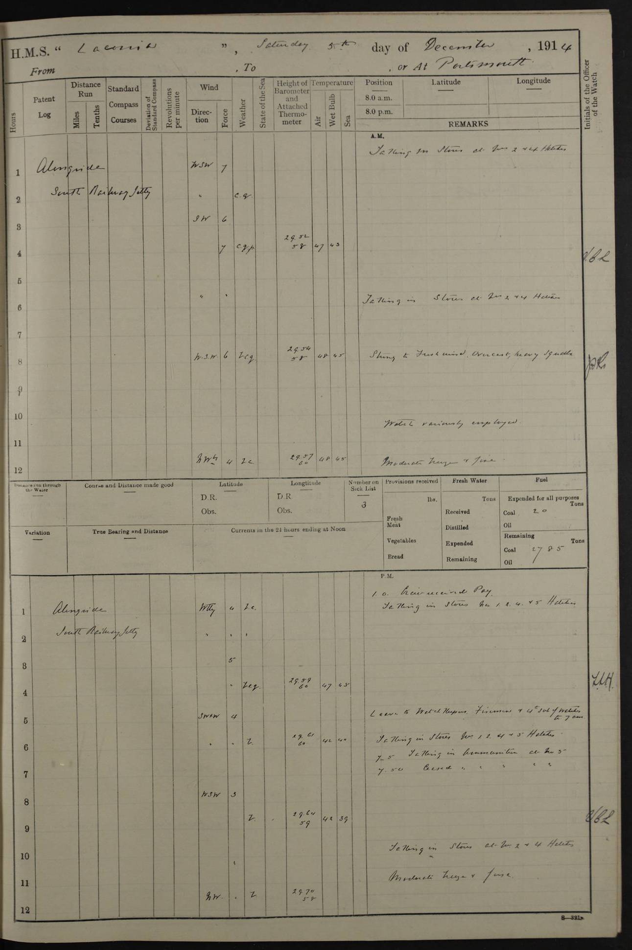 LOGS FOR NOVEMBER 1914 [Liverpool and Portsmouth] 4ef4f6dce53e0a0c910022f7: (https://s3.amazonaws.com:443/oldweather/ADM53-45875/0005_0.jpg) 24 November 1914 Liverpool Lat 53.43, Long -3.0 9.00am: Broke pendant, ship commissioned by Captain CS Wills as armed merchant cruiser with crew from Chatham depôt. 10.30am: Crew employed hoisting in and stowing stores, ammunition, projectiles etc. 1.30pm: Fires lit and engine room telegraph tested. Steering gear examined. 4ef4f6dce53e0a0c910022f8: (https://s3.amazonaws.com:443/oldweather/ADM53-45875/0005_1.jpg) 25 November 1914 Liverpool Lat 53.43, Long -3.0 8.00am: Hands taking in stores. 11.45am: Singled up moorings. 12.50pm: Left berth in Huskisson Dock assisted by three tugs. 1.35pm: Made fast in Sandon Basin. 4ef4f6dde53e0a0c910022f9: (https://s3.amazonaws.com:443/oldweather/ADM53-45875/0006_0.jpg) 26 November 1914 Liverpool and at sea towards Portsmouth Lat 53.55, Long -3.37 8.00am: Tested gun mountings. Compass adjusted by Lt Furse, compass adjuster. Draught on leaving 24’ 42” for’d, 26’ 10” aft. Coal 3,205 tons. Noon: Proceeded on passage. 2.49pm: Dropped pilot to pilot boat off Point Lynas. Proceeded full speed. 3.32pm: Middle Mouse I. abeam, 1.25 miles. Weather: West wind f 6 with squally showers. 4ef4f6dde53e0a0c910022fa: (https://s3.amazonaws.com:443/oldweather/ADM53-45875/0006_1.jpg) 27 November 1914 At sea Lat 49.95, Long -4.85 12.50am: Smalls Lt abeam 3 miles, a/c S24W. 8.00am: Pos. 50º 20’N, 5º 25’W. 9.10am: Longships Lt abeam 3 miles, a/c S60E. 11.10am: Lizard Lt abeam 4 miles, a/c S38E. Noon: Courses & DMG, various 294.5 miles, coasting. 1.10pm: Eddystone Lt bg N49E(t). 2.08pm: Same abeam 7 miles. 2.35pm: Start Pt Lt bg N64E(t) 3.54pm: Same abeam, 5 miles. 6.12pm: Portland Bill Lt bg Lt N53E(m) 7.17pm: Same abeam, 11 miles. 8.00pm: Pos 50º 22’N, 2º 08’W. 10.05pm: Needles Lt bg N80E 11.00pm: St Catherine’s Pt Lt abeam 3.5 miles. 4ef4f6dde53e0a0c910022fb: (https://s3.amazonaws.com:443/oldweather/ADM53-45875/0007_0.jpg) 28 November 1914 At sea to Portsmouth Lat 50.81, Long -1.11 12.46am: Passed Warrior LV and anchored. 7.10am: Weighed, pilot boarded. 7.46am: Anchored, awaiting permission to enter harbour. 8.30am: Weighed and proceeded. 9.15am: Secured alongside South Railway jetty. Drew fires in five boilers, banked fires in remainder. Noon: Courses & DMG, various 164.5 miles to anchorage. 4ef4f6dde53e0a0c910022fc: (https://s3.amazonaws.com:443/oldweather/ADM53-45875/0007_1.jpg) 29 November 1914 Portsmouth Lat 50.81, Long -1.11 9.05am: Commenced loading ammunition. 4ef4f6dee53e0a0c910022fd: (https://s3.amazonaws.com:443/oldweather/ADM53-45875/0008_0.jpg) 30 November 1914 Portsmouth Lat 50.81, Long -1.11 3.25am: Ceased work at No 3 hold, barge unloaded. 9.15am: Commenced loading victualling stores. 10.30am: Resumed loading ammunition. Work continuing throughout the night. LOGS FOR DECEMBER 1914 [Portsmouth, St Vincent and Ascension I.] 4ef4f6dee53e0a0c910022fe: (https://s3.amazonaws.com:443/oldweather/ADM53-45875/0008_1.jpg) 1 December 1914 Portsmouth Lat 50.81, Long -1.11 Receiving ammunition and victualling stores throughout the day and night. Sick list: 5. Weather: Strong winds, W or SW, f 7 at times in the am, f 4 in the pm, with some rain showers, 50º to 55º F. 4ef4f6dfe53e0a0c910022ff: (https://s3.amazonaws.com:443/oldweather/ADM53-45875/0009_0.jpg) 2 December 1914 Portsmouth Lat 50.81, Long -1.11 Hoisting in and stowing naval stores throughout the 24 hours. 4ef4f6dfe53e0a0c91002300: (https://s3.amazonaws.com:443/oldweather/ADM53-45875/0009_1.jpg) 3 December 1914 Portsmouth Lat 50.81, Long -1.11 Continuing to load stores throughout the 24 hours, with breaks for strong weather, SW winds up to f 7 with showers. 4ef4f6e0e53e0a0c91002303: (https://s3.amazonaws.com:443/oldweather/ADM53-45875/0011_0.jpg) 4 December 1914 Portsmouth Lat 50.81, Long -1.11 Taking in stores. 1.40pm: Ceased work at aft hatches owing to bad weather [force 8, squalls and rain]. 11.30pm: Escort with prisoner arrived on board. 4ef4f6e0e53e0a0c91002304: (https://s3.amazonaws.com:443/oldweather/ADM53-45875/0011_1.jpg) 5 December 1914 Portsmouth Lat 50.81, Long -1.11 Taking in stores and ammunition. 4ef4f6e0e53e0a0c91002305: (https://s3.amazonaws.com:443/oldweather/ADM53-45875/0012_0.jpg) 6 December 1914 Portsmouth Lat 50.81, Long -1.11 7.05am: AB Jones brought on board by escort. Taking in stores. 9.30pm: Ceased work for heavy rain. 4ef4f6e0e53e0a0c91002306: (https://s3.amazonaws.com:443/oldweather/ADM53-45875/0012_1.jpg) 7 December 1914 Portsmouth Lat 50.81, Long -1.11 Taking in stores in between rain showers. 9.00am: Exercised S2 and P2 guns. Hands overhauling boats etc. 4ef4f6e1e53e0a0c91002307: (https://s3.amazonaws.com:443/oldweather/ADM53-45875/0013_0.jpg) 8 December 1914 Portsmouth Lat 50.81, Long -1.11 Taking in stores. 9.00am: Gun crews at gun drill and loader exercises. 4ef4f6e1e53e0a0c91002308: (https://s3.amazonaws.com:443/oldweather/ADM53-45875/0013_1.jpg) 9 December 1914 Portsmouth. Lat 50.81, Long -1.11 Taking in stores. 2.00pm: Discharged Lt/Cdr Masson [?] to HMS Pembroke. Lt/Cdr Bowles joined ship. 7.45pm: One Marine from Chatham HQ joined the ship. 10.30pm: Stopped receiving stores and covered hatches owing to heavy rain. 4ef4f6e1e53e0a0c91002309: (https://s3.amazonaws.com:443/oldweather/ADM53-45875/0014_0.jpg) 10 December 1914 Portsmouth Lat 50.81, Long -1.11 Taking in stores. 5.30pm: Guard with prisoner returned from Barracks. 4ef4f6e1e53e0a0c9100230a: (https://s3.amazonaws.com:443/oldweather/ADM53-45875/0014_1.jpg) 11 December 1914 Portsmouth Lat 50.81, Long -1.11 In am: Taking in stores. 2.00pm: Stopped all work at hatches. Heavy continuous rain. 5.00pm: One ERA and three stokers joined ship. 7.00pm: Resumed work. 4ef4f6e2e53e0a0c9100230b: (https://s3.amazonaws.com:443/oldweather/ADM53-45875/0015_0.jpg) 12 December 1914 Portsmouth Lat 50.81, Long -1.11 Taking in stores. Discharging cordite and projectiles. 4ef4f6e2