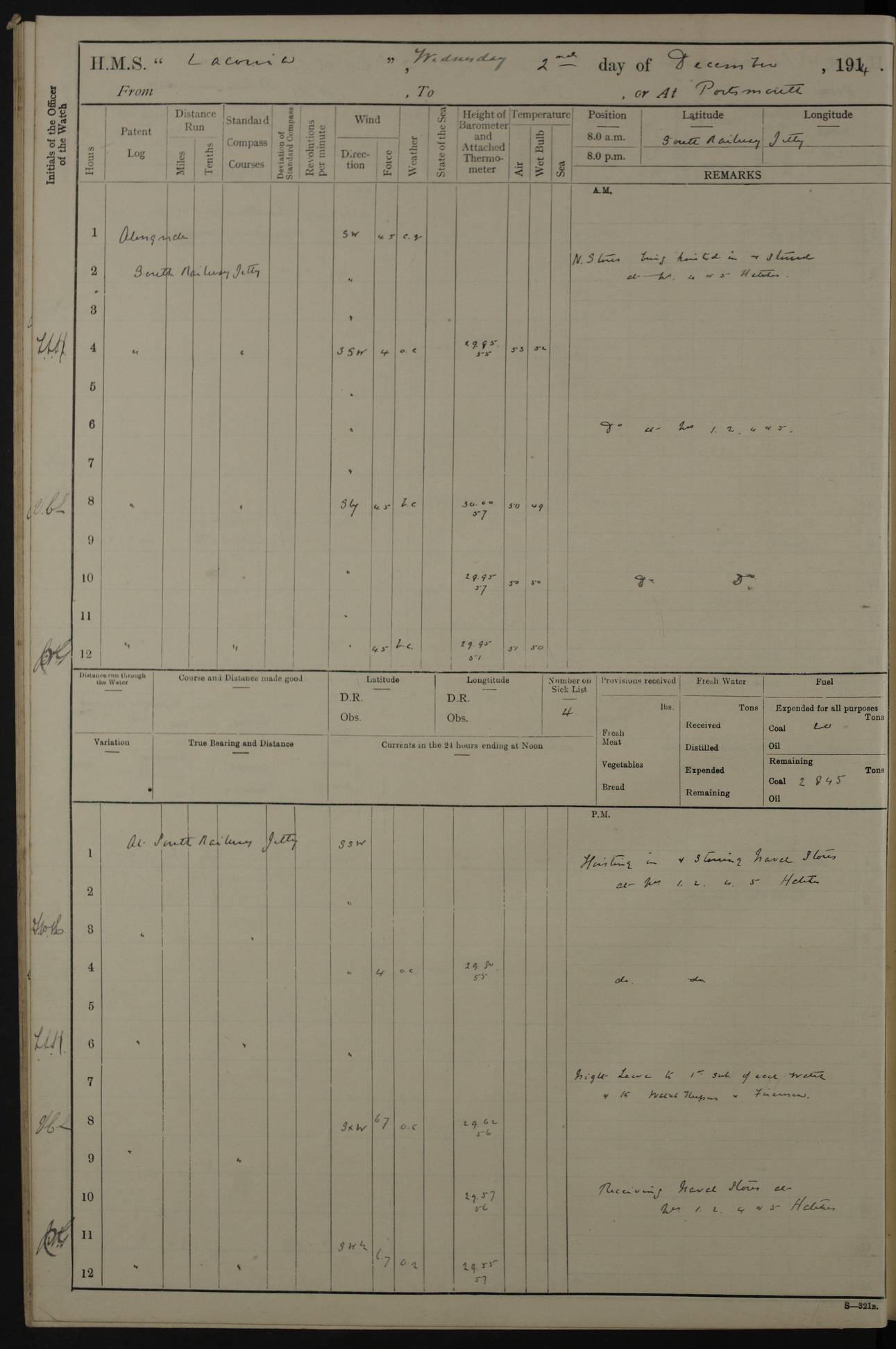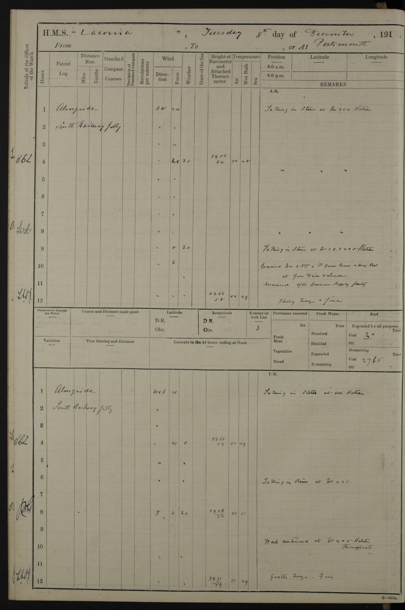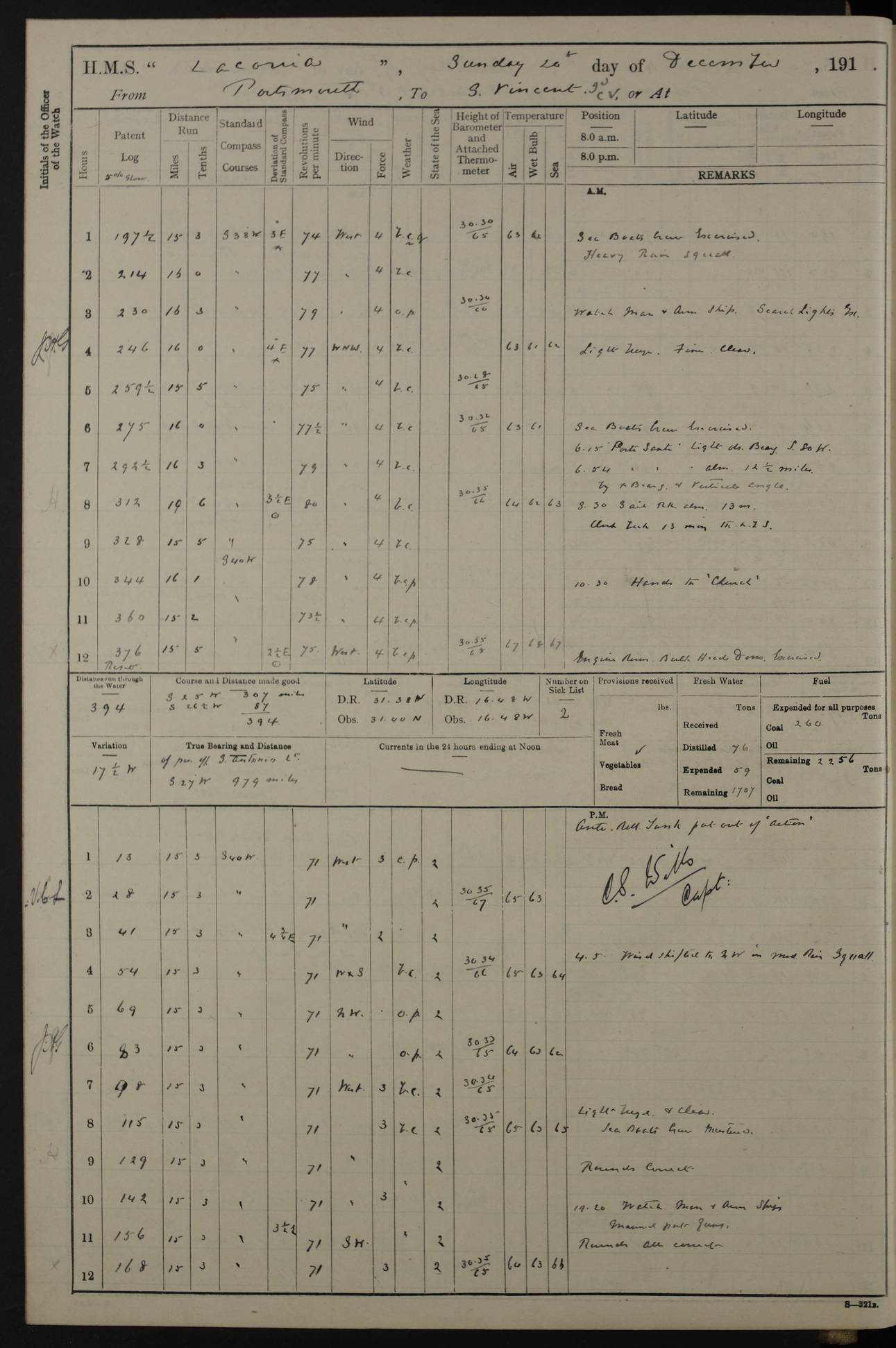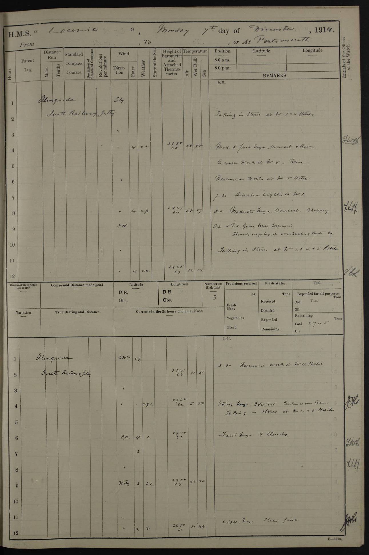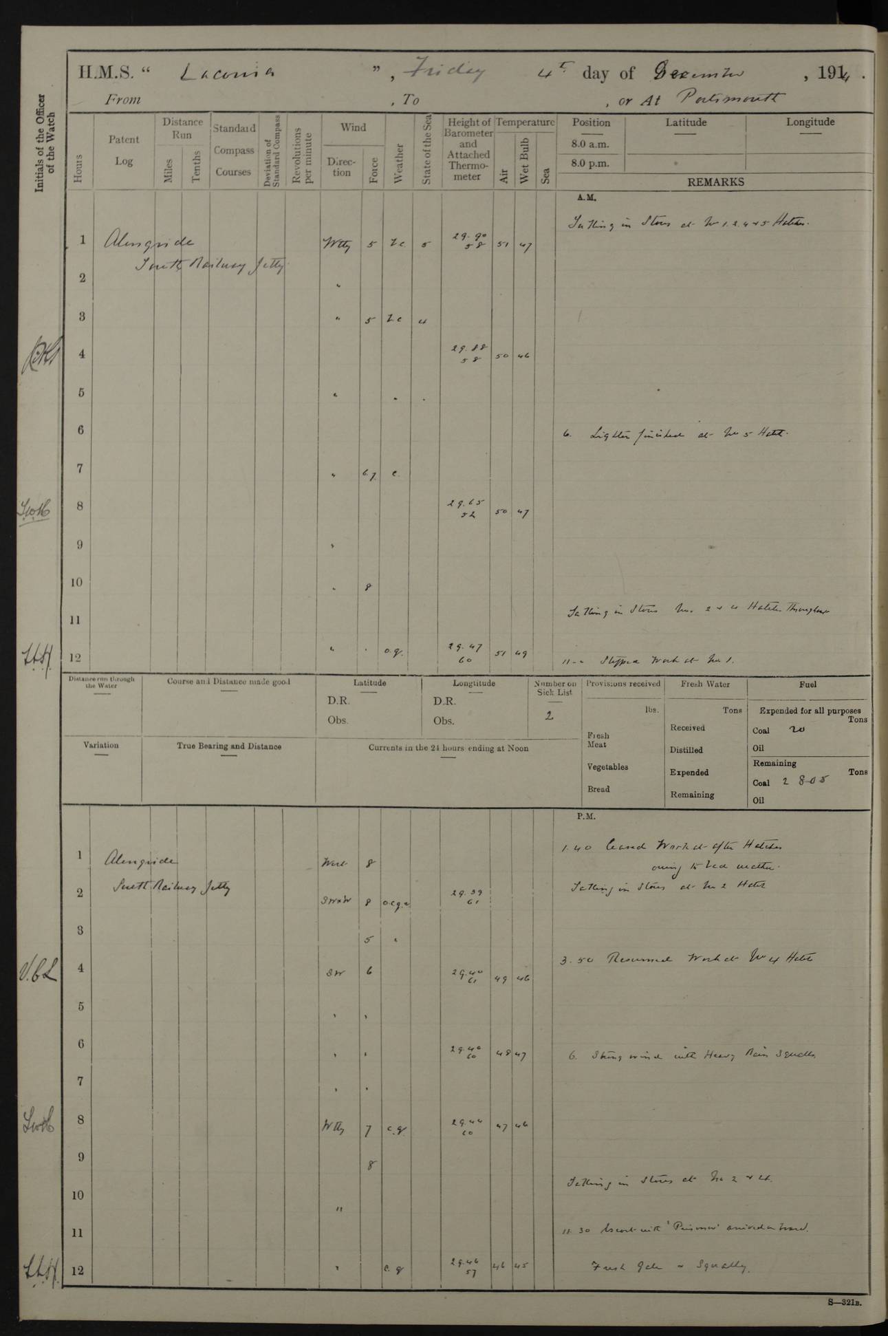 LOGS FOR NOVEMBER 1914 [Liverpool and Portsmouth] 4ef4f6dce53e0a0c910022f7: (https://s3.amazonaws.com:443/oldweather/ADM53-45875/0005_0.jpg) 24 November 1914 Liverpool Lat 53.43, Long -3.0 9.00am: Broke pendant, ship commissioned by Captain CS Wills as armed merchant cruiser with crew from Chatham depôt. 10.30am: Crew employed hoisting in and stowing stores, ammunition, projectiles etc. 1.30pm: Fires lit and engine room telegraph tested. Steering gear examined. 4ef4f6dce53e0a0c910022f8: (https://s3.amazonaws.com:443/oldweather/ADM53-45875/0005_1.jpg) 25 November 1914 Liverpool Lat 53.43, Long -3.0 8.00am: Hands taking in stores. 11.45am: Singled up moorings. 12.50pm: Left berth in Huskisson Dock assisted by three tugs. 1.35pm: Made fast in Sandon Basin. 4ef4f6dde53e0a0c910022f9: (https://s3.amazonaws.com:443/oldweather/ADM53-45875/0006_0.jpg) 26 November 1914 Liverpool and at sea towards Portsmouth Lat 53.55, Long -3.37 8.00am: Tested gun mountings. Compass adjusted by Lt Furse, compass adjuster. Draught on leaving 24’ 42” for’d, 26’ 10” aft. Coal 3,205 tons. Noon: Proceeded on passage. 2.49pm: Dropped pilot to pilot boat off Point Lynas. Proceeded full speed. 3.32pm: Middle Mouse I. abeam, 1.25 miles. Weather: West wind f 6 with squally showers. 4ef4f6dde53e0a0c910022fa: (https://s3.amazonaws.com:443/oldweather/ADM53-45875/0006_1.jpg) 27 November 1914 At sea Lat 49.95, Long -4.85 12.50am: Smalls Lt abeam 3 miles, a/c S24W. 8.00am: Pos. 50º 20’N, 5º 25’W. 9.10am: Longships Lt abeam 3 miles, a/c S60E. 11.10am: Lizard Lt abeam 4 miles, a/c S38E. Noon: Courses & DMG, various 294.5 miles, coasting. 1.10pm: Eddystone Lt bg N49E(t). 2.08pm: Same abeam 7 miles. 2.35pm: Start Pt Lt bg N64E(t) 3.54pm: Same abeam, 5 miles. 6.12pm: Portland Bill Lt bg Lt N53E(m) 7.17pm: Same abeam, 11 miles. 8.00pm: Pos 50º 22’N, 2º 08’W. 10.05pm: Needles Lt bg N80E 11.00pm: St Catherine’s Pt Lt abeam 3.5 miles. 4ef4f6dde53e0a0c910022fb: (https://s3.amazonaws.com:443/oldweather/ADM53-45875/0007_0.jpg) 28 November 1914 At sea to Portsmouth Lat 50.81, Long -1.11 12.46am: Passed Warrior LV and anchored. 7.10am: Weighed, pilot boarded. 7.46am: Anchored, awaiting permission to enter harbour. 8.30am: Weighed and proceeded. 9.15am: Secured alongside South Railway jetty. Drew fires in five boilers, banked fires in remainder. Noon: Courses & DMG, various 164.5 miles to anchorage. 4ef4f6dde53e0a0c910022fc: (https://s3.amazonaws.com:443/oldweather/ADM53-45875/0007_1.jpg) 29 November 1914 Portsmouth Lat 50.81, Long -1.11 9.05am: Commenced loading ammunition. 4ef4f6dee53e0a0c910022fd: (https://s3.amazonaws.com:443/oldweather/ADM53-45875/0008_0.jpg) 30 November 1914 Portsmouth Lat 50.81, Long -1.11 3.25am: Ceased work at No 3 hold, barge unloaded. 9.15am: Commenced loading victualling stores. 10.30am: Resumed loading ammunition. Work continuing throughout the night. LOGS FOR DECEMBER 1914 [Portsmouth, St Vincent and Ascension I.] 4ef4f6dee53e0a0c910022fe: (https://s3.amazonaws.com:443/oldweather/ADM53-45875/0008_1.jpg) 1 December 1914 Portsmouth Lat 50.81, Long -1.11 Receiving ammunition and victualling stores throughout the day and night. Sick list: 5. Weather: Strong winds, W or SW, f 7 at times in the am, f 4 in the pm, with some rain showers, 50º to 55º F. 4ef4f6dfe53e0a0c910022ff: (https://s3.amazonaws.com:443/oldweather/ADM53-45875/0009_0.jpg) 2 December 1914 Portsmouth Lat 50.81, Long -1.11 Hoisting in and stowing naval stores throughout the 24 hours. 4ef4f6dfe53e0a0c91002300: (https://s3.amazonaws.com:443/oldweather/ADM53-45875/0009_1.jpg) 3 December 1914 Portsmouth Lat 50.81, Long -1.11 Continuing to load stores throughout the 24 hours, with breaks for strong weather, SW winds up to f 7 with showers. 4ef4f6e0e53e0a0c91002303: (https://s3.amazonaws.com:443/oldweather/ADM53-45875/0011_0.jpg) 4 December 1914 Portsmouth Lat 50.81, Long -1.11 Taking in stores. 1.40pm: Ceased work at aft hatches owing to bad weather [force 8, squalls and rain]. 11.30pm: Escort with prisoner arrived on board. 4ef4f6e0e53e0a0c91002304: (https://s3.amazonaws.com:443/oldweather/ADM53-45875/0011_1.jpg) 5 December 1914 Portsmouth Lat 50.81, Long -1.11 Taking in stores and ammunition. 4ef4f6e0e53e0a0c91002305: (https://s3.amazonaws.com:443/oldweather/ADM53-45875/0012_0.jpg) 6 December 1914 Portsmouth Lat 50.81, Long -1.11 7.05am: AB Jones brought on board by escort. Taking in stores. 9.30pm: Ceased work for heavy rain. 4ef4f6e0e53e0a0c91002306: (https://s3.amazonaws.com:443/oldweather/ADM53-45875/0012_1.jpg) 7 December 1914 Portsmouth Lat 50.81, Long -1.11 Taking in stores in between rain showers. 9.00am: Exercised S2 and P2 guns. Hands overhauling boats etc. 4ef4f6e1e53e0a0c91002307: (https://s3.amazonaws.com:443/oldweather/ADM53-45875/0013_0.jpg) 8 December 1914 Portsmouth Lat 50.81, Long -1.11 Taking in stores. 9.00am: Gun crews at gun drill and loader exercises. 4ef4f6e1e53e0a0c91002308: (https://s3.amazonaws.com:443/oldweather/ADM53-45875/0013_1.jpg) 9 December 1914 Portsmouth. Lat 50.81, Long -1.11 Taking in stores. 2.00pm: Discharged Lt/Cdr Masson [?] to HMS Pembroke. Lt/Cdr Bowles joined ship. 7.45pm: One Marine from Chatham HQ joined the ship. 10.30pm: Stopped receiving stores and covered hatches owing to heavy rain. 4ef4f6e1e53e0a0c91002309: (https://s3.amazonaws.com:443/oldweather/ADM53-45875/0014_0.jpg) 10 December 1914 Portsmouth Lat 50.81, Long -1.11 Taking in stores. 5.30pm: Guard with prisoner returned from Barracks. 4ef4f6e1e53e0a0c9100230a: (https://s3.amazonaws.com:443/oldweather/ADM53-45875/0014_1.jpg) 11 December 1914 Portsmouth Lat 50.81, Long -1.11 In am: Taking in stores. 2.00pm: Stopped all work at hatches. Heavy continuous rain. 5.00pm: One ERA and three stokers joined ship. 7.00pm: Resumed work. 4ef4f6e2e53e0a0c9100230b: (https://s3.amazonaws.com:443/oldweather/ADM53-45875/0015_0.jpg) 12 December 1914 Portsmouth Lat 50.81, Long -1.11 Taking in stores. Discharging cordite and projectiles. 4ef4f6e2