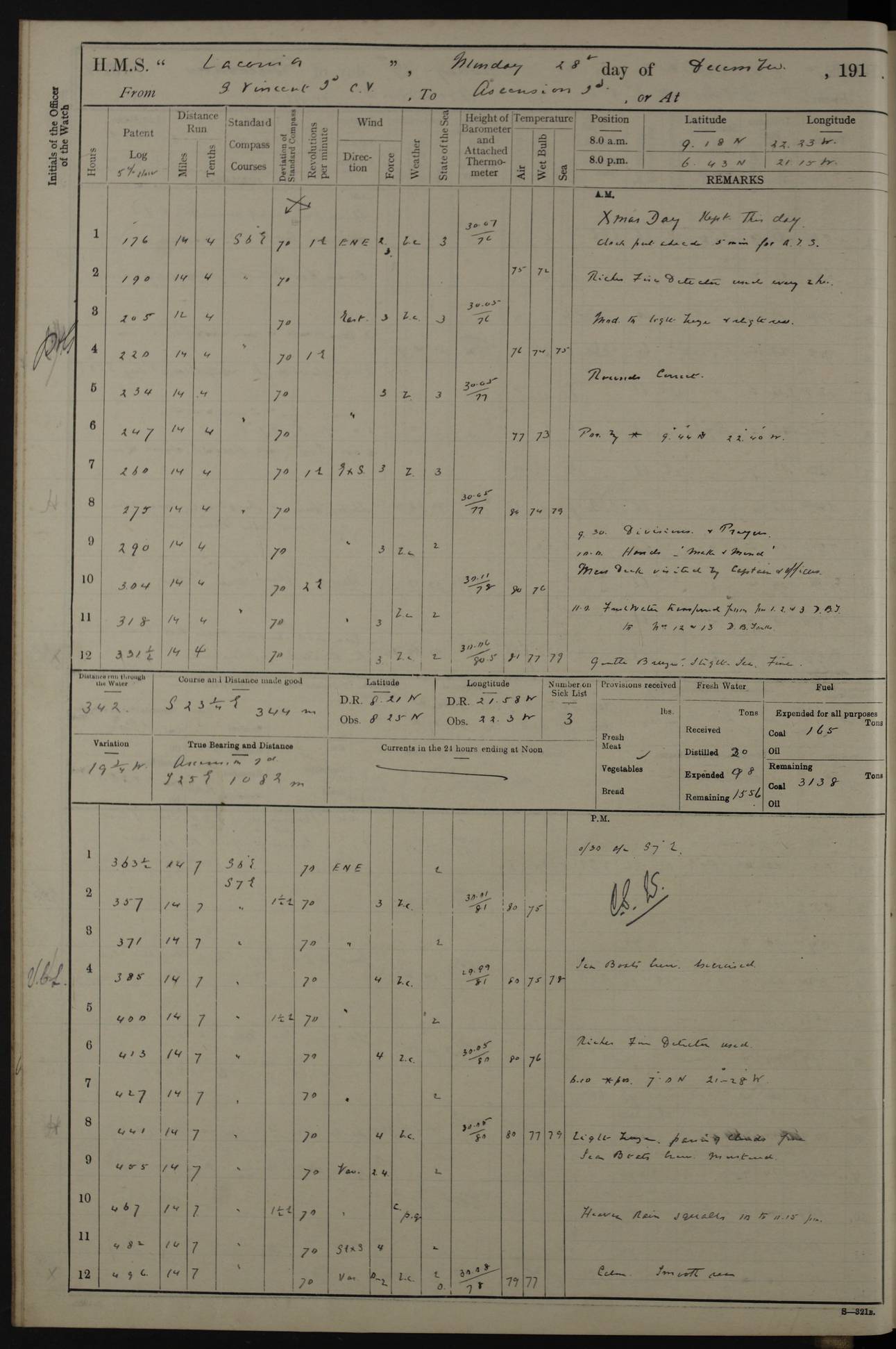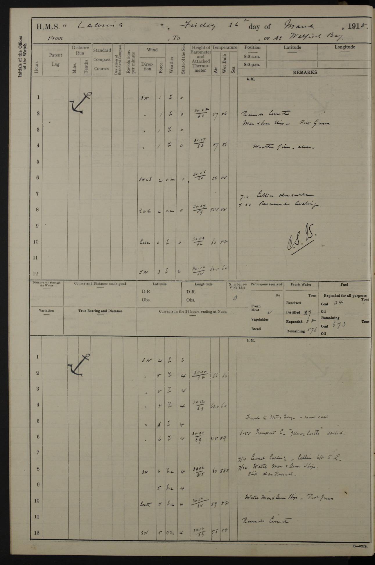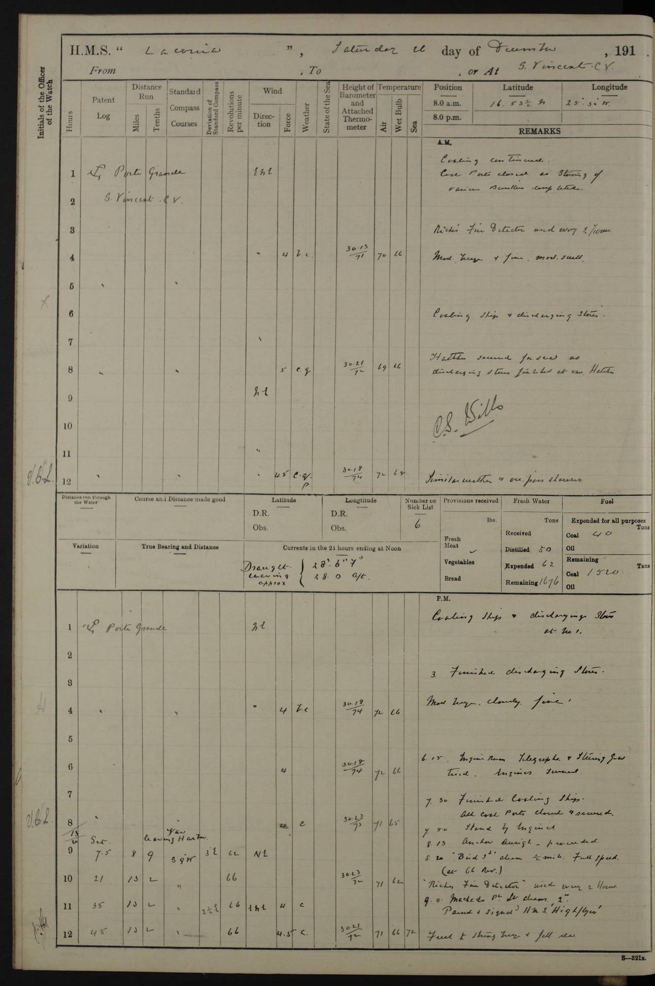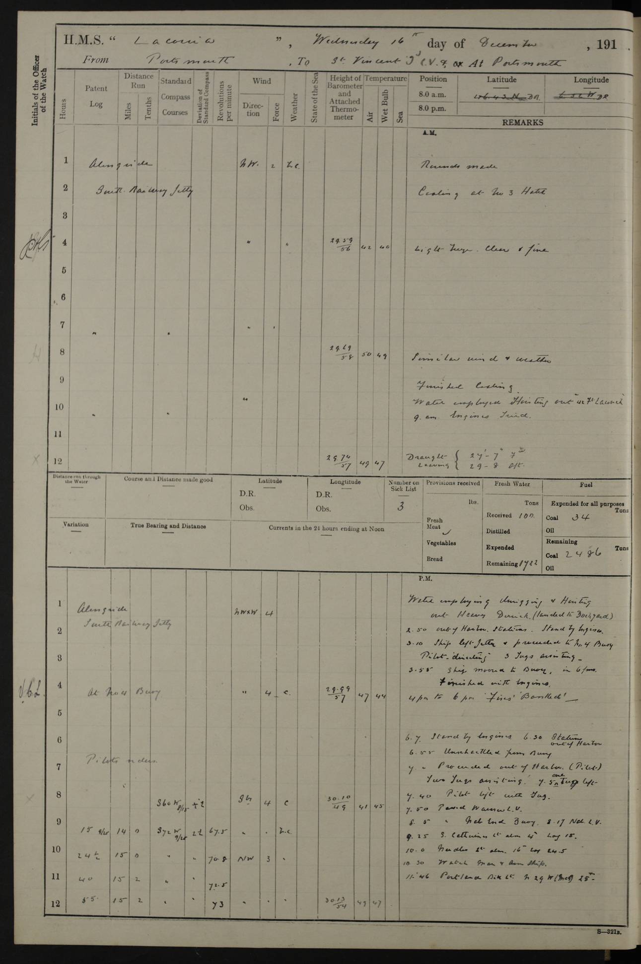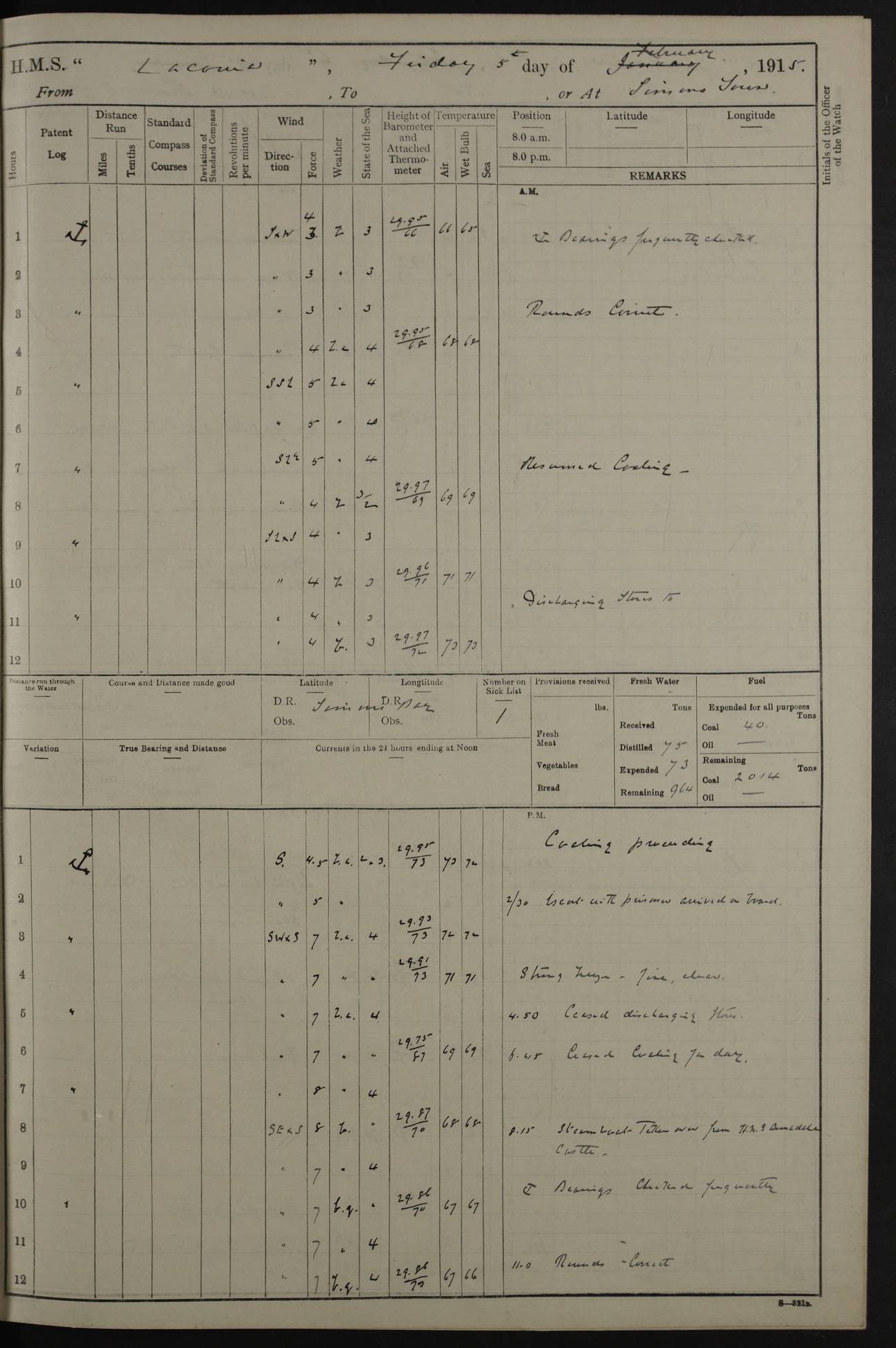 LOGS FOR NOVEMBER 1914 [Liverpool and Portsmouth] 4ef4f6dce53e0a0c910022f7: (https://s3.amazonaws.com:443/oldweather/ADM53-45875/0005_0.jpg) 24 November 1914 Liverpool Lat 53.43, Long -3.0 9.00am: Broke pendant, ship commissioned by Captain CS Wills as armed merchant cruiser with crew from Chatham depôt. 10.30am: Crew employed hoisting in and stowing stores, ammunition, projectiles etc. 1.30pm: Fires lit and engine room telegraph tested. Steering gear examined. 4ef4f6dce53e0a0c910022f8: (https://s3.amazonaws.com:443/oldweather/ADM53-45875/0005_1.jpg) 25 November 1914 Liverpool Lat 53.43, Long -3.0 8.00am: Hands taking in stores. 11.45am: Singled up moorings. 12.50pm: Left berth in Huskisson Dock assisted by three tugs. 1.35pm: Made fast in Sandon Basin. 4ef4f6dde53e0a0c910022f9: (https://s3.amazonaws.com:443/oldweather/ADM53-45875/0006_0.jpg) 26 November 1914 Liverpool and at sea towards Portsmouth Lat 53.55, Long -3.37 8.00am: Tested gun mountings. Compass adjusted by Lt Furse, compass adjuster. Draught on leaving 24’ 42” for’d, 26’ 10” aft. Coal 3,205 tons. Noon: Proceeded on passage. 2.49pm: Dropped pilot to pilot boat off Point Lynas. Proceeded full speed. 3.32pm: Middle Mouse I. abeam, 1.25 miles. Weather: West wind f 6 with squally showers. 4ef4f6dde53e0a0c910022fa: (https://s3.amazonaws.com:443/oldweather/ADM53-45875/0006_1.jpg) 27 November 1914 At sea Lat 49.95, Long -4.85 12.50am: Smalls Lt abeam 3 miles, a/c S24W. 8.00am: Pos. 50º 20’N, 5º 25’W. 9.10am: Longships Lt abeam 3 miles, a/c S60E. 11.10am: Lizard Lt abeam 4 miles, a/c S38E. Noon: Courses & DMG, various 294.5 miles, coasting. 1.10pm: Eddystone Lt bg N49E(t). 2.08pm: Same abeam 7 miles. 2.35pm: Start Pt Lt bg N64E(t) 3.54pm: Same abeam, 5 miles. 6.12pm: Portland Bill Lt bg Lt N53E(m) 7.17pm: Same abeam, 11 miles. 8.00pm: Pos 50º 22’N, 2º 08’W. 10.05pm: Needles Lt bg N80E 11.00pm: St Catherine’s Pt Lt abeam 3.5 miles. 4ef4f6dde53e0a0c910022fb: (https://s3.amazonaws.com:443/oldweather/ADM53-45875/0007_0.jpg) 28 November 1914 At sea to Portsmouth Lat 50.81, Long -1.11 12.46am: Passed Warrior LV and anchored. 7.10am: Weighed, pilot boarded. 7.46am: Anchored, awaiting permission to enter harbour. 8.30am: Weighed and proceeded. 9.15am: Secured alongside South Railway jetty. Drew fires in five boilers, banked fires in remainder. Noon: Courses & DMG, various 164.5 miles to anchorage. 4ef4f6dde53e0a0c910022fc: (https://s3.amazonaws.com:443/oldweather/ADM53-45875/0007_1.jpg) 29 November 1914 Portsmouth Lat 50.81, Long -1.11 9.05am: Commenced loading ammunition. 4ef4f6dee53e0a0c910022fd: (https://s3.amazonaws.com:443/oldweather/ADM53-45875/0008_0.jpg) 30 November 1914 Portsmouth Lat 50.81, Long -1.11 3.25am: Ceased work at No 3 hold, barge unloaded. 9.15am: Commenced loading victualling stores. 10.30am: Resumed loading ammunition. Work continuing throughout the night. LOGS FOR DECEMBER 1914 [Portsmouth, St Vincent and Ascension I.] 4ef4f6dee53e0a0c910022fe: (https://s3.amazonaws.com:443/oldweather/ADM53-45875/0008_1.jpg) 1 December 1914 Portsmouth Lat 50.81, Long -1.11 Receiving ammunition and victualling stores throughout the day and night. Sick list: 5. Weather: Strong winds, W or SW, f 7 at times in the am, f 4 in the pm, with some rain showers, 50º to 55º F. 4ef4f6dfe53e0a0c910022ff: (https://s3.amazonaws.com:443/oldweather/ADM53-45875/0009_0.jpg) 2 December 1914 Portsmouth Lat 50.81, Long -1.11 Hoisting in and stowing naval stores throughout the 24 hours. 4ef4f6dfe53e0a0c91002300: (https://s3.amazonaws.com:443/oldweather/ADM53-45875/0009_1.jpg) 3 December 1914 Portsmouth Lat 50.81, Long -1.11 Continuing to load stores throughout the 24 hours, with breaks for strong weather, SW winds up to f 7 with showers. 4ef4f6e0e53e0a0c91002303: (https://s3.amazonaws.com:443/oldweather/ADM53-45875/0011_0.jpg) 4 December 1914 Portsmouth Lat 50.81, Long -1.11 Taking in stores. 1.40pm: Ceased work at aft hatches owing to bad weather [force 8, squalls and rain]. 11.30pm: Escort with prisoner arrived on board. 4ef4f6e0e53e0a0c91002304: (https://s3.amazonaws.com:443/oldweather/ADM53-45875/0011_1.jpg) 5 December 1914 Portsmouth Lat 50.81, Long -1.11 Taking in stores and ammunition. 4ef4f6e0e53e0a0c91002305: (https://s3.amazonaws.com:443/oldweather/ADM53-45875/0012_0.jpg) 6 December 1914 Portsmouth Lat 50.81, Long -1.11 7.05am: AB Jones brought on board by escort. Taking in stores. 9.30pm: Ceased work for heavy rain. 4ef4f6e0e53e0a0c91002306: (https://s3.amazonaws.com:443/oldweather/ADM53-45875/0012_1.jpg) 7 December 1914 Portsmouth Lat 50.81, Long -1.11 Taking in stores in between rain showers. 9.00am: Exercised S2 and P2 guns. Hands overhauling boats etc. 4ef4f6e1e53e0a0c91002307: (https://s3.amazonaws.com:443/oldweather/ADM53-45875/0013_0.jpg) 8 December 1914 Portsmouth Lat 50.81, Long -1.11 Taking in stores. 9.00am: Gun crews at gun drill and loader exercises. 4ef4f6e1e53e0a0c91002308: (https://s3.amazonaws.com:443/oldweather/ADM53-45875/0013_1.jpg) 9 December 1914 Portsmouth. Lat 50.81, Long -1.11 Taking in stores. 2.00pm: Discharged Lt/Cdr Masson [?] to HMS Pembroke. Lt/Cdr Bowles joined ship. 7.45pm: One Marine from Chatham HQ joined the ship. 10.30pm: Stopped receiving stores and covered hatches owing to heavy rain. 4ef4f6e1e53e0a0c91002309: (https://s3.amazonaws.com:443/oldweather/ADM53-45875/0014_0.jpg) 10 December 1914 Portsmouth Lat 50.81, Long -1.11 Taking in stores. 5.30pm: Guard with prisoner returned from Barracks. 4ef4f6e1e53e0a0c9100230a: (https://s3.amazonaws.com:443/oldweather/ADM53-45875/0014_1.jpg) 11 December 1914 Portsmouth Lat 50.81, Long -1.11 In am: Taking in stores. 2.00pm: Stopped all work at hatches. Heavy continuous rain. 5.00pm: One ERA and three stokers joined ship. 7.00pm: Resumed work. 4ef4f6e2e53e0a0c9100230b: (https://s3.amazonaws.com:443/oldweather/ADM53-45875/0015_0.jpg) 12 December 1914 Portsmouth Lat 50.81, Long -1.11 Taking in stores. Discharging cordite and projectiles. 4ef4f6e2