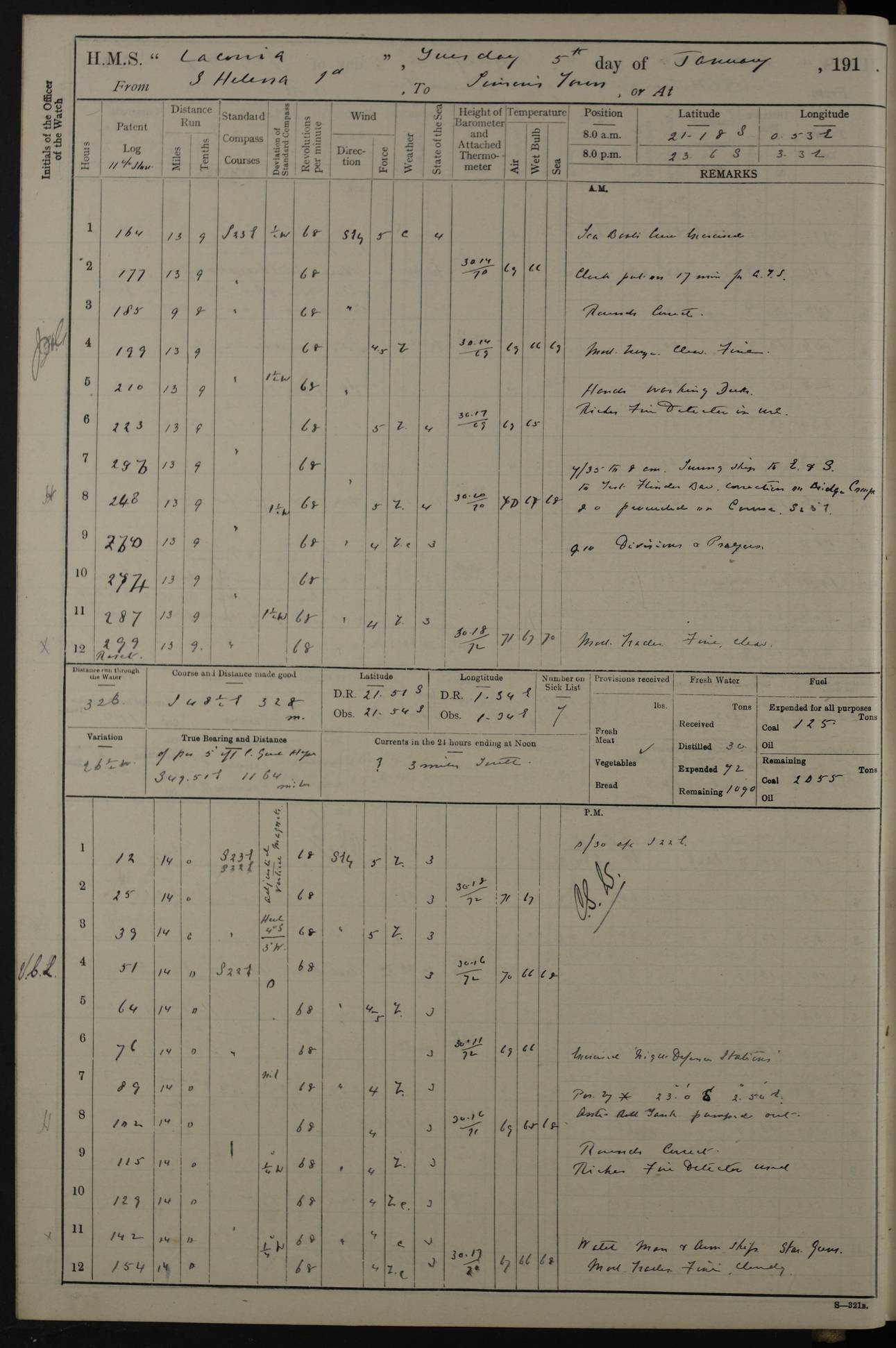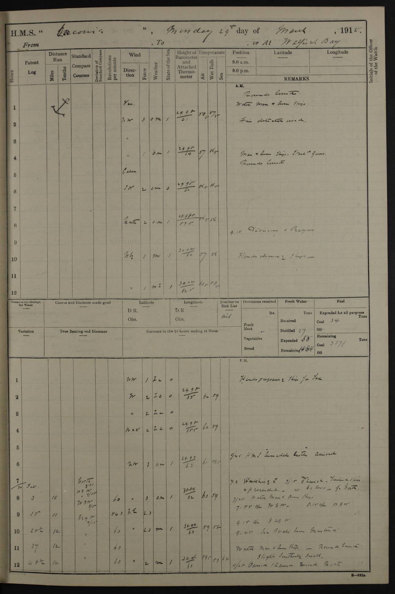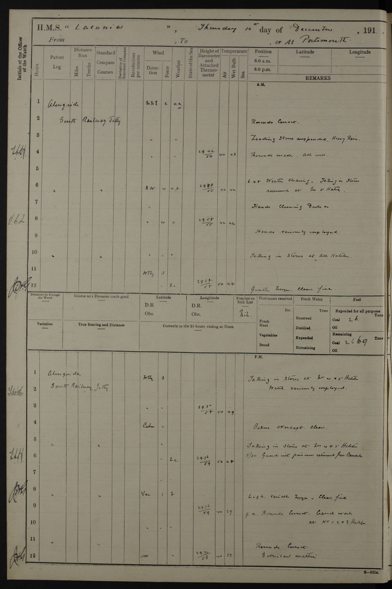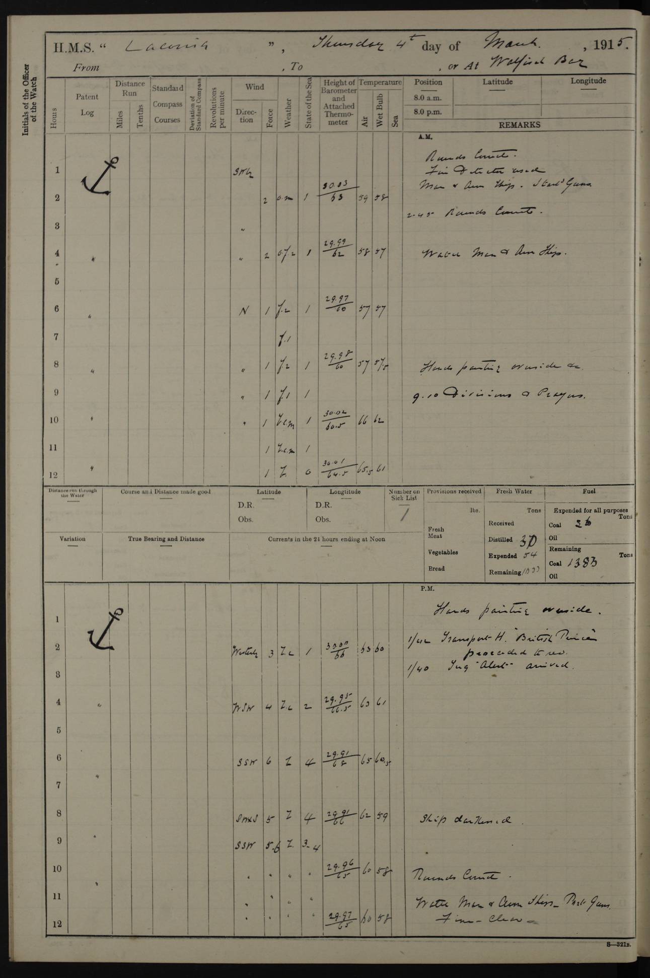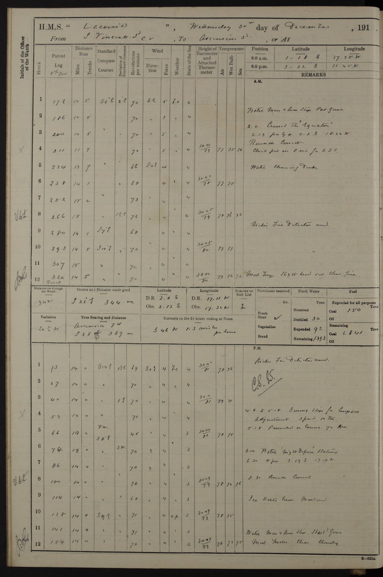 LOGS FOR NOVEMBER 1914 [Liverpool and Portsmouth] 4ef4f6dce53e0a0c910022f7: (https://s3.amazonaws.com:443/oldweather/ADM53-45875/0005_0.jpg) 24 November 1914 Liverpool Lat 53.43, Long -3.0 9.00am: Broke pendant, ship commissioned by Captain CS Wills as armed merchant cruiser with crew from Chatham depôt. 10.30am: Crew employed hoisting in and stowing stores, ammunition, projectiles etc. 1.30pm: Fires lit and engine room telegraph tested. Steering gear examined. 4ef4f6dce53e0a0c910022f8: (https://s3.amazonaws.com:443/oldweather/ADM53-45875/0005_1.jpg) 25 November 1914 Liverpool Lat 53.43, Long -3.0 8.00am: Hands taking in stores. 11.45am: Singled up moorings. 12.50pm: Left berth in Huskisson Dock assisted by three tugs. 1.35pm: Made fast in Sandon Basin. 4ef4f6dde53e0a0c910022f9: (https://s3.amazonaws.com:443/oldweather/ADM53-45875/0006_0.jpg) 26 November 1914 Liverpool and at sea towards Portsmouth Lat 53.55, Long -3.37 8.00am: Tested gun mountings. Compass adjusted by Lt Furse, compass adjuster. Draught on leaving 24’ 42” for’d, 26’ 10” aft. Coal 3,205 tons. Noon: Proceeded on passage. 2.49pm: Dropped pilot to pilot boat off Point Lynas. Proceeded full speed. 3.32pm: Middle Mouse I. abeam, 1.25 miles. Weather: West wind f 6 with squally showers. 4ef4f6dde53e0a0c910022fa: (https://s3.amazonaws.com:443/oldweather/ADM53-45875/0006_1.jpg) 27 November 1914 At sea Lat 49.95, Long -4.85 12.50am: Smalls Lt abeam 3 miles, a/c S24W. 8.00am: Pos. 50º 20’N, 5º 25’W. 9.10am: Longships Lt abeam 3 miles, a/c S60E. 11.10am: Lizard Lt abeam 4 miles, a/c S38E. Noon: Courses & DMG, various 294.5 miles, coasting. 1.10pm: Eddystone Lt bg N49E(t). 2.08pm: Same abeam 7 miles. 2.35pm: Start Pt Lt bg N64E(t) 3.54pm: Same abeam, 5 miles. 6.12pm: Portland Bill Lt bg Lt N53E(m) 7.17pm: Same abeam, 11 miles. 8.00pm: Pos 50º 22’N, 2º 08’W. 10.05pm: Needles Lt bg N80E 11.00pm: St Catherine’s Pt Lt abeam 3.5 miles. 4ef4f6dde53e0a0c910022fb: (https://s3.amazonaws.com:443/oldweather/ADM53-45875/0007_0.jpg) 28 November 1914 At sea to Portsmouth Lat 50.81, Long -1.11 12.46am: Passed Warrior LV and anchored. 7.10am: Weighed, pilot boarded. 7.46am: Anchored, awaiting permission to enter harbour. 8.30am: Weighed and proceeded. 9.15am: Secured alongside South Railway jetty. Drew fires in five boilers, banked fires in remainder. Noon: Courses & DMG, various 164.5 miles to anchorage. 4ef4f6dde53e0a0c910022fc: (https://s3.amazonaws.com:443/oldweather/ADM53-45875/0007_1.jpg) 29 November 1914 Portsmouth Lat 50.81, Long -1.11 9.05am: Commenced loading ammunition. 4ef4f6dee53e0a0c910022fd: (https://s3.amazonaws.com:443/oldweather/ADM53-45875/0008_0.jpg) 30 November 1914 Portsmouth Lat 50.81, Long -1.11 3.25am: Ceased work at No 3 hold, barge unloaded. 9.15am: Commenced loading victualling stores. 10.30am: Resumed loading ammunition. Work continuing throughout the night. LOGS FOR DECEMBER 1914 [Portsmouth, St Vincent and Ascension I.] 4ef4f6dee53e0a0c910022fe: (https://s3.amazonaws.com:443/oldweather/ADM53-45875/0008_1.jpg) 1 December 1914 Portsmouth Lat 50.81, Long -1.11 Receiving ammunition and victualling stores throughout the day and night. Sick list: 5. Weather: Strong winds, W or SW, f 7 at times in the am, f 4 in the pm, with some rain showers, 50º to 55º F. 4ef4f6dfe53e0a0c910022ff: (https://s3.amazonaws.com:443/oldweather/ADM53-45875/0009_0.jpg) 2 December 1914 Portsmouth Lat 50.81, Long -1.11 Hoisting in and stowing naval stores throughout the 24 hours. 4ef4f6dfe53e0a0c91002300: (https://s3.amazonaws.com:443/oldweather/ADM53-45875/0009_1.jpg) 3 December 1914 Portsmouth Lat 50.81, Long -1.11 Continuing to load stores throughout the 24 hours, with breaks for strong weather, SW winds up to f 7 with showers. 4ef4f6e0e53e0a0c91002303: (https://s3.amazonaws.com:443/oldweather/ADM53-45875/0011_0.jpg) 4 December 1914 Portsmouth Lat 50.81, Long -1.11 Taking in stores. 1.40pm: Ceased work at aft hatches owing to bad weather [force 8, squalls and rain]. 11.30pm: Escort with prisoner arrived on board. 4ef4f6e0e53e0a0c91002304: (https://s3.amazonaws.com:443/oldweather/ADM53-45875/0011_1.jpg) 5 December 1914 Portsmouth Lat 50.81, Long -1.11 Taking in stores and ammunition. 4ef4f6e0e53e0a0c91002305: (https://s3.amazonaws.com:443/oldweather/ADM53-45875/0012_0.jpg) 6 December 1914 Portsmouth Lat 50.81, Long -1.11 7.05am: AB Jones brought on board by escort. Taking in stores. 9.30pm: Ceased work for heavy rain. 4ef4f6e0e53e0a0c91002306: (https://s3.amazonaws.com:443/oldweather/ADM53-45875/0012_1.jpg) 7 December 1914 Portsmouth Lat 50.81, Long -1.11 Taking in stores in between rain showers. 9.00am: Exercised S2 and P2 guns. Hands overhauling boats etc. 4ef4f6e1e53e0a0c91002307: (https://s3.amazonaws.com:443/oldweather/ADM53-45875/0013_0.jpg) 8 December 1914 Portsmouth Lat 50.81, Long -1.11 Taking in stores. 9.00am: Gun crews at gun drill and loader exercises. 4ef4f6e1e53e0a0c91002308: (https://s3.amazonaws.com:443/oldweather/ADM53-45875/0013_1.jpg) 9 December 1914 Portsmouth. Lat 50.81, Long -1.11 Taking in stores. 2.00pm: Discharged Lt/Cdr Masson [?] to HMS Pembroke. Lt/Cdr Bowles joined ship. 7.45pm: One Marine from Chatham HQ joined the ship. 10.30pm: Stopped receiving stores and covered hatches owing to heavy rain. 4ef4f6e1e53e0a0c91002309: (https://s3.amazonaws.com:443/oldweather/ADM53-45875/0014_0.jpg) 10 December 1914 Portsmouth Lat 50.81, Long -1.11 Taking in stores. 5.30pm: Guard with prisoner returned from Barracks. 4ef4f6e1e53e0a0c9100230a: (https://s3.amazonaws.com:443/oldweather/ADM53-45875/0014_1.jpg) 11 December 1914 Portsmouth Lat 50.81, Long -1.11 In am: Taking in stores. 2.00pm: Stopped all work at hatches. Heavy continuous rain. 5.00pm: One ERA and three stokers joined ship. 7.00pm: Resumed work. 4ef4f6e2e53e0a0c9100230b: (https://s3.amazonaws.com:443/oldweather/ADM53-45875/0015_0.jpg) 12 December 1914 Portsmouth Lat 50.81, Long -1.11 Taking in stores. Discharging cordite and projectiles. 4ef4f6e2
