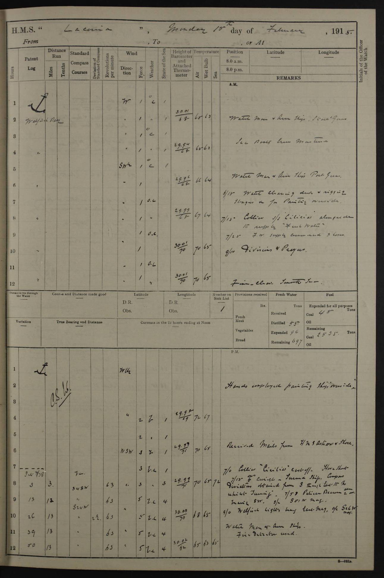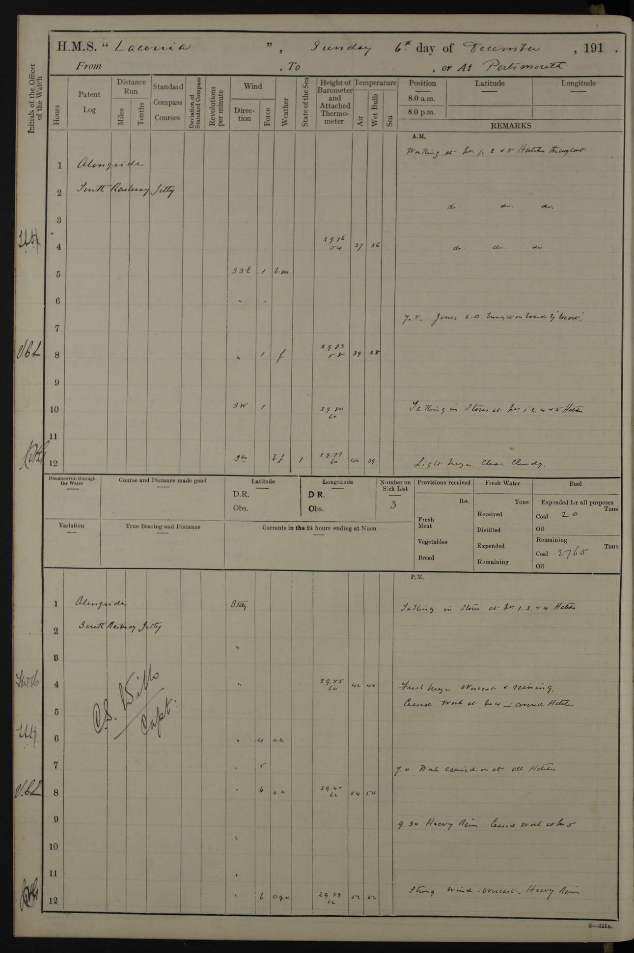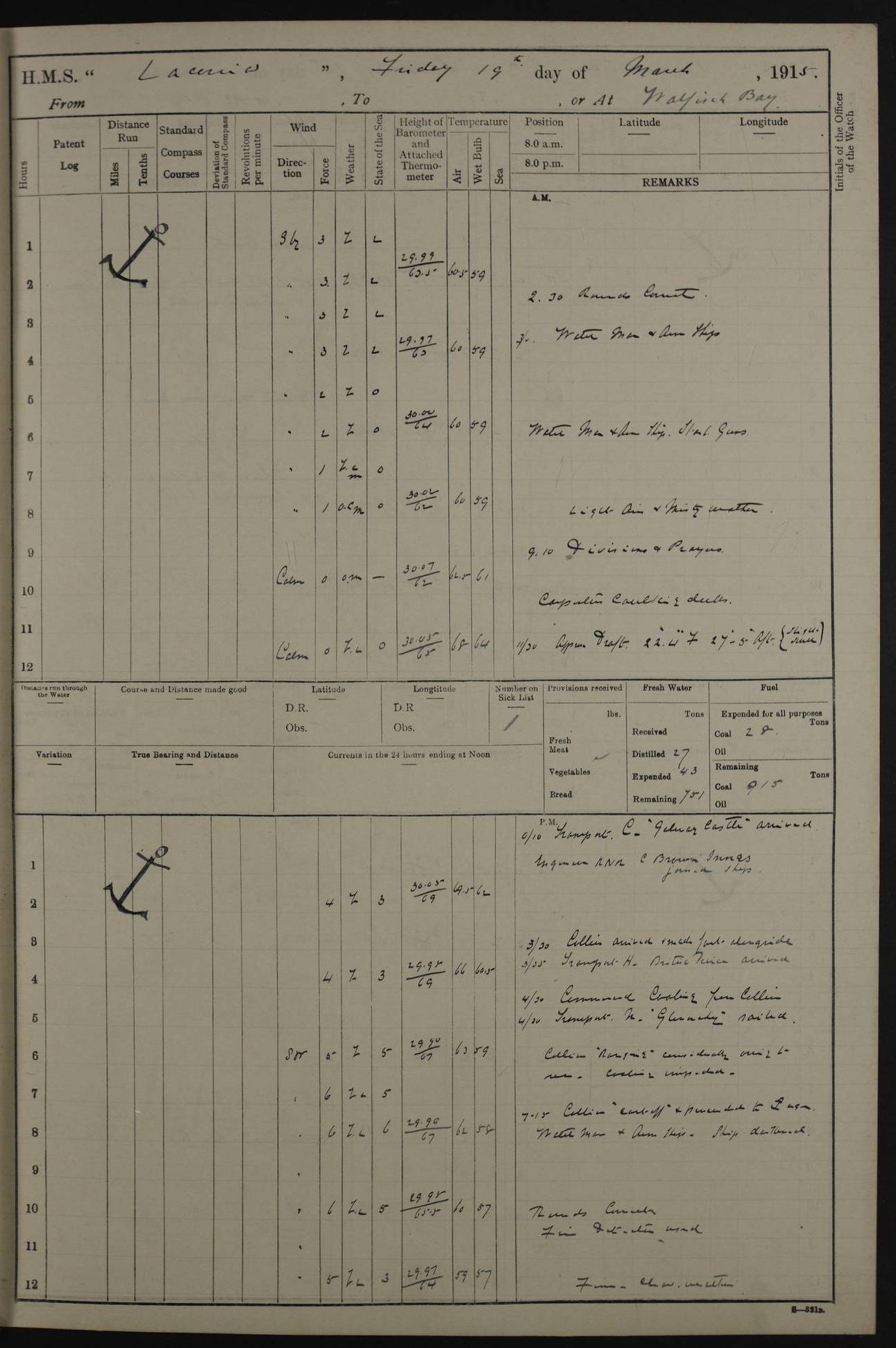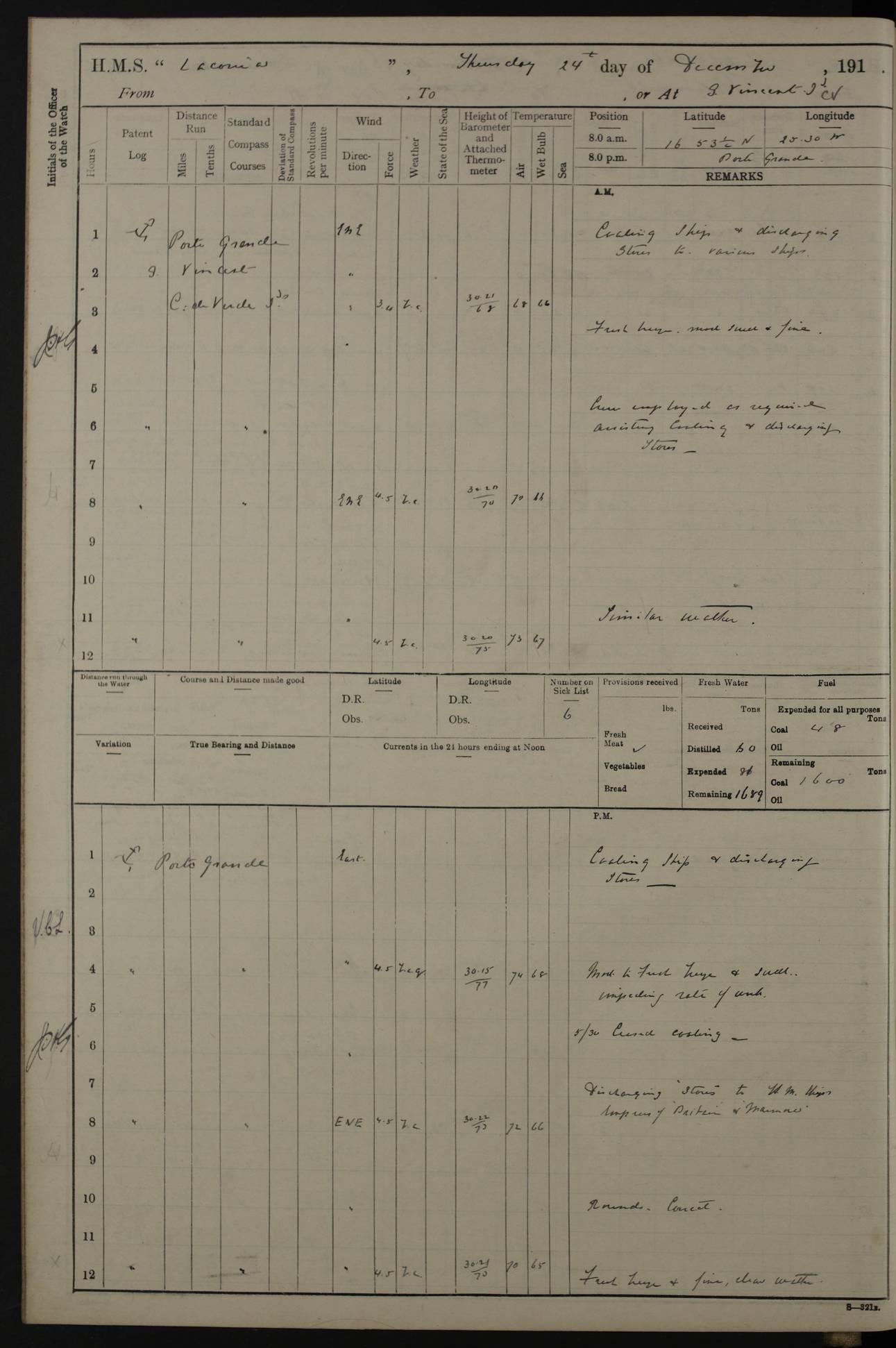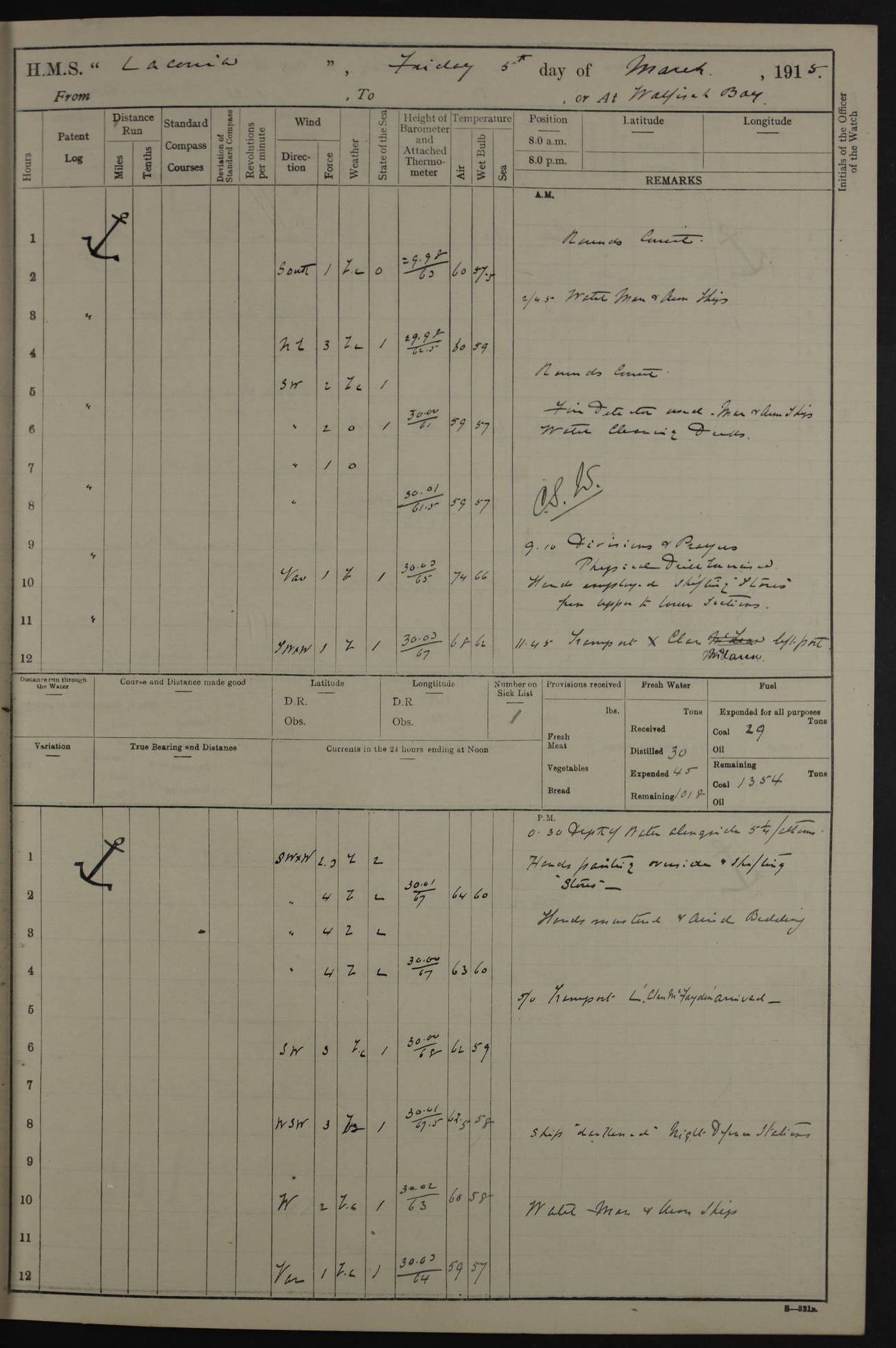 LOGS FOR NOVEMBER 1914 [Liverpool and Portsmouth] 4ef4f6dce53e0a0c910022f7: (https://s3.amazonaws.com:443/oldweather/ADM53-45875/0005_0.jpg) 24 November 1914 Liverpool Lat 53.43, Long -3.0 9.00am: Broke pendant, ship commissioned by Captain CS Wills as armed merchant cruiser with crew from Chatham depôt. 10.30am: Crew employed hoisting in and stowing stores, ammunition, projectiles etc. 1.30pm: Fires lit and engine room telegraph tested. Steering gear examined. 4ef4f6dce53e0a0c910022f8: (https://s3.amazonaws.com:443/oldweather/ADM53-45875/0005_1.jpg) 25 November 1914 Liverpool Lat 53.43, Long -3.0 8.00am: Hands taking in stores. 11.45am: Singled up moorings. 12.50pm: Left berth in Huskisson Dock assisted by three tugs. 1.35pm: Made fast in Sandon Basin. 4ef4f6dde53e0a0c910022f9: (https://s3.amazonaws.com:443/oldweather/ADM53-45875/0006_0.jpg) 26 November 1914 Liverpool and at sea towards Portsmouth Lat 53.55, Long -3.37 8.00am: Tested gun mountings. Compass adjusted by Lt Furse, compass adjuster. Draught on leaving 24’ 42” for’d, 26’ 10” aft. Coal 3,205 tons. Noon: Proceeded on passage. 2.49pm: Dropped pilot to pilot boat off Point Lynas. Proceeded full speed. 3.32pm: Middle Mouse I. abeam, 1.25 miles. Weather: West wind f 6 with squally showers. 4ef4f6dde53e0a0c910022fa: (https://s3.amazonaws.com:443/oldweather/ADM53-45875/0006_1.jpg) 27 November 1914 At sea Lat 49.95, Long -4.85 12.50am: Smalls Lt abeam 3 miles, a/c S24W. 8.00am: Pos. 50º 20’N, 5º 25’W. 9.10am: Longships Lt abeam 3 miles, a/c S60E. 11.10am: Lizard Lt abeam 4 miles, a/c S38E. Noon: Courses & DMG, various 294.5 miles, coasting. 1.10pm: Eddystone Lt bg N49E(t). 2.08pm: Same abeam 7 miles. 2.35pm: Start Pt Lt bg N64E(t) 3.54pm: Same abeam, 5 miles. 6.12pm: Portland Bill Lt bg Lt N53E(m) 7.17pm: Same abeam, 11 miles. 8.00pm: Pos 50º 22’N, 2º 08’W. 10.05pm: Needles Lt bg N80E 11.00pm: St Catherine’s Pt Lt abeam 3.5 miles. 4ef4f6dde53e0a0c910022fb: (https://s3.amazonaws.com:443/oldweather/ADM53-45875/0007_0.jpg) 28 November 1914 At sea to Portsmouth Lat 50.81, Long -1.11 12.46am: Passed Warrior LV and anchored. 7.10am: Weighed, pilot boarded. 7.46am: Anchored, awaiting permission to enter harbour. 8.30am: Weighed and proceeded. 9.15am: Secured alongside South Railway jetty. Drew fires in five boilers, banked fires in remainder. Noon: Courses & DMG, various 164.5 miles to anchorage. 4ef4f6dde53e0a0c910022fc: (https://s3.amazonaws.com:443/oldweather/ADM53-45875/0007_1.jpg) 29 November 1914 Portsmouth Lat 50.81, Long -1.11 9.05am: Commenced loading ammunition. 4ef4f6dee53e0a0c910022fd: (https://s3.amazonaws.com:443/oldweather/ADM53-45875/0008_0.jpg) 30 November 1914 Portsmouth Lat 50.81, Long -1.11 3.25am: Ceased work at No 3 hold, barge unloaded. 9.15am: Commenced loading victualling stores. 10.30am: Resumed loading ammunition. Work continuing throughout the night. LOGS FOR DECEMBER 1914 [Portsmouth, St Vincent and Ascension I.] 4ef4f6dee53e0a0c910022fe: (https://s3.amazonaws.com:443/oldweather/ADM53-45875/0008_1.jpg) 1 December 1914 Portsmouth Lat 50.81, Long -1.11 Receiving ammunition and victualling stores throughout the day and night. Sick list: 5. Weather: Strong winds, W or SW, f 7 at times in the am, f 4 in the pm, with some rain showers, 50º to 55º F. 4ef4f6dfe53e0a0c910022ff: (https://s3.amazonaws.com:443/oldweather/ADM53-45875/0009_0.jpg) 2 December 1914 Portsmouth Lat 50.81, Long -1.11 Hoisting in and stowing naval stores throughout the 24 hours. 4ef4f6dfe53e0a0c91002300: (https://s3.amazonaws.com:443/oldweather/ADM53-45875/0009_1.jpg) 3 December 1914 Portsmouth Lat 50.81, Long -1.11 Continuing to load stores throughout the 24 hours, with breaks for strong weather, SW winds up to f 7 with showers. 4ef4f6e0e53e0a0c91002303: (https://s3.amazonaws.com:443/oldweather/ADM53-45875/0011_0.jpg) 4 December 1914 Portsmouth Lat 50.81, Long -1.11 Taking in stores. 1.40pm: Ceased work at aft hatches owing to bad weather [force 8, squalls and rain]. 11.30pm: Escort with prisoner arrived on board. 4ef4f6e0e53e0a0c91002304: (https://s3.amazonaws.com:443/oldweather/ADM53-45875/0011_1.jpg) 5 December 1914 Portsmouth Lat 50.81, Long -1.11 Taking in stores and ammunition. 4ef4f6e0e53e0a0c91002305: (https://s3.amazonaws.com:443/oldweather/ADM53-45875/0012_0.jpg) 6 December 1914 Portsmouth Lat 50.81, Long -1.11 7.05am: AB Jones brought on board by escort. Taking in stores. 9.30pm: Ceased work for heavy rain. 4ef4f6e0e53e0a0c91002306: (https://s3.amazonaws.com:443/oldweather/ADM53-45875/0012_1.jpg) 7 December 1914 Portsmouth Lat 50.81, Long -1.11 Taking in stores in between rain showers. 9.00am: Exercised S2 and P2 guns. Hands overhauling boats etc. 4ef4f6e1e53e0a0c91002307: (https://s3.amazonaws.com:443/oldweather/ADM53-45875/0013_0.jpg) 8 December 1914 Portsmouth Lat 50.81, Long -1.11 Taking in stores. 9.00am: Gun crews at gun drill and loader exercises. 4ef4f6e1e53e0a0c91002308: (https://s3.amazonaws.com:443/oldweather/ADM53-45875/0013_1.jpg) 9 December 1914 Portsmouth. Lat 50.81, Long -1.11 Taking in stores. 2.00pm: Discharged Lt/Cdr Masson [?] to HMS Pembroke. Lt/Cdr Bowles joined ship. 7.45pm: One Marine from Chatham HQ joined the ship. 10.30pm: Stopped receiving stores and covered hatches owing to heavy rain. 4ef4f6e1e53e0a0c91002309: (https://s3.amazonaws.com:443/oldweather/ADM53-45875/0014_0.jpg) 10 December 1914 Portsmouth Lat 50.81, Long -1.11 Taking in stores. 5.30pm: Guard with prisoner returned from Barracks. 4ef4f6e1e53e0a0c9100230a: (https://s3.amazonaws.com:443/oldweather/ADM53-45875/0014_1.jpg) 11 December 1914 Portsmouth Lat 50.81, Long -1.11 In am: Taking in stores. 2.00pm: Stopped all work at hatches. Heavy continuous rain. 5.00pm: One ERA and three stokers joined ship. 7.00pm: Resumed work. 4ef4f6e2e53e0a0c9100230b: (https://s3.amazonaws.com:443/oldweather/ADM53-45875/0015_0.jpg) 12 December 1914 Portsmouth Lat 50.81, Long -1.11 Taking in stores. Discharging cordite and projectiles. 4ef4f6e2