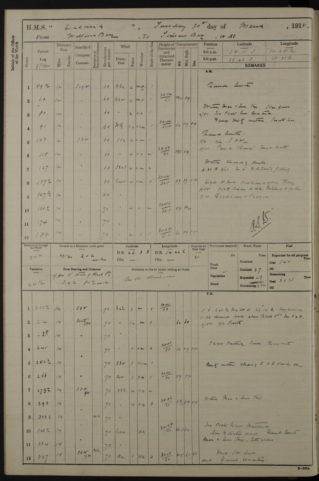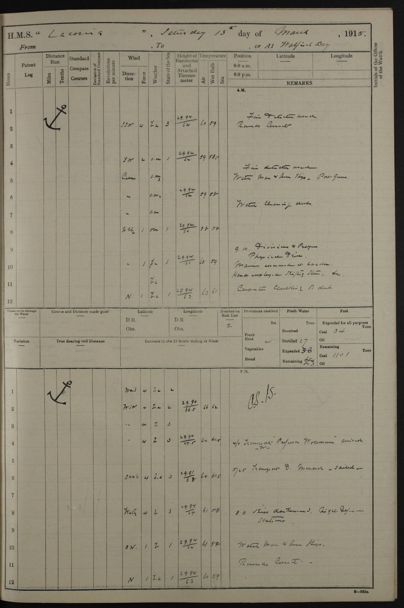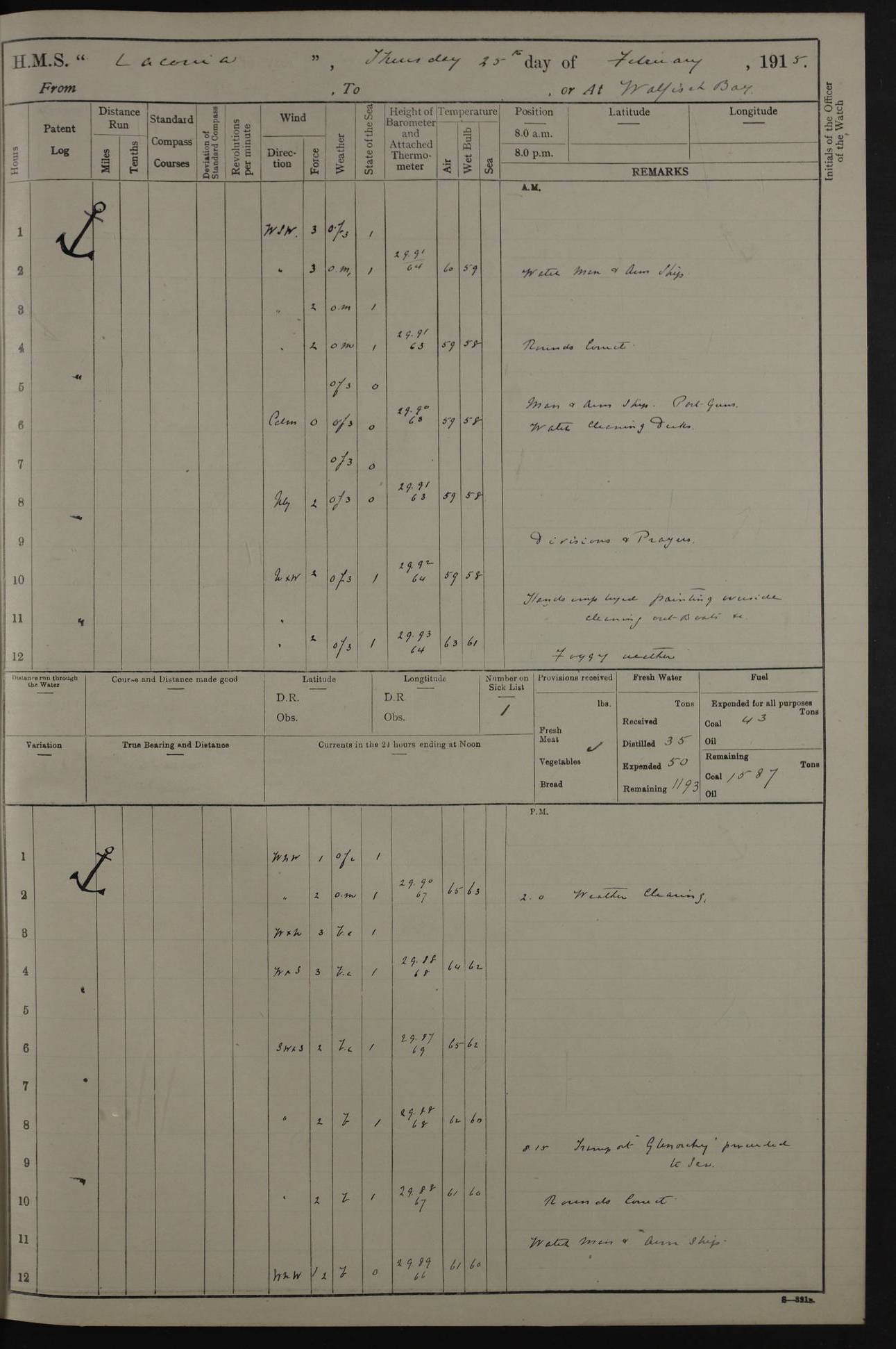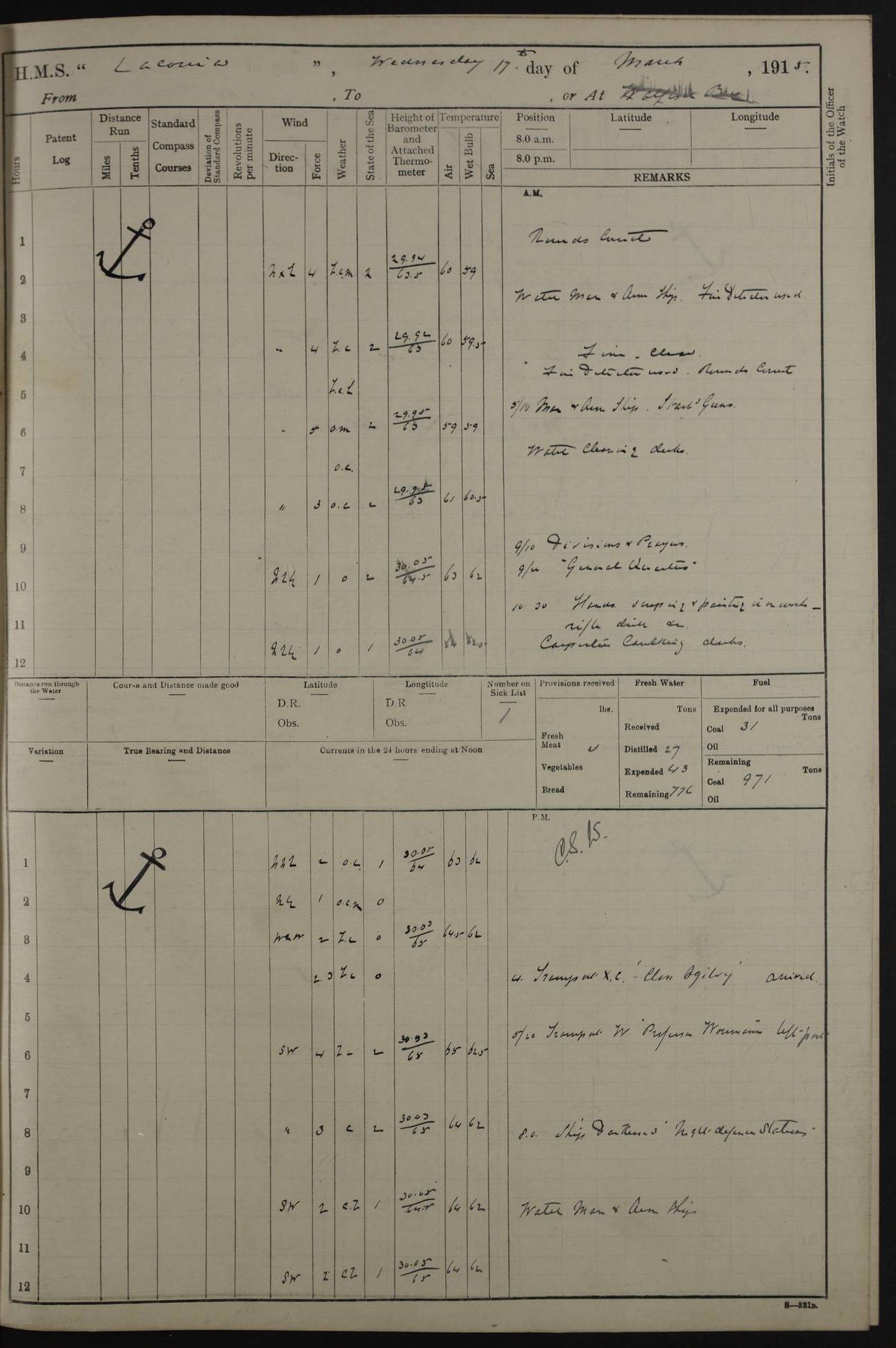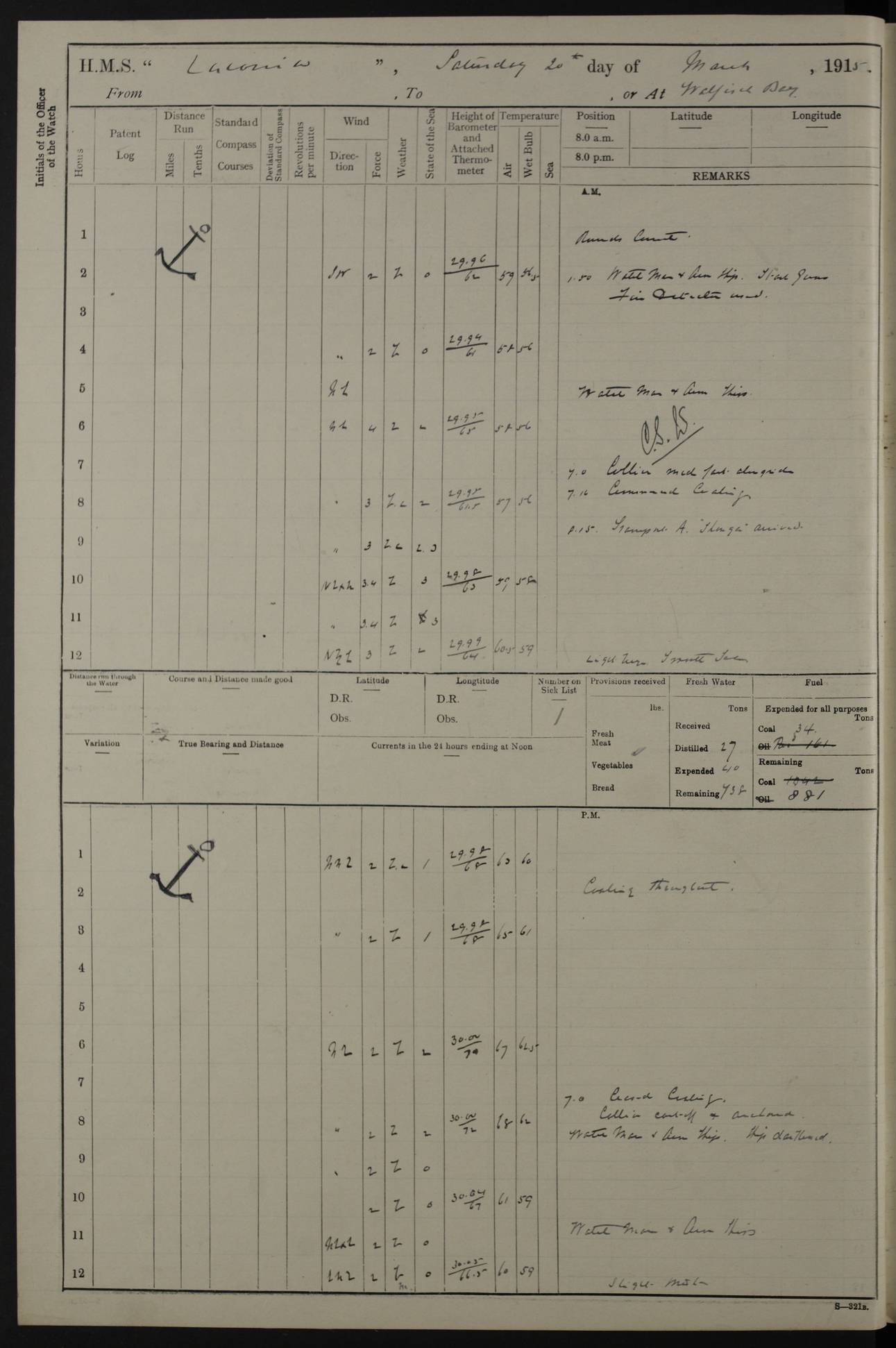 LOGS FOR NOVEMBER 1914 [Liverpool and Portsmouth] 4ef4f6dce53e0a0c910022f7: (https://s3.amazonaws.com:443/oldweather/ADM53-45875/0005_0.jpg) 24 November 1914 Liverpool Lat 53.43, Long -3.0 9.00am: Broke pendant, ship commissioned by Captain CS Wills as armed merchant cruiser with crew from Chatham depôt. 10.30am: Crew employed hoisting in and stowing stores, ammunition, projectiles etc. 1.30pm: Fires lit and engine room telegraph tested. Steering gear examined. 4ef4f6dce53e0a0c910022f8: (https://s3.amazonaws.com:443/oldweather/ADM53-45875/0005_1.jpg) 25 November 1914 Liverpool Lat 53.43, Long -3.0 8.00am: Hands taking in stores. 11.45am: Singled up moorings. 12.50pm: Left berth in Huskisson Dock assisted by three tugs. 1.35pm: Made fast in Sandon Basin. 4ef4f6dde53e0a0c910022f9: (https://s3.amazonaws.com:443/oldweather/ADM53-45875/0006_0.jpg) 26 November 1914 Liverpool and at sea towards Portsmouth Lat 53.55, Long -3.37 8.00am: Tested gun mountings. Compass adjusted by Lt Furse, compass adjuster. Draught on leaving 24’ 42” for’d, 26’ 10” aft. Coal 3,205 tons. Noon: Proceeded on passage. 2.49pm: Dropped pilot to pilot boat off Point Lynas. Proceeded full speed. 3.32pm: Middle Mouse I. abeam, 1.25 miles. Weather: West wind f 6 with squally showers. 4ef4f6dde53e0a0c910022fa: (https://s3.amazonaws.com:443/oldweather/ADM53-45875/0006_1.jpg) 27 November 1914 At sea Lat 49.95, Long -4.85 12.50am: Smalls Lt abeam 3 miles, a/c S24W. 8.00am: Pos. 50º 20’N, 5º 25’W. 9.10am: Longships Lt abeam 3 miles, a/c S60E. 11.10am: Lizard Lt abeam 4 miles, a/c S38E. Noon: Courses & DMG, various 294.5 miles, coasting. 1.10pm: Eddystone Lt bg N49E(t). 2.08pm: Same abeam 7 miles. 2.35pm: Start Pt Lt bg N64E(t) 3.54pm: Same abeam, 5 miles. 6.12pm: Portland Bill Lt bg Lt N53E(m) 7.17pm: Same abeam, 11 miles. 8.00pm: Pos 50º 22’N, 2º 08’W. 10.05pm: Needles Lt bg N80E 11.00pm: St Catherine’s Pt Lt abeam 3.5 miles. 4ef4f6dde53e0a0c910022fb: (https://s3.amazonaws.com:443/oldweather/ADM53-45875/0007_0.jpg) 28 November 1914 At sea to Portsmouth Lat 50.81, Long -1.11 12.46am: Passed Warrior LV and anchored. 7.10am: Weighed, pilot boarded. 7.46am: Anchored, awaiting permission to enter harbour. 8.30am: Weighed and proceeded. 9.15am: Secured alongside South Railway jetty. Drew fires in five boilers, banked fires in remainder. Noon: Courses & DMG, various 164.5 miles to anchorage. 4ef4f6dde53e0a0c910022fc: (https://s3.amazonaws.com:443/oldweather/ADM53-45875/0007_1.jpg) 29 November 1914 Portsmouth Lat 50.81, Long -1.11 9.05am: Commenced loading ammunition. 4ef4f6dee53e0a0c910022fd: (https://s3.amazonaws.com:443/oldweather/ADM53-45875/0008_0.jpg) 30 November 1914 Portsmouth Lat 50.81, Long -1.11 3.25am: Ceased work at No 3 hold, barge unloaded. 9.15am: Commenced loading victualling stores. 10.30am: Resumed loading ammunition. Work continuing throughout the night. LOGS FOR DECEMBER 1914 [Portsmouth, St Vincent and Ascension I.] 4ef4f6dee53e0a0c910022fe: (https://s3.amazonaws.com:443/oldweather/ADM53-45875/0008_1.jpg) 1 December 1914 Portsmouth Lat 50.81, Long -1.11 Receiving ammunition and victualling stores throughout the day and night. Sick list: 5. Weather: Strong winds, W or SW, f 7 at times in the am, f 4 in the pm, with some rain showers, 50º to 55º F. 4ef4f6dfe53e0a0c910022ff: (https://s3.amazonaws.com:443/oldweather/ADM53-45875/0009_0.jpg) 2 December 1914 Portsmouth Lat 50.81, Long -1.11 Hoisting in and stowing naval stores throughout the 24 hours. 4ef4f6dfe53e0a0c91002300: (https://s3.amazonaws.com:443/oldweather/ADM53-45875/0009_1.jpg) 3 December 1914 Portsmouth Lat 50.81, Long -1.11 Continuing to load stores throughout the 24 hours, with breaks for strong weather, SW winds up to f 7 with showers. 4ef4f6e0e53e0a0c91002303: (https://s3.amazonaws.com:443/oldweather/ADM53-45875/0011_0.jpg) 4 December 1914 Portsmouth Lat 50.81, Long -1.11 Taking in stores. 1.40pm: Ceased work at aft hatches owing to bad weather [force 8, squalls and rain]. 11.30pm: Escort with prisoner arrived on board. 4ef4f6e0e53e0a0c91002304: (https://s3.amazonaws.com:443/oldweather/ADM53-45875/0011_1.jpg) 5 December 1914 Portsmouth Lat 50.81, Long -1.11 Taking in stores and ammunition. 4ef4f6e0e53e0a0c91002305: (https://s3.amazonaws.com:443/oldweather/ADM53-45875/0012_0.jpg) 6 December 1914 Portsmouth Lat 50.81, Long -1.11 7.05am: AB Jones brought on board by escort. Taking in stores. 9.30pm: Ceased work for heavy rain. 4ef4f6e0e53e0a0c91002306: (https://s3.amazonaws.com:443/oldweather/ADM53-45875/0012_1.jpg) 7 December 1914 Portsmouth Lat 50.81, Long -1.11 Taking in stores in between rain showers. 9.00am: Exercised S2 and P2 guns. Hands overhauling boats etc. 4ef4f6e1e53e0a0c91002307: (https://s3.amazonaws.com:443/oldweather/ADM53-45875/0013_0.jpg) 8 December 1914 Portsmouth Lat 50.81, Long -1.11 Taking in stores. 9.00am: Gun crews at gun drill and loader exercises. 4ef4f6e1e53e0a0c91002308: (https://s3.amazonaws.com:443/oldweather/ADM53-45875/0013_1.jpg) 9 December 1914 Portsmouth. Lat 50.81, Long -1.11 Taking in stores. 2.00pm: Discharged Lt/Cdr Masson [?] to HMS Pembroke. Lt/Cdr Bowles joined ship. 7.45pm: One Marine from Chatham HQ joined the ship. 10.30pm: Stopped receiving stores and covered hatches owing to heavy rain. 4ef4f6e1e53e0a0c91002309: (https://s3.amazonaws.com:443/oldweather/ADM53-45875/0014_0.jpg) 10 December 1914 Portsmouth Lat 50.81, Long -1.11 Taking in stores. 5.30pm: Guard with prisoner returned from Barracks. 4ef4f6e1e53e0a0c9100230a: (https://s3.amazonaws.com:443/oldweather/ADM53-45875/0014_1.jpg) 11 December 1914 Portsmouth Lat 50.81, Long -1.11 In am: Taking in stores. 2.00pm: Stopped all work at hatches. Heavy continuous rain. 5.00pm: One ERA and three stokers joined ship. 7.00pm: Resumed work. 4ef4f6e2e53e0a0c9100230b: (https://s3.amazonaws.com:443/oldweather/ADM53-45875/0015_0.jpg) 12 December 1914 Portsmouth Lat 50.81, Long -1.11 Taking in stores. Discharging cordite and projectiles. 4ef4f6e2