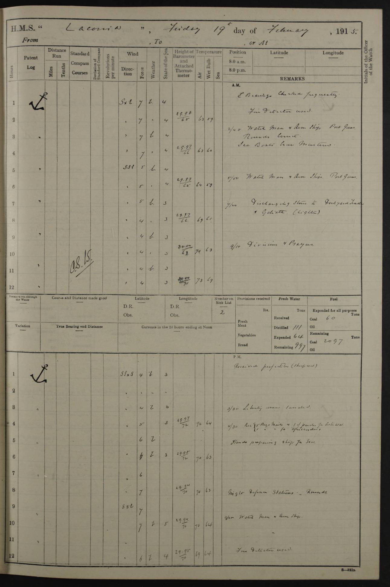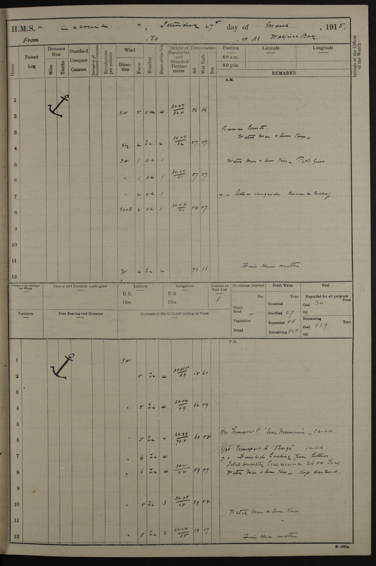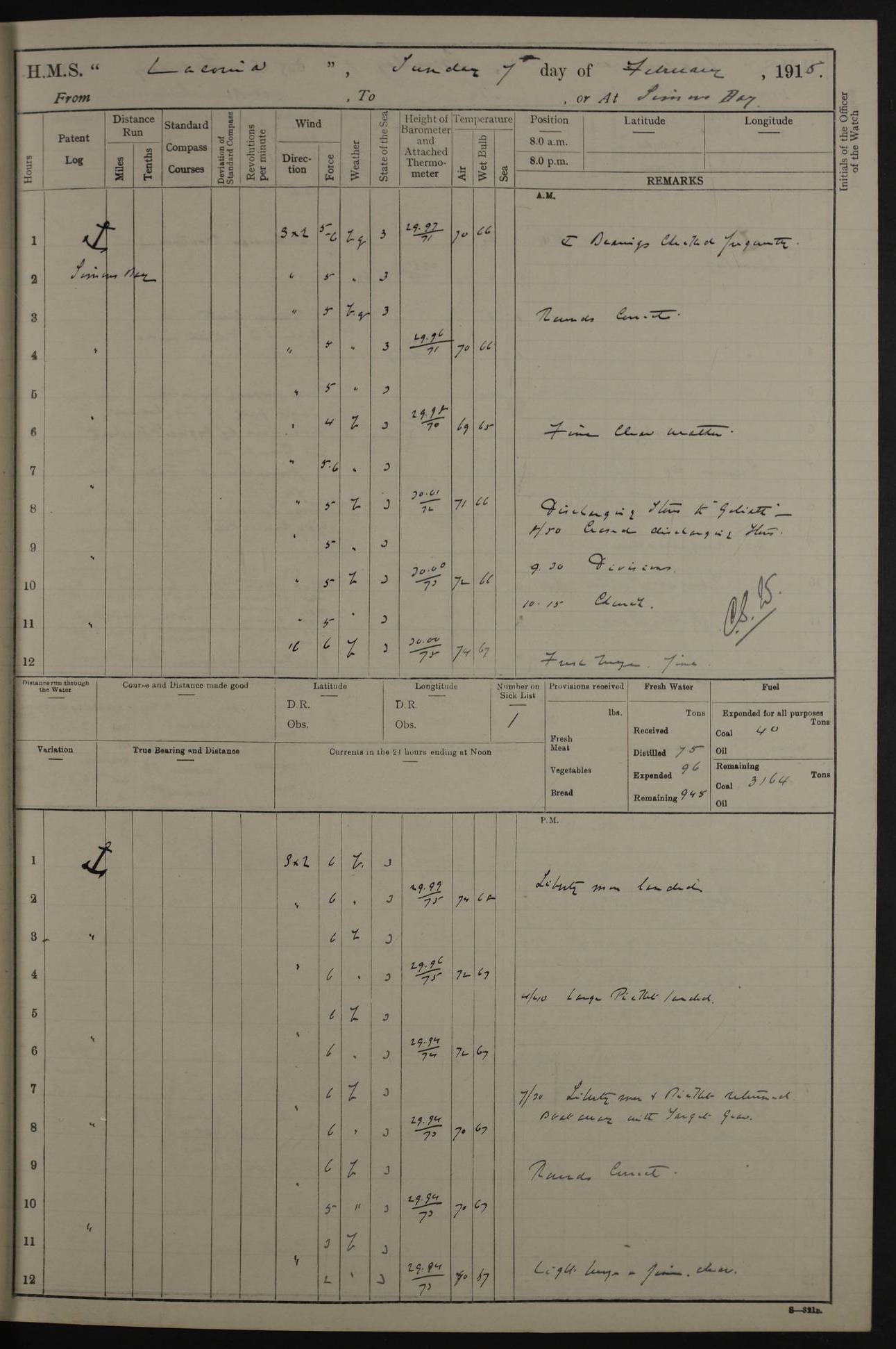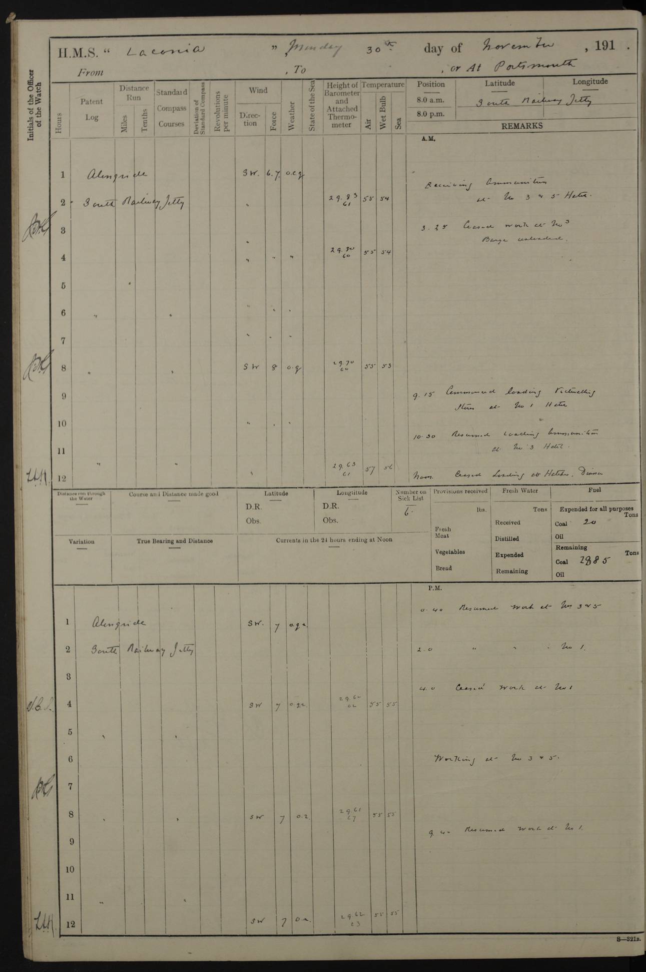 LOGS FOR NOVEMBER 1914 [Liverpool and Portsmouth] 4ef4f6dce53e0a0c910022f7: (https://s3.amazonaws.com:443/oldweather/ADM53-45875/0005_0.jpg) 24 November 1914 Liverpool Lat 53.43, Long -3.0 9.00am: Broke pendant, ship commissioned by Captain CS Wills as armed merchant cruiser with crew from Chatham depôt. 10.30am: Crew employed hoisting in and stowing stores, ammunition, projectiles etc. 1.30pm: Fires lit and engine room telegraph tested. Steering gear examined. 4ef4f6dce53e0a0c910022f8: (https://s3.amazonaws.com:443/oldweather/ADM53-45875/0005_1.jpg) 25 November 1914 Liverpool Lat 53.43, Long -3.0 8.00am: Hands taking in stores. 11.45am: Singled up moorings. 12.50pm: Left berth in Huskisson Dock assisted by three tugs. 1.35pm: Made fast in Sandon Basin. 4ef4f6dde53e0a0c910022f9: (https://s3.amazonaws.com:443/oldweather/ADM53-45875/0006_0.jpg) 26 November 1914 Liverpool and at sea towards Portsmouth Lat 53.55, Long -3.37 8.00am: Tested gun mountings. Compass adjusted by Lt Furse, compass adjuster. Draught on leaving 24’ 42” for’d, 26’ 10” aft. Coal 3,205 tons. Noon: Proceeded on passage. 2.49pm: Dropped pilot to pilot boat off Point Lynas. Proceeded full speed. 3.32pm: Middle Mouse I. abeam, 1.25 miles. Weather: West wind f 6 with squally showers. 4ef4f6dde53e0a0c910022fa: (https://s3.amazonaws.com:443/oldweather/ADM53-45875/0006_1.jpg) 27 November 1914 At sea Lat 49.95, Long -4.85 12.50am: Smalls Lt abeam 3 miles, a/c S24W. 8.00am: Pos. 50º 20’N, 5º 25’W. 9.10am: Longships Lt abeam 3 miles, a/c S60E. 11.10am: Lizard Lt abeam 4 miles, a/c S38E. Noon: Courses & DMG, various 294.5 miles, coasting. 1.10pm: Eddystone Lt bg N49E(t). 2.08pm: Same abeam 7 miles. 2.35pm: Start Pt Lt bg N64E(t) 3.54pm: Same abeam, 5 miles. 6.12pm: Portland Bill Lt bg Lt N53E(m) 7.17pm: Same abeam, 11 miles. 8.00pm: Pos 50º 22’N, 2º 08’W. 10.05pm: Needles Lt bg N80E 11.00pm: St Catherine’s Pt Lt abeam 3.5 miles. 4ef4f6dde53e0a0c910022fb: (https://s3.amazonaws.com:443/oldweather/ADM53-45875/0007_0.jpg) 28 November 1914 At sea to Portsmouth Lat 50.81, Long -1.11 12.46am: Passed Warrior LV and anchored. 7.10am: Weighed, pilot boarded. 7.46am: Anchored, awaiting permission to enter harbour. 8.30am: Weighed and proceeded. 9.15am: Secured alongside South Railway jetty. Drew fires in five boilers, banked fires in remainder. Noon: Courses & DMG, various 164.5 miles to anchorage. 4ef4f6dde53e0a0c910022fc: (https://s3.amazonaws.com:443/oldweather/ADM53-45875/0007_1.jpg) 29 November 1914 Portsmouth Lat 50.81, Long -1.11 9.05am: Commenced loading ammunition. 4ef4f6dee53e0a0c910022fd: (https://s3.amazonaws.com:443/oldweather/ADM53-45875/0008_0.jpg) 30 November 1914 Portsmouth Lat 50.81, Long -1.11 3.25am: Ceased work at No 3 hold, barge unloaded. 9.15am: Commenced loading victualling stores. 10.30am: Resumed loading ammunition. Work continuing throughout the night. LOGS FOR DECEMBER 1914 [Portsmouth, St Vincent and Ascension I.] 4ef4f6dee53e0a0c910022fe: (https://s3.amazonaws.com:443/oldweather/ADM53-45875/0008_1.jpg) 1 December 1914 Portsmouth Lat 50.81, Long -1.11 Receiving ammunition and victualling stores throughout the day and night. Sick list: 5. Weather: Strong winds, W or SW, f 7 at times in the am, f 4 in the pm, with some rain showers, 50º to 55º F. 4ef4f6dfe53e0a0c910022ff: (https://s3.amazonaws.com:443/oldweather/ADM53-45875/0009_0.jpg) 2 December 1914 Portsmouth Lat 50.81, Long -1.11 Hoisting in and stowing naval stores throughout the 24 hours. 4ef4f6dfe53e0a0c91002300: (https://s3.amazonaws.com:443/oldweather/ADM53-45875/0009_1.jpg) 3 December 1914 Portsmouth Lat 50.81, Long -1.11 Continuing to load stores throughout the 24 hours, with breaks for strong weather, SW winds up to f 7 with showers. 4ef4f6e0e53e0a0c91002303: (https://s3.amazonaws.com:443/oldweather/ADM53-45875/0011_0.jpg) 4 December 1914 Portsmouth Lat 50.81, Long -1.11 Taking in stores. 1.40pm: Ceased work at aft hatches owing to bad weather [force 8, squalls and rain]. 11.30pm: Escort with prisoner arrived on board. 4ef4f6e0e53e0a0c91002304: (https://s3.amazonaws.com:443/oldweather/ADM53-45875/0011_1.jpg) 5 December 1914 Portsmouth Lat 50.81, Long -1.11 Taking in stores and ammunition. 4ef4f6e0e53e0a0c91002305: (https://s3.amazonaws.com:443/oldweather/ADM53-45875/0012_0.jpg) 6 December 1914 Portsmouth Lat 50.81, Long -1.11 7.05am: AB Jones brought on board by escort. Taking in stores. 9.30pm: Ceased work for heavy rain. 4ef4f6e0e53e0a0c91002306: (https://s3.amazonaws.com:443/oldweather/ADM53-45875/0012_1.jpg) 7 December 1914 Portsmouth Lat 50.81, Long -1.11 Taking in stores in between rain showers. 9.00am: Exercised S2 and P2 guns. Hands overhauling boats etc. 4ef4f6e1e53e0a0c91002307: (https://s3.amazonaws.com:443/oldweather/ADM53-45875/0013_0.jpg) 8 December 1914 Portsmouth Lat 50.81, Long -1.11 Taking in stores. 9.00am: Gun crews at gun drill and loader exercises. 4ef4f6e1e53e0a0c91002308: (https://s3.amazonaws.com:443/oldweather/ADM53-45875/0013_1.jpg) 9 December 1914 Portsmouth. Lat 50.81, Long -1.11 Taking in stores. 2.00pm: Discharged Lt/Cdr Masson [?] to HMS Pembroke. Lt/Cdr Bowles joined ship. 7.45pm: One Marine from Chatham HQ joined the ship. 10.30pm: Stopped receiving stores and covered hatches owing to heavy rain. 4ef4f6e1e53e0a0c91002309: (https://s3.amazonaws.com:443/oldweather/ADM53-45875/0014_0.jpg) 10 December 1914 Portsmouth Lat 50.81, Long -1.11 Taking in stores. 5.30pm: Guard with prisoner returned from Barracks. 4ef4f6e1e53e0a0c9100230a: (https://s3.amazonaws.com:443/oldweather/ADM53-45875/0014_1.jpg) 11 December 1914 Portsmouth Lat 50.81, Long -1.11 In am: Taking in stores. 2.00pm: Stopped all work at hatches. Heavy continuous rain. 5.00pm: One ERA and three stokers joined ship. 7.00pm: Resumed work. 4ef4f6e2e53e0a0c9100230b: (https://s3.amazonaws.com:443/oldweather/ADM53-45875/0015_0.jpg) 12 December 1914 Portsmouth Lat 50.81, Long -1.11 Taking in stores. Discharging cordite and projectiles. 4ef4f6e2