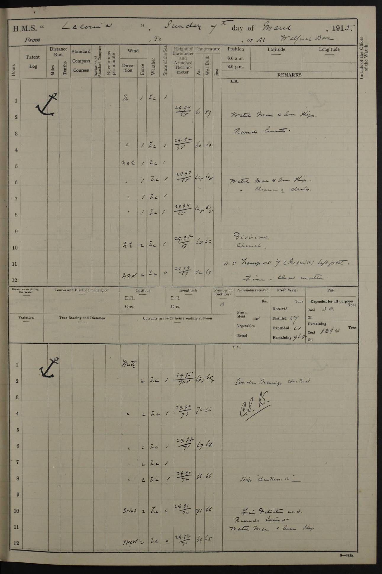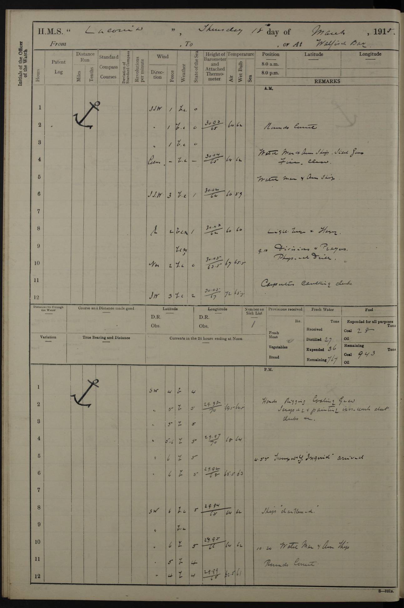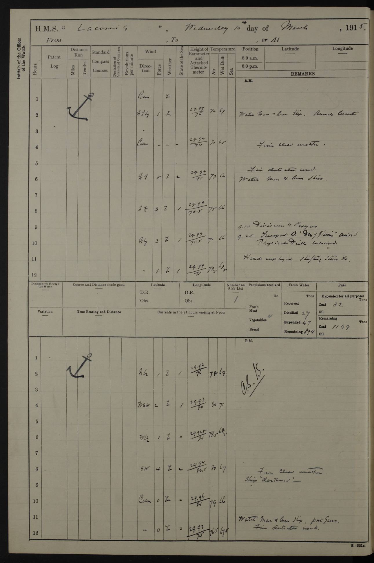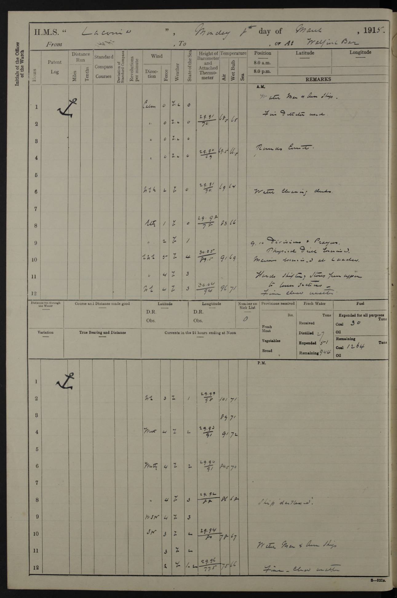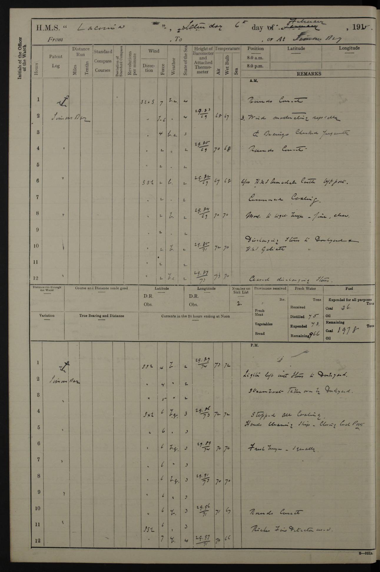 LOGS FOR NOVEMBER 1914 [Liverpool and Portsmouth] 4ef4f6dce53e0a0c910022f7: (https://s3.amazonaws.com:443/oldweather/ADM53-45875/0005_0.jpg) 24 November 1914 Liverpool Lat 53.43, Long -3.0 9.00am: Broke pendant, ship commissioned by Captain CS Wills as armed merchant cruiser with crew from Chatham depôt. 10.30am: Crew employed hoisting in and stowing stores, ammunition, projectiles etc. 1.30pm: Fires lit and engine room telegraph tested. Steering gear examined. 4ef4f6dce53e0a0c910022f8: (https://s3.amazonaws.com:443/oldweather/ADM53-45875/0005_1.jpg) 25 November 1914 Liverpool Lat 53.43, Long -3.0 8.00am: Hands taking in stores. 11.45am: Singled up moorings. 12.50pm: Left berth in Huskisson Dock assisted by three tugs. 1.35pm: Made fast in Sandon Basin. 4ef4f6dde53e0a0c910022f9: (https://s3.amazonaws.com:443/oldweather/ADM53-45875/0006_0.jpg) 26 November 1914 Liverpool and at sea towards Portsmouth Lat 53.55, Long -3.37 8.00am: Tested gun mountings. Compass adjusted by Lt Furse, compass adjuster. Draught on leaving 24’ 42” for’d, 26’ 10” aft. Coal 3,205 tons. Noon: Proceeded on passage. 2.49pm: Dropped pilot to pilot boat off Point Lynas. Proceeded full speed. 3.32pm: Middle Mouse I. abeam, 1.25 miles. Weather: West wind f 6 with squally showers. 4ef4f6dde53e0a0c910022fa: (https://s3.amazonaws.com:443/oldweather/ADM53-45875/0006_1.jpg) 27 November 1914 At sea Lat 49.95, Long -4.85 12.50am: Smalls Lt abeam 3 miles, a/c S24W. 8.00am: Pos. 50º 20’N, 5º 25’W. 9.10am: Longships Lt abeam 3 miles, a/c S60E. 11.10am: Lizard Lt abeam 4 miles, a/c S38E. Noon: Courses & DMG, various 294.5 miles, coasting. 1.10pm: Eddystone Lt bg N49E(t). 2.08pm: Same abeam 7 miles. 2.35pm: Start Pt Lt bg N64E(t) 3.54pm: Same abeam, 5 miles. 6.12pm: Portland Bill Lt bg Lt N53E(m) 7.17pm: Same abeam, 11 miles. 8.00pm: Pos 50º 22’N, 2º 08’W. 10.05pm: Needles Lt bg N80E 11.00pm: St Catherine’s Pt Lt abeam 3.5 miles. 4ef4f6dde53e0a0c910022fb: (https://s3.amazonaws.com:443/oldweather/ADM53-45875/0007_0.jpg) 28 November 1914 At sea to Portsmouth Lat 50.81, Long -1.11 12.46am: Passed Warrior LV and anchored. 7.10am: Weighed, pilot boarded. 7.46am: Anchored, awaiting permission to enter harbour. 8.30am: Weighed and proceeded. 9.15am: Secured alongside South Railway jetty. Drew fires in five boilers, banked fires in remainder. Noon: Courses & DMG, various 164.5 miles to anchorage. 4ef4f6dde53e0a0c910022fc: (https://s3.amazonaws.com:443/oldweather/ADM53-45875/0007_1.jpg) 29 November 1914 Portsmouth Lat 50.81, Long -1.11 9.05am: Commenced loading ammunition. 4ef4f6dee53e0a0c910022fd: (https://s3.amazonaws.com:443/oldweather/ADM53-45875/0008_0.jpg) 30 November 1914 Portsmouth Lat 50.81, Long -1.11 3.25am: Ceased work at No 3 hold, barge unloaded. 9.15am: Commenced loading victualling stores. 10.30am: Resumed loading ammunition. Work continuing throughout the night. LOGS FOR DECEMBER 1914 [Portsmouth, St Vincent and Ascension I.] 4ef4f6dee53e0a0c910022fe: (https://s3.amazonaws.com:443/oldweather/ADM53-45875/0008_1.jpg) 1 December 1914 Portsmouth Lat 50.81, Long -1.11 Receiving ammunition and victualling stores throughout the day and night. Sick list: 5. Weather: Strong winds, W or SW, f 7 at times in the am, f 4 in the pm, with some rain showers, 50º to 55º F. 4ef4f6dfe53e0a0c910022ff: (https://s3.amazonaws.com:443/oldweather/ADM53-45875/0009_0.jpg) 2 December 1914 Portsmouth Lat 50.81, Long -1.11 Hoisting in and stowing naval stores throughout the 24 hours. 4ef4f6dfe53e0a0c91002300: (https://s3.amazonaws.com:443/oldweather/ADM53-45875/0009_1.jpg) 3 December 1914 Portsmouth Lat 50.81, Long -1.11 Continuing to load stores throughout the 24 hours, with breaks for strong weather, SW winds up to f 7 with showers. 4ef4f6e0e53e0a0c91002303: (https://s3.amazonaws.com:443/oldweather/ADM53-45875/0011_0.jpg) 4 December 1914 Portsmouth Lat 50.81, Long -1.11 Taking in stores. 1.40pm: Ceased work at aft hatches owing to bad weather [force 8, squalls and rain]. 11.30pm: Escort with prisoner arrived on board. 4ef4f6e0e53e0a0c91002304: (https://s3.amazonaws.com:443/oldweather/ADM53-45875/0011_1.jpg) 5 December 1914 Portsmouth Lat 50.81, Long -1.11 Taking in stores and ammunition. 4ef4f6e0e53e0a0c91002305: (https://s3.amazonaws.com:443/oldweather/ADM53-45875/0012_0.jpg) 6 December 1914 Portsmouth Lat 50.81, Long -1.11 7.05am: AB Jones brought on board by escort. Taking in stores. 9.30pm: Ceased work for heavy rain. 4ef4f6e0e53e0a0c91002306: (https://s3.amazonaws.com:443/oldweather/ADM53-45875/0012_1.jpg) 7 December 1914 Portsmouth Lat 50.81, Long -1.11 Taking in stores in between rain showers. 9.00am: Exercised S2 and P2 guns. Hands overhauling boats etc. 4ef4f6e1e53e0a0c91002307: (https://s3.amazonaws.com:443/oldweather/ADM53-45875/0013_0.jpg) 8 December 1914 Portsmouth Lat 50.81, Long -1.11 Taking in stores. 9.00am: Gun crews at gun drill and loader exercises. 4ef4f6e1e53e0a0c91002308: (https://s3.amazonaws.com:443/oldweather/ADM53-45875/0013_1.jpg) 9 December 1914 Portsmouth. Lat 50.81, Long -1.11 Taking in stores. 2.00pm: Discharged Lt/Cdr Masson [?] to HMS Pembroke. Lt/Cdr Bowles joined ship. 7.45pm: One Marine from Chatham HQ joined the ship. 10.30pm: Stopped receiving stores and covered hatches owing to heavy rain. 4ef4f6e1e53e0a0c91002309: (https://s3.amazonaws.com:443/oldweather/ADM53-45875/0014_0.jpg) 10 December 1914 Portsmouth Lat 50.81, Long -1.11 Taking in stores. 5.30pm: Guard with prisoner returned from Barracks. 4ef4f6e1e53e0a0c9100230a: (https://s3.amazonaws.com:443/oldweather/ADM53-45875/0014_1.jpg) 11 December 1914 Portsmouth Lat 50.81, Long -1.11 In am: Taking in stores. 2.00pm: Stopped all work at hatches. Heavy continuous rain. 5.00pm: One ERA and three stokers joined ship. 7.00pm: Resumed work. 4ef4f6e2e53e0a0c9100230b: (https://s3.amazonaws.com:443/oldweather/ADM53-45875/0015_0.jpg) 12 December 1914 Portsmouth Lat 50.81, Long -1.11 Taking in stores. Discharging cordite and projectiles. 4ef4f6e2