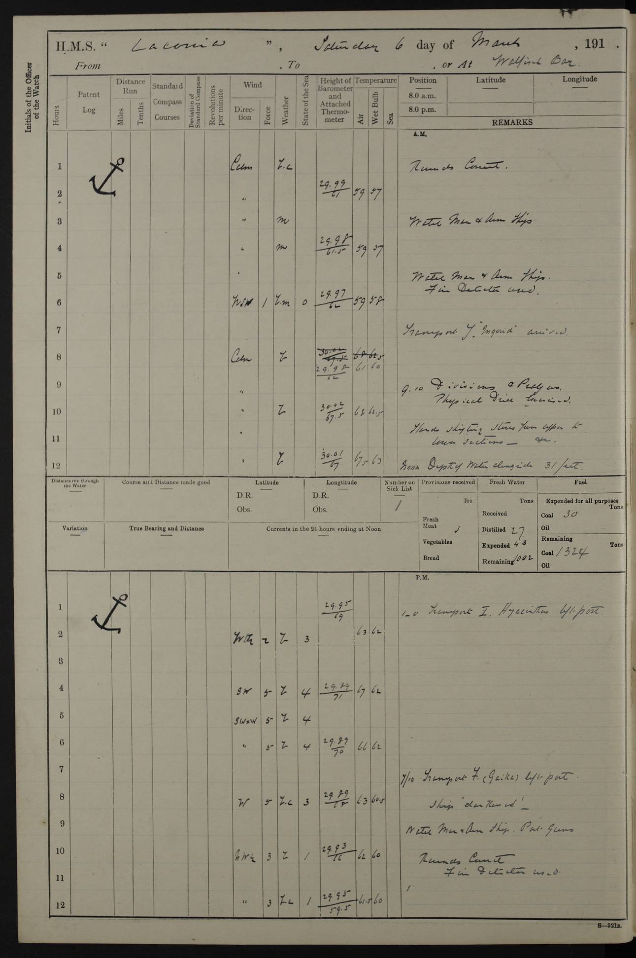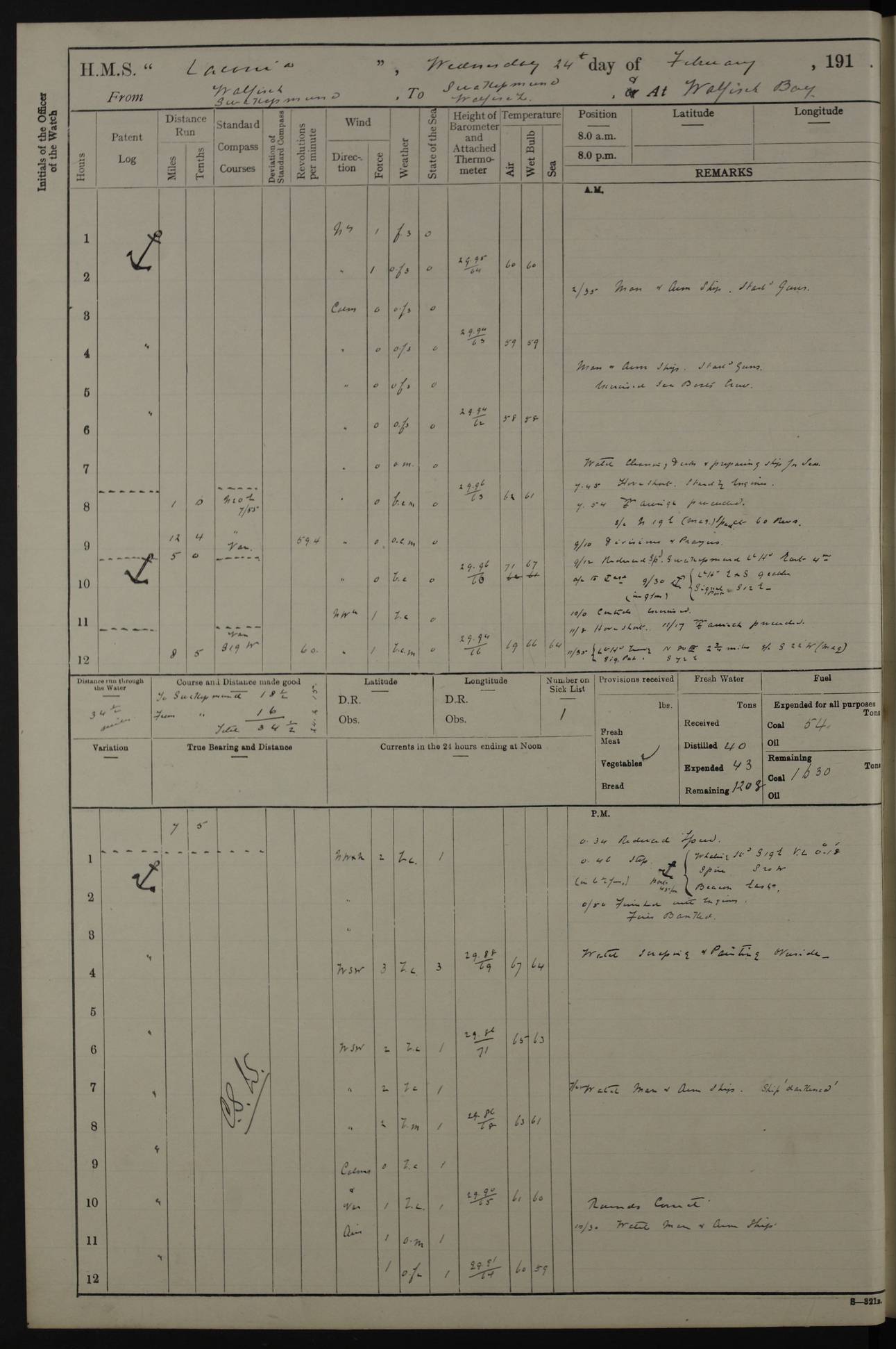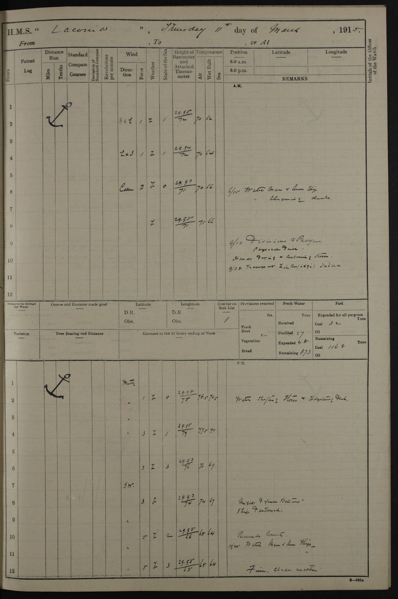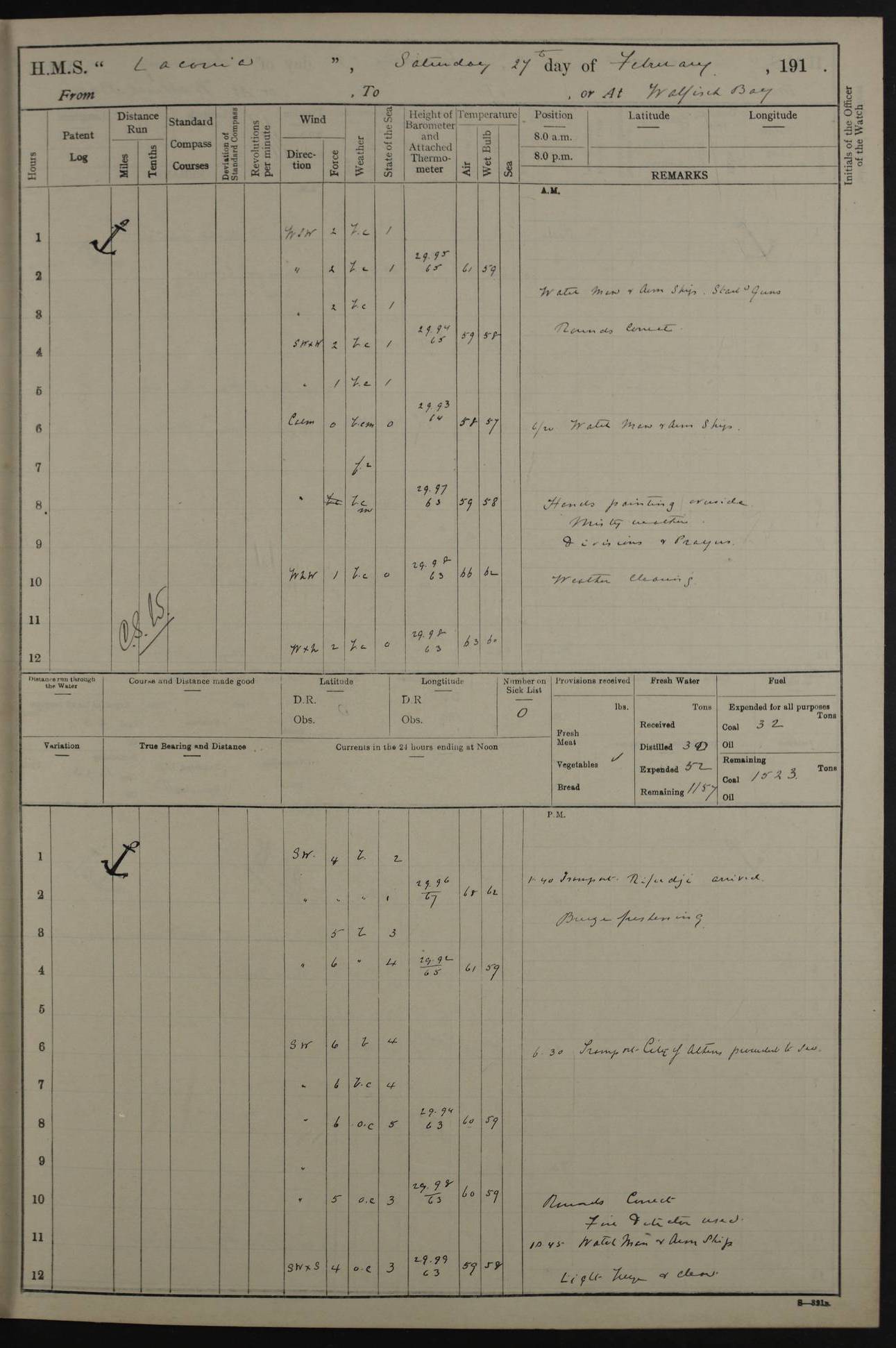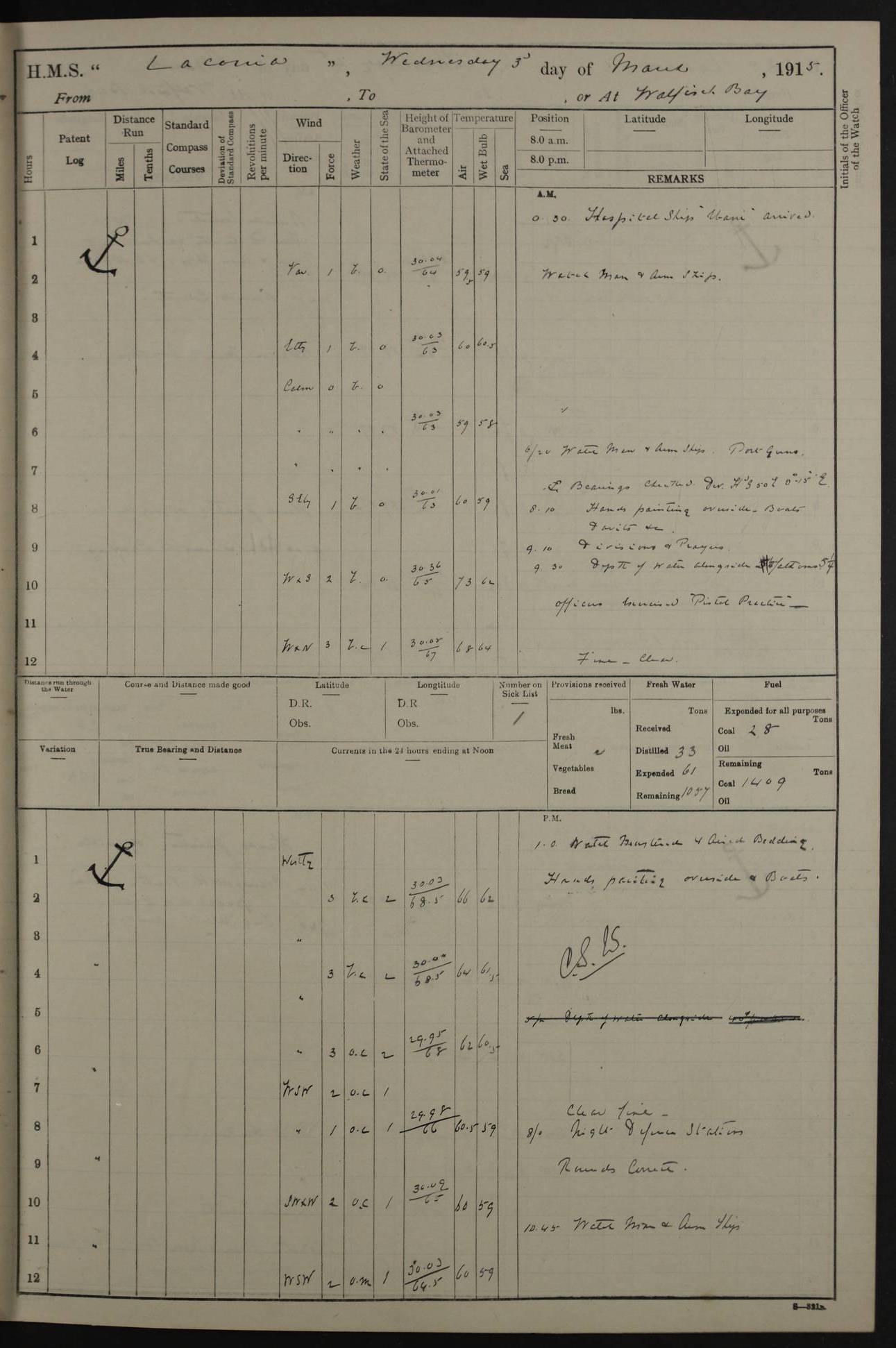 LOGS FOR NOVEMBER 1914 [Liverpool and Portsmouth] 4ef4f6dce53e0a0c910022f7: (https://s3.amazonaws.com:443/oldweather/ADM53-45875/0005_0.jpg) 24 November 1914 Liverpool Lat 53.43, Long -3.0 9.00am: Broke pendant, ship commissioned by Captain CS Wills as armed merchant cruiser with crew from Chatham depôt. 10.30am: Crew employed hoisting in and stowing stores, ammunition, projectiles etc. 1.30pm: Fires lit and engine room telegraph tested. Steering gear examined. 4ef4f6dce53e0a0c910022f8: (https://s3.amazonaws.com:443/oldweather/ADM53-45875/0005_1.jpg) 25 November 1914 Liverpool Lat 53.43, Long -3.0 8.00am: Hands taking in stores. 11.45am: Singled up moorings. 12.50pm: Left berth in Huskisson Dock assisted by three tugs. 1.35pm: Made fast in Sandon Basin. 4ef4f6dde53e0a0c910022f9: (https://s3.amazonaws.com:443/oldweather/ADM53-45875/0006_0.jpg) 26 November 1914 Liverpool and at sea towards Portsmouth Lat 53.55, Long -3.37 8.00am: Tested gun mountings. Compass adjusted by Lt Furse, compass adjuster. Draught on leaving 24’ 42” for’d, 26’ 10” aft. Coal 3,205 tons. Noon: Proceeded on passage. 2.49pm: Dropped pilot to pilot boat off Point Lynas. Proceeded full speed. 3.32pm: Middle Mouse I. abeam, 1.25 miles. Weather: West wind f 6 with squally showers. 4ef4f6dde53e0a0c910022fa: (https://s3.amazonaws.com:443/oldweather/ADM53-45875/0006_1.jpg) 27 November 1914 At sea Lat 49.95, Long -4.85 12.50am: Smalls Lt abeam 3 miles, a/c S24W. 8.00am: Pos. 50º 20’N, 5º 25’W. 9.10am: Longships Lt abeam 3 miles, a/c S60E. 11.10am: Lizard Lt abeam 4 miles, a/c S38E. Noon: Courses & DMG, various 294.5 miles, coasting. 1.10pm: Eddystone Lt bg N49E(t). 2.08pm: Same abeam 7 miles. 2.35pm: Start Pt Lt bg N64E(t) 3.54pm: Same abeam, 5 miles. 6.12pm: Portland Bill Lt bg Lt N53E(m) 7.17pm: Same abeam, 11 miles. 8.00pm: Pos 50º 22’N, 2º 08’W. 10.05pm: Needles Lt bg N80E 11.00pm: St Catherine’s Pt Lt abeam 3.5 miles. 4ef4f6dde53e0a0c910022fb: (https://s3.amazonaws.com:443/oldweather/ADM53-45875/0007_0.jpg) 28 November 1914 At sea to Portsmouth Lat 50.81, Long -1.11 12.46am: Passed Warrior LV and anchored. 7.10am: Weighed, pilot boarded. 7.46am: Anchored, awaiting permission to enter harbour. 8.30am: Weighed and proceeded. 9.15am: Secured alongside South Railway jetty. Drew fires in five boilers, banked fires in remainder. Noon: Courses & DMG, various 164.5 miles to anchorage. 4ef4f6dde53e0a0c910022fc: (https://s3.amazonaws.com:443/oldweather/ADM53-45875/0007_1.jpg) 29 November 1914 Portsmouth Lat 50.81, Long -1.11 9.05am: Commenced loading ammunition. 4ef4f6dee53e0a0c910022fd: (https://s3.amazonaws.com:443/oldweather/ADM53-45875/0008_0.jpg) 30 November 1914 Portsmouth Lat 50.81, Long -1.11 3.25am: Ceased work at No 3 hold, barge unloaded. 9.15am: Commenced loading victualling stores. 10.30am: Resumed loading ammunition. Work continuing throughout the night. LOGS FOR DECEMBER 1914 [Portsmouth, St Vincent and Ascension I.] 4ef4f6dee53e0a0c910022fe: (https://s3.amazonaws.com:443/oldweather/ADM53-45875/0008_1.jpg) 1 December 1914 Portsmouth Lat 50.81, Long -1.11 Receiving ammunition and victualling stores throughout the day and night. Sick list: 5. Weather: Strong winds, W or SW, f 7 at times in the am, f 4 in the pm, with some rain showers, 50º to 55º F. 4ef4f6dfe53e0a0c910022ff: (https://s3.amazonaws.com:443/oldweather/ADM53-45875/0009_0.jpg) 2 December 1914 Portsmouth Lat 50.81, Long -1.11 Hoisting in and stowing naval stores throughout the 24 hours. 4ef4f6dfe53e0a0c91002300: (https://s3.amazonaws.com:443/oldweather/ADM53-45875/0009_1.jpg) 3 December 1914 Portsmouth Lat 50.81, Long -1.11 Continuing to load stores throughout the 24 hours, with breaks for strong weather, SW winds up to f 7 with showers. 4ef4f6e0e53e0a0c91002303: (https://s3.amazonaws.com:443/oldweather/ADM53-45875/0011_0.jpg) 4 December 1914 Portsmouth Lat 50.81, Long -1.11 Taking in stores. 1.40pm: Ceased work at aft hatches owing to bad weather [force 8, squalls and rain]. 11.30pm: Escort with prisoner arrived on board. 4ef4f6e0e53e0a0c91002304: (https://s3.amazonaws.com:443/oldweather/ADM53-45875/0011_1.jpg) 5 December 1914 Portsmouth Lat 50.81, Long -1.11 Taking in stores and ammunition. 4ef4f6e0e53e0a0c91002305: (https://s3.amazonaws.com:443/oldweather/ADM53-45875/0012_0.jpg) 6 December 1914 Portsmouth Lat 50.81, Long -1.11 7.05am: AB Jones brought on board by escort. Taking in stores. 9.30pm: Ceased work for heavy rain. 4ef4f6e0e53e0a0c91002306: (https://s3.amazonaws.com:443/oldweather/ADM53-45875/0012_1.jpg) 7 December 1914 Portsmouth Lat 50.81, Long -1.11 Taking in stores in between rain showers. 9.00am: Exercised S2 and P2 guns. Hands overhauling boats etc. 4ef4f6e1e53e0a0c91002307: (https://s3.amazonaws.com:443/oldweather/ADM53-45875/0013_0.jpg) 8 December 1914 Portsmouth Lat 50.81, Long -1.11 Taking in stores. 9.00am: Gun crews at gun drill and loader exercises. 4ef4f6e1e53e0a0c91002308: (https://s3.amazonaws.com:443/oldweather/ADM53-45875/0013_1.jpg) 9 December 1914 Portsmouth. Lat 50.81, Long -1.11 Taking in stores. 2.00pm: Discharged Lt/Cdr Masson [?] to HMS Pembroke. Lt/Cdr Bowles joined ship. 7.45pm: One Marine from Chatham HQ joined the ship. 10.30pm: Stopped receiving stores and covered hatches owing to heavy rain. 4ef4f6e1e53e0a0c91002309: (https://s3.amazonaws.com:443/oldweather/ADM53-45875/0014_0.jpg) 10 December 1914 Portsmouth Lat 50.81, Long -1.11 Taking in stores. 5.30pm: Guard with prisoner returned from Barracks. 4ef4f6e1e53e0a0c9100230a: (https://s3.amazonaws.com:443/oldweather/ADM53-45875/0014_1.jpg) 11 December 1914 Portsmouth Lat 50.81, Long -1.11 In am: Taking in stores. 2.00pm: Stopped all work at hatches. Heavy continuous rain. 5.00pm: One ERA and three stokers joined ship. 7.00pm: Resumed work. 4ef4f6e2e53e0a0c9100230b: (https://s3.amazonaws.com:443/oldweather/ADM53-45875/0015_0.jpg) 12 December 1914 Portsmouth Lat 50.81, Long -1.11 Taking in stores. Discharging cordite and projectiles. 4ef4f6e2