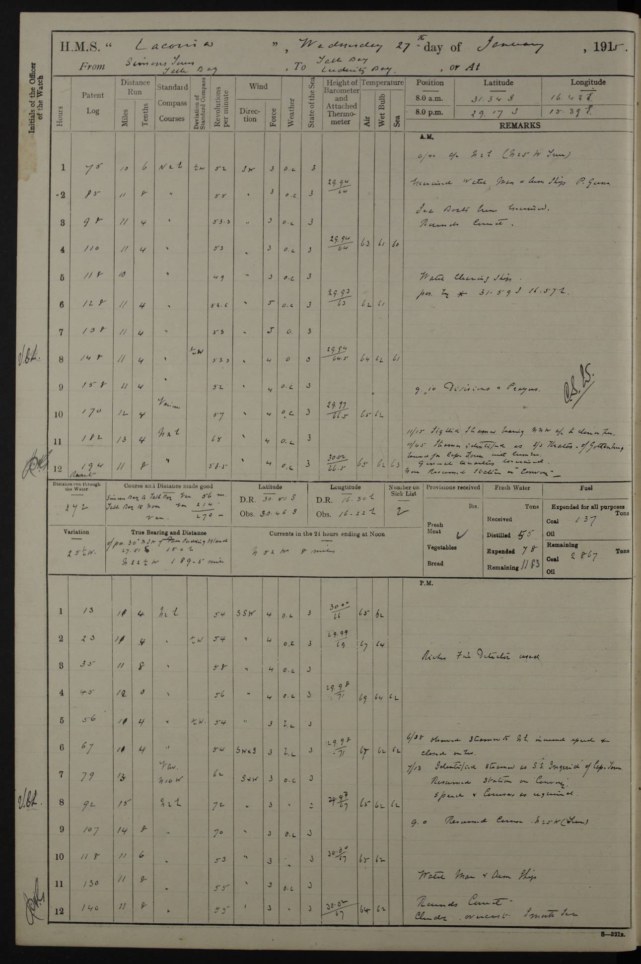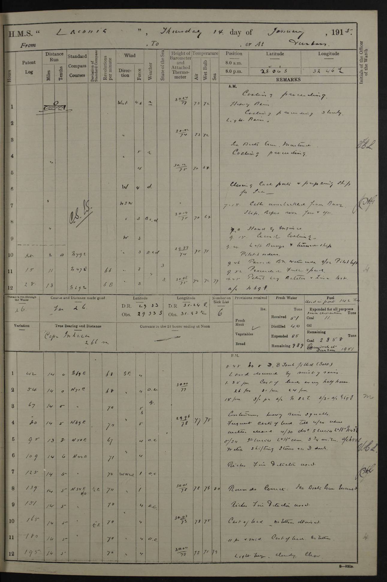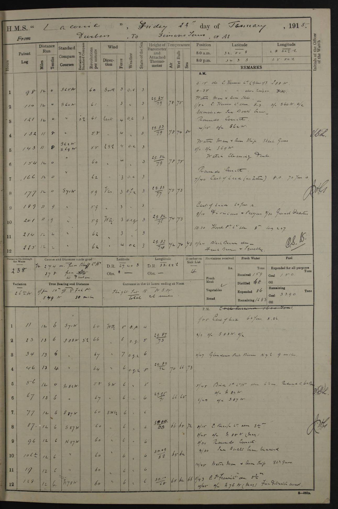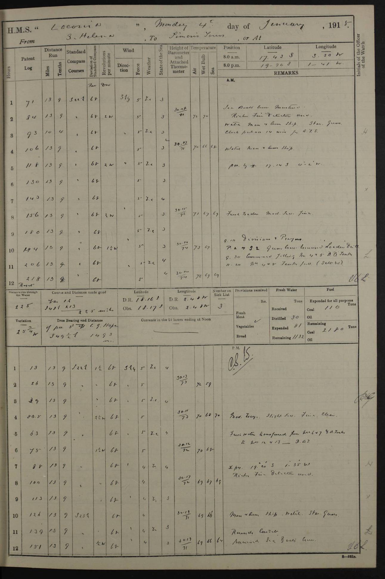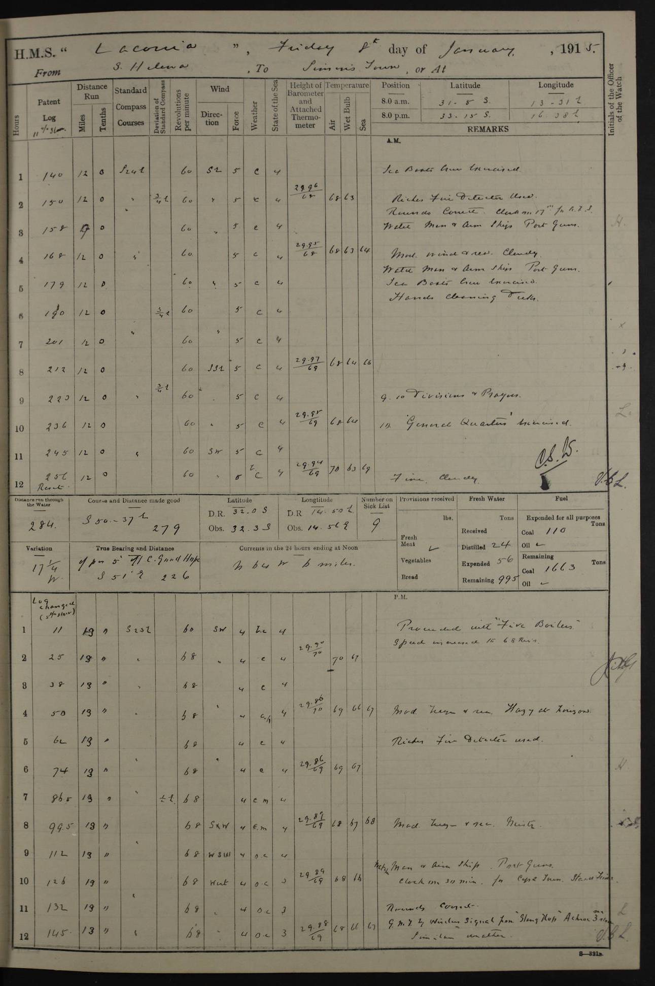 LOGS FOR JANUARY 1916 [Simonstown, Durban, to Kilindini with troops and Durban] 4caf8799cadfd3419701ba89: (http://oldweather.s3.amazonaws.com/ADM_53-45885/ADM 53-45885-001_0.jpg) 4caf8799cadfd3419701ba8a: (http://oldweather.s3.amazonaws.com/ADM_53-45885/ADM 53-45885-001_1.jpg) Cover, Adm. 53/45885, signed WRD Irvine. 4caf8799cadfd3419701ba8b: (http://oldweather.s3.amazonaws.com/ADM_53-45885/ADM 53-45885-002_0.jpg) 4caf8799cadfd3419701ba8c: (http://oldweather.s3.amazonaws.com/ADM_53-45885/ADM 53-45885-002_1.jpg) Dated 10th February 1916, signed CS Wills. 4caf8799cadfd3419701ba8d: (http://oldweather.s3.amazonaws.com/ADM_53-45885/ADM 53-45885-003_0.jpg) 4caf8799cadfd3419701ba8e: (http://oldweather.s3.amazonaws.com/ADM_53-45885/ADM 53-45885-003_1.jpg) 1 January 1916 Simonstown Lat -34.18, Long 18.43 Strong SSE winds, gale force 8 or 9 at times, all day. 10.00am: Commenced coaling. 3.00pm: One SBS to hospital, one Trimmer joined from same. 5.00pm: Read punishment warrants 22 and 23. One Fireman to cells. 7.45pm: Ceased coaling, 515 tons received. Sick list: 1. 4caf8799cadfd3419701ba8f: (http://oldweather.s3.amazonaws.com/ADM_53-45885/ADM 53-45885-004_0.jpg) 2 January 1916 Simonstown Lat -34.18, Long 18.43 SSE winds up to gale force 8 all day. 7.30am: Resumed coaling. 7.00pm: Two Firemen to cells. 8.00pm: Ceased coaling. 4caf8799cadfd3419701ba90: (http://oldweather.s3.amazonaws.com/ADM_53-45885/ADM 53-45885-004_1.jpg) 3 January 1916 Simonstown and at sea Lat -34.43, Long 18.81 Gale force winds at first, gradually abating to f 4 by noon. 7.00am: Wind moderating. 7.35am: Ship canted from berth to dock entrance by dockyard staff. 8.21am: Left dock. 8.33am: Anchored. 9.22am: Weighed and proceeded at full speed. Noon: Courses & DMG, various 23.5 miles. C Hangklip abeam, 2 miles. 2.40pm: Danger Pt Lt abeam, 4.5 miles, a/c S38E. 4.25pm: Quoin Pt abeam, 4 miles, a/c S45E. 6.00pm: C Agulhas abeam, 6 miles, a/c S71E. 8.00pm: Pos. 34º 52’S, 20º 27.5’E. 4caf8799cadfd3419701ba91: (http://oldweather.s3.amazonaws.com/ADM_53-45885/ADM 53-45885-005_0.jpg) 4 January 1916 At sea Lat -34.39, Long 24.44 8.00am: Pos. 34º 35’S, 23º 22’E. A/c S74E. Noon: Courses and DMG, various, 288 miles. 12.35pm: A/c S79E. 1.15pm: Seal Pt Lt bg N73E, land partially obscured by rain. 4.00pm: SS St Egbert passed bound west. 6.13pm: C Recife Lt bg N13E, 6 miles. 8.00pm: Pos. 34º 00’S, 26º 10’E. 8.12pm: Bird I. Lt abeam, 8 miles. 4caf8799cadfd3419701ba92: (http://oldweather.s3.amazonaws.com/ADM_53-45885/ADM 53-45885-005_1.jpg) 5 January 1916 At sea Lat -32.44, Long 28.75 1.11am: Gt Fish Pt Lt bg N36E, a/c N78E. 6.13am: Hood Pt Lt abeam, bg N21W, 6.25 miles. 8.00am: Pos. 32º 53’S, 28º 15’E. Noon: Courses and DMG, various, 251 miles. 4.25pm: A/c N67E. 5.53pm: C Hermes Lt abeam, bg N22W, 5 miles. 8.00pm: Pos. 31º 28.5’S, 29º 53.5’E. 10.10pm: HMS Armadale Castle passed bound South. 11.30pm: A/c N56E. 4caf8799cadfd3419701ba94: (http://oldweather.s3.amazonaws.com/ADM_53-45885/ADM 53-45885-006_1.jpg) 6 January 1916 At sea and alongside quay, shed H, Durban Lat -29.87, Long 31.02 12.30am: Shepstone Lt bg N40E. 2.16am: Same abeam, bg N32W, 5.5 miles. 8.59am: Pilot aboard. 9.30am: Alongside quay, two tugs assisting. 10.30am: Commenced coaling. Coaling from railway waggons on quayside and lighters on the starboard side, local labour. Noon: Courses and DMG, various, 200 miles. 4.05pm: 93 libertymen landed. 9.00pm: Libertymen returned, 17 absentees. 9.30pm: Two Firemen placed under sentry’s charge. 4caf8799cadfd3419701ba95: (http://oldweather.s3.amazonaws.com/ADM_53-45885/ADM 53-45885-007_0.jpg) 7 January 1916 Alongside quay, shed H, Durban Lat -29.87, Long 31.02 Coaling throughout. 7.40am: HMS Hyacinth arrived. 5.00pm: Fireman Fitzpatrick released from cells and resumed duty. 11.00pm: Shore carpenters landed. 4caf8799cadfd3419701ba96: (http://oldweather.s3.amazonaws.com/ADM_53-45885/ADM 53-45885-007_1.jpg) 8 January 1916 Alongside quay, shed H, Durban Lat -29.87, Long 31.02 1.00am: 10 absentees returned. 6.00am: Troops embarking. 9.00am: Taking in ammunition. 1.30pm: Libertymen landed. 2.00pm: Four Trimmers joined from shore to replace deserters. 9.00pm: Libertymen returned, 18 absentees. 4caf8799cadfd3419701ba97: (http://oldweather.s3.amazonaws.com/ADM_53-45885/ADM 53-45885-008_0.jpg) 9 January 1916 Durban and at sea Lat -29.87, Long 31.02 10.20am: Received three bags of mail for Mombasa and hoisting in troops baggage. 1.00pm: Troops embarked, 5th and 6th SAI, total 2,591. 4.00pm: Let go and proceeded, assisted by two tugs. 4.38pm: Pilot left. Set course N70E. 11.05pm: C St Lucia Lt bg N32E. 4caf8799cadfd3419701ba98: (http://oldweather.s3.amazonaws.com/ADM_53-45885/ADM 53-45885-008_1.jpg) 10 January 1916 At sea Lat -26.67, Long 34.14 12.55am: St Lucia Lt abeam, 14 miles, a/c N52E. 8.00am: Pos. 27º 26’S, 33º 34’E. 9.30am: HMS Trent passed bound South. Noon: Courses and DMG, various, 256.5 miles. 6.35pm: SS Student, Liverpool, passed. 8.00pm: Pos. 25º 16’S, 35º 20’E. 10.25pm: A/c N47E. 4caf8799cadfd3419701ba99: (http://oldweather.s3.amazonaws.com/ADM_53-45885/ADM 53-45885-009_0.jpg) 11 January 1916 At sea Lat -22.24, Long 37.39 Heavy swell and fresh SE winds f5-6 at times, all day. 6.15am: Entered tropics. 8.00am: Pos. 23º 07.5’S, 36º 50’E. Noon: Course and DMG, N34E, 320 miles. A/c N40E. 5.10pm: Read punishment warrant No 24. 8.00pm: Pos. 20º 35’S, 38º 26’E. 4caf8799cadfd3419701ba9a: (http://oldweather.s3.amazonaws.com/ADM_53-45885/ADM 53-45885-009_1.jpg) 12 January 1916 At sea Lat -16.97, Long 40.19 8.00am: Pos. 17º 48’S, 37º 43’E. Noon: Course and DMG, N26.5E, 353 miles. A/c N33E. 8.00pm: Pos. 15º 15’S, 41º 00’E. Mozambique Lt bg N38W. 4caf8799cadfd3419701ba9b: (http://oldweather.s3.amazonaws.com/ADM_53-45885/ADM 53-45885-010_0.jpg) 13 January 1916 At sea Lat -11.64, Long 40.99 8.00am: Pos. 12º 31S, 40º 57E. Noon: Courses and DMG, various, 330.5 miles. 4.30pm: Estimated C Del
