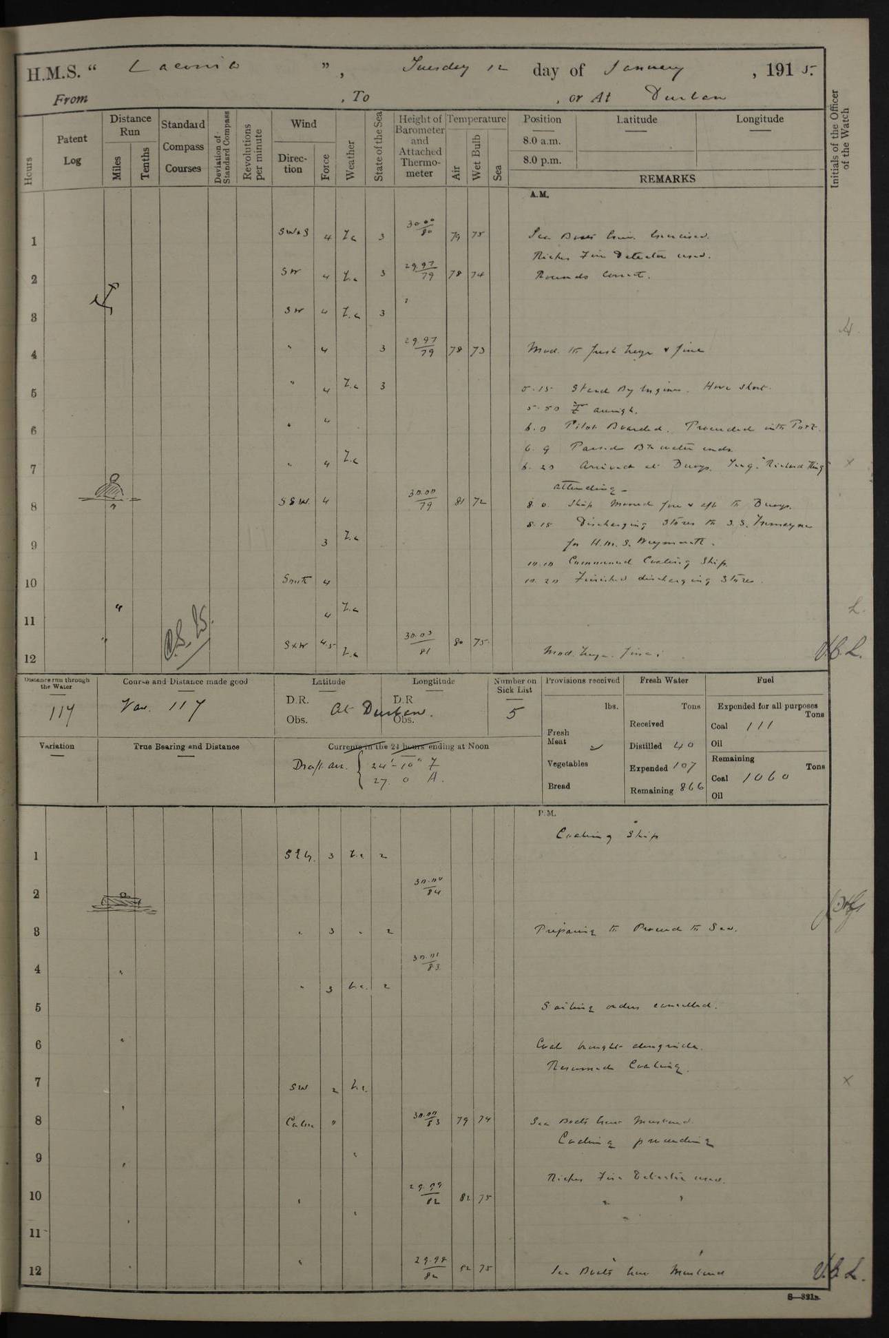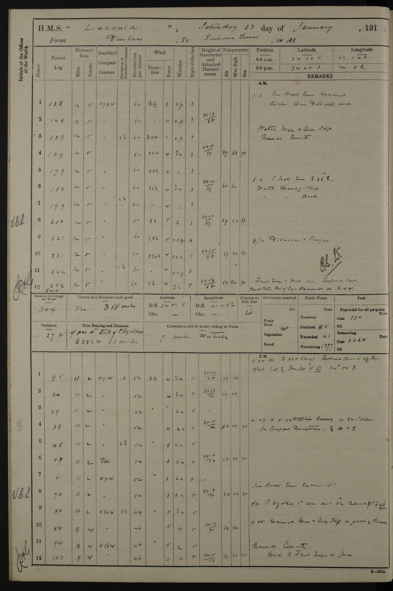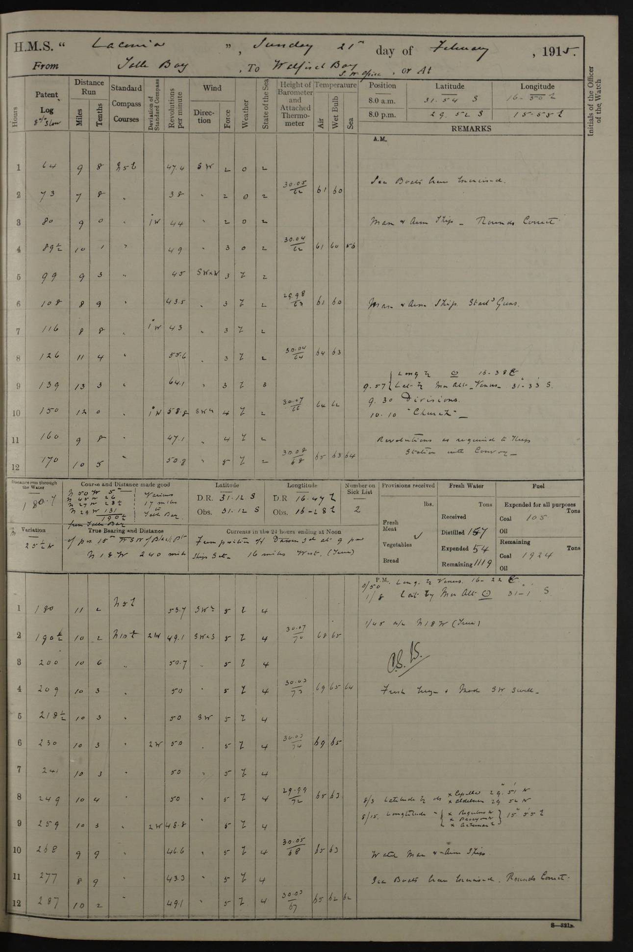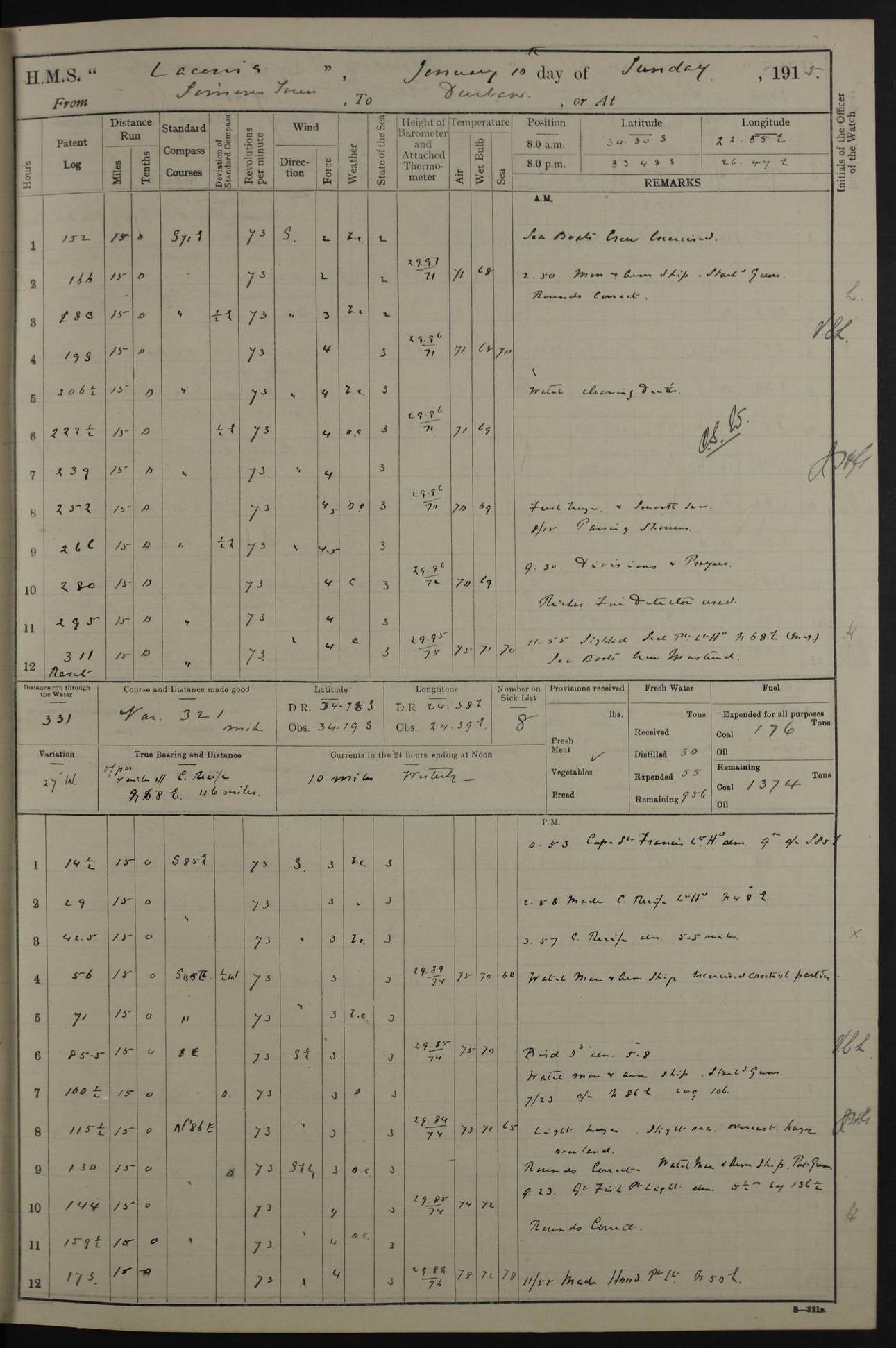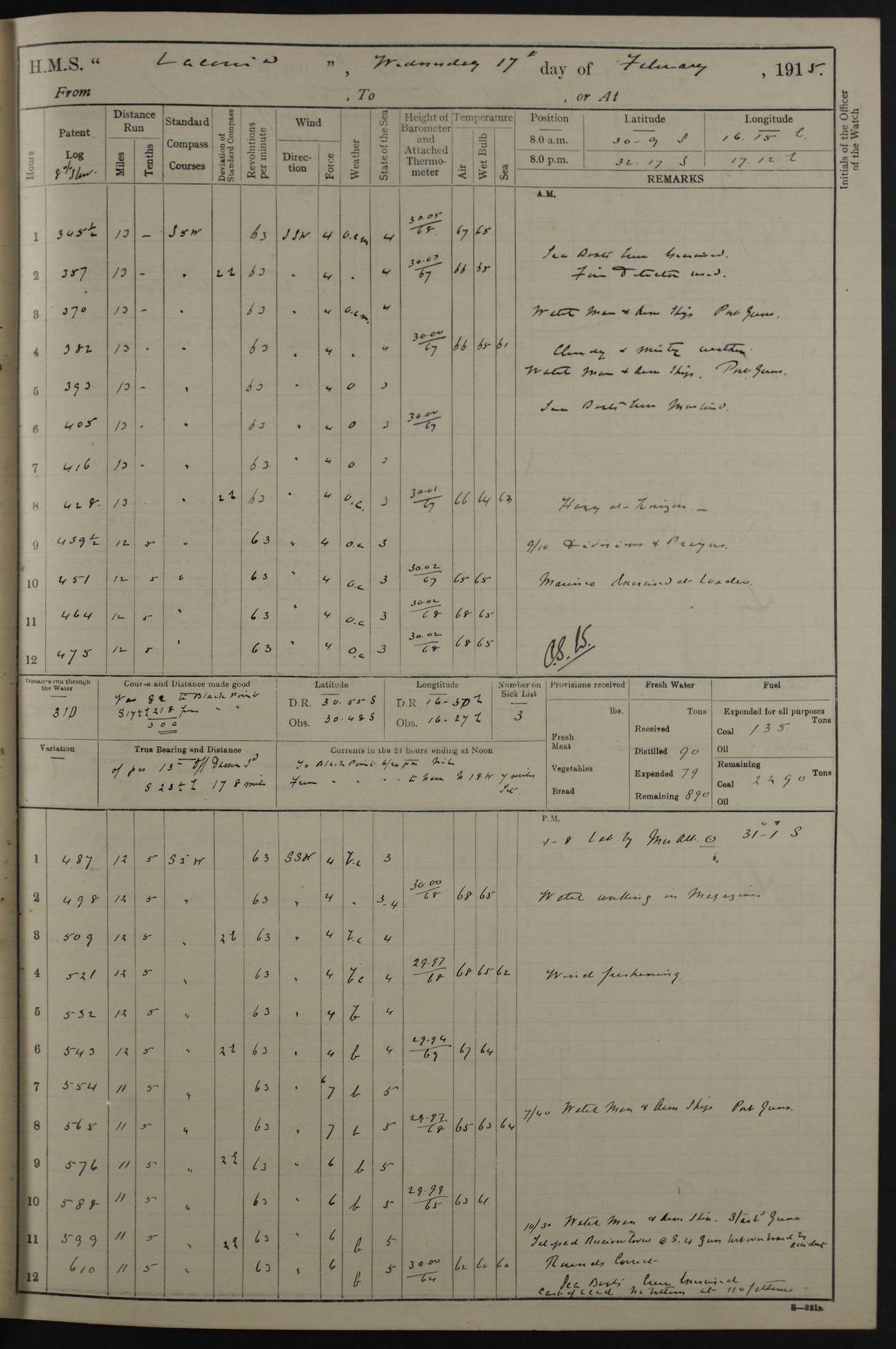 LOGS FOR JANUARY 1916 [Simonstown, Durban, to Kilindini with troops and Durban] 4caf8799cadfd3419701ba89: (http://oldweather.s3.amazonaws.com/ADM_53-45885/ADM 53-45885-001_0.jpg) 4caf8799cadfd3419701ba8a: (http://oldweather.s3.amazonaws.com/ADM_53-45885/ADM 53-45885-001_1.jpg) Cover, Adm. 53/45885, signed WRD Irvine. 4caf8799cadfd3419701ba8b: (http://oldweather.s3.amazonaws.com/ADM_53-45885/ADM 53-45885-002_0.jpg) 4caf8799cadfd3419701ba8c: (http://oldweather.s3.amazonaws.com/ADM_53-45885/ADM 53-45885-002_1.jpg) Dated 10th February 1916, signed CS Wills. 4caf8799cadfd3419701ba8d: (http://oldweather.s3.amazonaws.com/ADM_53-45885/ADM 53-45885-003_0.jpg) 4caf8799cadfd3419701ba8e: (http://oldweather.s3.amazonaws.com/ADM_53-45885/ADM 53-45885-003_1.jpg) 1 January 1916 Simonstown Lat -34.18, Long 18.43 Strong SSE winds, gale force 8 or 9 at times, all day. 10.00am: Commenced coaling. 3.00pm: One SBS to hospital, one Trimmer joined from same. 5.00pm: Read punishment warrants 22 and 23. One Fireman to cells. 7.45pm: Ceased coaling, 515 tons received. Sick list: 1. 4caf8799cadfd3419701ba8f: (http://oldweather.s3.amazonaws.com/ADM_53-45885/ADM 53-45885-004_0.jpg) 2 January 1916 Simonstown Lat -34.18, Long 18.43 SSE winds up to gale force 8 all day. 7.30am: Resumed coaling. 7.00pm: Two Firemen to cells. 8.00pm: Ceased coaling. 4caf8799cadfd3419701ba90: (http://oldweather.s3.amazonaws.com/ADM_53-45885/ADM 53-45885-004_1.jpg) 3 January 1916 Simonstown and at sea Lat -34.43, Long 18.81 Gale force winds at first, gradually abating to f 4 by noon. 7.00am: Wind moderating. 7.35am: Ship canted from berth to dock entrance by dockyard staff. 8.21am: Left dock. 8.33am: Anchored. 9.22am: Weighed and proceeded at full speed. Noon: Courses & DMG, various 23.5 miles. C Hangklip abeam, 2 miles. 2.40pm: Danger Pt Lt abeam, 4.5 miles, a/c S38E. 4.25pm: Quoin Pt abeam, 4 miles, a/c S45E. 6.00pm: C Agulhas abeam, 6 miles, a/c S71E. 8.00pm: Pos. 34º 52’S, 20º 27.5’E. 4caf8799cadfd3419701ba91: (http://oldweather.s3.amazonaws.com/ADM_53-45885/ADM 53-45885-005_0.jpg) 4 January 1916 At sea Lat -34.39, Long 24.44 8.00am: Pos. 34º 35’S, 23º 22’E. A/c S74E. Noon: Courses and DMG, various, 288 miles. 12.35pm: A/c S79E. 1.15pm: Seal Pt Lt bg N73E, land partially obscured by rain. 4.00pm: SS St Egbert passed bound west. 6.13pm: C Recife Lt bg N13E, 6 miles. 8.00pm: Pos. 34º 00’S, 26º 10’E. 8.12pm: Bird I. Lt abeam, 8 miles. 4caf8799cadfd3419701ba92: (http://oldweather.s3.amazonaws.com/ADM_53-45885/ADM 53-45885-005_1.jpg) 5 January 1916 At sea Lat -32.44, Long 28.75 1.11am: Gt Fish Pt Lt bg N36E, a/c N78E. 6.13am: Hood Pt Lt abeam, bg N21W, 6.25 miles. 8.00am: Pos. 32º 53’S, 28º 15’E. Noon: Courses and DMG, various, 251 miles. 4.25pm: A/c N67E. 5.53pm: C Hermes Lt abeam, bg N22W, 5 miles. 8.00pm: Pos. 31º 28.5’S, 29º 53.5’E. 10.10pm: HMS Armadale Castle passed bound South. 11.30pm: A/c N56E. 4caf8799cadfd3419701ba94: (http://oldweather.s3.amazonaws.com/ADM_53-45885/ADM 53-45885-006_1.jpg) 6 January 1916 At sea and alongside quay, shed H, Durban Lat -29.87, Long 31.02 12.30am: Shepstone Lt bg N40E. 2.16am: Same abeam, bg N32W, 5.5 miles. 8.59am: Pilot aboard. 9.30am: Alongside quay, two tugs assisting. 10.30am: Commenced coaling. Coaling from railway waggons on quayside and lighters on the starboard side, local labour. Noon: Courses and DMG, various, 200 miles. 4.05pm: 93 libertymen landed. 9.00pm: Libertymen returned, 17 absentees. 9.30pm: Two Firemen placed under sentry’s charge. 4caf8799cadfd3419701ba95: (http://oldweather.s3.amazonaws.com/ADM_53-45885/ADM 53-45885-007_0.jpg) 7 January 1916 Alongside quay, shed H, Durban Lat -29.87, Long 31.02 Coaling throughout. 7.40am: HMS Hyacinth arrived. 5.00pm: Fireman Fitzpatrick released from cells and resumed duty. 11.00pm: Shore carpenters landed. 4caf8799cadfd3419701ba96: (http://oldweather.s3.amazonaws.com/ADM_53-45885/ADM 53-45885-007_1.jpg) 8 January 1916 Alongside quay, shed H, Durban Lat -29.87, Long 31.02 1.00am: 10 absentees returned. 6.00am: Troops embarking. 9.00am: Taking in ammunition. 1.30pm: Libertymen landed. 2.00pm: Four Trimmers joined from shore to replace deserters. 9.00pm: Libertymen returned, 18 absentees. 4caf8799cadfd3419701ba97: (http://oldweather.s3.amazonaws.com/ADM_53-45885/ADM 53-45885-008_0.jpg) 9 January 1916 Durban and at sea Lat -29.87, Long 31.02 10.20am: Received three bags of mail for Mombasa and hoisting in troops baggage. 1.00pm: Troops embarked, 5th and 6th SAI, total 2,591. 4.00pm: Let go and proceeded, assisted by two tugs. 4.38pm: Pilot left. Set course N70E. 11.05pm: C St Lucia Lt bg N32E. 4caf8799cadfd3419701ba98: (http://oldweather.s3.amazonaws.com/ADM_53-45885/ADM 53-45885-008_1.jpg) 10 January 1916 At sea Lat -26.67, Long 34.14 12.55am: St Lucia Lt abeam, 14 miles, a/c N52E. 8.00am: Pos. 27º 26’S, 33º 34’E. 9.30am: HMS Trent passed bound South. Noon: Courses and DMG, various, 256.5 miles. 6.35pm: SS Student, Liverpool, passed. 8.00pm: Pos. 25º 16’S, 35º 20’E. 10.25pm: A/c N47E. 4caf8799cadfd3419701ba99: (http://oldweather.s3.amazonaws.com/ADM_53-45885/ADM 53-45885-009_0.jpg) 11 January 1916 At sea Lat -22.24, Long 37.39 Heavy swell and fresh SE winds f5-6 at times, all day. 6.15am: Entered tropics. 8.00am: Pos. 23º 07.5’S, 36º 50’E. Noon: Course and DMG, N34E, 320 miles. A/c N40E. 5.10pm: Read punishment warrant No 24. 8.00pm: Pos. 20º 35’S, 38º 26’E. 4caf8799cadfd3419701ba9a: (http://oldweather.s3.amazonaws.com/ADM_53-45885/ADM 53-45885-009_1.jpg) 12 January 1916 At sea Lat -16.97, Long 40.19 8.00am: Pos. 17º 48’S, 37º 43’E. Noon: Course and DMG, N26.5E, 353 miles. A/c N33E. 8.00pm: Pos. 15º 15’S, 41º 00’E. Mozambique Lt bg N38W. 4caf8799cadfd3419701ba9b: (http://oldweather.s3.amazonaws.com/ADM_53-45885/ADM 53-45885-010_0.jpg) 13 January 1916 At sea Lat -11.64, Long 40.99 8.00am: Pos. 12º 31S, 40º 57E. Noon: Courses and DMG, various, 330.5 miles. 4.30pm: Estimated C Del