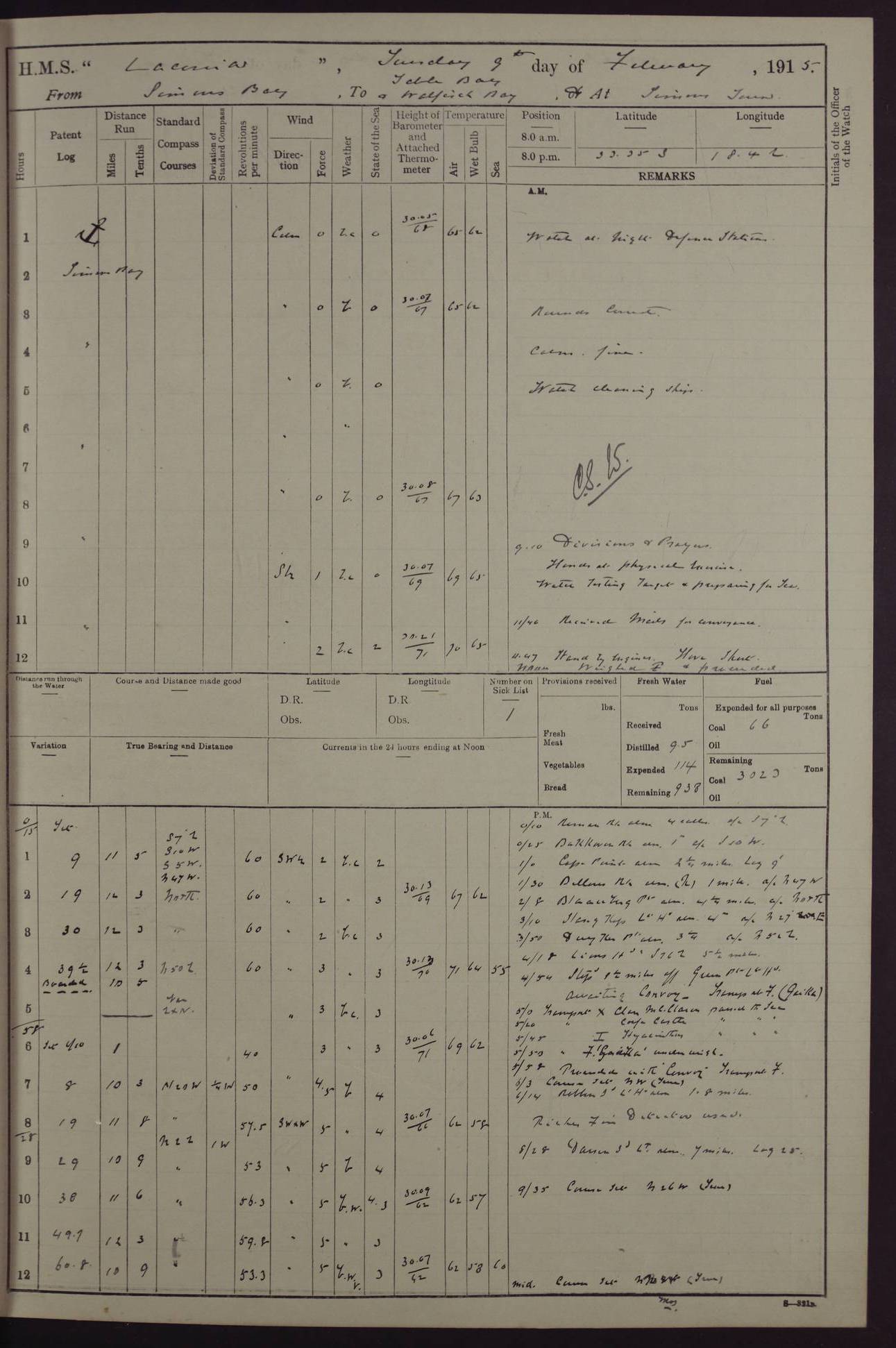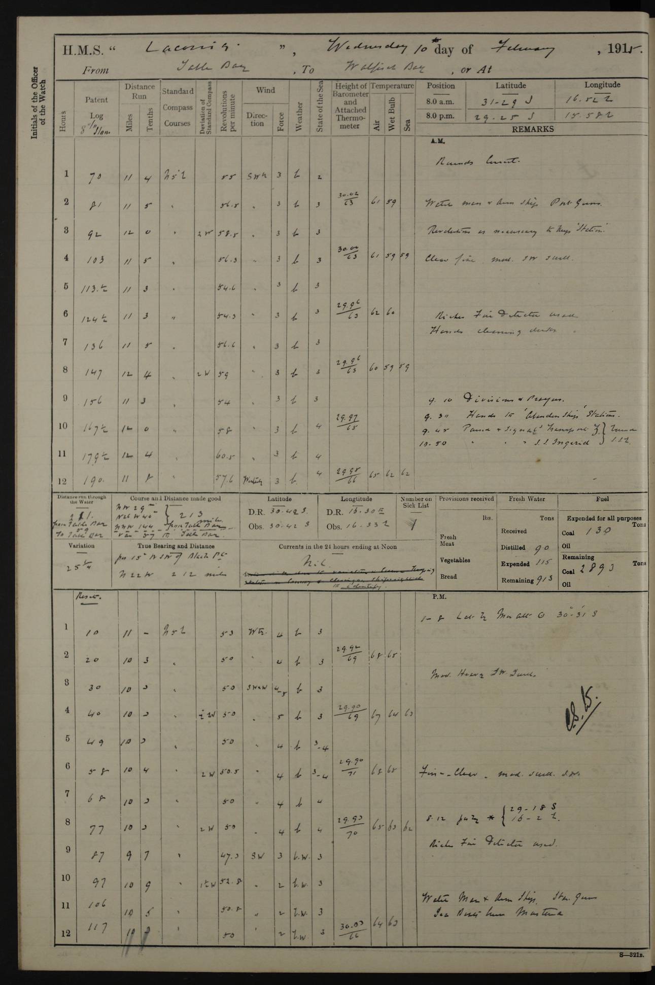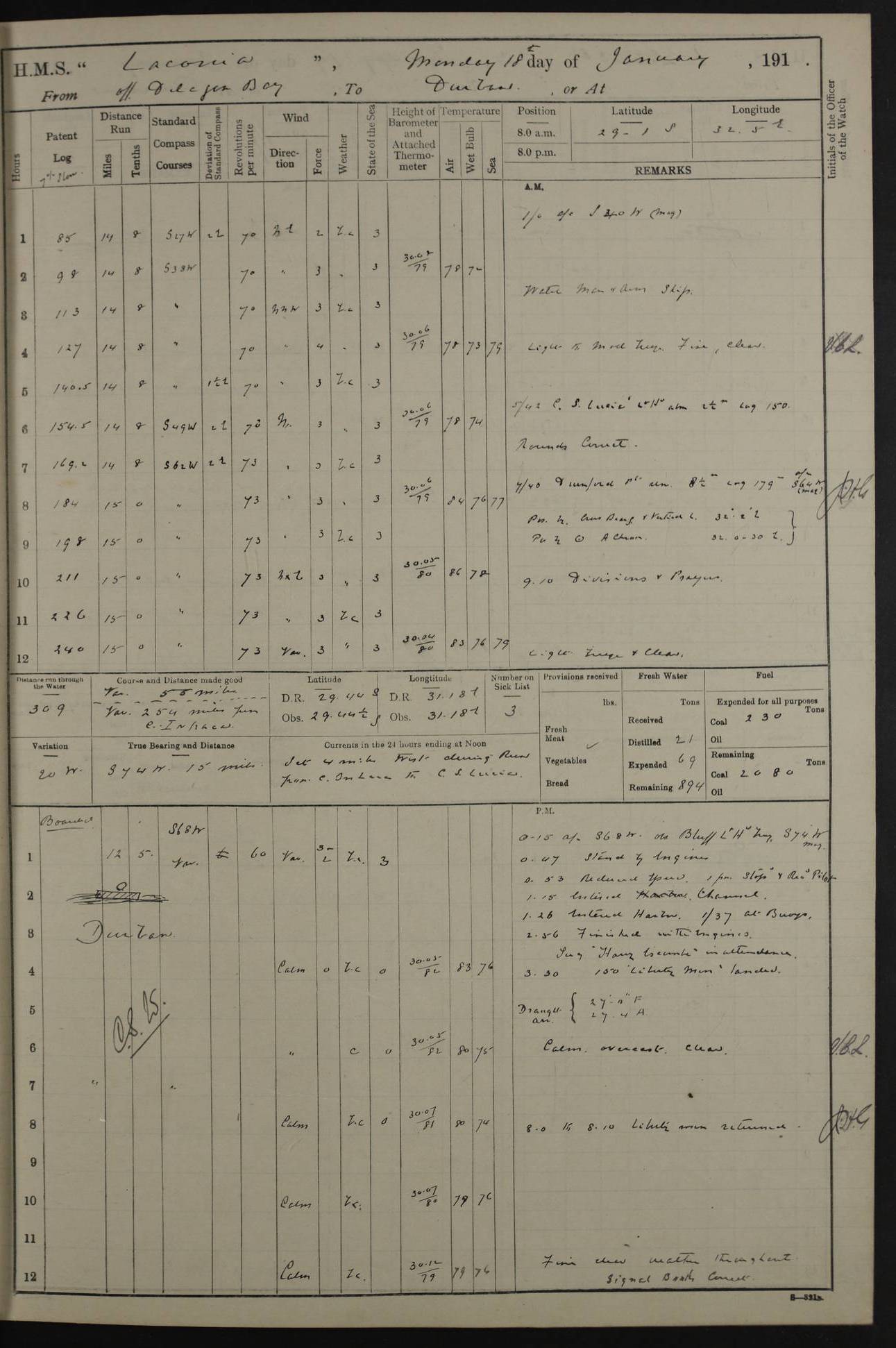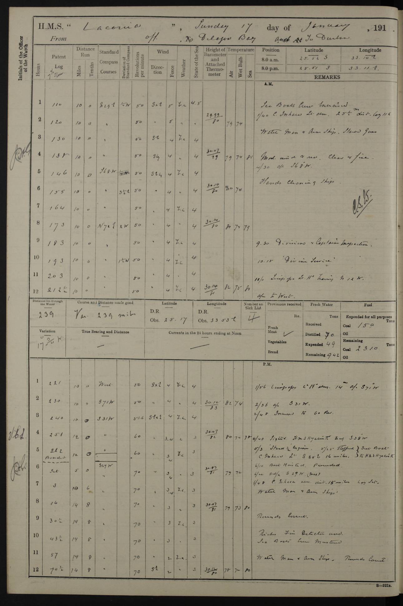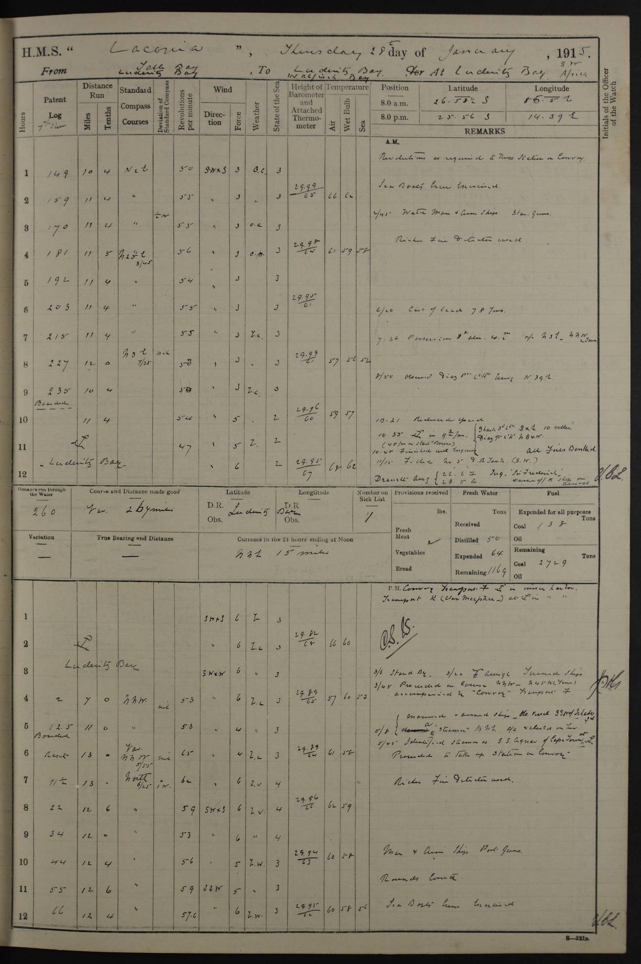 LOGS FOR JANUARY 1916 [Simonstown, Durban, to Kilindini with troops and Durban] 4caf8799cadfd3419701ba89: (http://oldweather.s3.amazonaws.com/ADM_53-45885/ADM 53-45885-001_0.jpg) 4caf8799cadfd3419701ba8a: (http://oldweather.s3.amazonaws.com/ADM_53-45885/ADM 53-45885-001_1.jpg) Cover, Adm. 53/45885, signed WRD Irvine. 4caf8799cadfd3419701ba8b: (http://oldweather.s3.amazonaws.com/ADM_53-45885/ADM 53-45885-002_0.jpg) 4caf8799cadfd3419701ba8c: (http://oldweather.s3.amazonaws.com/ADM_53-45885/ADM 53-45885-002_1.jpg) Dated 10th February 1916, signed CS Wills. 4caf8799cadfd3419701ba8d: (http://oldweather.s3.amazonaws.com/ADM_53-45885/ADM 53-45885-003_0.jpg) 4caf8799cadfd3419701ba8e: (http://oldweather.s3.amazonaws.com/ADM_53-45885/ADM 53-45885-003_1.jpg) 1 January 1916 Simonstown Lat -34.18, Long 18.43 Strong SSE winds, gale force 8 or 9 at times, all day. 10.00am: Commenced coaling. 3.00pm: One SBS to hospital, one Trimmer joined from same. 5.00pm: Read punishment warrants 22 and 23. One Fireman to cells. 7.45pm: Ceased coaling, 515 tons received. Sick list: 1. 4caf8799cadfd3419701ba8f: (http://oldweather.s3.amazonaws.com/ADM_53-45885/ADM 53-45885-004_0.jpg) 2 January 1916 Simonstown Lat -34.18, Long 18.43 SSE winds up to gale force 8 all day. 7.30am: Resumed coaling. 7.00pm: Two Firemen to cells. 8.00pm: Ceased coaling. 4caf8799cadfd3419701ba90: (http://oldweather.s3.amazonaws.com/ADM_53-45885/ADM 53-45885-004_1.jpg) 3 January 1916 Simonstown and at sea Lat -34.43, Long 18.81 Gale force winds at first, gradually abating to f 4 by noon. 7.00am: Wind moderating. 7.35am: Ship canted from berth to dock entrance by dockyard staff. 8.21am: Left dock. 8.33am: Anchored. 9.22am: Weighed and proceeded at full speed. Noon: Courses & DMG, various 23.5 miles. C Hangklip abeam, 2 miles. 2.40pm: Danger Pt Lt abeam, 4.5 miles, a/c S38E. 4.25pm: Quoin Pt abeam, 4 miles, a/c S45E. 6.00pm: C Agulhas abeam, 6 miles, a/c S71E. 8.00pm: Pos. 34º 52’S, 20º 27.5’E. 4caf8799cadfd3419701ba91: (http://oldweather.s3.amazonaws.com/ADM_53-45885/ADM 53-45885-005_0.jpg) 4 January 1916 At sea Lat -34.39, Long 24.44 8.00am: Pos. 34º 35’S, 23º 22’E. A/c S74E. Noon: Courses and DMG, various, 288 miles. 12.35pm: A/c S79E. 1.15pm: Seal Pt Lt bg N73E, land partially obscured by rain. 4.00pm: SS St Egbert passed bound west. 6.13pm: C Recife Lt bg N13E, 6 miles. 8.00pm: Pos. 34º 00’S, 26º 10’E. 8.12pm: Bird I. Lt abeam, 8 miles. 4caf8799cadfd3419701ba92: (http://oldweather.s3.amazonaws.com/ADM_53-45885/ADM 53-45885-005_1.jpg) 5 January 1916 At sea Lat -32.44, Long 28.75 1.11am: Gt Fish Pt Lt bg N36E, a/c N78E. 6.13am: Hood Pt Lt abeam, bg N21W, 6.25 miles. 8.00am: Pos. 32º 53’S, 28º 15’E. Noon: Courses and DMG, various, 251 miles. 4.25pm: A/c N67E. 5.53pm: C Hermes Lt abeam, bg N22W, 5 miles. 8.00pm: Pos. 31º 28.5’S, 29º 53.5’E. 10.10pm: HMS Armadale Castle passed bound South. 11.30pm: A/c N56E. 4caf8799cadfd3419701ba94: (http://oldweather.s3.amazonaws.com/ADM_53-45885/ADM 53-45885-006_1.jpg) 6 January 1916 At sea and alongside quay, shed H, Durban Lat -29.87, Long 31.02 12.30am: Shepstone Lt bg N40E. 2.16am: Same abeam, bg N32W, 5.5 miles. 8.59am: Pilot aboard. 9.30am: Alongside quay, two tugs assisting. 10.30am: Commenced coaling. Coaling from railway waggons on quayside and lighters on the starboard side, local labour. Noon: Courses and DMG, various, 200 miles. 4.05pm: 93 libertymen landed. 9.00pm: Libertymen returned, 17 absentees. 9.30pm: Two Firemen placed under sentry’s charge. 4caf8799cadfd3419701ba95: (http://oldweather.s3.amazonaws.com/ADM_53-45885/ADM 53-45885-007_0.jpg) 7 January 1916 Alongside quay, shed H, Durban Lat -29.87, Long 31.02 Coaling throughout. 7.40am: HMS Hyacinth arrived. 5.00pm: Fireman Fitzpatrick released from cells and resumed duty. 11.00pm: Shore carpenters landed. 4caf8799cadfd3419701ba96: (http://oldweather.s3.amazonaws.com/ADM_53-45885/ADM 53-45885-007_1.jpg) 8 January 1916 Alongside quay, shed H, Durban Lat -29.87, Long 31.02 1.00am: 10 absentees returned. 6.00am: Troops embarking. 9.00am: Taking in ammunition. 1.30pm: Libertymen landed. 2.00pm: Four Trimmers joined from shore to replace deserters. 9.00pm: Libertymen returned, 18 absentees. 4caf8799cadfd3419701ba97: (http://oldweather.s3.amazonaws.com/ADM_53-45885/ADM 53-45885-008_0.jpg) 9 January 1916 Durban and at sea Lat -29.87, Long 31.02 10.20am: Received three bags of mail for Mombasa and hoisting in troops baggage. 1.00pm: Troops embarked, 5th and 6th SAI, total 2,591. 4.00pm: Let go and proceeded, assisted by two tugs. 4.38pm: Pilot left. Set course N70E. 11.05pm: C St Lucia Lt bg N32E. 4caf8799cadfd3419701ba98: (http://oldweather.s3.amazonaws.com/ADM_53-45885/ADM 53-45885-008_1.jpg) 10 January 1916 At sea Lat -26.67, Long 34.14 12.55am: St Lucia Lt abeam, 14 miles, a/c N52E. 8.00am: Pos. 27º 26’S, 33º 34’E. 9.30am: HMS Trent passed bound South. Noon: Courses and DMG, various, 256.5 miles. 6.35pm: SS Student, Liverpool, passed. 8.00pm: Pos. 25º 16’S, 35º 20’E. 10.25pm: A/c N47E. 4caf8799cadfd3419701ba99: (http://oldweather.s3.amazonaws.com/ADM_53-45885/ADM 53-45885-009_0.jpg) 11 January 1916 At sea Lat -22.24, Long 37.39 Heavy swell and fresh SE winds f5-6 at times, all day. 6.15am: Entered tropics. 8.00am: Pos. 23º 07.5’S, 36º 50’E. Noon: Course and DMG, N34E, 320 miles. A/c N40E. 5.10pm: Read punishment warrant No 24. 8.00pm: Pos. 20º 35’S, 38º 26’E. 4caf8799cadfd3419701ba9a: (http://oldweather.s3.amazonaws.com/ADM_53-45885/ADM 53-45885-009_1.jpg) 12 January 1916 At sea Lat -16.97, Long 40.19 8.00am: Pos. 17º 48’S, 37º 43’E. Noon: Course and DMG, N26.5E, 353 miles. A/c N33E. 8.00pm: Pos. 15º 15’S, 41º 00’E. Mozambique Lt bg N38W. 4caf8799cadfd3419701ba9b: (http://oldweather.s3.amazonaws.com/ADM_53-45885/ADM 53-45885-010_0.jpg) 13 January 1916 At sea Lat -11.64, Long 40.99 8.00am: Pos. 12º 31S, 40º 57E. Noon: Courses and DMG, various, 330.5 miles. 4.30pm: Estimated C Del